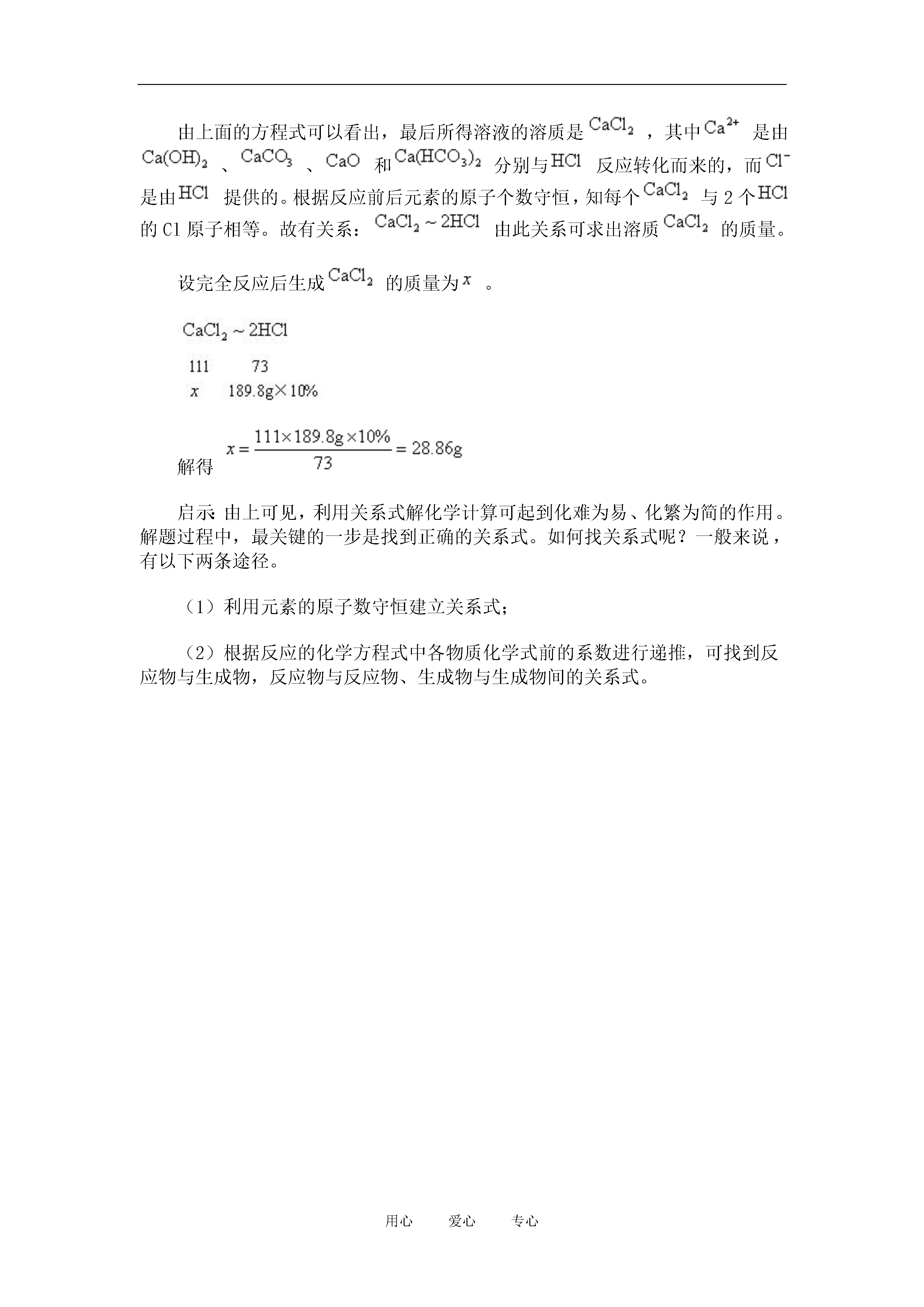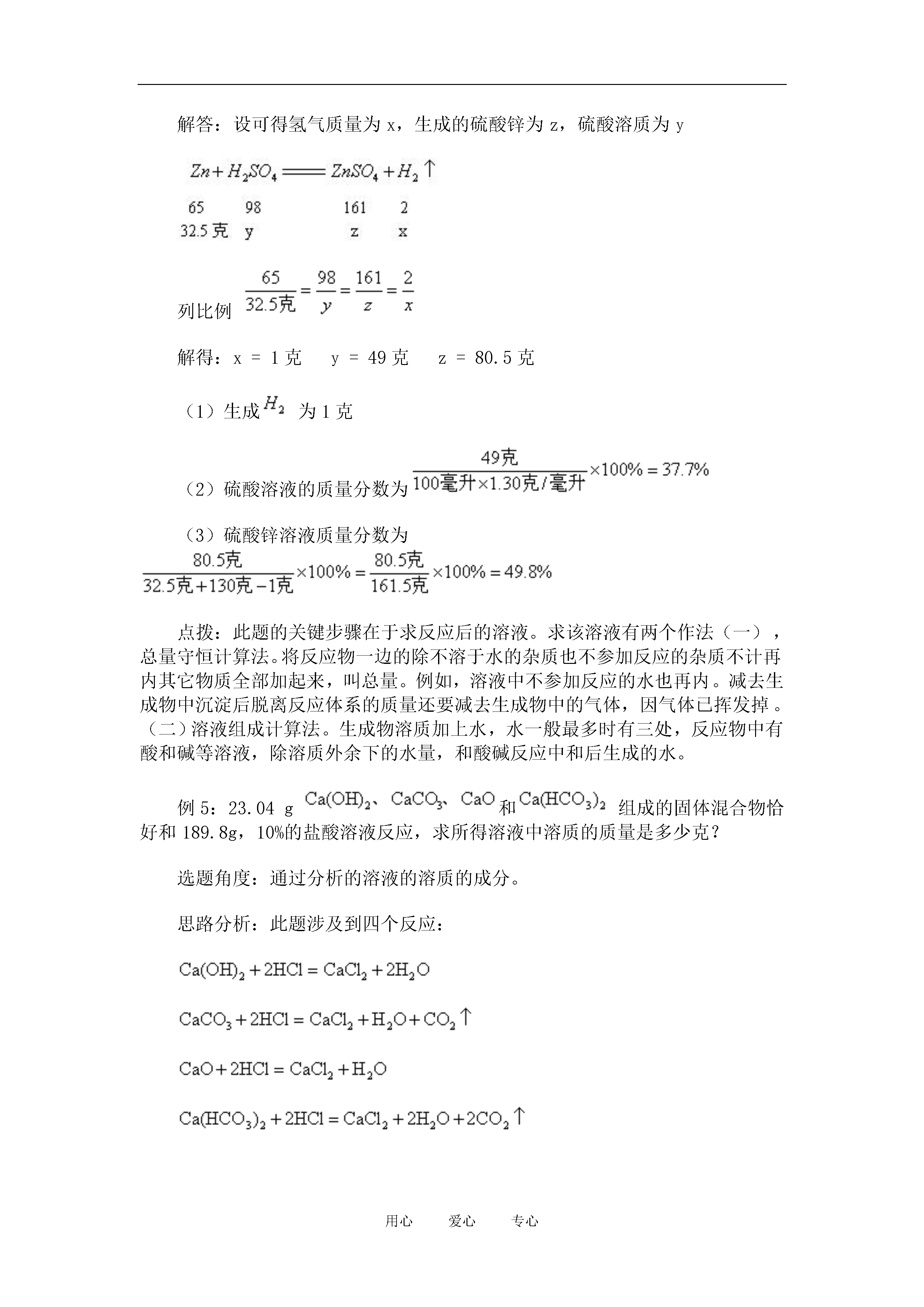 用心爱心专心典型例题例120℃食盐的溶解度为36克,求20℃时配成的饱和食盐水溶质质量分数为多少?在该温度下能配成30%的食盐溶液吗?分析:根据溶解度的概念可知,36克是溶质需要溶解在100克水中达到饱和状态,所以溶液的质量是:100克+36克=136克。根据溶质质量分数的概念可以求出。解答:(1)(2)不能配成。点拨:通过此题解答,可知按溶解度配成的一定温度下的饱和溶液,是该种物质在该温度下的溶液中溶质质量分数的最大值。在20℃食盐饱和溶液溶质质量分数最大值为26.5%,不改变温度,就不可能再进一步溶解溶质,也不能将其浓度进一步提高。因此,不能配成20℃时的30%的食盐溶液。例2在80克15%的溶液里加入20克水或20克,计算用这两种方法制成的两种溶液的溶质的质量分数?分析:在溶质质量分数一定的溶液里用加水或加质方法改变它的质量分数要注意;各种量变的规律。只加水能引起溶剂量和溶液量的改变而溶质质量不变,即溶质守恒。只加溶质能引起溶质量和溶液量改变而溶剂量不变。解答:原溶液中有溶质为80克×15%=12克水为80克-12克=68克。(1)(2)点拨:通过此题的计算可知,加水时只加在溶液的质量变化上,而加溶质时,除了溶质要加上还要加在溶液的质量变化上。加水时不引起溶质质量变化可用溶质守恒计算列方程。加溶质时要用原溶液中的溶质加上加入的新溶质和混合后的溶液中的溶质质量相等来列方程,也可解出。例325℃,10克某盐加入一定量的水,完全溶解后,得到不饱和溶液,若蒸发12.5克水后得到浓度为20%的饱和溶液。(1)计算25℃时某盐的溶解度(2)原不饱和溶液的溶质的质量分数(3)25℃时若要使5克某盐从饱和溶液中析出来,需蒸发多少克水?分析:此题,由已知溶质10克某盐入手利用质量分数为20%,求出饱和溶液的量。再加上蒸发掉的水就可得到原来不饱和溶液。5克盐是原来溶质的,因此,蒸发掉水为饱和溶液量的一半中的溶剂。利用质量分数与溶解度的换算公式,可直接求出25℃时的溶解度。解答:(1)=25克(2)原不饱和溶液的量为:10克÷20%+12.5克=62.5克原不饱和溶液的质量分数:10克÷62.5克×100%=16%(3)析出5克盐需蒸发掉水为:25克-5克=20克。点拨:能利用质量分数求溶解度的前提条件必须是饱和溶液。同理,利用溶解度也能求溶液溶质的质量分数。此时的质量分数为该饱和溶液的最大值。析出晶体的条件也同样是在饱和溶液中,蒸发溶剂的量决定析出晶体的量,与剩余母液的量无关。例432.5克锌与密度为的硫酸溶液100毫升恰好完全反应,计算:(1)可制得氢气多少克?(2)硫酸溶液溶质质量分数为多少?(3)反应后溶液溶质的质量分数是多少?分析:此题综合了不少知识内容,其中包含了密度、体积、质量换算,利用化学方程式的计算都包含在内。注意写出完整的方程式并将纯量代入方程式。溶液中只有参加反应的溶质才能代入方程。解答:设可得氢气质量为x,生成的硫酸锌为z,硫酸溶质为y列比例解得:x=1克y=49克z=80.5克(1)生成为1克(2)硫酸溶液的质量分数为(3)硫酸锌溶液质量分数为点拨:此题的关键步骤在于求反应后的溶液。求该溶液有两个作法(一),总量守恒计算法。将反应物一边的除不溶于水的杂质也不参加反应的杂质不计再内其它物质全部加起来,叫总量。例如,溶液中不参加反应的水也再内。减去生成物中沉淀后脱离反应体系的质量还要减去生成物中的气体,因气体已挥发掉。(二)溶液组成计算法。生成物溶质加上水,水一般最多时有三处,反应物中有酸和碱等溶液,除溶质外余下的水量,和酸碱反应中和后生成的水。例5:23.04g和组成的固体混合物恰好和189.8g,10%的盐酸溶液反应,求所得溶液中溶质的质量是多少克?选题角度:通过分析的溶液的溶质的成分。思路分析:此题涉及到四个反应:由上面的方程式可以看出,最后所得溶液的溶质是,其中是由、、和分别与反应转化而来的,而是由提供的。根据反应前后元素的原子个数守恒,知每个与2个的Cl原子相等。故有关系:由此关系可求出溶质的质量。设完全反应后生成的质量为。解得启示:由上可见,利用关系式解化学计算可起到化难为易、化繁为简的作用。解题过程中,最关键的一步是找到正确的关系式。如何找关系式呢?一般来说,有以下两条途径。(1)利用元素的原子数守恒建立关系式;(2)根据反应的化学方程式中各物质化学式前的系数进行递推,可找到反应物与生成物,反应物与反应物、生成物与生成物间的关系式。