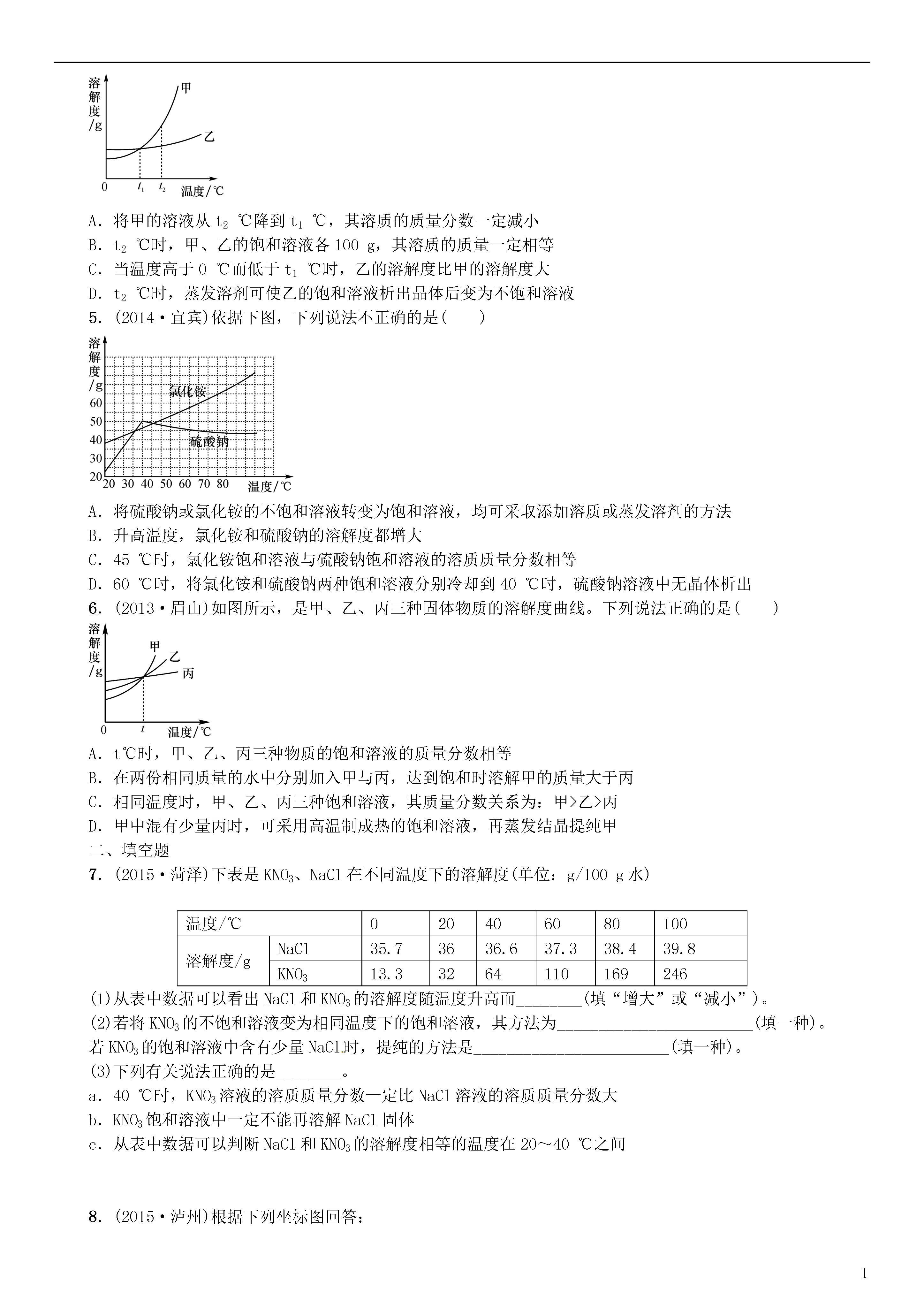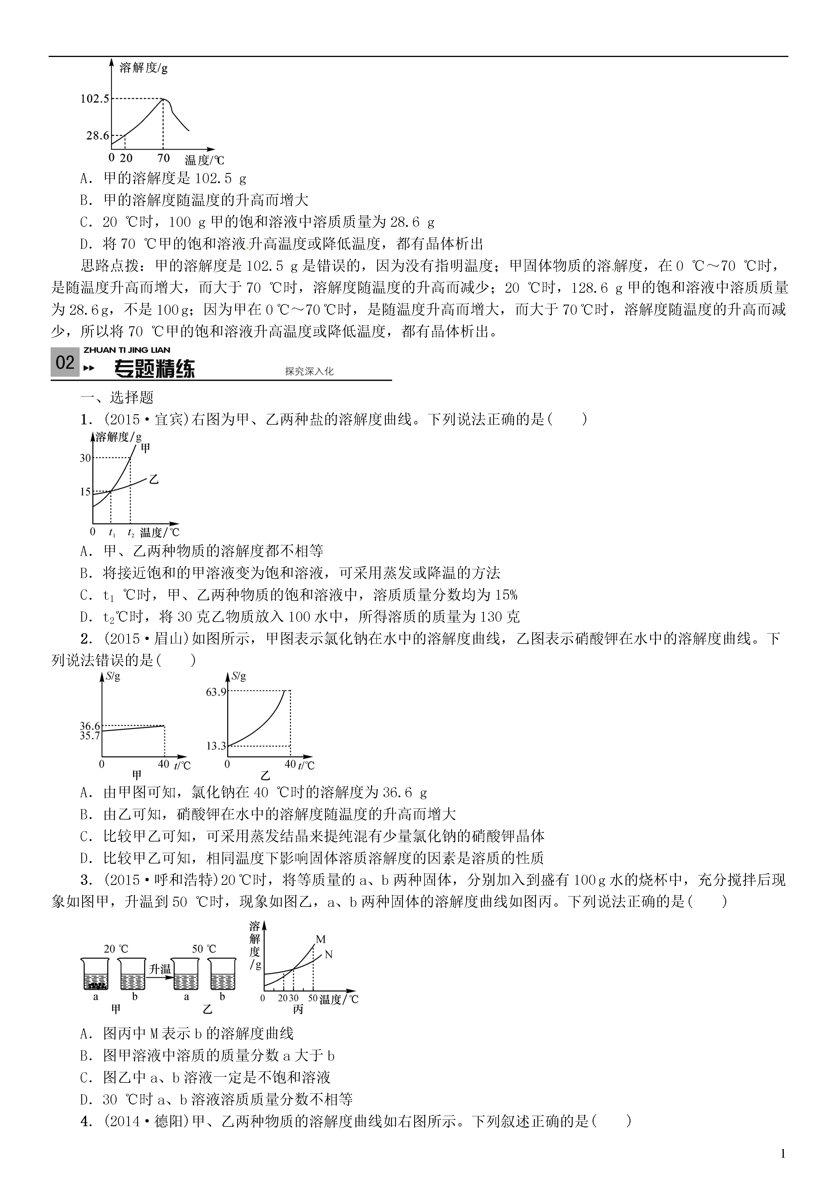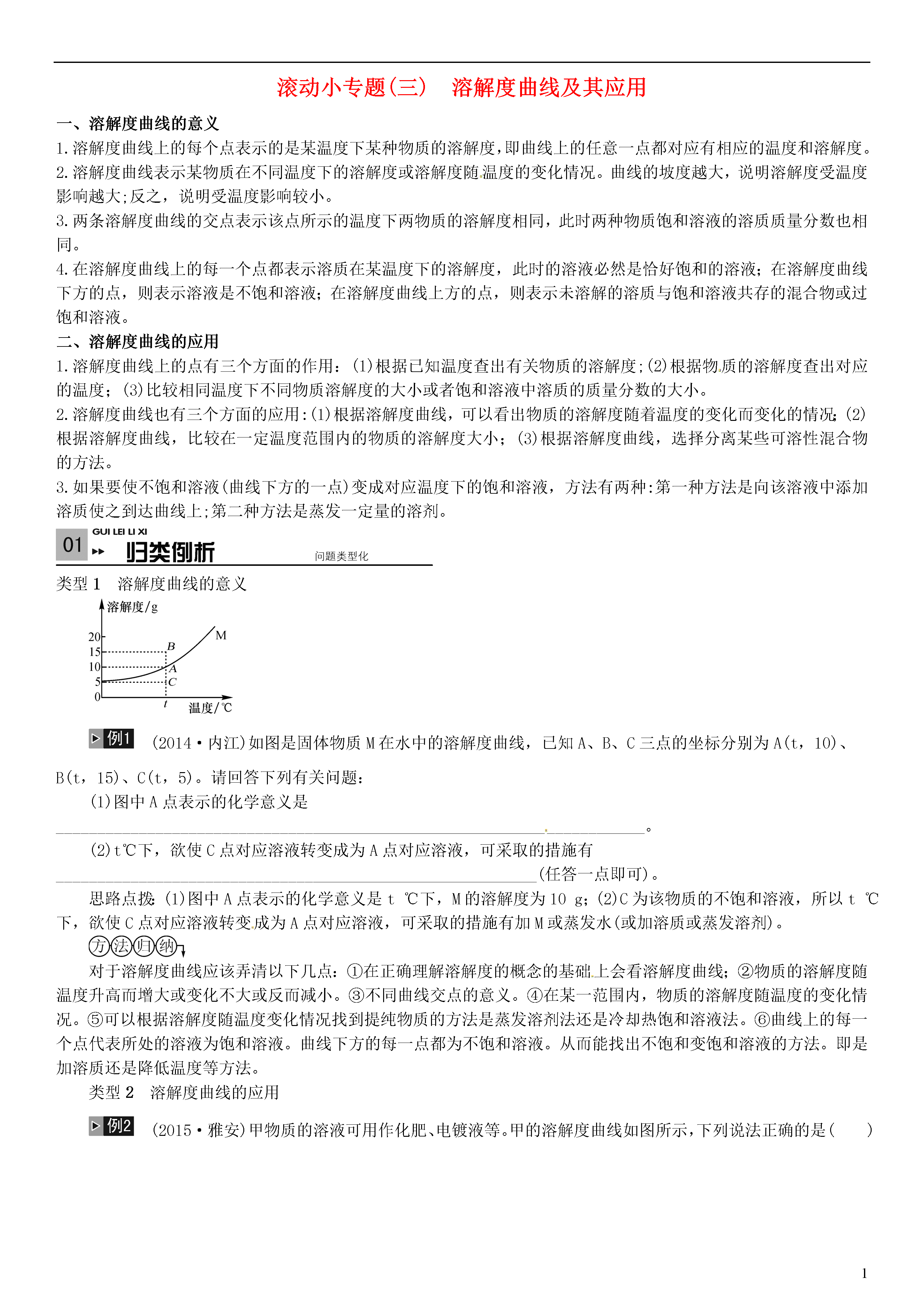 1滚动小专题(三)溶解度曲线及其应用一、溶解度曲线的意义1.溶解度曲线上的每个点表示的是某温度下某种物质的溶解度,即曲线上的任意一点都对应有相应的温度和溶解度。2.溶解度曲线表示某物质在不同温度下的溶解度或溶解度随温度的变化情况。曲线的坡度越大,说明溶解度受温度影响越大;反之,说明受温度影响较小。3.两条溶解度曲线的交点表示该点所示的温度下两物质的溶解度相同,此时两种物质饱和溶液的溶质质量分数也相同。4.在溶解度曲线上的每一个点都表示溶质在某温度下的溶解度,此时的溶液必然是恰好饱和的溶液;在溶解度曲线下方的点,则表示溶液是不饱和溶液;在溶解度曲线上方的点,则表示未溶解的溶质与饱和溶液共存的混合物或过饱和溶液。二、溶解度曲线的应用1.溶解度曲线上的点有三个方面的作用:(1)根据已知温度查出有关物质的溶解度;(2)根据物质的溶解度查出对应的温度;(3)比较相同温度下不同物质溶解度的大小或者饱和溶液中溶质的质量分数的大小。2.溶解度曲线也有三个方面的应用:(1)根据溶解度曲线,可以看出物质的溶解度随着温度的变化而变化的情况;(2)根据溶解度曲线,比较在一定温度范围内的物质的溶解度大小;(3)根据溶解度曲线,选择分离某些可溶性混合物的方法。3.如果要使不饱和溶液(曲线下方的一点)变成对应温度下的饱和溶液,方法有两种:第一种方法是向该溶液中添加溶质使之到达曲线上;第二种方法是蒸发一定量的溶剂。类型1溶解度曲线的意义(2014·内江)如图是固体物质M在水中的溶解度曲线,已知A、B、C三点的坐标分别为A(t,10)、B(t,15)、C(t,5)。请回答下列有关问题:(1)图中A点表示的化学意义是________________________________________________________________________。(2)t℃下,欲使C点对应溶液转变成为A点对应溶液,可采取的措施有___________________________________________________________(任答一点即可)。思路点拨:(1)图中A点表示的化学意义是t℃下,M的溶解度为10g;(2)C为该物质的不饱和溶液,所以t℃下,欲使C点对应溶液转变成为A点对应溶液,可采取的措施有加M或蒸发水(或加溶质或蒸发溶剂)。对于溶解度曲线应该弄清以下几点:①在正确理解溶解度的概念的基础上会看溶解度曲线;②物质的溶解度随温度升高而增大或变化不大或反而减小。③不同曲线交点的意义。④在某一范围内,物质的溶解度随温度的变化情况。⑤可以根据溶解度随温度变化情况找到提纯物质的方法是蒸发溶剂法还是冷却热饱和溶液法。⑥曲线上的每一个点代表所处的溶液为饱和溶液。曲线下方的每一点都为不饱和溶液。从而能找出不饱和变饱和溶液的方法。即是加溶质还是降低温度等方法。类型2溶解度曲线的应用(2015·雅安)甲物质的溶液可用作化肥、电镀液等。甲的溶解度曲线如图所示,下列说法正确的是()A.甲的溶解度是102.5gB.甲的溶解度随温度的升高而增大C.20℃时,100g甲的饱和溶液中溶质质量为28.6gD.将70℃甲的饱和溶液升高温度或降低温度,都有晶体析出思路点拨:甲的溶解度是102.5g是错误的,因为没有指明温度;甲固体物质的溶解度,在0℃~70℃时,是随温度升高而增大,而大于70℃时,溶解度随温度的升高而减少;20℃时,128.6g甲的饱和溶液中溶质质量为28.6g,不是100g;因为甲在0℃~70℃时,是随温度升高而增大,而大于70℃时,溶解度随温度的升高而减少,所以将70℃甲的饱和溶液升高温度或降低温度,都有晶体析出。一、选择题1.(2015·宜宾)右图为甲、乙两种盐的溶解度曲线。下列说法正确的是()A.甲、乙两种物质的溶解度都不相等B.将接近饱和的甲溶液变为饱和溶液,可采用蒸发或降温的方法C.t1℃时,甲、乙两种物质的饱和溶液中,溶质质量分数均为15%D.t2℃时,将30克乙物质放入100水中,所得溶质的质量为130克2.(2015·眉山)如图所示,甲图表示氯化钠在水中的溶解度曲线,乙图表示硝酸钾在水中的溶解度曲线。下列说法错误的是()A.由甲图可知,氯化钠在40℃时的溶解度为36.6gB.由乙可知,硝酸钾在水中的溶解度随温度的升高而增大C.比较甲乙可知,可采用蒸发结晶来提纯混有少量氯化钠的硝酸钾晶体D.比较甲乙可知,相同温度下影响固体溶质溶解度的因素是溶质的性质3.(2015·呼和浩特)20℃时,将等质量的a、b两种固体,分别加入到盛有100g水的烧杯中,充分搅拌后现象如图甲,升温到50℃时,现象如图乙,a、b两种固体的溶解度曲线如图丙。下列说法正确的是()