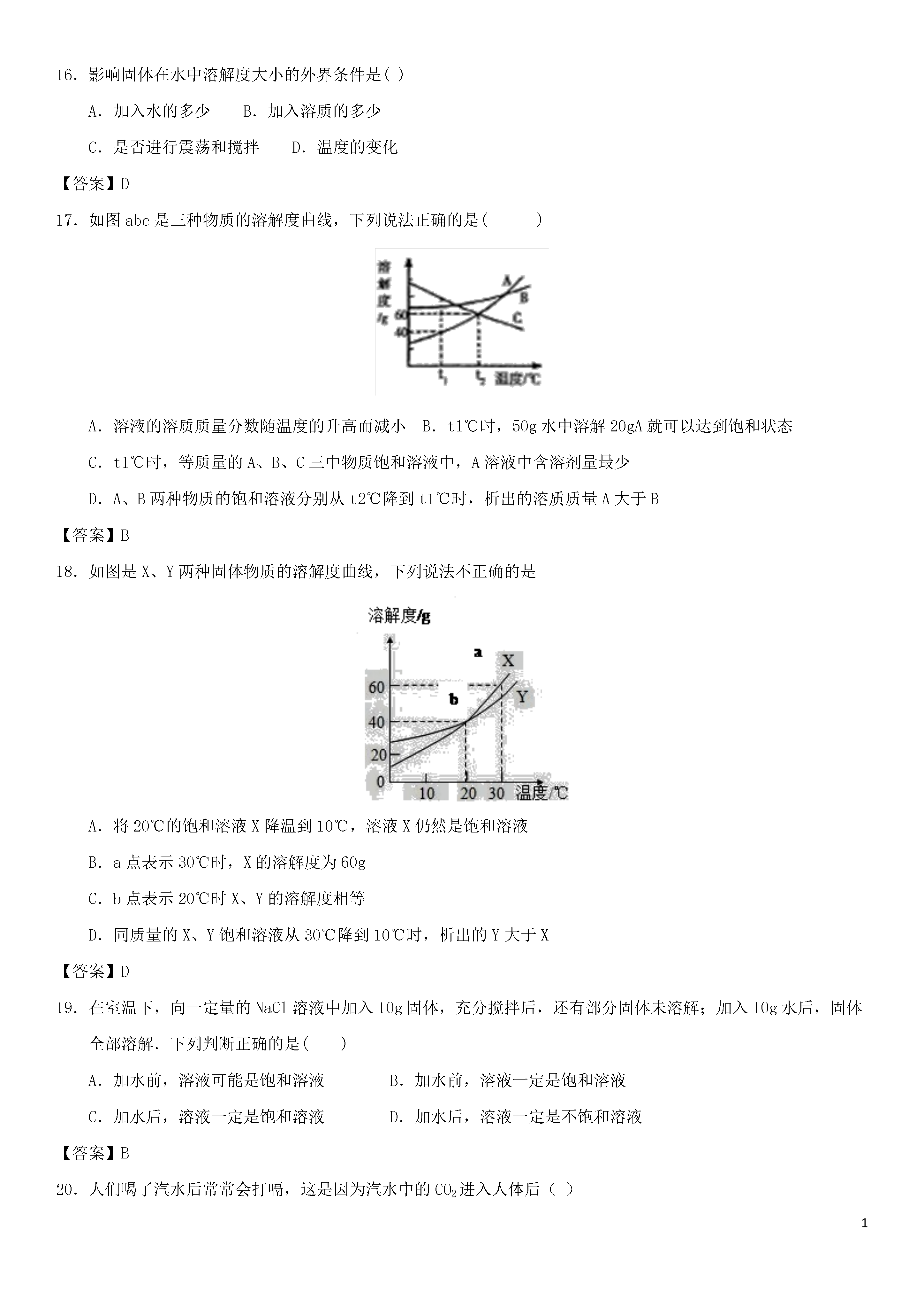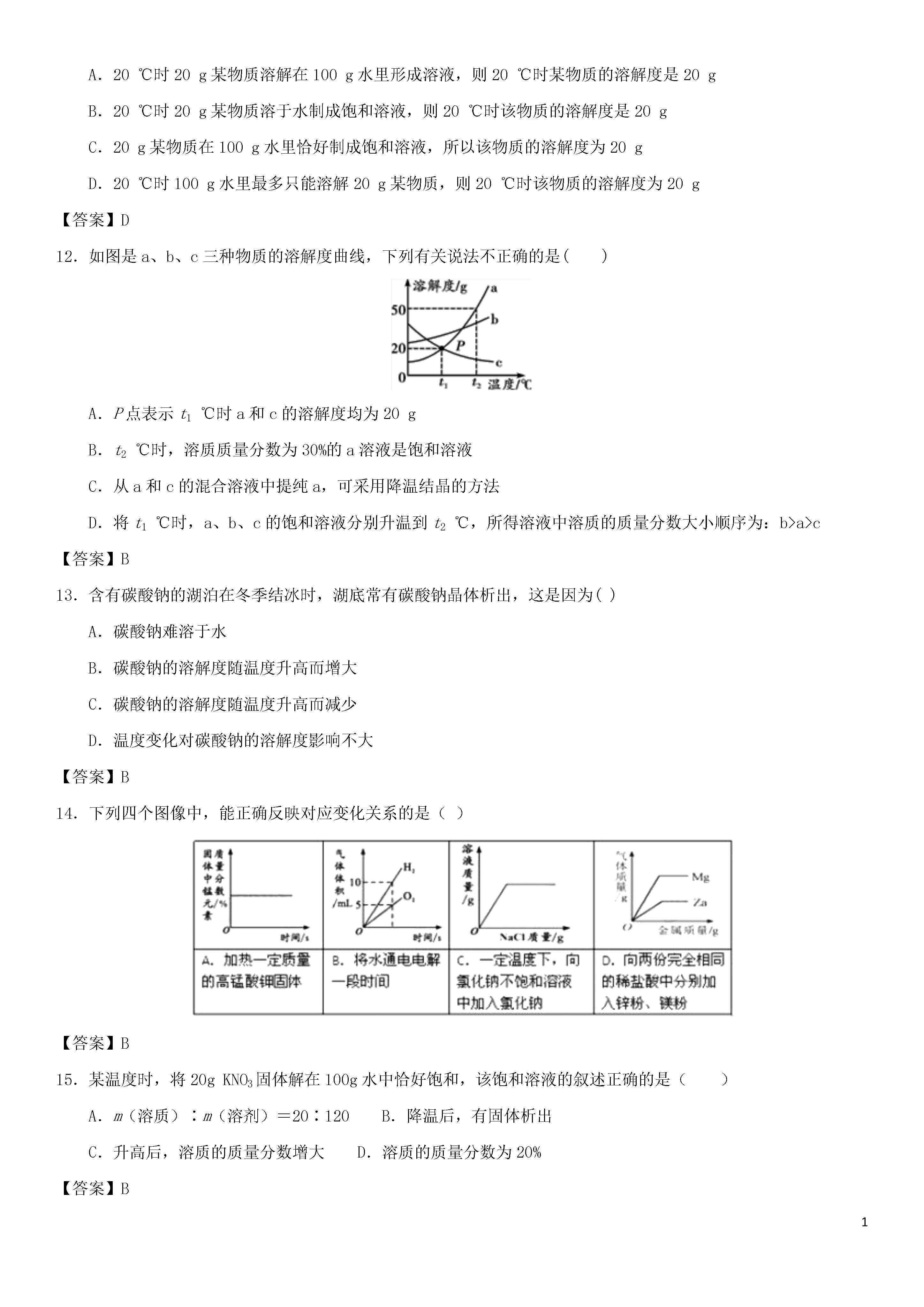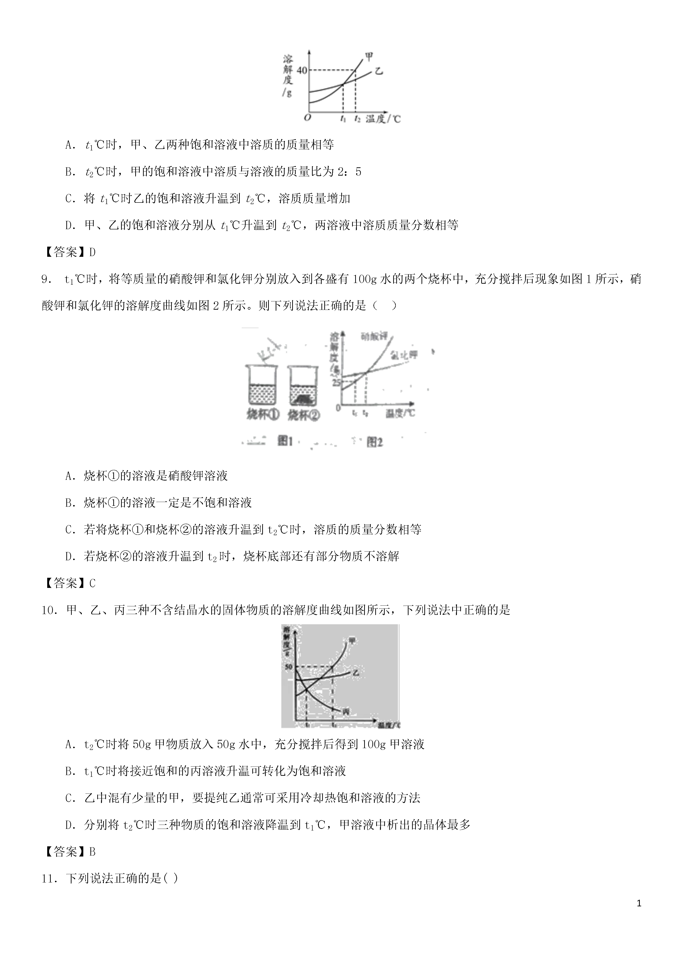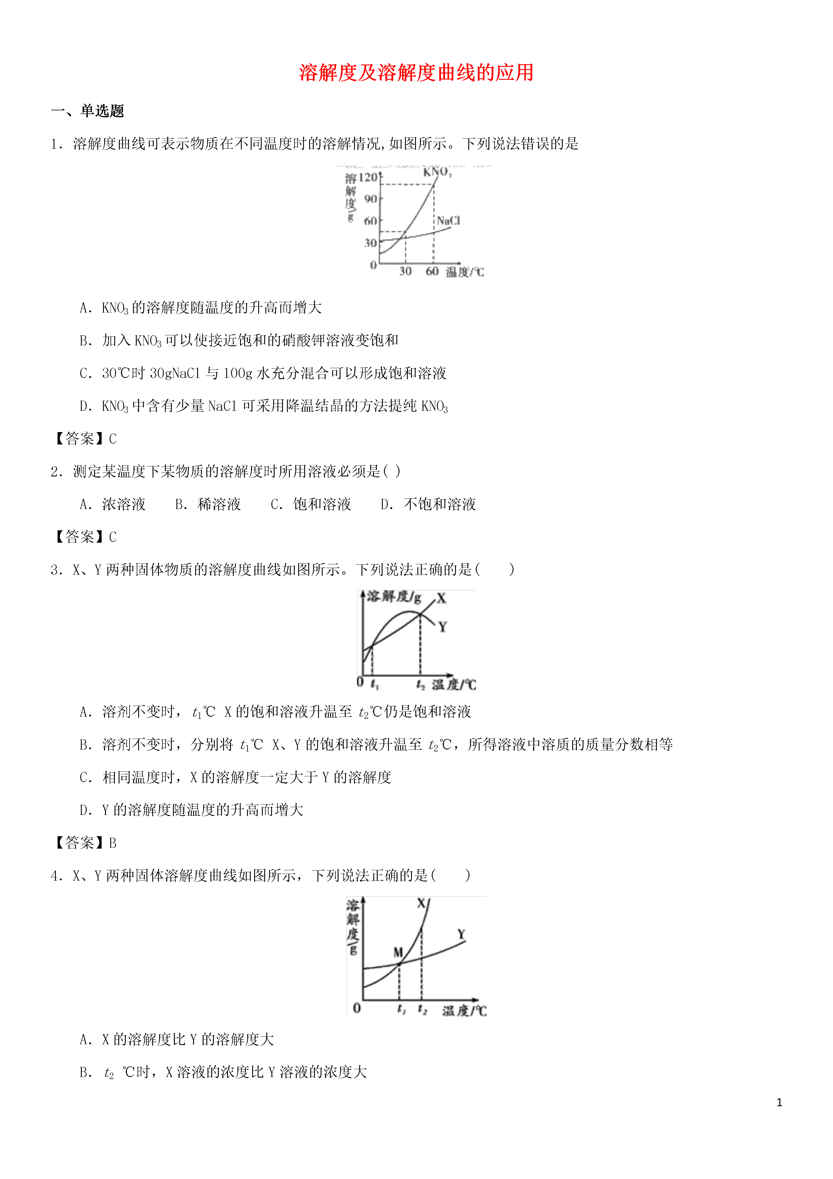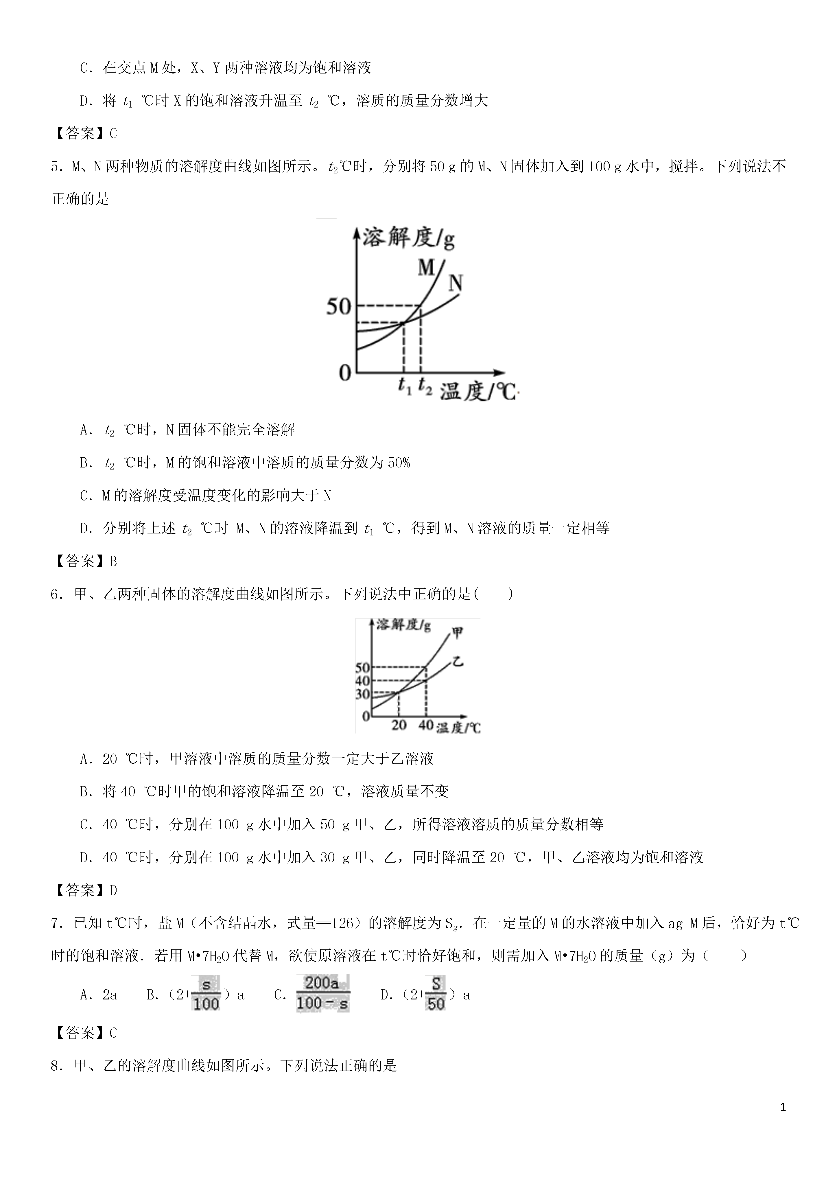 1溶解度及溶解度曲线的应用一、单选题1.溶解度曲线可表示物质在不同温度时的溶解情况,如图所示。下列说法错误的是A.KNO3的溶解度随温度的升高而增大B.加入KNO3可以使接近饱和的硝酸钾溶液变饱和C.30℃时30gNaCl与100g水充分混合可以形成饱和溶液D.KNO3中含有少量NaCl可采用降温结晶的方法提纯KNO3【答案】C2.测定某温度下某物质的溶解度时所用溶液必须是()A.浓溶液B.稀溶液C.饱和溶液D.不饱和溶液【答案】C3.X、Y两种固体物质的溶解度曲线如图所示。下列说法正确的是()A.溶剂不变时,t1℃X的饱和溶液升温至t2℃仍是饱和溶液B.溶剂不变时,分别将t1℃X、Y的饱和溶液升温至t2℃,所得溶液中溶质的质量分数相等C.相同温度时,X的溶解度一定大于Y的溶解度D.Y的溶解度随温度的升高而增大【答案】B4.X、Y两种固体溶解度曲线如图所示,下列说法正确的是()A.X的溶解度比Y的溶解度大B.t2℃时,X溶液的浓度比Y溶液的浓度大C.在交点M处,X、Y两种溶液均为饱和溶液D.将t1℃时X的饱和溶液升温至t2℃,溶质的质量分数增大【答案】C5.M、N两种物质的溶解度曲线如图所示。t2℃时,分别将50g的M、N固体加入到100g水中,搅拌。下列说法不正确的是A.t2℃时,N固体不能完全溶解B.t2℃时,M的饱和溶液中溶质的质量分数为50%C.M的溶解度受温度变化的影响大于ND.分别将上述t2℃时M、N的溶液降温到t1℃,得到M、N溶液的质量一定相等【答案】B6.甲、乙两种固体的溶解度曲线如图所示。下列说法中正确的是()A.20℃时,甲溶液中溶质的质量分数一定大于乙溶液B.将40℃时甲的饱和溶液降温至20℃,溶液质量不变C.40℃时,分别在100g水中加入50g甲、乙,所得溶液溶质的质量分数相等D.40℃时,分别在100g水中加入30g甲、乙,同时降温至20℃,甲、乙溶液均为饱和溶液【答案】D7.已知t℃时,盐M(不含结晶水,式量═126)的溶解度为Sg.在一定量的M的水溶液中加入agM后,恰好为t℃时的饱和溶液.若用M•7H2O代替M,欲使原溶液在t℃时恰好饱和,则需加入M•7H2O的质量(g)为()A.2aB.(2+)aC.D.(2+)a【答案】C8.甲、乙的溶解度曲线如图所示。下列说法正确的是A.t1℃时,甲、乙两种饱和溶液中溶质的质量相等B.t2℃时,甲的饱和溶液中溶质与溶液的质量比为2:5C.将t1℃时乙的饱和溶液升温到t2℃,溶质质量增加D.甲、乙的饱和溶液分别从t1℃升温到t2℃,两溶液中溶质质量分数相等【答案】D9.t1℃时,将等质量的硝酸钾和氯化钾分别放入到各盛有100g水的两个烧杯中,充分搅拌后现象如图1所示,硝酸钾和氯化钾的溶解度曲线如图2所示。则下列说法正确的是()A.烧杯①的溶液是硝酸钾溶液B.烧杯①的溶液一定是不饱和溶液C.若将烧杯①和烧杯②的溶液升温到t2℃时,溶质的质量分数相等D.若烧杯②的溶液升温到t2时,烧杯底部还有部分物质不溶解【答案】C10.甲、乙、丙三种不含结晶水的固体物质的溶解度曲线如图所示,下列说法中正确的是A.t2℃时将50g甲物质放入50g水中,充分搅拌后得到100g甲溶液B.t1℃时将接近饱和的丙溶液升温可转化为饱和溶液C.乙中混有少量的甲,要提纯乙通常可采用冷却热饱和溶液的方法D.分别将t2℃时三种物质的饱和溶液降温到t1℃,甲溶液中析出的晶体最多【答案】B11.下列说法正确的是()A.20℃时20g某物质溶解在100g水里形成溶液,则20℃时某物质的溶解度是20gB.20℃时20g某物质溶于水制成饱和溶液,则20℃时该物质的溶解度是20gC.20g某物质在100g水里恰好制成饱和溶液,所以该物质的溶解度为20gD.20℃时100g水里最多只能溶解20g某物质,则20℃时该物质的溶解度为20g【答案】D12.如图是a、b、c三种物质的溶解度曲线,下列有关说法不正确的是()A.P点表示t1℃时a和c的溶解度均为20gB.t2℃时,溶质质量分数为30%的a溶液是饱和溶液C.从a和c的混合溶液中提纯a,可采用降温结晶的方法D.将t1℃时,a、b、c的饱和溶液分别升温到t2℃,所得溶液中溶质的质量分数大小顺序为:b>a>c【答案】B13.含有碳酸钠的湖泊在冬季结冰时,湖底常有碳酸钠晶体析出,这是因为()A.碳酸钠难溶于水B.碳酸钠的溶解度随温度升高而增大C.碳酸钠的溶解度随温度升高而减少D.温度变化对碳酸钠的溶解度影响不大【答案】B14.下列四个图像中,能正确反映对应变化关系的是()【答案】B1