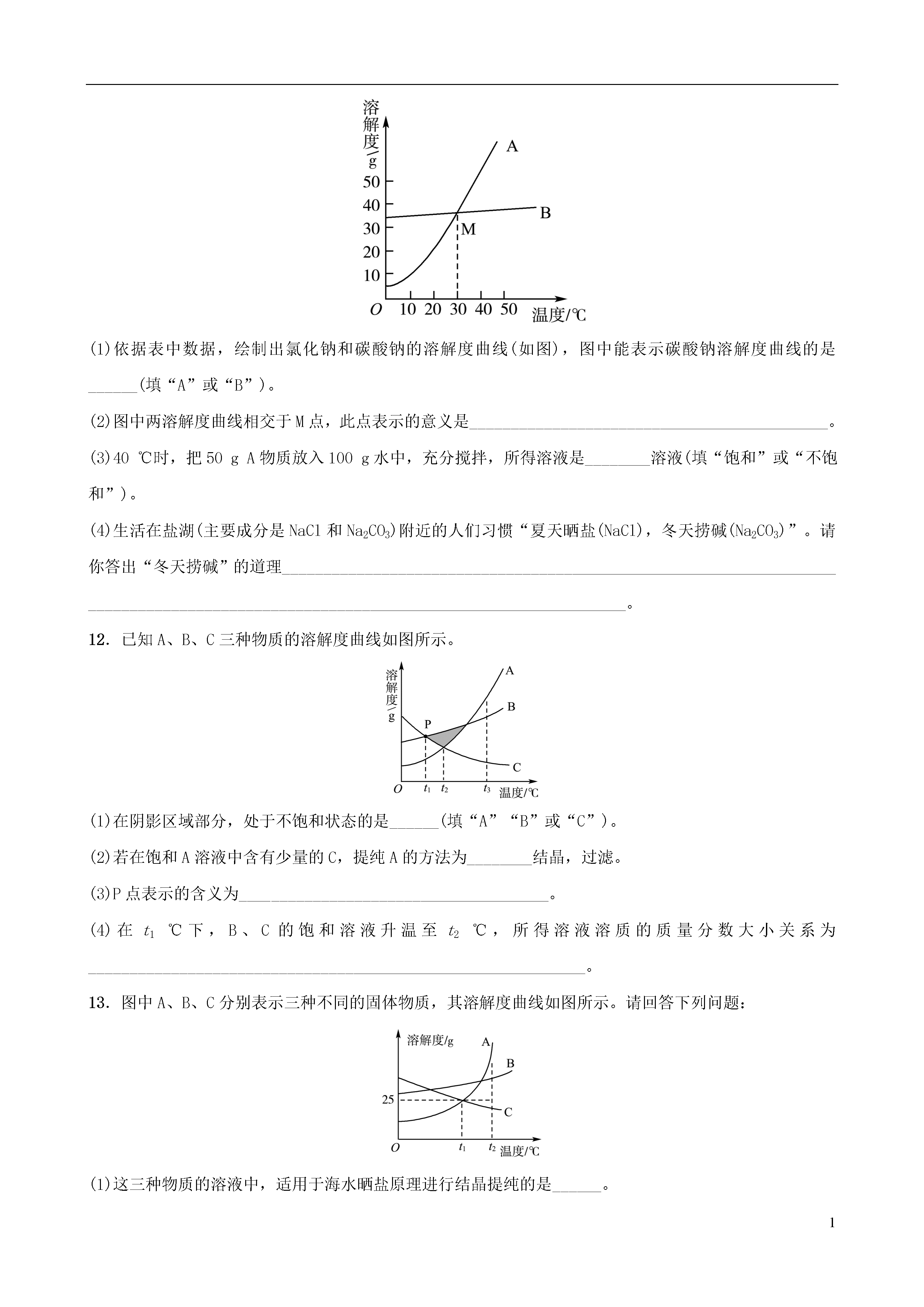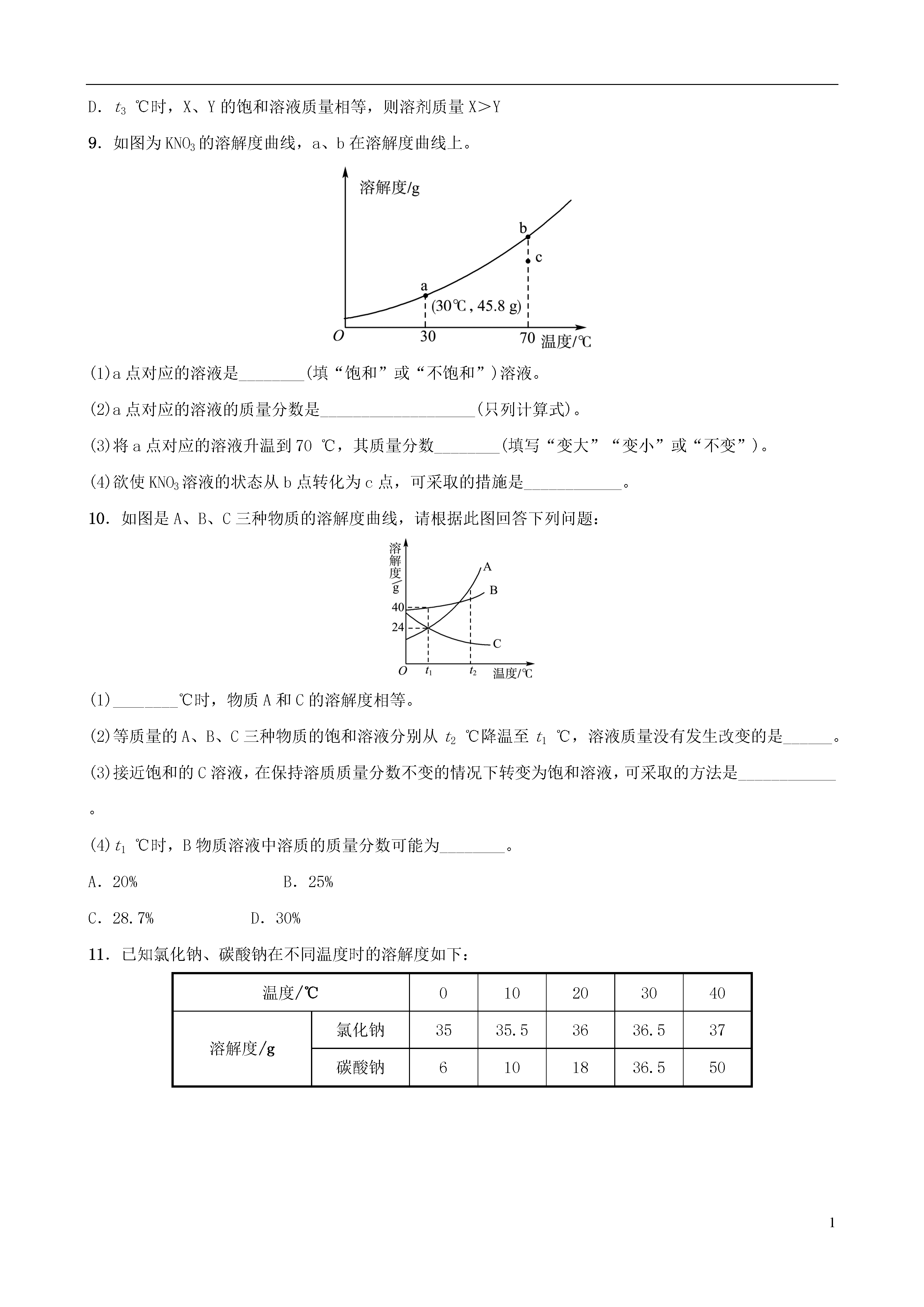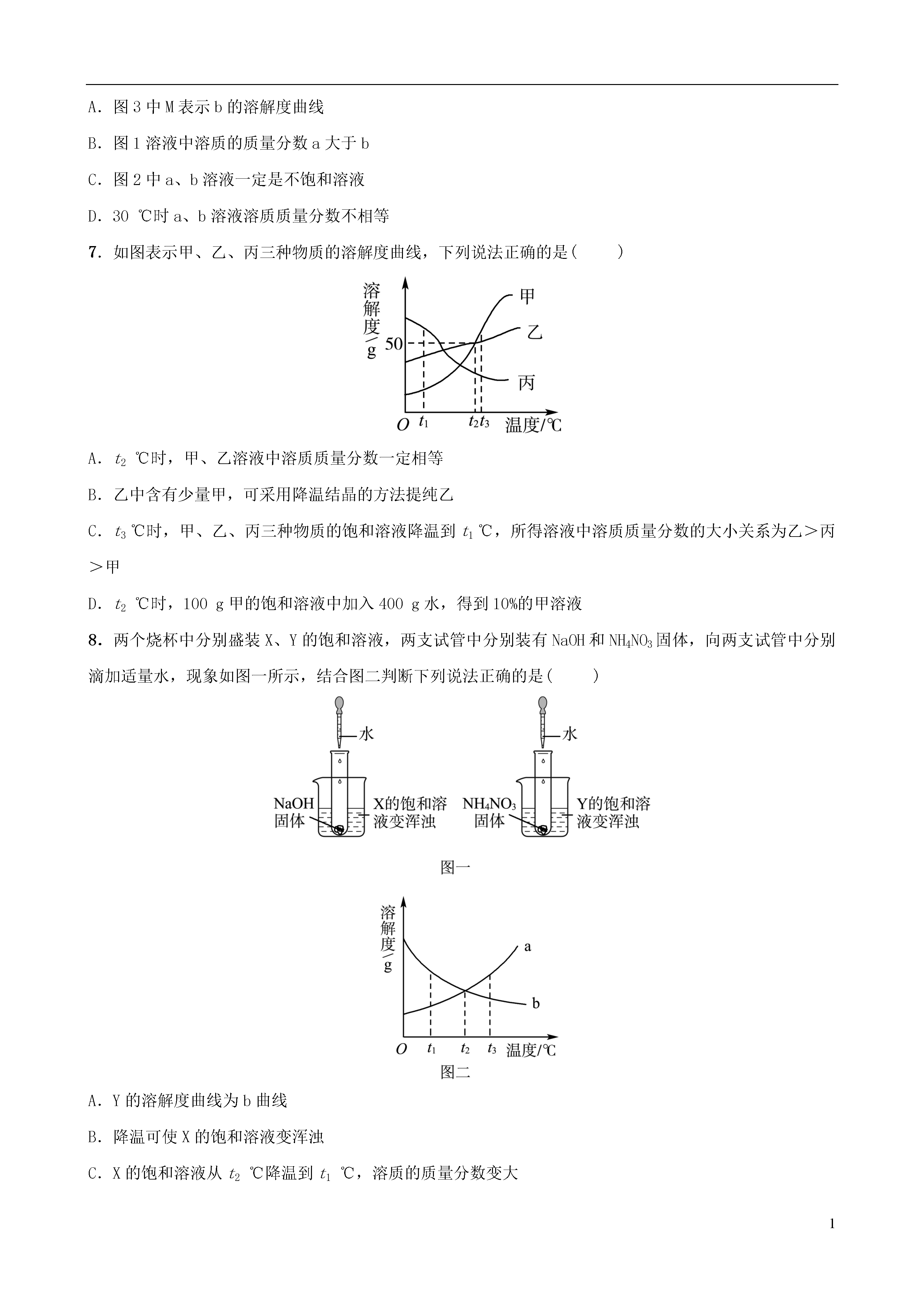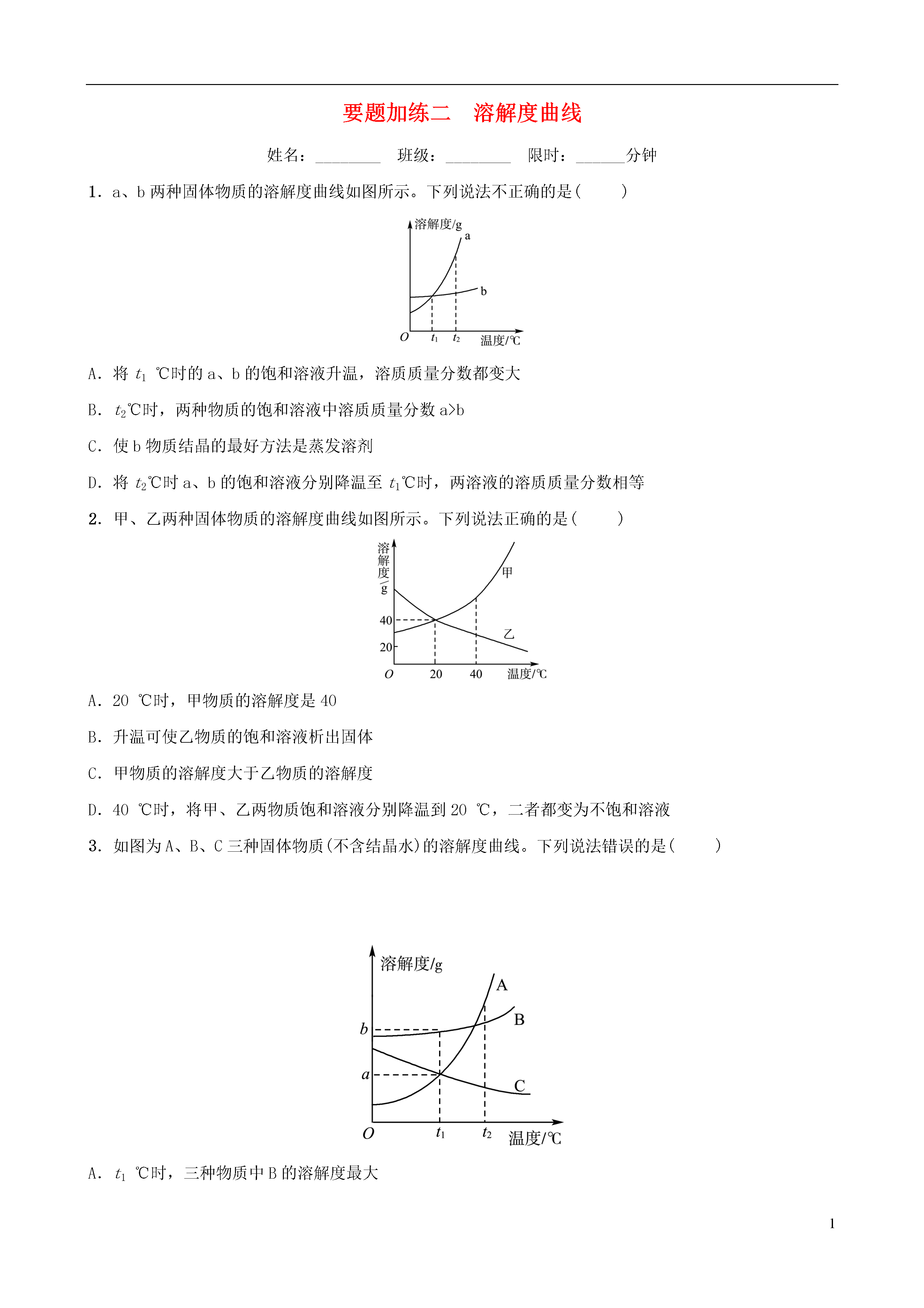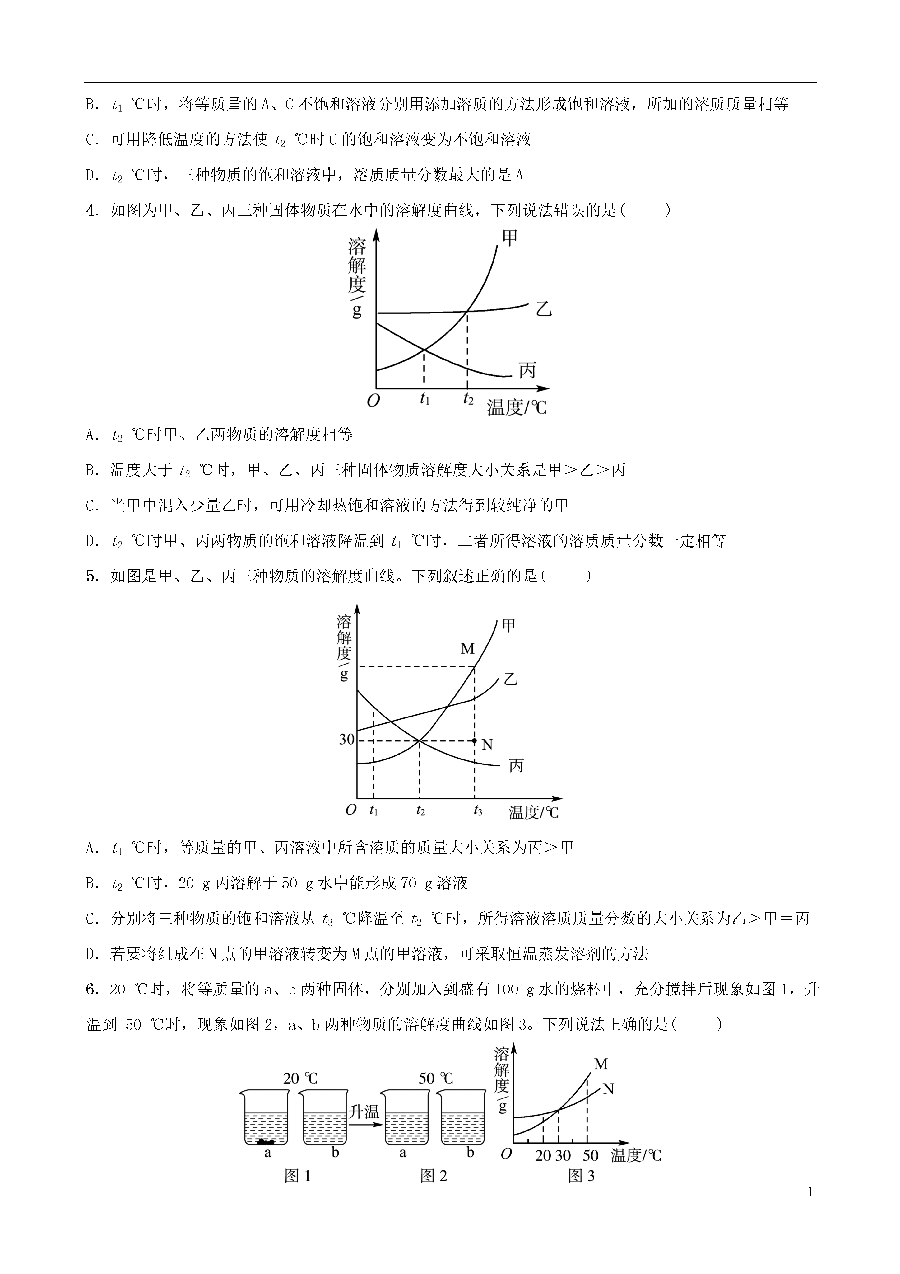 1要题加练二溶解度曲线姓名:________班级:________限时:______分钟1.a、b两种固体物质的溶解度曲线如图所示。下列说法不正确的是()A.将t1℃时的a、b的饱和溶液升温,溶质质量分数都变大B.t2℃时,两种物质的饱和溶液中溶质质量分数a>bC.使b物质结晶的最好方法是蒸发溶剂D.将t2℃时a、b的饱和溶液分别降温至t1℃时,两溶液的溶质质量分数相等2.甲、乙两种固体物质的溶解度曲线如图所示。下列说法正确的是()A.20℃时,甲物质的溶解度是40B.升温可使乙物质的饱和溶液析出固体C.甲物质的溶解度大于乙物质的溶解度D.40℃时,将甲、乙两物质饱和溶液分别降温到20℃,二者都变为不饱和溶液3.如图为A、B、C三种固体物质(不含结晶水)的溶解度曲线。下列说法错误的是()A.t1℃时,三种物质中B的溶解度最大B.t1℃时,将等质量的A、C不饱和溶液分别用添加溶质的方法形成饱和溶液,所加的溶质质量相等C.可用降低温度的方法使t2℃时C的饱和溶液变为不饱和溶液D.t2℃时,三种物质的饱和溶液中,溶质质量分数最大的是A4.如图为甲、乙、丙三种固体物质在水中的溶解度曲线,下列说法错误的是()A.t2℃时甲、乙两物质的溶解度相等B.温度大于t2℃时,甲、乙、丙三种固体物质溶解度大小关系是甲>乙>丙C.当甲中混入少量乙时,可用冷却热饱和溶液的方法得到较纯净的甲D.t2℃时甲、丙两物质的饱和溶液降温到t1℃时,二者所得溶液的溶质质量分数一定相等5.如图是甲、乙、丙三种物质的溶解度曲线。下列叙述正确的是()A.t1℃时,等质量的甲、丙溶液中所含溶质的质量大小关系为丙>甲B.t2℃时,20g丙溶解于50g水中能形成70g溶液C.分别将三种物质的饱和溶液从t3℃降温至t2℃时,所得溶液溶质质量分数的大小关系为乙>甲=丙D.若要将组成在N点的甲溶液转变为M点的甲溶液,可采取恒温蒸发溶剂的方法6.20℃时,将等质量的a、b两种固体,分别加入到盛有100g水的烧杯中,充分搅拌后现象如图1,升温到50℃时,现象如图2,a、b两种物质的溶解度曲线如图3。下列说法正确的是()A.图3中M表示b的溶解度曲线B.图1溶液中溶质的质量分数a大于bC.图2中a、b溶液一定是不饱和溶液D.30℃时a、b溶液溶质质量分数不相等7.如图表示甲、乙、丙三种物质的溶解度曲线,下列说法正确的是()A.t2℃时,甲、乙溶液中溶质质量分数一定相等B.乙中含有少量甲,可采用降温结晶的方法提纯乙C.t3℃时,甲、乙、丙三种物质的饱和溶液降温到t1℃,所得溶液中溶质质量分数的大小关系为乙>丙>甲D.t2℃时,100g甲的饱和溶液中加入400g水,得到10%的甲溶液8.两个烧杯中分别盛装X、Y的饱和溶液,两支试管中分别装有NaOH和NH4NO3固体,向两支试管中分别滴加适量水,现象如图一所示,结合图二判断下列说法正确的是()A.Y的溶解度曲线为b曲线B.降温可使X的饱和溶液变浑浊C.X的饱和溶液从t2℃降温到t1℃,溶质的质量分数变大D.t3℃时,X、Y的饱和溶液质量相等,则溶剂质量X>Y9.如图为KNO3的溶解度曲线,a、b在溶解度曲线上。(1)a点对应的溶液是________(填“饱和”或“不饱和”)溶液。(2)a点对应的溶液的质量分数是___________________(只列计算式)。(3)将a点对应的溶液升温到70℃,其质量分数________(填写“变大”“变小”或“不变”)。(4)欲使KNO3溶液的状态从b点转化为c点,可采取的措施是____________。10.如图是A、B、C三种物质的溶解度曲线,请根据此图回答下列问题:(1)________℃时,物质A和C的溶解度相等。(2)等质量的A、B、C三种物质的饱和溶液分别从t2℃降温至t1℃,溶液质量没有发生改变的是______。(3)接近饱和的C溶液,在保持溶质质量分数不变的情况下转变为饱和溶液,可采取的方法是____________。(4)t1℃时,B物质溶液中溶质的质量分数可能为________。A.20%B.25%C.28.7%D.30%11.已知氯化钠、碳酸钠在不同温度时的溶解度如下:温度/℃010203040溶解度/g氯化钠3535.53636.537碳酸钠6101836.550(1)依据表中数据,绘制出氯化钠和碳酸钠的溶解度曲线(如图),图中能表示碳酸钠溶解度曲线的是______(填“A”或“B”)。(2)图中两溶解度曲线相交于M点,此点表示的意义是____________________________________________。(