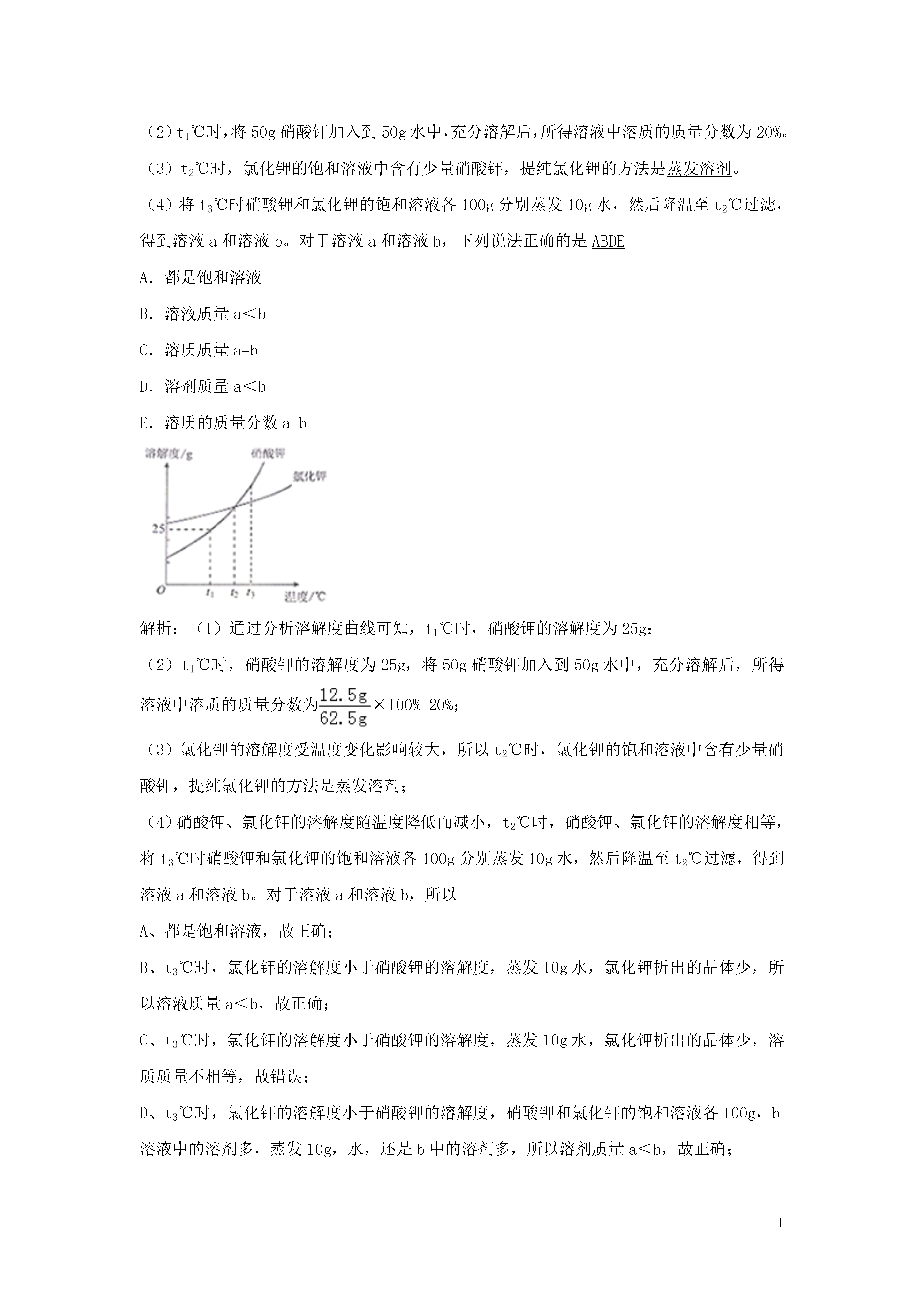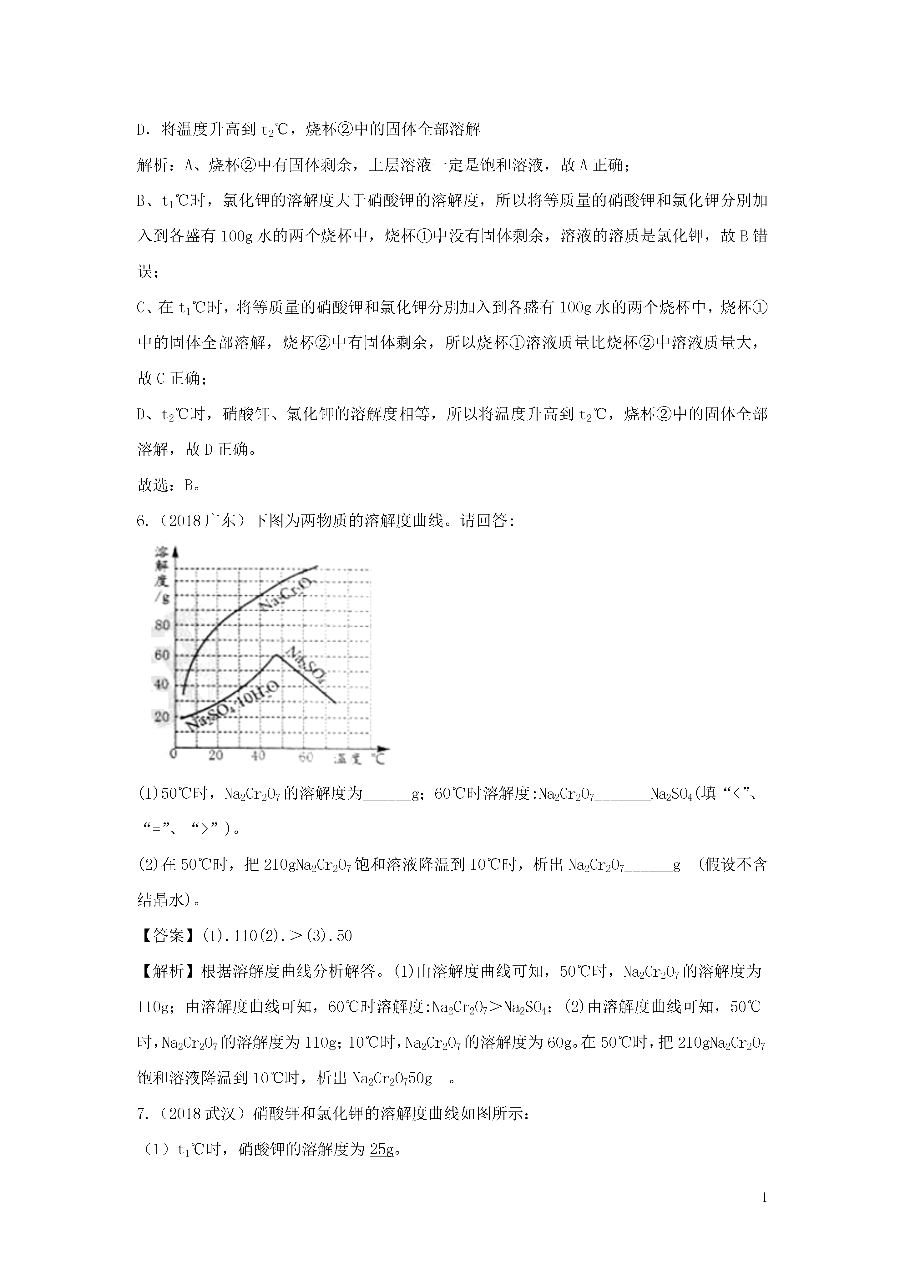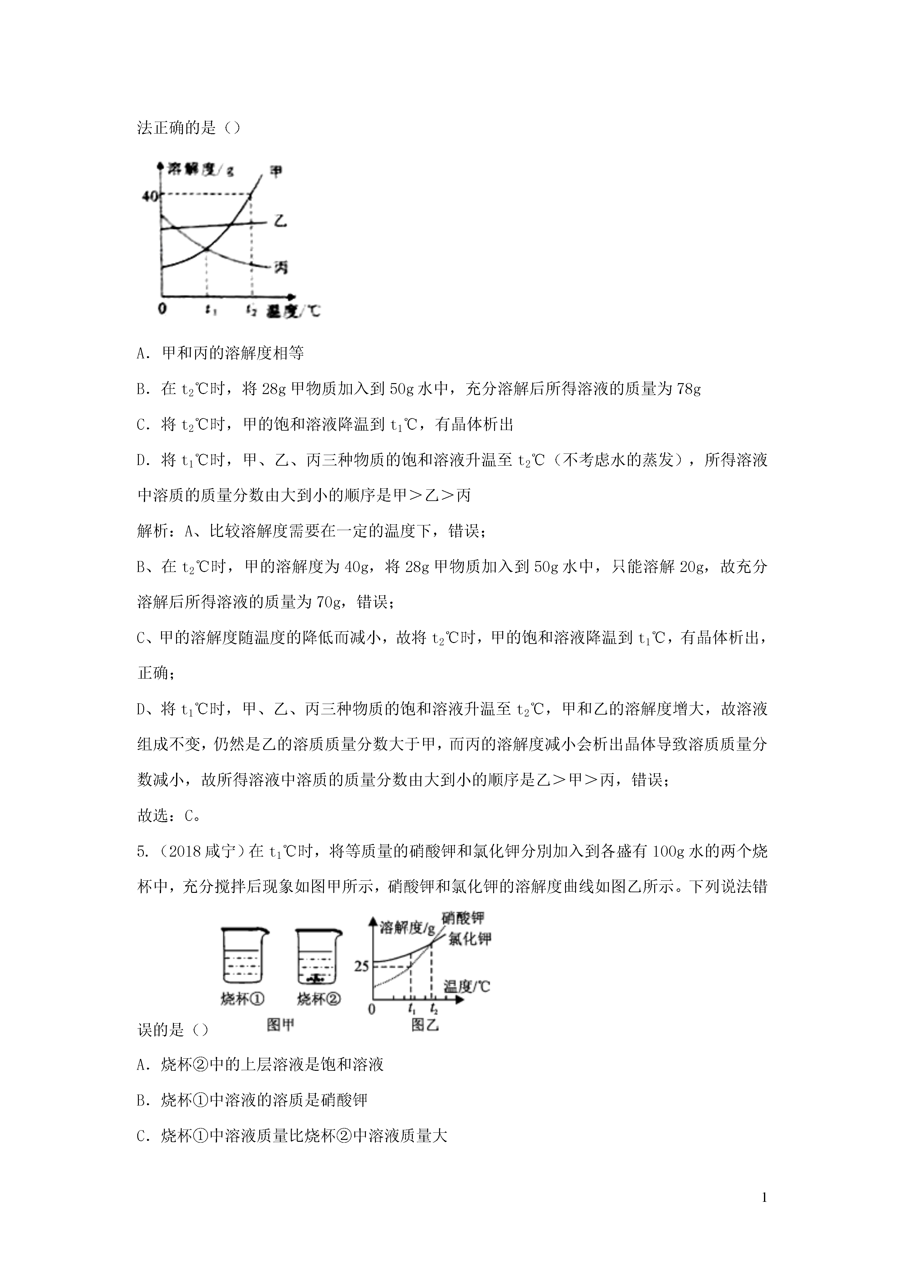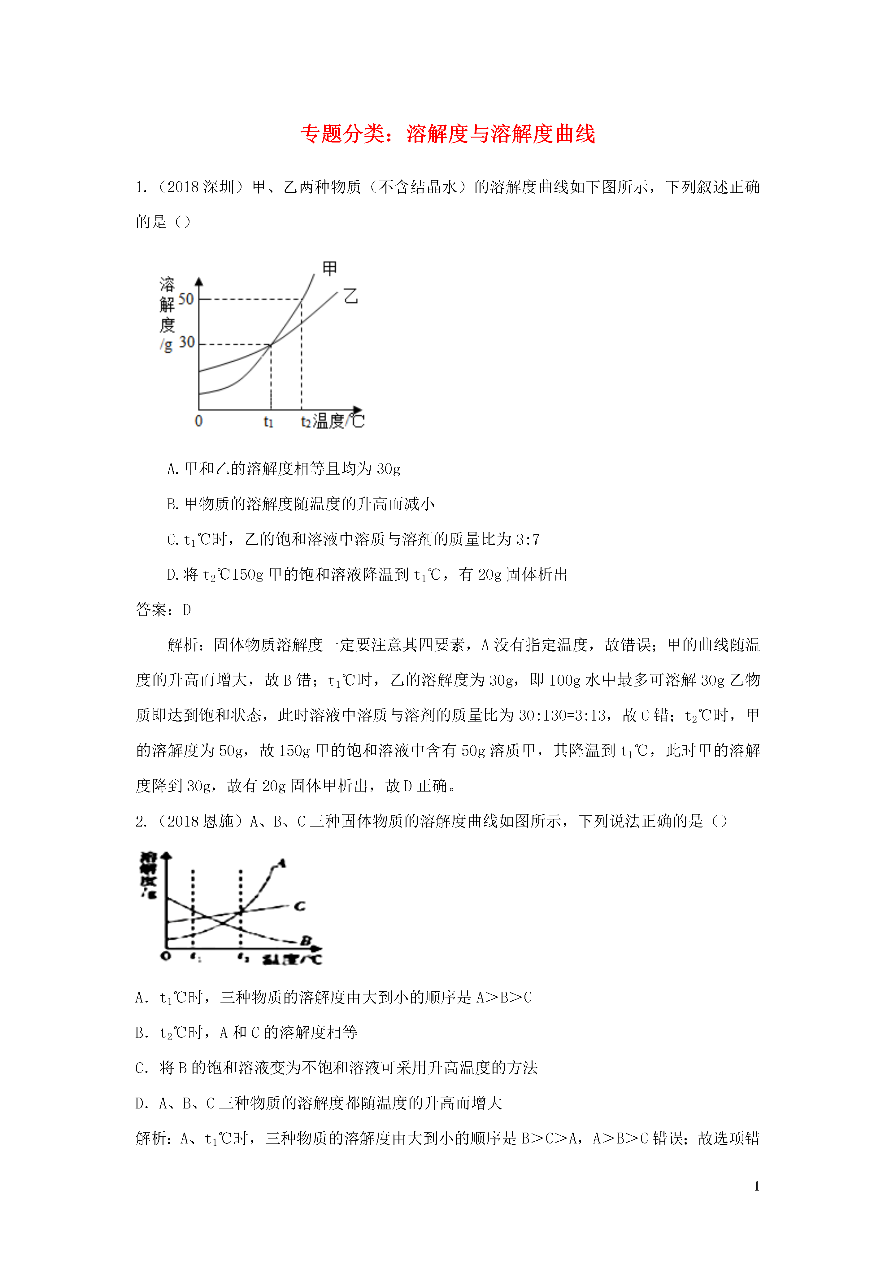 1专题分类:溶解度与溶解度曲线1.(2018深圳)甲、乙两种物质(不含结晶水)的溶解度曲线如下图所示,下列叙述正确的是()A.甲和乙的溶解度相等且均为30gB.甲物质的溶解度随温度的升高而减小C.t1℃时,乙的饱和溶液中溶质与溶剂的质量比为3:7D.将t2℃150g甲的饱和溶液降温到t1℃,有20g固体析出答案:D解析:固体物质溶解度一定要注意其四要素,A没有指定温度,故错误;甲的曲线随温度的升高而增大,故B错;t1℃时,乙的溶解度为30g,即100g水中最多可溶解30g乙物质即达到饱和状态,此时溶液中溶质与溶剂的质量比为30:130=3:13,故C错;t2℃时,甲的溶解度为50g,故150g甲的饱和溶液中含有50g溶质甲,其降温到t1℃,此时甲的溶解度降到30g,故有20g固体甲析出,故D正确。2.(2018恩施)A、B、C三种固体物质的溶解度曲线如图所示,下列说法正确的是()A.t1℃时,三种物质的溶解度由大到小的顺序是A>B>CB.t2℃时,A和C的溶解度相等C.将B的饱和溶液变为不饱和溶液可采用升高温度的方法D.A、B、C三种物质的溶解度都随温度的升高而增大解析:A、t1℃时,三种物质的溶解度由大到小的顺序是B>C>A,A>B>C错误;故选项错误;B、t2℃时,A和C的溶解度相等正确,因为该温度下它们有交点;故选项正确;C、将B的饱和溶液变为不饱和溶液可采用升高温度的方法错误,因为B的溶解度随温度的升高而减少;故选项错误;D、A、B、C三种物质的溶解度都随温度的升高而增大错误,因为B的溶解度随温度的升高而减少;故选项错误;故选:B。3.(2018宜昌)甲乙丙三种物质均不含结晶水,溶解度曲线如下图所示,下列分析错误的是A.甲中含有杂质乙,可采用加水溶解、蒸发浓缩、冷却结晶、过滤的方法提纯甲B.将A点降温到t1℃甲、乙、丙均变为不饱和溶液C.t2℃时,甲、乙、丙饱和溶液中,丙质量分数最大D.将甲中A点变成B点可采用恒温蒸发溶剂的方法【答案】B【解析】A.对于溶解度受温度影响较大的物质,从溶液中结晶析出的方法是冷却热饱和溶液,如果溶解度受温度影响不大的物质从溶液中结晶析出的方法是蒸发溶剂,因为甲的溶解度受温度影响较大,可用降温结晶法,所以甲中含有杂质乙,可采用加水溶解、蒸发浓缩、冷却结晶、过滤的方法提纯甲,正确;B.将A点降温到t1℃时,甲、乙的溶解度变小,有晶体析出,丙溶解度增大,变为不饱和溶液,错误;C.t2℃时,甲、乙、丙的溶解度大小关系是:丙>甲=乙,所以饱和溶液中,丙质量分数最大,正确;D.A点是不饱和溶液,B点是饱和溶液,将甲的不饱和溶液变成饱和溶液,可采用恒温蒸发溶剂的方法,正确。故选B。4.(2018孝感)如图是甲、乙、两三种固体物质(均不含结晶水)的溶解度曲线。下列说法正确的是()A.甲和丙的溶解度相等B.在t2℃时,将28g甲物质加入到50g水中,充分溶解后所得溶液的质量为78gC.将t2℃时,甲的饱和溶液降温到t1℃,有晶体析出D.将t1℃时,甲、乙、丙三种物质的饱和溶液升温至t2℃(不考虑水的蒸发),所得溶液中溶质的质量分数由大到小的顺序是甲>乙>丙解析:A、比较溶解度需要在一定的温度下,错误;B、在t2℃时,甲的溶解度为40g,将28g甲物质加入到50g水中,只能溶解20g,故充分溶解后所得溶液的质量为70g,错误;C、甲的溶解度随温度的降低而减小,故将t2℃时,甲的饱和溶液降温到t1℃,有晶体析出,正确;D、将t1℃时,甲、乙、丙三种物质的饱和溶液升温至t2℃,甲和乙的溶解度增大,故溶液组成不变,仍然是乙的溶质质量分数大于甲,而丙的溶解度减小会析出晶体导致溶质质量分数减小,故所得溶液中溶质的质量分数由大到小的顺序是乙>甲>丙,错误;故选:C。5.(2018咸宁)在t1℃时,将等质量的硝酸钾和氯化钾分別加入到各盛有100g水的两个烧杯中,充分搅拌后现象如图甲所示,硝酸钾和氯化钾的溶解度曲线如图乙所示。下列说法错误的是()A.烧杯②中的上层溶液是饱和溶液B.烧杯①中溶液的溶质是硝酸钾C.烧杯①中溶液质量比烧杯②中溶液质量大D.将温度升高到t2℃,烧杯②中的固体全部溶解解析:A、烧杯②中有固体剩余,上层溶液一定是饱和溶液,故A正确;B、t1℃时,氯化钾的溶解度大于硝酸钾的溶解度,所以将等质量的硝酸钾和氯化钾分別加入到各盛有100g水的两个烧杯中,烧杯①中没有固体剩余,溶液的溶质是氯化钾,故B错误;C、在t1℃时,将等质量的硝酸钾和氯化钾分別加入到各盛有100g水的两个烧杯中,烧杯①中的固体全部溶解,烧杯②中有固体剩余,所以烧杯①溶液质量比烧杯②中溶液质量大,故C正确;D、t2℃时,硝酸钾、氯化钾的溶
