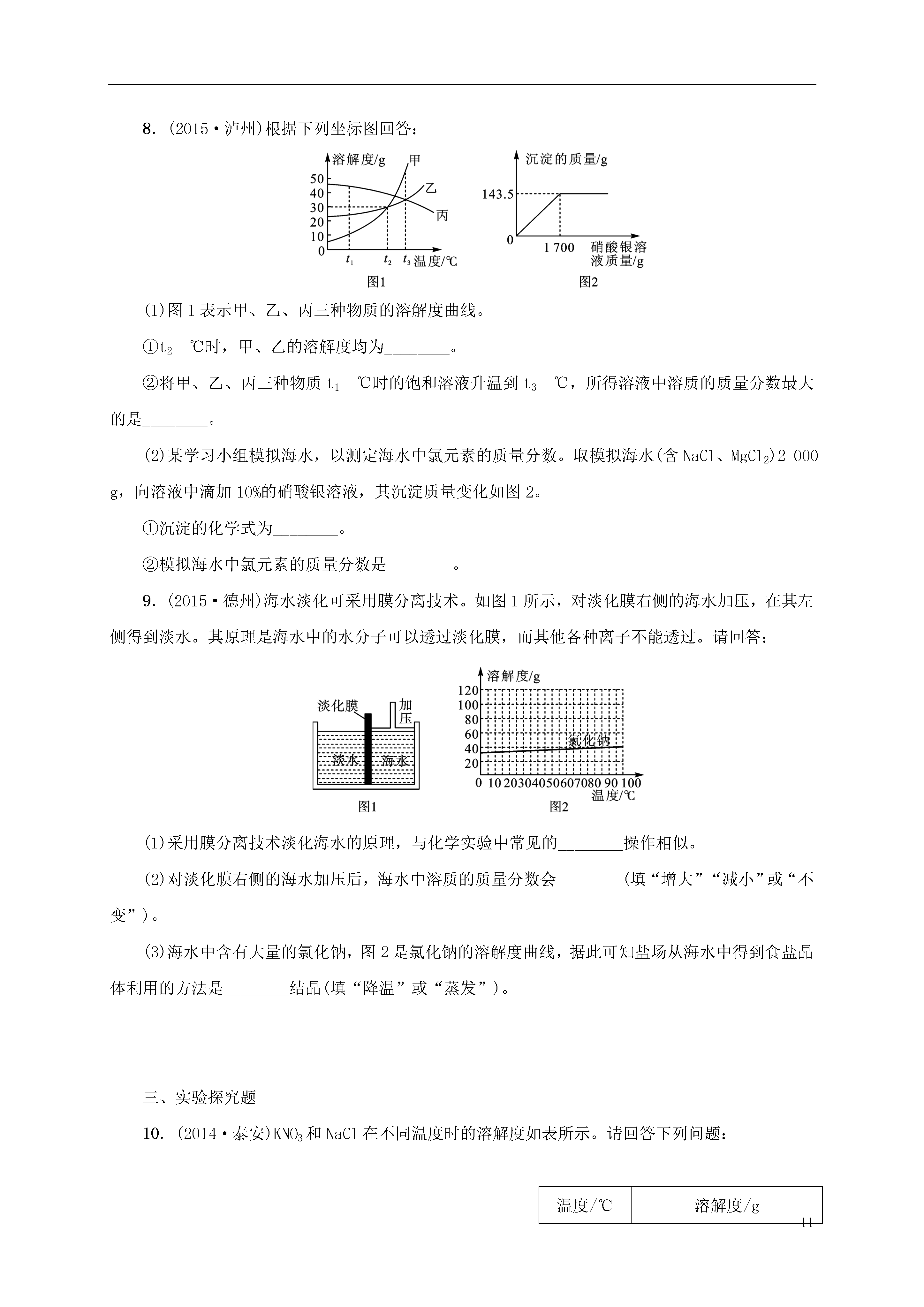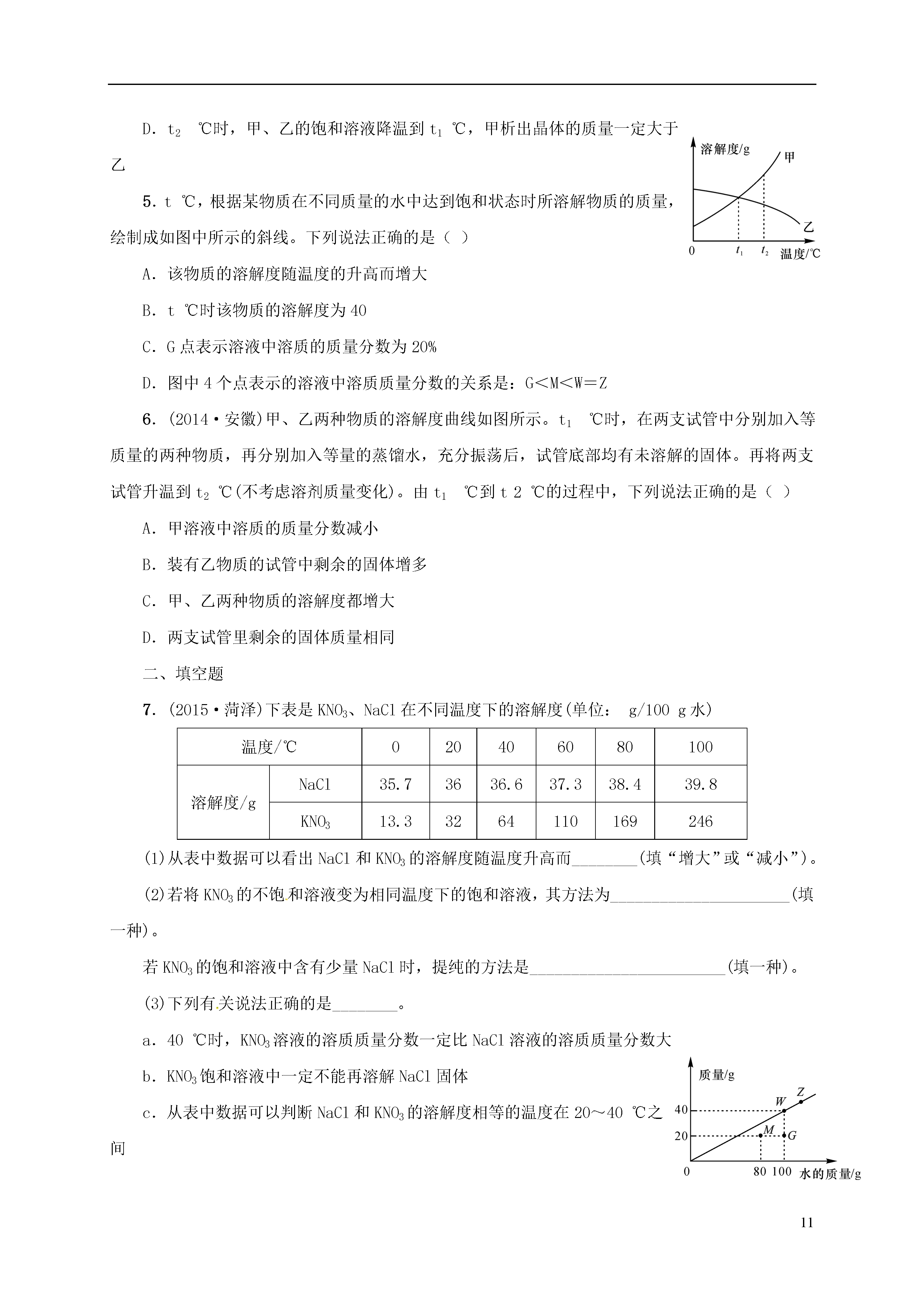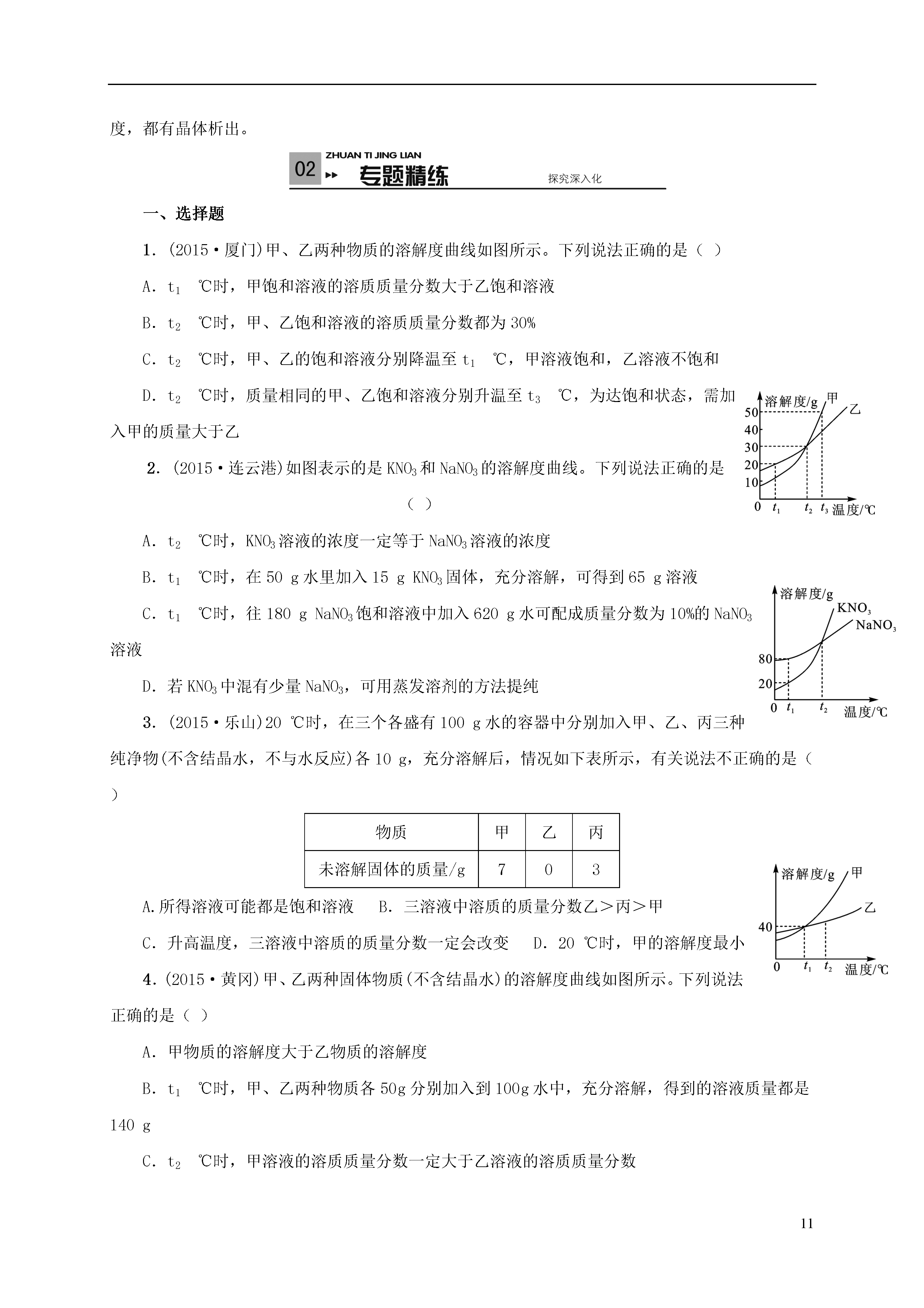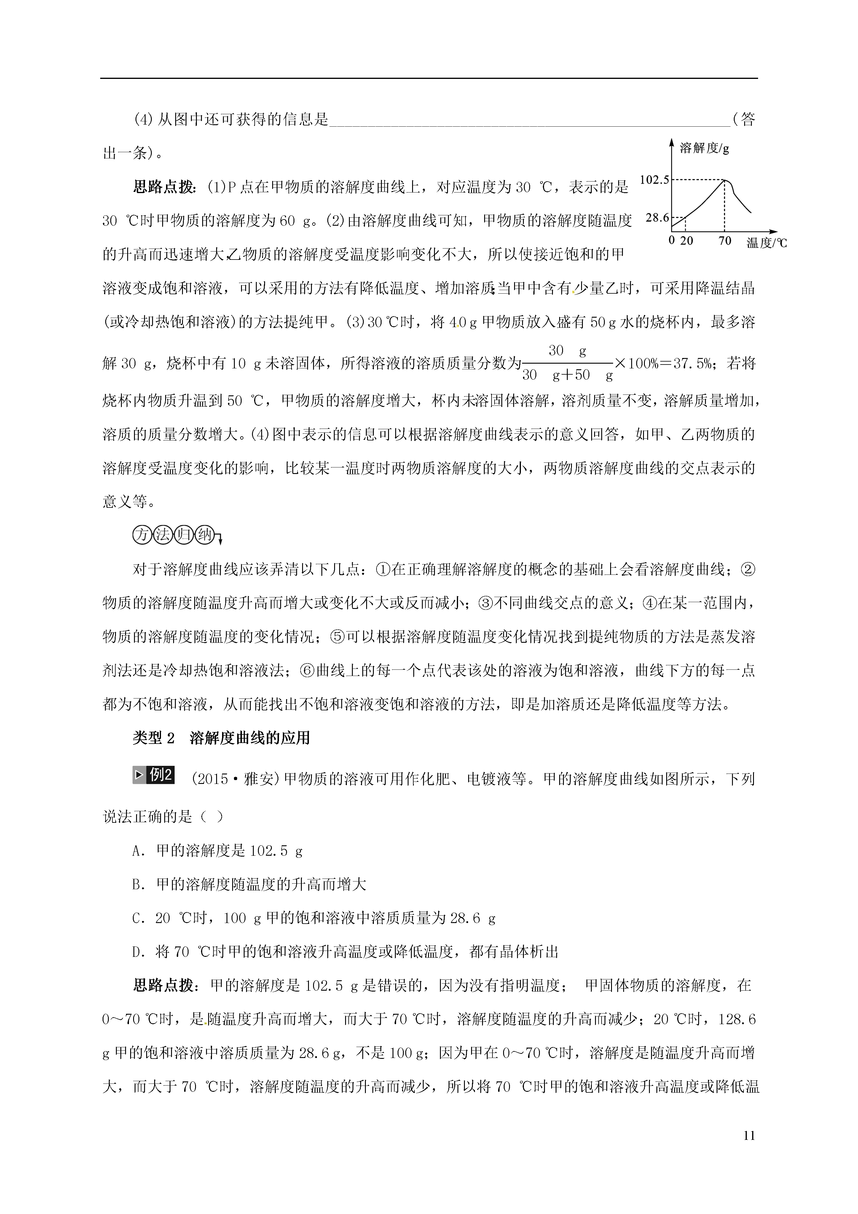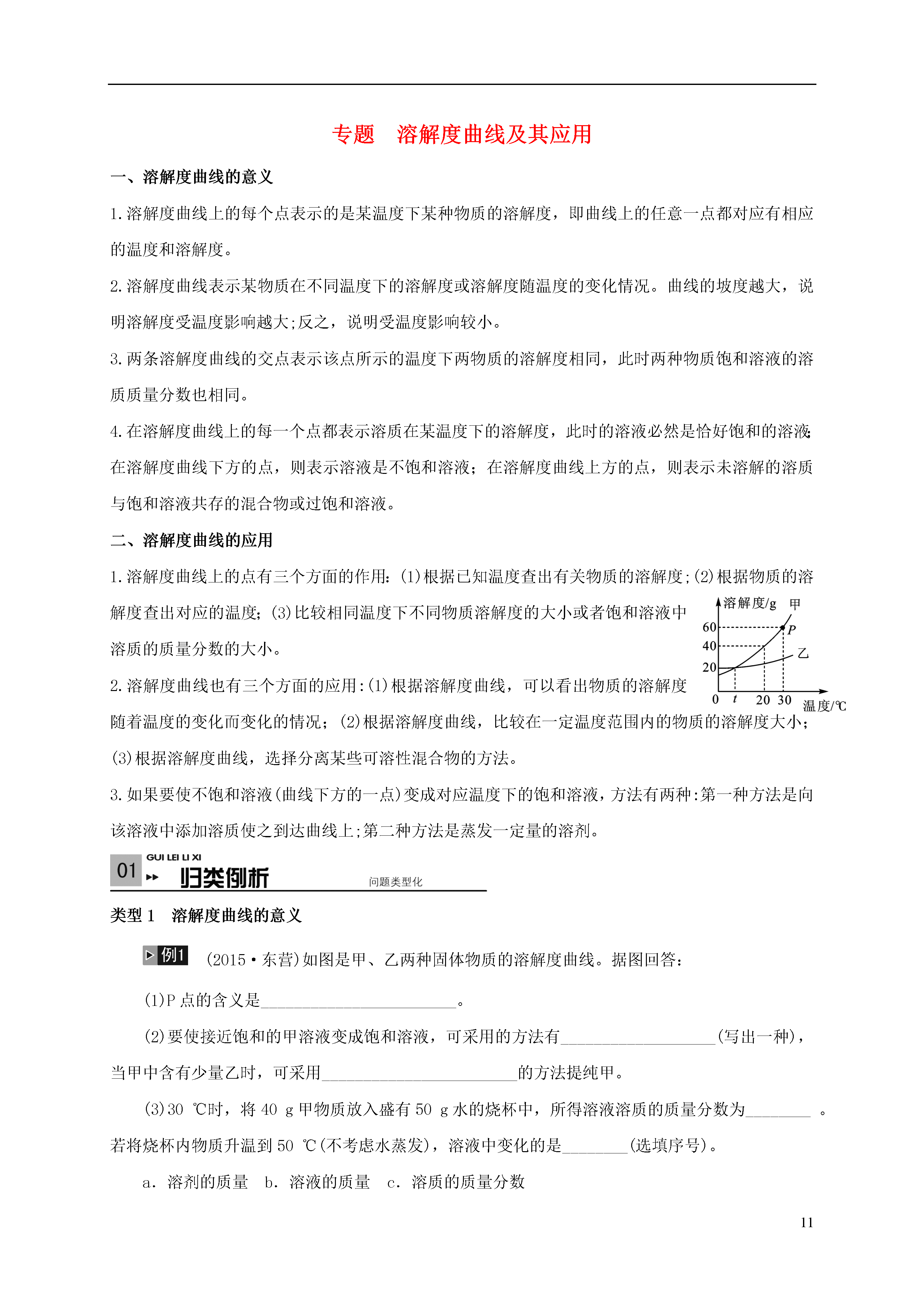 11专题溶解度曲线及其应用一、溶解度曲线的意义1.溶解度曲线上的每个点表示的是某温度下某种物质的溶解度,即曲线上的任意一点都对应有相应的温度和溶解度。2.溶解度曲线表示某物质在不同温度下的溶解度或溶解度随温度的变化情况。曲线的坡度越大,说明溶解度受温度影响越大;反之,说明受温度影响较小。3.两条溶解度曲线的交点表示该点所示的温度下两物质的溶解度相同,此时两种物质饱和溶液的溶质质量分数也相同。4.在溶解度曲线上的每一个点都表示溶质在某温度下的溶解度,此时的溶液必然是恰好饱和的溶液;在溶解度曲线下方的点,则表示溶液是不饱和溶液;在溶解度曲线上方的点,则表示未溶解的溶质与饱和溶液共存的混合物或过饱和溶液。二、溶解度曲线的应用1.溶解度曲线上的点有三个方面的作用:(1)根据已知温度查出有关物质的溶解度;(2)根据物质的溶解度查出对应的温度;(3)比较相同温度下不同物质溶解度的大小或者饱和溶液中溶质的质量分数的大小。2.溶解度曲线也有三个方面的应用:(1)根据溶解度曲线,可以看出物质的溶解度随着温度的变化而变化的情况;(2)根据溶解度曲线,比较在一定温度范围内的物质的溶解度大小;(3)根据溶解度曲线,选择分离某些可溶性混合物的方法。3.如果要使不饱和溶液(曲线下方的一点)变成对应温度下的饱和溶液,方法有两种:第一种方法是向该溶液中添加溶质使之到达曲线上;第二种方法是蒸发一定量的溶剂。类型1溶解度曲线的意义(2015·东营)如图是甲、乙两种固体物质的溶解度曲线。据图回答:(1)P点的含义是________________________。(2)要使接近饱和的甲溶液变成饱和溶液,可采用的方法有___________________(写出一种),当甲中含有少量乙时,可采用________________________的方法提纯甲。(3)30℃时,将40g甲物质放入盛有50g水的烧杯中,所得溶液溶质的质量分数为________。若将烧杯内物质升温到50℃(不考虑水蒸发),溶液中变化的是________(选填序号)。a.溶剂的质量b.溶液的质量c.溶质的质量分数(4)从图中还可获得的信息是_____________________________________________________(答出一条)。思路点拨:(1)P点在甲物质的溶解度曲线上,对应温度为30℃,表示的是30℃时甲物质的溶解度为60g。(2)由溶解度曲线可知,甲物质的溶解度随温度的升高而迅速增大,乙物质的溶解度受温度影响变化不大,所以使接近饱和的甲溶液变成饱和溶液,可以采用的方法有降低温度、增加溶质;当甲中含有少量乙时,可采用降温结晶(或冷却热饱和溶液)的方法提纯甲。(3)30℃时,将40g甲物质放入盛有50g水的烧杯内,最多溶解30g,烧杯中有10g未溶固体,所得溶液的溶质质量分数为eq\f(30g,30g+50g)×100%=37.5%;若将烧杯内物质升温到50℃,甲物质的溶解度增大,杯内未溶固体溶解,溶剂质量不变,溶解质量增加,溶质的质量分数增大。(4)图中表示的信息可以根据溶解度曲线表示的意义回答,如甲、乙两物质的溶解度受温度变化的影响,比较某一温度时两物质溶解度的大小,两物质溶解度曲线的交点表示的意义等。对于溶解度曲线应该弄清以下几点:①在正确理解溶解度的概念的基础上会看溶解度曲线;②物质的溶解度随温度升高而增大或变化不大或反而减小;③不同曲线交点的意义;④在某一范围内,物质的溶解度随温度的变化情况;⑤可以根据溶解度随温度变化情况找到提纯物质的方法是蒸发溶剂法还是冷却热饱和溶液法;⑥曲线上的每一个点代表该处的溶液为饱和溶液,曲线下方的每一点都为不饱和溶液,从而能找出不饱和溶液变饱和溶液的方法,即是加溶质还是降低温度等方法。类型2溶解度曲线的应用(2015·雅安)甲物质的溶液可用作化肥、电镀液等。甲的溶解度曲线如图所示,下列说法正确的是()A.甲的溶解度是102.5gB.甲的溶解度随温度的升高而增大C.20℃时,100g甲的饱和溶液中溶质质量为28.6gD.将70℃时甲的饱和溶液升高温度或降低温度,都有晶体析出思路点拨:甲的溶解度是102.5g是错误的,因为没有指明温度;甲固体物质的溶解度,在0~70℃时,是随温度升高而增大,而大于70℃时,溶解度随温度的升高而减少;20℃时,128.6g甲的饱和溶液中溶质质量为28.6g,不是100g;因为甲在0~70℃时,溶解度是随温度升高而增大,而大于70℃时,溶解度随温度的升高而减少,所以将70℃时甲的饱和溶液升高温度或降低温度,都有晶体析出。一、选择题1.(2015·厦门)甲、乙两种物质的溶解度曲线如图所示。下列说法正确的是()A.t1℃时