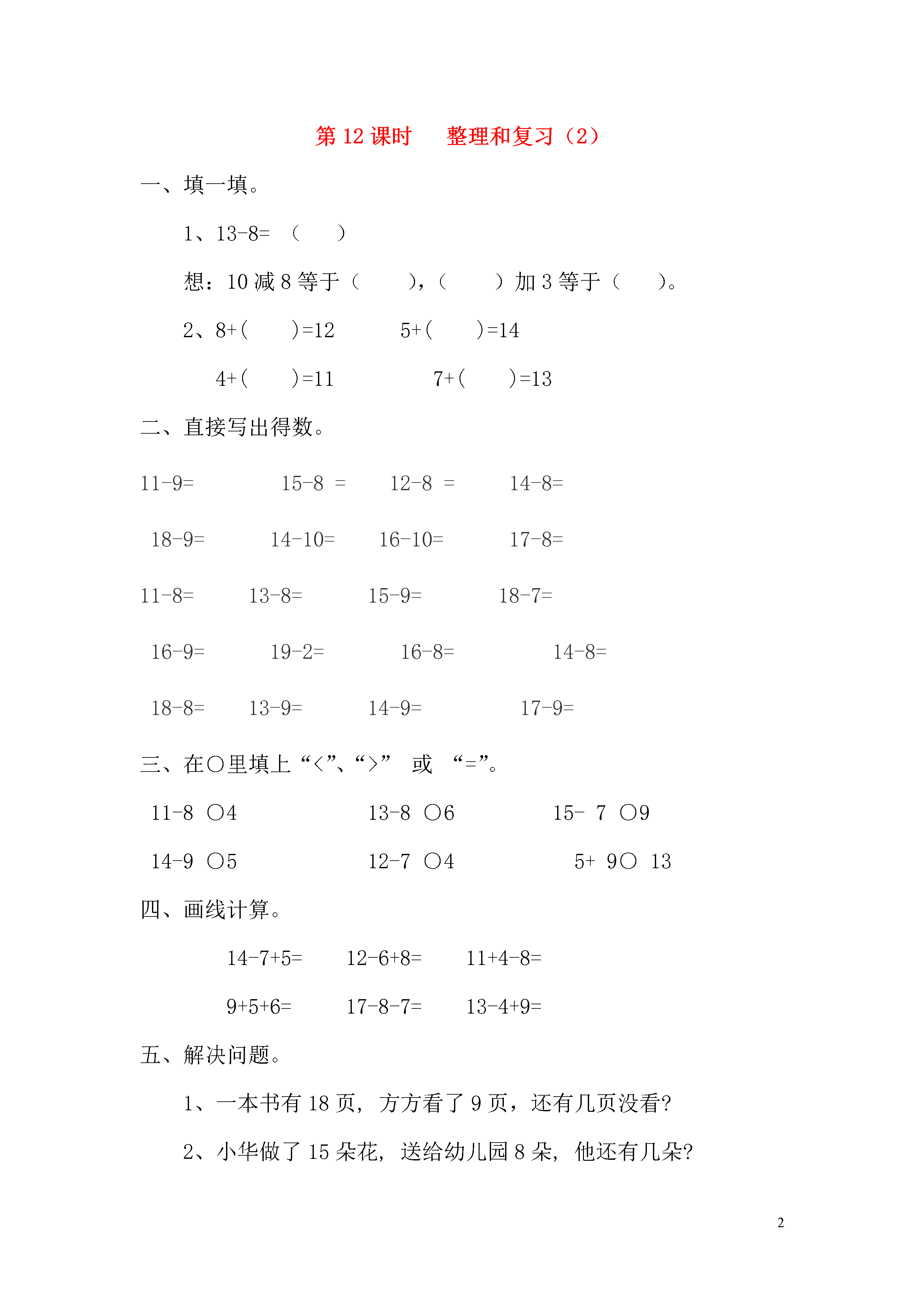 2第12课时整理和复习(2)填一填。1、13-8=()想:10减8等于(),()加3等于()。2、8+()=125+()=144+()=117+()=13二、直接写出得数。11-9=15-8=12-8=14-8=18-9=14-10=16-10=17-8=11-8=13-8=15-9=18-7=16-9=19-2=16-8=14-8=18-8=13-9=14-9=17-9=三、在○里填上“<”、“>”或“=”。11-8○413-8○615-7○914-9○512-7○45+9○13四、画线计算。14-7+5=12-6+8=11+4-8=9+5+6=17-8-7=13-4+9=五、解决问题。1、一本书有18页,方方看了9页,还有几页没看?2、小华做了15朵花,送给幼儿园8朵,他还有几朵?3、要送13份礼物,现在剩下4份,送了几份?