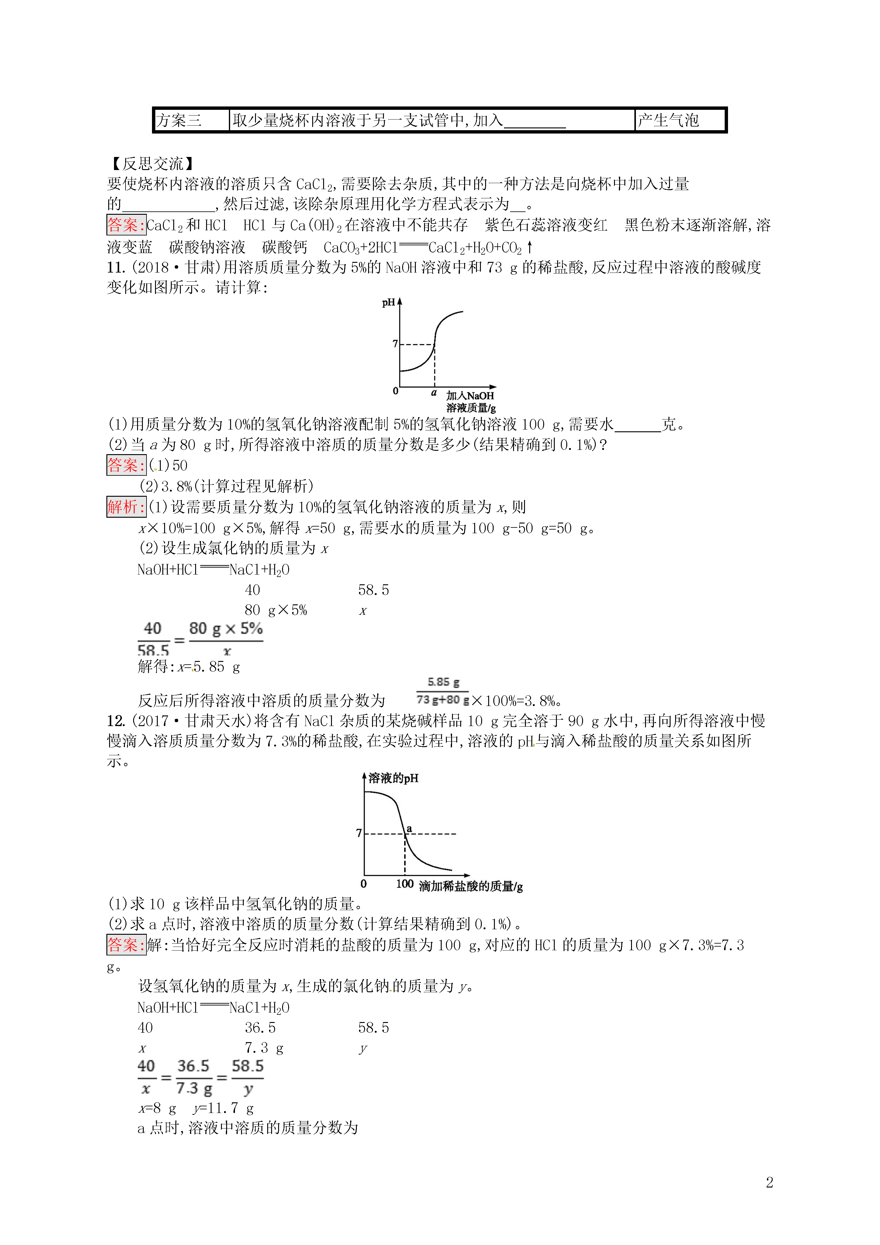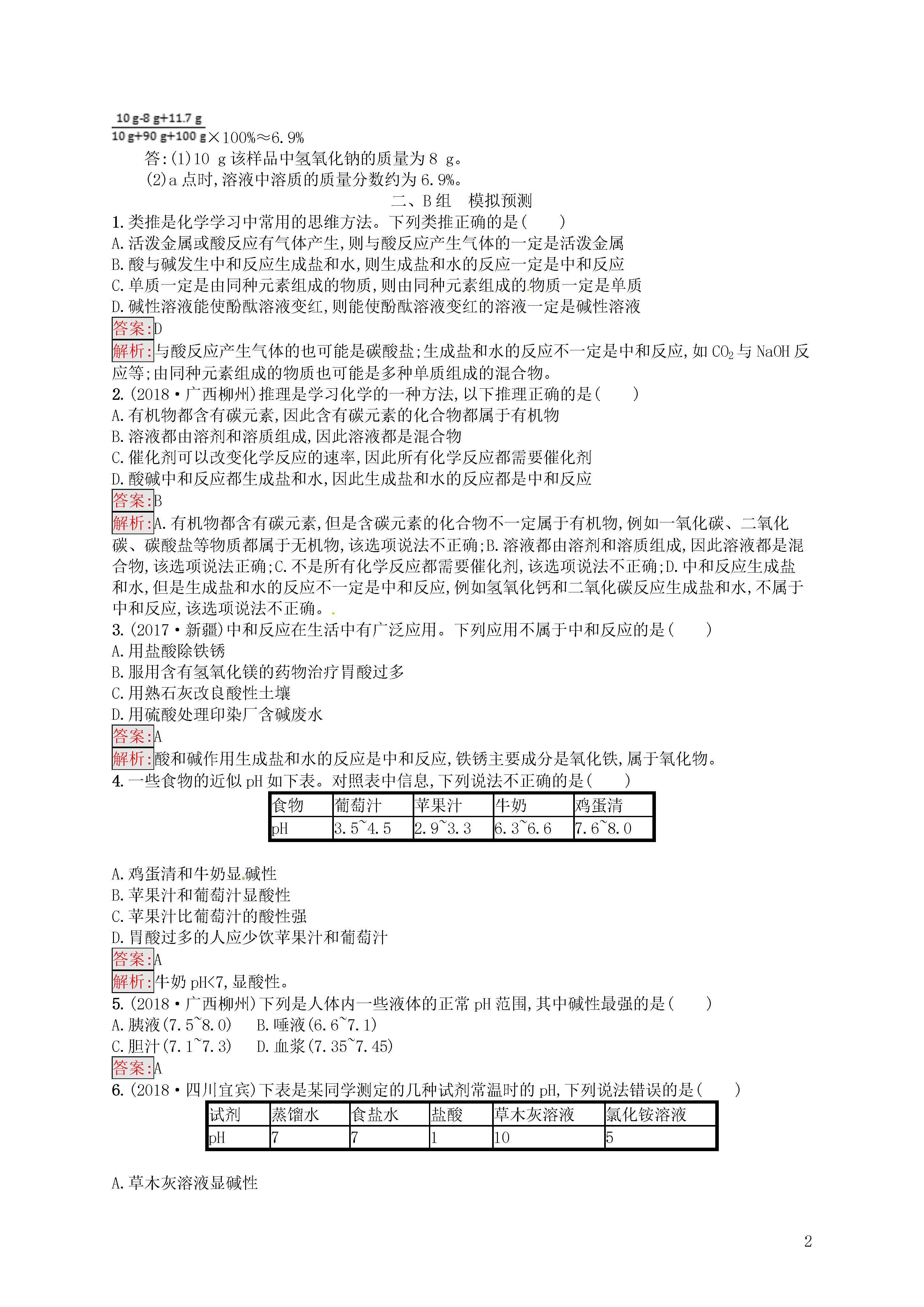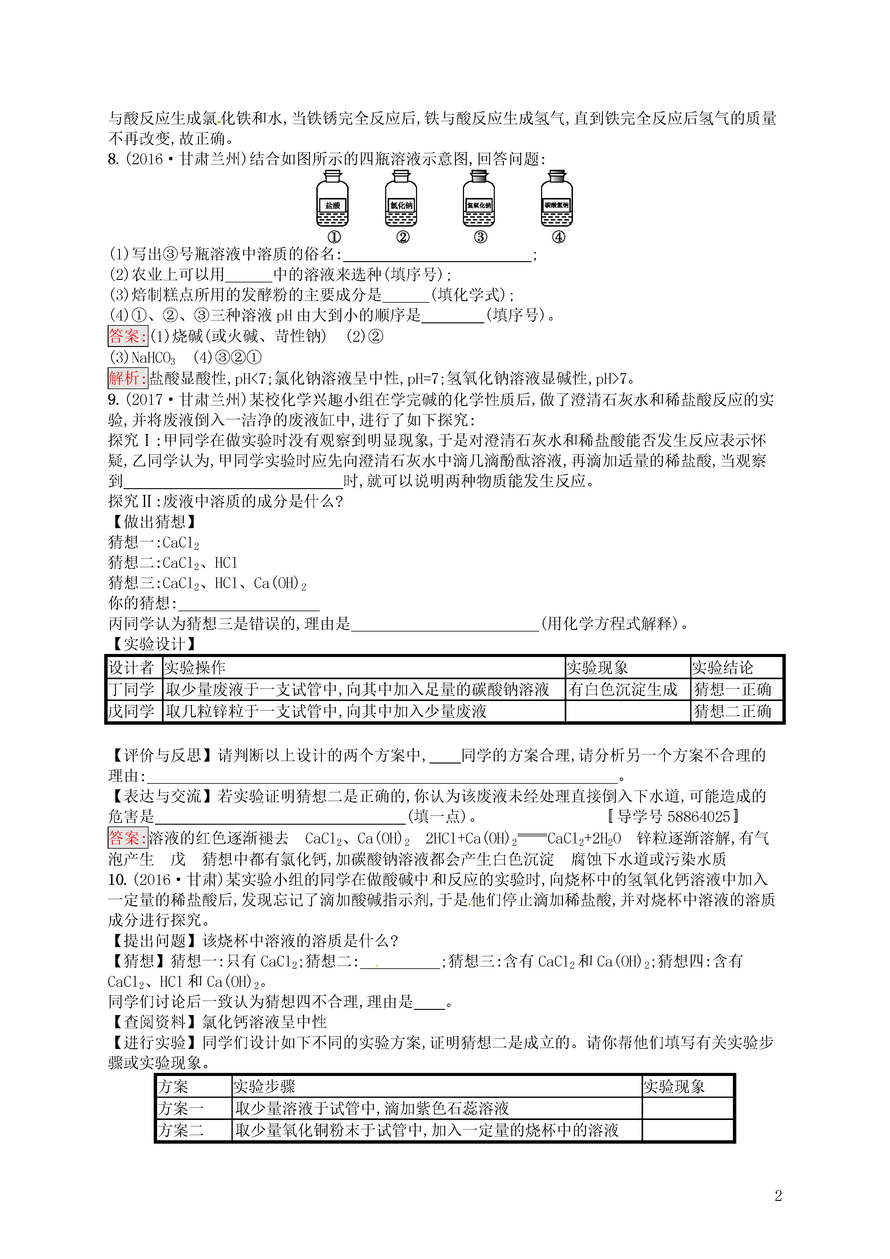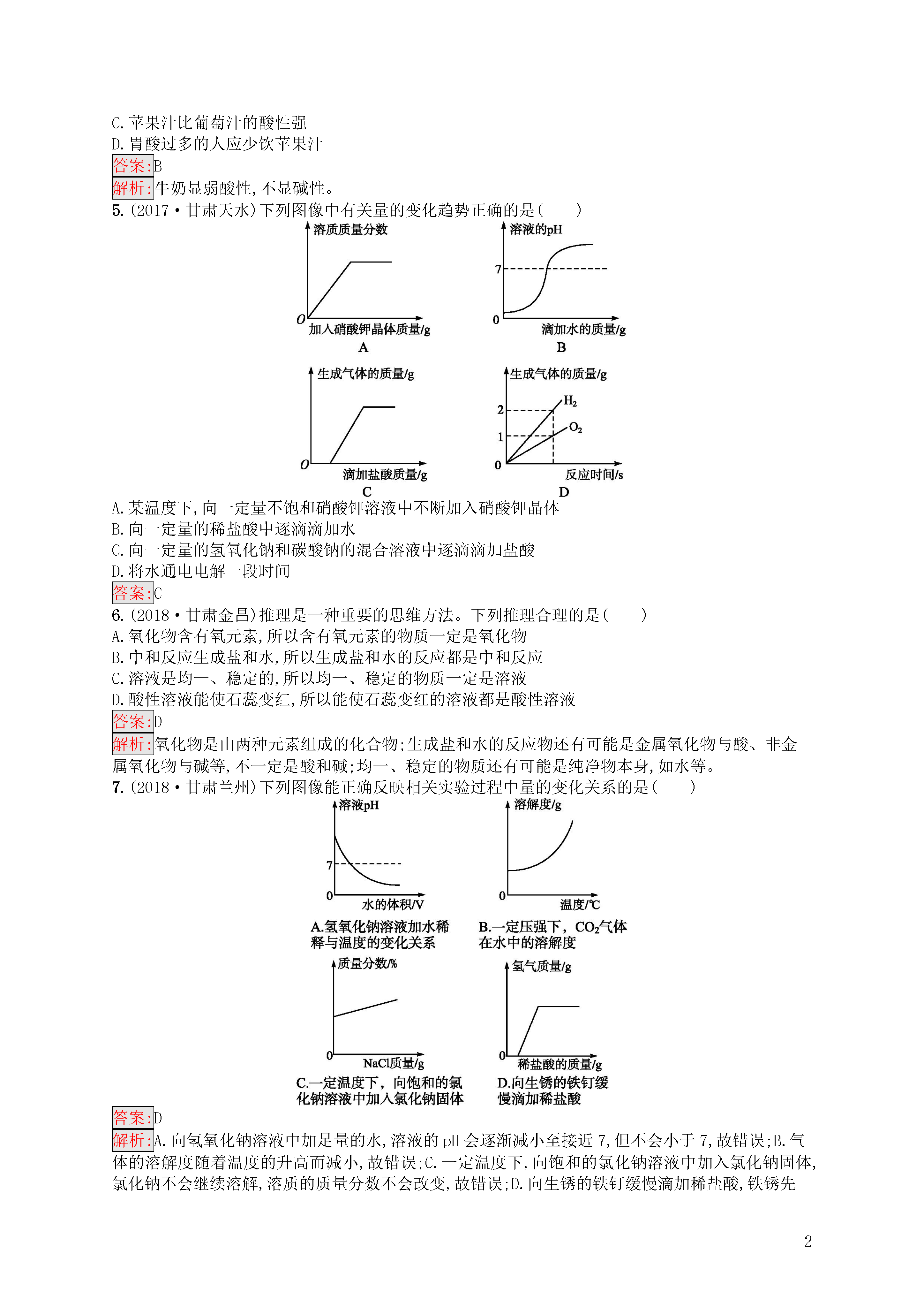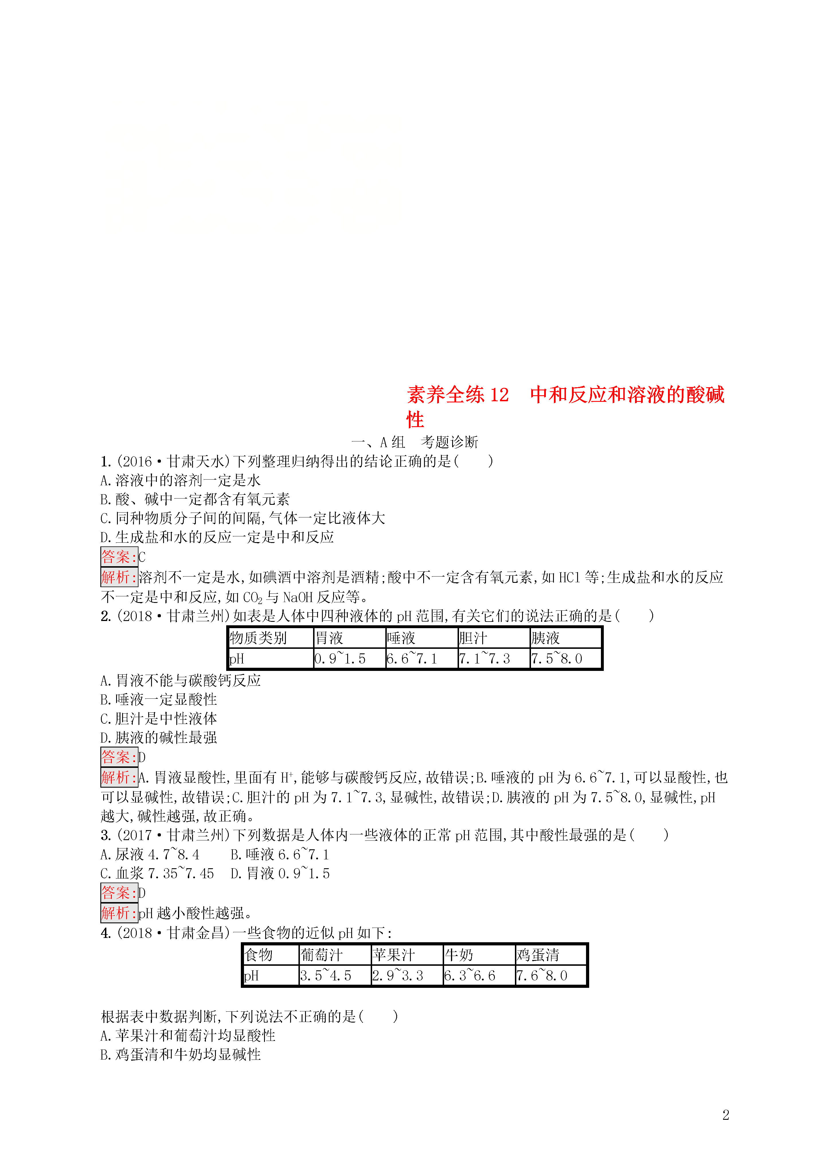 2素养全练12中和反应和溶液的酸碱性一、A组考题诊断1.(2016·甘肃天水)下列整理归纳得出的结论正确的是()A.溶液中的溶剂一定是水B.酸、碱中一定都含有氧元素C.同种物质分子间的间隔,气体一定比液体大D.生成盐和水的反应一定是中和反应答案:C解析:溶剂不一定是水,如碘酒中溶剂是酒精;酸中不一定含有氧元素,如HCl等;生成盐和水的反应不一定是中和反应,如CO2与NaOH反应等。2.(2018·甘肃兰州)如表是人体中四种液体的pH范围,有关它们的说法正确的是()物质类别胃液唾液胆汁胰液pH0.9~1.56.6~7.17.1~7.37.5~8.0A.胃液不能与碳酸钙反应B.唾液一定显酸性C.胆汁是中性液体D.胰液的碱性最强答案:D解析:A.胃液显酸性,里面有H+,能够与碳酸钙反应,故错误;B.唾液的pH为6.6~7.1,可以显酸性,也可以显碱性,故错误;C.胆汁的pH为7.1~7.3,显碱性,故错误;D.胰液的pH为7.5~8.0,显碱性,pH越大,碱性越强,故正确。3.(2017·甘肃兰州)下列数据是人体内一些液体的正常pH范围,其中酸性最强的是()A.尿液4.7~8.4B.唾液6.6~7.1C.血浆7.35~7.45D.胃液0.9~1.5答案:D解析:pH越小酸性越强。4.(2018·甘肃金昌)一些食物的近似pH如下:食物葡萄汁苹果汁牛奶鸡蛋清pH3.5~4.52.9~3.36.3~6.67.6~8.0根据表中数据判断,下列说法不正确的是()A.苹果汁和葡萄汁均显酸性B.鸡蛋清和牛奶均显碱性C.苹果汁比葡萄汁的酸性强D.胃酸过多的人应少饮苹果汁答案:B解析:牛奶显弱酸性,不显碱性。5.(2017·甘肃天水)下列图像中有关量的变化趋势正确的是()A.某温度下,向一定量不饱和硝酸钾溶液中不断加入硝酸钾晶体B.向一定量的稀盐酸中逐滴滴加水C.向一定量的氢氧化钠和碳酸钠的混合溶液中逐滴滴加盐酸D.将水通电电解一段时间答案:C6.(2018·甘肃金昌)推理是一种重要的思维方法。下列推理合理的是()A.氧化物含有氧元素,所以含有氧元素的物质一定是氧化物B.中和反应生成盐和水,所以生成盐和水的反应都是中和反应C.溶液是均一、稳定的,所以均一、稳定的物质一定是溶液D.酸性溶液能使石蕊变红,所以能使石蕊变红的溶液都是酸性溶液答案:D解析:氧化物是由两种元素组成的化合物;生成盐和水的反应物还有可能是金属氧化物与酸、非金属氧化物与碱等,不一定是酸和碱;均一、稳定的物质还有可能是纯净物本身,如水等。7.(2018·甘肃兰州)下列图像能正确反映相关实验过程中量的变化关系的是()答案:D解析:A.向氢氧化钠溶液中加足量的水,溶液的pH会逐渐减小至接近7,但不会小于7,故错误;B.气体的溶解度随着温度的升高而减小,故错误;C.一定温度下,向饱和的氯化钠溶液中加入氯化钠固体,氯化钠不会继续溶解,溶质的质量分数不会改变,故错误;D.向生锈的铁钉缓慢滴加稀盐酸,铁锈先与酸反应生成氯化铁和水,当铁锈完全反应后,铁与酸反应生成氢气,直到铁完全反应后氢气的质量不再改变,故正确。8.(2016·甘肃兰州)结合如图所示的四瓶溶液示意图,回答问题:(1)写出③号瓶溶液中溶质的俗名:;(2)农业上可以用中的溶液来选种(填序号);(3)焙制糕点所用的发酵粉的主要成分是(填化学式);(4)①、②、③三种溶液pH由大到小的顺序是(填序号)。答案:(1)烧碱(或火碱、苛性钠)(2)②(3)NaHCO3(4)③②①解析:盐酸显酸性,pH<7;氯化钠溶液呈中性,pH=7;氢氧化钠溶液显碱性,pH>7。9.(2017·甘肃兰州)某校化学兴趣小组在学完碱的化学性质后,做了澄清石灰水和稀盐酸反应的实验,并将废液倒入一洁净的废液缸中,进行了如下探究:探究Ⅰ:甲同学在做实验时没有观察到明显现象,于是对澄清石灰水和稀盐酸能否发生反应表示怀疑,乙同学认为,甲同学实验时应先向澄清石灰水中滴几滴酚酞溶液,再滴加适量的稀盐酸,当观察到时,就可以说明两种物质能发生反应。探究Ⅱ:废液中溶质的成分是什么?【做出猜想】猜想一:CaCl2猜想二:CaCl2、HCl猜想三:CaCl2、HCl、Ca(OH)2你的猜想:丙同学认为猜想三是错误的,理由是(用化学方程式解释)。【实验设计】设计者实验操作实验现象实验结论丁同学取少量废液于一支试管中,向其中加入足量的碳酸钠溶液有白色沉淀生成猜想一正确戊同学取几粒锌粒于一支试管中,向其中加入少量废液猜想二正确【评价与反思】请判断以上设计的两个方案中,同学的方案合理,请分析另一个方案不合理的理由:。【表达与交流