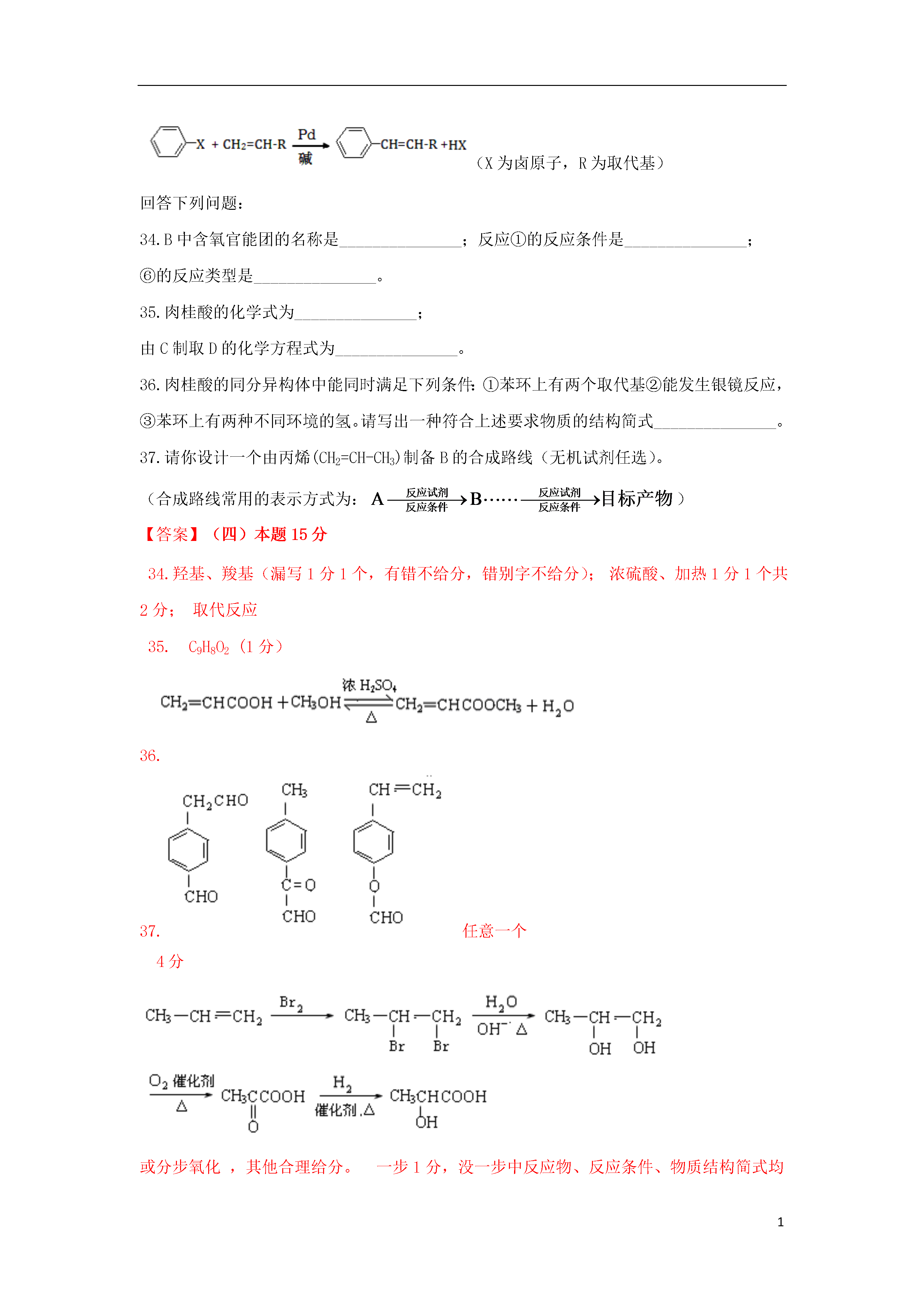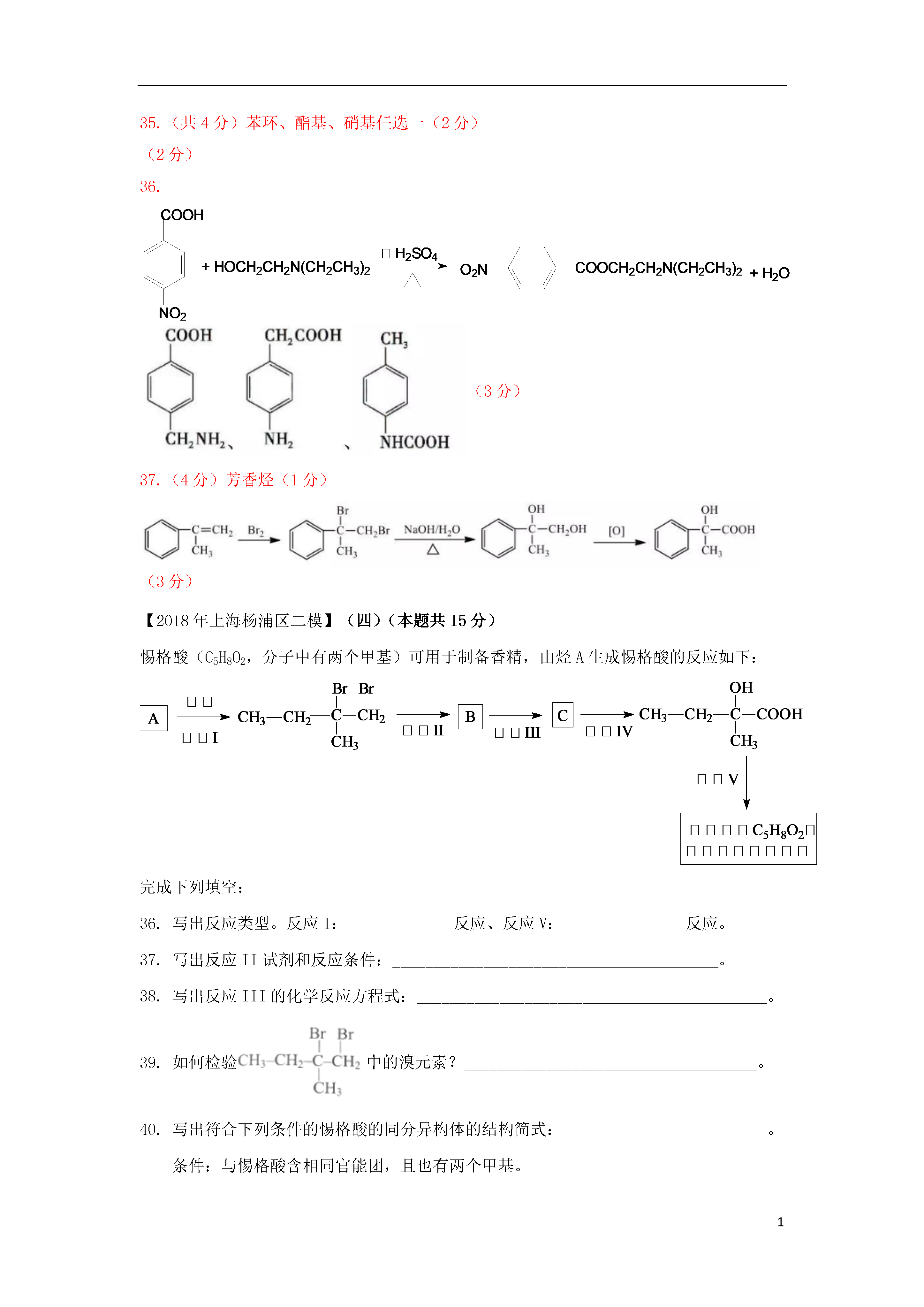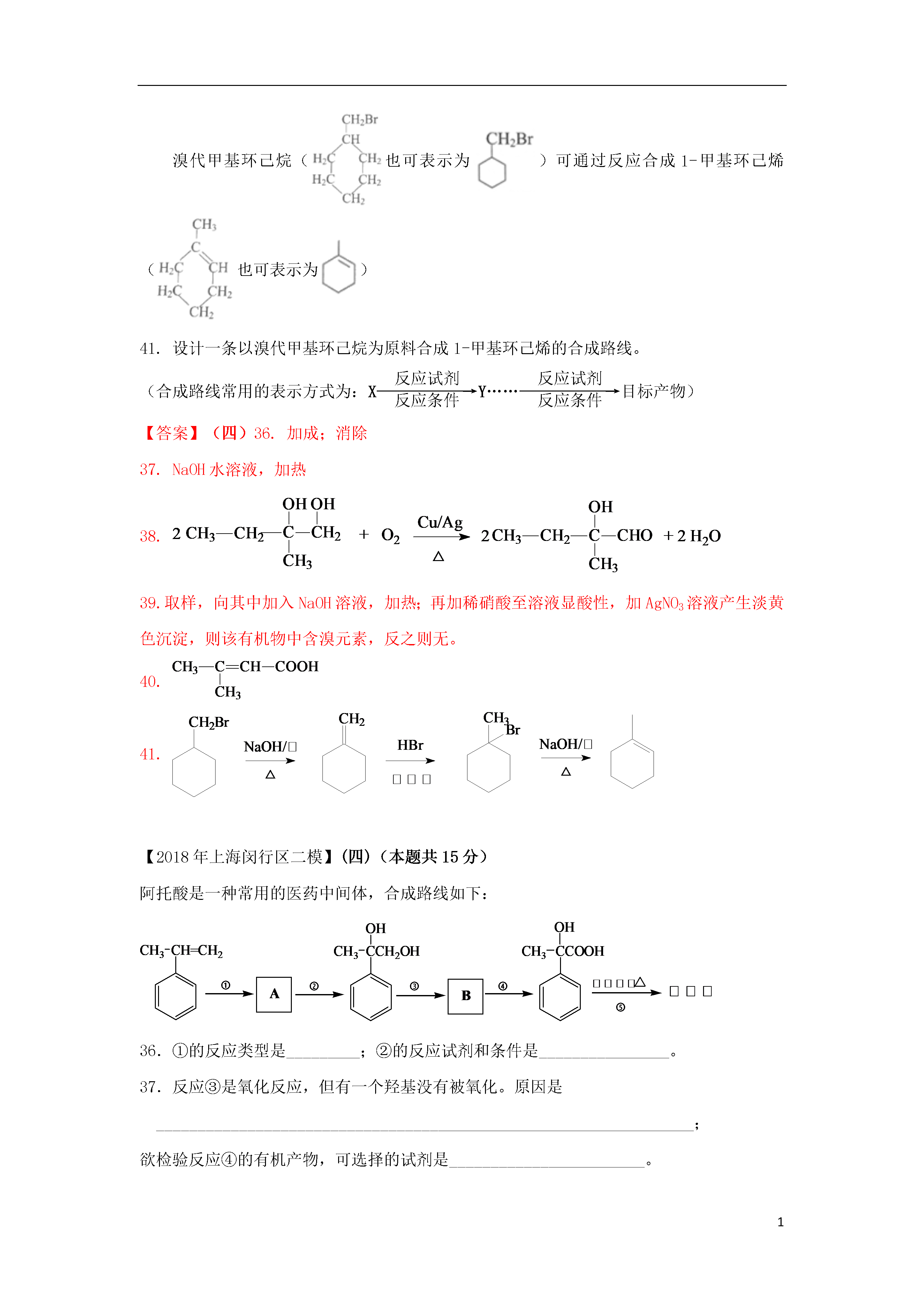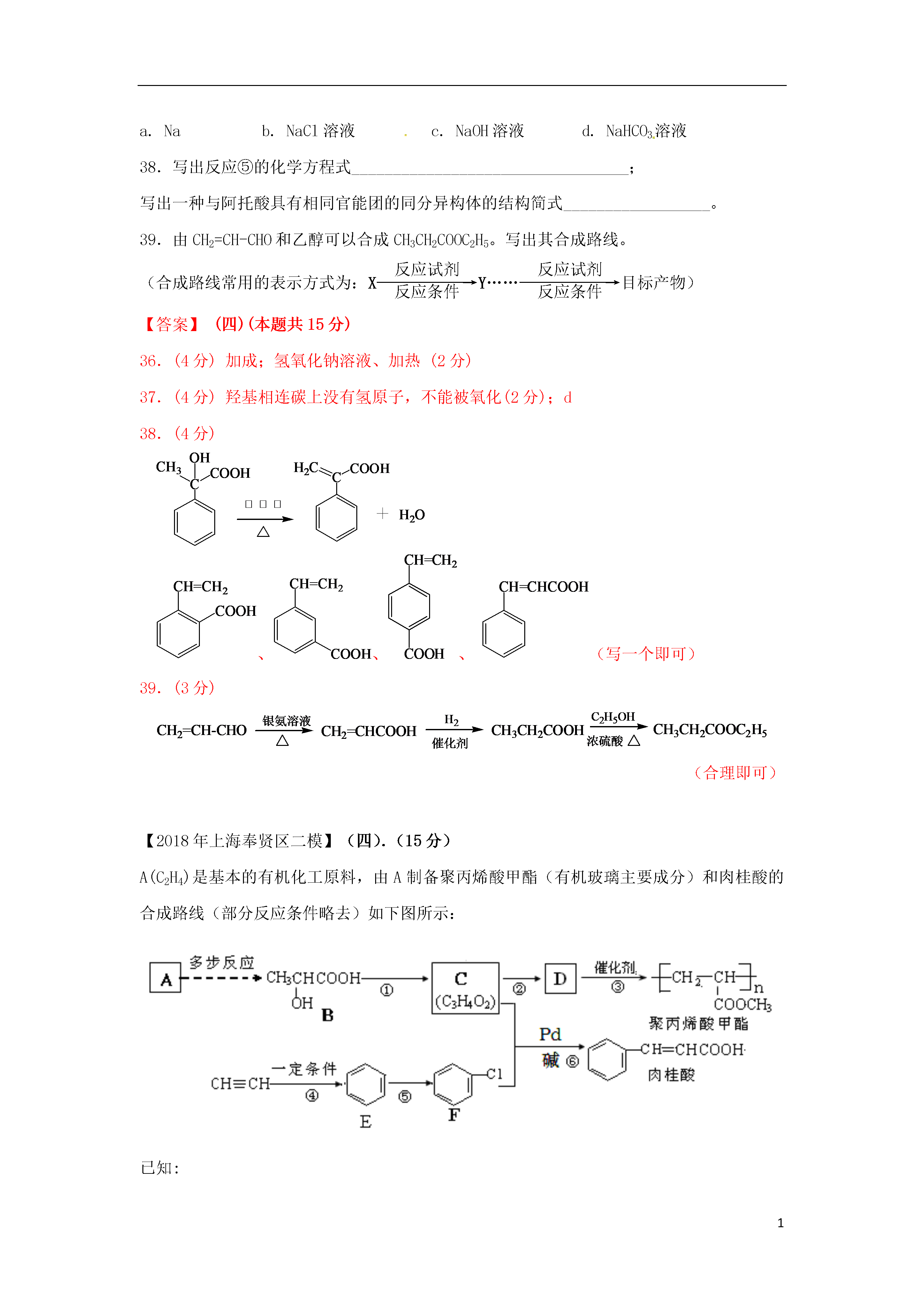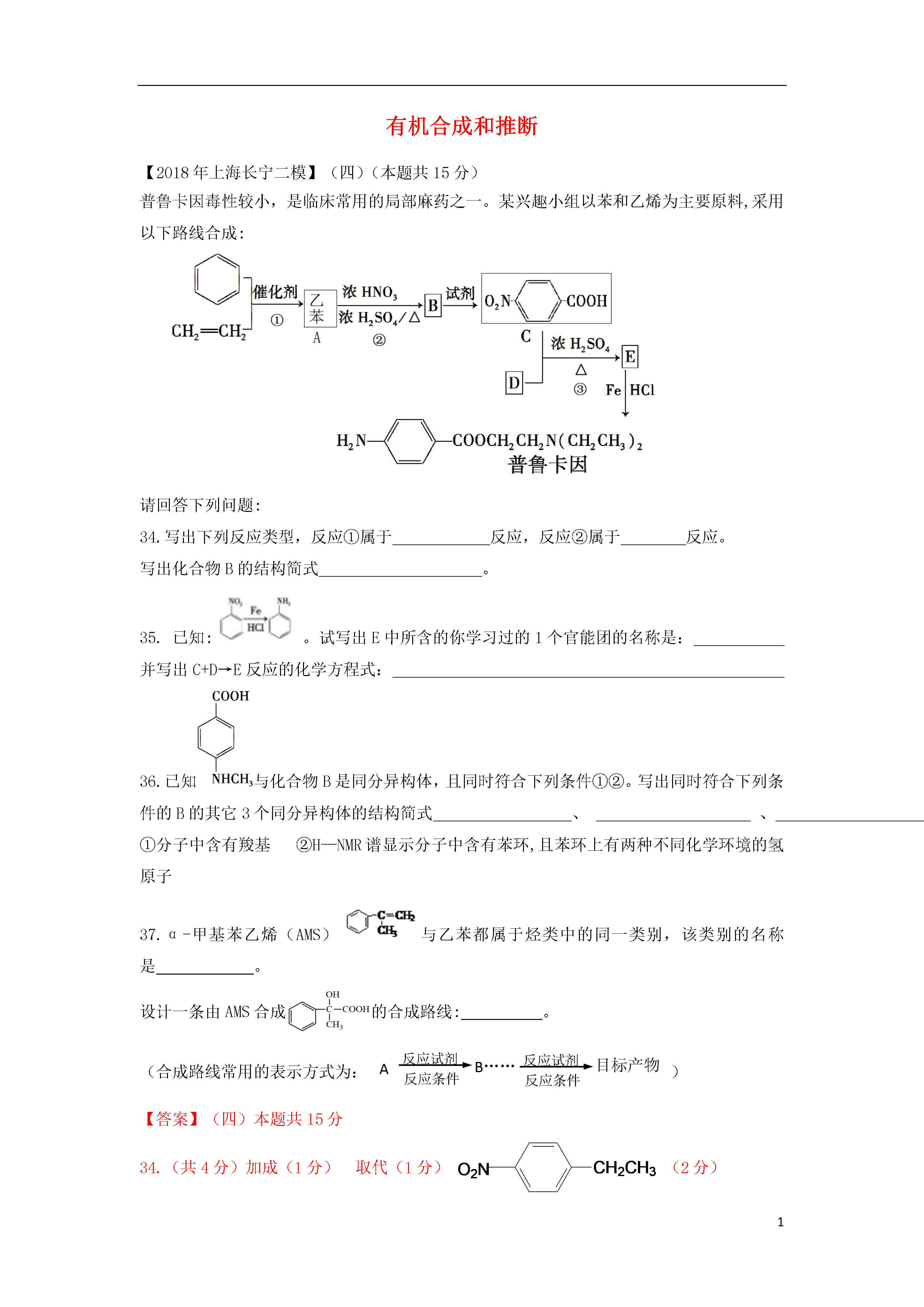 1有机合成和推断【2018年上海长宁二模】(四)(本题共15分)普鲁卡因毒性较小,是临床常用的局部麻药之一。某兴趣小组以苯和乙烯为主要原料,采用以下路线合成:请回答下列问题:34.写出下列反应类型,反应①属于反应,反应②属于反应。写出化合物B的结构简式。35.已知:。试写出E中所含的你学习过的1个官能团的名称是:并写出C+D→E反应的化学方程式:36.已知与化合物B是同分异构体,且同时符合下列条件①②。写出同时符合下列条件的B的其它3个同分异构体的结构简式、、。①分子中含有羧基②H—NMR谱显示分子中含有苯环,且苯环上有两种不同化学环境的氢原子37.α-甲基苯乙烯(AMS)与乙苯都属于烃类中的同一类别,该类别的名称是。设计一条由AMS合成的合成路线:。(合成路线常用的表示方式为:B……A目标产物反应试剂反应条件反应试剂反应条件)【答案】(四)本题共15分34.(共4分)加成(1分)取代(1分)(2分)35.(共4分)苯环、酯基、硝基任选一(2分)(2分)36.(3分)37.(4分)芳香烃(1分)(3分)【2018年上海杨浦区二模】(四)(本题共15分)惕格酸(C5H8O2,分子中有两个甲基)可用于制备香精,由烃A生成惕格酸的反应如下:完成下列填空:36.写出反应类型。反应I:_____________反应、反应V:_______________反应。37.写出反应II试剂和反应条件:________________________________________。38.写出反应III的化学反应方程式:___________________________________________。39.如何检验中的溴元素?____________________________________。40.写出符合下列条件的惕格酸的同分异构体的结构简式:_________________________。条件:与惕格酸含相同官能团,且也有两个甲基。溴代甲基环己烷(也可表示为)可通过反应合成1-甲基环己烯(也可表示为)41.设计一条以溴代甲基环己烷为原料合成1-甲基环己烯的合成路线。(合成路线常用的表示方式为:Xeq\o(——————→,\s\up11(反应试剂),\s\do4(反应条件))Y……eq\o(——————→,\s\up11(反应试剂),\s\do4(反应条件))目标产物)【答案】(四)36.加成;消除37.NaOH水溶液,加热38.39.取样,向其中加入NaOH溶液,加热;再加稀硝酸至溶液显酸性,加AgNO3溶液产生淡黄色沉淀,则该有机物中含溴元素,反之则无。40.41.【2018年上海闵行区二模】(四)(本题共15分)阿托酸是一种常用的医药中间体,合成路线如下:36.①的反应类型是_________;②的反应试剂和条件是________________。37.反应③是氧化反应,但有一个羟基没有被氧化。原因是__________________________________________________________________;欲检验反应④的有机产物,可选择的试剂是________________________。a.Nab.NaCl溶液c.NaOH溶液d.NaHCO3溶液38.写出反应⑤的化学方程式__________________________________;写出一种与阿托酸具有相同官能团的同分异构体的结构简式__________________。39.由CH2=CH-CHO和乙醇可以合成CH3CH2COOC2H5。写出其合成路线。(合成路线常用的表示方式为:Xeq\o(——————→,\s\up11(反应试剂),\s\do4(反应条件))Y……eq\o(——————→,\s\up11(反应试剂),\s\do4(反应条件))目标产物)【答案】(四)(本题共15分)36.(4分)加成;氢氧化钠溶液、加热(2分)37.(4分)羟基相连碳上没有氢原子,不能被氧化(2分);d38.(4分)、、、(写一个即可)39.(3分)(合理即可)【2018年上海奉贤区二模】(四).(15分)A(C2H4)是基本的有机化工原料,由A制备聚丙烯酸甲酯(有机玻璃主要成分)和肉桂酸的合成路线(部分反应条件略去)如下图所示:已知:(X为卤原子,R为取代基)回答下列问题:34.B中含氧官能团的名称是_______________;反应①的反应条件是_______________;⑥的反应类型是_______________。35.肉桂酸的化学式为__