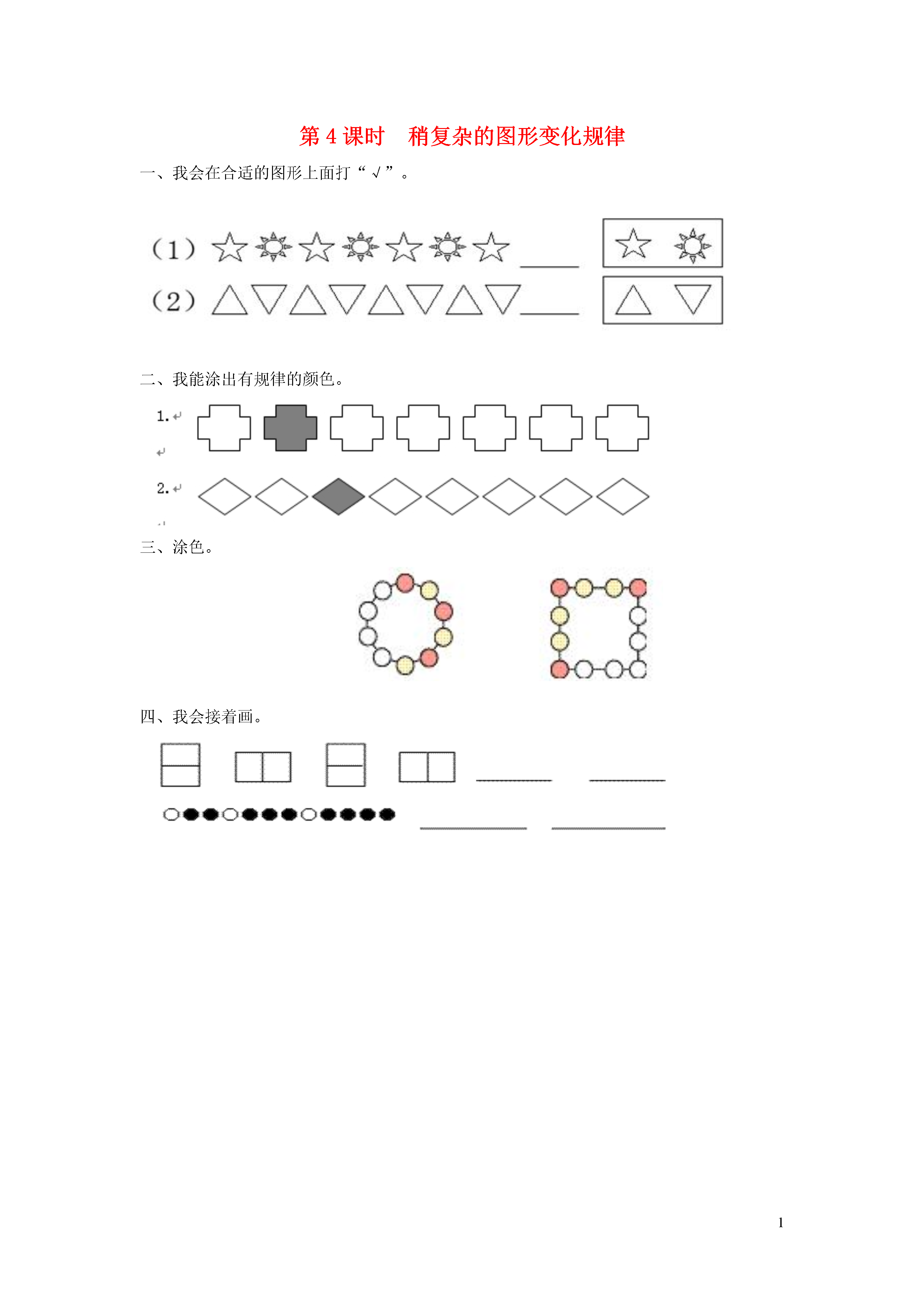 1第4课时稍复杂的图形变化规律一、我会在合适的图形上面打“√”。二、我能涂出有规律的颜色。涂色。我会接着画。