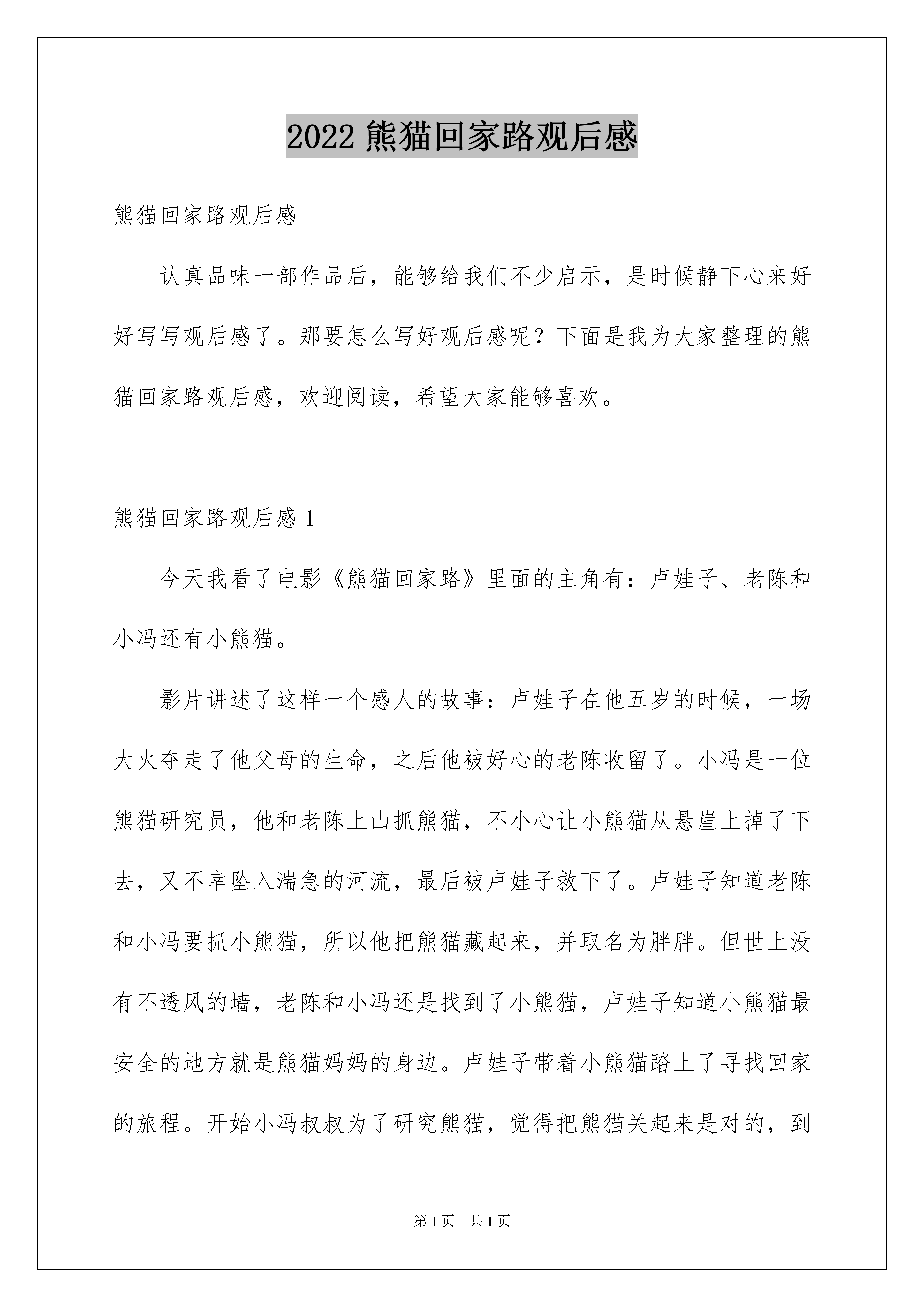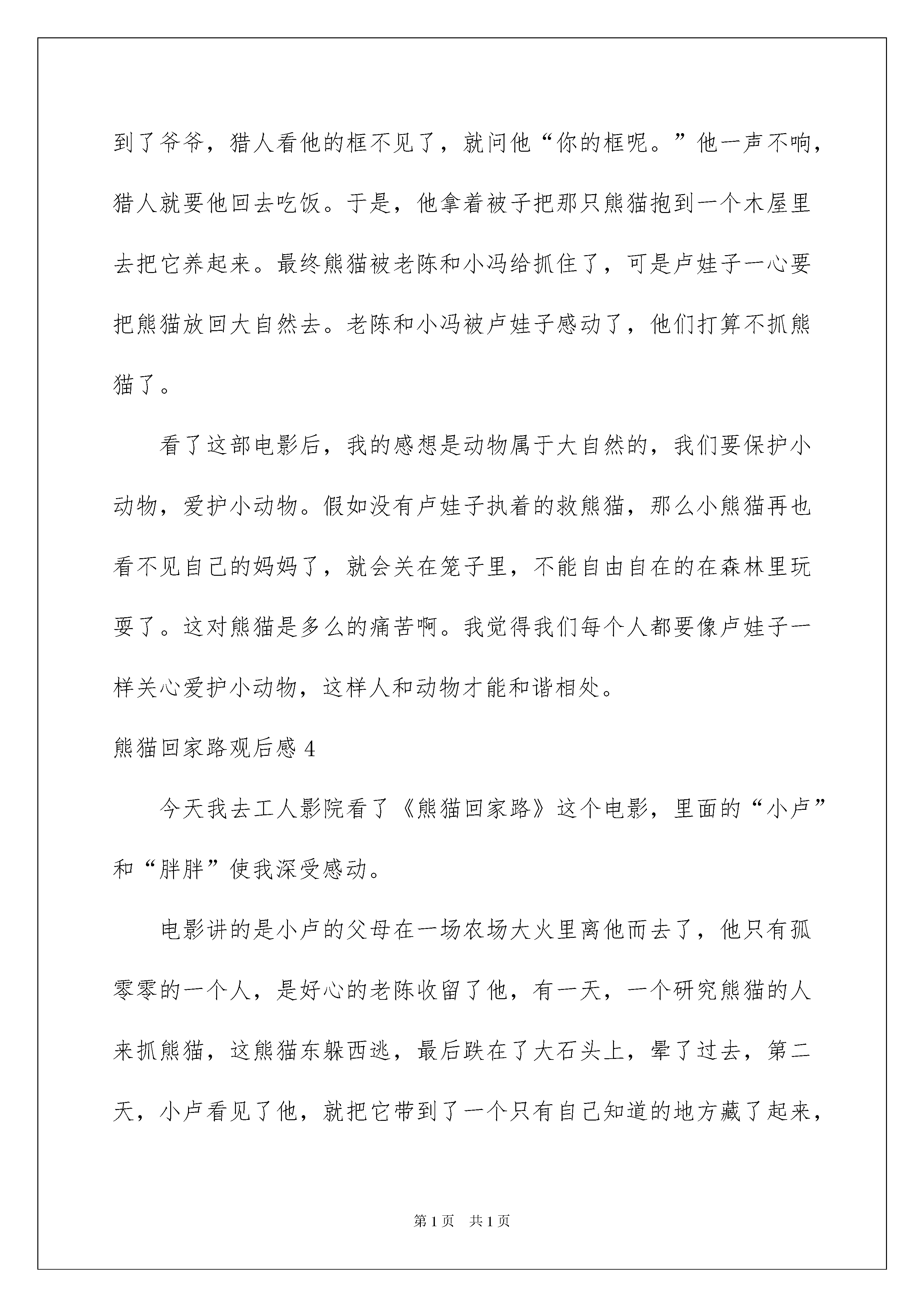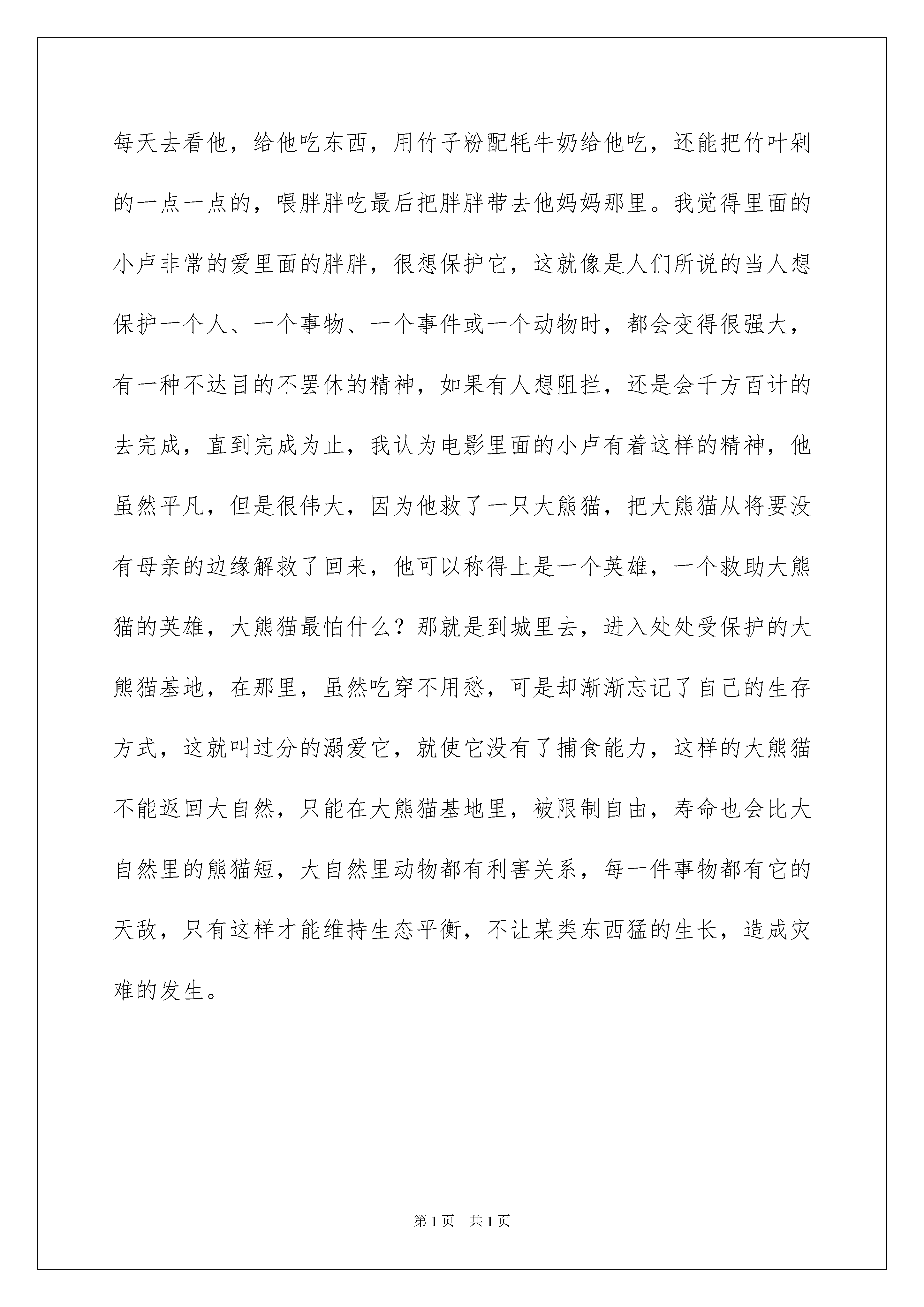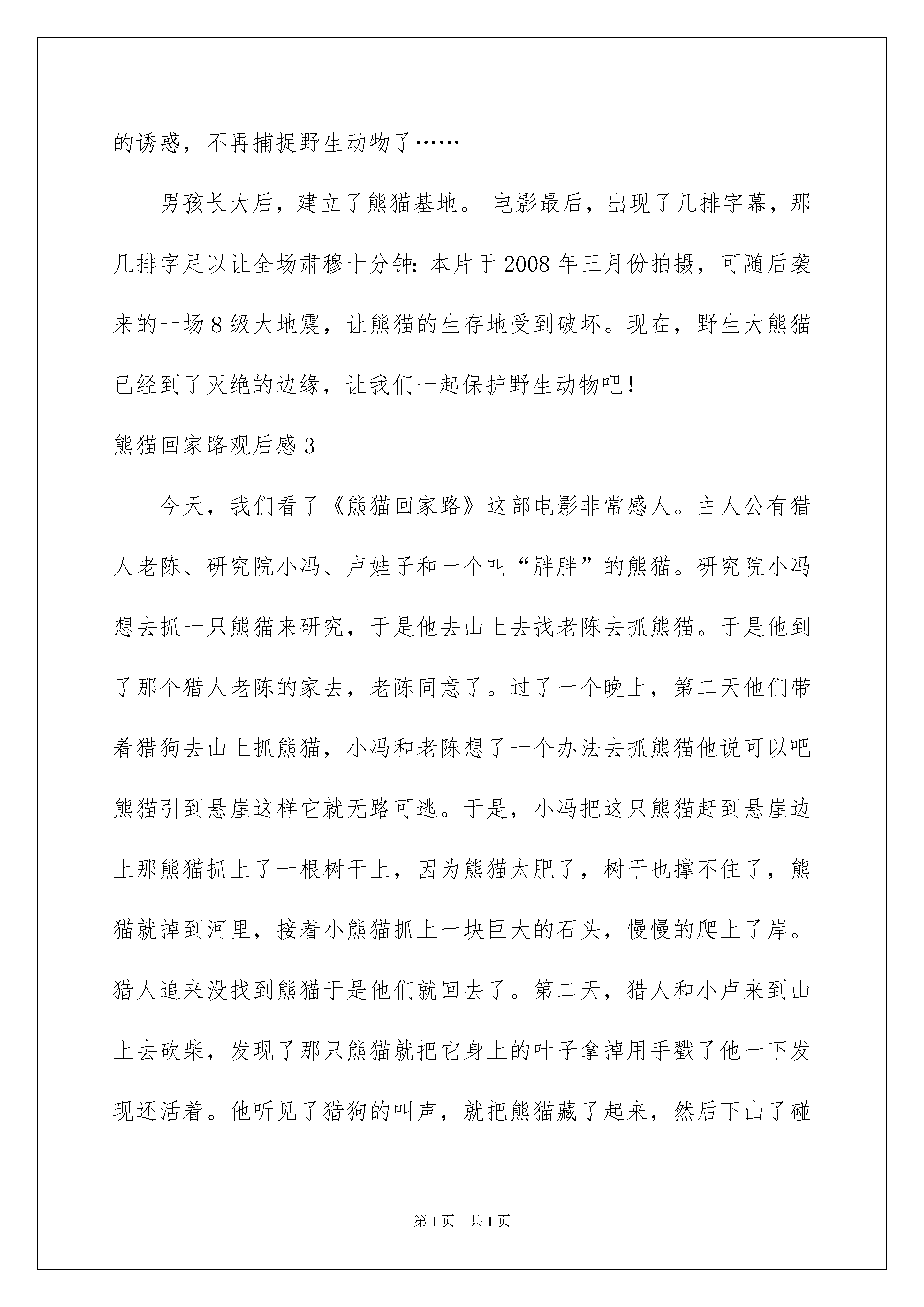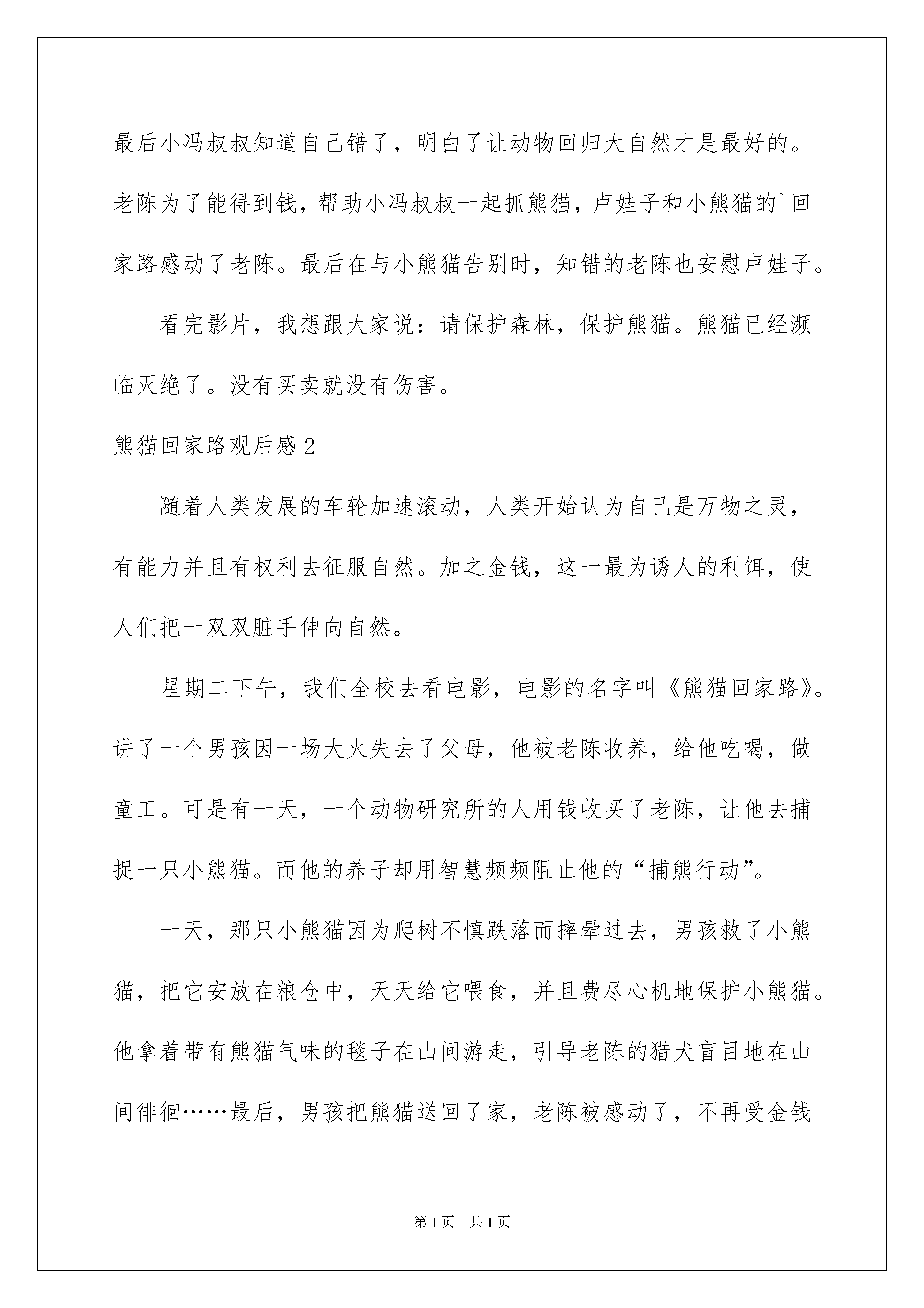2022熊猫回家路观后感熊猫回家路观后感认真品味一部作品后,能够给我们不少启示,是时候静下心来好好写写观后感了。那要怎么写好观后感呢?下面是我为大家整理的熊猫回家路观后感,欢迎阅读,希望大家能够喜欢。熊猫回家路观后感1今天我看了电影《熊猫回家路》里面的主角有:卢娃子、老陈和小冯还有小熊猫。影片讲述了这样一个感人的故事:卢娃子在他五岁的时候,一场大火夺走了他父母的生命,之后他被好心的老陈收留了。小冯是一位熊猫研究员,他和老陈上山抓熊猫,不小心让小熊猫从悬崖上掉了下去,又不幸坠入湍急的河流,最后被卢娃子救下了。卢娃子知道老陈和小冯要抓小熊猫,所以他把熊猫藏起来,并取名为胖胖。但世上没有不透风的墙,老陈和小冯还是找到了小熊猫,卢娃子知道小熊猫最安全的地方就是熊猫妈妈的身边。卢娃子带着小熊猫踏上了寻找回家的旅程。开始小冯叔叔为了研究熊猫,觉得把熊猫关起来是对的,到最后小冯叔叔知道自己错了,明白了让动物回归大自然才是最好的。老陈为了能得到钱,帮助小冯叔叔一起抓熊猫,卢娃子和小熊猫的`回家路感动了老陈。最后在与小熊猫告别时,知错的老陈也安慰卢娃子。看完影片,我想跟大家说:请保护森林,保护熊猫。熊猫已经濒临灭绝了。没有买卖就没有伤害。熊猫回家路观后感2随着人类发展的车轮加速滚动,人类开始认为自己是万物之灵,有能力并且有权利去征服自然。加之金钱,这一最为诱人的利饵,使人们把一双双脏手伸向自然。星期二下午,我们全校去看电影,电影的名字叫《熊猫回家路》。讲了一个男孩因一场大火失去了父母,他被老陈收养,给他吃喝,做童工。可是有一天,一个动物研究所的人用钱收买了老陈,让他去捕捉一只小熊猫。而他的养子却用智慧频频阻止他的“捕熊行动”。一天,那只小熊猫因为爬树不慎跌落而摔晕过去,男孩救了小熊猫,把它安放在粮仓中,天天给它喂食,并且费尽心机地保护小熊猫。他拿着带有熊猫气味的毯子在山间游走,引导老陈的猎犬盲目地在山间徘徊……最后,男孩把熊猫送回了家,老陈被感动了,不再受金钱的诱惑,不再捕捉野生动物了……男孩长大后,建立了熊猫基地。电影最后,出现了几排字幕,那几排字足以让全场肃穆十分钟:本片于2008年三月份拍摄,可随后袭来的一场8级大地震,让熊猫的生存地受到破坏。现在,野生大熊猫已经到了灭绝的边缘,让我们一起保护野生动物吧!熊猫回家路观后感3今天,我们看了《熊猫回家路》这部电影非常感人。主人公有猎人老陈、研究院小冯、卢娃子和一个叫“胖胖”的熊猫。研究院小冯想去抓一只熊猫来研究,于是他去山上去找老陈去抓熊猫。于是他到了那个猎人老陈的家去,老陈同意了。过了一个晚上,第二天他们带着猎狗去山上抓熊猫,小冯和老陈想了一个办法去抓熊猫他说可以吧熊猫引到悬崖这样它就无路可逃。于是,小冯把这只熊猫赶到悬崖边上那熊猫抓上了一根树干上,因为熊猫太肥了,树干也撑不住了,熊猫就掉到河里,接着小熊猫抓上一块巨大的石头,慢慢的爬上了岸。猎人追来没找到熊猫于是他们就回去了。第二天,猎人和小卢来到山上去砍柴,发现了那只熊猫就把它身上的叶子拿掉用手戳了他一下发现还活着。他听见了猎狗的叫声,就把熊猫藏了起来,然后下山了碰到了爷爷,猎人看他的框不见了,就问他“你的框呢。”他一声不响,猎人就要他回去吃饭。于是,他拿着被子把那只熊猫抱到一个木屋里去把它养起来。最终熊猫被老陈和小冯给抓住了,可是卢娃子一心要把熊猫放回大自然去。老陈和小冯被卢娃子感动了,他们打算不抓熊猫了。看了这部电影后,我的感想是动物属于大自然的,我们要保护小动物,爱护小动物。假如没有卢娃子执着的救熊猫,那么小熊猫再也看不见自己的妈妈了,就会关在笼子里,不能自由自在的在森林里玩耍了。这对熊猫是多么的痛苦啊。我觉得我们每个人都要像卢娃子一样关心爱护小动物,这样人和动物才能和谐相处。熊猫回家路观后感4今天我去工人影院看了《熊猫回家路》这个电影,里面的“小卢”和“胖胖”使我深受感动。电影讲的是小卢的父母在一场农场大火里离他而去了,他只有孤零零的一个人,是好心的老陈收留了他,有一天,一个研究熊猫的人来抓熊猫,这熊猫东躲西逃,最后跌在了大石头上,晕了过去,第二天,小卢看见了他,就把它带到了一个只有自己知道的地方藏了起来,每天去看他,给他吃东西,用竹子粉配牦牛奶给他吃,还能把竹叶剁的一点一点的,喂胖胖吃最后把胖胖带去他妈妈那里。我觉得里面的小卢非常的爱里面的胖胖,很想保护它,这就像是人们所说的当人想保护一个人、一个事物、一个事件或一个动物时,都会变得很强大,有一种不达目的不罢休的精神,如果有人想阻拦,还是会千方百计的去完成,直到完成为止,我认为电影里面的小卢有着这样的精神,他虽然平凡,但是很