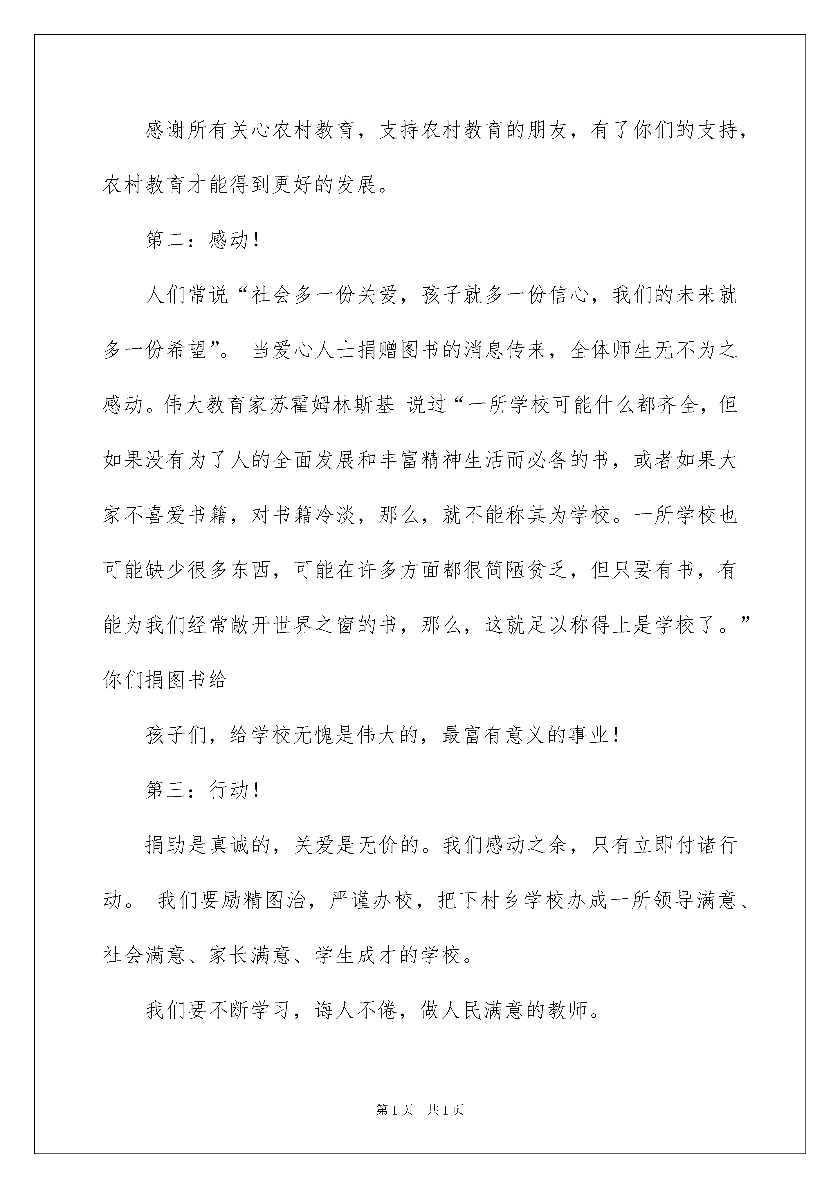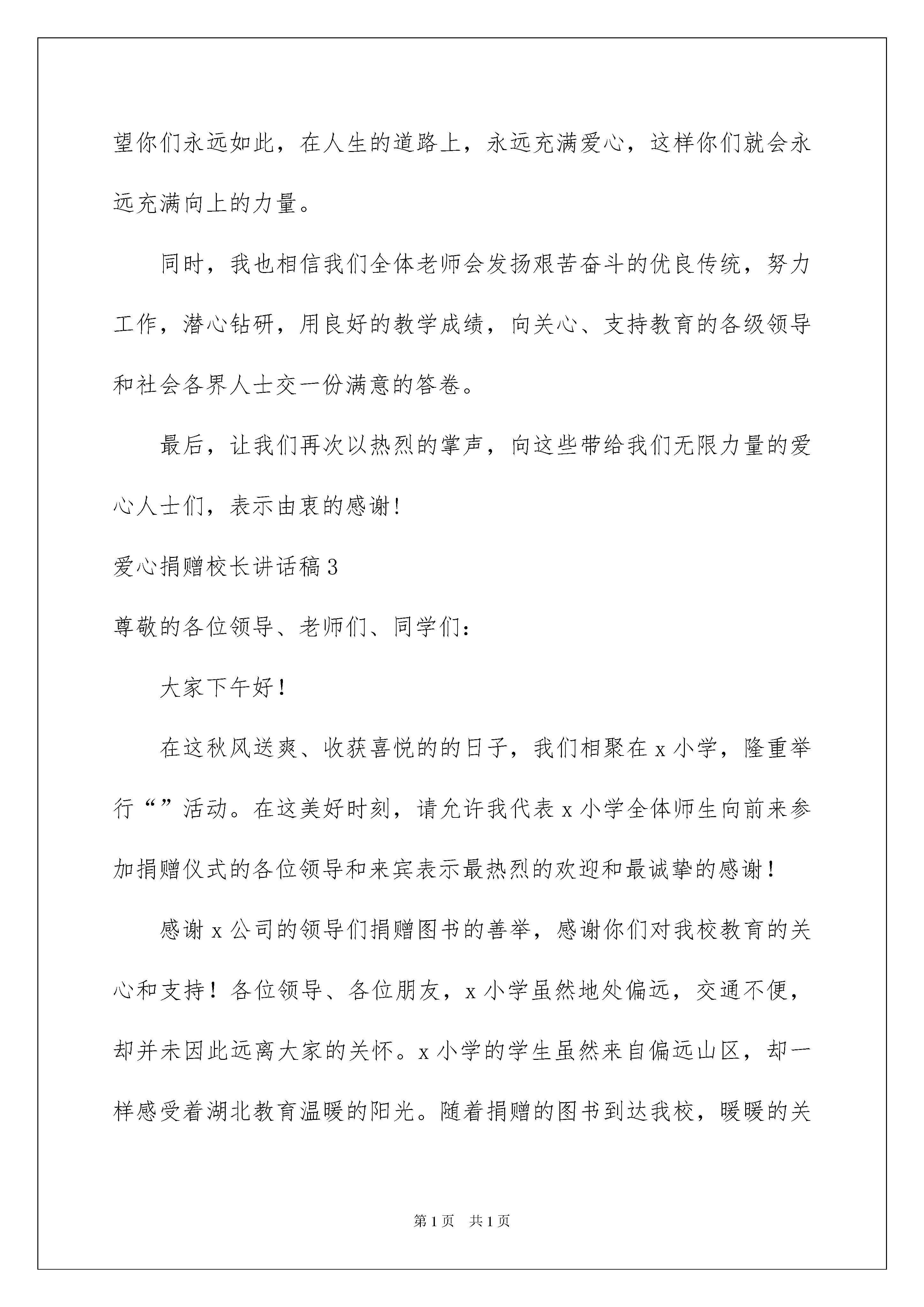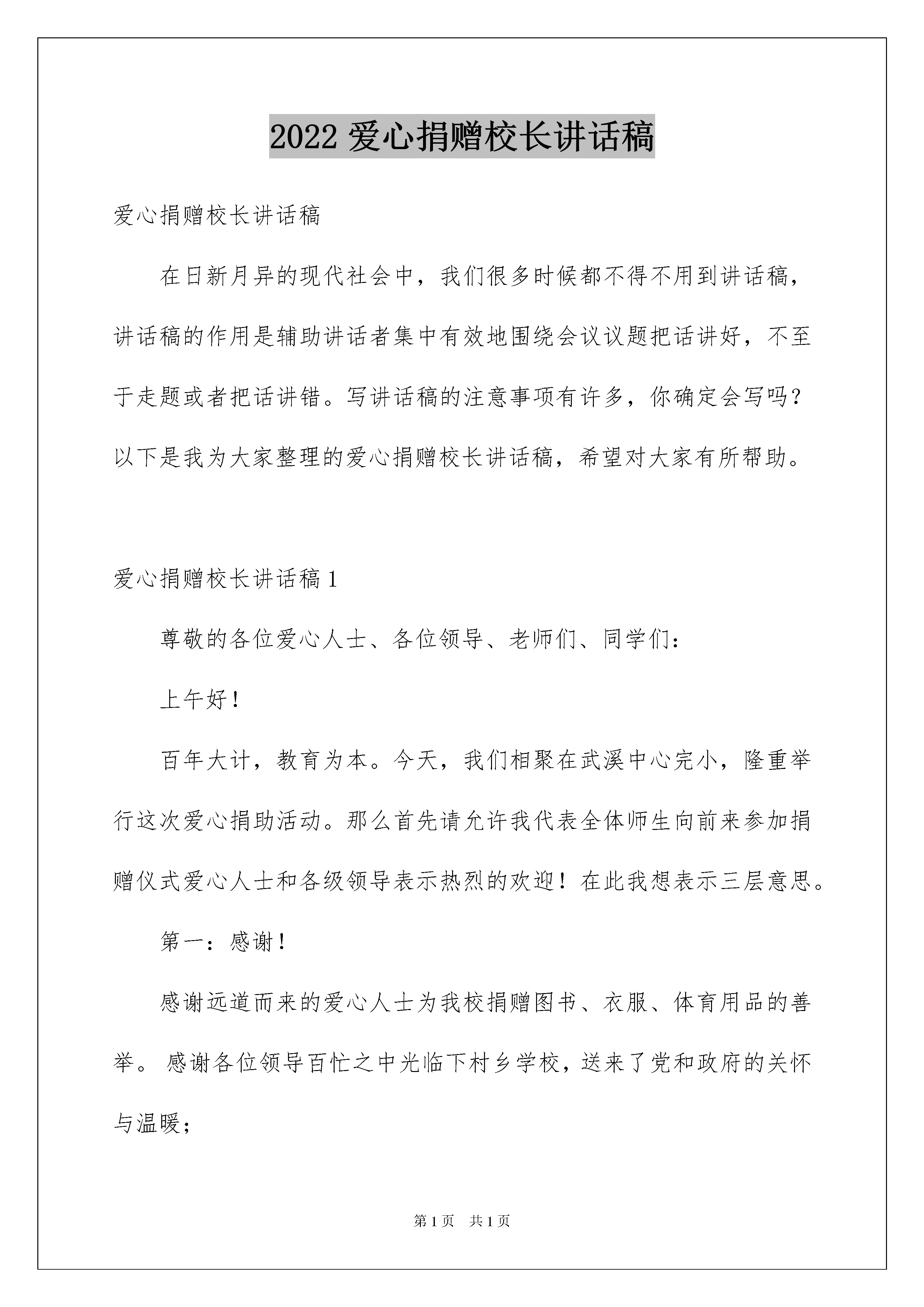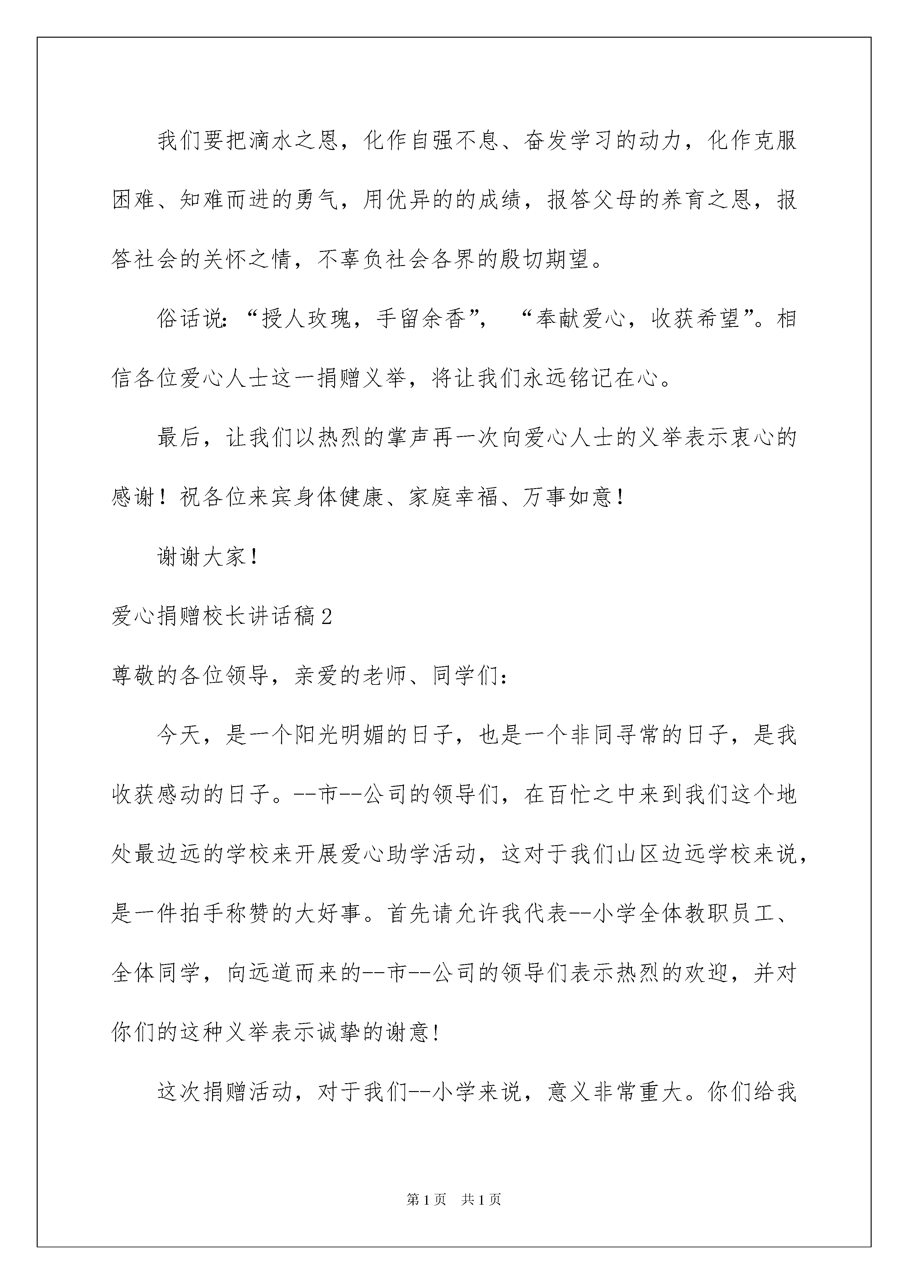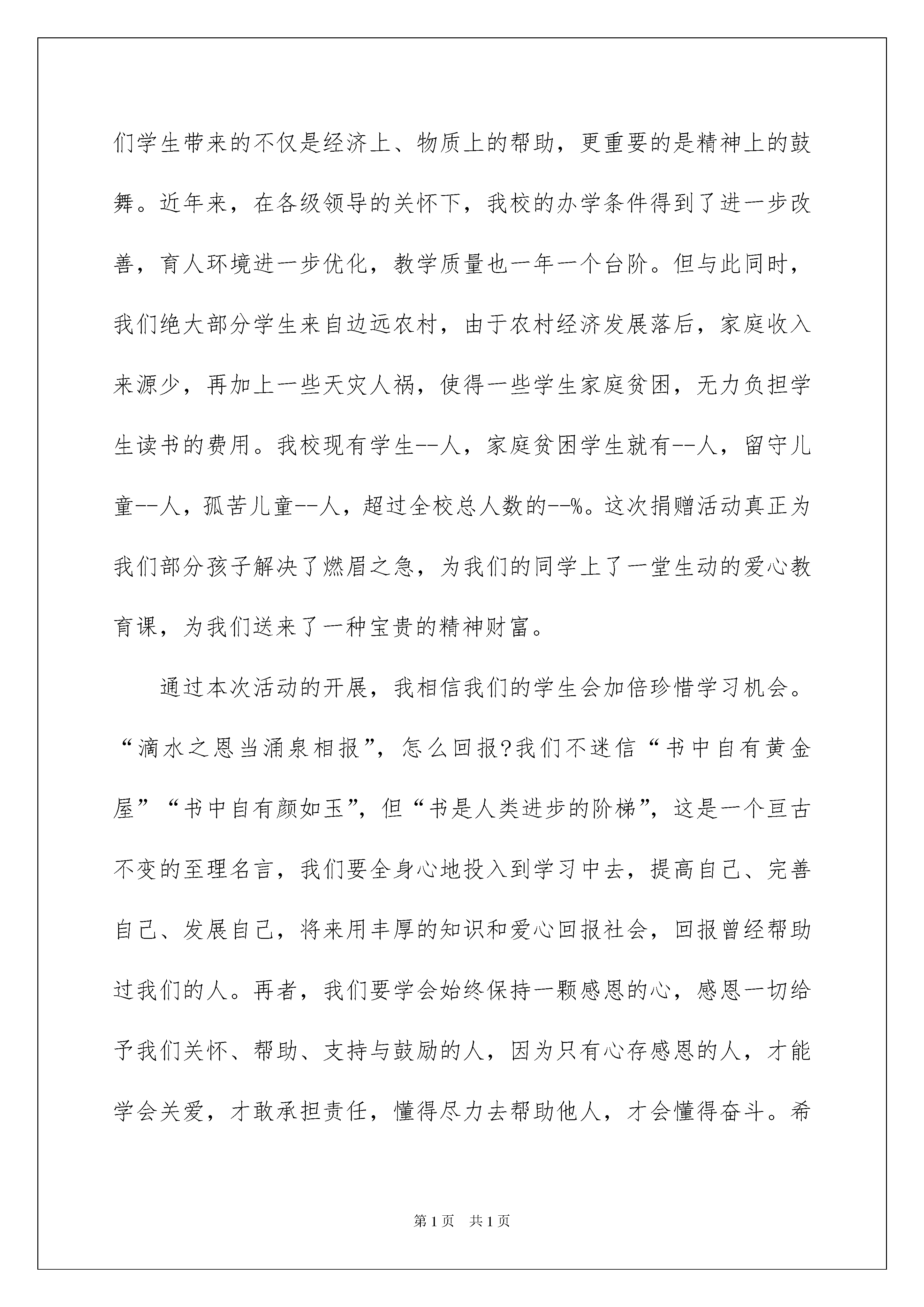 2022爱心捐赠校长讲话稿爱心捐赠校长讲话稿在日新月异的现代社会中,我们很多时候都不得不用到讲话稿,讲话稿的作用是辅助讲话者集中有效地围绕会议议题把话讲好,不至于走题或者把话讲错。写讲话稿的注意事项有许多,你确定会写吗?以下是我为大家整理的爱心捐赠校长讲话稿,希望对大家有所帮助。爱心捐赠校长讲话稿1尊敬的各位爱心人士、各位领导、老师们、同学们:上午好!百年大计,教育为本。今天,我们相聚在武溪中心完小,隆重举行这次爱心捐助活动。那么首先请允许我代表全体师生向前来参加捐赠仪式爱心人士和各级领导表示热烈的欢迎!在此我想表示三层意思。第一:感谢!感谢远道而来的爱心人士为我校捐赠图书、衣服、体育用品的善举。感谢各位领导百忙之中光临下村乡学校,送来了党和政府的关怀与温暖;感谢所有关心农村教育,支持农村教育的朋友,有了你们的支持,农村教育才能得到更好的发展。第二:感动!人们常说“社会多一份关爱,孩子就多一份信心,我们的未来就多一份希望”。当爱心人士捐赠图书的消息传来,全体师生无不为之感动。伟大教育家苏霍姆林斯基说过“一所学校可能什么都齐全,但如果没有为了人的全面发展和丰富精神生活而必备的书,或者如果大家不喜爱书籍,对书籍冷淡,那么,就不能称其为学校。一所学校也可能缺少很多东西,可能在许多方面都很简陋贫乏,但只要有书,有能为我们经常敞开世界之窗的书,那么,这就足以称得上是学校了。”你们捐图书给孩子们,给学校无愧是伟大的,最富有意义的事业!第三:行动!捐助是真诚的,关爱是无价的。我们感动之余,只有立即付诸行动。我们要励精图治,严谨办校,把下村乡学校办成一所领导满意、社会满意、家长满意、学生成才的学校。我们要不断学习,诲人不倦,做人民满意的教师。我们要把滴水之恩,化作自强不息、奋发学习的动力,化作克服困难、知难而进的勇气,用优异的的成绩,报答父母的养育之恩,报答社会的关怀之情,不辜负社会各界的殷切期望。俗话说:“授人玫瑰,手留余香”,“奉献爱心,收获希望”。相信各位爱心人士这一捐赠义举,将让我们永远铭记在心。最后,让我们以热烈的掌声再一次向爱心人士的义举表示衷心的感谢!祝各位来宾身体健康、家庭幸福、万事如意!谢谢大家!爱心捐赠校长讲话稿2尊敬的各位领导,亲爱的老师、同学们:今天,是一个阳光明媚的日子,也是一个非同寻常的日子,是我收获感动的日子。--市--公司的领导们,在百忙之中来到我们这个地处最边远的学校来开展爱心助学活动,这对于我们山区边远学校来说,是一件拍手称赞的大好事。首先请允许我代表--小学全体教职员工、全体同学,向远道而来的--市--公司的领导们表示热烈的欢迎,并对你们的这种义举表示诚挚的谢意!这次捐赠活动,对于我们--小学来说,意义非常重大。你们给我们学生带来的不仅是经济上、物质上的帮助,更重要的是精神上的鼓舞。近年来,在各级领导的关怀下,我校的办学条件得到了进一步改善,育人环境进一步优化,教学质量也一年一个台阶。但与此同时,我们绝大部分学生来自边远农村,由于农村经济发展落后,家庭收入来源少,再加上一些天灾人祸,使得一些学生家庭贫困,无力负担学生读书的费用。我校现有学生--人,家庭贫困学生就有--人,留守儿童--人,孤苦儿童--人,超过全校总人数的--%。这次捐赠活动真正为我们部分孩子解决了燃眉之急,为我们的同学上了一堂生动的爱心教育课,为我们送来了一种宝贵的精神财富。通过本次活动的开展,我相信我们的学生会加倍珍惜学习机会。“滴水之恩当涌泉相报”,怎么回报?我们不迷信“书中自有黄金屋”“书中自有颜如玉”,但“书是人类进步的阶梯”,这是一个亘古不变的至理名言,我们要全身心地投入到学习中去,提高自己、完善自己、发展自己,将来用丰厚的知识和爱心回报社会,回报曾经帮助过我们的人。再者,我们要学会始终保持一颗感恩的心,感恩一切给予我们关怀、帮助、支持与鼓励的人,因为只有心存感恩的人,才能学会关爱,才敢承担责任,懂得尽力去帮助他人,才会懂得奋斗。希望你们永远如此,在人生的道路上,永远充满爱心,这样你们就会永远充满向上的力量。同时,我也相信我们全体老师会发扬艰苦奋斗的优良传统,努力工作,潜心钻研,用良好的教学成绩,向关心、支持教育的各级领导和社会各界人士交一份满意的答卷。最后,让我们再次以热烈的掌声,向这些带给我们无限力量的爱心人士们,表示由衷的感谢!爱心捐赠校长讲话稿3尊敬的各位领导、老师们、同学们:大家下午好!在这秋风送爽、收获喜悦的的日子,我们相聚在x小学,隆重举行“”活动。在这美好时刻,请允许我代表x小学全体师生向前来参加捐赠仪式的各位领导和来宾表示最热烈的欢迎和最诚挚的感谢!感谢x公