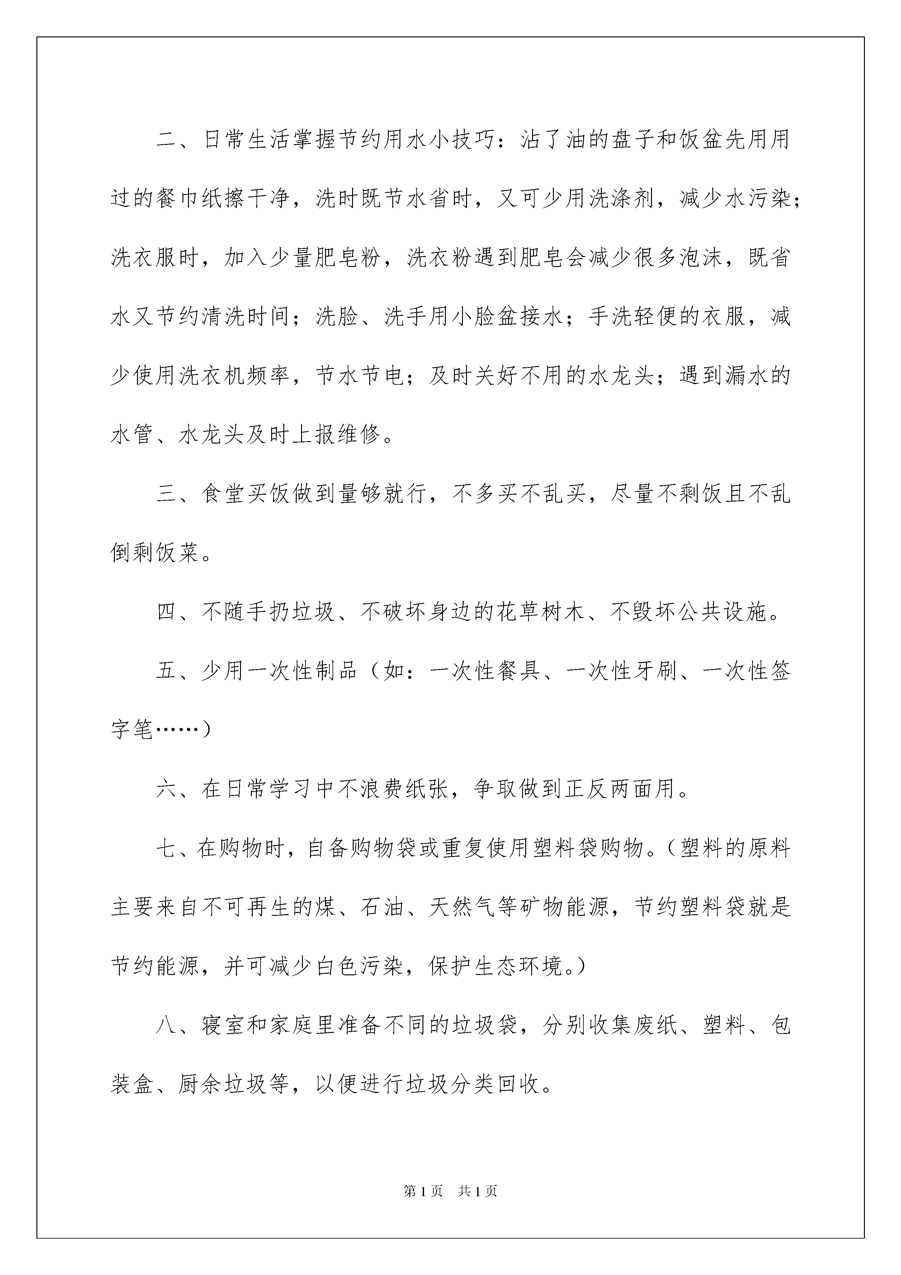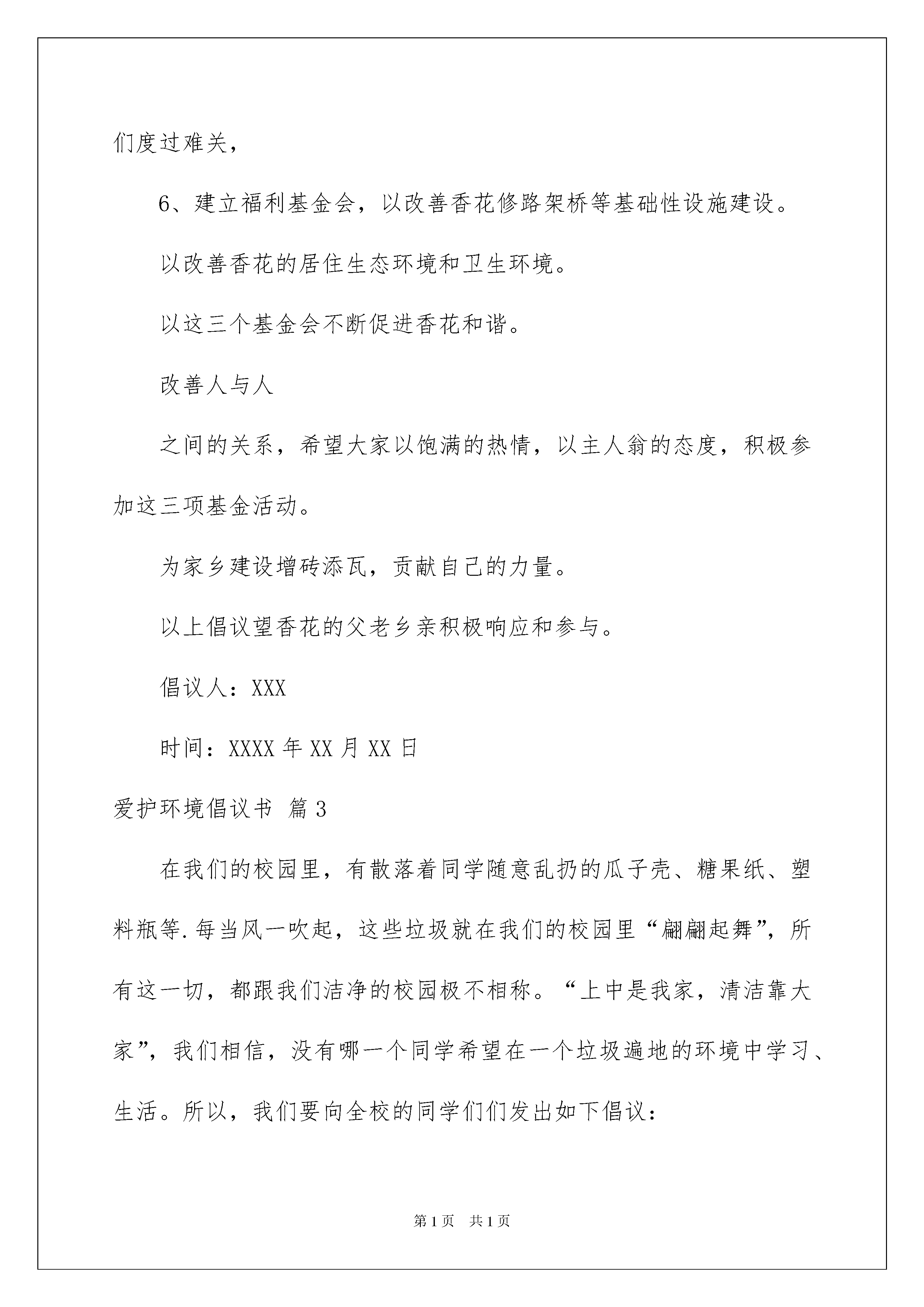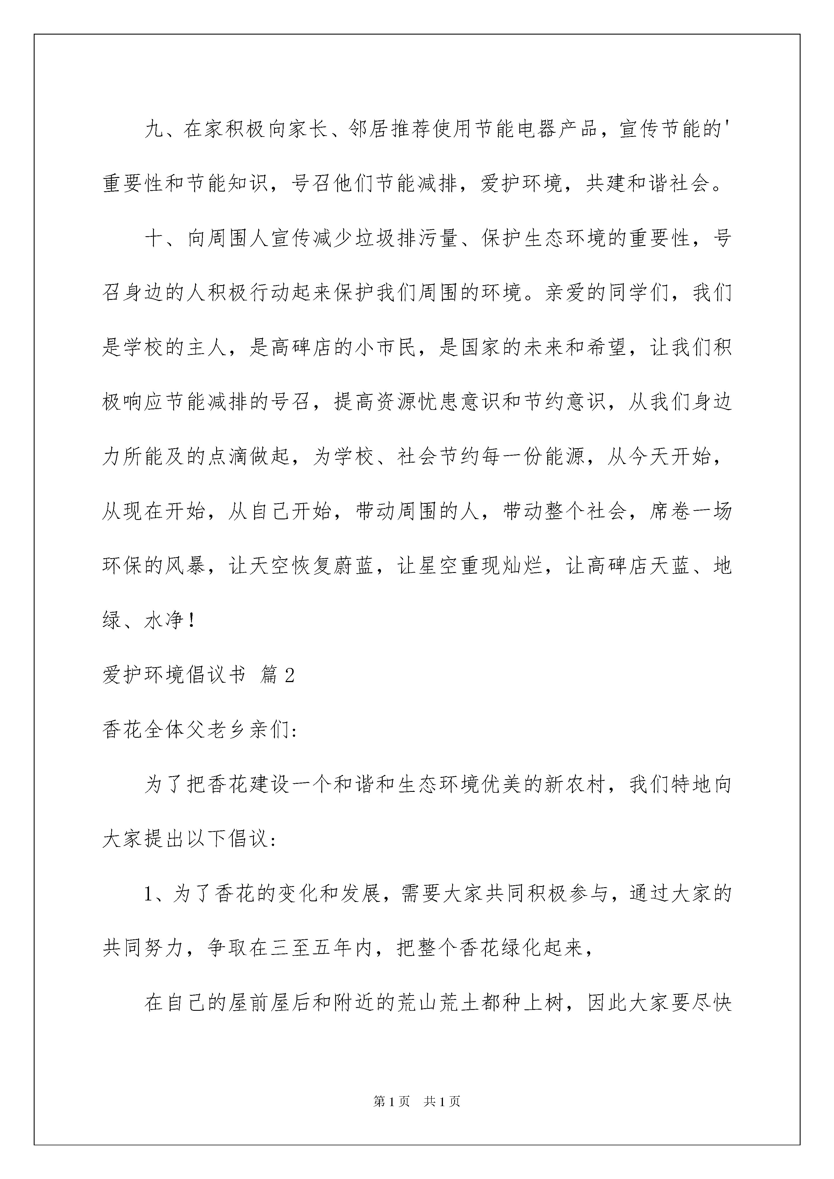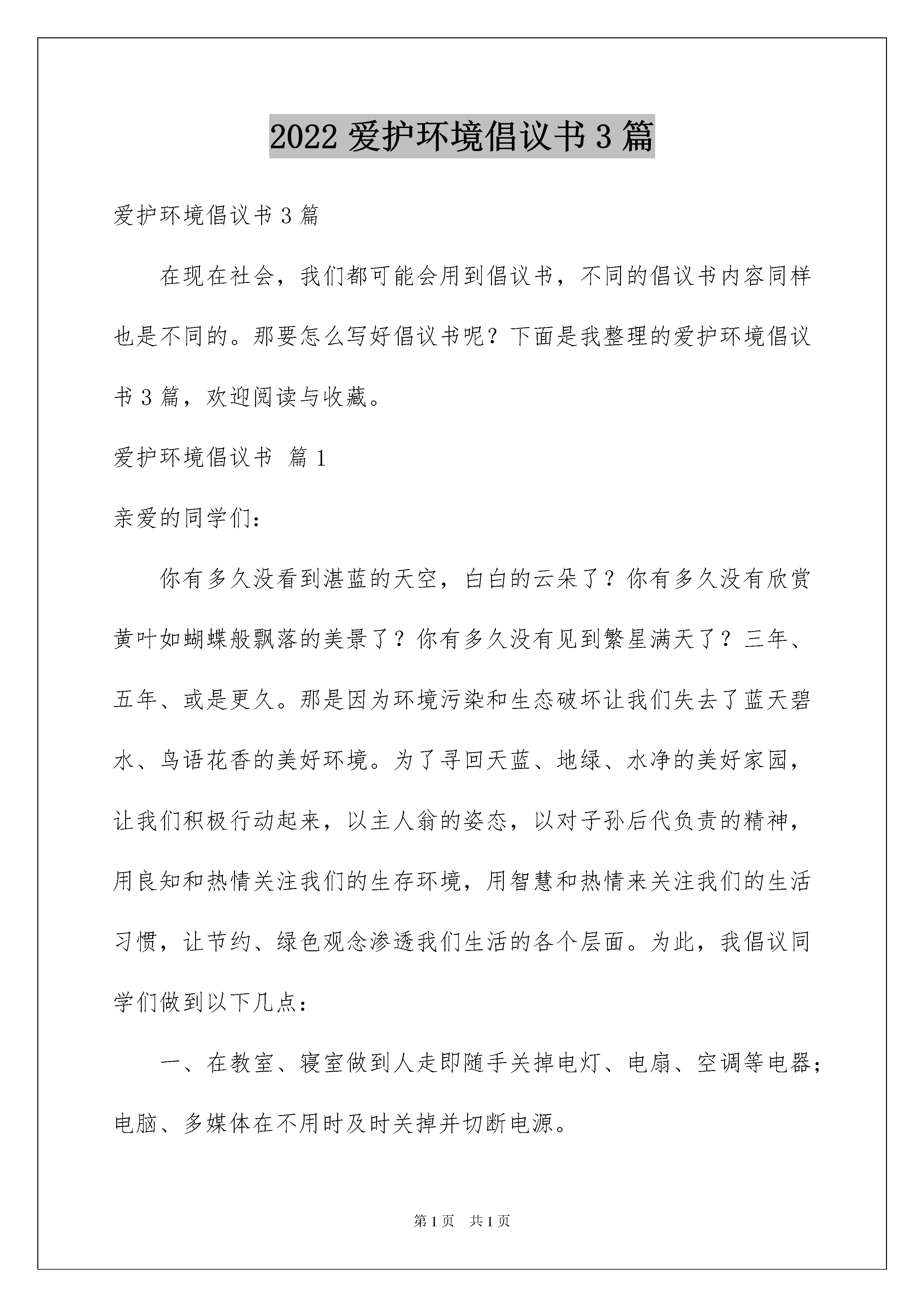 2022爱护环境倡议书3篇爱护环境倡议书3篇在现在社会,我们都可能会用到倡议书,不同的倡议书内容同样也是不同的。那要怎么写好倡议书呢?下面是我整理的爱护环境倡议书3篇,欢迎阅读与收藏。爱护环境倡议书篇1亲爱的同学们:你有多久没看到湛蓝的天空,白白的云朵了?你有多久没有欣赏黄叶如蝴蝶般飘落的美景了?你有多久没有见到繁星满天了?三年、五年、或是更久。那是因为环境污染和生态破坏让我们失去了蓝天碧水、鸟语花香的美好环境。为了寻回天蓝、地绿、水净的美好家园,让我们积极行动起来,以主人翁的姿态,以对子孙后代负责的精神,用良知和热情关注我们的生存环境,用智慧和热情来关注我们的生活习惯,让节约、绿色观念渗透我们生活的各个层面。为此,我倡议同学们做到以下几点:一、在教室、寝室做到人走即随手关掉电灯、电扇、空调等电器;电脑、多媒体在不用时及时关掉并切断电源。二、日常生活掌握节约用水小技巧:沾了油的盘子和饭盆先用用过的餐巾纸擦干净,洗时既节水省时,又可少用洗涤剂,减少水污染;洗衣服时,加入少量肥皂粉,洗衣粉遇到肥皂会减少很多泡沫,既省水又节约清洗时间;洗脸、洗手用小脸盆接水;手洗轻便的衣服,减少使用洗衣机频率,节水节电;及时关好不用的水龙头;遇到漏水的水管、水龙头及时上报维修。三、食堂买饭做到量够就行,不多买不乱买,尽量不剩饭且不乱倒剩饭菜。四、不随手扔垃圾、不破坏身边的花草树木、不毁坏公共设施。五、少用一次性制品(如:一次性餐具、一次性牙刷、一次性签字笔……)六、在日常学习中不浪费纸张,争取做到正反两面用。七、在购物时,自备购物袋或重复使用塑料袋购物。(塑料的原料主要来自不可再生的煤、石油、天然气等矿物能源,节约塑料袋就是节约能源,并可减少白色污染,保护生态环境。)八、寝室和家庭里准备不同的垃圾袋,分别收集废纸、塑料、包装盒、厨余垃圾等,以便进行垃圾分类回收。九、在家积极向家长、邻居推荐使用节能电器产品,宣传节能的'重要性和节能知识,号召他们节能减排,爱护环境,共建和谐社会。十、向周围人宣传减少垃圾排污量、保护生态环境的重要性,号召身边的人积极行动起来保护我们周围的环境。亲爱的同学们,我们是学校的主人,是高碑店的小市民,是国家的未来和希望,让我们积极响应节能减排的号召,提高资源忧患意识和节约意识,从我们身边力所能及的点滴做起,为学校、社会节约每一份能源,从今天开始,从现在开始,从自己开始,带动周围的人,带动整个社会,席卷一场环保的风暴,让天空恢复蔚蓝,让星空重现灿烂,让高碑店天蓝、地绿、水净!爱护环境倡议书篇2香花全体父老乡亲们:为了把香花建设一个和谐和生态环境优美的新农村,我们特地向大家提出以下倡议:1、为了香花的变化和发展,需要大家共同积极参与,通过大家的共同努力,争取在三至五年内,把整个香花绿化起来,在自己的屋前屋后和附近的荒山荒土都种上树,因此大家要尽快行动起来,绿化自己的家园和整个香花村,使香花变成青山绿水,花香鸟语的幸福乐园。2、我们同处一个自然村,要把整个香花当成一个大家庭,大家要互相关心,互相帮助,互相尊重,互相支持,互相信任,争做一个有良心,有爱心,有文化,有道德修养,有正义感,讲卫生懂礼貌,勤劳致富,遵纪守法,受人尊重和爱戴的良好村民,大家共同努力,克服和抵制各种不良倾向,积极参与各项文体活动,提高自己的身体素质和生活质量,大家在文体活动中获得快乐和健康长寿。3、父母要做好孩子的表率作用,认真教育孩子努力学习,艰苦奋斗,尊敬长辈,从小培养他们良好的学习和生活习惯,成为一个有理想,有文化,有教养,有道德,有爱心高素质人才。4、设立教育基金会,以鼓励和奖励考上重点中学和考上大学的优秀孩子,激励孩子的上进性和荣誉感,使香花有更多的孩子能考上大学,成为国家栋梁之才,为家庭争光,为家乡争光,为祖宗争光,5、建立扶贫基金会,大家以爱心伸出援助之手,以帮助那些生活极端贫穷和豪无生活来源的村民,形成一人有难,大家相帮,帮助他们度过难关,6、建立福利基金会,以改善香花修路架桥等基础性设施建设。以改善香花的居住生态环境和卫生环境。以这三个基金会不断促进香花和谐。改善人与人之间的关系,希望大家以饱满的热情,以主人翁的态度,积极参加这三项基金活动。为家乡建设增砖添瓦,贡献自己的力量。以上倡议望香花的父老乡亲积极响应和参与。倡议人:XXX时间:XXXX年XX月XX日爱护环境倡议书篇3在我们的校园里,有散落着同学随意乱扔的瓜子壳、糖果纸、塑料瓶等.每当风一吹起,这些垃圾就在我们的校园里“翩翩起舞”,所有这一切,都跟我们洁净的校园极不相称。“上中是我家,清洁靠大家”,我们相信,没有哪一个同学希望在一个