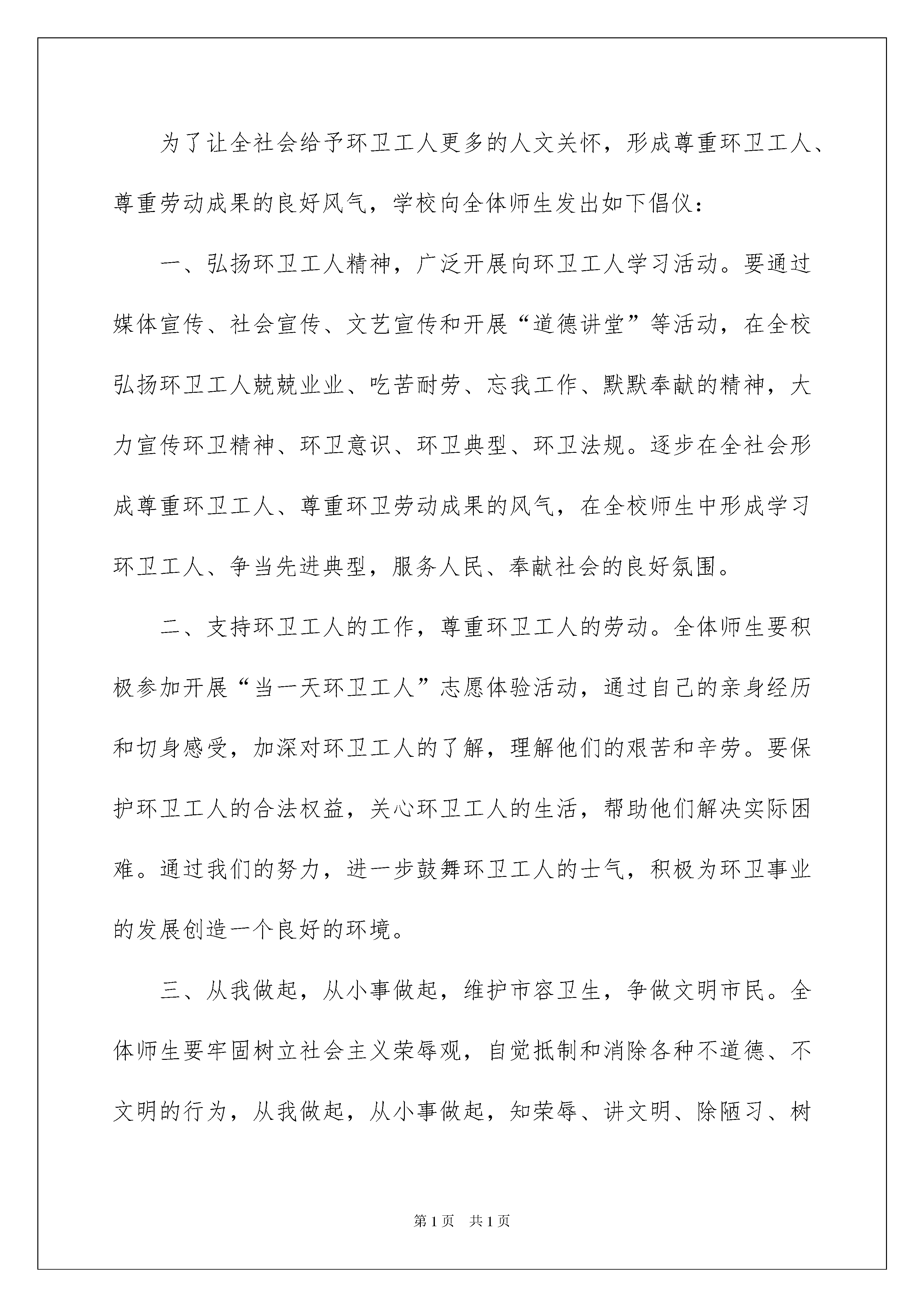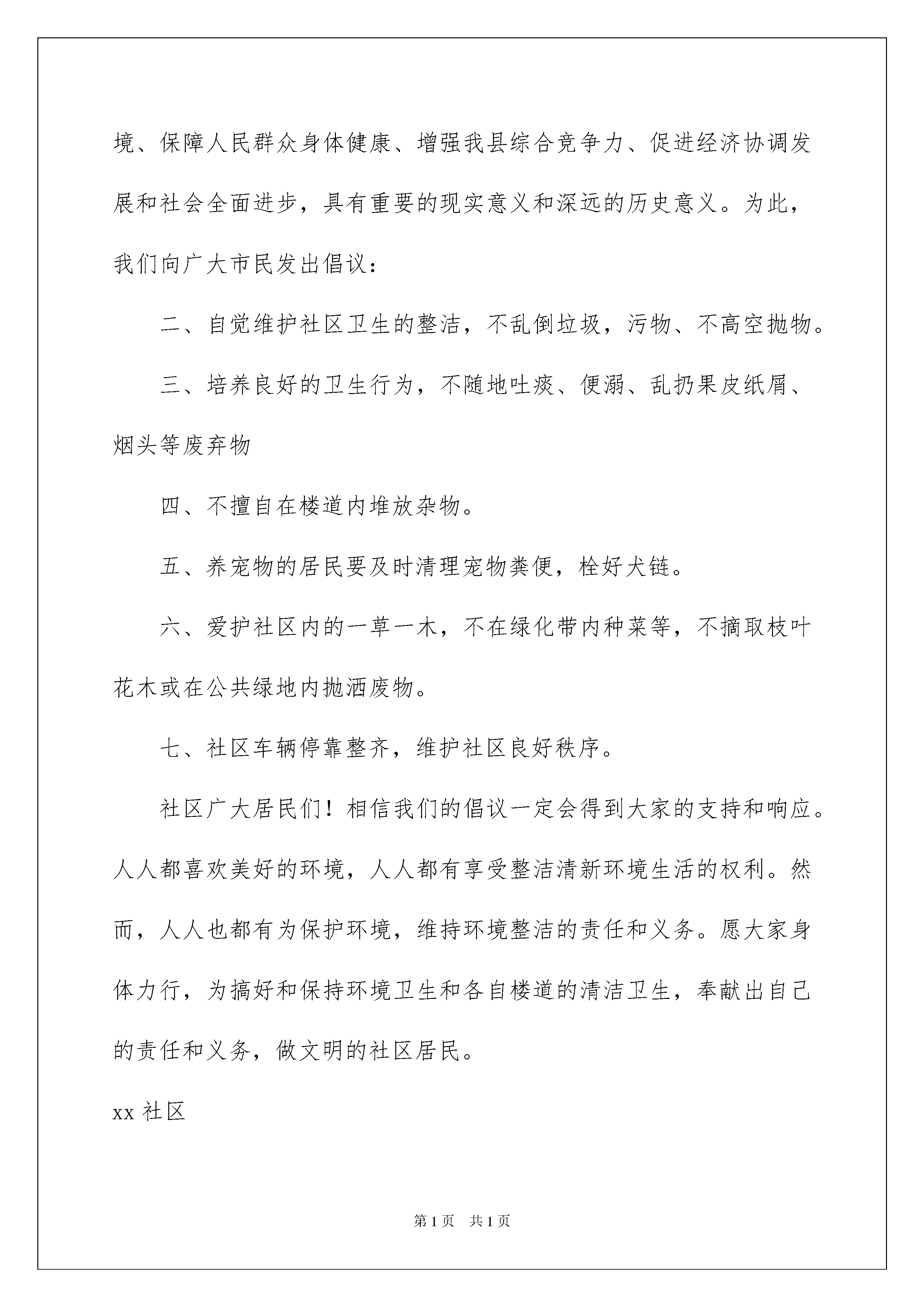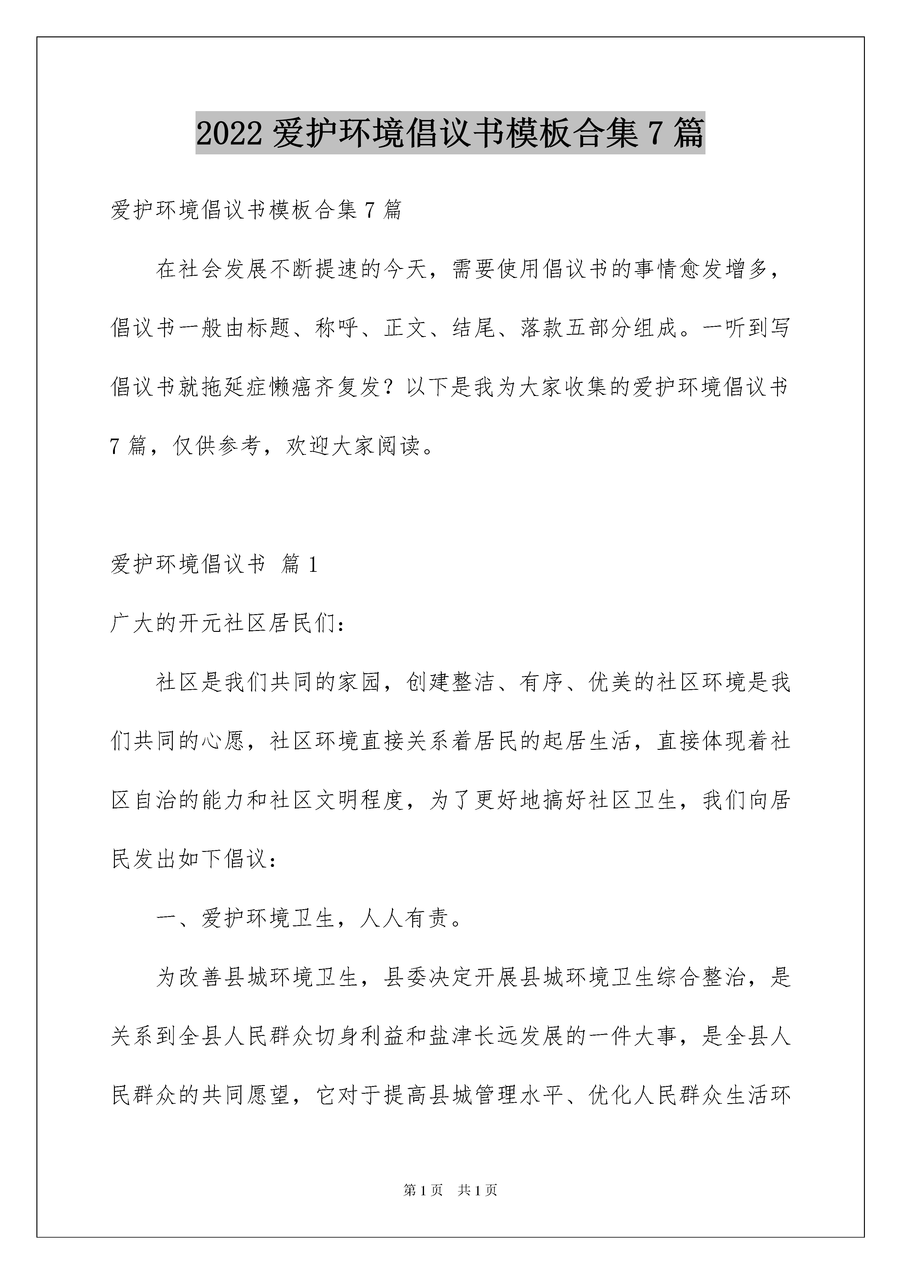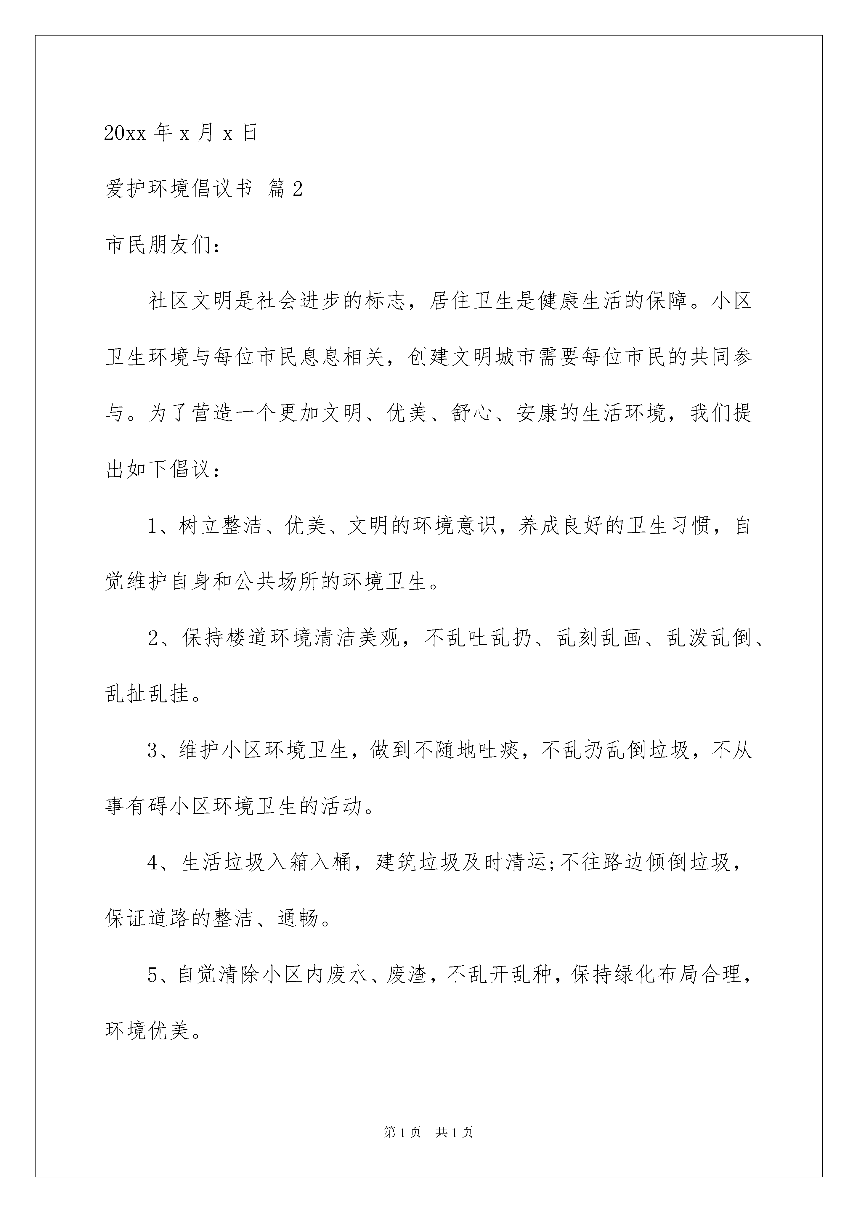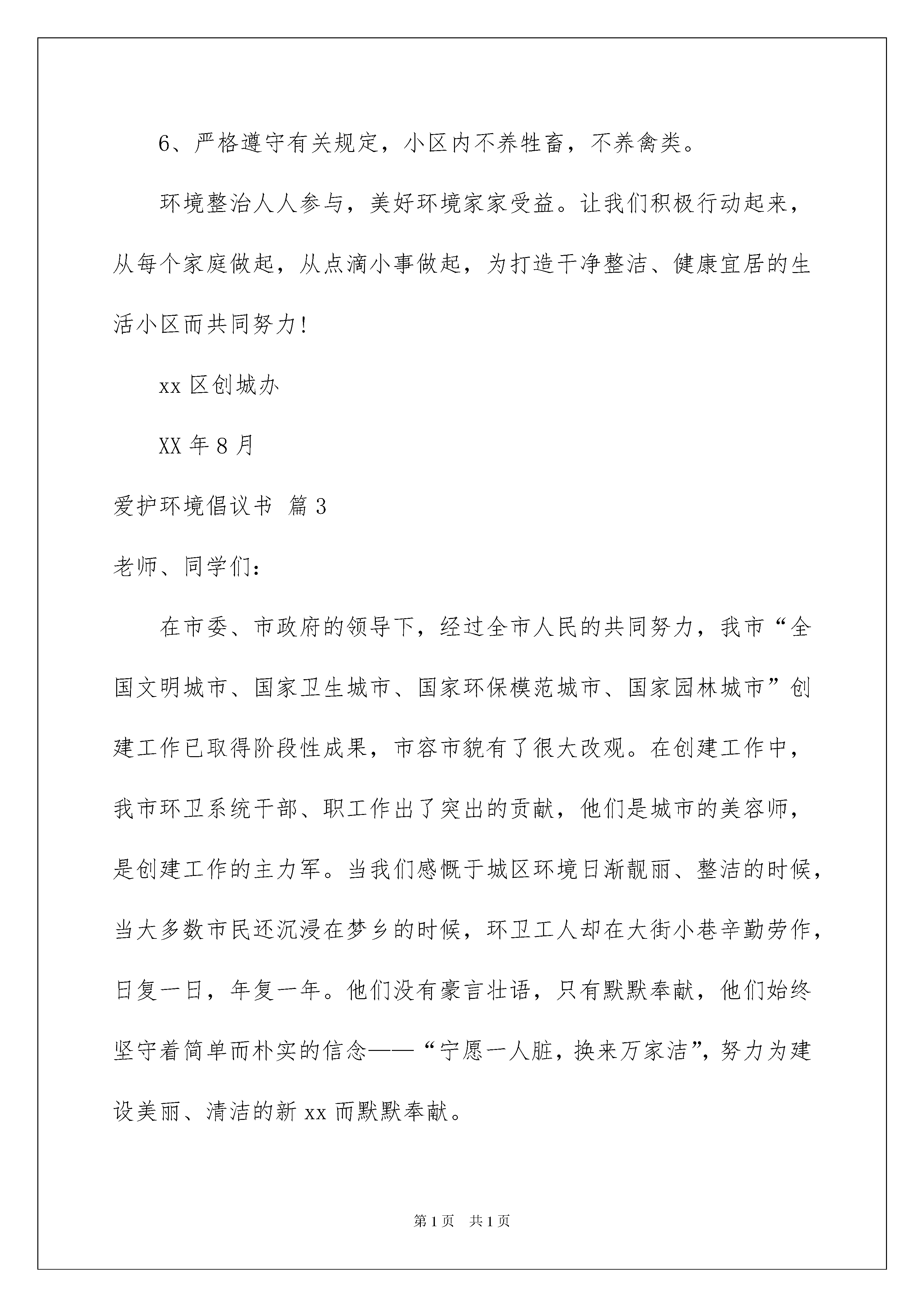 2022爱护环境倡议书模板合集7篇爱护环境倡议书模板合集7篇在社会发展不断提速的今天,需要使用倡议书的事情愈发增多,倡议书一般由标题、称呼、正文、结尾、落款五部分组成。一听到写倡议书就拖延症懒癌齐复发?以下是我为大家收集的爱护环境倡议书7篇,仅供参考,欢迎大家阅读。爱护环境倡议书篇1广大的开元社区居民们:社区是我们共同的家园,创建整洁、有序、优美的社区环境是我们共同的心愿,社区环境直接关系着居民的起居生活,直接体现着社区自治的能力和社区文明程度,为了更好地搞好社区卫生,我们向居民发出如下倡议:一、爱护环境卫生,人人有责。为改善县城环境卫生,县委决定开展县城环境卫生综合整治,是关系到全县人民群众切身利益和盐津长远发展的一件大事,是全县人民群众的共同愿望,它对于提高县城管理水平、优化人民群众生活环境、保障人民群众身体健康、增强我县综合竞争力、促进经济协调发展和社会全面进步,具有重要的现实意义和深远的历史意义。为此,我们向广大市民发出倡议:二、自觉维护社区卫生的整洁,不乱倒垃圾,污物、不高空抛物。三、培养良好的卫生行为,不随地吐痰、便溺、乱扔果皮纸屑、烟头等废弃物四、不擅自在楼道内堆放杂物。五、养宠物的居民要及时清理宠物粪便,栓好犬链。六、爱护社区内的一草一木,不在绿化带内种菜等,不摘取枝叶花木或在公共绿地内抛洒废物。七、社区车辆停靠整齐,维护社区良好秩序。社区广大居民们!相信我们的倡议一定会得到大家的支持和响应。人人都喜欢美好的环境,人人都有享受整洁清新环境生活的权利。然而,人人也都有为保护环境,维持环境整洁的责任和义务。愿大家身体力行,为搞好和保持环境卫生和各自楼道的清洁卫生,奉献出自己的责任和义务,做文明的社区居民。xx社区20xx年x月x日爱护环境倡议书篇2市民朋友们:社区文明是社会进步的标志,居住卫生是健康生活的保障。小区卫生环境与每位市民息息相关,创建文明城市需要每位市民的共同参与。为了营造一个更加文明、优美、舒心、安康的生活环境,我们提出如下倡议:1、树立整洁、优美、文明的环境意识,养成良好的卫生习惯,自觉维护自身和公共场所的环境卫生。2、保持楼道环境清洁美观,不乱吐乱扔、乱刻乱画、乱泼乱倒、乱扯乱挂。3、维护小区环境卫生,做到不随地吐痰,不乱扔乱倒垃圾,不从事有碍小区环境卫生的活动。4、生活垃圾入箱入桶,建筑垃圾及时清运;不往路边倾倒垃圾,保证道路的整洁、通畅。5、自觉清除小区内废水、废渣,不乱开乱种,保持绿化布局合理,环境优美。6、严格遵守有关规定,小区内不养牲畜,不养禽类。环境整治人人参与,美好环境家家受益。让我们积极行动起来,从每个家庭做起,从点滴小事做起,为打造干净整洁、健康宜居的生活小区而共同努力!xx区创城办XX年8月爱护环境倡议书篇3老师、同学们:在市委、市政府的领导下,经过全市人民的共同努力,我市“全国文明城市、国家卫生城市、国家环保模范城市、国家园林城市”创建工作已取得阶段性成果,市容市貌有了很大改观。在创建工作中,我市环卫系统干部、职工作出了突出的贡献,他们是城市的美容师,是创建工作的主力军。当我们感慨于城区环境日渐靓丽、整洁的时候,当大多数市民还沉浸在梦乡的时候,环卫工人却在大街小巷辛勤劳作,日复一日,年复一年。他们没有豪言壮语,只有默默奉献,他们始终坚守着简单而朴实的信念——“宁愿一人脏,换来万家洁”,努力为建设美丽、清洁的新xx而默默奉献。为了让全社会给予环卫工人更多的人文关怀,形成尊重环卫工人、尊重劳动成果的良好风气,学校向全体师生发出如下倡仪:一、弘扬环卫工人精神,广泛开展向环卫工人学习活动。要通过媒体宣传、社会宣传、文艺宣传和开展“道德讲堂”等活动,在全校弘扬环卫工人兢兢业业、吃苦耐劳、忘我工作、默默奉献的精神,大力宣传环卫精神、环卫意识、环卫典型、环卫法规。逐步在全社会形成尊重环卫工人、尊重环卫劳动成果的风气,在全校师生中形成学习环卫工人、争当先进典型,服务人民、奉献社会的良好氛围。二、支持环卫工人的工作,尊重环卫工人的劳动。全体师生要积极参加开展“当一天环卫工人”志愿体验活动,通过自己的亲身经历和切身感受,加深对环卫工人的了解,理解他们的艰苦和辛劳。要保护环卫工人的合法权益,关心环卫工人的生活,帮助他们解决实际困难。通过我们的努力,进一步鼓舞环卫工人的士气,积极为环卫事业的发展创造一个良好的环境。三、从我做起,从小事做起,维护市容卫生,争做文明市民。全体师生要牢固树立社会主义荣辱观,自觉抵制和消除各种不道德、不文明的行为,从我做起,从小事做起,知荣辱、讲文明、除陋习、树新风。做到不随地倾倒垃圾、污水,不向果皮箱扔污浊物、便溺物