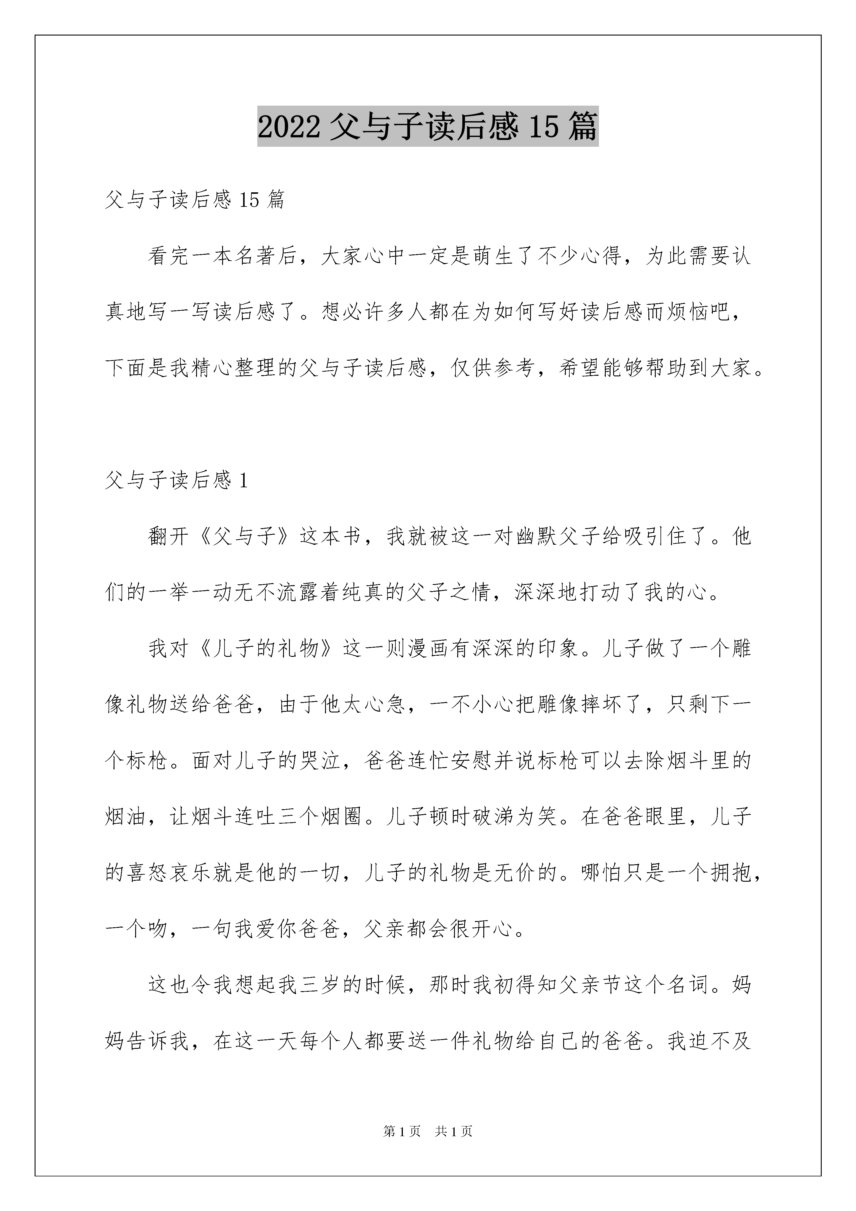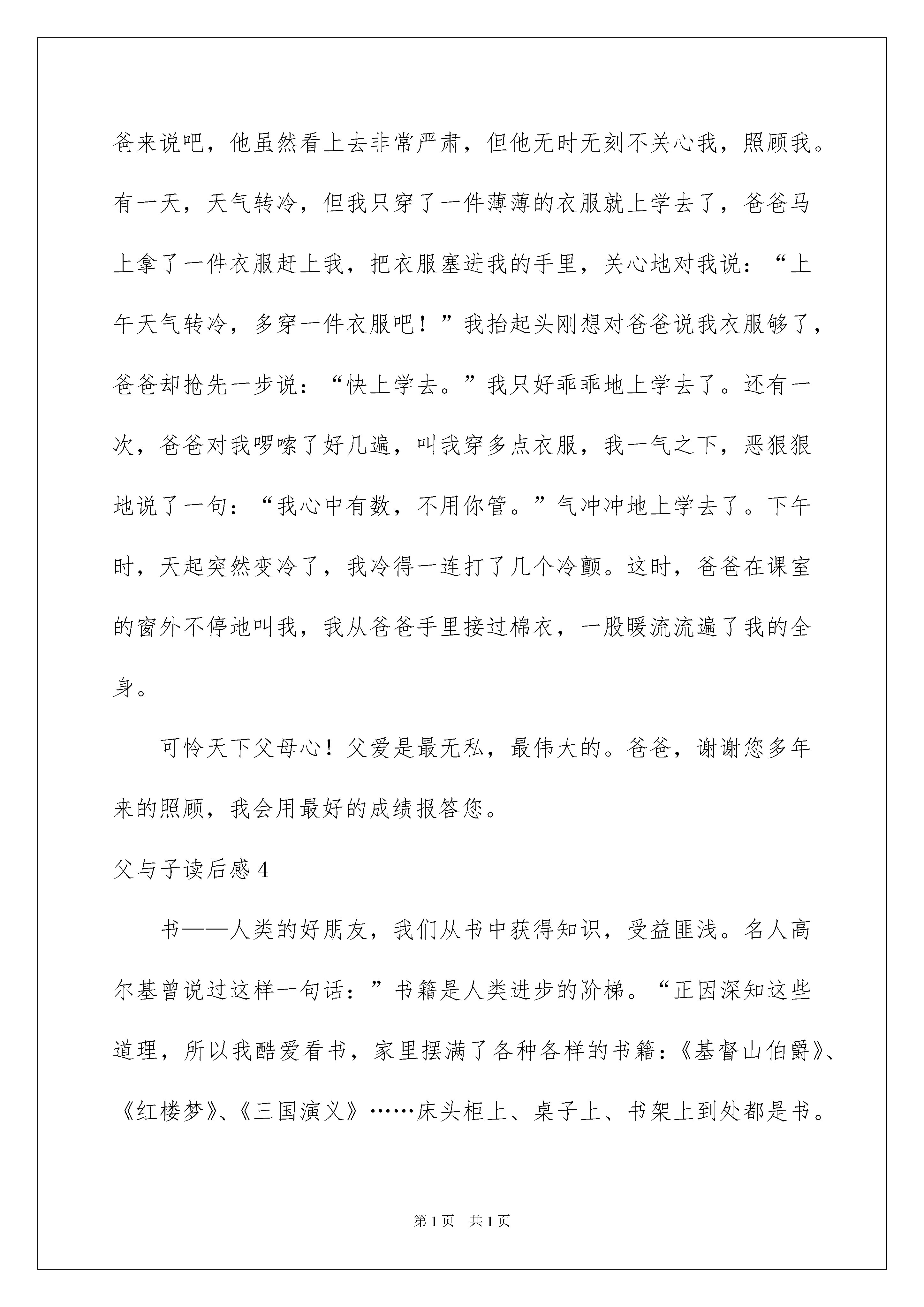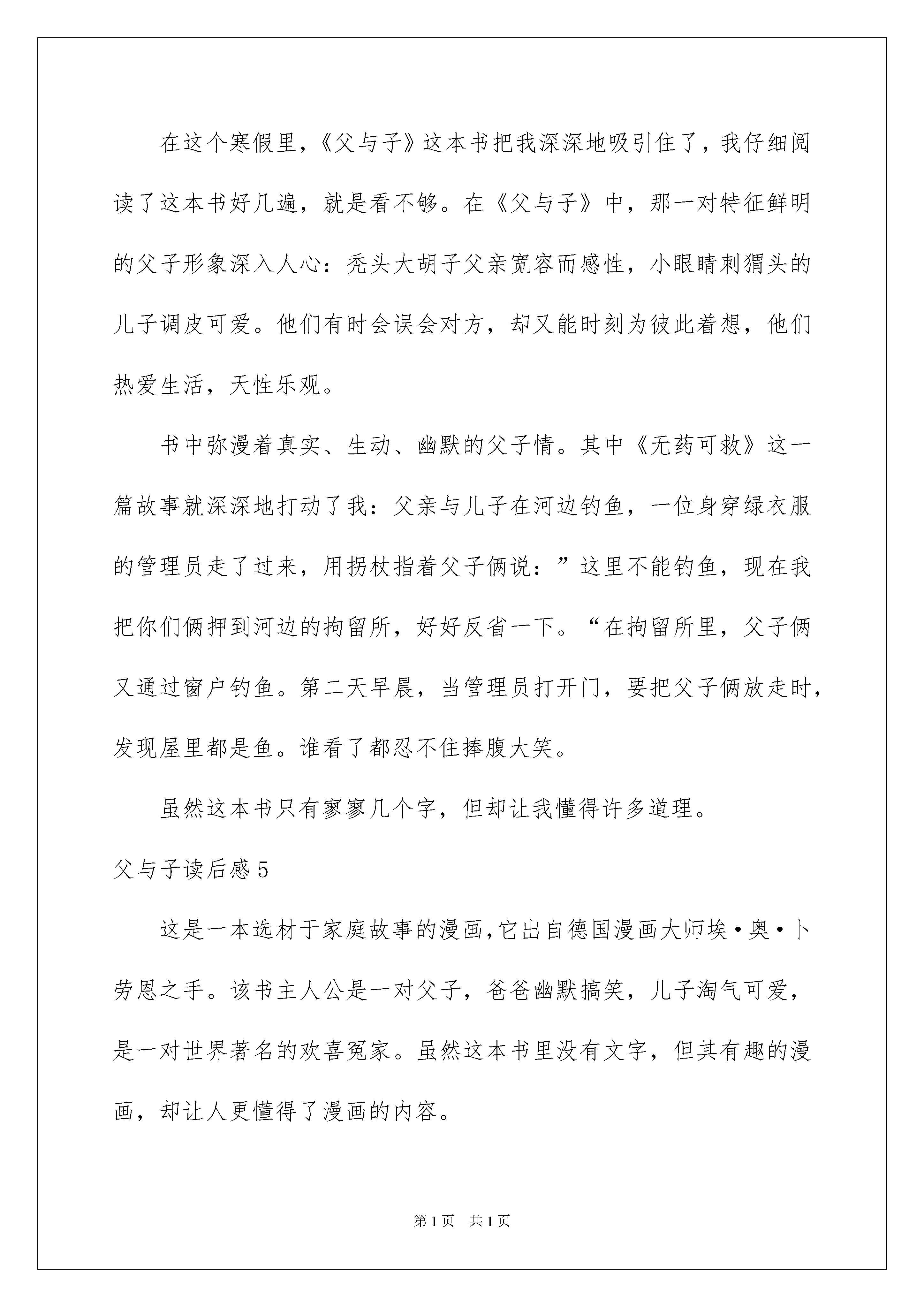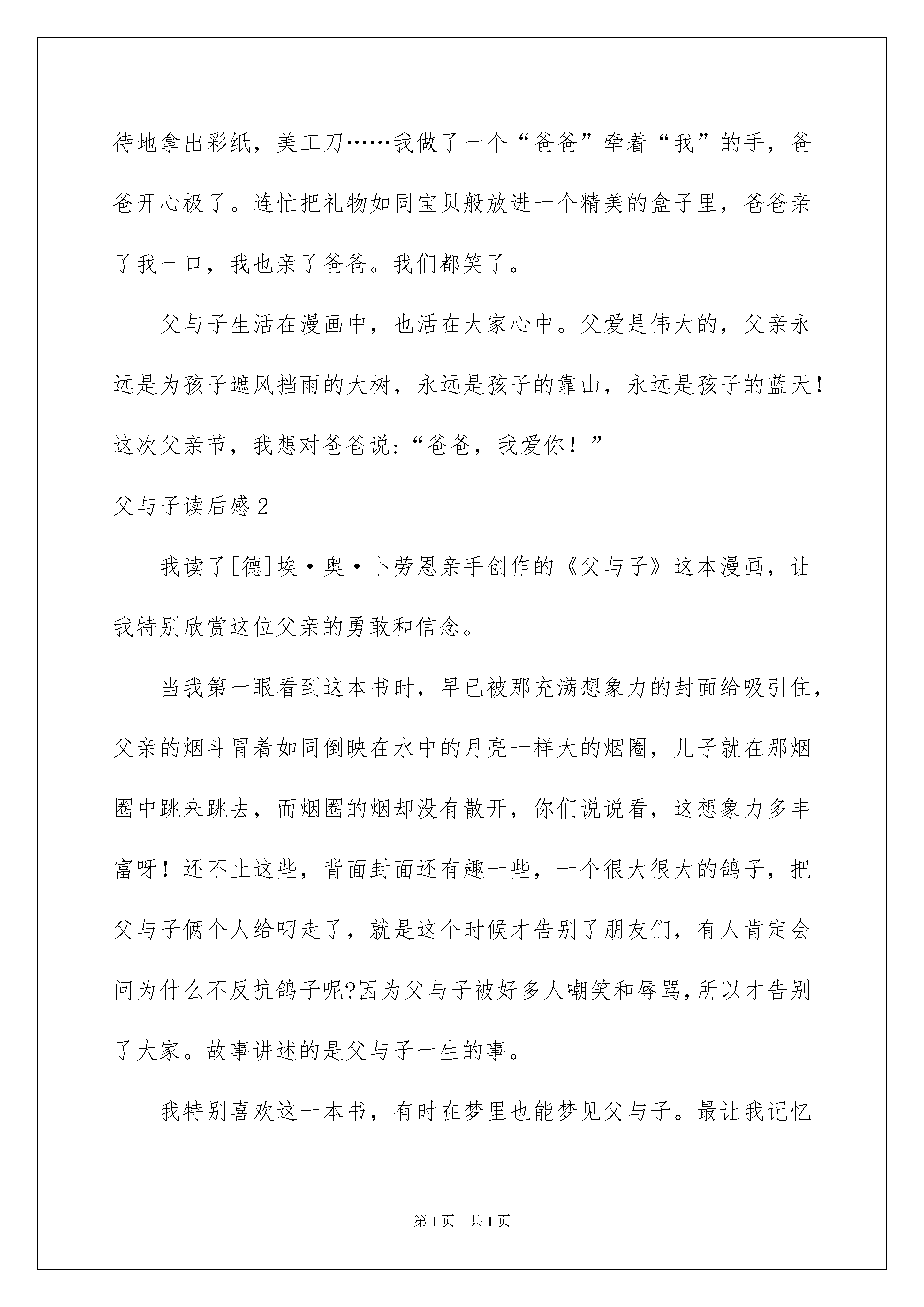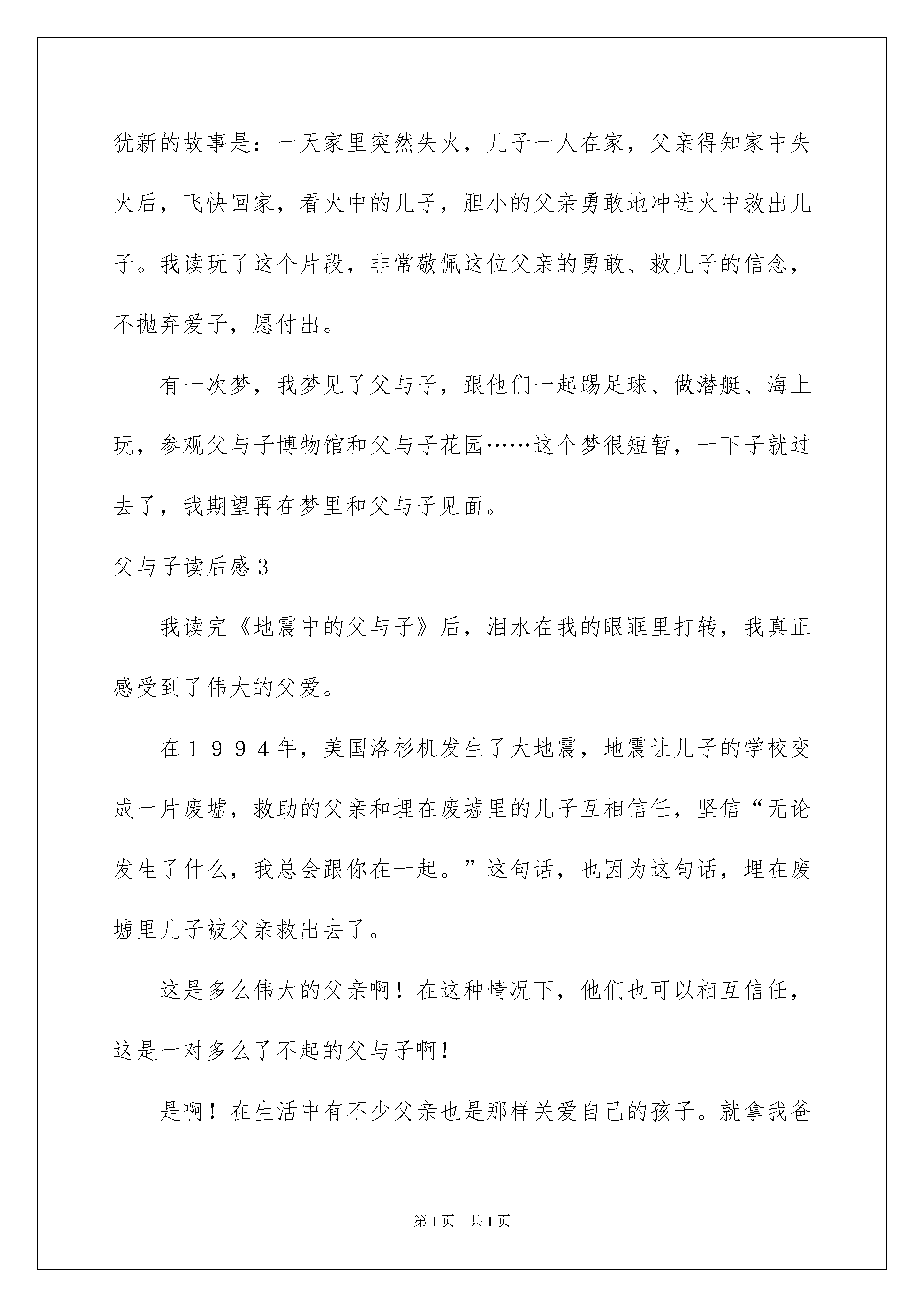 2022父与子读后感15篇父与子读后感15篇看完一本名著后,大家心中一定是萌生了不少心得,为此需要认真地写一写读后感了。想必许多人都在为如何写好读后感而烦恼吧,下面是我精心整理的父与子读后感,仅供参考,希望能够帮助到大家。父与子读后感1翻开《父与子》这本书,我就被这一对幽默父子给吸引住了。他们的一举一动无不流露着纯真的父子之情,深深地打动了我的心。我对《儿子的礼物》这一则漫画有深深的印象。儿子做了一个雕像礼物送给爸爸,由于他太心急,一不小心把雕像摔坏了,只剩下一个标枪。面对儿子的哭泣,爸爸连忙安慰并说标枪可以去除烟斗里的烟油,让烟斗连吐三个烟圈。儿子顿时破涕为笑。在爸爸眼里,儿子的喜怒哀乐就是他的一切,儿子的礼物是无价的。哪怕只是一个拥抱,一个吻,一句我爱你爸爸,父亲都会很开心。这也令我想起我三岁的时候,那时我初得知父亲节这个名词。妈妈告诉我,在这一天每个人都要送一件礼物给自己的爸爸。我迫不及待地拿出彩纸,美工刀……我做了一个“爸爸”牵着“我”的手,爸爸开心极了。连忙把礼物如同宝贝般放进一个精美的盒子里,爸爸亲了我一口,我也亲了爸爸。我们都笑了。父与子生活在漫画中,也活在大家心中。父爱是伟大的,父亲永远是为孩子遮风挡雨的大树,永远是孩子的靠山,永远是孩子的蓝天!这次父亲节,我想对爸爸说:“爸爸,我爱你!”父与子读后感2我读了[德]埃·奥·卜劳恩亲手创作的《父与子》这本漫画,让我特别欣赏这位父亲的勇敢和信念。当我第一眼看到这本书时,早已被那充满想象力的封面给吸引住,父亲的烟斗冒着如同倒映在水中的月亮一样大的烟圈,儿子就在那烟圈中跳来跳去,而烟圈的烟却没有散开,你们说说看,这想象力多丰富呀!还不止这些,背面封面还有趣一些,一个很大很大的鸽子,把父与子俩个人给叼走了,就是这个时候才告别了朋友们,有人肯定会问为什么不反抗鸽子呢?因为父与子被好多人嘲笑和辱骂,所以才告别了大家。故事讲述的是父与子一生的事。我特别喜欢这一本书,有时在梦里也能梦见父与子。最让我记忆犹新的故事是:一天家里突然失火,儿子一人在家,父亲得知家中失火后,飞快回家,看火中的儿子,胆小的父亲勇敢地冲进火中救出儿子。我读玩了这个片段,非常敬佩这位父亲的勇敢、救儿子的信念,不抛弃爱子,愿付出。有一次梦,我梦见了父与子,跟他们一起踢足球、做潜艇、海上玩,参观父与子博物馆和父与子花园……这个梦很短暂,一下子就过去了,我期望再在梦里和父与子见面。父与子读后感3我读完《地震中的父与子》后,泪水在我的眼眶里打转,我真正感受到了伟大的父爱。在1994年,美国洛杉机发生了大地震,地震让儿子的学校变成一片废墟,救助的父亲和埋在废墟里的儿子互相信任,坚信“无论发生了什么,我总会跟你在一起。”这句话,也因为这句话,埋在废墟里儿子被父亲救出去了。这是多么伟大的父亲啊!在这种情况下,他们也可以相互信任,这是一对多么了不起的父与子啊!是啊!在生活中有不少父亲也是那样关爱自己的孩子。就拿我爸爸来说吧,他虽然看上去非常严肃,但他无时无刻不关心我,照顾我。有一天,天气转冷,但我只穿了一件薄薄的衣服就上学去了,爸爸马上拿了一件衣服赶上我,把衣服塞进我的手里,关心地对我说:“上午天气转冷,多穿一件衣服吧!”我抬起头刚想对爸爸说我衣服够了,爸爸却抢先一步说:“快上学去。”我只好乖乖地上学去了。还有一次,爸爸对我啰嗦了好几遍,叫我穿多点衣服,我一气之下,恶狠狠地说了一句:“我心中有数,不用你管。”气冲冲地上学去了。下午时,天起突然变冷了,我冷得一连打了几个冷颤。这时,爸爸在课室的窗外不停地叫我,我从爸爸手里接过棉衣,一股暖流流遍了我的全身。可怜天下父母心!父爱是最无私,最伟大的。爸爸,谢谢您多年来的照顾,我会用最好的成绩报答您。父与子读后感4书——人类的好朋友,我们从书中获得知识,受益匪浅。名人高尔基曾说过这样一句话:”书籍是人类进步的阶梯。“正因深知这些道理,所以我酷爱看书,家里摆满了各种各样的书籍:《基督山伯爵》、《红楼梦》、《三国演义》……床头柜上、桌子上、书架上到处都是书。在这个寒假里,《父与子》这本书把我深深地吸引住了,我仔细阅读了这本书好几遍,就是看不够。在《父与子》中,那一对特征鲜明的父子形象深入人心:秃头大胡子父亲宽容而感性,小眼睛刺猬头的儿子调皮可爱。他们有时会误会对方,却又能时刻为彼此着想,他们热爱生活,天性乐观。书中弥漫着真实、生动、幽默的父子情。其中《无药可救》这一篇故事就深深地打动了我:父亲与儿子在河边钓鱼,一位身穿绿衣服的管理员走了过来,用拐杖指着父子俩说:”这里不能钓鱼,现在我把你们俩押到河边的拘留所,好好反省一下。“在拘留所里