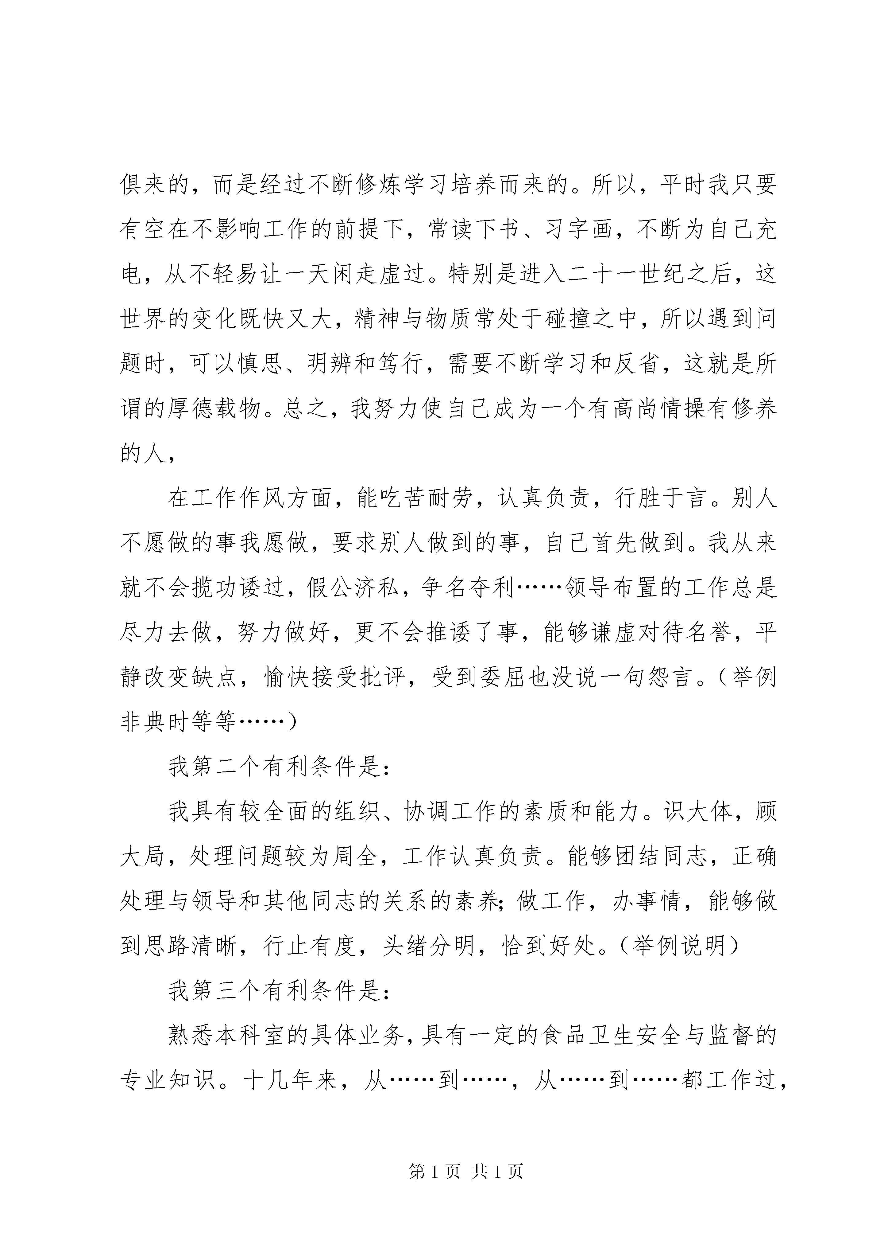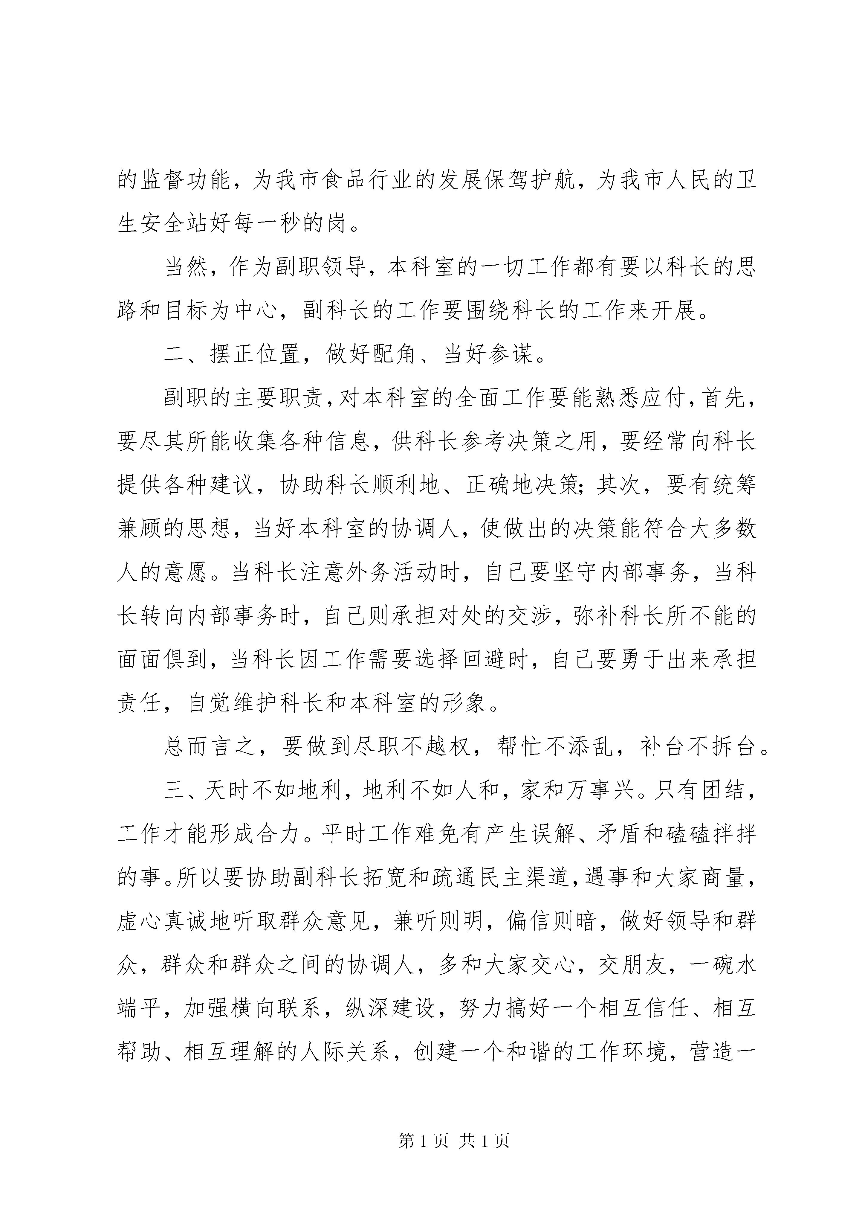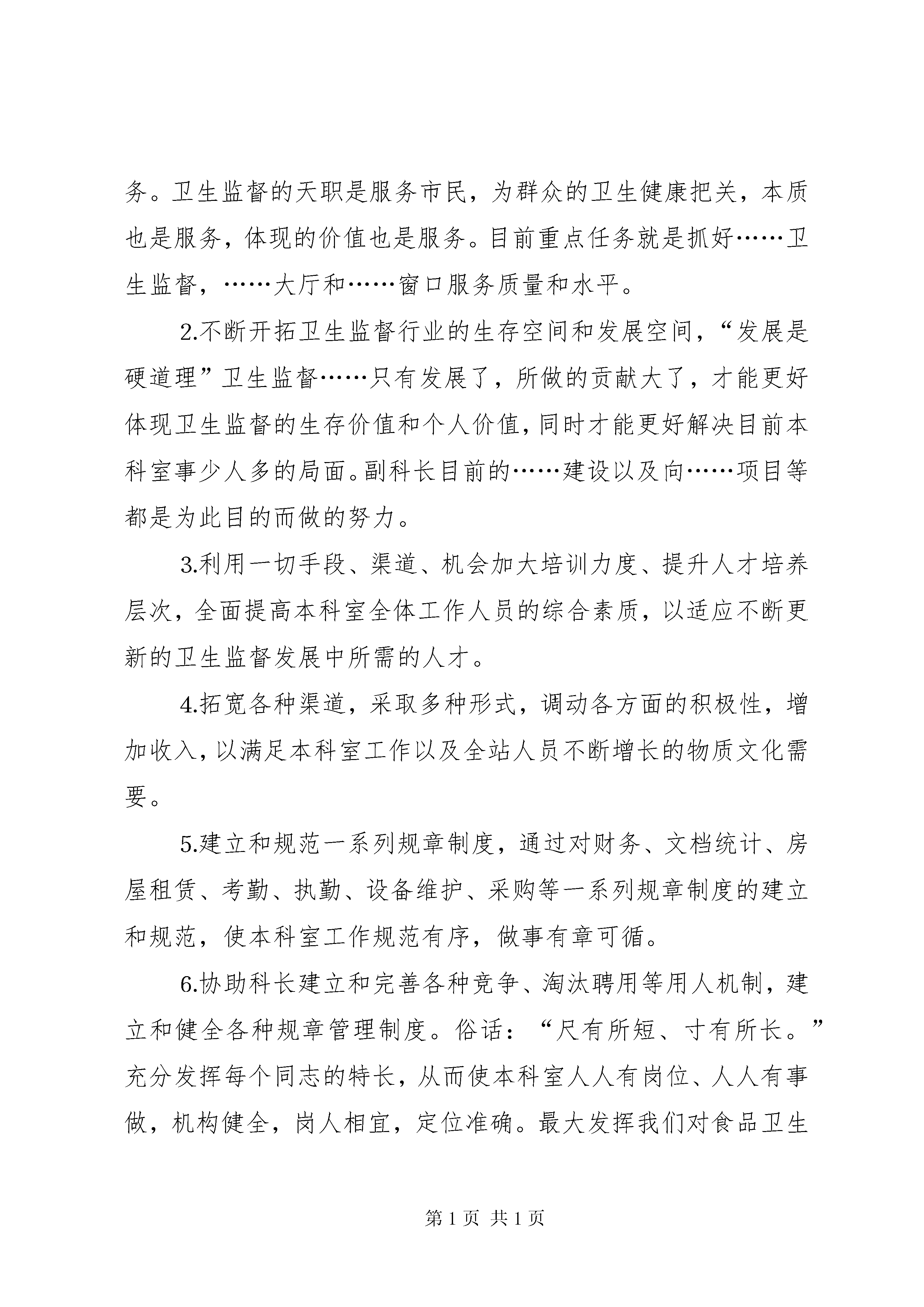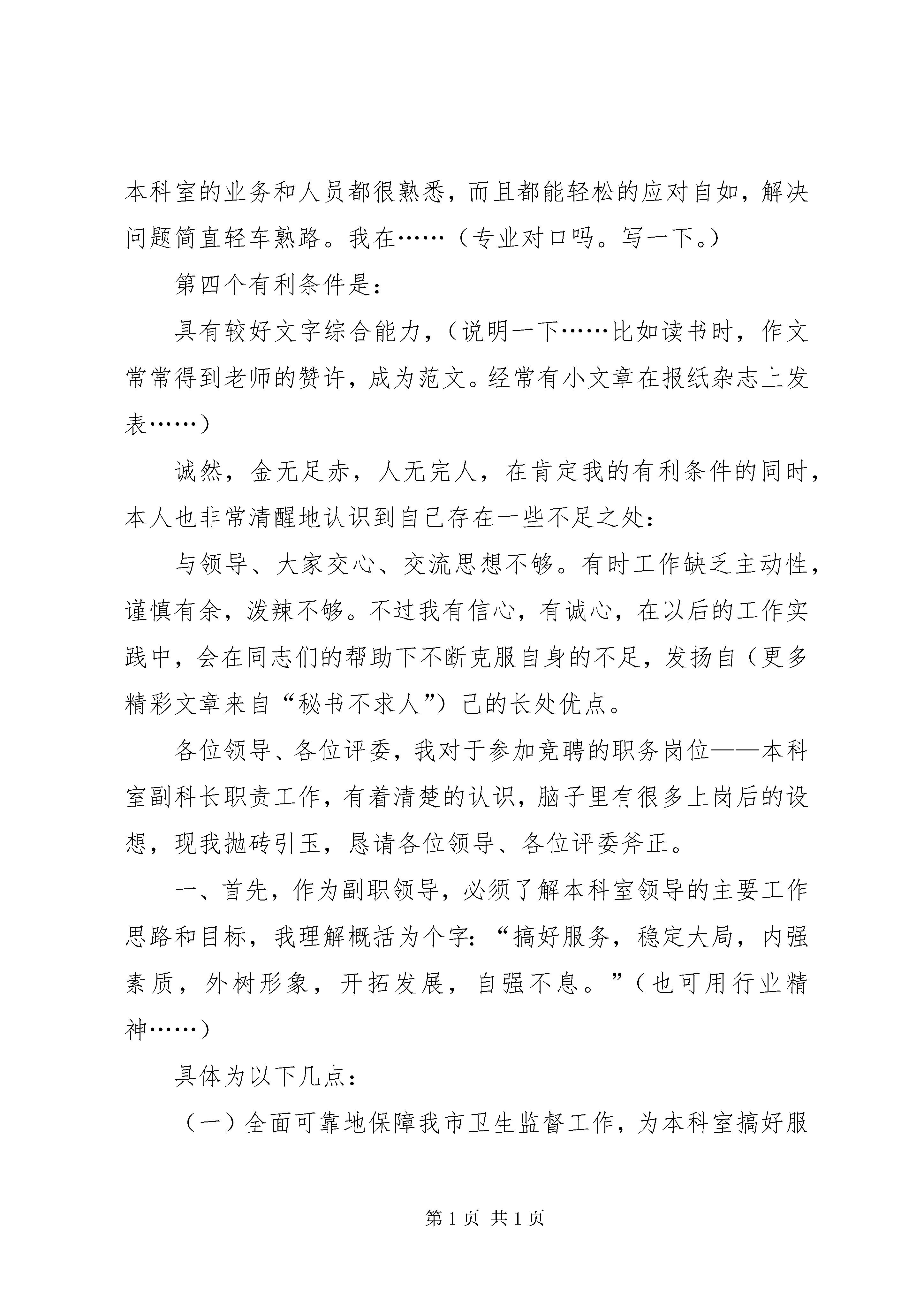 卫生监督副科长(市级)竞聘演讲稿卫生监督副科长市级竞聘演讲稿各位领导、各位评委,大家好:在决定参加这次职务竞聘之前,我也曾度德量力,思虑再三,因为中国传统的处世哲学就是“不与世人争”,今天,我之所以参加这次中层领导职务的竞聘,是因为:一方面,表明我对推行中层领导岗位竞聘上岗机制的拥护和信任;另一方面;通过这次演讲,锻炼提高自己的综合能力,充分展现自己的才华,发掘潜力,并借此机会和同志们交流;同时,准备接受领导群众对自己优劣长短的评价,期待得到领导的挑选和信任。我相信,通过这次职务竞聘,必将使我在各方面得到检验,能力得到提高。各位领导、各位评委,首先,我简单的向您介绍我的经历。(简介要简明,突出优势)参加本科室副科长这个职位的竞聘,我认为自己具有以下几个方面的有利条件。我的第一个有利条件是:一、我具有正直的人品、良好的修养以及完善的工作作风。要做好一个中层领导,必须先做好人。我在为人方面,胸怀坦荡,公道正派,善解人意,与人为善,不搞小动作,多年来没有和任何人当面红过脸,从不背后搞人。始终认为:沉默是金,忍让是银,帮人是德,吃亏是福。在个人修养方面,领会到一个人的高尚情操和修养不是与生俱来的,而是经过不断修炼学习培养而来的。所以,平时我只要有空在不影响工作的前提下,常读下书、习字画,不断为自己充电,从不轻易让一天闲走虚过。特别是进入二十一世纪之后,这世界的变化既快又大,精神与物质常处于碰撞之中,所以遇到问题时,可以慎思、明辨和笃行,需要不断学习和反省,这就是所谓的厚德载物。总之,我努力使自己成为一个有高尚情操有修养的人,在工作作风方面,能吃苦耐劳,认真负责,行胜于言。别人不愿做的事我愿做,要求别人做到的事,自己首先做到。我从来就不会揽功诿过,假公济私,争名夺利……领导布置的工作总是尽力去做,努力做好,更不会推诿了事,能够谦虚对待名誉,平静改变缺点,愉快接受批评,受到委屈也没说一句怨言。(举例非典时等等……)我第二个有利条件是:我具有较全面的组织、协调工作的素质和能力。识大体,顾大局,处理问题较为周全,工作认真负责。能够团结同志,正确处理与领导和其他同志的关系的素养;做工作,办事情,能够做到思路清晰,行止有度,头绪分明,恰到好处。(举例说明)我第三个有利条件是:熟悉本科室的具体业务,具有一定的食品卫生安全与监督的专业知识。十几年来,从……到……,从……到……都工作过,本科室的业务和人员都很熟悉,而且都能轻松的应对自如,解决问题简直轻车熟路。我在……(专业对口吗。写一下。)第四个有利条件是:具有较好文字综合能力,(说明一下……比如读书时,作文常常得到老师的赞许,成为范文。经常有小文章在报纸杂志上发表……)诚然,金无足赤,人无完人,在肯定我的有利条件的同时,本人也非常清醒地认识到自己存在一些不足之处:与领导、大家交心、交流思想不够。有时工作缺乏主动性,谨慎有余,泼辣不够。不过我有信心,有诚心,在以后的工作实践中,会在同志们的帮助下不断克服自身的不足,发扬自(更多精彩文章来自“秘书不求人”)己的长处优点。各位领导、各位评委,我对于参加竞聘的职务岗位——本科室副科长职责工作,有着清楚的认识,脑子里有很多上岗后的设想,现我抛砖引玉,恳请各位领导、各位评委斧正。一、首先,作为副职领导,必须了解本科室领导的主要工作思路和目标,我理解概括为个字:“搞好服务,稳定大局,内强素质,外树形象,开拓发展,自强不息。”(也可用行业精神……)具体为以下几点:(一)全面可靠地保障我市卫生监督工作,为本科室搞好服务。卫生监督的天职是服务市民,为群众的卫生健康把关,本质也是服务,体现的价值也是服务。目前重点任务就是抓好……卫生监督,……大厅和……窗口服务质量和水平。⒉不断开拓卫生监督行业的生存空间和发展空间,“发展是硬道理”卫生监督……只有发展了,所做的贡献大了,才能更好体现卫生监督的生存价值和个人价值,同时才能更好解决目前本科室事少人多的局面。副科长目前的……建设以及向……项目等都是为此目的而做的努力。⒊利用一切手段、渠道、机会加大培训力度、提升人才培养层次,全面提高本科室全体工作人员的综合素质,以适应不断更新的卫生监督发展中所需的人才。⒋拓宽各种渠道,采取多种形式,调动各方面的积极性,增加收入,以满足本科室工作以及全站人员不断增长的物质文化需要。⒌建立和规范一系列规章制度,通过对财务、文档统计、房屋租赁、考勤、执勤、设备维护、采购等一系列规章制度的建立和规范,使本科室工作规范有序,做事有章可循。⒍协助科长建立和完善各种竞争、淘汰聘用等用人机制,建立和健全各种规章管理制度。俗话:“尺有所短、寸有所长。”充分发挥每个同志的特长,从而使本科室人人有岗位、人人有事做,机构健全,岗人相宜,定位准确。最大发挥我们对食品卫生的监督功能,为我市食品行业