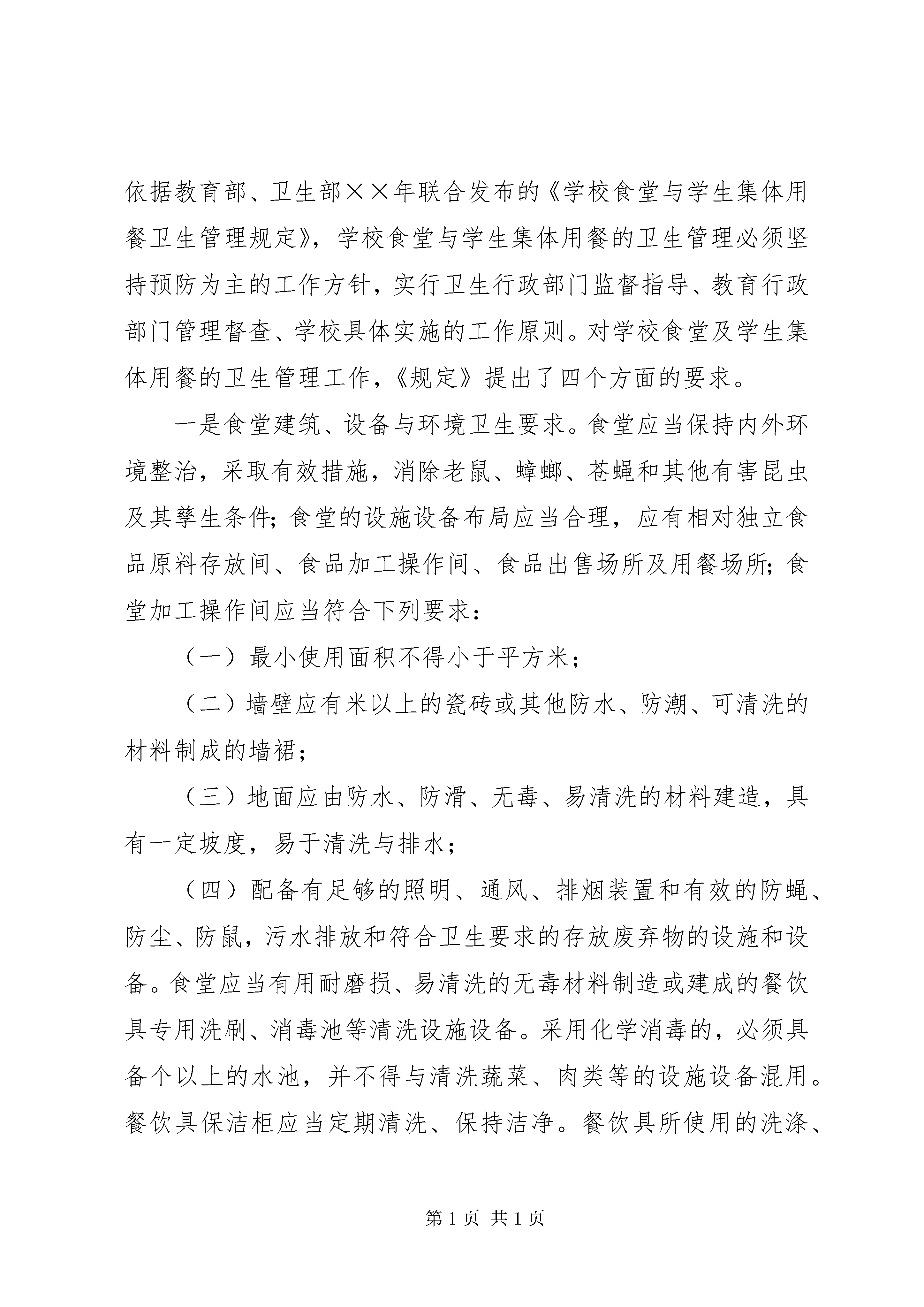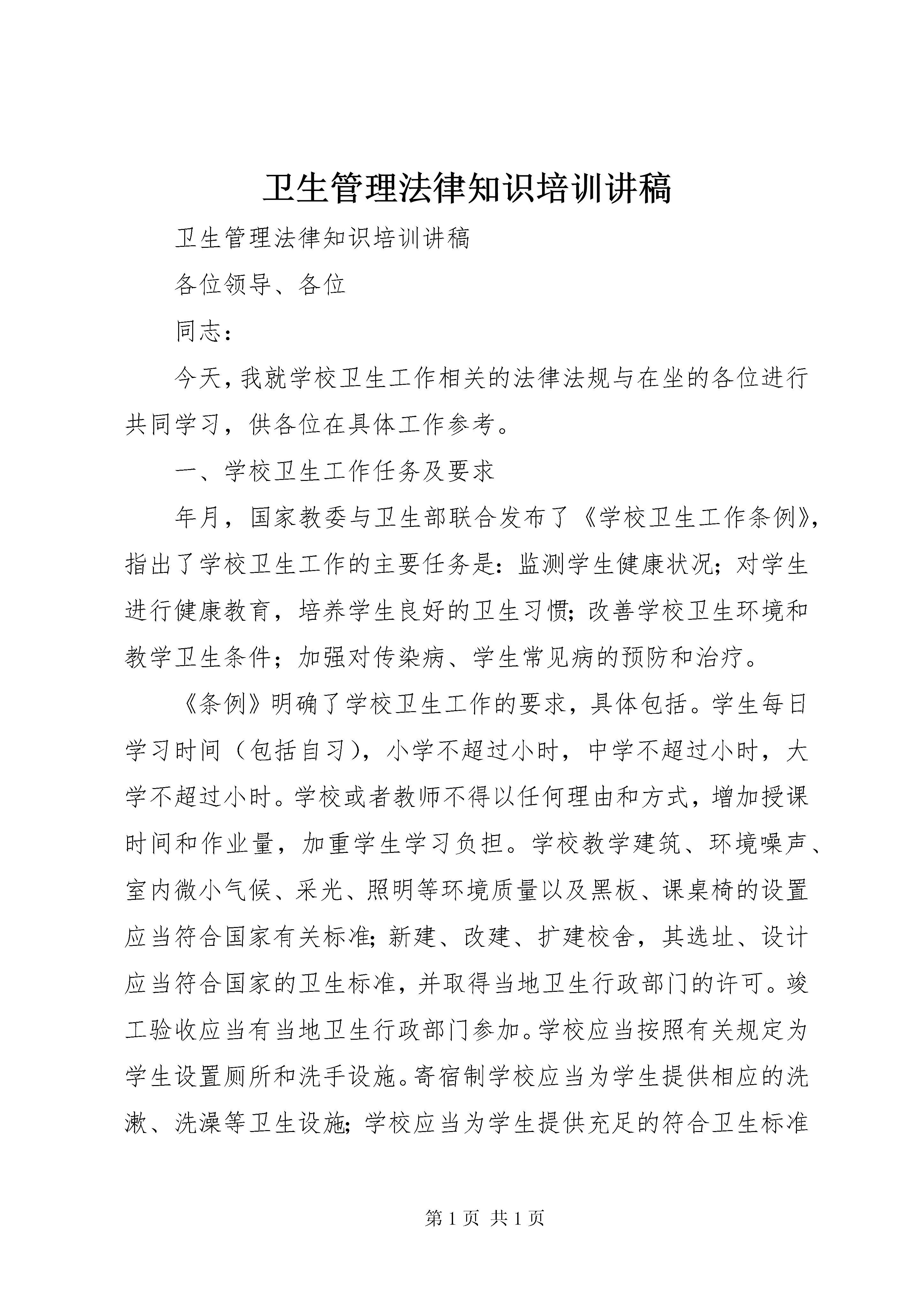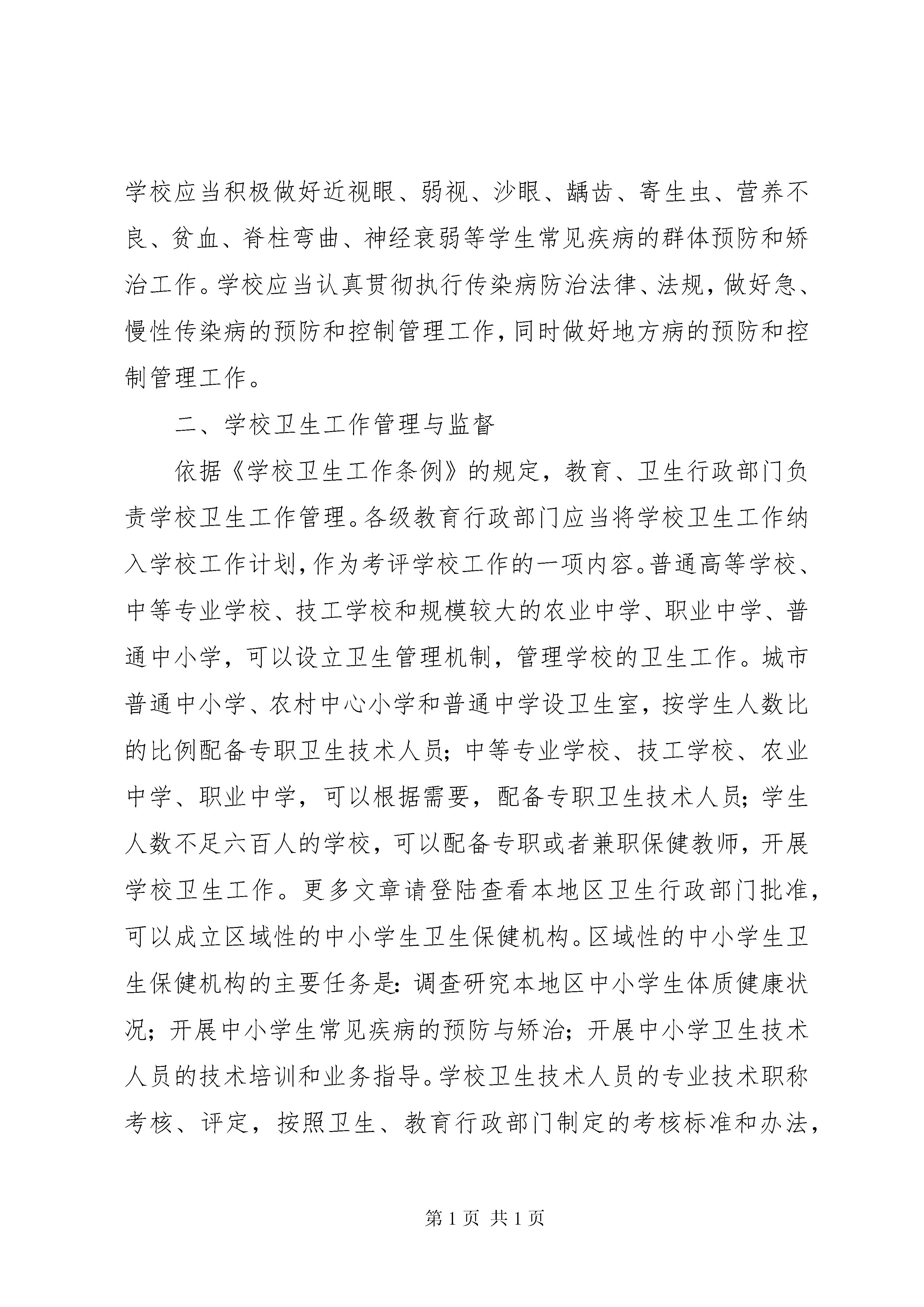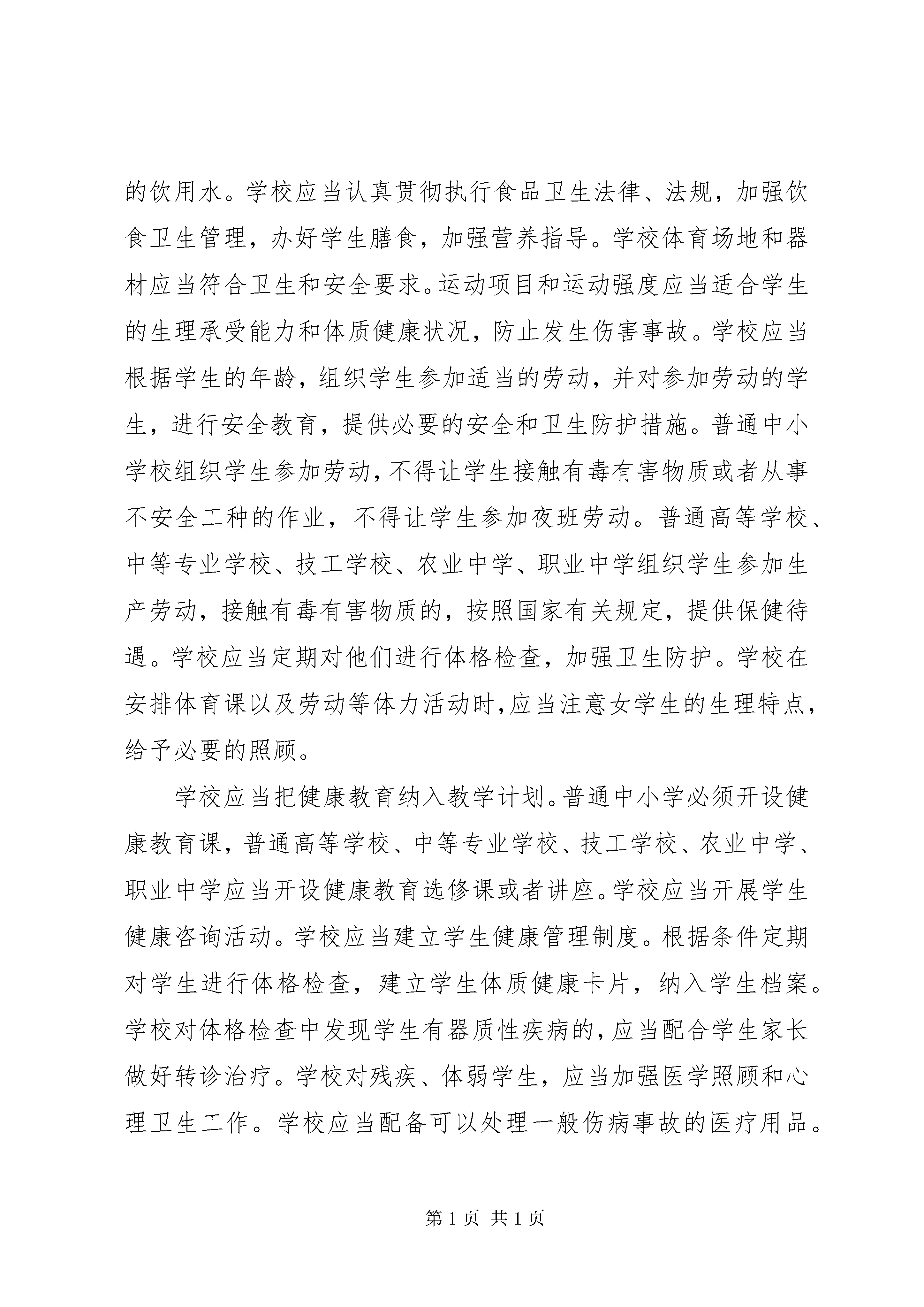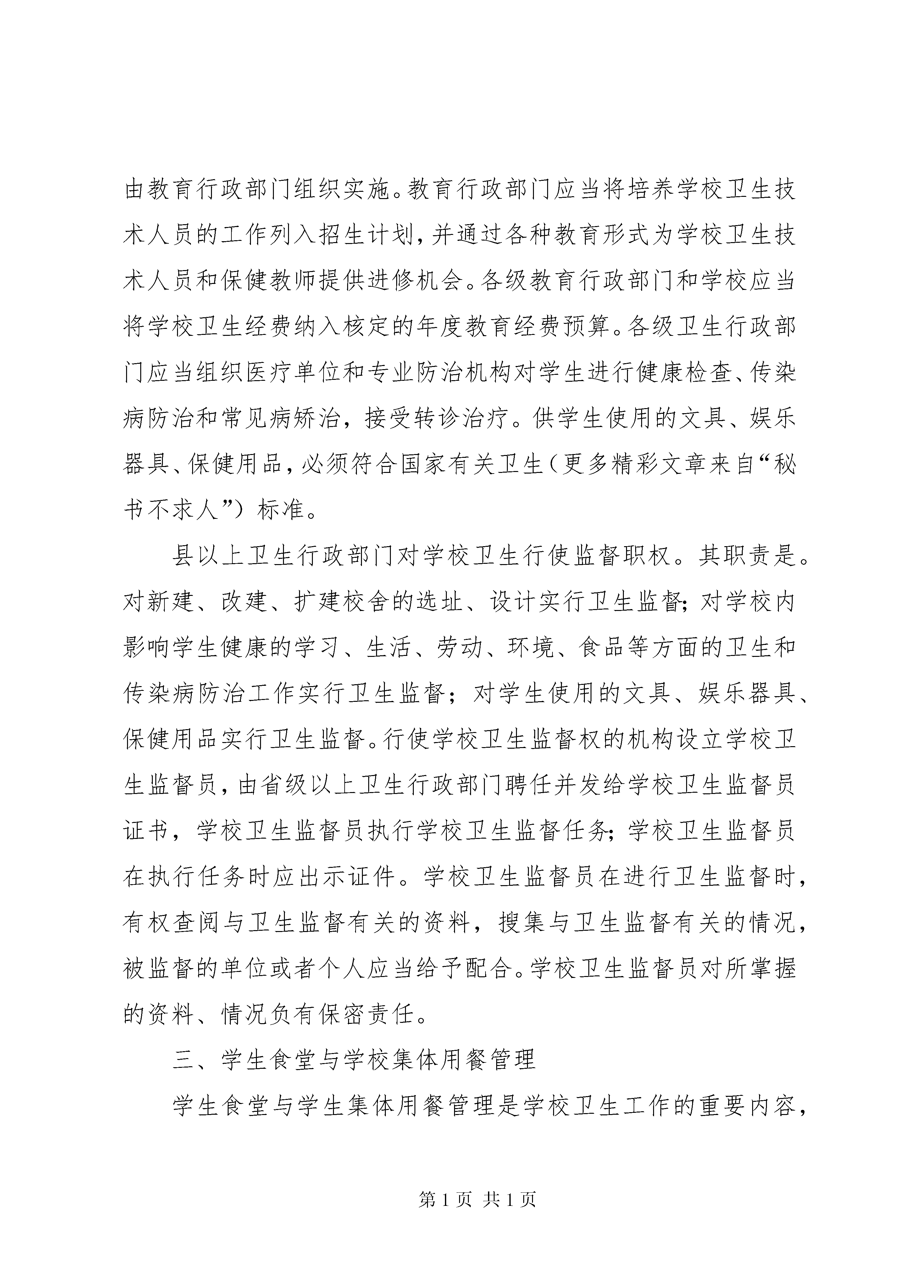 卫生管理法律知识培训讲稿卫生管理法律知识培训讲稿各位领导、各位同志:今天,我就学校卫生工作相关的法律法规与在坐的各位进行共同学习,供各位在具体工作参考。一、学校卫生工作任务及要求年月,国家教委与卫生部联合发布了《学校卫生工作条例》,指出了学校卫生工作的主要任务是:监测学生健康状况;对学生进行健康教育,培养学生良好的卫生习惯;改善学校卫生环境和教学卫生条件;加强对传染病、学生常见病的预防和治疗。《条例》明确了学校卫生工作的要求,具体包括。学生每日学习时间(包括自习),小学不超过小时,中学不超过小时,大学不超过小时。学校或者教师不得以任何理由和方式,增加授课时间和作业量,加重学生学习负担。学校教学建筑、环境噪声、室内微小气候、采光、照明等环境质量以及黑板、课桌椅的设置应当符合国家有关标准;新建、改建、扩建校舍,其选址、设计应当符合国家的卫生标准,并取得当地卫生行政部门的许可。竣工验收应当有当地卫生行政部门参加。学校应当按照有关规定为学生设置厕所和洗手设施。寄宿制学校应当为学生提供相应的洗漱、洗澡等卫生设施;学校应当为学生提供充足的符合卫生标准的饮用水。学校应当认真贯彻执行食品卫生法律、法规,加强饮食卫生管理,办好学生膳食,加强营养指导。学校体育场地和器材应当符合卫生和安全要求。运动项目和运动强度应当适合学生的生理承受能力和体质健康状况,防止发生伤害事故。学校应当根据学生的年龄,组织学生参加适当的劳动,并对参加劳动的学生,进行安全教育,提供必要的安全和卫生防护措施。普通中小学校组织学生参加劳动,不得让学生接触有毒有害物质或者从事不安全工种的作业,不得让学生参加夜班劳动。普通高等学校、中等专业学校、技工学校、农业中学、职业中学组织学生参加生产劳动,接触有毒有害物质的,按照国家有关规定,提供保健待遇。学校应当定期对他们进行体格检查,加强卫生防护。学校在安排体育课以及劳动等体力活动时,应当注意女学生的生理特点,给予必要的照顾。学校应当把健康教育纳入教学计划。普通中小学必须开设健康教育课,普通高等学校、中等专业学校、技工学校、农业中学、职业中学应当开设健康教育选修课或者讲座。学校应当开展学生健康咨询活动。学校应当建立学生健康管理制度。根据条件定期对学生进行体格检查,建立学生体质健康卡片,纳入学生档案。学校对体格检查中发现学生有器质性疾病的,应当配合学生家长做好转诊治疗。学校对残疾、体弱学生,应当加强医学照顾和心理卫生工作。学校应当配备可以处理一般伤病事故的医疗用品。学校应当积极做好近视眼、弱视、沙眼、龋齿、寄生虫、营养不良、贫血、脊柱弯曲、神经衰弱等学生常见疾病的群体预防和矫治工作。学校应当认真贯彻执行传染病防治法律、法规,做好急、慢性传染病的预防和控制管理工作,同时做好地方病的预防和控制管理工作。二、学校卫生工作管理与监督依据《学校卫生工作条例》的规定,教育、卫生行政部门负责学校卫生工作管理。各级教育行政部门应当将学校卫生工作纳入学校工作计划,作为考评学校工作的一项内容。普通高等学校、中等专业学校、技工学校和规模较大的农业中学、职业中学、普通中小学,可以设立卫生管理机制,管理学校的卫生工作。城市普通中小学、农村中心小学和普通中学设卫生室,按学生人数比的比例配备专职卫生技术人员;中等专业学校、技工学校、农业中学、职业中学,可以根据需要,配备专职卫生技术人员;学生人数不足六百人的学校,可以配备专职或者兼职保健教师,开展学校卫生工作。更多文章请登陆查看本地区卫生行政部门批准,可以成立区域性的中小学生卫生保健机构。区域性的中小学生卫生保健机构的主要任务是:调查研究本地区中小学生体质健康状况;开展中小学生常见疾病的预防与矫治;开展中小学卫生技术人员的技术培训和业务指导。学校卫生技术人员的专业技术职称考核、评定,按照卫生、教育行政部门制定的考核标准和办法,由教育行政部门组织实施。教育行政部门应当将培养学校卫生技术人员的工作列入招生计划,并通过各种教育形式为学校卫生技术人员和保健教师提供进修机会。各级教育行政部门和学校应当将学校卫生经费纳入核定的年度教育经费预算。各级卫生行政部门应当组织医疗单位和专业防治机构对学生进行健康检查、传染病防治和常见病矫治,接受转诊治疗。供学生使用的文具、娱乐器具、保健用品,必须符合国家有关卫生(更多精彩文章来自“秘书不求人”)标准。县以上卫生行政部门对学校卫生行使监督职权。其职责是。对新建、改建、扩建校舍的选址、设计实行卫生监督;对学校内影响学生健康的学习、生活、劳动、环境、食品等方面的卫生和传染病防治工作实行卫生监督;对学生使用的文具、娱乐器具、保健用品实行卫生监督。行使学校卫生监督权的机构设立学校卫生监督员,由省级以上卫生行政部门聘任并发给学校卫生监督员证书,学校卫生监督员执行学校卫生监督任务