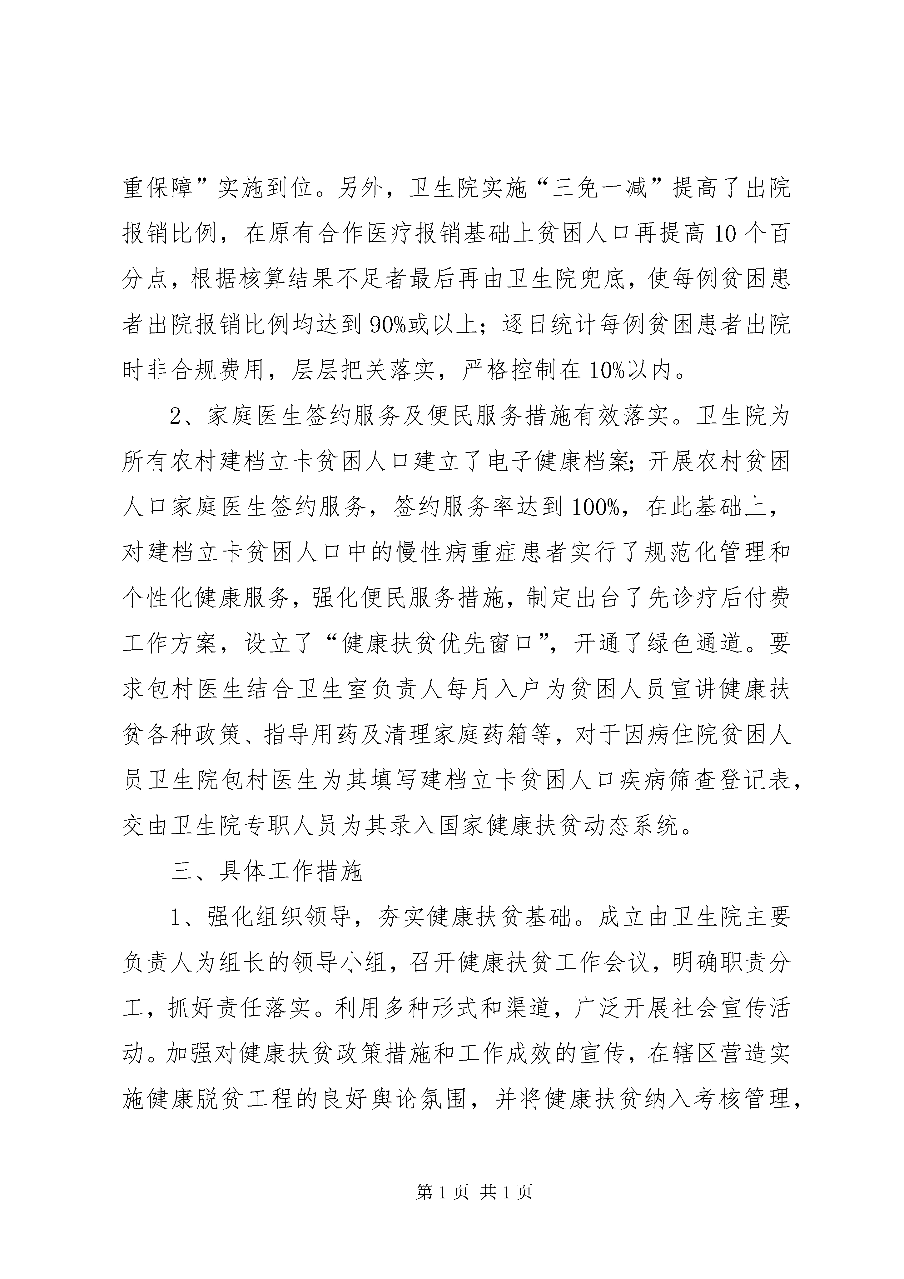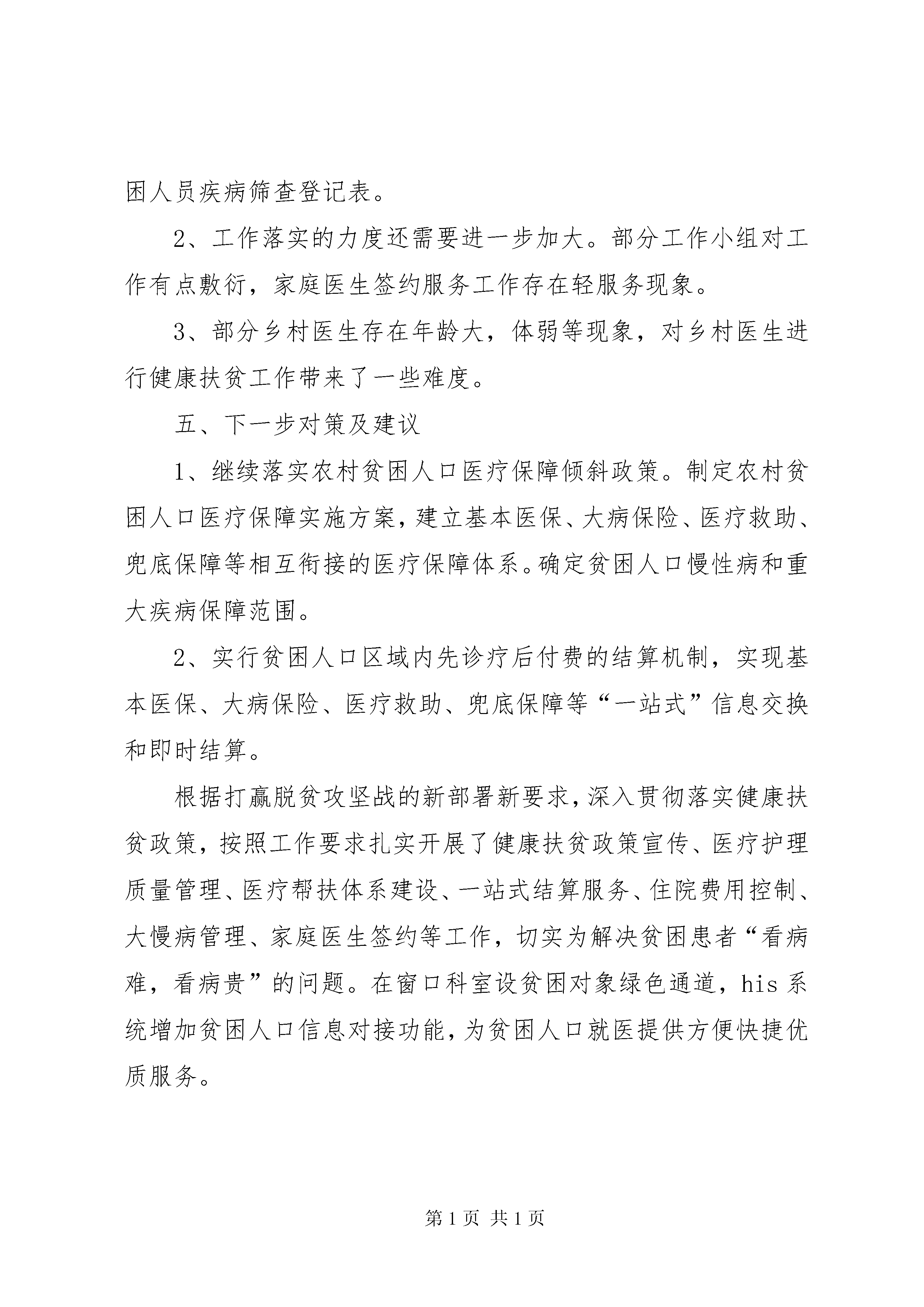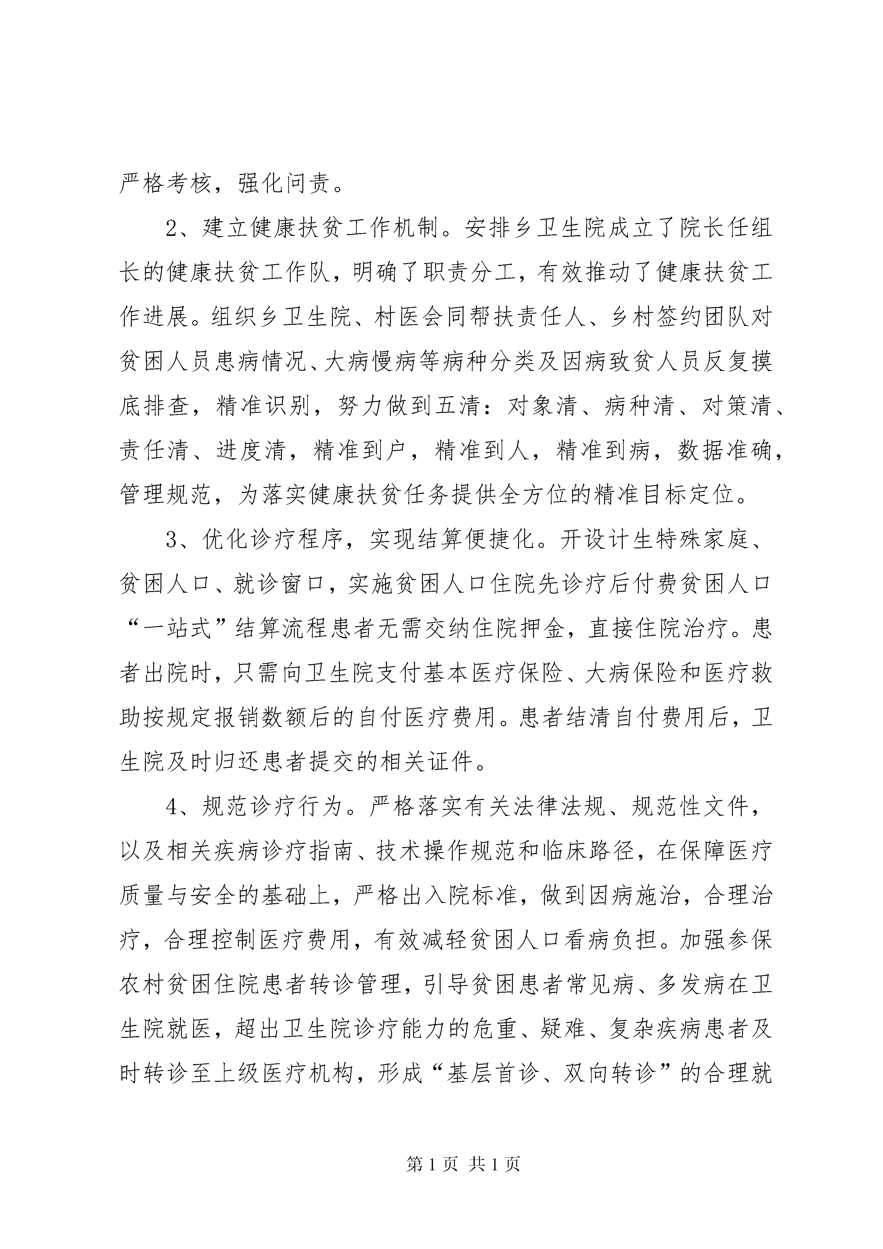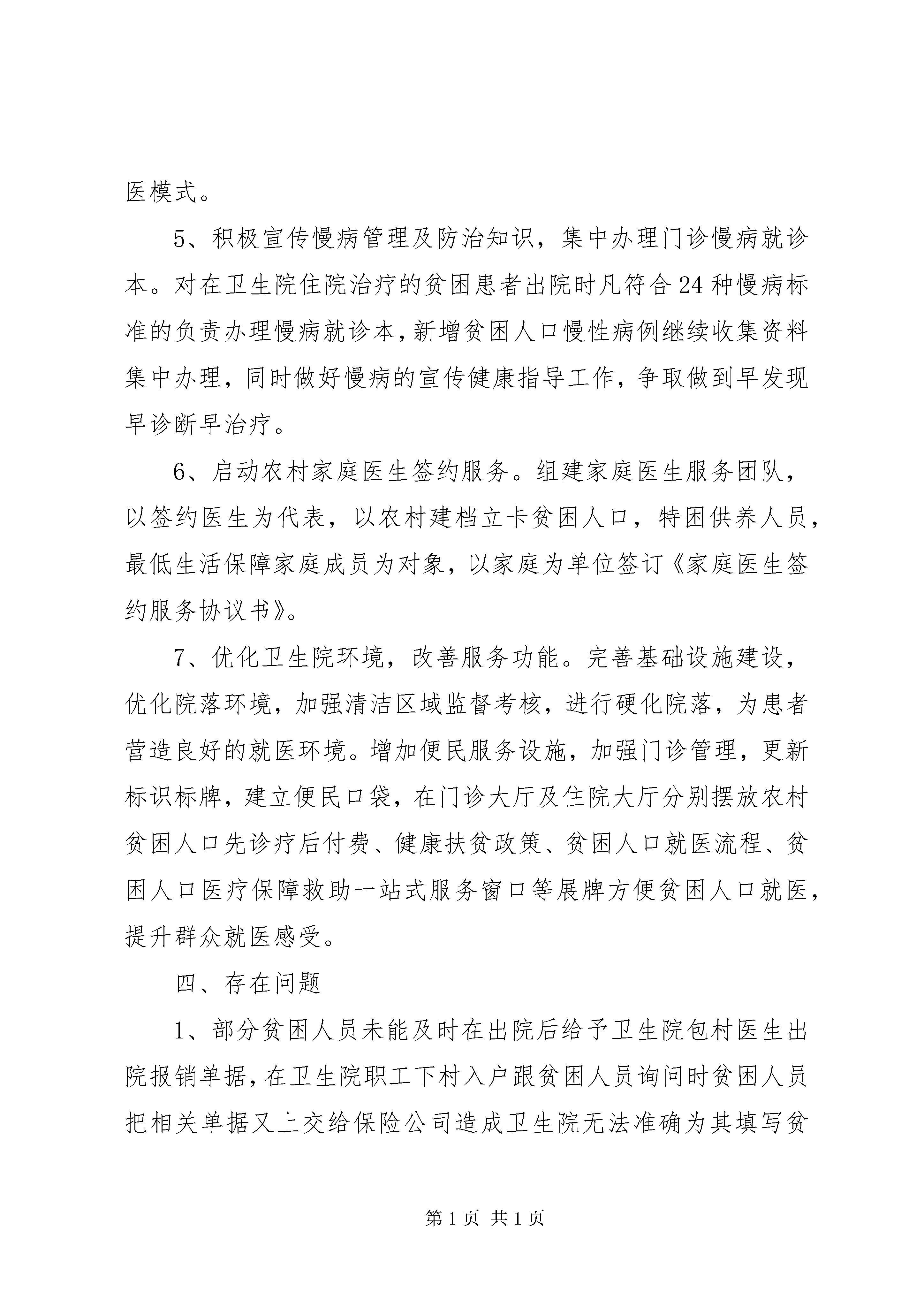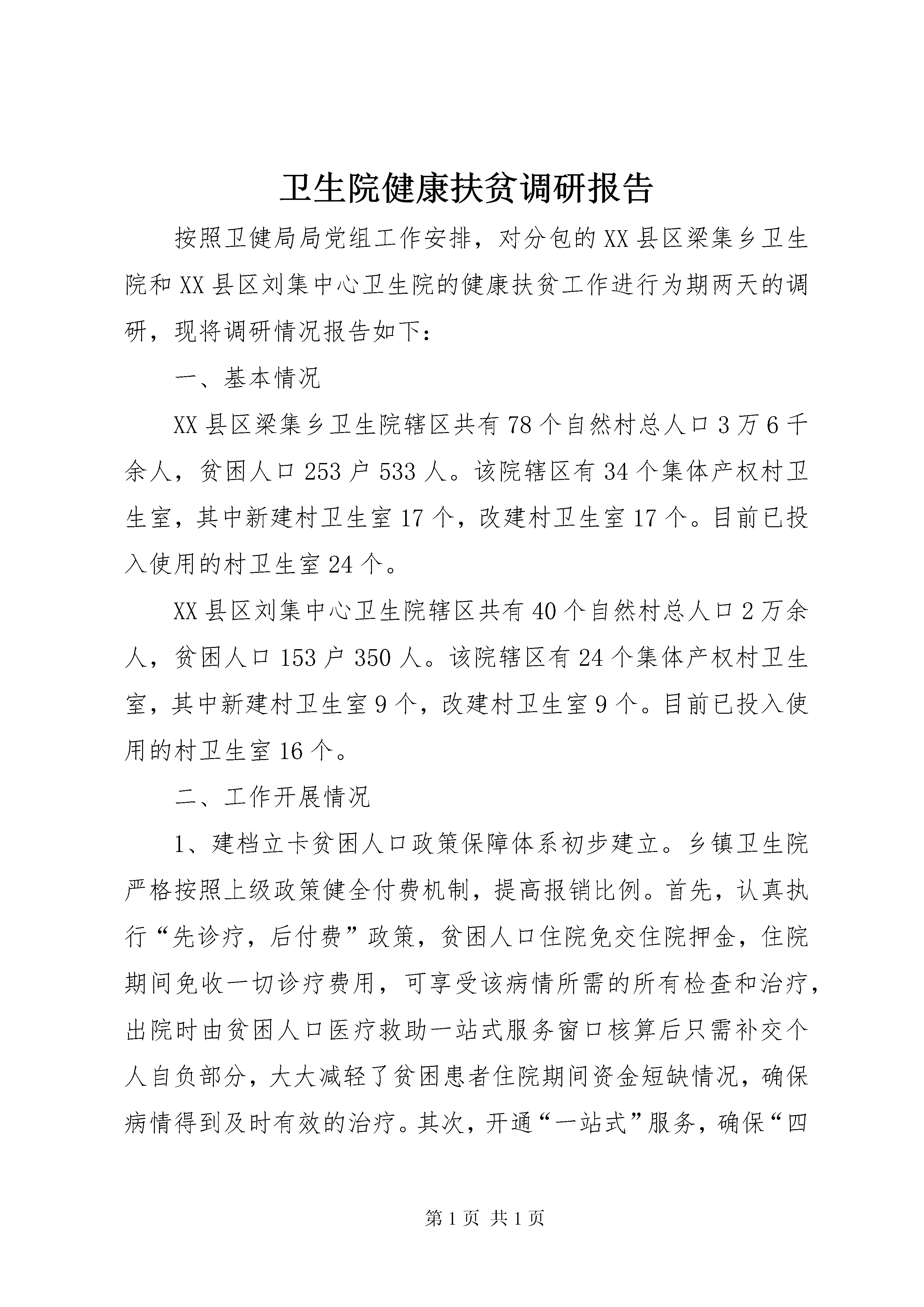 卫生院健康扶贫调研报告按照卫健局局党组工作安排,对分包的XX县区梁集乡卫生院和XX县区刘集中心卫生院的健康扶贫工作进行为期两天的调研,现将调研情况报告如下:一、基本情况XX县区梁集乡卫生院辖区共有78个自然村总人口3万6千余人,贫困人口253户533人。该院辖区有34个集体产权村卫生室,其中新建村卫生室17个,改建村卫生室17个。目前已投入使用的村卫生室24个。XX县区刘集中心卫生院辖区共有40个自然村总人口2万余人,贫困人口153户350人。该院辖区有24个集体产权村卫生室,其中新建村卫生室9个,改建村卫生室9个。目前已投入使用的村卫生室16个。二、工作开展情况1、建档立卡贫困人口政策保障体系初步建立。乡镇卫生院严格按照上级政策健全付费机制,提高报销比例。首先,认真执行“先诊疗,后付费”政策,贫困人口住院免交住院押金,住院期间免收一切诊疗费用,可享受该病情所需的所有检查和治疗,出院时由贫困人口医疗救助一站式服务窗口核算后只需补交个人自负部分,大大减轻了贫困患者住院期间资金短缺情况,确保病情得到及时有效的治疗。其次,开通“一站式”服务,确保“四重保障”实施到位。另外,卫生院实施“三免一减”提高了出院报销比例,在原有合作医疗报销基础上贫困人口再提高10个百分点,根据核算结果不足者最后再由卫生院兜底,使每例贫困患者出院报销比例均达到90%或以上;逐日统计每例贫困患者出院时非合规费用,层层把关落实,严格控制在10%以内。2、家庭医生签约服务及便民服务措施有效落实。卫生院为所有农村建档立卡贫困人口建立了电子健康档案;开展农村贫困人口家庭医生签约服务,签约服务率达到100%,在此基础上,对建档立卡贫困人口中的慢性病重症患者实行了规范化管理和个性化健康服务,强化便民服务措施,制定出台了先诊疗后付费工作方案,设立了“健康扶贫优先窗口”,开通了绿色通道。要求包村医生结合卫生室负责人每月入户为贫困人员宣讲健康扶贫各种政策、指导用药及清理家庭药箱等,对于因病住院贫困人员卫生院包村医生为其填写建档立卡贫困人口疾病筛查登记表,交由卫生院专职人员为其录入国家健康扶贫动态系统。三、具体工作措施1、强化组织领导,夯实健康扶贫基础。成立由卫生院主要负责人为组长的领导小组,召开健康扶贫工作会议,明确职责分工,抓好责任落实。利用多种形式和渠道,广泛开展社会宣传活动。加强对健康扶贫政策措施和工作成效的宣传,在辖区营造实施健康脱贫工程的良好舆论氛围,并将健康扶贫纳入考核管理,严格考核,强化问责。2、建立健康扶贫工作机制。安排乡卫生院成立了院长任组长的健康扶贫工作队,明确了职责分工,有效推动了健康扶贫工作进展。组织乡卫生院、村医会同帮扶责任人、乡村签约团队对贫困人员患病情况、大病慢病等病种分类及因病致贫人员反复摸底排查,精准识别,努力做到五清:对象清、病种清、对策清、责任清、进度清,精准到户,精准到人,精准到病,数据准确,管理规范,为落实健康扶贫任务提供全方位的精准目标定位。3、优化诊疗程序,实现结算便捷化。开设计生特殊家庭、贫困人口、就诊窗口,实施贫困人口住院先诊疗后付费贫困人口“一站式”结算流程患者无需交纳住院押金,直接住院治疗。患者出院时,只需向卫生院支付基本医疗保险、大病保险和医疗救助按规定报销数额后的自付医疗费用。患者结清自付费用后,卫生院及时归还患者提交的相关证件。4、规范诊疗行为。严格落实有关法律法规、规范性文件,以及相关疾病诊疗指南、技术操作规范和临床路径,在保障医疗质量与安全的基础上,严格出入院标准,做到因病施治,合理治疗,合理控制医疗费用,有效减轻贫困人口看病负担。加强参保农村贫困住院患者转诊管理,引导贫困患者常见病、多发病在卫生院就医,超出卫生院诊疗能力的危重、疑难、复杂疾病患者及时转诊至上级医疗机构,形成“基层首诊、双向转诊”的合理就医模式。5、积极宣传慢病管理及防治知识,集中办理门诊慢病就诊本。对在卫生院住院治疗的贫困患者出院时凡符合24种慢病标准的负责办理慢病就诊本,新增贫困人口慢性病例继续收集资料集中办理,同时做好慢病的宣传健康指导工作,争取做到早发现早诊断早治疗。6、启动农村家庭医生签约服务。组建家庭医生服务团队,以签约医生为代表,以农村建档立卡贫困人口,特困供养人员,最低生活保障家庭成员为对象,以家庭为单位签订《家庭医生签约服务协议书》。7、优化卫生院环境,改善服务功能。完善基础设施建设,优化院落环境,加强清洁区域监督考核,进行硬化院落,为患者营造良好的就医环境。增加便民服务设施,加强门诊管理,更新标识标牌,建立便民口袋,在门诊大厅及住院大厅分别摆放农村贫困人口先诊疗后付费、健康扶贫政策、贫困人口就医流程、贫困人口医疗保障救助一站式服务窗口等展牌方便贫困人口就医,提升群众就医感受。四、存在问题1、部分贫困人员