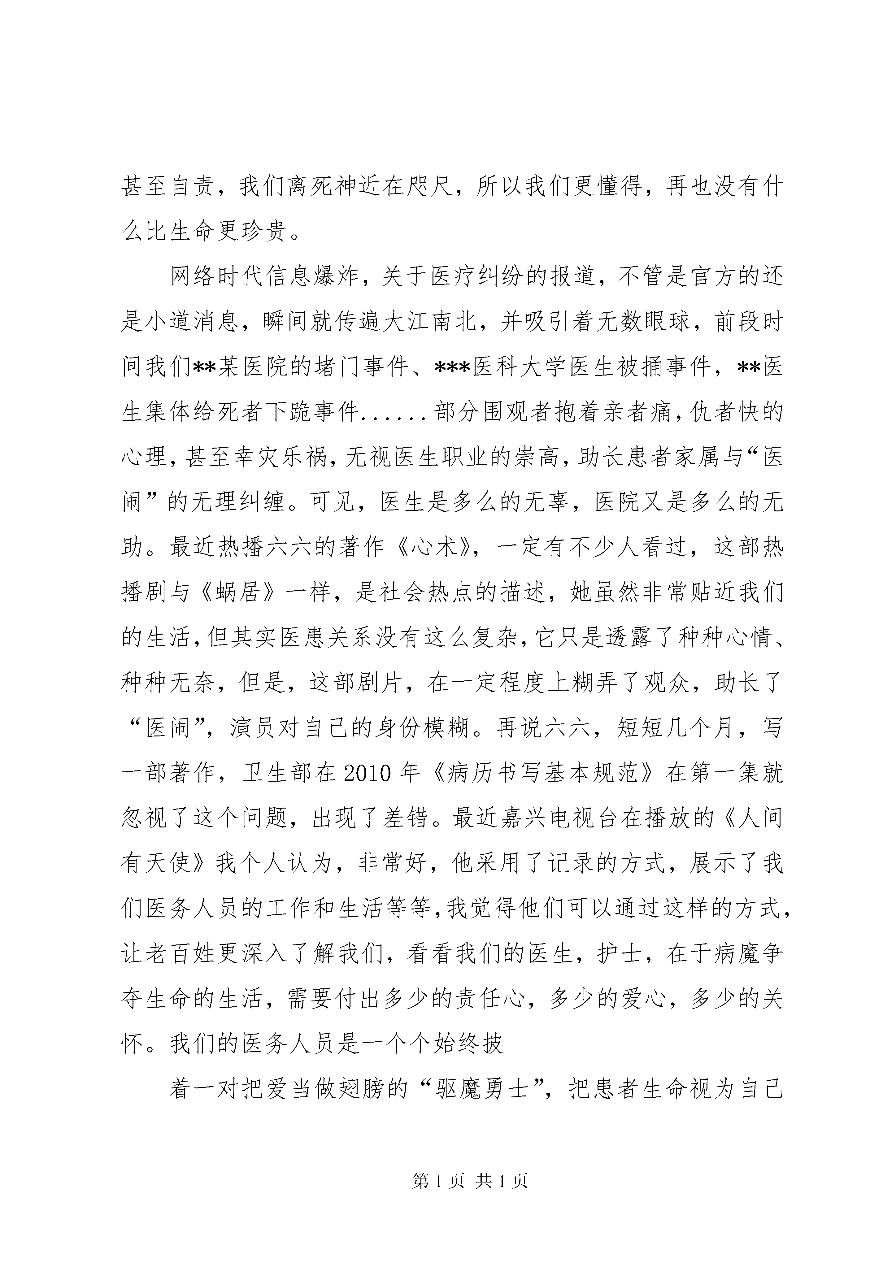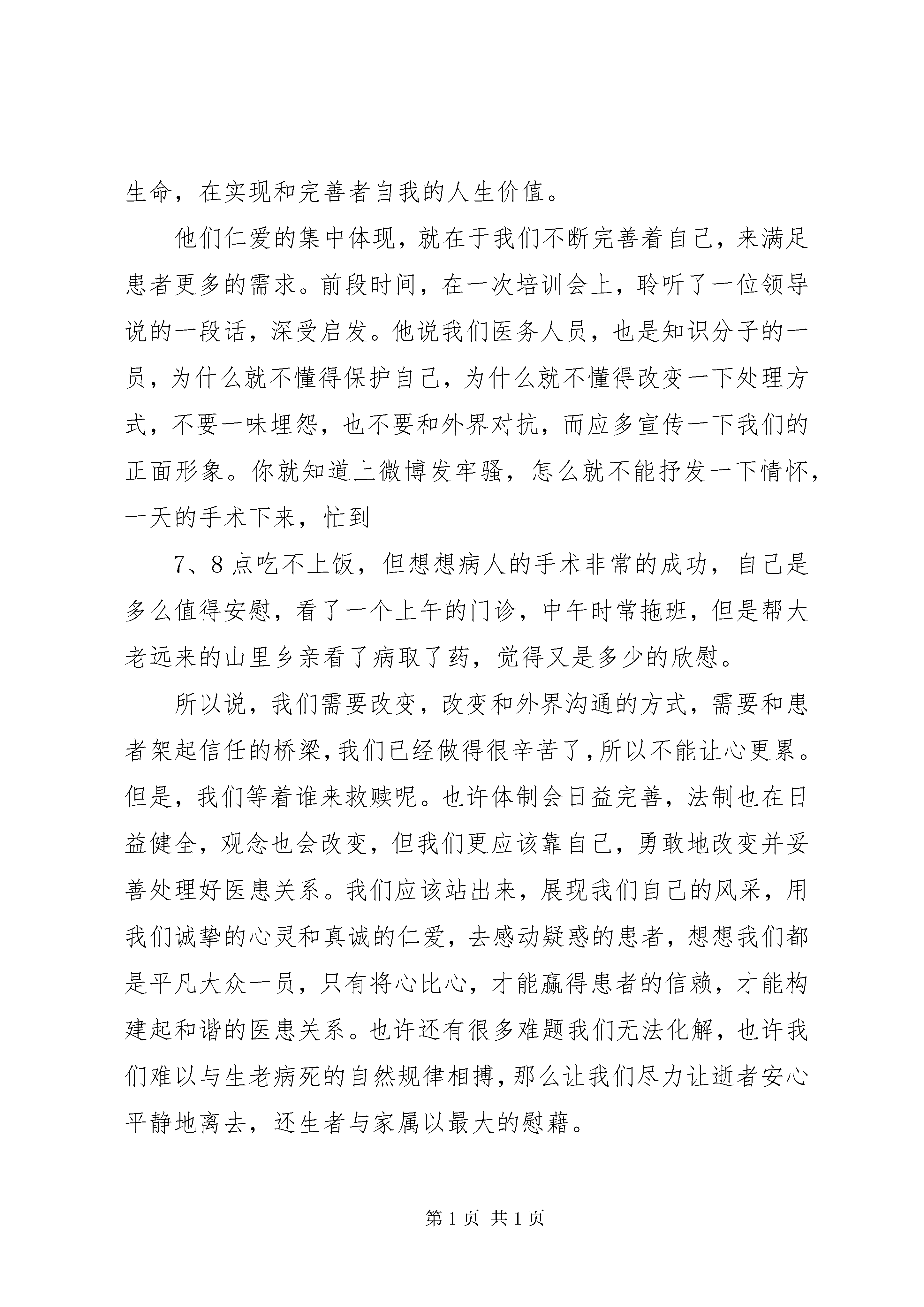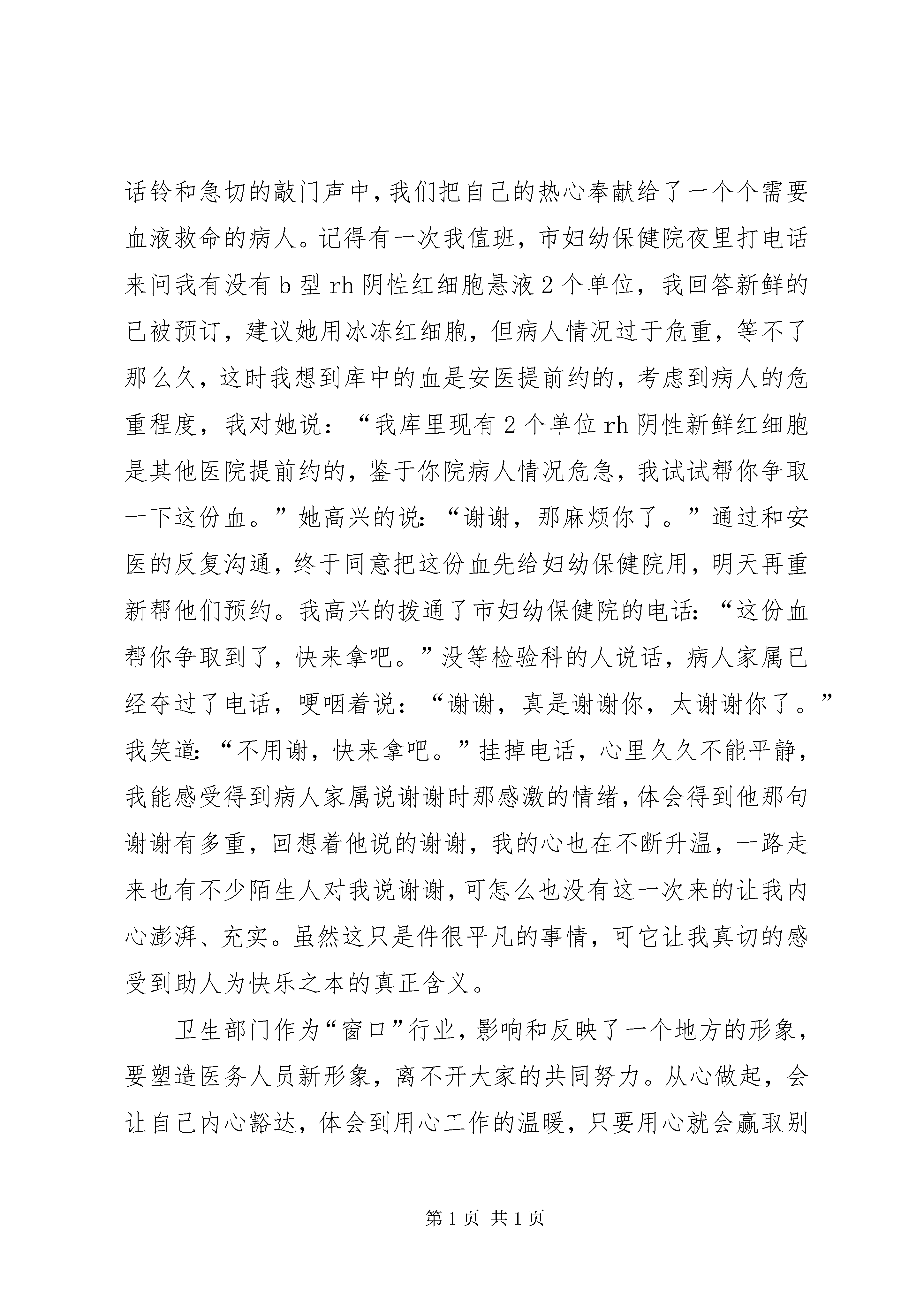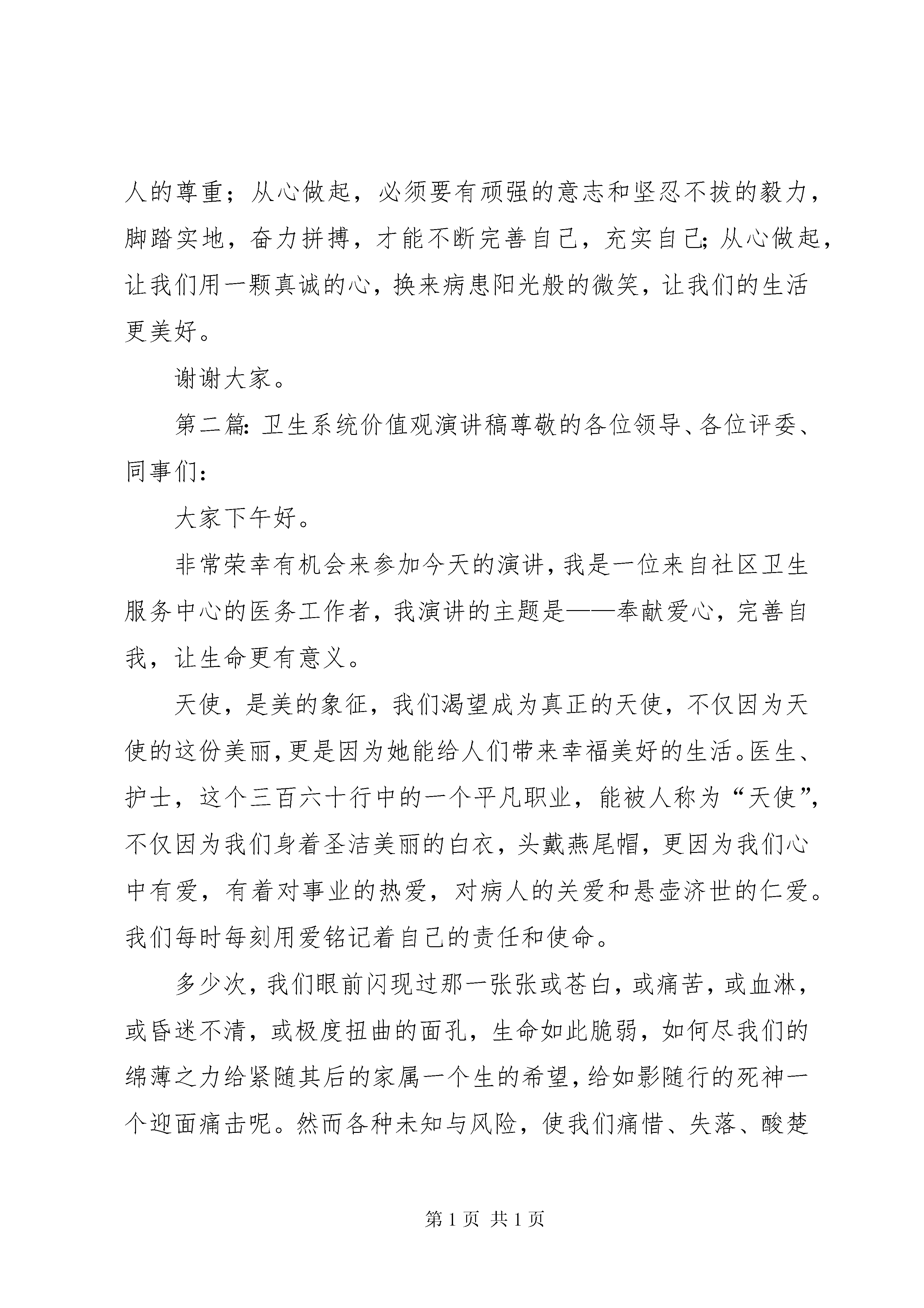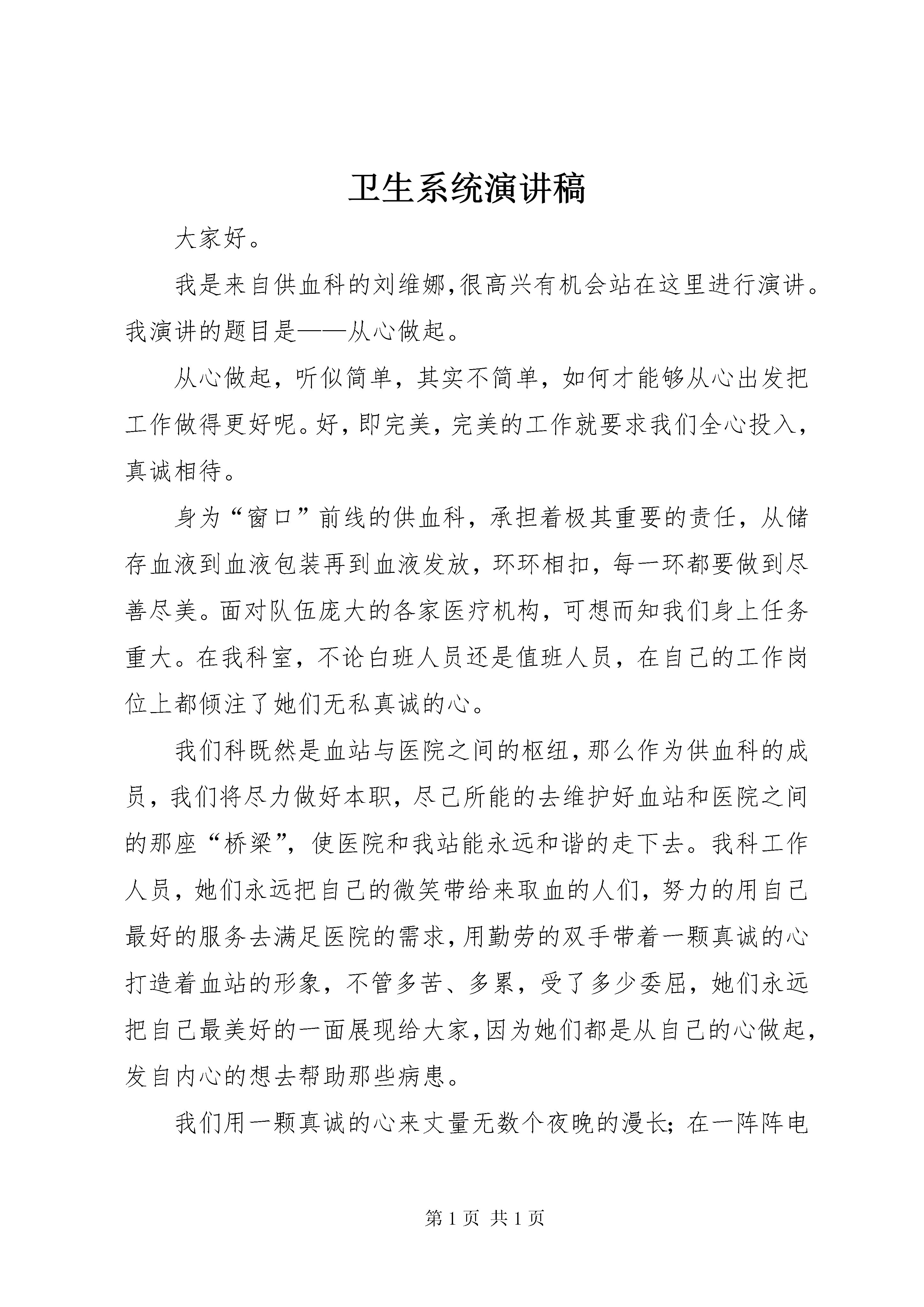 卫生系统演讲稿大家好。我是来自供血科的刘维娜,很高兴有机会站在这里进行演讲。我演讲的题目是——从心做起。从心做起,听似简单,其实不简单,如何才能够从心出发把工作做得更好呢。好,即完美,完美的工作就要求我们全心投入,真诚相待。身为“窗口”前线的供血科,承担着极其重要的责任,从储存血液到血液包装再到血液发放,环环相扣,每一环都要做到尽善尽美。面对队伍庞大的各家医疗机构,可想而知我们身上任务重大。在我科室,不论白班人员还是值班人员,在自己的工作岗位上都倾注了她们无私真诚的心。我们科既然是血站与医院之间的枢纽,那么作为供血科的成员,我们将尽力做好本职,尽己所能的去维护好血站和医院之间的那座“桥梁”,使医院和我站能永远和谐的走下去。我科工作人员,她们永远把自己的微笑带给来取血的人们,努力的用自己最好的服务去满足医院的需求,用勤劳的双手带着一颗真诚的心打造着血站的形象,不管多苦、多累,受了多少委屈,她们永远把自己最美好的一面展现给大家,因为她们都是从自己的心做起,发自内心的想去帮助那些病患。我们用一颗真诚的心来丈量无数个夜晚的漫长;在一阵阵电话铃和急切的敲门声中,我们把自己的热心奉献给了一个个需要血液救命的病人。记得有一次我值班,市妇幼保健院夜里打电话来问我有没有b型rh阴性红细胞悬液2个单位,我回答新鲜的已被预订,建议她用冰冻红细胞,但病人情况过于危重,等不了那么久,这时我想到库中的血是安医提前约的,考虑到病人的危重程度,我对她说:“我库里现有2个单位rh阴性新鲜红细胞是其他医院提前约的,鉴于你院病人情况危急,我试试帮你争取一下这份血。”她高兴的说:“谢谢,那麻烦你了。”通过和安医的反复沟通,终于同意把这份血先给妇幼保健院用,明天再重新帮他们预约。我高兴的拨通了市妇幼保健院的电话:“这份血帮你争取到了,快来拿吧。”没等检验科的人说话,病人家属已经夺过了电话,哽咽着说:“谢谢,真是谢谢你,太谢谢你了。”我笑道:“不用谢,快来拿吧。”挂掉电话,心里久久不能平静,我能感受得到病人家属说谢谢时那感激的情绪,体会得到他那句谢谢有多重,回想着他说的谢谢,我的心也在不断升温,一路走来也有不少陌生人对我说谢谢,可怎么也没有这一次来的让我内心澎湃、充实。虽然这只是件很平凡的事情,可它让我真切的感受到助人为快乐之本的真正含义。卫生部门作为“窗口”行业,影响和反映了一个地方的形象,要塑造医务人员新形象,离不开大家的共同努力。从心做起,会让自己内心豁达,体会到用心工作的温暖,只要用心就会赢取别人的尊重;从心做起,必须要有顽强的意志和坚忍不拔的毅力,脚踏实地,奋力拼搏,才能不断完善自己,充实自己;从心做起,让我们用一颗真诚的心,换来病患阳光般的微笑,让我们的生活更美好。谢谢大家。第二篇:卫生系统价值观演讲稿尊敬的各位领导、各位评委、同事们:大家下午好。非常荣幸有机会来参加今天的演讲,我是一位来自社区卫生服务中心的医务工作者,我演讲的主题是——奉献爱心,完善自我,让生命更有意义。天使,是美的象征,我们渴望成为真正的天使,不仅因为天使的这份美丽,更是因为她能给人们带来幸福美好的生活。医生、护士,这个三百六十行中的一个平凡职业,能被人称为“天使”,不仅因为我们身着圣洁美丽的白衣,头戴燕尾帽,更因为我们心中有爱,有着对事业的热爱,对病人的关爱和悬壶济世的仁爱。我们每时每刻用爱铭记着自己的责任和使命。多少次,我们眼前闪现过那一张张或苍白,或痛苦,或血淋,或昏迷不清,或极度扭曲的面孔,生命如此脆弱,如何尽我们的绵薄之力给紧随其后的家属一个生的希望,给如影随行的死神一个迎面痛击呢。然而各种未知与风险,使我们痛惜、失落、酸楚甚至自责,我们离死神近在咫尺,所以我们更懂得,再也没有什么比生命更珍贵。网络时代信息爆炸,关于医疗纠纷的报道,不管是官方的还是小道消息,瞬间就传遍大江南北,并吸引着无数眼球,前段时间我们**某医院的堵门事件、***医科大学医生被捅事件,**医生集体给死者下跪事件......部分围观者抱着亲者痛,仇者快的心理,甚至幸灾乐祸,无视医生职业的崇高,助长患者家属与“医闹”的无理纠缠。可见,医生是多么的无辜,医院又是多么的无助。最近热播六六的著作《心术》,一定有不少人看过,这部热播剧与《蜗居》一样,是社会热点的描述,她虽然非常贴近我们的生活,但其实医患关系没有这么复杂,它只是透露了种种心情、种种无奈,但是,这部剧片,在一定程度上糊弄了观众,助长了“医闹”,演员对自己的身份模糊。再说六六,短短几个月,写一部著作,卫生部在2010年《病历书写基本规范》在第一集就忽视了这个问题,出现了差错。最近嘉兴电视台在播放的《人间有天使》我个人认为,非常好,他采用了记录的方式,展示了我们医务人员的工作和生活等等,我觉得他们可以通过这样的方式,让老百姓更深入了解