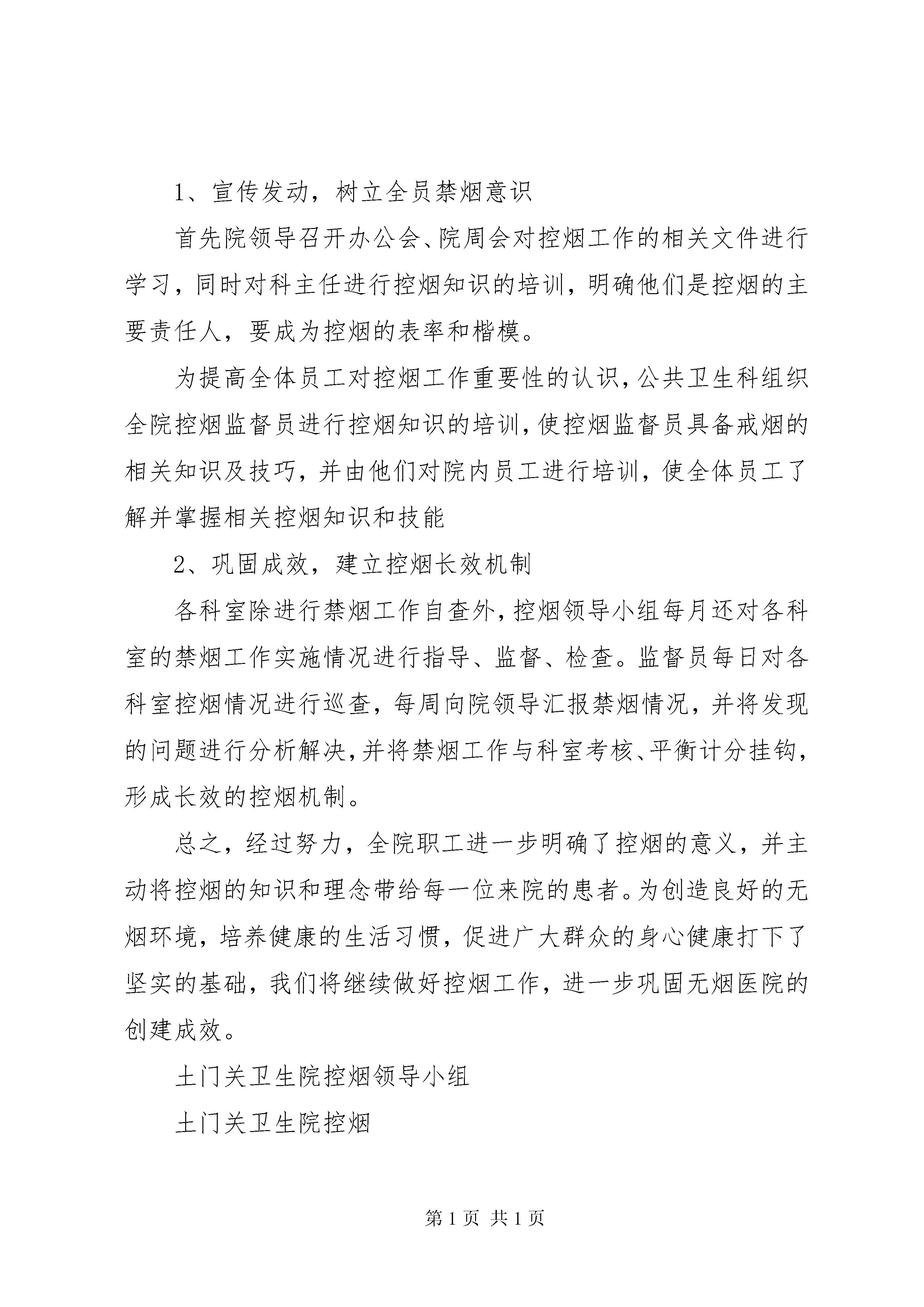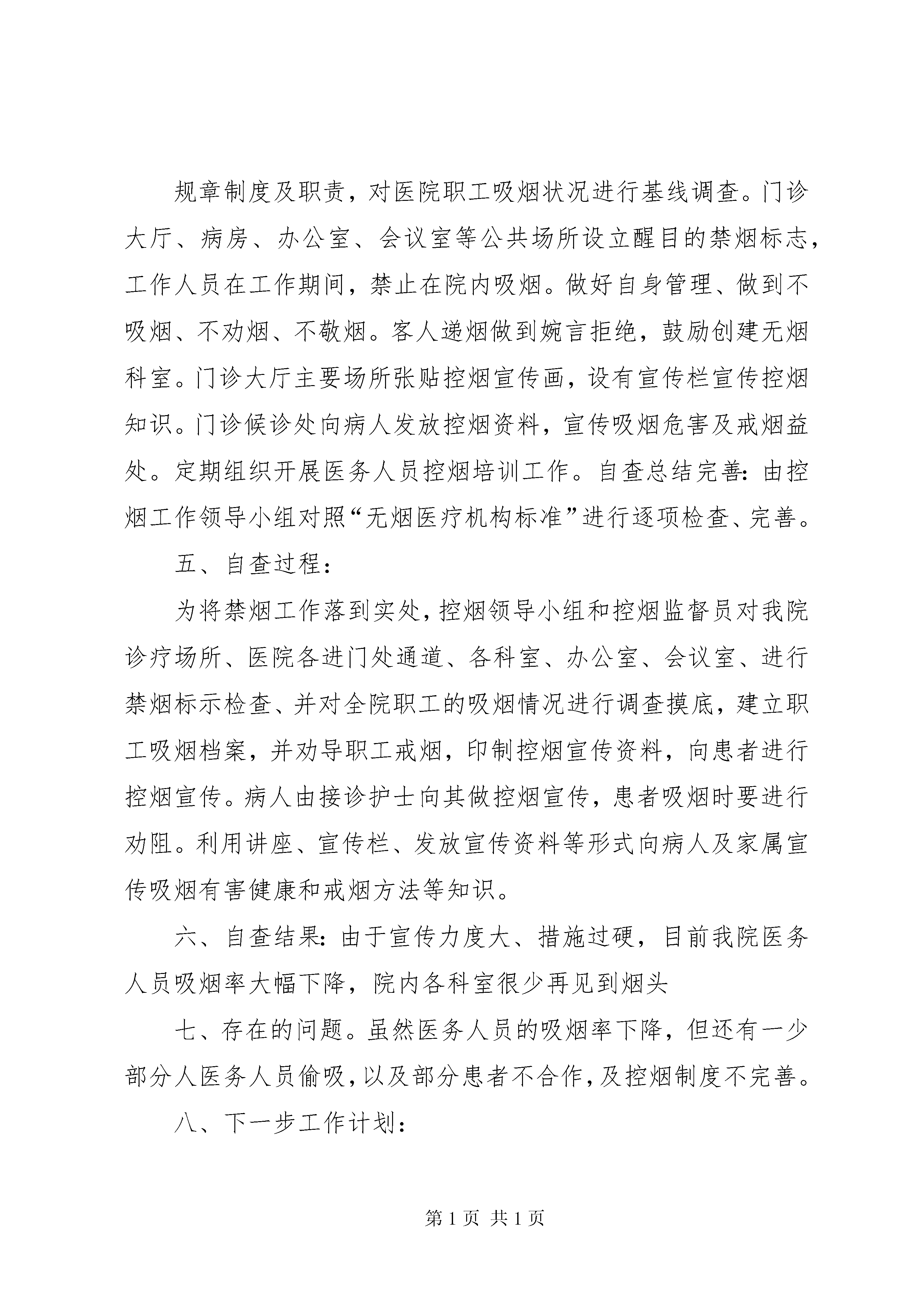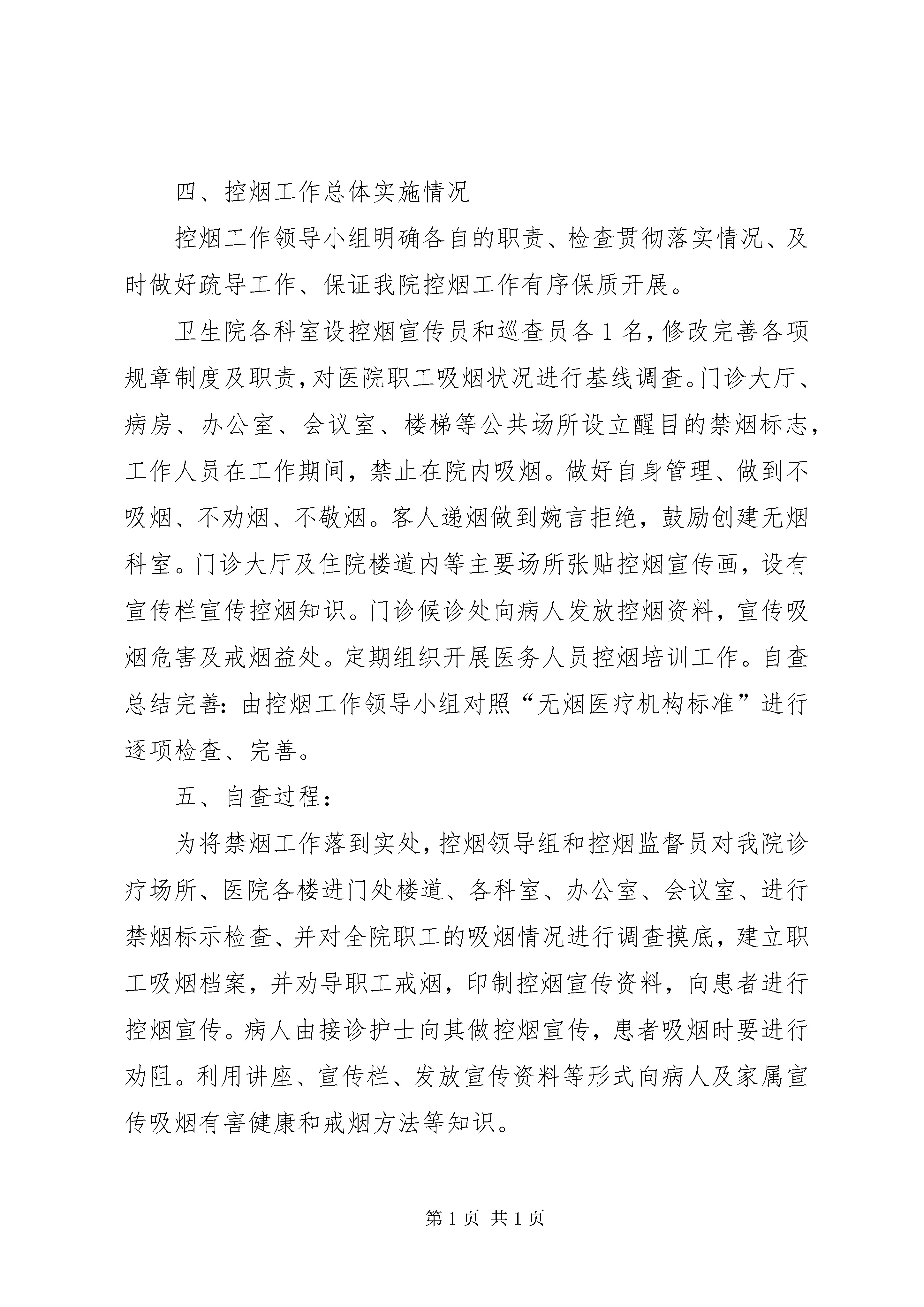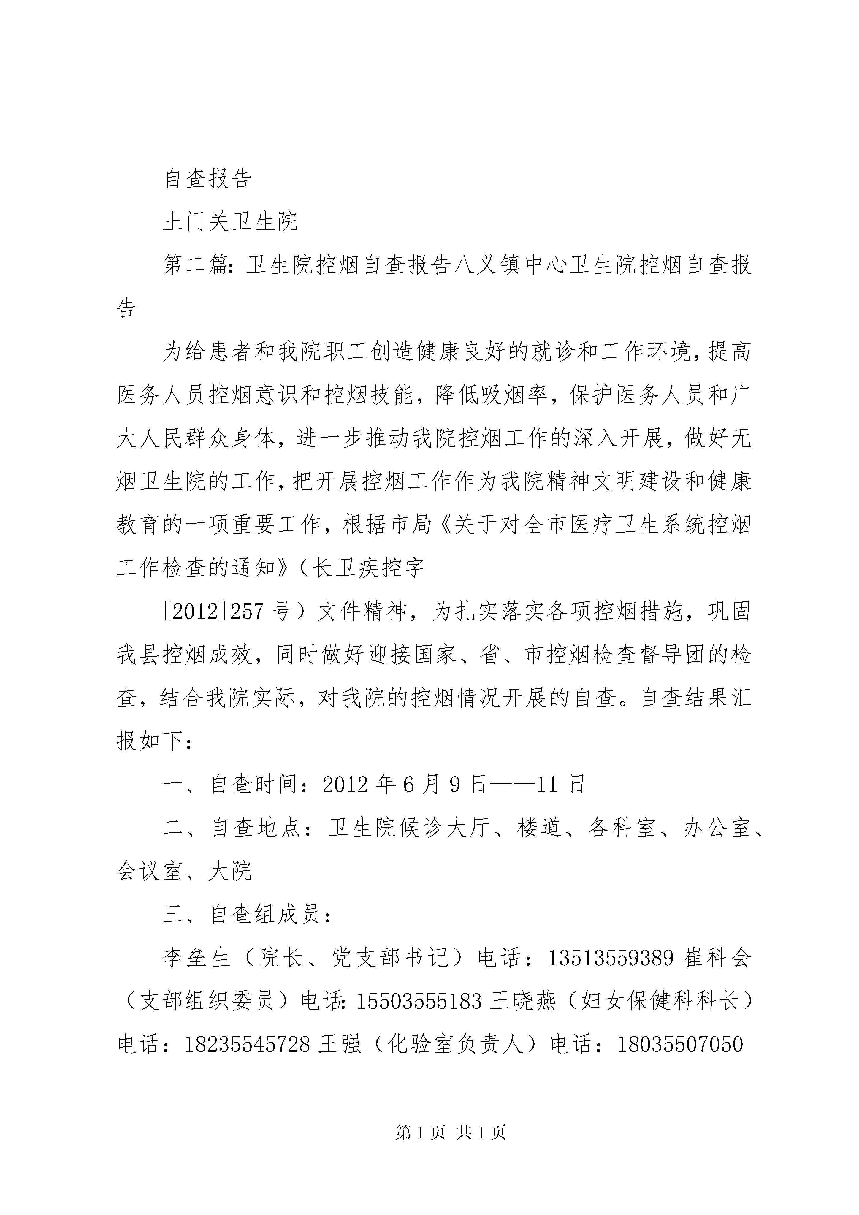 卫生院控烟自查报告范文为给患者和我院职工创造健康良好的就诊和工作环境,提高医务人员控烟意识和控烟技能,降低吸烟率,保护医务人员和广大人民群众身体,进一步推动我院控烟工作的深入开展,做好无烟卫生院的工作,把开展控烟工作作为我院精神文明建设和健康教育的一项重要工作,根据县局《关于对全县医疗卫生系统控烟工作检查的通知》,为扎实落实各项控烟措施,巩固我县控烟成效,同时做好迎接国家、省、市控烟检查督导团的检查,结合我院实际,对我院的控烟情况开展的自查。自查结果汇报如下:一、自查时间:2012年10月3日—9日二、自查地点:卫生院候诊大厅、走廊、各科室、办公室、会议室、大院三、自查组成员:甘生贵(院长)王志杰(公共卫生科科长)马晓东(卫生院主治医师)王小珍(护士长)四、控烟工作总体实施情况控烟工作领导小组明确各自的职责、检查贯彻落实情况、及时做好疏导工作、保证我院控烟工作有序保质开展。卫生院各科室设控烟宣传员和巡查员各1名,修改完善各项规章制度及职责,对医院职工吸烟状况进行基线调查。门诊大厅、病房、办公室、会议室等公共场所设立醒目的禁烟标志,工作人员在工作期间,禁止在院内吸烟。做好自身管理、做到不吸烟、不劝烟、不敬烟。客人递烟做到婉言拒绝,鼓励创建无烟科室。门诊大厅主要场所张贴控烟宣传画,设有宣传栏宣传控烟知识。门诊候诊处向病人发放控烟资料,宣传吸烟危害及戒烟益处。定期组织开展医务人员控烟培训工作。自查总结完善:由控烟工作领导小组对照“无烟医疗机构标准”进行逐项检查、完善。五、自查过程:为将禁烟工作落到实处,控烟领导小组和控烟监督员对我院诊疗场所、医院各进门处通道、各科室、办公室、会议室、进行禁烟标示检查、并对全院职工的吸烟情况进行调查摸底,建立职工吸烟档案,并劝导职工戒烟,印制控烟宣传资料,向患者进行控烟宣传。病人由接诊护士向其做控烟宣传,患者吸烟时要进行劝阻。利用讲座、宣传栏、发放宣传资料等形式向病人及家属宣传吸烟有害健康和戒烟方法等知识。六、自查结果:由于宣传力度大、措施过硬,目前我院医务人员吸烟率大幅下降,院内各科室很少再见到烟头七、存在的问题。虽然医务人员的吸烟率下降,但还有一少部分人医务人员偷吸,以及部分患者不合作,及控烟制度不完善。八、下一步工作计划:1、宣传发动,树立全员禁烟意识首先院领导召开办公会、院周会对控烟工作的相关文件进行学习,同时对科主任进行控烟知识的培训,明确他们是控烟的主要责任人,要成为控烟的表率和楷模。为提高全体员工对控烟工作重要性的认识,公共卫生科组织全院控烟监督员进行控烟知识的培训,使控烟监督员具备戒烟的相关知识及技巧,并由他们对院内员工进行培训,使全体员工了解并掌握相关控烟知识和技能2、巩固成效,建立控烟长效机制各科室除进行禁烟工作自查外,控烟领导小组每月还对各科室的禁烟工作实施情况进行指导、监督、检查。监督员每日对各科室控烟情况进行巡查,每周向院领导汇报禁烟情况,并将发现的问题进行分析解决,并将禁烟工作与科室考核、平衡计分挂钩,形成长效的控烟机制。总之,经过努力,全院职工进一步明确了控烟的意义,并主动将控烟的知识和理念带给每一位来院的患者。为创造良好的无烟环境,培养健康的生活习惯,促进广大群众的身心健康打下了坚实的基础,我们将继续做好控烟工作,进一步巩固无烟医院的创建成效。土门关卫生院控烟领导小组土门关卫生院控烟自查报告土门关卫生院第二篇:卫生院控烟自查报告八义镇中心卫生院控烟自查报告为给患者和我院职工创造健康良好的就诊和工作环境,提高医务人员控烟意识和控烟技能,降低吸烟率,保护医务人员和广大人民群众身体,进一步推动我院控烟工作的深入开展,做好无烟卫生院的工作,把开展控烟工作作为我院精神文明建设和健康教育的一项重要工作,根据市局《关于对全市医疗卫生系统控烟工作检查的通知》(长卫疾控字[2012]257号)文件精神,为扎实落实各项控烟措施,巩固我县控烟成效,同时做好迎接国家、省、市控烟检查督导团的检查,结合我院实际,对我院的控烟情况开展的自查。自查结果汇报如下:一、自查时间:2012年6月9日——11日二、自查地点:卫生院候诊大厅、楼道、各科室、办公室、会议室、大院三、自查组成员:李垒生(院长、党支部书记)电话:13513559389崔科会(支部组织委员)电话:15503555183王晓燕(妇女保健科科长)电话:18235545728王强(化验室负责人)电话:18035507050四、控烟工作总体实施情况控烟工作领导小组明确各自的职责、检查贯彻落实情况、及时做好疏导工作、保证我院控烟工作有序保质开展。卫生院各科室设控烟宣传员和巡查员各1名,修改完善各项规章制度及职责,对医院职工吸烟状况进行基线调查。门诊大厅、病房、办公室、会议室、楼梯等公共场所设立醒目的禁烟标志,工作人员在工