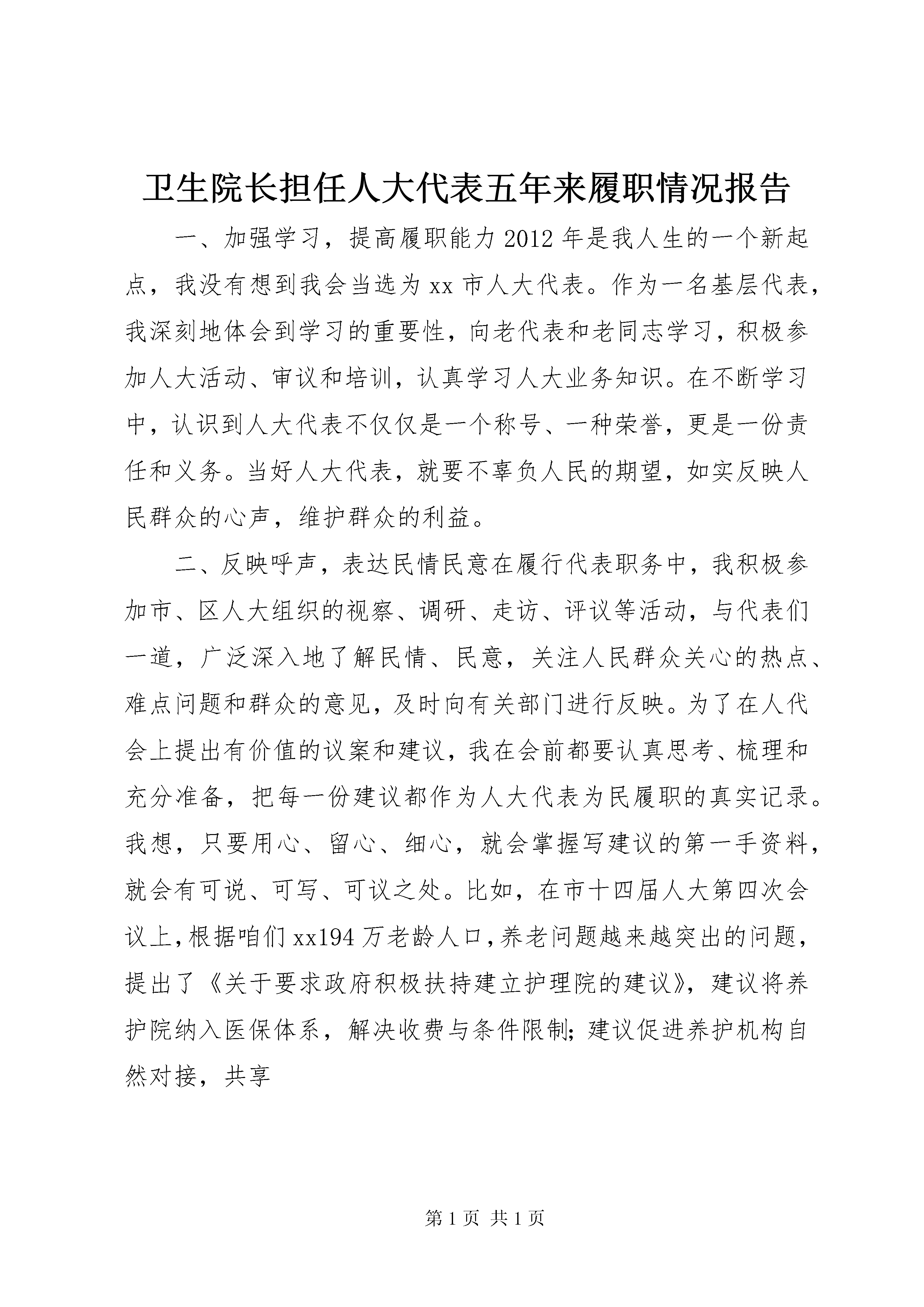 卫生院长担任人大代表五年来履职情况报告一、加强学习,提高履职能力2012年是我人生的一个新起点,我没有想到我会当选为xx市人大代表。作为一名基层代表,我深刻地体会到学习的重要性,向老代表和老同志学习,积极参加人大活动、审议和培训,认真学习人大业务知识。在不断学习中,认识到人大代表不仅仅是一个称号、一种荣誉,更是一份责任和义务。当好人大代表,就要不辜负人民的期望,如实反映人民群众的心声,维护群众的利益。二、反映呼声,表达民情民意在履行代表职务中,我积极参加市、区人大组织的视察、调研、走访、评议等活动,与代表们一道,广泛深入地了解民情、民意,关注人民群众关心的热点、难点问题和群众的意见,及时向有关部门进行反映。为了在人代会上提出有价值的议案和建议,我在会前都要认真思考、梳理和充分准备,把每一份建议都作为人大代表为民履职的真实记录。我想,只要用心、留心、细心,就会掌握写建议的第一手资料,就会有可说、可写、可议之处。比如,在市十四届人大第四次会议上,根据咱们xx194万老龄人口,养老问题越来越突出的问题,提出了《关于要求政府积极扶持建立护理院的建议》,建议将养护院纳入医保体系,解决收费与条件限制;建议促进养护机构自然对接,共享