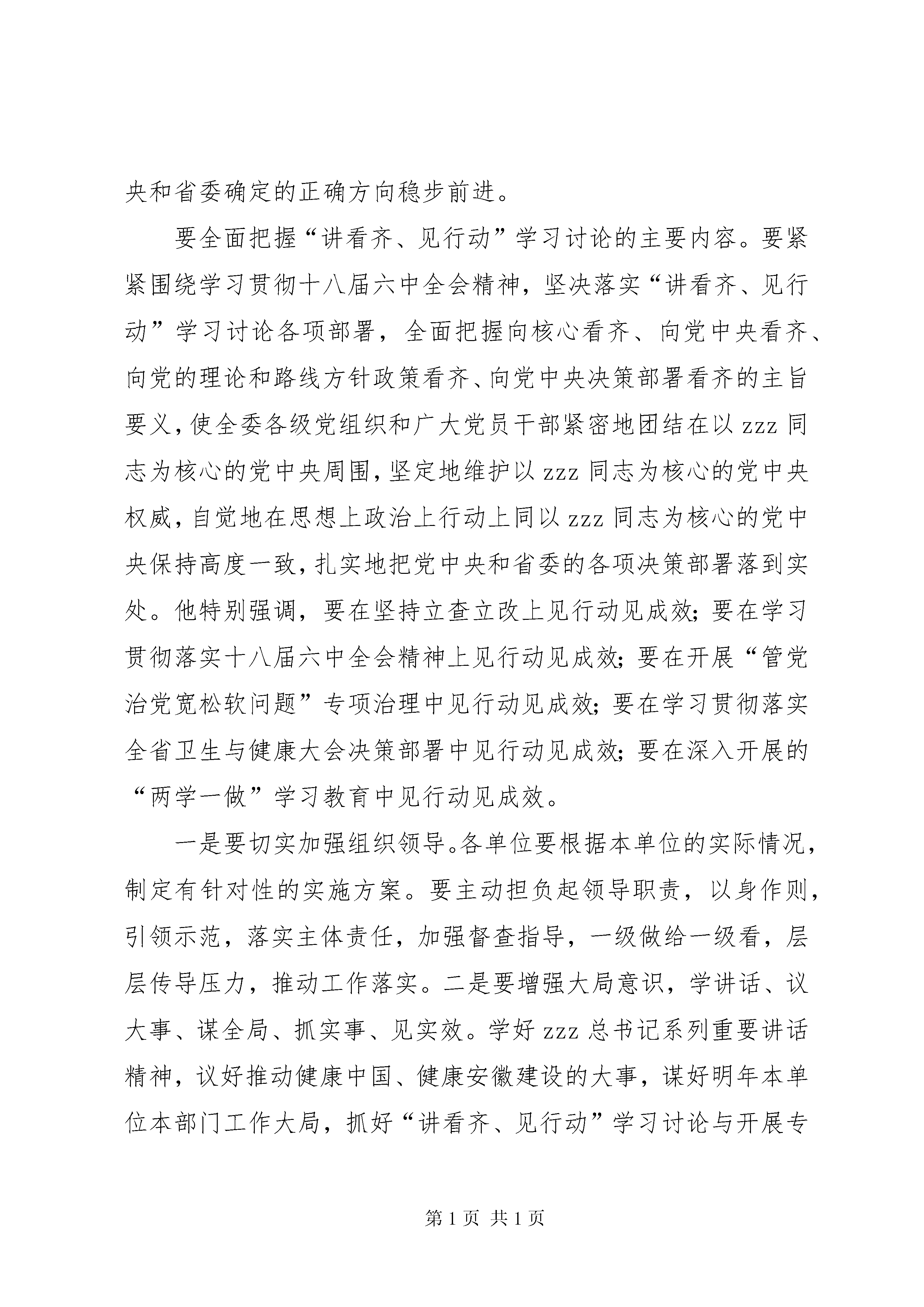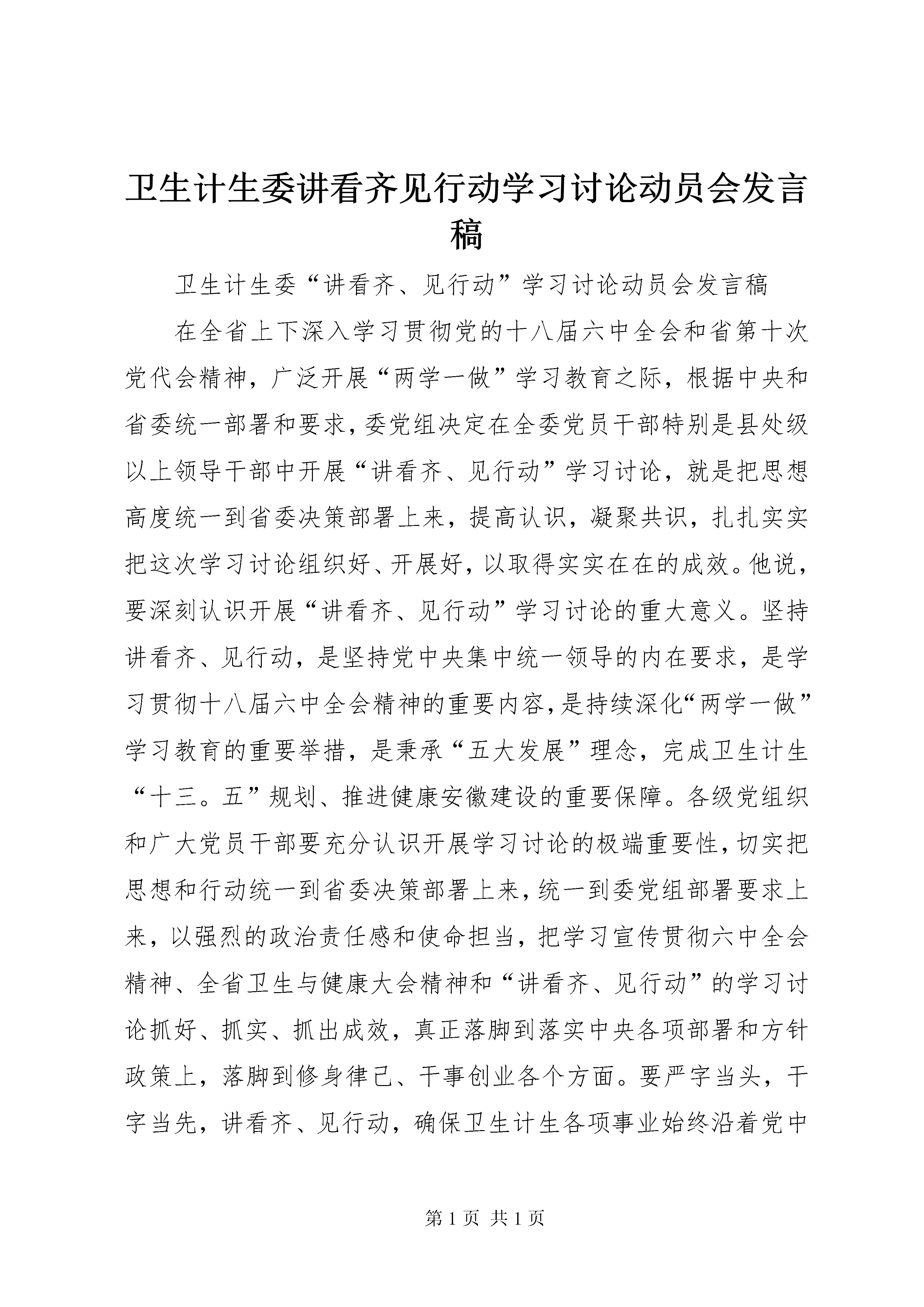 卫生计生委讲看齐见行动学习讨论动员会发言稿卫生计生委“讲看齐、见行动”学习讨论动员会发言稿在全省上下深入学习贯彻党的十八届六中全会和省第十次党代会精神,广泛开展“两学一做”学习教育之际,根据中央和省委统一部署和要求,委党组决定在全委党员干部特别是县处级以上领导干部中开展“讲看齐、见行动”学习讨论,就是把思想高度统一到省委决策部署上来,提高认识,凝聚共识,扎扎实实把这次学习讨论组织好、开展好,以取得实实在在的成效。他说,要深刻认识开展“讲看齐、见行动”学习讨论的重大意义。坚持讲看齐、见行动,是坚持党中央集中统一领导的内在要求,是学习贯彻十八届六中全会精神的重要内容,是持续深化“两学一做”学习教育的重要举措,是秉承“五大发展”理念,完成卫生计生“十三。五”规划、推进健康安徽建设的重要保障。各级党组织和广大党员干部要充分认识开展学习讨论的极端重要性,切实把思想和行动统一到省委决策部署上来,统一到委党组部署要求上来,以强烈的政治责任感和使命担当,把学习宣传贯彻六中全会精神、全省卫生与健康大会精神和“讲看齐、见行动”的学习讨论抓好、抓实、抓出成效,真正落脚到落实中央各项部署和方针政策上,落脚到修身律己、干事创业各个方面。要严字当头,干字当先,讲看齐、见行动,确保卫生计生各项事业始终沿着党中央和省委确定的正确方向稳步前进。要全面把握“讲看齐、见行动”学习讨论的主要内容。要紧紧围绕学习贯彻十八届六中全会精神,坚决落实“讲看齐、见行动”学习讨论各项部署,全面把握向核心看齐、向党中央看齐、向党的理论和路线方针政策看齐、向党中央决策部署看齐的主旨要义,使全委各级党组织和广大党员干部紧密地团结在以zzz同志为核心的党中央周围,坚定地维护以zzz同志为核心的党中央权威,自觉地在思想上政治上行动上同以zzz同志为核心的党中央保持高度一致,扎实地把党中央和省委的各项决策部署落到实处。他特别强调,要在坚持立查立改上见行动见成效;要在学习贯彻落实十八届六中全会精神上见行动见成效;要在开展“管党治党宽松软问题”专项治理中见行动见成效;要在学习贯彻落实全省卫生与健康大会决策部署中见行动见成效;要在深入开展的“两学一做”学习教育中见行动见成效。一是要切实加强组织领导。各单位要根据本单位的实际情况,制定有针对性的实施方案。要主动担负起领导职责,以身作则,引领示范,落实主体责任,加强督查指导,一级做给一级看,层层传导压力,推动工作落实。二是要增强大局意识,学讲话、议大事、谋全局、抓实事、见实效。学好zzz总书记系列重要讲话精神,议好推动健康中国、健康安徽建设的大事,谋好明年本单位本部门工作大局,抓好“讲看齐、见行动”学习讨论与开展专项整治工作、与开展“两学一做”学习教育、与学习贯彻落实全省卫生与健康大会决策部署四者紧密结合起来,做好统筹,共同推进。在战决胜全面小康,加快推进健康安徽建设见实效。三是要加强宣传,做好舆论引导,开设专题专栏,运用新媒体、新手段及时宣传活动开展的进展与成效,自觉接受群众监督,以成果来检验学习讨论的实际成效。六中全会,发言稿,党代会,计生委,责任感