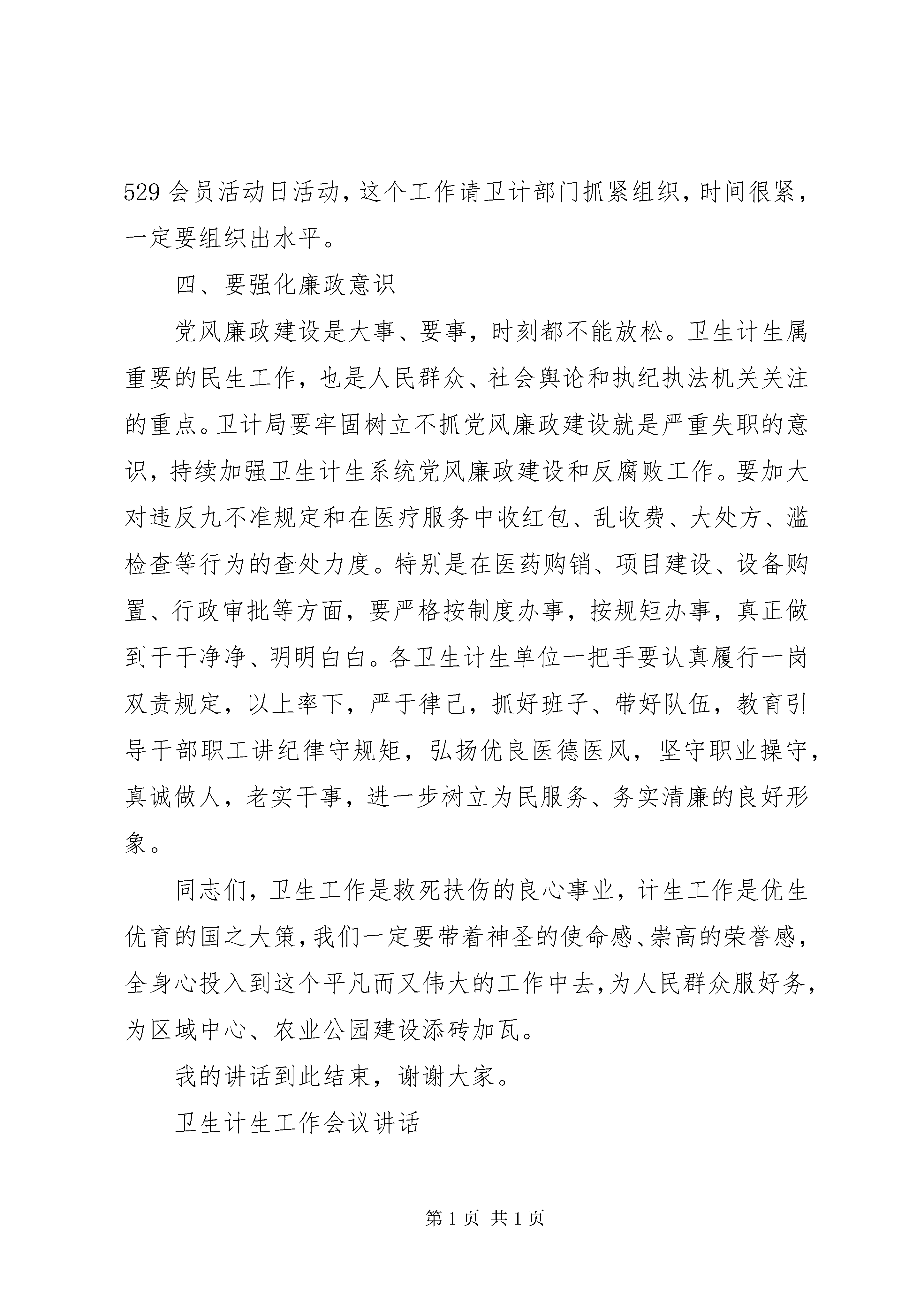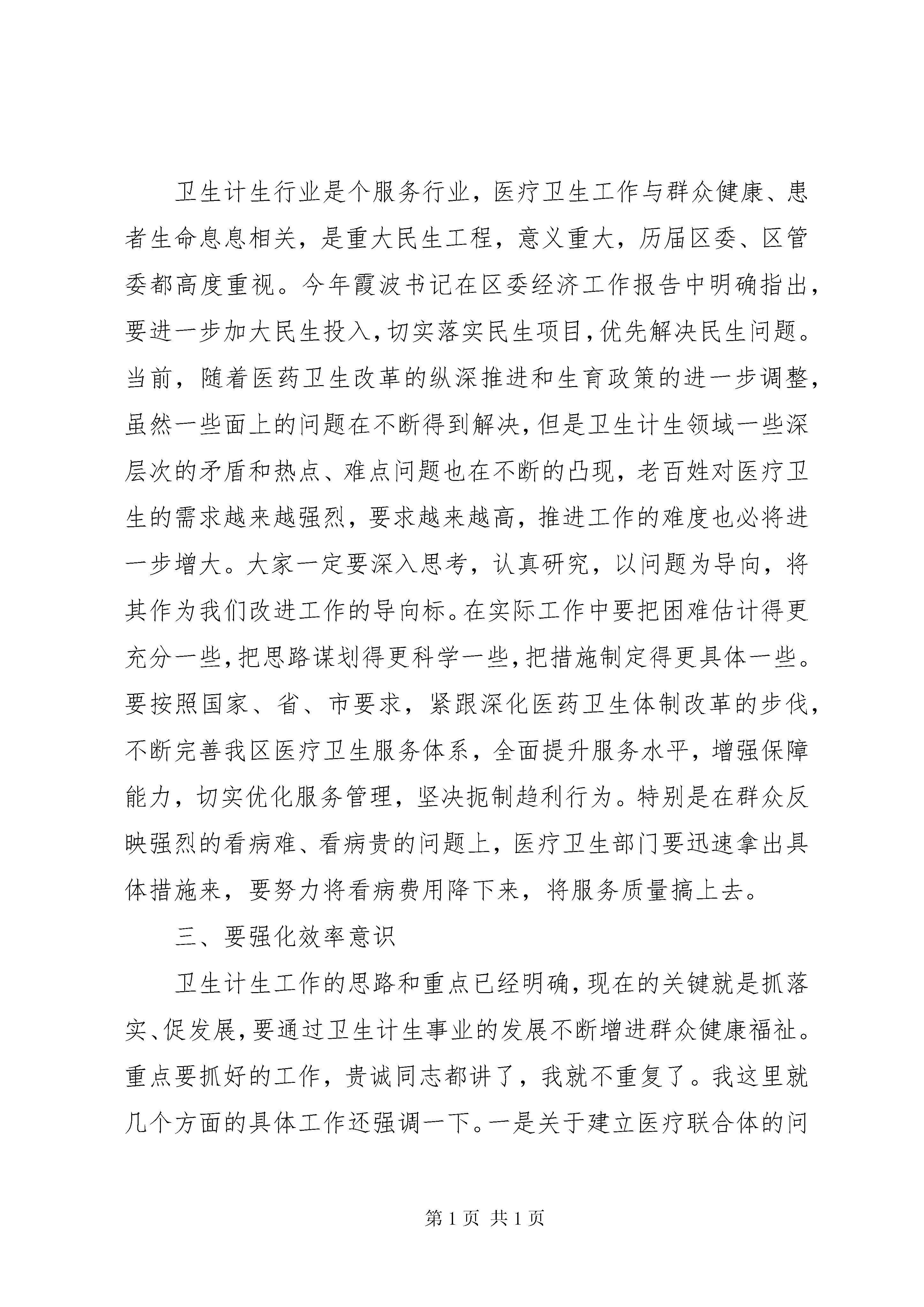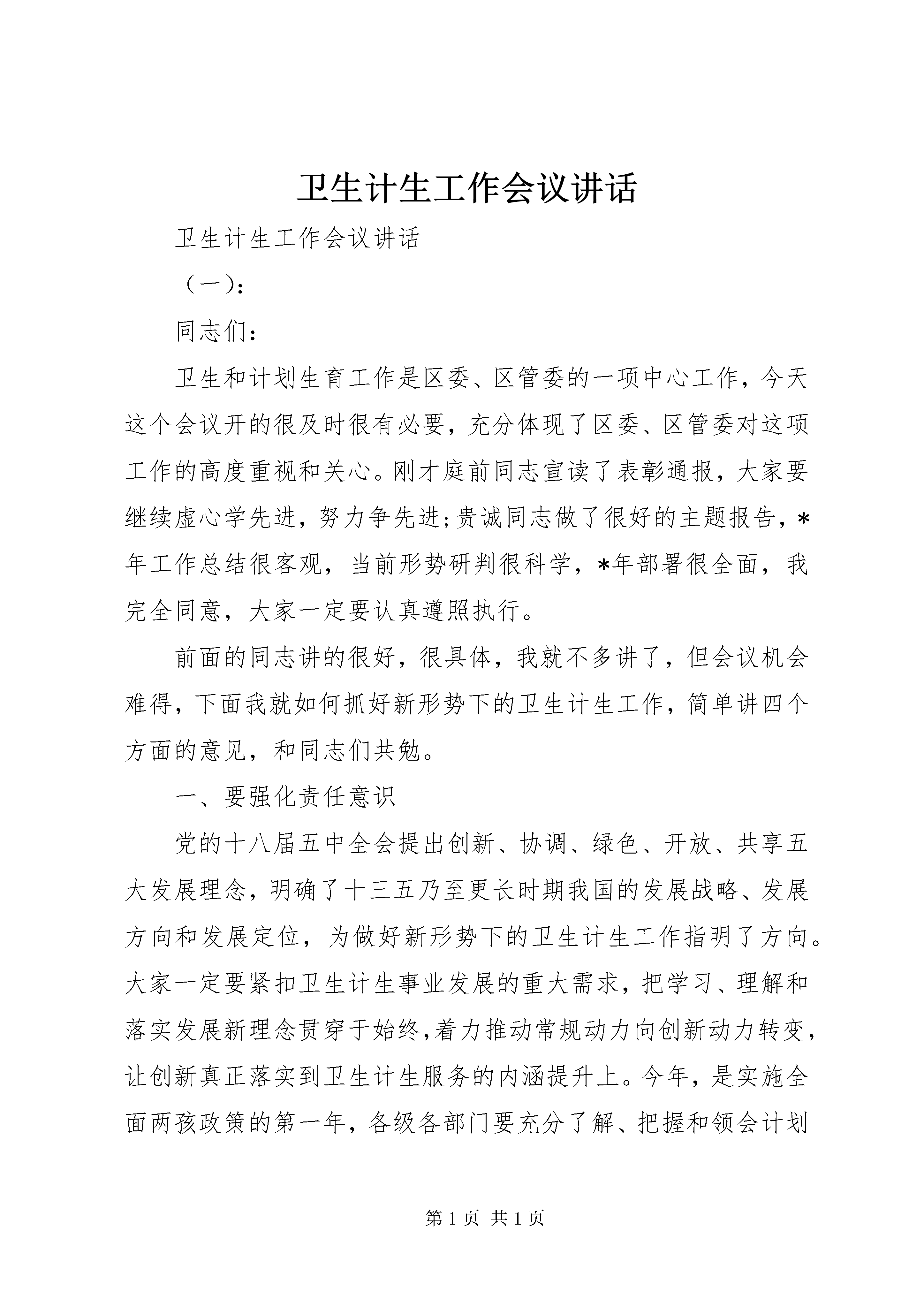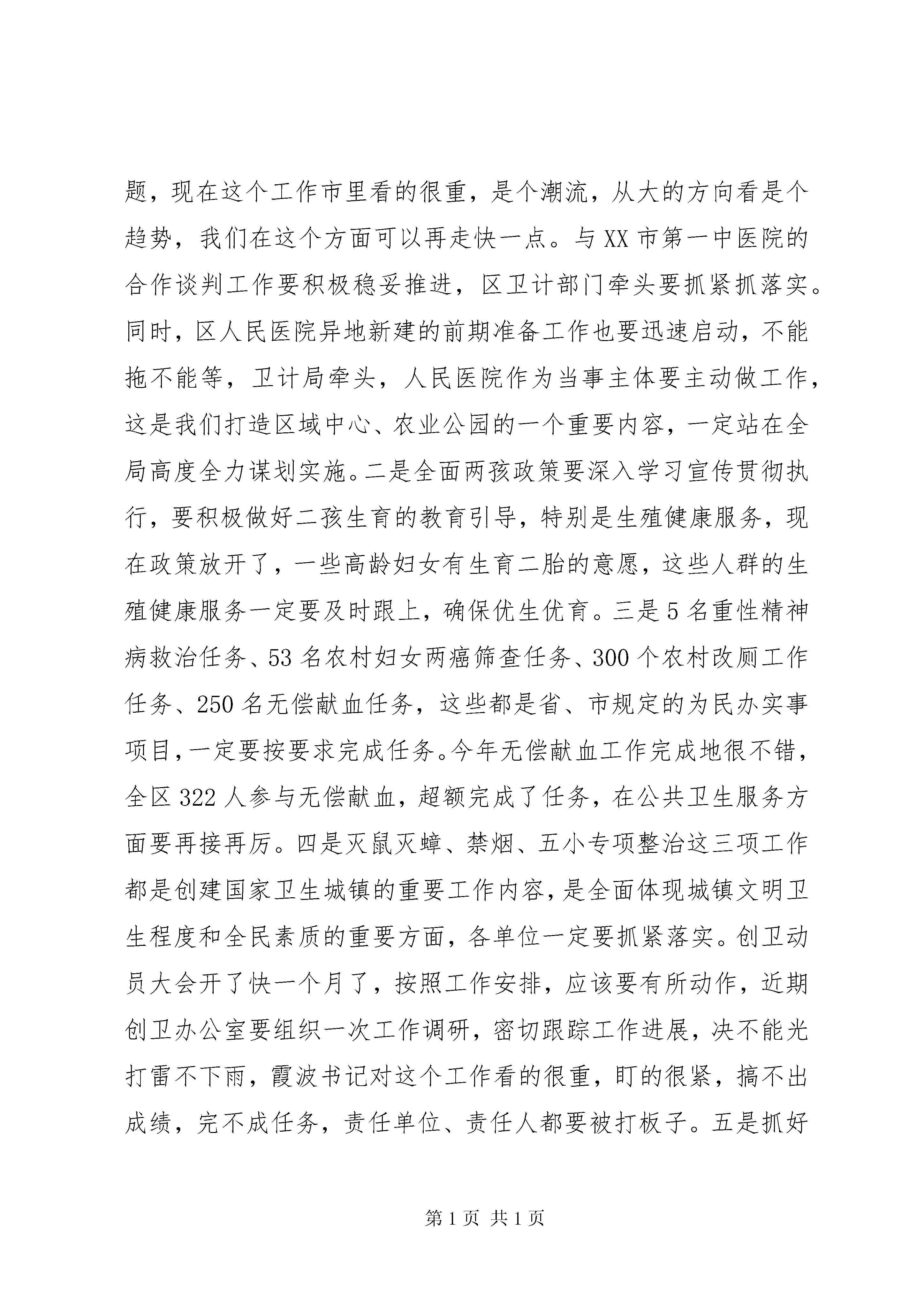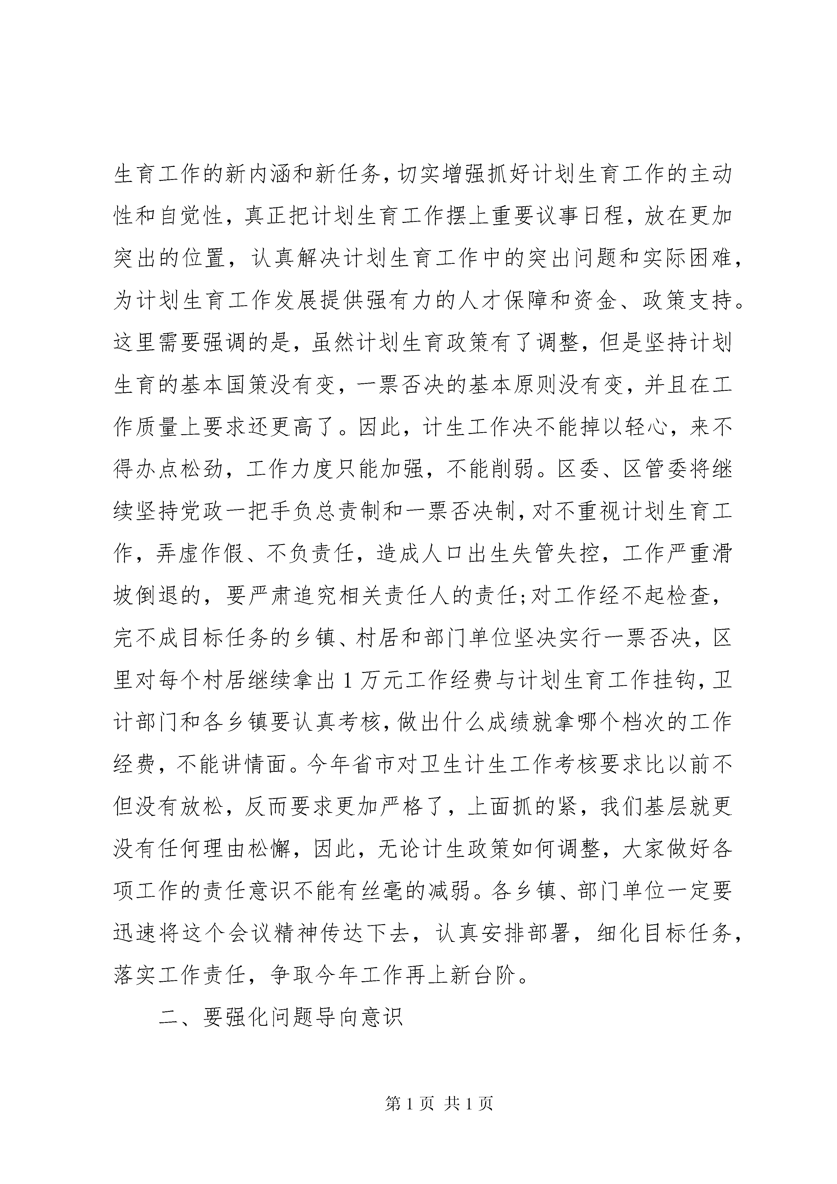 卫生计生工作会议讲话卫生计生工作会议讲话(一):同志们:卫生和计划生育工作是区委、区管委的一项中心工作,今天这个会议开的很及时很有必要,充分体现了区委、区管委对这项工作的高度重视和关心。刚才庭前同志宣读了表彰通报,大家要继续虚心学先进,努力争先进;贵诚同志做了很好的主题报告,*年工作总结很客观,当前形势研判很科学,*年部署很全面,我完全同意,大家一定要认真遵照执行。前面的同志讲的很好,很具体,我就不多讲了,但会议机会难得,下面我就如何抓好新形势下的卫生计生工作,简单讲四个方面的意见,和同志们共勉。一、要强化责任意识党的十八届五中全会提出创新、协调、绿色、开放、共享五大发展理念,明确了十三五乃至更长时期我国的发展战略、发展方向和发展定位,为做好新形势下的卫生计生工作指明了方向。大家一定要紧扣卫生计生事业发展的重大需求,把学习、理解和落实发展新理念贯穿于始终,着力推动常规动力向创新动力转变,让创新真正落实到卫生计生服务的内涵提升上。今年,是实施全面两孩政策的第一年,各级各部门要充分了解、把握和领会计划生育工作的新内涵和新任务,切实增强抓好计划生育工作的主动性和自觉性,真正把计划生育工作摆上重要议事日程,放在更加突出的位置,认真解决计划生育工作中的突出问题和实际困难,为计划生育工作发展提供强有力的人才保障和资金、政策支持。这里需要强调的是,虽然计划生育政策有了调整,但是坚持计划生育的基本国策没有变,一票否决的基本原则没有变,并且在工作质量上要求还更高了。因此,计生工作决不能掉以轻心,来不得办点松劲,工作力度只能加强,不能削弱。区委、区管委将继续坚持党政一把手负总责制和一票否决制,对不重视计划生育工作,弄虚作假、不负责任,造成人口出生失管失控,工作严重滑坡倒退的,要严肃追究相关责任人的责任;对工作经不起检查,完不成目标任务的乡镇、村居和部门单位坚决实行一票否决,区里对每个村居继续拿出1万元工作经费与计划生育工作挂钩,卫计部门和各乡镇要认真考核,做出什么成绩就拿哪个档次的工作经费,不能讲情面。今年省市对卫生计生工作考核要求比以前不但没有放松,反而要求更加严格了,上面抓的紧,我们基层就更没有任何理由松懈,因此,无论计生政策如何调整,大家做好各项工作的责任意识不能有丝毫的减弱。各乡镇、部门单位一定要迅速将这个会议精神传达下去,认真安排部署,细化目标任务,落实工作责任,争取今年工作再上新台阶。二、要强化问题导向意识卫生计生行业是个服务行业,医疗卫生工作与群众健康、患者生命息息相关,是重大民生工程,意义重大,历届区委、区管委都高度重视。今年霞波书记在区委经济工作报告中明确指出,要进一步加大民生投入,切实落实民生项目,优先解决民生问题。当前,随着医药卫生改革的纵深推进和生育政策的进一步调整,虽然一些面上的问题在不断得到解决,但是卫生计生领域一些深层次的矛盾和热点、难点问题也在不断的凸现,老百姓对医疗卫生的需求越来越强烈,要求越来越高,推进工作的难度也必将进一步增大。大家一定要深入思考,认真研究,以问题为导向,将其作为我们改进工作的导向标。在实际工作中要把困难估计得更充分一些,把思路谋划得更科学一些,把措施制定得更具体一些。要按照国家、省、市要求,紧跟深化医药卫生体制改革的步伐,不断完善我区医疗卫生服务体系,全面提升服务水平,增强保障能力,切实优化服务管理,坚决扼制趋利行为。特别是在群众反映强烈的看病难、看病贵的问题上,医疗卫生部门要迅速拿出具体措施来,要努力将看病费用降下来,将服务质量搞上去。三、要强化效率意识卫生计生工作的思路和重点已经明确,现在的关键就是抓落实、促发展,要通过卫生计生事业的发展不断增进群众健康福祉。重点要抓好的工作,贵诚同志都讲了,我就不重复了。我这里就几个方面的具体工作还强调一下。一是关于建立医疗联合体的问题,现在这个工作市里看的很重,是个潮流,从大的方向看是个趋势,我们在这个方面可以再走快一点。与XX市第一中医院的合作谈判工作要积极稳妥推进,区卫计部门牵头要抓紧抓落实。同时,区人民医院异地新建的前期准备工作也要迅速启动,不能拖不能等,卫计局牵头,人民医院作为当事主体要主动做工作,这是我们打造区域中心、农业公园的一个重要内容,一定站在全局高度全力谋划实施。二是全面两孩政策要深入学习宣传贯彻执行,要积极做好二孩生育的教育引导,特别是生殖健康服务,现在政策放开了,一些高龄妇女有生育二胎的意愿,这些人群的生殖健康服务一定要及时跟上,确保优生优育。三是5名重性精神病救治任务、53名农村妇女两癌筛查任务、300个农村改厕工作任务、250名无偿献血任务,这些都是省、市规定的为民办实事项目,一定要按要求完成任务。今年无偿献血工作完成地很不错,全区322人参与无偿献血,超额完成了任务,在公共卫生服务方面要再接再厉。