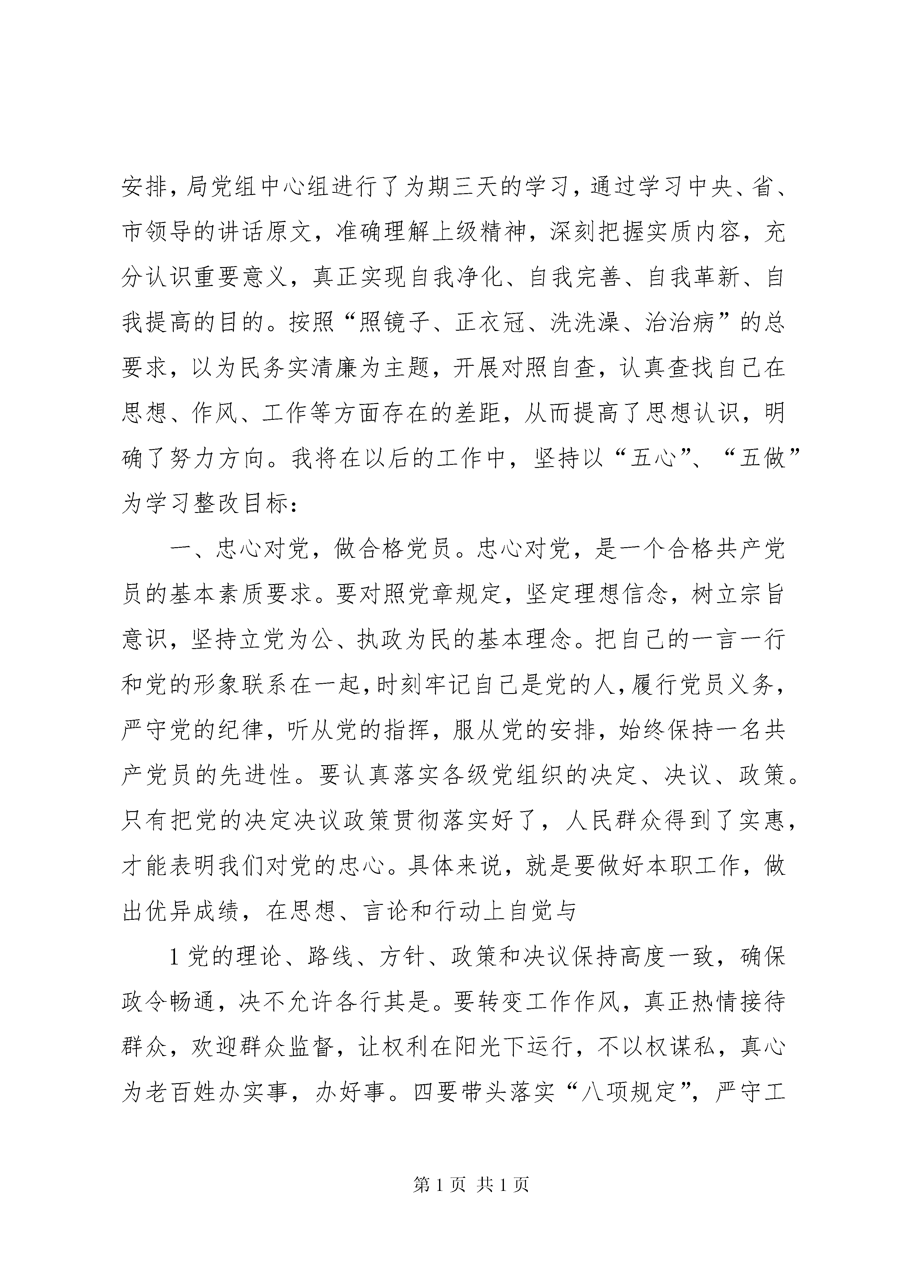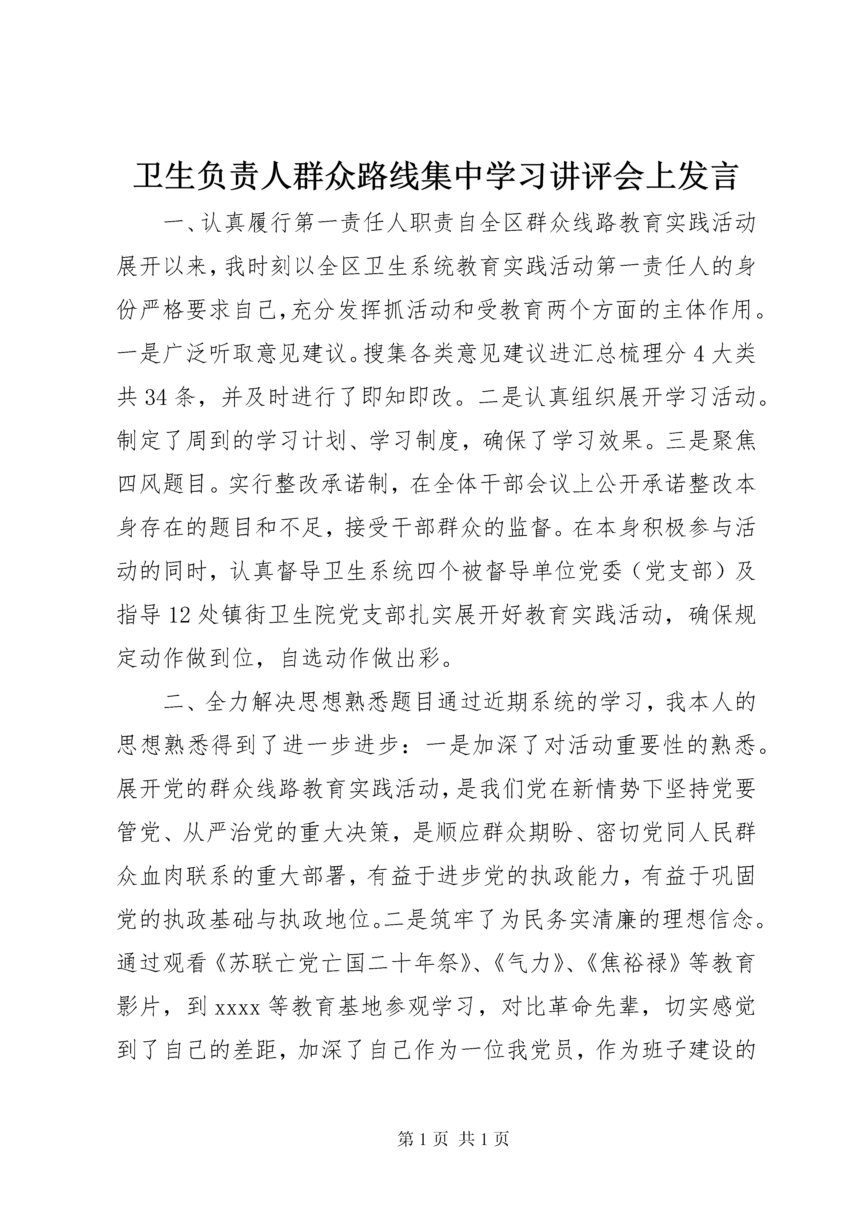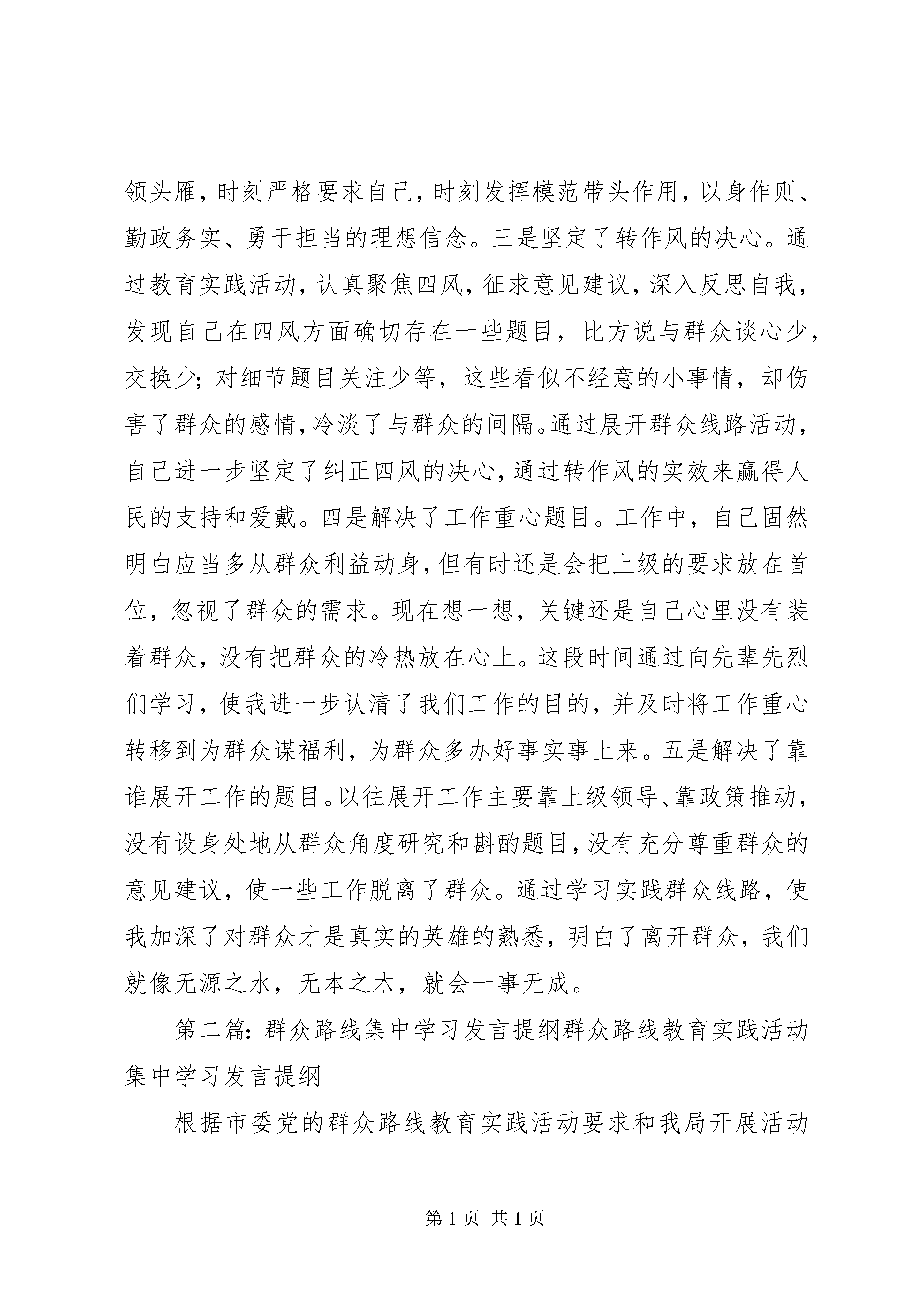 卫生负责人群众路线集中学习讲评会上发言一、认真履行第一责任人职责自全区群众线路教育实践活动展开以来,我时刻以全区卫生系统教育实践活动第一责任人的身份严格要求自己,充分发挥抓活动和受教育两个方面的主体作用。一是广泛听取意见建议。搜集各类意见建议进汇总梳理分4大类共34条,并及时进行了即知即改。二是认真组织展开学习活动。制定了周到的学习计划、学习制度,确保了学习效果。三是聚焦四风题目。实行整改承诺制,在全体干部会议上公开承诺整改本身存在的题目和不足,接受干部群众的监督。在本身积极参与活动的同时,认真督导卫生系统四个被督导单位党委(党支部)及指导12处镇街卫生院党支部扎实展开好教育实践活动,确保规定动作做到位,自选动作做出彩。二、全力解决思想熟悉题目通过近期系统的学习,我本人的思想熟悉得到了进一步进步:一是加深了对活动重要性的熟悉。展开党的群众线路教育实践活动,是我们党在新情势下坚持党要管党、从严治党的重大决策,是顺应群众期盼、密切党同人民群众血肉联系的重大部署,有益于进步党的执政能力,有益于巩固党的执政基础与执政地位。二是筑牢了为民务实清廉的理想信念。通过观看《苏联亡党亡国二十年祭》、《气力》、《焦裕禄》等教育影片,到xxxx等教育基地参观学习,对比革命先辈,切实感觉到了自己的差距,加深了自己作为一位我党员,作为班子建设的领头雁,时刻严格要求自己,时刻发挥模范带头作用,以身作则、勤政务实、勇于担当的理想信念。三是坚定了转作风的决心。通过教育实践活动,认真聚焦四风,征求意见建议,深入反思自我,发现自己在四风方面确切存在一些题目,比方说与群众谈心少,交换少;对细节题目关注少等,这些看似不经意的小事情,却伤害了群众的感情,冷淡了与群众的间隔。通过展开群众线路活动,自己进一步坚定了纠正四风的决心,通过转作风的实效来赢得人民的支持和爱戴。四是解决了工作重心题目。工作中,自己固然明白应当多从群众利益动身,但有时还是会把上级的要求放在首位,忽视了群众的需求。现在想一想,关键还是自己心里没有装着群众,没有把群众的冷热放在心上。这段时间通过向先辈先烈们学习,使我进一步认清了我们工作的目的,并及时将工作重心转移到为群众谋福利,为群众多办好事实事上来。五是解决了靠谁展开工作的题目。以往展开工作主要靠上级领导、靠政策推动,没有设身处地从群众角度研究和斟酌题目,没有充分尊重群众的意见建议,使一些工作脱离了群众。通过学习实践群众线路,使我加深了对群众才是真实的英雄的熟悉,明白了离开群众,我们就像无源之水,无本之木,就会一事无成。第二篇:群众路线集中学习发言提纲群众路线教育实践活动集中学习发言提纲根据市委党的群众路线教育实践活动要求和我局开展活动安排,局党组中心组进行了为期三天的学习,通过学习中央、省、市领导的讲话原文,准确理解上级精神,深刻把握实质内容,充分认识重要意义,真正实现自我净化、自我完善、自我革新、自我提高的目的。按照“照镜子、正衣冠、洗洗澡、治治病”的总要求,以为民务实清廉为主题,开展对照自查,认真查找自己在思想、作风、工作等方面存在的差距,从而提高了思想认识,明确了努力方向。我将在以后的工作中,坚持以“五心”、“五做”为学习整改目标:一、忠心对党,做合格党员。忠心对党,是一个合格共产党员的基本素质要求。要对照党章规定,坚定理想信念,树立宗旨意识,坚持立党为公、执政为民的基本理念。把自己的一言一行和党的形象联系在一起,时刻牢记自己是党的人,履行党员义务,严守党的纪律,听从党的指挥,服从党的安排,始终保持一名共产党员的先进性。要认真落实各级党组织的决定、决议、政策。只有把党的决定决议政策贯彻落实好了,人民群众得到了实惠,才能表明我们对党的忠心。具体来说,就是要做好本职工作,做出优异成绩,在思想、言论和行动上自觉与1党的理论、路线、方针、政策和决议保持高度一致,确保政令畅通,决不允许各行其是。要转变工作作风,真正热情接待群众,欢迎群众监督,让权利在阳光下运行,不以权谋私,真心为老百姓办实事,办好事。四要带头落实“八项规定”,严守工作纪律,提高工作效能,厉行勤俭节约,树立宗旨意识,落实便民措施,提升服务水平。二、真心为民,做人民公仆。始终保持党同人民群众的血肉联系,人民群众高度拥护是我们党的伟大事业持久不衰的根本保证。全心全意为人民服务就是要始终坚持党的群众路线,从群众中来,到群众中去。想问题办事情必须坚持群众路线和群众观点,时刻把群众放在心头,把群众的冷暖疾苦挂在心上。结合“下基层”活动,要真正地沉下心来,走出机关,走出文山会海,深入基层、深入一线、深入联系点、深入群众,到群众家中,掏心窝,拉家常,察民之情,体民之苦,排民之忧,解民之难,多听民声民意,多做好事实事,真正了解到群众的所思、所想、所盼。围绕群众关心关注的热点、难