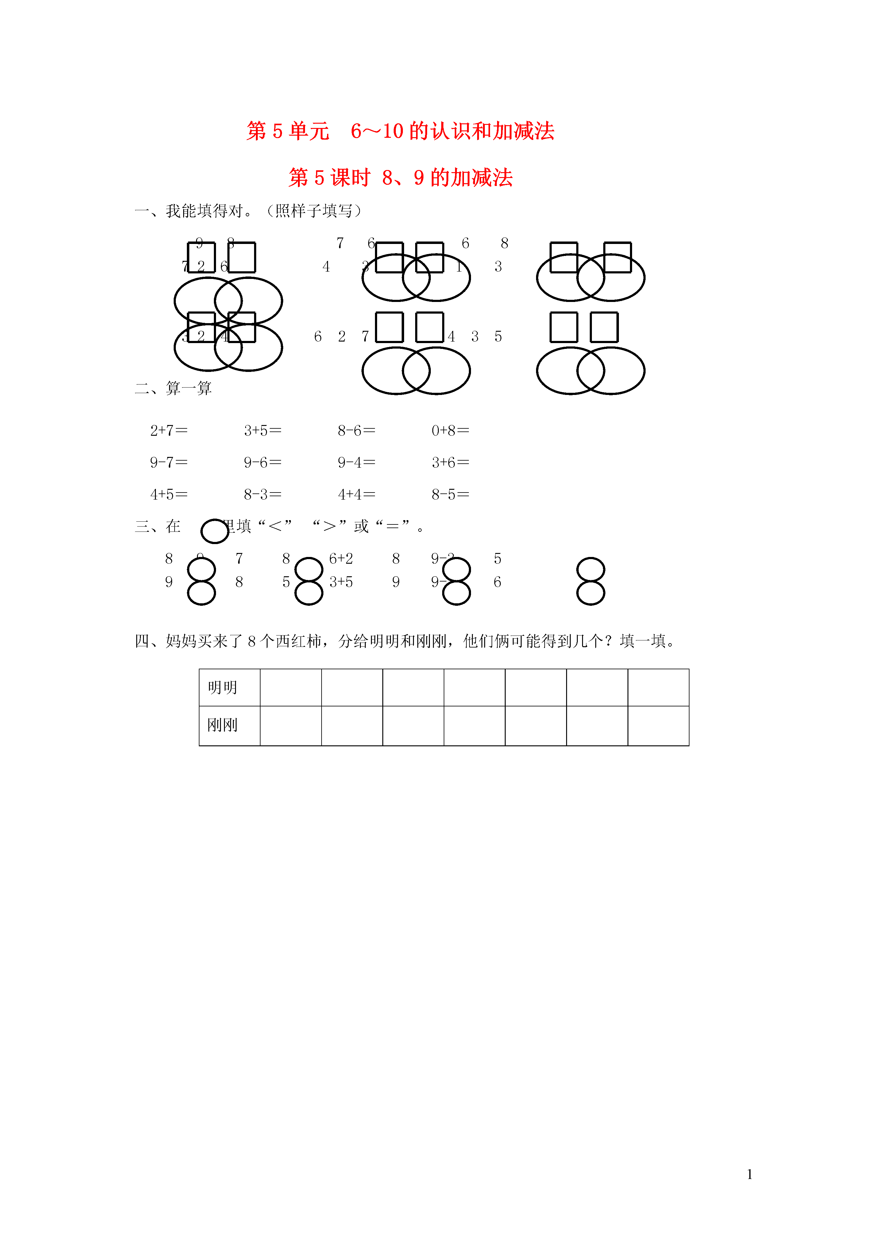 试题-全国-2019_一年级数学上册 第5单元 6-10的认识和加减法 第5课时 8 9的加减法课堂作业设计(无答案) 新人教版.doc
