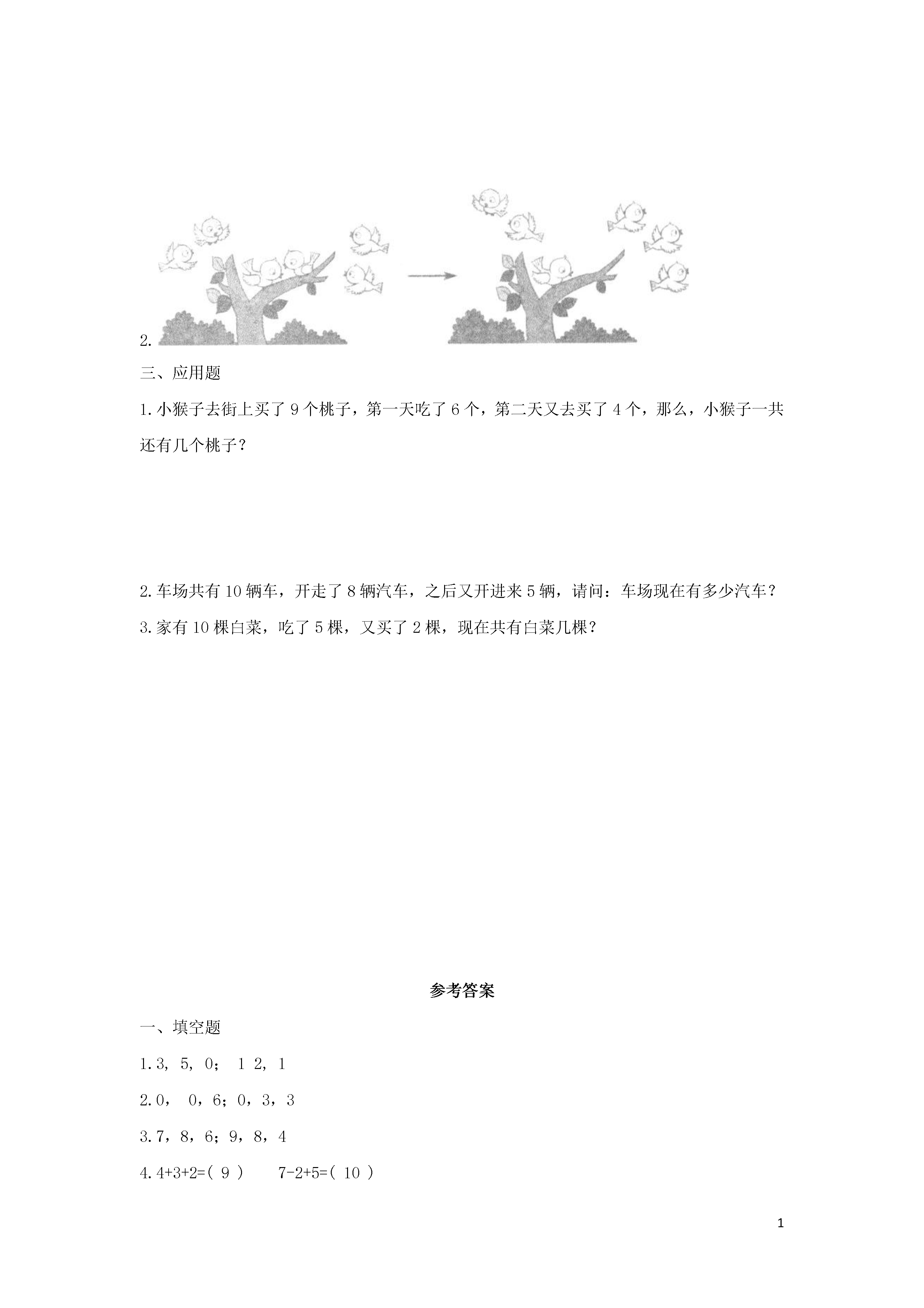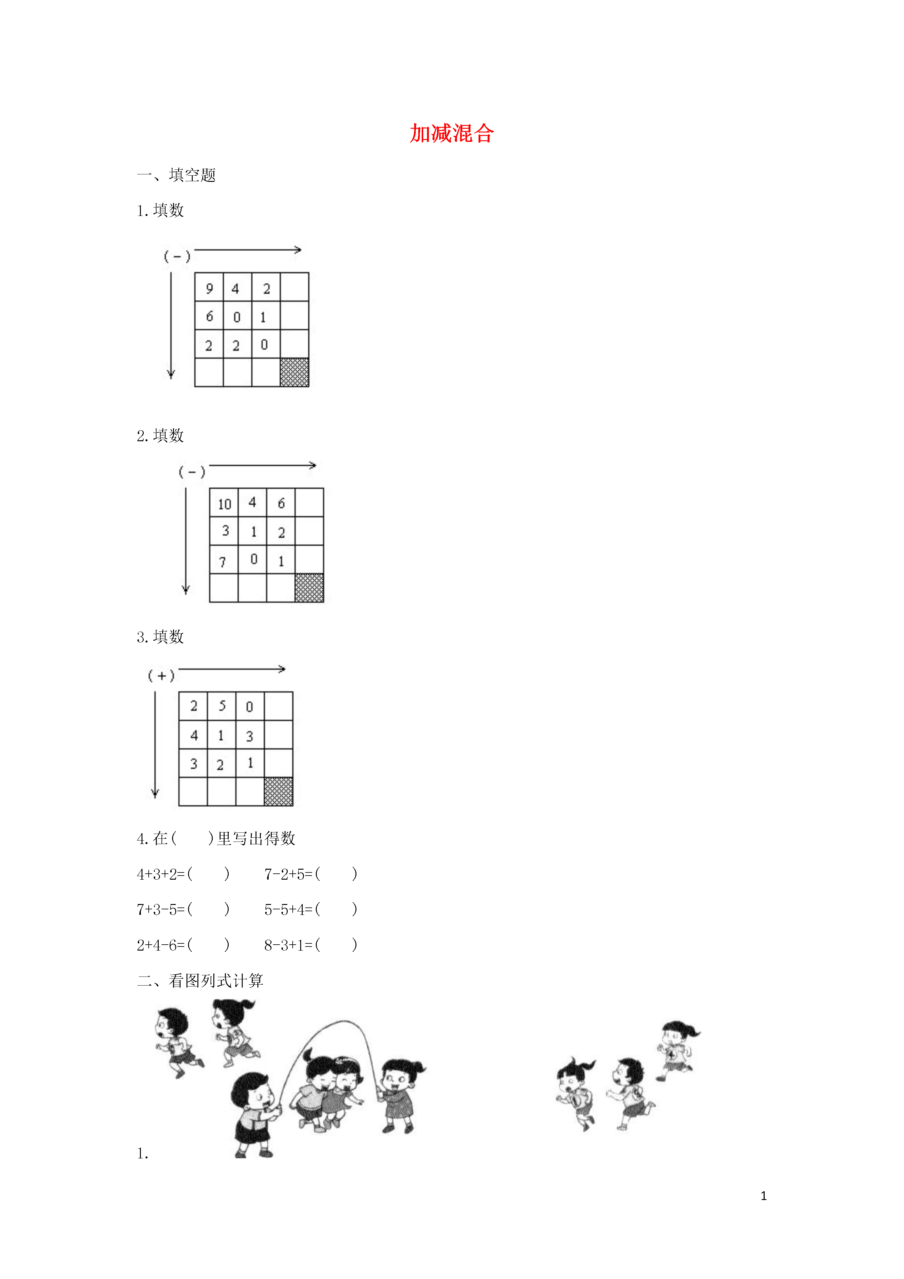 1加减混合一、填空题1.填数2.填数3.填数4.在()里写出得数4+3+2=()7-2+5=()7+3-5=()5-5+4=()2+4-6=()8-3+1=()二、看图列式计算1.2.三、应用题1.小猴子去街上买了9个桃子,第一天吃了6个,第二天又去买了4个,那么,小猴子一共还有几个桃子?2.车场共有10辆车,开走了8辆汽车,之后又开进来5辆,请问:车场现在有多少汽车?3.家有10棵白菜,吃了5棵,又买了2棵,现在共有白菜几棵?参考答案一、填空题1.3,5,0;12,12.0,0,6;0,3,33.7,8,6;9,8,44.4+3+2=(9)7-2+5=(10)7+3-5=(5)5-5+4=(4)2+4-6=(0)8-3+1=(6)二、看图列式1.4-2+3=5(人)2.2+4-5=1(只)三、应用题1.9-6+4=72.10-8+5=73.10-5+2=7