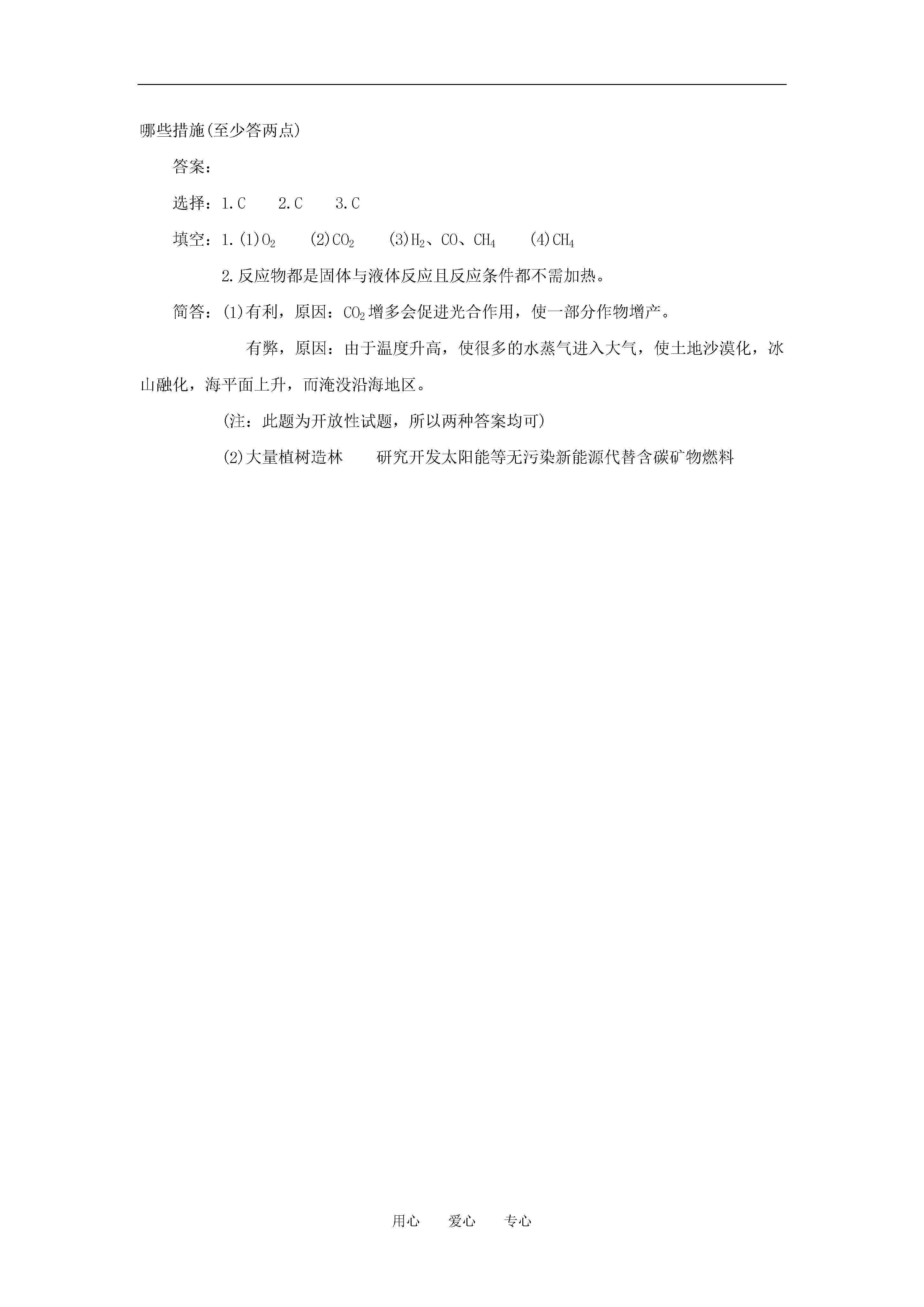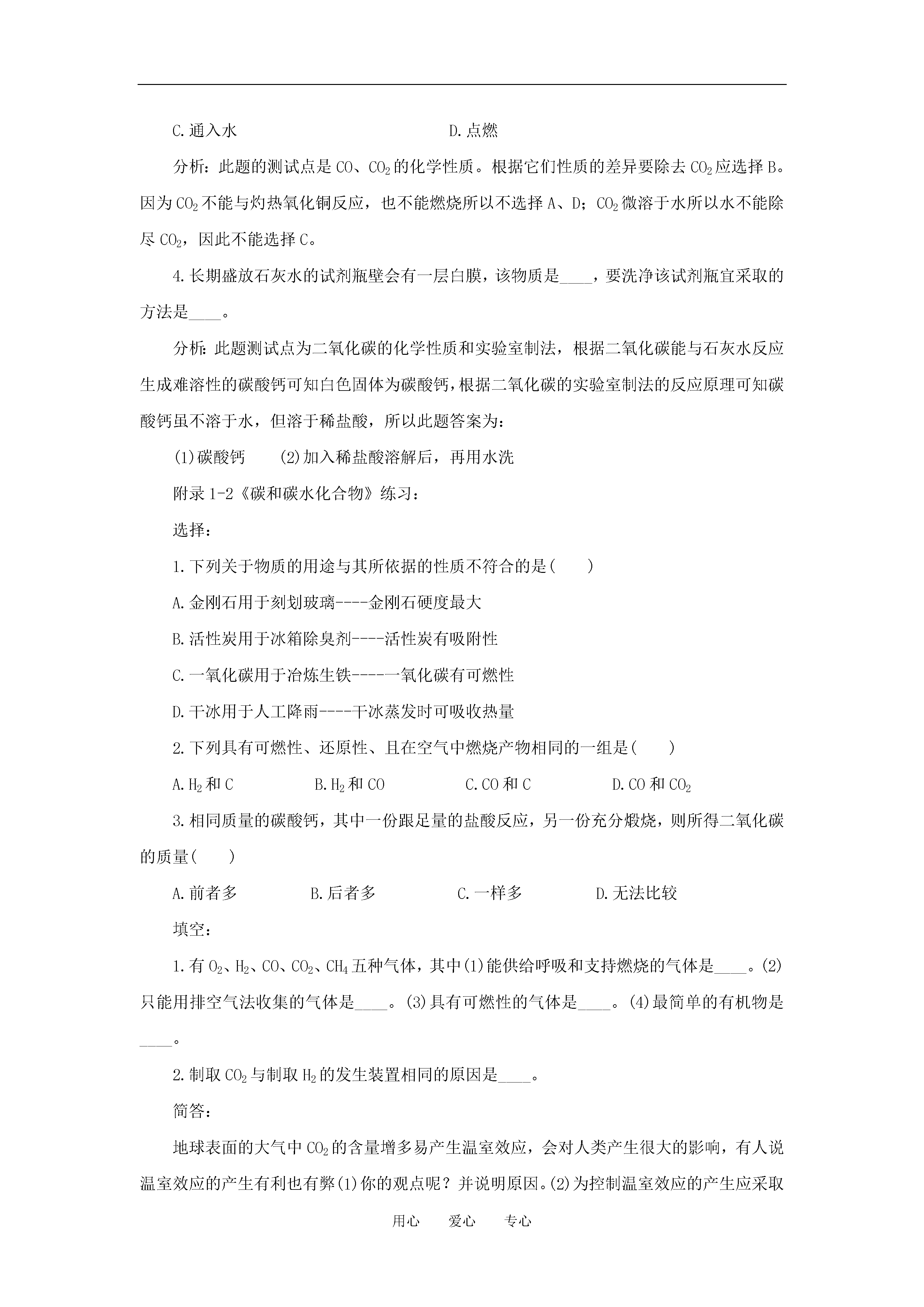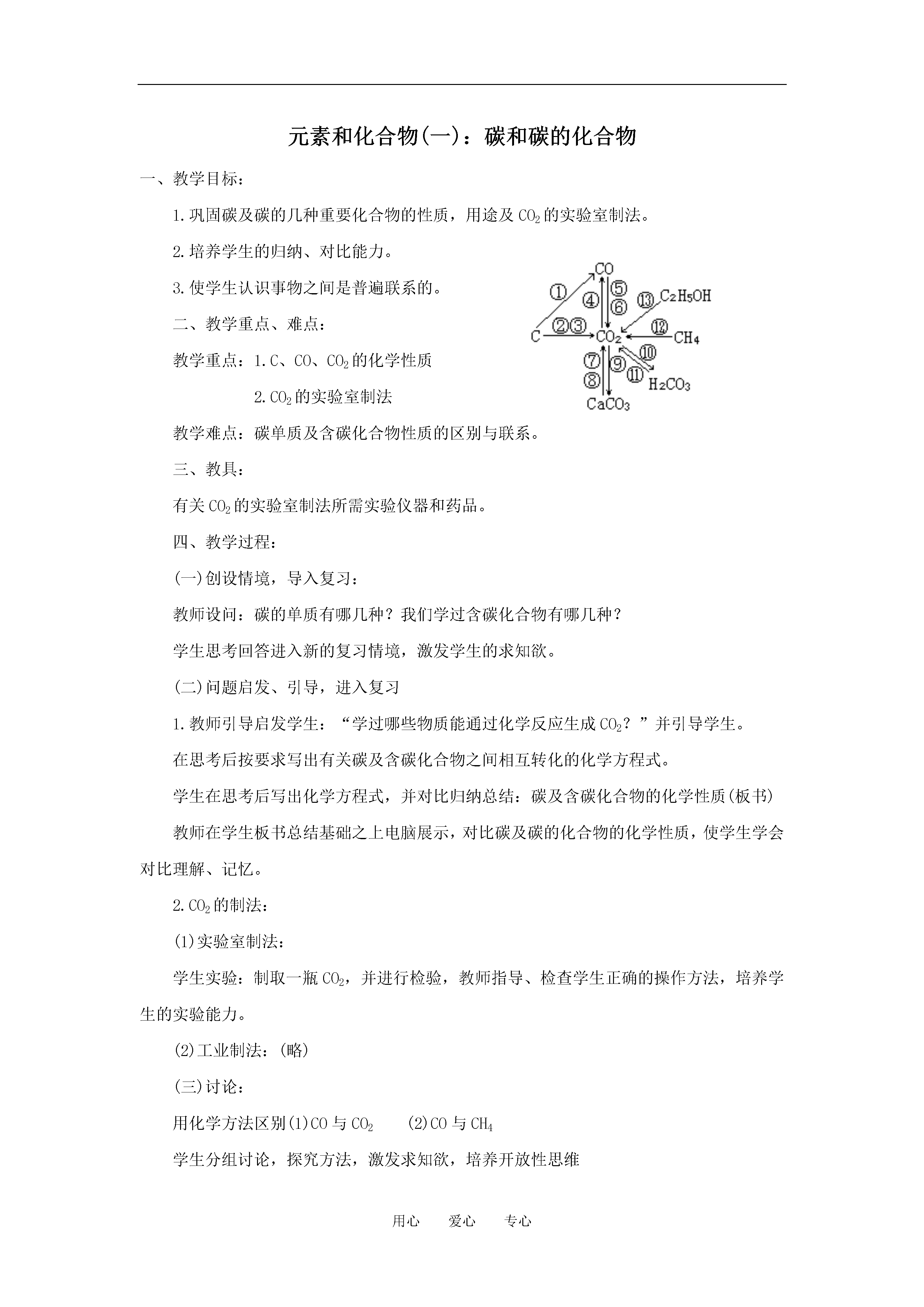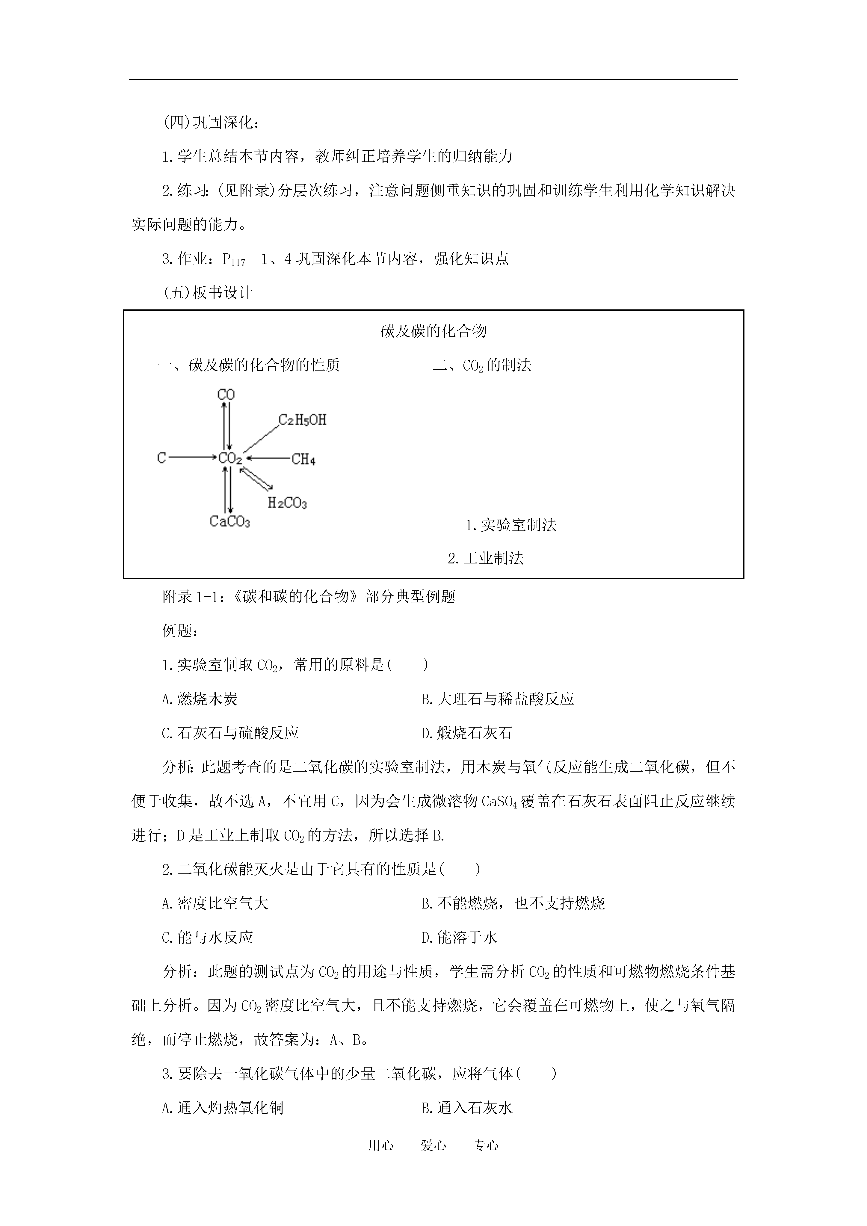 用心爱心专心元素和化合物(一):碳和碳的化合物一、教学目标:1.巩固碳及碳的几种重要化合物的性质,用途及CO2的实验室制法。2.培养学生的归纳、对比能力。3.使学生认识事物之间是普遍联系的。二、教学重点、难点:教学重点:1.C、CO、CO2的化学性质2.CO2的实验室制法教学难点:碳单质及含碳化合物性质的区别与联系。三、教具:有关CO2的实验室制法所需实验仪器和药品。四、教学过程:(一)创设情境,导入复习:教师设问:碳的单质有哪几种?我们学过含碳化合物有哪几种?学生思考回答进入新的复习情境,激发学生的求知欲。(二)问题启发、引导,进入复习1.教师引导启发学生:“学过哪些物质能通过化学反应生成CO2?”并引导学生。在思考后按要求写出有关碳及含碳化合物之间相互转化的化学方程式。学生在思考后写出化学方程式,并对比归纳总结:碳及含碳化合物的化学性质(板书)教师在学生板书总结基础之上电脑展示,对比碳及碳的化合物的化学性质,使学生学会对比理解、记忆。2.CO2的制法:(1)实验室制法:学生实验:制取一瓶CO2,并进行检验,教师指导、检查学生正确的操作方法,培养学生的实验能力。(2)工业制法:(略)(三)讨论:用化学方法区别(1)CO与CO2(2)CO与CH4学生分组讨论,探究方法,激发求知欲,培养开放性思维(四)巩固深化:1.学生总结本节内容,教师纠正培养学生的归纳能力2.练习:(见附录)分层次练习,注意问题侧重知识的巩固和训练学生利用化学知识解决实际问题的能力。3.作业:P1171、4巩固深化本节内容,强化知识点(五)板书设计碳及碳的化合物一、碳及碳的化合物的性质二、CO2的制法1.实验室制法2.工业制法附录1-1:《碳和碳的化合物》部分典型例题例题:1.实验室制取CO2,常用的原料是()A.燃烧木炭B.大理石与稀盐酸反应C.石灰石与硫酸反应D.煅烧石灰石分析:此题考查的是二氧化碳的实验室制法,用木炭与氧气反应能生成二氧化碳,但不便于收集,故不选A,不宜用C,因为会生成微溶物CaSO4覆盖在石灰石表面阻止反应继续进行;D是工业上制取CO2的方法,所以选择B.2.二氧化碳能灭火是由于它具有的性质是()A.密度比空气大B.不能燃烧,也不支持燃烧C.能与水反应D.能溶于水分析:此题的测试点为CO2的用途与性质,学生需分析CO2的性质和可燃物燃烧条件基础上分析。因为CO2密度比空气大,且不能支持燃烧,它会覆盖在可燃物上,使之与氧气隔绝,而停止燃烧,故答案为:A、B。3.要除去一氧化碳气体中的少量二氧化碳,应将气体()A.通入灼热氧化铜B.通入石灰水C.通入水D.点燃分析:此题的测试点是CO、CO2的化学性质。根据它们性质的差异要除去CO2应选择B。因为CO2不能与灼热氧化铜反应,也不能燃烧所以不选择A、D;CO2微溶于水所以水不能除尽CO2,因此不能选择C。4.长期盛放石灰水的试剂瓶壁会有一层白膜,该物质是____,要洗净该试剂瓶宜采取的方法是____。分析:此题测试点为二氧化碳的化学性质和实验室制法,根据二氧化碳能与石灰水反应生成难溶性的碳酸钙可知白色固体为碳酸钙,根据二氧化碳的实验室制法的反应原理可知碳酸钙虽不溶于水,但溶于稀盐酸,所以此题答案为:(1)碳酸钙(2)加入稀盐酸溶解后,再用水洗附录1-2《碳和碳水化合物》练习:选择:1.下列关于物质的用途与其所依据的性质不符合的是()A.金刚石用于刻划玻璃----金刚石硬度最大B.活性炭用于冰箱除臭剂----活性炭有吸附性C.一氧化碳用于冶炼生铁----一氧化碳有可燃性D.干冰用于人工降雨----干冰蒸发时可吸收热量2.下列具有可燃性、还原性、且在空气中燃烧产物相同的一组是()A.H2和CB.H2和COC.CO和CD.CO和CO23.相同质量的碳酸钙,其中一份跟足量的盐酸反应,另一份充分煅烧,则所得二氧化碳的质量()A.前者多B.后者多C.一样多D.无法比较填空:1.有O2、H2、CO、CO2、CH4五种气体,其中(1)能供给呼吸和支持燃烧的气体是____。(2)只能用排空气法收集的气体是____。(3)具有可燃性的气体是____。(4)最简单的有机物是____。2.制取CO2与制取H2的发生装置相同的原因是____。简答:地球表面的大气中CO2的含量增多易产生温室效应,会对人类产生很大的影响,有人说温室效应的产生有利也有弊(1)你的观点呢?并说明原因。(2)为控制温室效应的产生应采取哪些措施(至少答两点)答案:选择:1.C2.C3.C填空:1.(1)O2(2)CO2(3)H2、CO、CH4(4)CH42.反应物都是固体与液体反应且反应条件