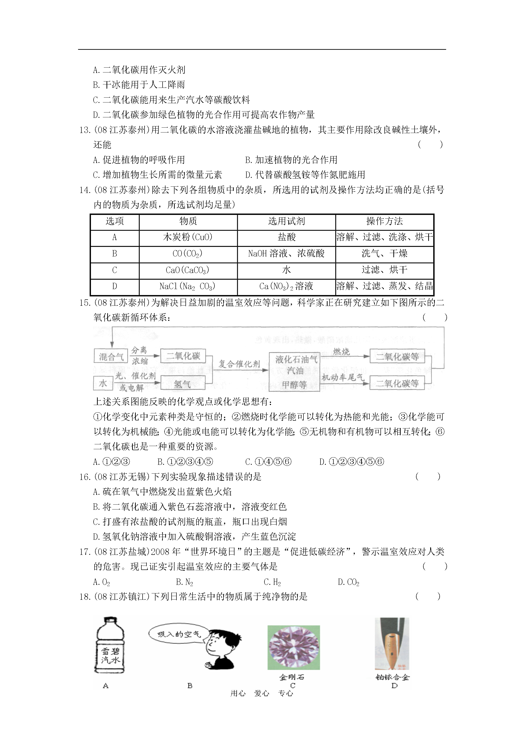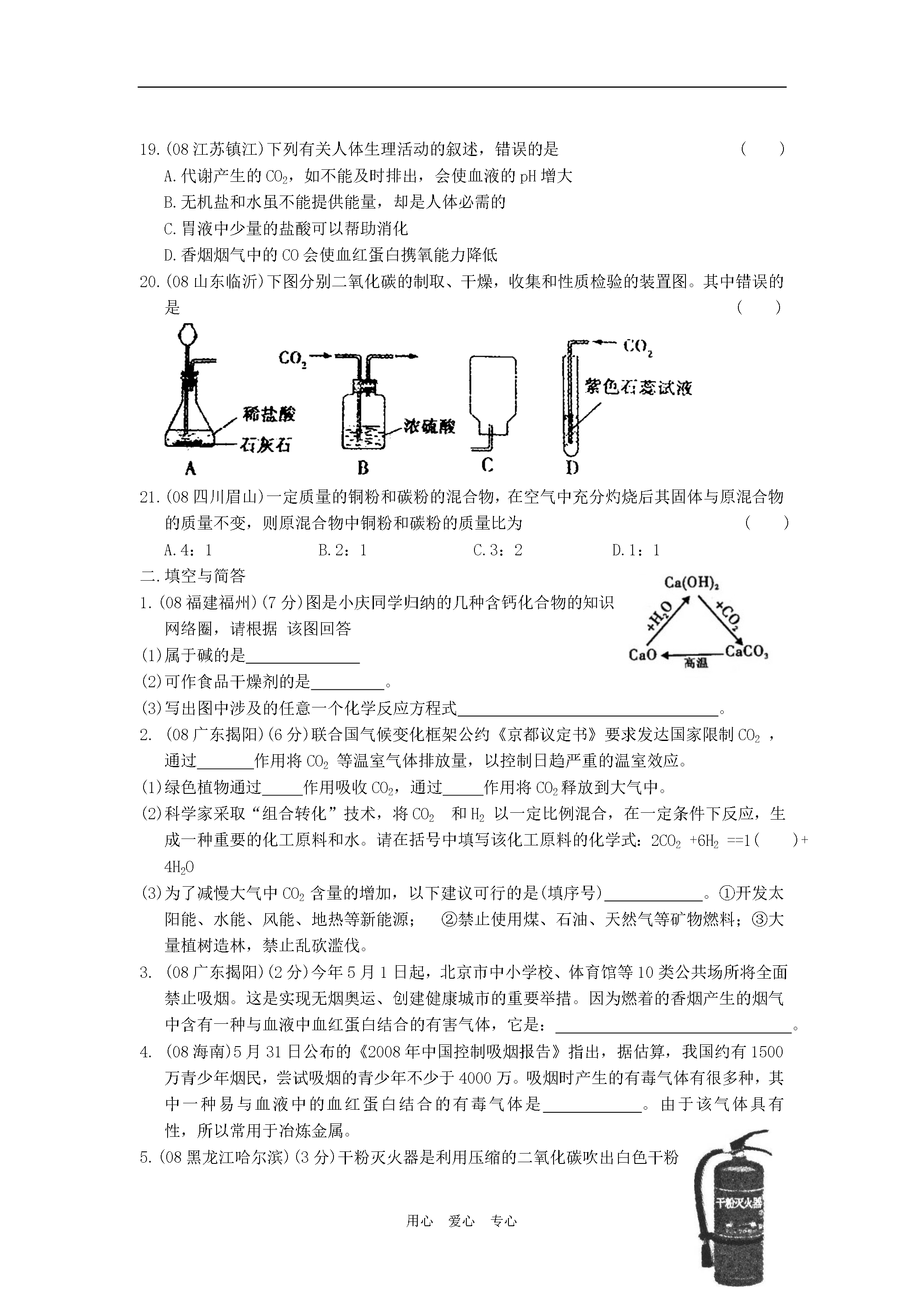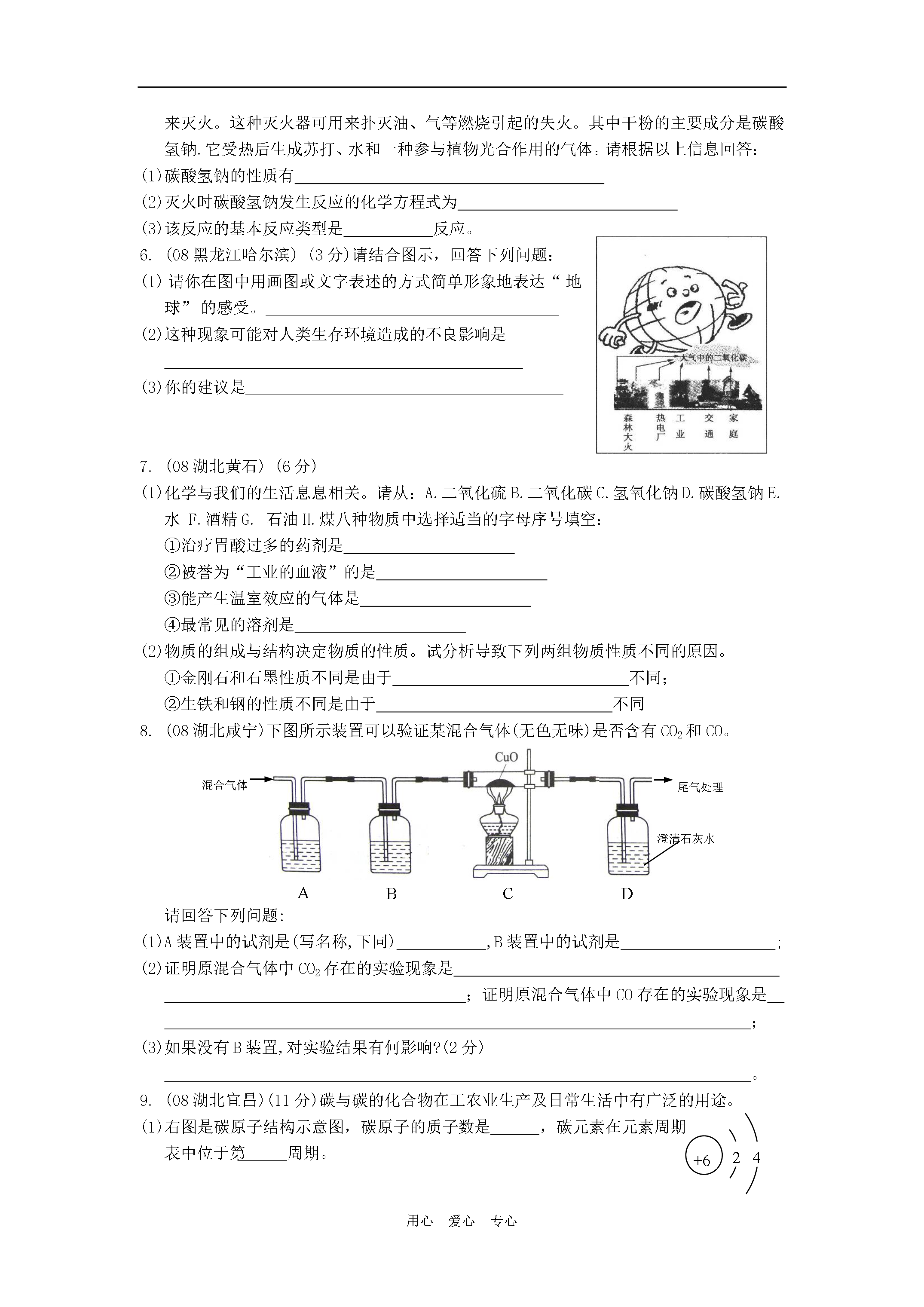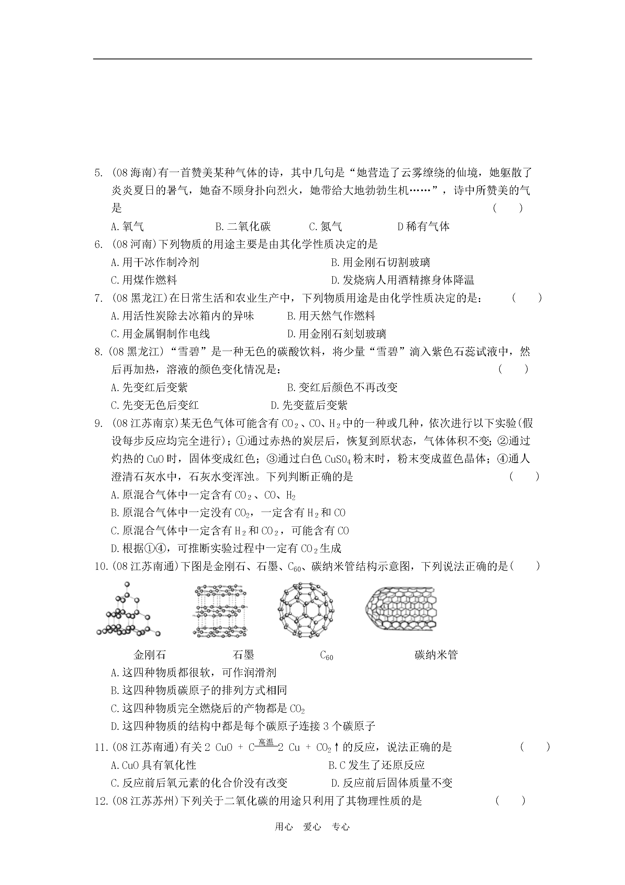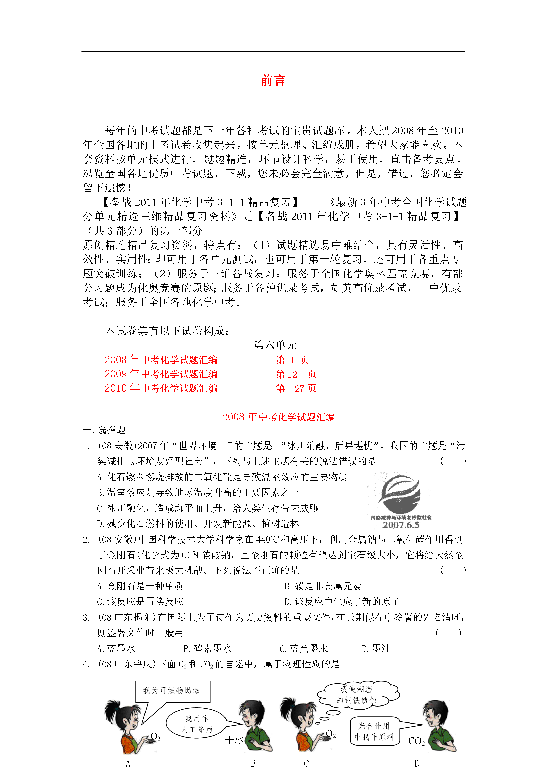 用心爱心专心前言每年的中考试题都是下一年各种考试的宝贵试题库。本人把2008年至2010年全国各地的中考试卷收集起来,按单元整理、汇编成册,希望大家能喜欢。本套资料按单元模式进行,题题精选,环节设计科学,易于使用,直击备考要点,纵览全国各地优质中考试题。下载,您未必会完全满意,但是,错过,您必定会留下遗憾!【备战2011年化学中考3-1-1精品复习】——《最新3年中考全国化学试题分单元精选三维精品复习资料》是【备战2011年化学中考3-1-1精品复习】(共3部分)的第一部分原创精选精品复习资料,特点有:(1)试题精选易中难结合,具有灵活性、高效性、实用性;即可用于各单元测试,也可用于第一轮复习,还可用于各重点专题突破训练;(2)服务于三维备战复习:服务于全国化学奥林匹克竞赛,有部分习题成为化奥竞赛的原题;服务于各种优录考试,如黄高优录考试,一中优录考试;服务于全国各地化学中考。本试卷集有以下试卷构成:第六单元2008年中考化学试题汇编2009年中考化学试题汇编2010年中考化学试题汇编2008年中考化学试题汇编一.选择题1.(08安徽)2007年“世界环境日”的主题是:“冰川消融,后果堪忧”,我国的主题是“污染减排与环境友好型社会”,下列与上述主题有关的说法错误的是()A.化石燃料燃烧排放的二氧化硫是导致温室效应的主要物质B.温室效应是导致地球温度升高的主要因素之一C.冰川融化,造成海平面上升,给人类生存带来威胁D.减少化石燃料的使用、开发新能源、植树造林2.(08安徽)中国科学技术大学科学家在440℃和高压下,利用金属钠与二氧化碳作用得到了金刚石(化学式为C)和碳酸钠,且金刚石的颗粒有望达到宝石级大小,它将给天然金刚石开采业带来极大挑战。下列说法不正确的是()A.金刚石是一种单质B.碳是非金属元素C.该反应是置换反应D.该反应中生成了新的原子3.(08广东揭阳)在国际上为了使作为历史资料的重要文件,在长期保存中签署的姓名清晰,则签署文件时一般用()A.蓝墨水B.碳素墨水C.蓝黑墨水D.墨汁4.(08广东肇庆)下面O2和CO2的自述中,属于物理性质的是A.B.C.D.CO2光合作用中我作原料O2我使潮湿的钢铁锈蚀干冰我用作人工降雨O2我为可燃物助燃5.(08海南)有一首赞美某种气体的诗,其中几句是“她营造了云雾缭绕的仙境,她躯散了炎炎夏日的暑气,她奋不顾身扑向烈火,她带给大地勃勃生机……”,诗中所赞美的气是()A.氧气B.二氧化碳C.氮气D稀有气体6.(08河南)下列物质的用途主要是由其化学性质决定的是A.用干冰作制冷剂B.用金刚石切割玻璃C.用煤作燃料D.发烧病人用酒精擦身体降温7.(08黑龙江)在日常生活和农业生产中,下列物质用途是由化学性质决定的是:()A.用活性炭除去冰箱内的异味B.用天然气作燃料C.用金属铜制作电线D.用金刚石刻划玻璃8.(08黑龙江)“雪碧”是一种无色的碳酸饮料,将少量“雪碧”滴入紫色石蕊试液中,然后再加热,溶液的颜色变化情况是:()A.先变红后变紫B.变红后颜色不再改变C.先变无色后变红D.先变蓝后变紫9.(08江苏南京)某无色气体可能含有CO2、CO、H2中的一种或几种,依次进行以下实验(假设每步反应均完全进行);①通过赤热的炭层后,恢复到原状态,气体体积不变;②通过灼热的CuO时,固体变成红色;③通过白色CuS04粉末时,粉末变成蓝色晶体;④通人澄清石灰水中,石灰水变浑浊。下列判断正确的是()A.原混合气体中一定含有CO2、CO、H2B.原混合气体中一定没有CO2,一定含有H2和COC.原混合气体中一定含有H2和CO2,可能含有COD.根据①④,可推断实验过程中一定有CO2生成10.(08江苏南通)下图是金刚石、石墨、C60、碳纳米管结构示意图,下列说法正确的是()金刚石石墨C60碳纳米管A.这四种物质都很软,可作润滑剂B.这四种物质碳原子的排列方式相同C.这四种物质完全燃烧后的产物都是CO2D.这四种物质的结构中都是每个碳原子连接3个碳原子11.(08江苏南通)有关2CuO+C高温2Cu+CO2↑的反应,说法正确的是()A.CuO具有氧化性B.C发生了还原反应C.反应前后氧元素的化合价没有改变D.反应前后固体质量不变12.(08江苏苏州)下列关于二氧化碳的用途只利用了其物理性质的是()A.二氧化碳用作灭火剂B.干冰能用于人工降雨C.二氧化碳能用来生产汽水等碳酸饮料D.二氧化碳参加绿色植物的光合作用可提高农作物产量13.(08江苏泰州)用二氧化碳的水溶液浇灌盐碱地的植物,其主要作用除改良碱性土壤外,还能()A.促进植物的呼吸作用B.加速植物的光合作用C.增加植物生长所需的微量元素D.代替碳酸氢铵等作氮肥施用14.(08江苏泰州)除去下列各组物质中的杂质,所选用的试剂及操作