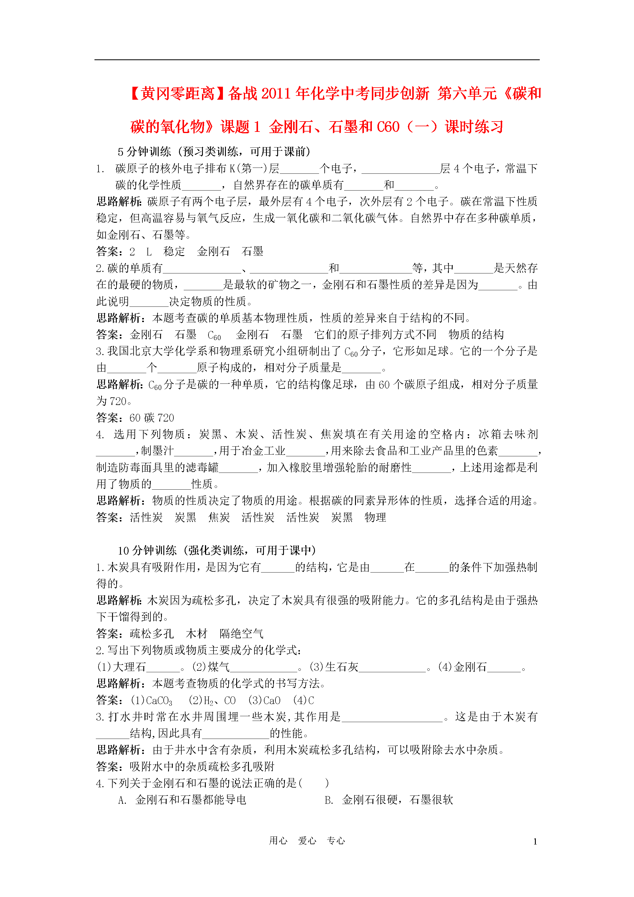 试题-全国-2010_黄冈零距离备战2011年化学中考同步创新 第六单元《碳和碳的氧化物》课题1 金刚石、石墨和C60(一)课时练习.rar