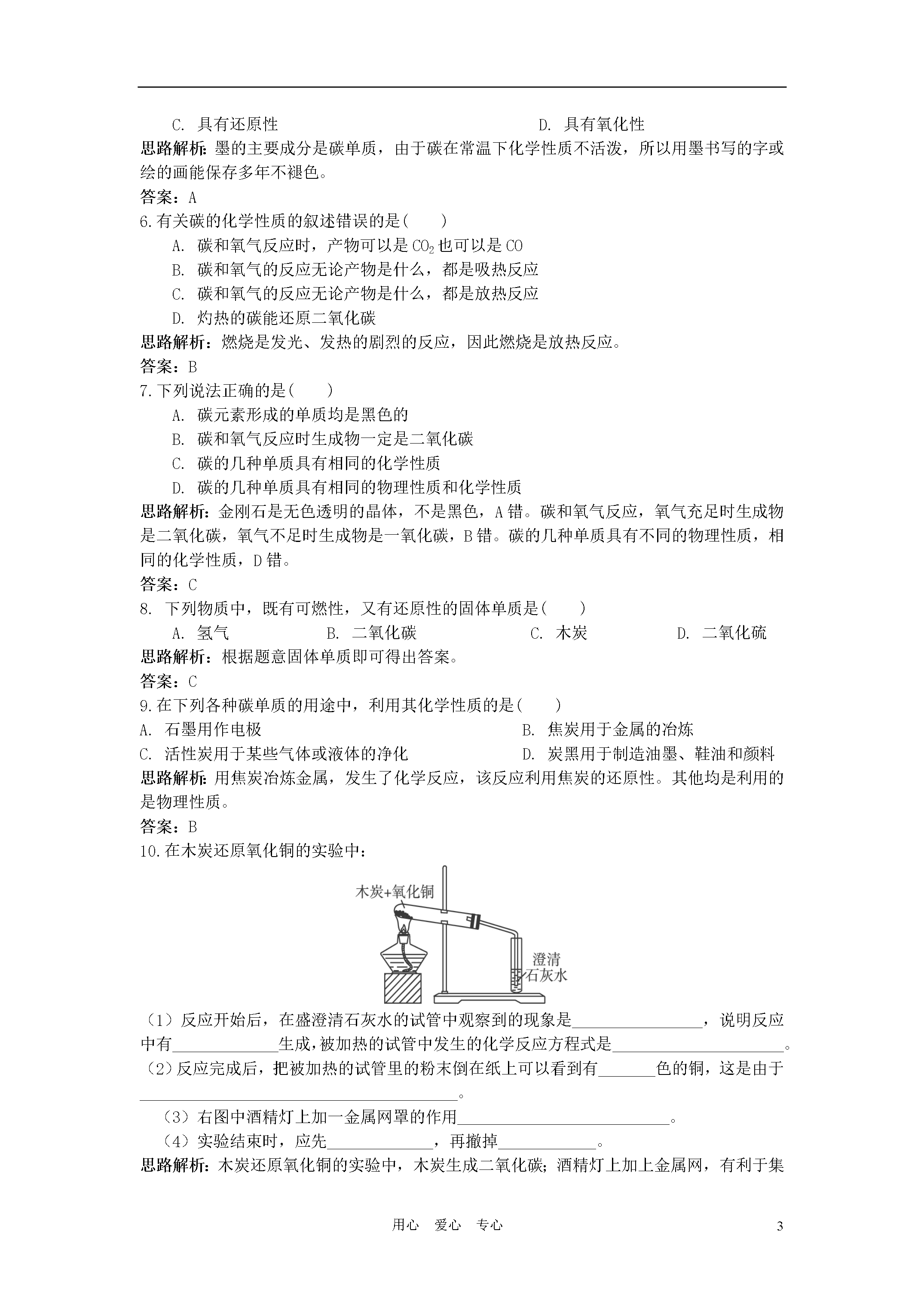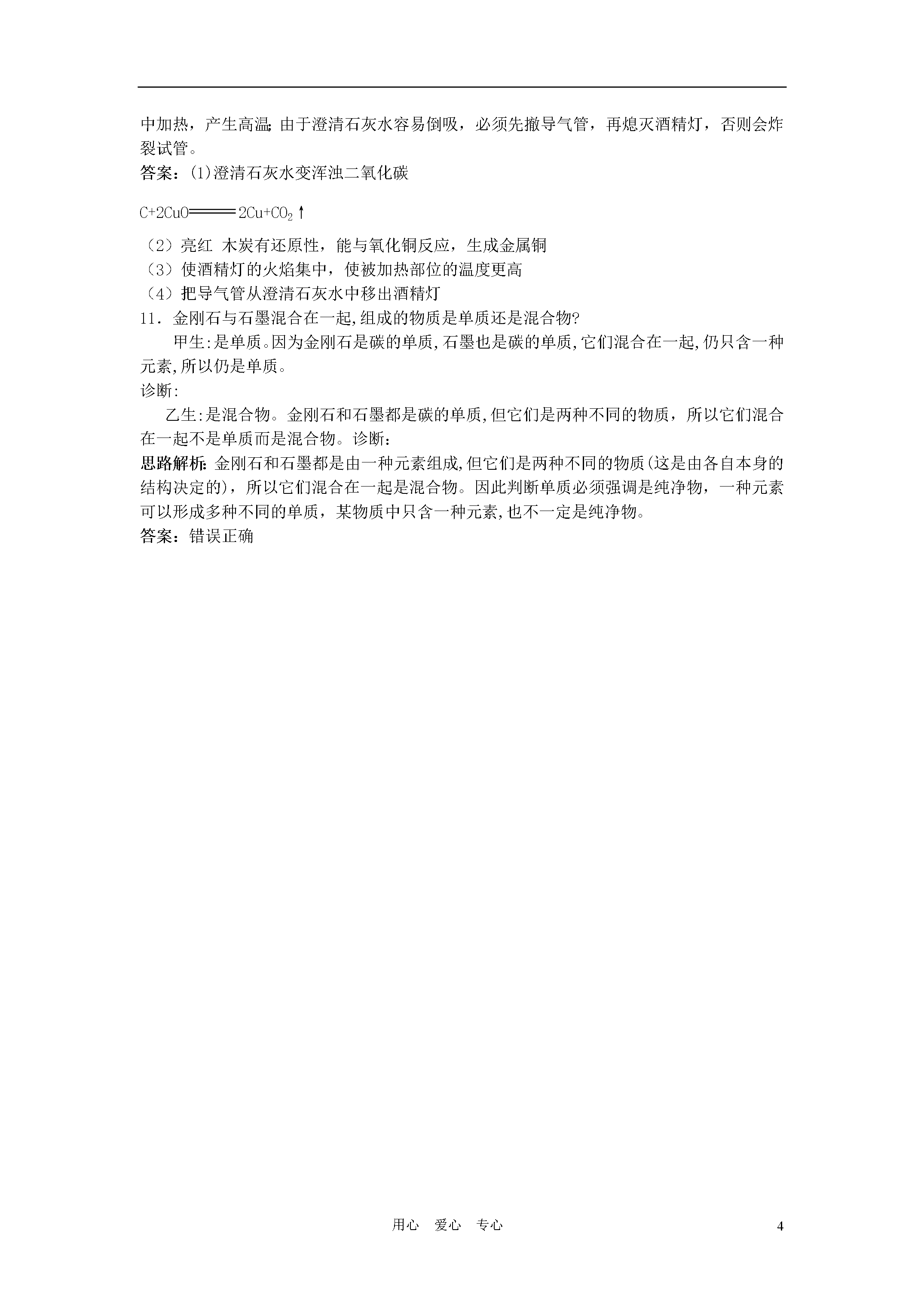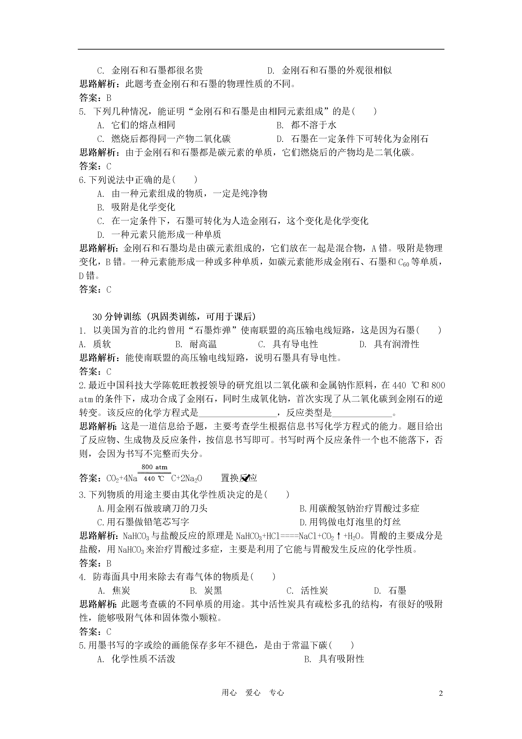 4用心爱心专心【黄冈零距离】备战2011年化学中考同步创新第六单元《碳和碳的氧化物》课题1金刚石、石墨和C60(一)课时练习5分钟训练(预习类训练,可用于课前)碳原子的核外电子排布K(第一)层_______个电子,______________层4个电子,常温下碳的化学性质_______,自然界存在的碳单质有_______和_______。思路解析:碳原子有两个电子层,最外层有4个电子,次外层有2个电子。碳在常温下性质稳定,但高温容易与氧气反应,生成一氧化碳和二氧化碳气体。自然界中存在多种碳单质,如金刚石、石墨等。答案:2L稳定金刚石石墨2.碳的单质有______________、______________和_____________等,其中_______是天然存在的最硬的物质,_______是最软的矿物之一,金刚石和石墨性质的差异是因为_______。由此说明_______决定物质的性质。思路解析:本题考查碳的单质基本物理性质,性质的差异来自于结构的不同。答案:金刚石石墨C60金刚石石墨它们的原子排列方式不同物质的结构3.我国北京大学化学系和物理系研究小组研制出了C60分子,它形如足球。它的一个分子是由_______个_______原子构成的,相对分子质量是_______。思路解析:C60分子是碳的一种单质,它的结构像足球,由60个碳原子组成,相对分子质量为720。答案:60碳7204.选用下列物质:炭黑、木炭、活性炭、焦炭填在有关用途的空格内:冰箱去味剂_______,制墨汁_______,用于冶金工业_______,用来除去食品和工业产品里的色素_______,制造防毒面具里的滤毒罐_______,加入橡胶里增强轮胎的耐磨性_______,上述用途都是利用了物质的_______性质。思路解析:物质的性质决定了物质的用途。根据碳的同素异形体的性质,选择合适的用途。答案:活性炭炭黑焦炭活性炭活性炭炭黑物理10分钟训练(强化类训练,可用于课中)1.木炭具有吸附作用,是因为它有______的结构,它是由______在______的条件下加强热制得的。思路解析:木炭因为疏松多孔,决定了木炭具有很强的吸附能力。它的多孔结构是由于强热下干馏得到的。答案:疏松多孔木材隔绝空气2.写出下列物质或物质主要成分的化学式:(1)大理石______。(2)煤气____________。(3)生石灰____________。(4)金刚石______。思路解析:本题考查物质的化学式的书写方法。答案:(1)CaCO3(2)H2、CO(3)CaO(4)C3.打水井时常在水井周围埋一些木炭,其作用是__________________。这是由于木炭有______结构,因此具有____________的性能。思路解析:由于井水中含有杂质,利用木炭疏松多孔结构,可以吸附除去水中杂质。答案:吸附水中的杂质疏松多孔吸附4.下列关于金刚石和石墨的说法正确的是()A.金刚石和石墨都能导电B.金刚石很硬,石墨很软C.金刚石和石墨都很名贵D.金刚石和石墨的外观很相似思路解析:此题考查金刚石和石墨的物理性质的不同。答案:B5.下列几种情况,能证明“金刚石和石墨是由相同元素组成”的是()A.它们的熔点相同B.都不溶于水C.燃烧后都得同一产物二氧化碳D.石墨在一定条件下可转化为金刚石思路解析:由于金刚石和石墨都是碳元素的单质,它们燃烧后的产物均是二氧化碳。答案:C6.下列说法中正确的是()A.由一种元素组成的物质,一定是纯净物B.吸附是化学变化C.在一定条件下,石墨可转化为人造金刚石,这个变化是化学变化D.一种元素只能形成一种单质思路解析:金刚石和石墨均是由碳元素组成的,它们放在一起是混合物,A错。吸附是物理变化,B错。一种元素能形成一种或多种单质,如碳元素能形成金刚石、石墨和C60等单质,D错。答案:C30分钟训练(巩固类训练,可用于课后)1.以美国为首的北约曾用“石墨炸弹”使南联盟的高压输电线短路,这是因为石墨()A.质软B.耐高温C.具有导电性D.具有润滑性思路解析:能使南联盟的高压输电线短路,说明石墨具有导电性。答案:C2.最近中国科技大学陈乾旺教授领导的研究组以二氧化碳和金属钠作原料,在440℃和800atm的条件下,成功合成了金刚石,同时生成氧化钠,首次实现了从二氧化碳到金刚石的逆转变。该反应的化学方程式是_________________,反应类型是_____________。思路解析:这是一道信息给予题,主要考查学生根据信息书写化学方程式的能力。题目给出了反应物、生成物及反应条件,按信息书写即可。书写时两个反应条件一个也不能落下,否则,会因为书写不完整而失分。答案:CO2+4NaC+2Na2O置换反应3.下列物质的用途主要由其化学性质决定的是()A.用金刚石做
