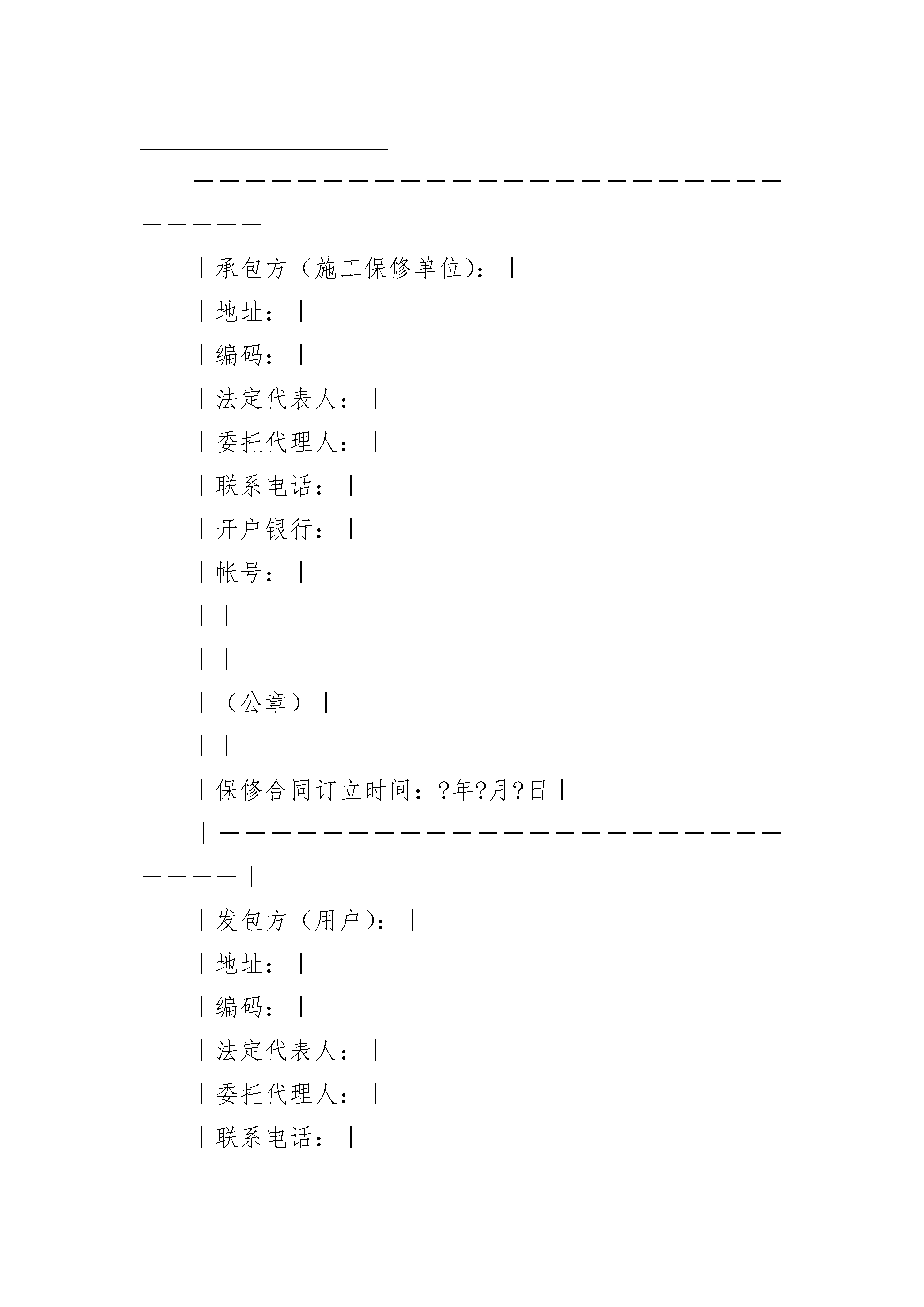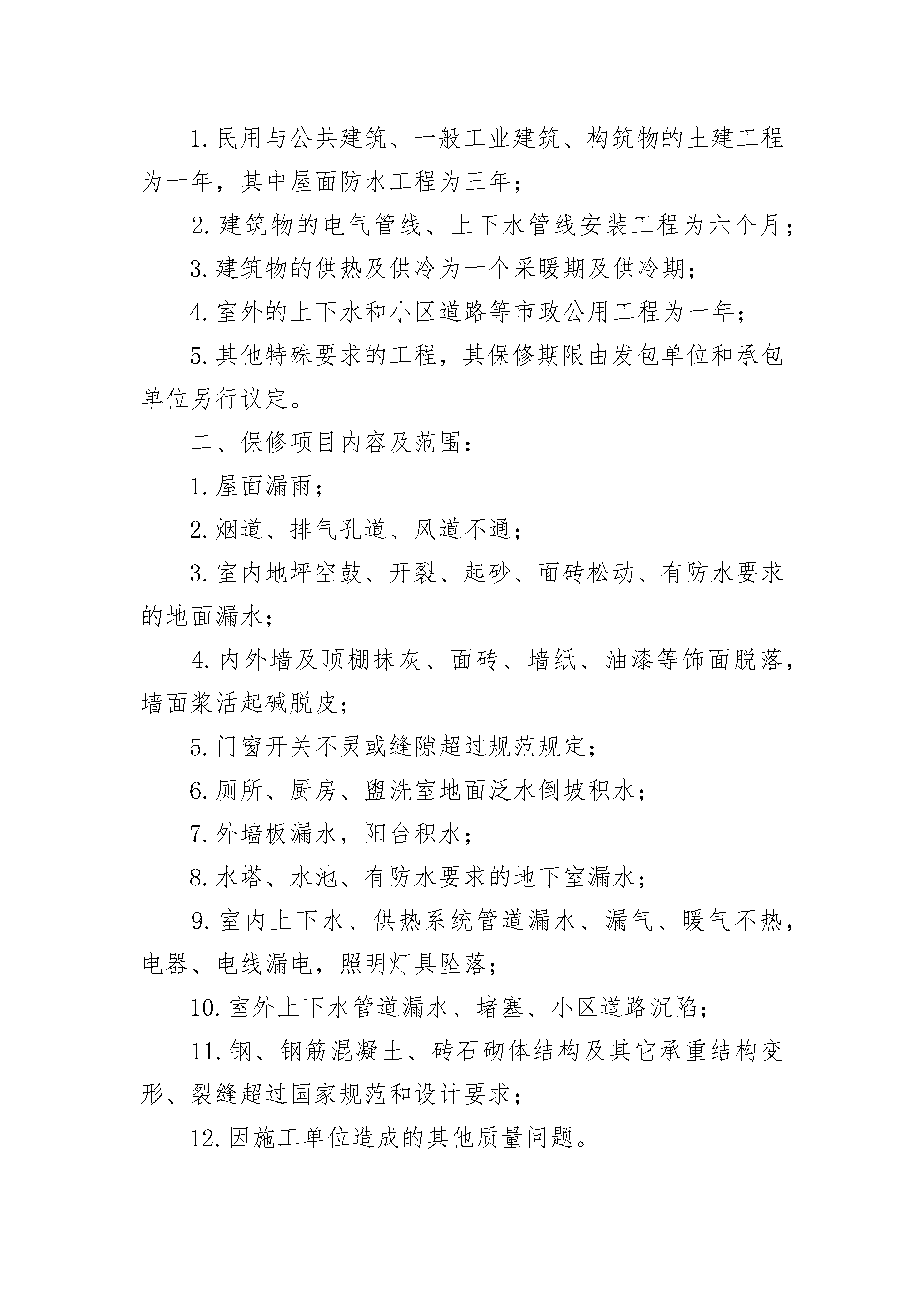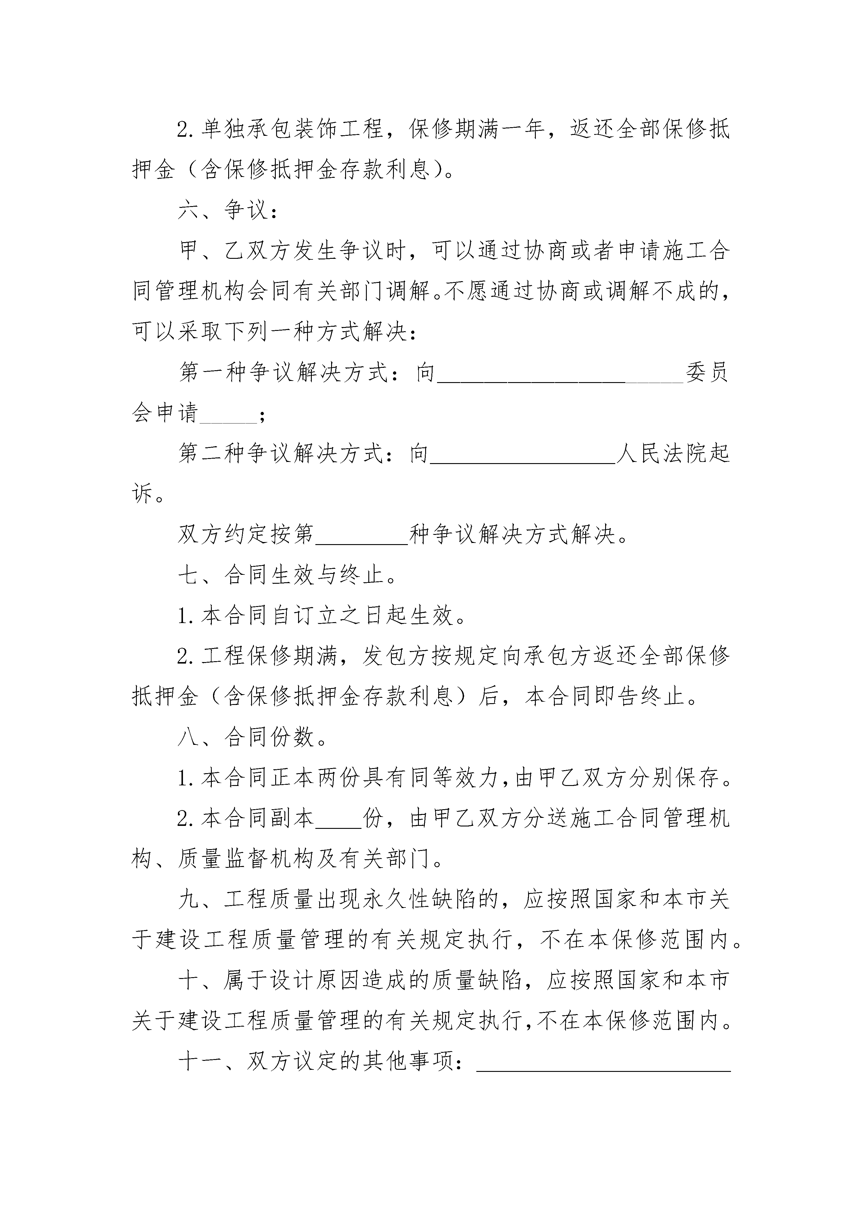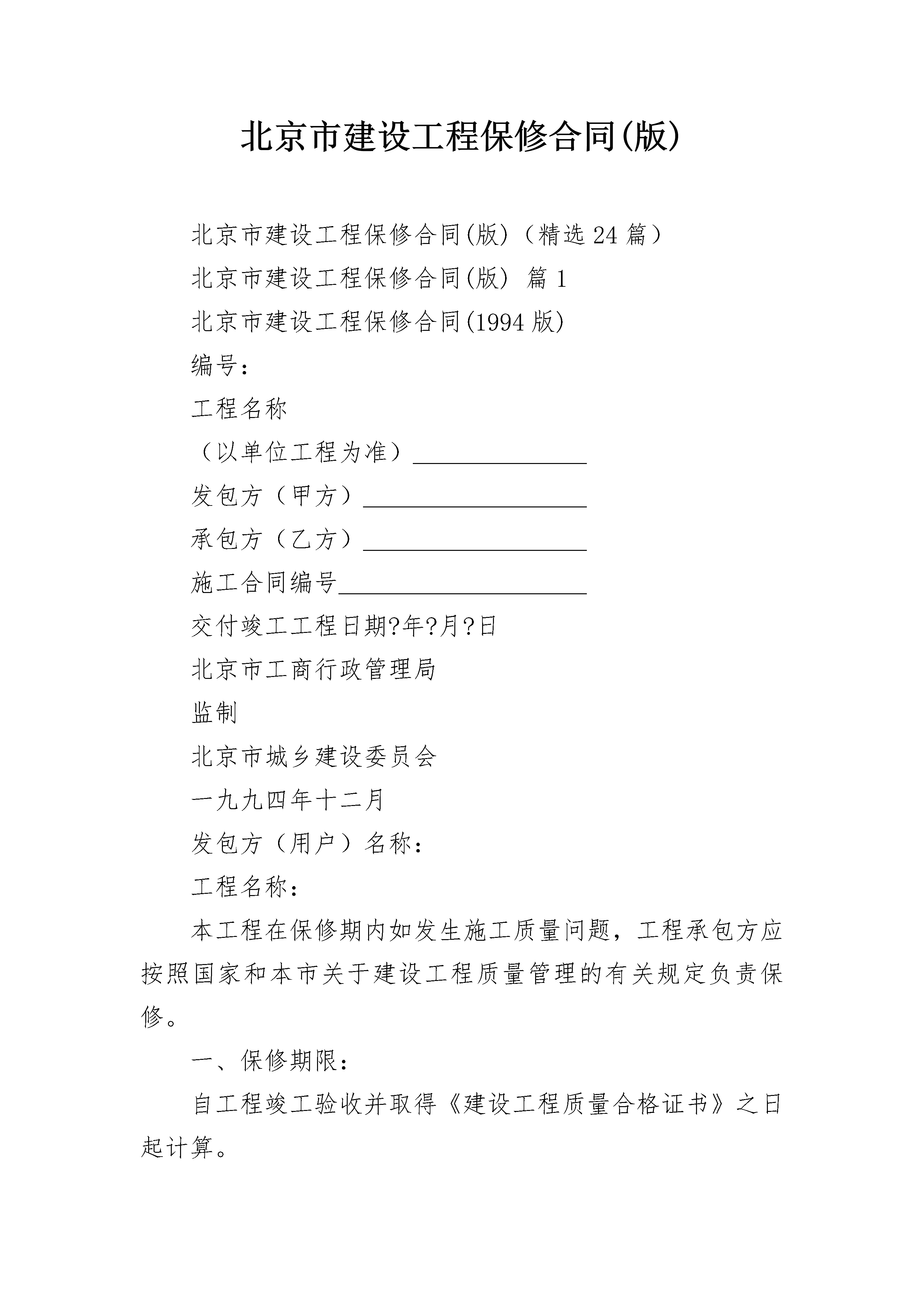 北京市建设工程保修合同(版)北京市建设工程保修合同(版)(精选24篇)北京市建设工程保修合同(版)篇1北京市建设工程保修合同(1994版)编号:工程名称(以单位工程为准)_______发包方(甲方)_________承包方(乙方)_________施工合同编号__________交付竣工工程日期?年?月?日北京市工商行政管理局监制北京市城乡建设委员会一九九四年十二月发包方(用户)名称:工程名称:本工程在保修期内如发生施工质量问题,工程承包方应按照国家和本市关于建设工程质量管理的有关规定负责保修。一、保修期限:自工程竣工验收并取得《建设工程质量合格证书》之日起计算。1.民用与公共建筑、一般工业建筑、构筑物的土建工程为一年,其中屋面防水工程为三年;2.建筑物的电气管线、上下水管线安装工程为六个月;3.建筑物的供热及供冷为一个采暖期及供冷期;4.室外的上下水和小区道路等市政公用工程为一年;5.其他特殊要求的工程,其保修期限由发包单位和承包单位另行议定。二、保修项目内容及范围:1.屋面漏雨;2.烟道、排气孔道、风道不通;3.室内地坪空鼓、开裂、起砂、面砖松动、有防水要求的地面漏水;4.内外墙及顶棚抹灰、面砖、墙纸、油漆等饰面脱落,墙面浆活起碱脱皮;5.门窗开关不灵或缝隙超过规范规定;6.厕所、厨房、盥洗室地面泛水倒坡积水;7.外墙板漏水,阳台积水;8.水塔、水池、有防水要求的地下室漏水;9.室内上下水、供热系统管道漏水、漏气、暖气不热,电器、电线漏电,照明灯具坠落;10.室外上下水管道漏水、堵塞、小区道路沉陷;11.钢、钢筋混凝土、砖石砌体结构及其它承重结构变形、裂缝超过国家规范和设计要求;12.因施工单位造成的其他质量问题。三、保修责任:施工单位自接到建设工程质量修理通知书(式样附后)之日起,必须在两周内到达现场与建设单位共同明确责任方,商议返修内容。属施工单位责任的,如施工单位未能按期到达现场,建设单位应再次通知施工单位;施工单位自接到再次通知书起一周内仍不能到达时,建设单位有权按原设计标准自行返修,所发生的费用由原施工单位承担。四、保修抵押金:1.保修抵押金计算方法。按工程结算造价扣除甲方供应的设备、成品价后的金额计算,由承包方向发包方支付保修抵押金。其中:(1)承包一般建安工程200万元以内的,按2.0%计算;200万元(不含200万元)至500万元的,按1.5%计算;500万元以上(不含500万元)的,按1.0%计算。(2)单独承包装饰工程,按1.0%计算。2.本工程保修抵押金为_________元。金额大写:______________。五、保修抵押金返还:工程保修期满,发包方按以下规定向承包方返还保修抵押金。1.承包一般建安工程,保修期满一年,返还保修抵押金(含保修抵押金存款利息)的80%为_______元。保修期满三年,返还保修抵押金(含保修抵押金存款利息)全部尾款。2.单独承包装饰工程,保修期满一年,返还全部保修抵押金(含保修抵押金存款利息)。六、争议:甲、乙双方发生争议时,可以通过协商或者申请施工合同管理机构会同有关部门调解。不愿通过协商或调解不成的,可以采取下列一种方式解决:第一种争议解决方式:向_____________委员会申请_____;第二种争议解决方式:向________人民法院起诉。双方约定按第____种争议解决方式解决。七、合同生效与终止。1.本合同自订立之日起生效。2.工程保修期满,发包方按规定向承包方返还全部保修抵押金(含保修抵押金存款利息)后,本合同即告终止。八、合同份数。1.本合同正本两份具有同等效力,由甲乙双方分别保存。2.本合同副本__份,由甲乙双方分送施工合同管理机构、质量监督机构及有关部门。九、工程质量出现永久性缺陷的,应按照国家和本市关于建设工程质量管理的有关规定执行,不在本保修范围内。十、属于设计原因造成的质量缺陷,应按照国家和本市关于建设工程质量管理的有关规定执行,不在本保修范围内。十一、双方议定的其他事项:_____________________----------------------------|承包方(施工保修单位):||地址:||编码:||法定代表人:||委托代理人:||联系电话:||开户银行:||帐号:||||||(公章)||||保修合同订立时间:?年?月?日||--------------------------||发包方(用户):||地址:||编码:||法定代表人:||委托代理人:||联系电话:||开户银行:||帐号:||||||(公章)?||年?月?日?|||----------------------------附件:?建设工程质量修理通知书?工程名称(以单位工程为准):保修合同编号:使用单位(用户)名称:?施工单位名称:本工程于年?月?日发生质量问