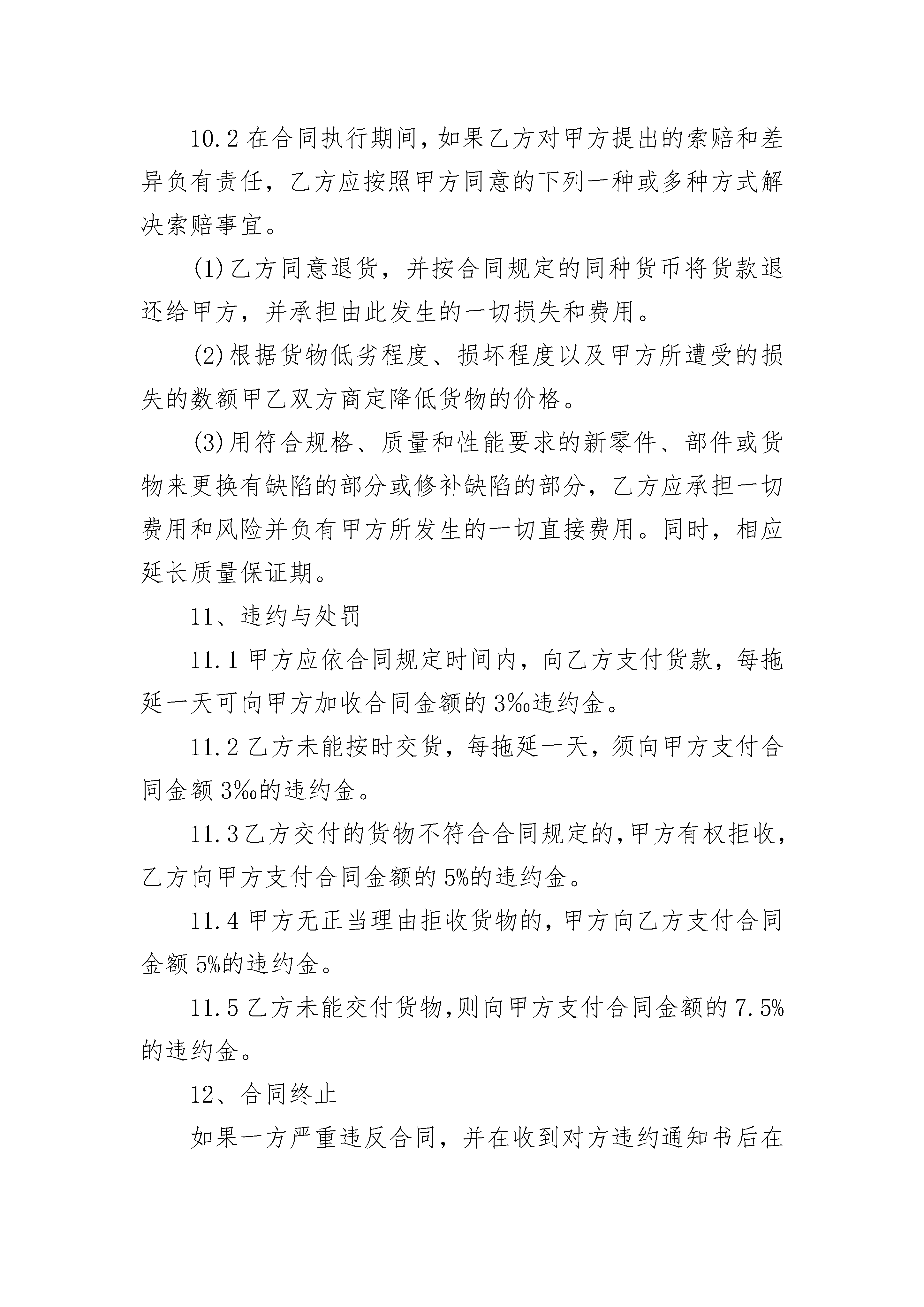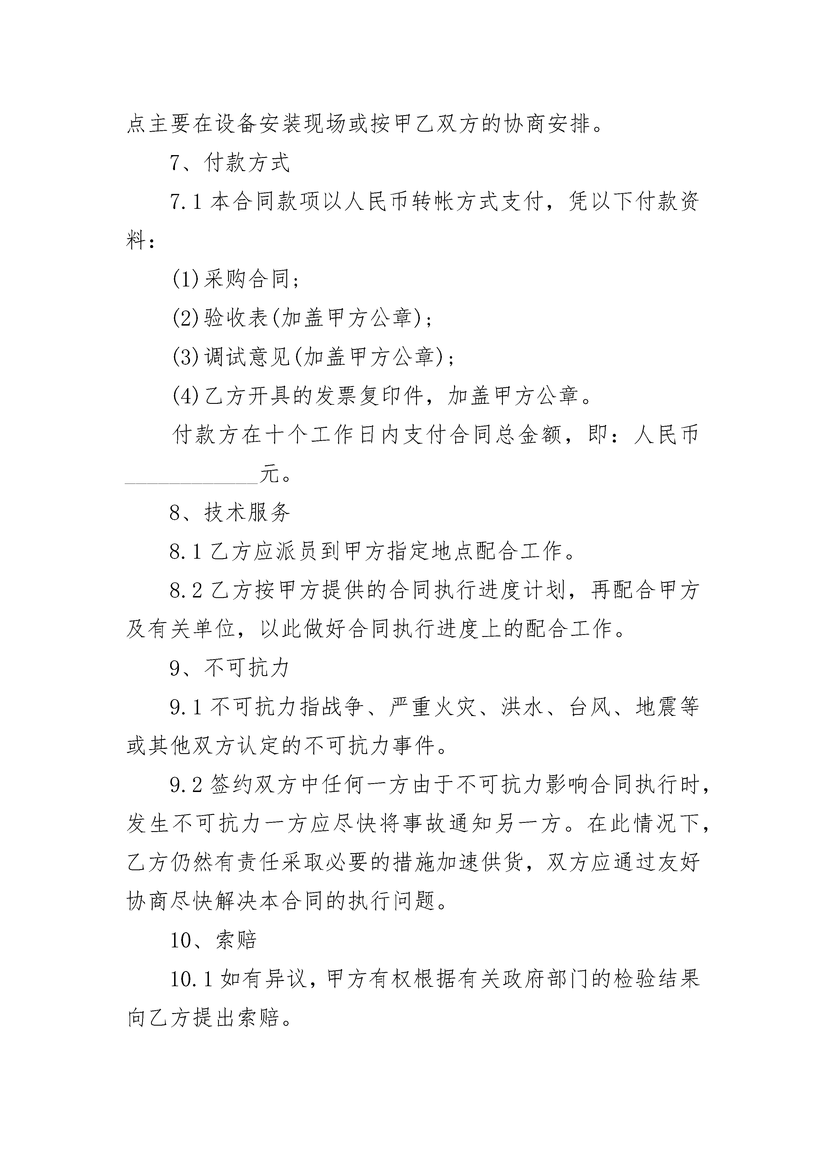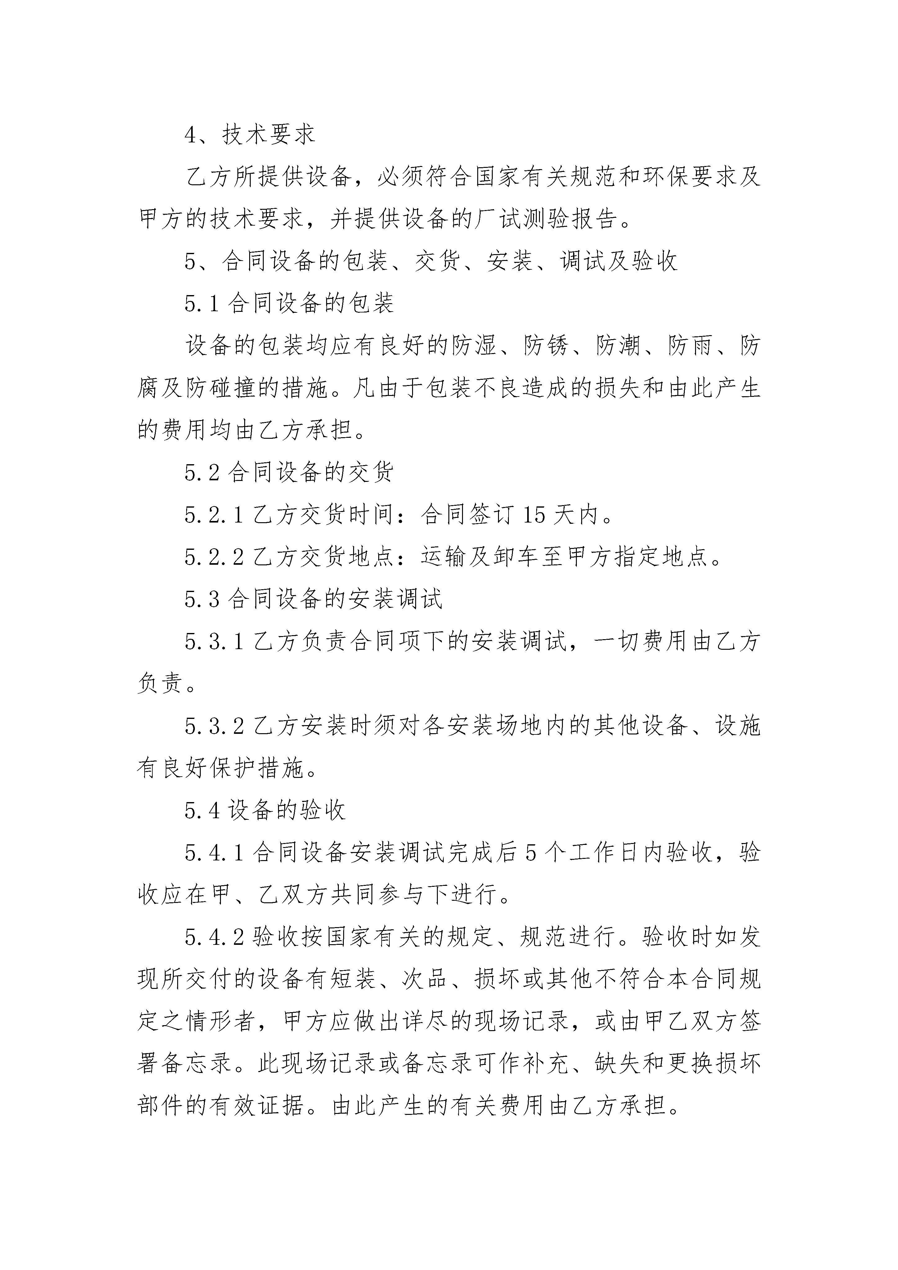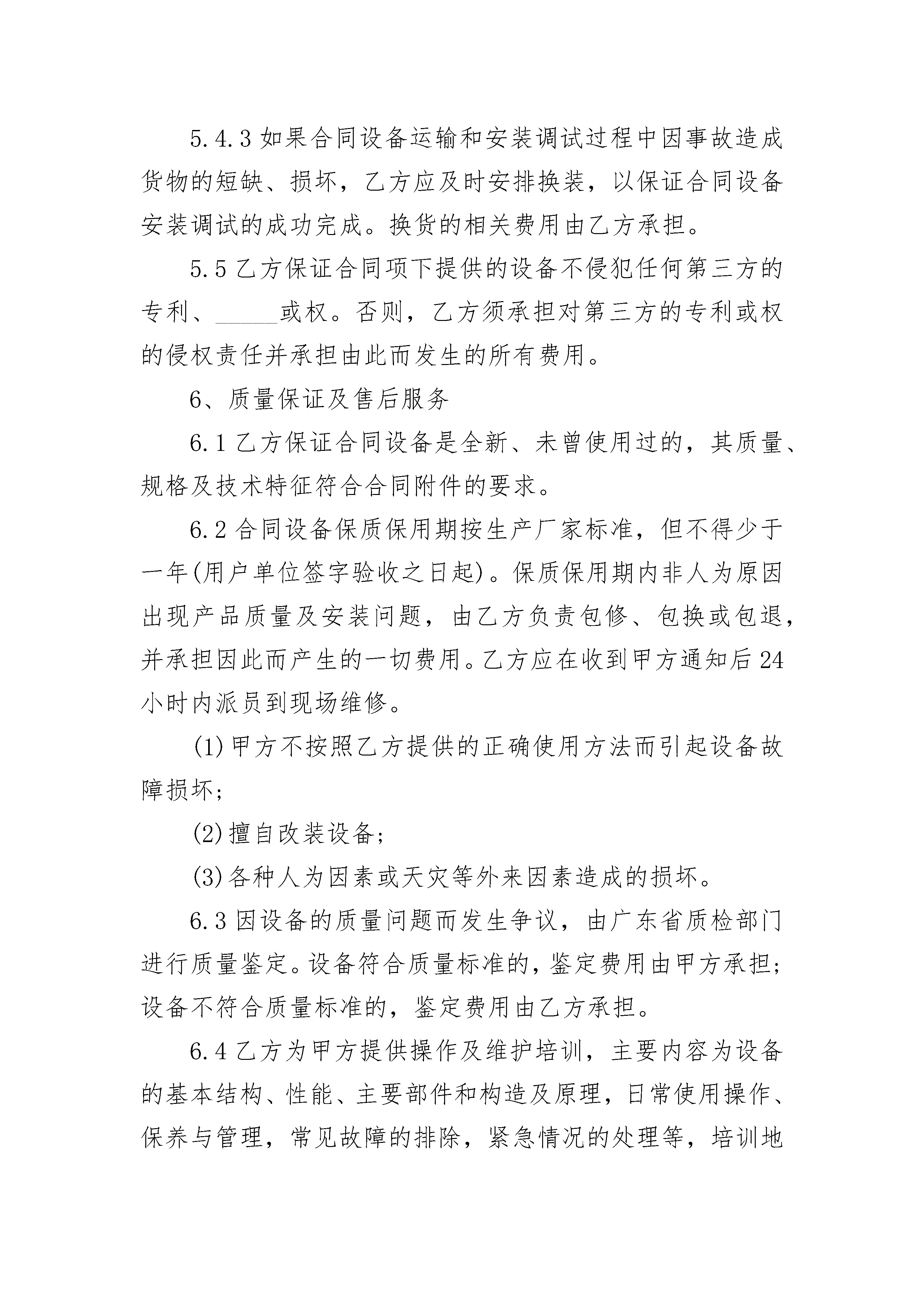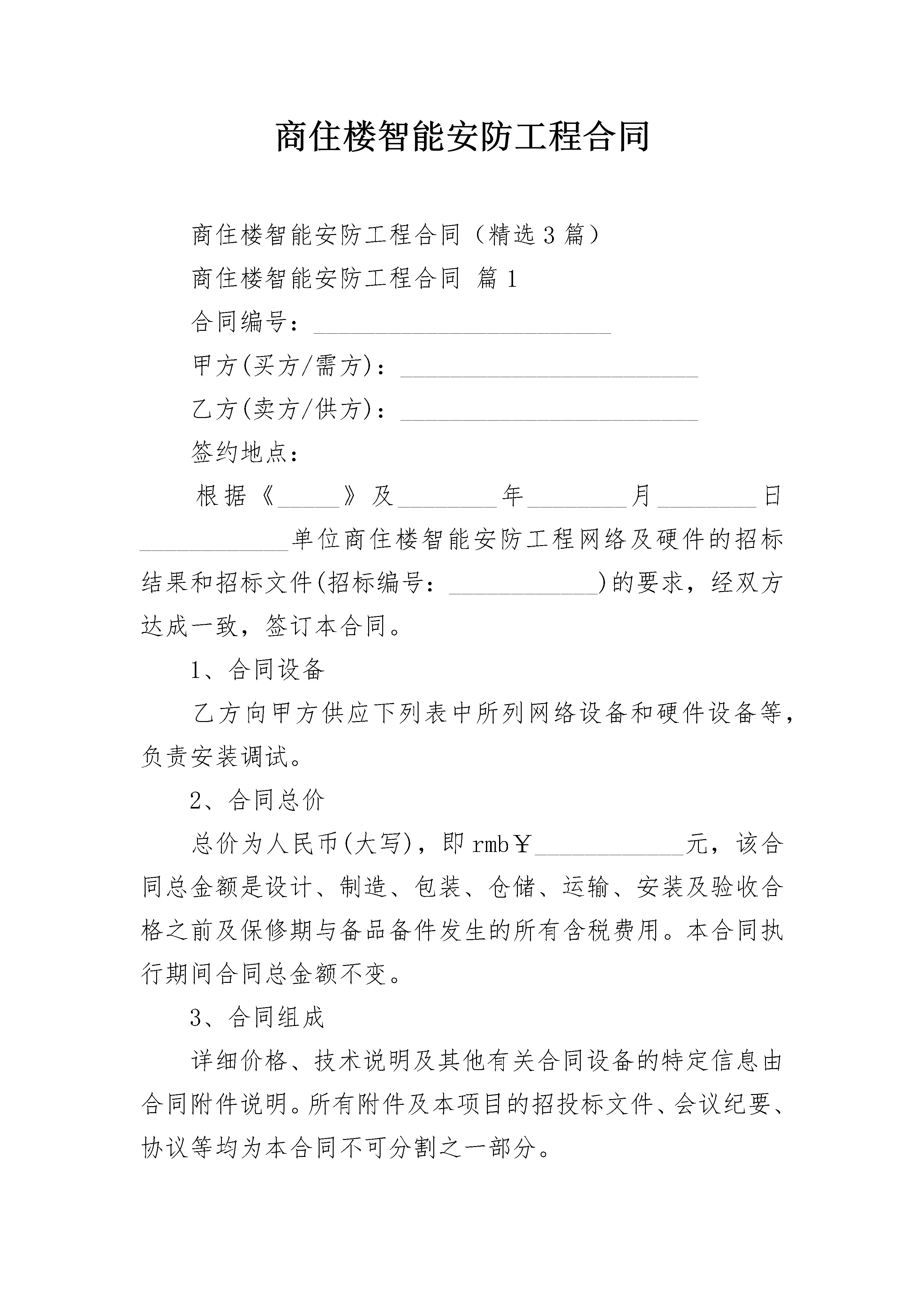 商住楼智能安防工程合同商住楼智能安防工程合同(精选3篇)商住楼智能安防工程合同篇1合同编号:________________________甲方(买方/需方):________________________乙方(卖方/供方):________________________签约地点:根据《_____》及________年________月________日____________单位商住楼智能安防工程网络及硬件的招标结果和招标文件(招标编号:____________)的要求,经双方达成一致,签订本合同。1、合同设备乙方向甲方供应下列表中所列网络设备和硬件设备等,负责安装调试。2、合同总价总价为人民币(大写),即rmb¥____________元,该合同总金额是设计、制造、包装、仓储、运输、安装及验收合格之前及保修期与备品备件发生的所有含税费用。本合同执行期间合同总金额不变。3、合同组成详细价格、技术说明及其他有关合同设备的特定信息由合同附件说明。所有附件及本项目的招投标文件、会议纪要、协议等均为本合同不可分割之一部分。4、技术要求乙方所提供设备,必须符合国家有关规范和环保要求及甲方的技术要求,并提供设备的厂试测验报告。5、合同设备的包装、交货、安装、调试及验收5.1合同设备的包装设备的包装均应有良好的防湿、防锈、防潮、防雨、防腐及防碰撞的措施。凡由于包装不良造成的损失和由此产生的费用均由乙方承担。5.2合同设备的交货5.2.1乙方交货时间:合同签订15天内。5.2.2乙方交货地点:运输及卸车至甲方指定地点。5.3合同设备的安装调试5.3.1乙方负责合同项下的安装调试,一切费用由乙方负责。5.3.2乙方安装时须对各安装场地内的其他设备、设施有良好保护措施。5.4设备的验收5.4.1合同设备安装调试完成后5个工作日内验收,验收应在甲、乙双方共同参与下进行。5.4.2验收按国家有关的规定、规范进行。验收时如发现所交付的设备有短装、次品、损坏或其他不符合本合同规定之情形者,甲方应做出详尽的现场记录,或由甲乙双方签署备忘录。此现场记录或备忘录可作补充、缺失和更换损坏部件的有效证据。由此产生的有关费用由乙方承担。5.4.3如果合同设备运输和安装调试过程中因事故造成货物的短缺、损坏,乙方应及时安排换装,以保证合同设备安装调试的成功完成。换货的相关费用由乙方承担。5.5乙方保证合同项下提供的设备不侵犯任何第三方的专利、_____或权。否则,乙方须承担对第三方的专利或权的侵权责任并承担由此而发生的所有费用。6、质量保证及售后服务6.1乙方保证合同设备是全新、未曾使用过的,其质量、规格及技术特征符合合同附件的要求。6.2合同设备保质保用期按生产厂家标准,但不得少于一年(用户单位签字验收之日起)。保质保用期内非人为原因出现产品质量及安装问题,由乙方负责包修、包换或包退,并承担因此而产生的一切费用。乙方应在收到甲方通知后24小时内派员到现场维修。(1)甲方不按照乙方提供的正确使用方法而引起设备故障损坏;(2)擅自改装设备;(3)各种人为因素或天灾等外来因素造成的损坏。6.3因设备的质量问题而发生争议,由广东省质检部门进行质量鉴定。设备符合质量标准的,鉴定费用由甲方承担;设备不符合质量标准的,鉴定费用由乙方承担。6.4乙方为甲方提供操作及维护培训,主要内容为设备的基本结构、性能、主要部件和构造及原理,日常使用操作、保养与管理,常见故障的排除,紧急情况的处理等,培训地点主要在设备安装现场或按甲乙双方的协商安排。7、付款方式7.1本合同款项以人民币转帐方式支付,凭以下付款资料:(1)采购合同;(2)验收表(加盖甲方公章);(3)调试意见(加盖甲方公章);(4)乙方开具的发票复印件,加盖甲方公章。付款方在十个工作日内支付合同总金额,即:人民币____________元。8、技术服务8.1乙方应派员到甲方指定地点配合工作。8.2乙方按甲方提供的合同执行进度计划,再配合甲方及有关单位,以此做好合同执行进度上的配合工作。9、不可抗力9.1不可抗力指战争、严重火灾、洪水、台风、地震等或其他双方认定的不可抗力事件。9.2签约双方中任何一方由于不可抗力影响合同执行时,发生不可抗力一方应尽快将事故通知另一方。在此情况下,乙方仍然有责任采取必要的措施加速供货,双方应通过友好协商尽快解决本合同的执行问题。10、索赔10.1如有异议,甲方有权根据有关政府部门的检验结果向乙方提出索赔。10.2在合同执行期间,如果乙方对甲方提出的索赔和差异负有责任,乙方应按照甲方同意的下列一种或多种方式解决索赔事宜。(1)乙方同意退货,并按合同规定的同种货币将货款退还给甲方,并承担由此发生的一切损失和费用。(2)根据货物低劣程度、损坏程度以及甲方所遭受的损失的数额甲乙双方商定降低货物的价格。