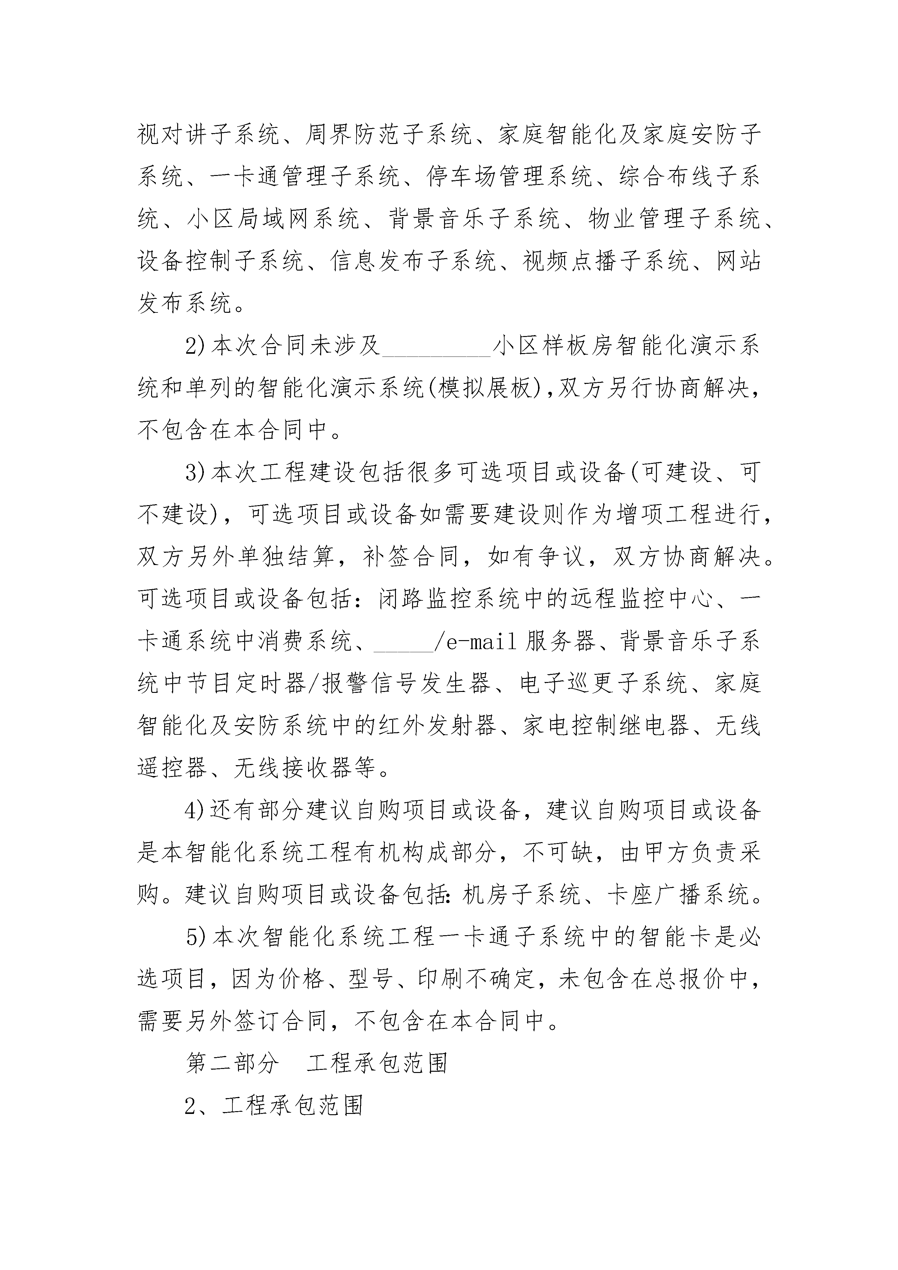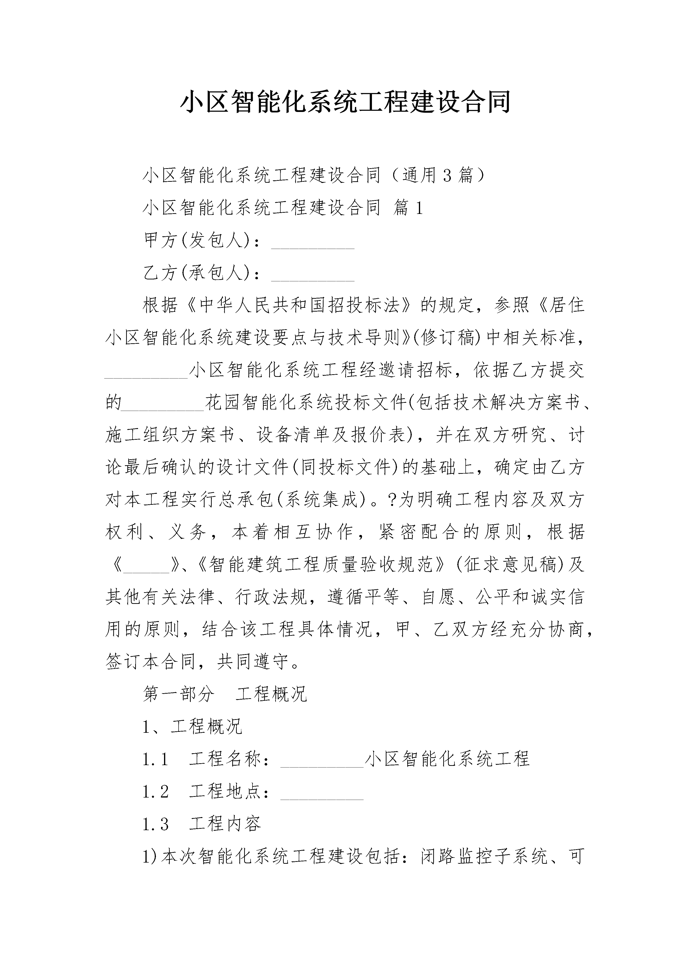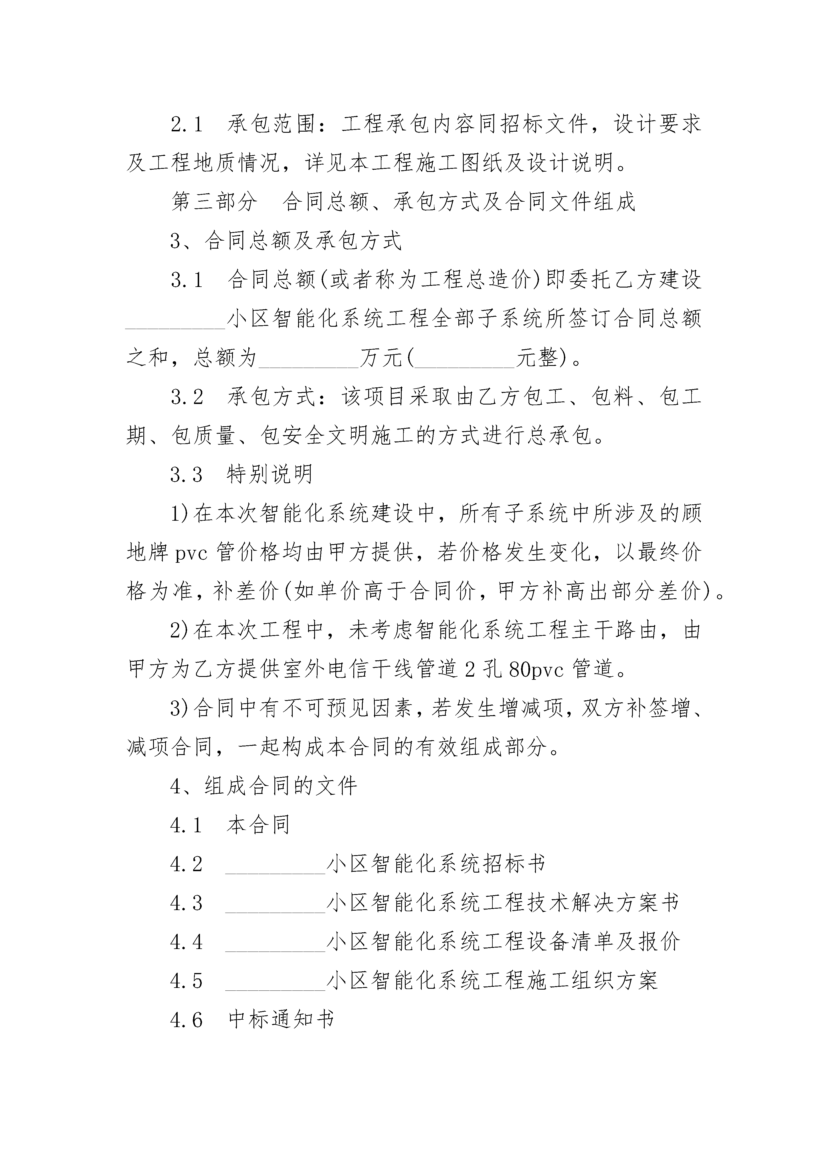 小区智能化系统工程建设合同小区智能化系统工程建设合同(通用3篇)小区智能化系统工程建设合同篇1甲方(发包人):_________乙方(承包人):_________根据《中华人民共和国招投标法》的规定,参照《居住小区智能化系统建设要点与技术导则》(修订稿)中相关标准,_________小区智能化系统工程经邀请招标,依据乙方提交的_________花园智能化系统投标文件(包括技术解决方案书、施工组织方案书、设备清单及报价表),并在双方研究、讨论最后确认的设计文件(同投标文件)的基础上,确定由乙方对本工程实行总承包(系统集成)。?为明确工程内容及双方权利、义务,本着相互协作,紧密配合的原则,根据《_____》、《智能建筑工程质量验收规范》(征求意见稿)及其他有关法律、行政法规,遵循平等、自愿、公平和诚实信用的原则,结合该工程具体情况,甲、乙双方经充分协商,签订本合同,共同遵守。第一部分工程概况1、工程概况1.1工程名称:_________小区智能化系统工程1.2工程地点:_________1.3工程内容1)本次智能化系统工程建设包括:闭路监控子系统、可视对讲子系统、周界防范子系统、家庭智能化及家庭安防子系统、一卡通管理子系统、停车场管理系统、综合布线子系统、小区局域网系统、背景音乐子系统、物业管理子系统、设备控制子系统、信息发布子系统、视频点播子系统、网站发布系统。2)本次合同未涉及_________小区样板房智能化演示系统和单列的智能化演示系统(模拟展板),双方另行协商解决,不包含在本合同中。3)本次工程建设包括很多可选项目或设备(可建设、可不建设),可选项目或设备如需要建设则作为增项工程进行,双方另外单独结算,补签合同,如有争议,双方协商解决。可选项目或设备包括:闭路监控系统中的远程监控中心、一卡通系统中消费系统、_____/e-mail服务器、背景音乐子系统中节目定时器/报警信号发生器、电子巡更子系统、家庭智能化及安防系统中的红外发射器、家电控制继电器、无线遥控器、无线接收器等。4)还有部分建议自购项目或设备,建议自购项目或设备是本智能化系统工程有机构成部分,不可缺,由甲方负责采购。建议自购项目或设备包括:机房子系统、卡座广播系统。5)本次智能化系统工程一卡通子系统中的智能卡是必选项目,因为价格、型号、印刷不确定,未包含在总报价中,需要另外签订合同,不包含在本合同中。第二部分工程承包范围2、工程承包范围2.1承包范围:工程承包内容同招标文件,设计要求及工程地质情况,详见本工程施工图纸及设计说明。第三部分合同总额、承包方式及合同文件组成3、合同总额及承包方式3.1合同总额(或者称为工程总造价)即委托乙方建设_________小区智能化系统工程全部子系统所签订合同总额之和,总额为_________万元(_________元整)。3.2承包方式:该项目采取由乙方包工、包料、包工期、包质量、包安全文明施工的方式进行总承包。3.3特别说明1)在本次智能化系统建设中,所有子系统中所涉及的顾地牌pvc管价格均由甲方提供,若价格发生变化,以最终价格为准,补差价(如单价高于合同价,甲方补高出部分差价)。2)在本次工程中,未考虑智能化系统工程主干路由,由甲方为乙方提供室外电信干线管道2孔80pvc管道。3)合同中有不可预见因素,若发生增减项,双方补签增、减项合同,一起构成本合同的有效组成部分。4、组成合同的文件4.1本合同4.2_________小区智能化系统招标书4.3_________小区智能化系统工程技术解决方案书4.4_________小区智能化系统工程设备清单及报价4.5_________小区智能化系统工程施工组织方案4.6中标通知书4.7图纸4.8双方有关工程的洽商、变更等书面协议或文件视为本合同的组成部分第四部分词语定义5、词语定义5.1甲方(发包人):指在合同中约定,具有工程发包主体资格和支付工程价款能力的当事人以及取得该当事人资格的合法继承人。5.2乙方(承包人):指在合同中约定,被发包人接受的具有工程施工承包主体资格的当事人以及取得该当事人资格的合法继承人。5.3项目经理:指承包人在合同中指定的负责施工管理和合同履行的代表。5.4监理单位:指发包人委托的负责本工程监理并取得相应工程监理资质等级证书的单位。5.5工程师:指本工程监理单位委派的总监理工程师或发包人指定的履行本合同的代表,其具体身份和职权由发包人承包人在合同中约定。5.6工程:指发包人承包人在协议书中约定的承包范围内的工程。5.7合同价款:指发包人承包人在协议书中约定,发包人用以支付承包人按照合同约定完成承包范围内全部工程并承担质量保修责任的款项。5.8追加合同价款:指在合同履行中发生需要增加合同价款的情况,