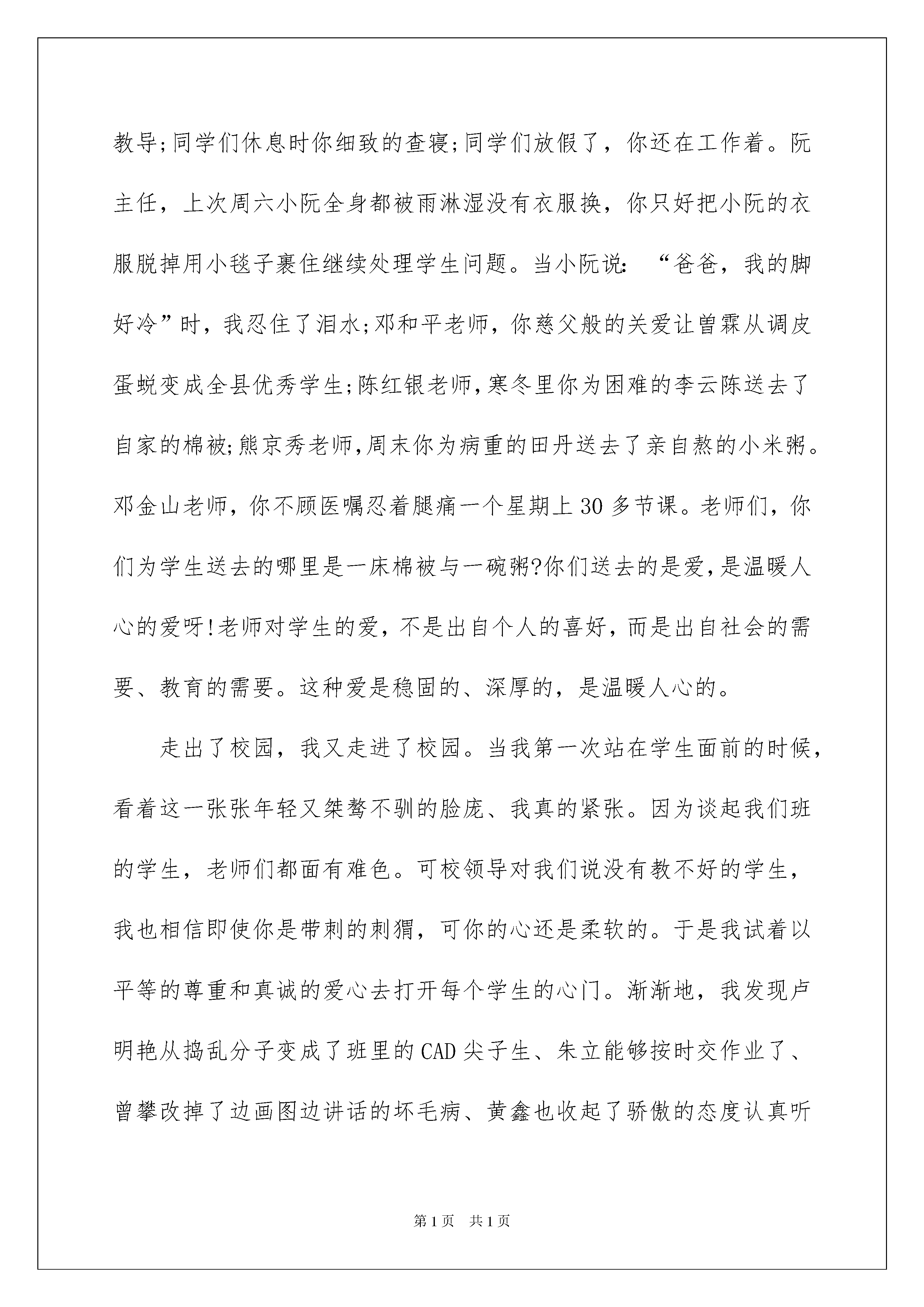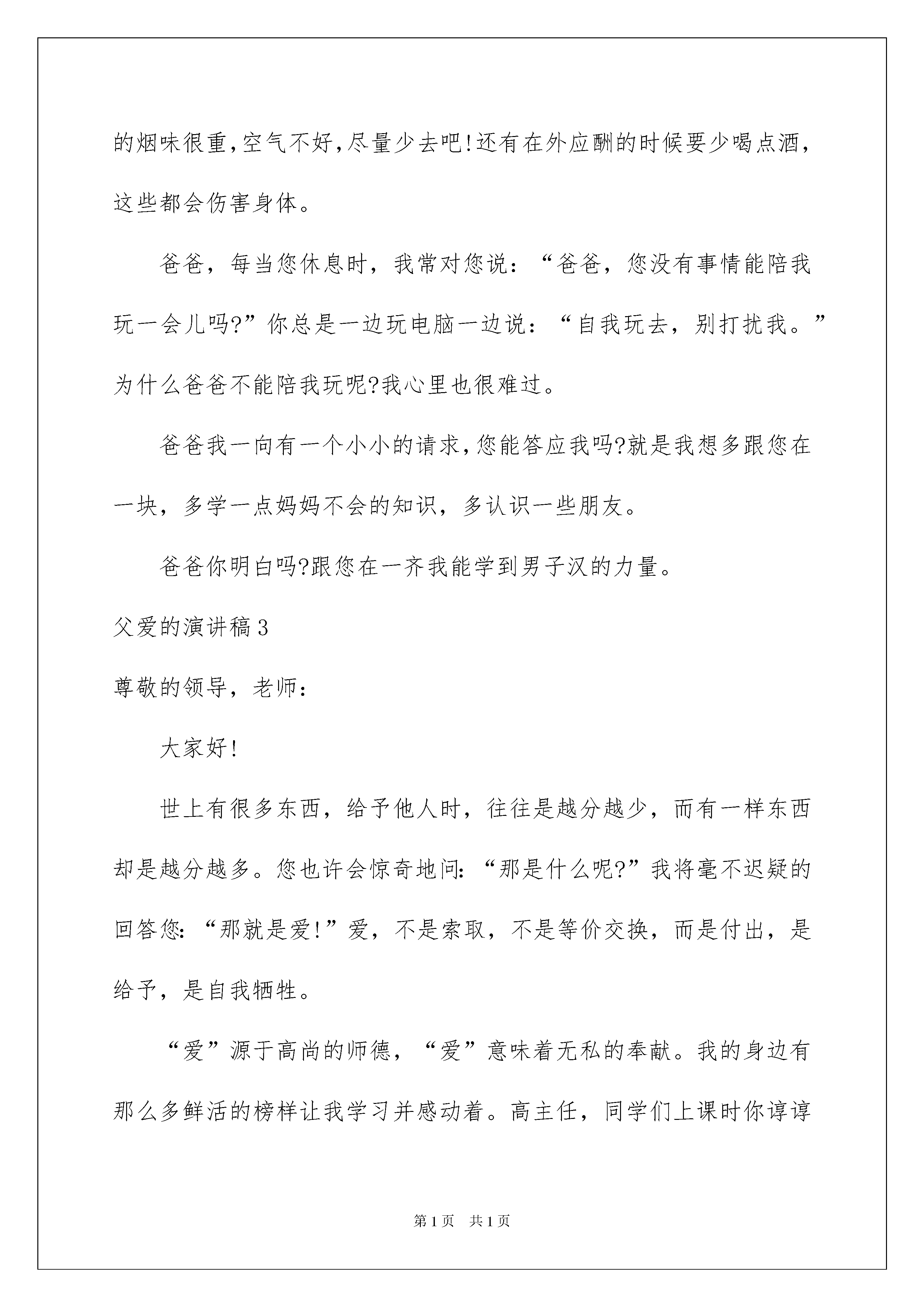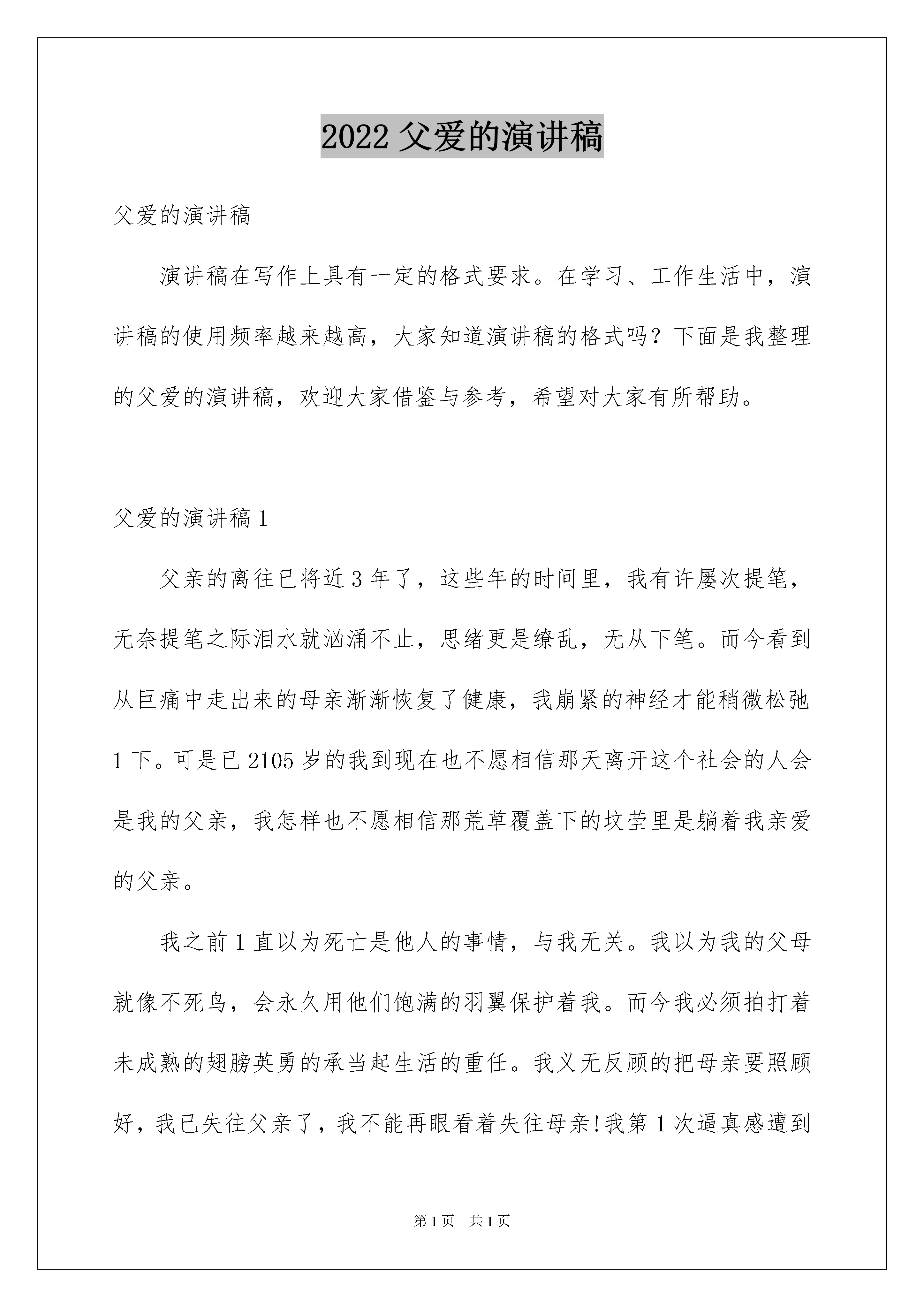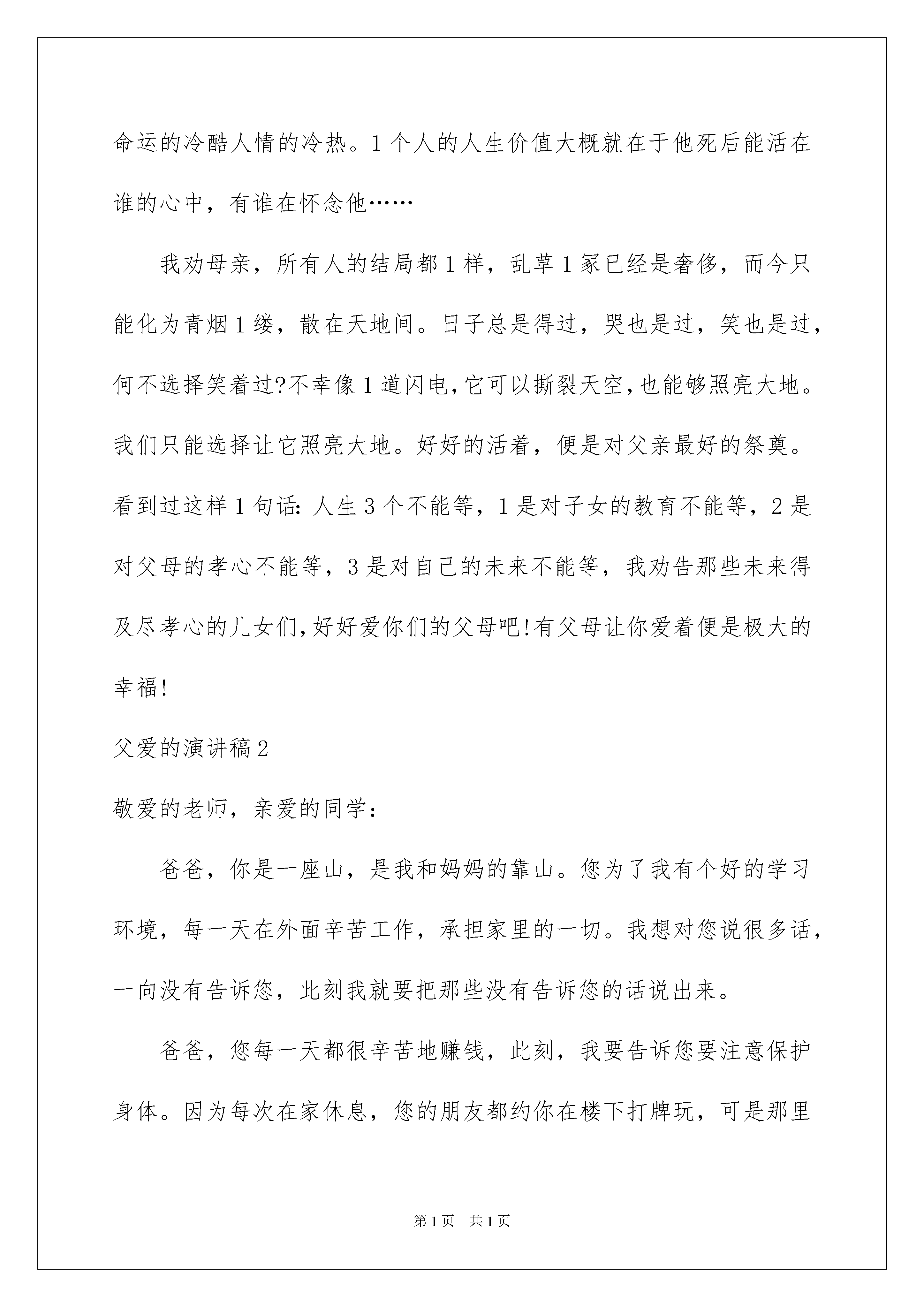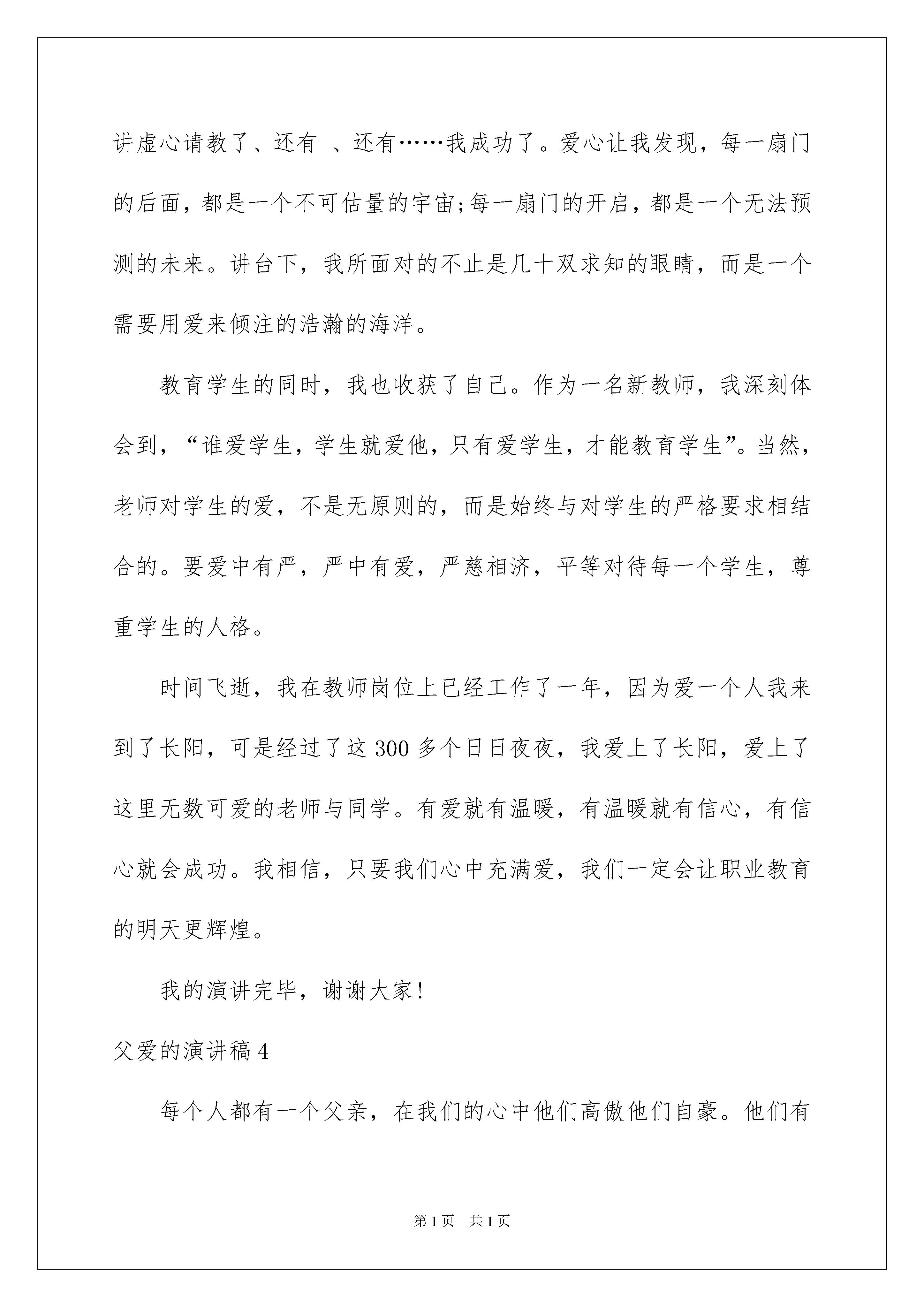 2022父爱的演讲稿父爱的演讲稿演讲稿在写作上具有一定的格式要求。在学习、工作生活中,演讲稿的使用频率越来越高,大家知道演讲稿的格式吗?下面是我整理的父爱的演讲稿,欢迎大家借鉴与参考,希望对大家有所帮助。父爱的演讲稿1父亲的离往已将近3年了,这些年的时间里,我有许屡次提笔,无奈提笔之际泪水就汹涌不止,思绪更是缭乱,无从下笔。而今看到从巨痛中走出来的母亲渐渐恢复了健康,我崩紧的神经才能稍微松弛1下。可是已2105岁的我到现在也不愿相信那天离开这个社会的人会是我的父亲,我怎样也不愿相信那荒草覆盖下的坟茔里是躺着我亲爱的父亲。我之前1直以为死亡是他人的事情,与我无关。我以为我的父母就像不死鸟,会永久用他们饱满的羽翼保护着我。而今我必须拍打着未成熟的翅膀英勇的承当起生活的重任。我义无反顾的把母亲要照顾好,我已失往父亲了,我不能再眼看着失往母亲!我第1次逼真感遭到命运的冷酷人情的冷热。1个人的人生价值大概就在于他死后能活在谁的心中,有谁在怀念他……我劝母亲,所有人的结局都1样,乱草1冢已经是奢侈,而今只能化为青烟1缕,散在天地间。日子总是得过,哭也是过,笑也是过,何不选择笑着过?不幸像1道闪电,它可以撕裂天空,也能够照亮大地。我们只能选择让它照亮大地。好好的活着,便是对父亲最好的祭奠。看到过这样1句话:人生3个不能等,1是对子女的教育不能等,2是对父母的孝心不能等,3是对自己的未来不能等,我劝告那些未来得及尽孝心的儿女们,好好爱你们的父母吧!有父母让你爱着便是极大的幸福!父爱的演讲稿2敬爱的老师,亲爱的同学:爸爸,你是一座山,是我和妈妈的靠山。您为了我有个好的学习环境,每一天在外面辛苦工作,承担家里的一切。我想对您说很多话,一向没有告诉您,此刻我就要把那些没有告诉您的话说出来。爸爸,您每一天都很辛苦地赚钱,此刻,我要告诉您要注意保护身体。因为每次在家休息,您的朋友都约你在楼下打牌玩,可是那里的烟味很重,空气不好,尽量少去吧!还有在外应酬的时候要少喝点酒,这些都会伤害身体。爸爸,每当您休息时,我常对您说:“爸爸,您没有事情能陪我玩一会儿吗?”你总是一边玩电脑一边说:“自我玩去,别打扰我。”为什么爸爸不能陪我玩呢?我心里也很难过。爸爸我一向有一个小小的请求,您能答应我吗?就是我想多跟您在一块,多学一点妈妈不会的知识,多认识一些朋友。爸爸你明白吗?跟您在一齐我能学到男子汉的力量。父爱的演讲稿3尊敬的领导,老师:大家好!世上有很多东西,给予他人时,往往是越分越少,而有一样东西却是越分越多。您也许会惊奇地问:“那是什么呢?”我将毫不迟疑的回答您:“那就是爱!”爱,不是索取,不是等价交换,而是付出,是给予,是自我牺牲。“爱”源于高尚的师德,“爱”意味着无私的奉献。我的身边有那么多鲜活的榜样让我学习并感动着。高主任,同学们上课时你谆谆教导;同学们休息时你细致的查寝;同学们放假了,你还在工作着。阮主任,上次周六小阮全身都被雨淋湿没有衣服换,你只好把小阮的衣服脱掉用小毯子裹住继续处理学生问题。当小阮说:“爸爸,我的脚好冷”时,我忍住了泪水;邓和平老师,你慈父般的关爱让曽霖从调皮蛋蜕变成全县优秀学生;陈红银老师,寒冬里你为困难的李云陈送去了自家的棉被;熊京秀老师,周末你为病重的田丹送去了亲自熬的小米粥。邓金山老师,你不顾医嘱忍着腿痛一个星期上30多节课。老师们,你们为学生送去的哪里是一床棉被与一碗粥?你们送去的是爱,是温暖人心的爱呀!老师对学生的爱,不是出自个人的喜好,而是出自社会的需要、教育的需要。这种爱是稳固的、深厚的,是温暖人心的。走出了校园,我又走进了校园。当我第一次站在学生面前的时候,看着这一张张年轻又桀骜不驯的脸庞、我真的紧张。因为谈起我们班的学生,老师们都面有难色。可校领导对我们说没有教不好的学生,我也相信即使你是带刺的刺猬,可你的心还是柔软的。于是我试着以平等的尊重和真诚的爱心去打开每个学生的心门。渐渐地,我发现卢明艳从捣乱分子变成了班里的CAD尖子生、朱立能够按时交作业了、曾攀改掉了边画图边讲话的坏毛病、黄鑫也收起了骄傲的态度认真听讲虚心请教了、还有、还有……我成功了。爱心让我发现,每一扇门的后面,都是一个不可估量的宇宙;每一扇门的开启,都是一个无法预测的未来。讲台下,我所面对的不止是几十双求知的眼睛,而是一个需要用爱来倾注的浩瀚的海洋。教育学生的同时,我也收获了自己。作为一名新教师,我深刻体会到,“谁爱学生,学生就爱他,只有爱学生,才能教育学生”。当然,老师对学生的爱,不是无原则的,而是始终与对学生的严格要求相结合的。要爱中有严,严中有爱,严慈相济,平等对待每一个学生,尊重学生的人