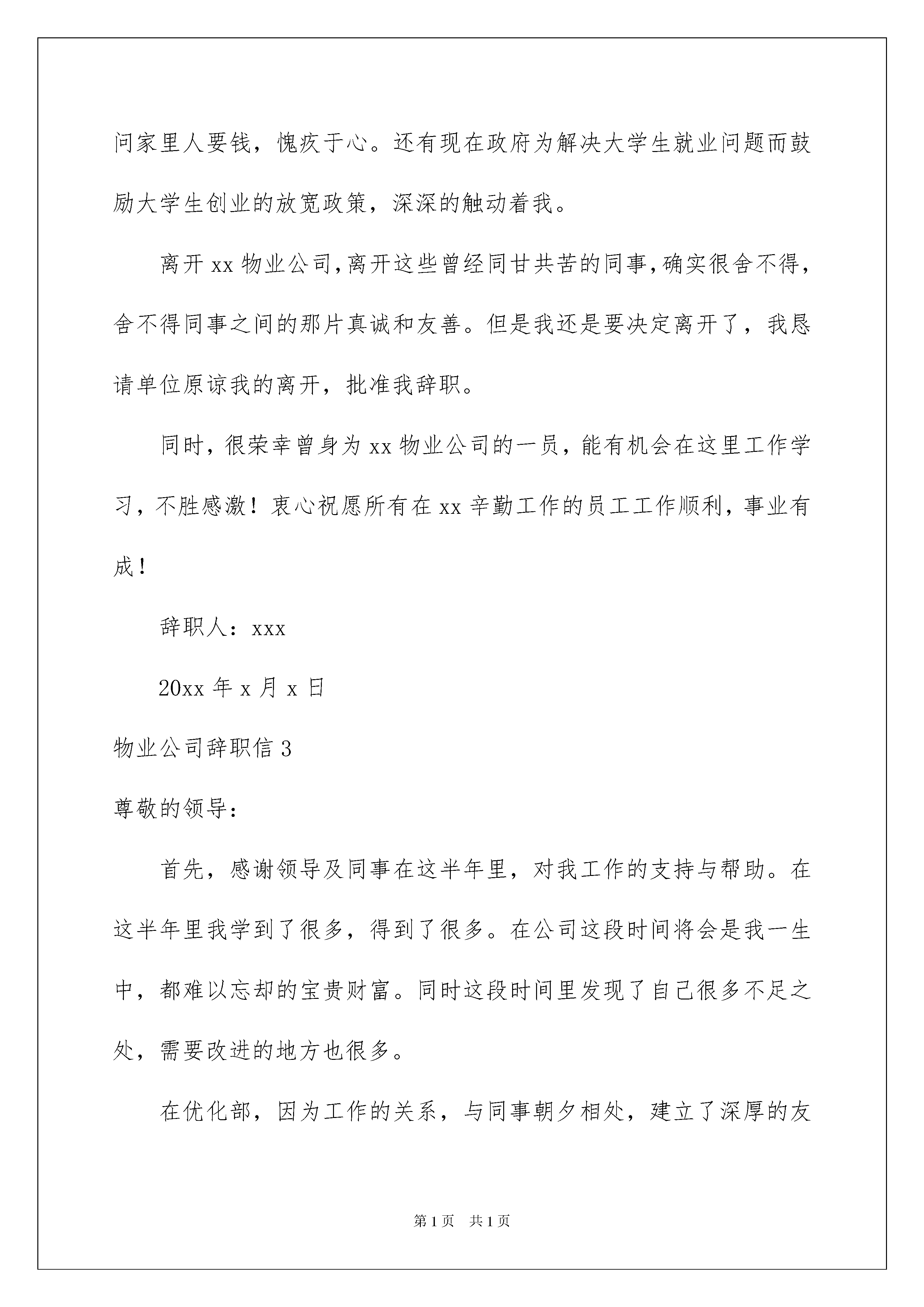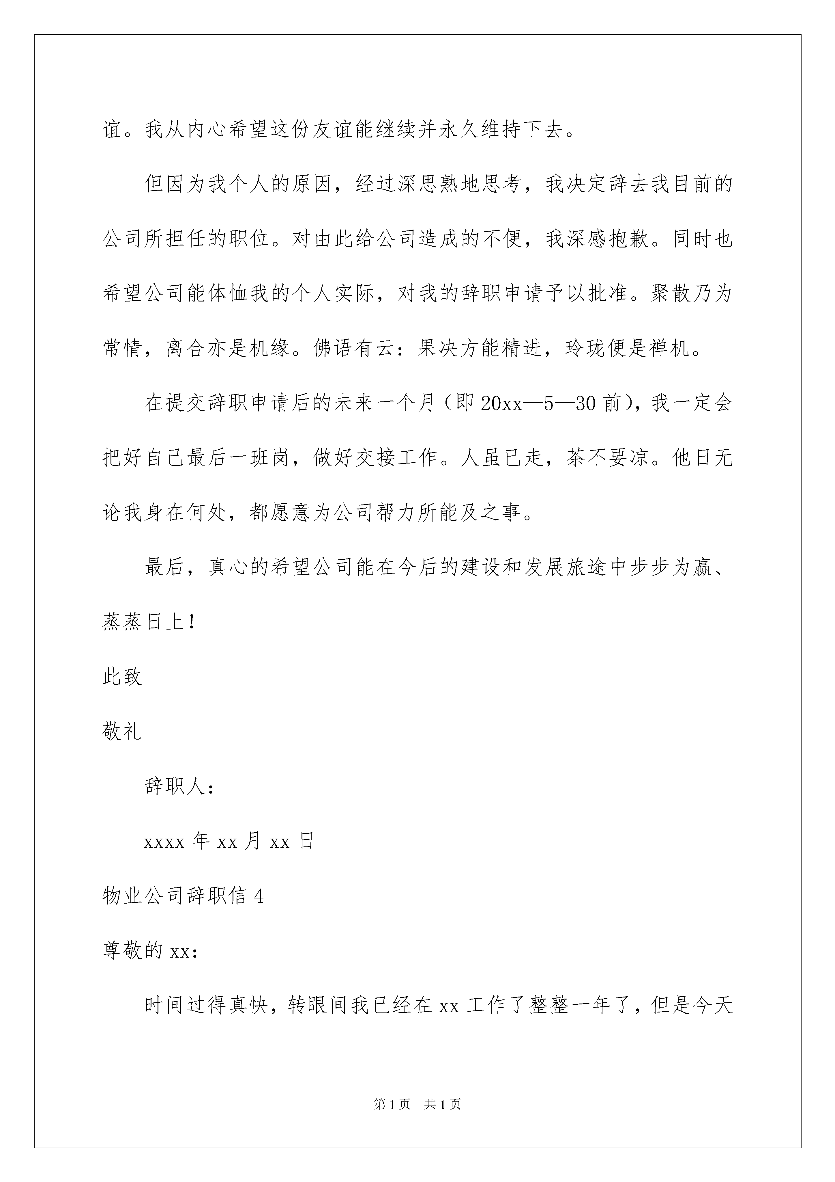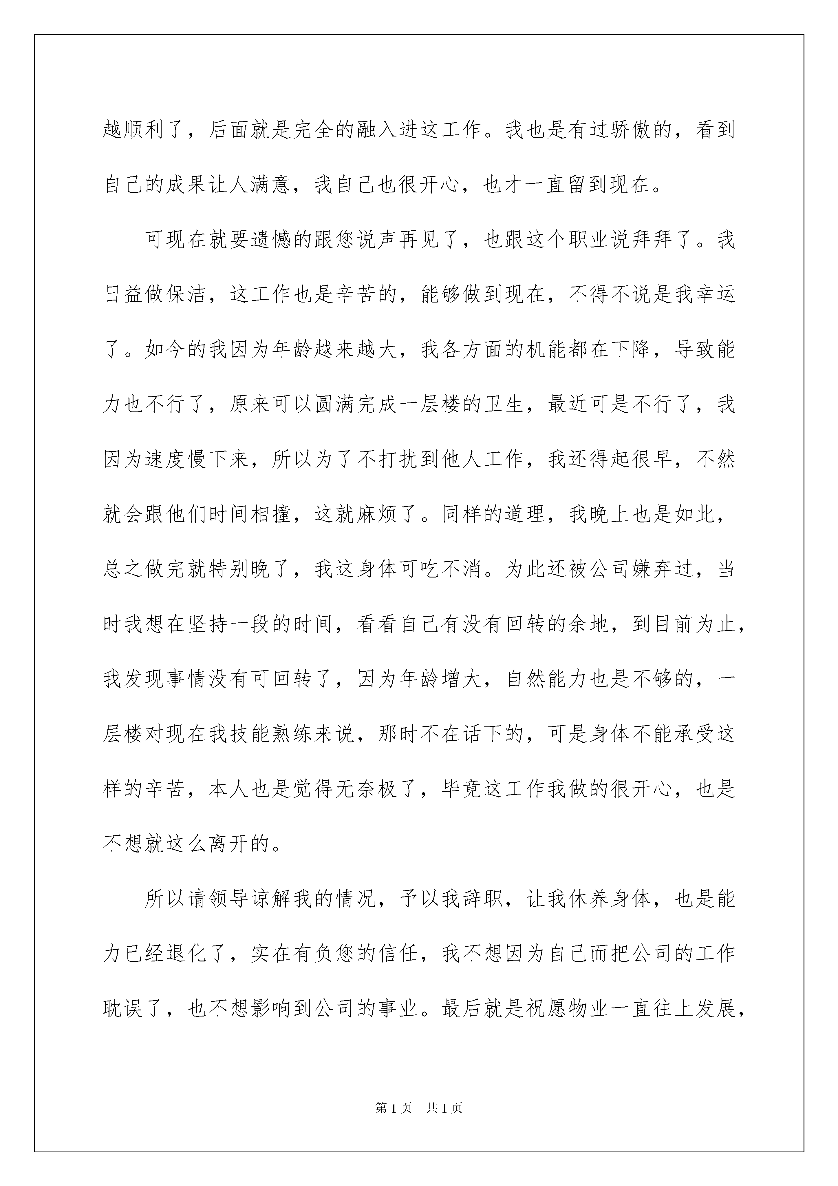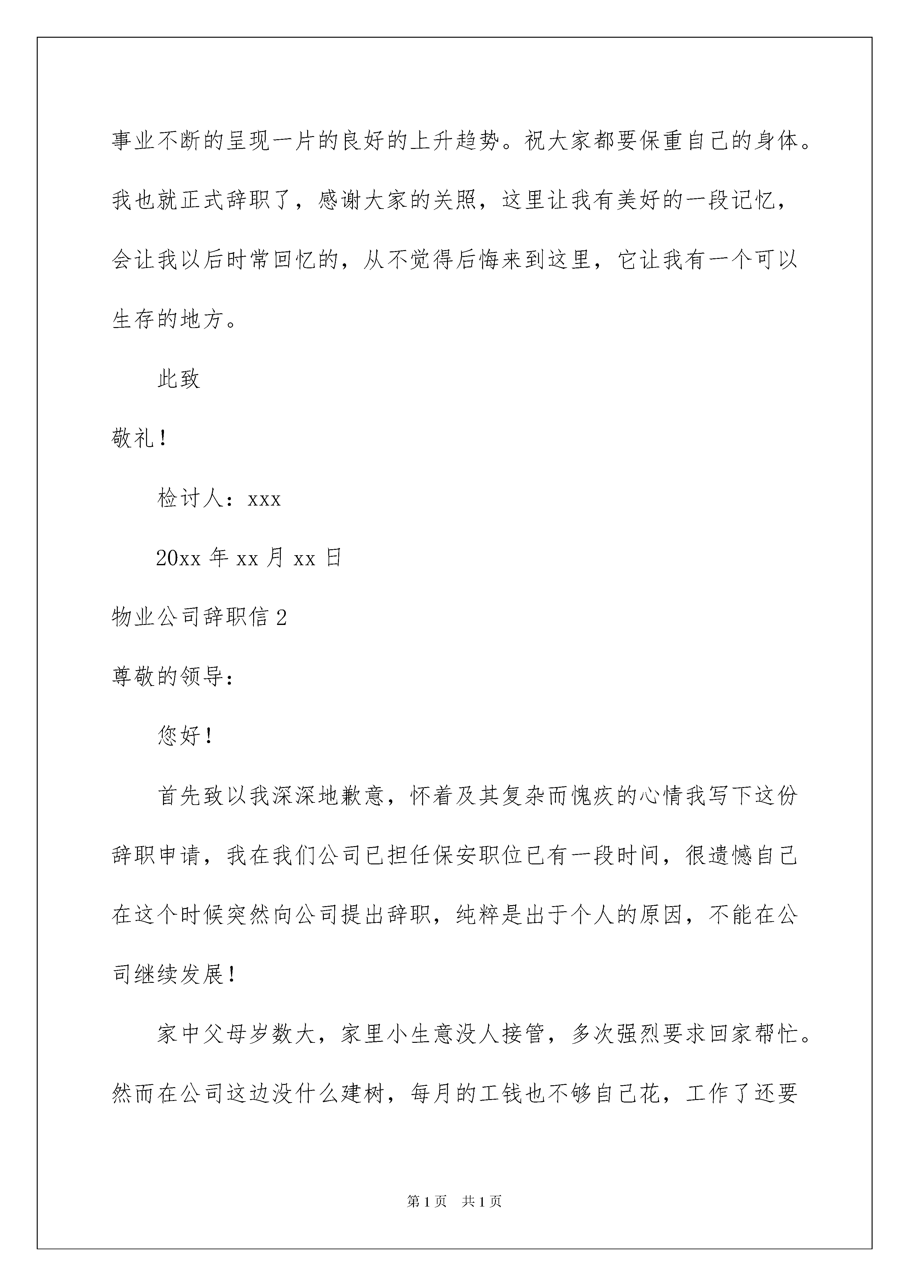 2022物业公司辞职信10篇物业公司辞职信10篇在岗位上呆了一段时间后,某些条件下我们会离开岗位,这时就需要学习写辞职信吧。相信许多人会觉得辞职信很难写吧,下面是我收集整理的物业公司辞职信,欢迎阅读与收藏。物业公司辞职信1尊敬的公司领导:您好!我是公司保洁员xxx,在我们物业也工作很长时间了,现在我面临辞职的境地,实在是身体和能力都不足以担任保洁员这一职,我心愧于您,抱歉在此提辞职,望充分谅解以及批准。在物业公司做保洁员,着实是很辛苦的,以前我都熬过来了,只是现在年龄也大了,身体大不如从前,自然做事也就不那么利索了。公司大概有十几号保洁员,每个人一天负责一层楼,一般都能够做完,早上和晚上各一次,我记得刚来的时候,做起来还有点吃力,一层楼的卫生都是我一个人搞,还是有难度的,可是随着时间我工作也越来越顺利了,后面就是完全的融入进这工作。我也是有过骄傲的,看到自己的成果让人满意,我自己也很开心,也才一直留到现在。可现在就要遗憾的跟您说声再见了,也跟这个职业说拜拜了。我日益做保洁,这工作也是辛苦的,能够做到现在,不得不说是我幸运了。如今的我因为年龄越来越大,我各方面的机能都在下降,导致能力也不行了,原来可以圆满完成一层楼的卫生,最近可是不行了,我因为速度慢下来,所以为了不打扰到他人工作,我还得起很早,不然就会跟他们时间相撞,这就麻烦了。同样的道理,我晚上也是如此,总之做完就特别晚了,我这身体可吃不消。为此还被公司嫌弃过,当时我想在坚持一段的时间,看看自己有没有回转的余地,到目前为止,我发现事情没有可回转了,因为年龄增大,自然能力也是不够的,一层楼对现在我技能熟练来说,那时不在话下的,可是身体不能承受这样的辛苦,本人也是觉得无奈极了,毕竟这工作我做的很开心,也是不想就这么离开的。所以请领导谅解我的情况,予以我辞职,让我休养身体,也是能力已经退化了,实在有负您的信任,我不想因为自己而把公司的工作耽误了,也不想影响到公司的事业。最后就是祝愿物业一直往上发展,事业不断的呈现一片的良好的上升趋势。祝大家都要保重自己的身体。我也就正式辞职了,感谢大家的关照,这里让我有美好的一段记忆,会让我以后时常回忆的,从不觉得后悔来到这里,它让我有一个可以生存的地方。此致敬礼!检讨人:xxx20xx年xx月xx日物业公司辞职信2尊敬的领导:您好!首先致以我深深地歉意,怀着及其复杂而愧疚的心情我写下这份辞职申请,我在我们公司已担任保安职位已有一段时间,很遗憾自己在这个时候突然向公司提出辞职,纯粹是出于个人的原因,不能在公司继续发展!家中父母岁数大,家里小生意没人接管,多次强烈要求回家帮忙。然而在公司这边没什么建树,每月的工钱也不够自己花,工作了还要问家里人要钱,愧疚于心。还有现在政府为解决大学生就业问题而鼓励大学生创业的放宽政策,深深的触动着我。离开xx物业公司,离开这些曾经同甘共苦的同事,确实很舍不得,舍不得同事之间的那片真诚和友善。但是我还是要决定离开了,我恳请单位原谅我的离开,批准我辞职。同时,很荣幸曾身为xx物业公司的一员,能有机会在这里工作学习,不胜感激!衷心祝愿所有在xx辛勤工作的员工工作顺利,事业有成!辞职人:xxx20xx年x月x日物业公司辞职信3尊敬的领导:首先,感谢领导及同事在这半年里,对我工作的支持与帮助。在这半年里我学到了很多,得到了很多。在公司这段时间将会是我一生中,都难以忘却的宝贵财富。同时这段时间里发现了自己很多不足之处,需要改进的地方也很多。在优化部,因为工作的关系,与同事朝夕相处,建立了深厚的友谊。我从内心希望这份友谊能继续并永久维持下去。但因为我个人的原因,经过深思熟地思考,我决定辞去我目前的公司所担任的职位。对由此给公司造成的不便,我深感抱歉。同时也希望公司能体恤我的个人实际,对我的辞职申请予以批准。聚散乃为常情,离合亦是机缘。佛语有云:果决方能精进,玲珑便是禅机。在提交辞职申请后的未来一个月(即20xx—5—30前),我一定会把好自己最后一班岗,做好交接工作。人虽已走,茶不要凉。他日无论我身在何处,都愿意为公司帮力所能及之事。最后,真心的希望公司能在今后的建设和发展旅途中步步为赢、蒸蒸日上!此致敬礼辞职人:xxxx年xx月xx日物业公司辞职信4尊敬的xx:时间过得真快,转眼间我已经在xx工作了整整一年了,但是今天由于我自己的原因我不得不提出辞职。首先,非常感谢这一年来xx对我的信任、关心、照顾、认可、教导和培养,但是以后我无法再为公司服务了,也无法再陪伴于xx的`身边,在此我感到非常的遗憾。认真回顾过去的这一年,我在xx学到了很多东西,无论是专业技能还是为人处事方面都