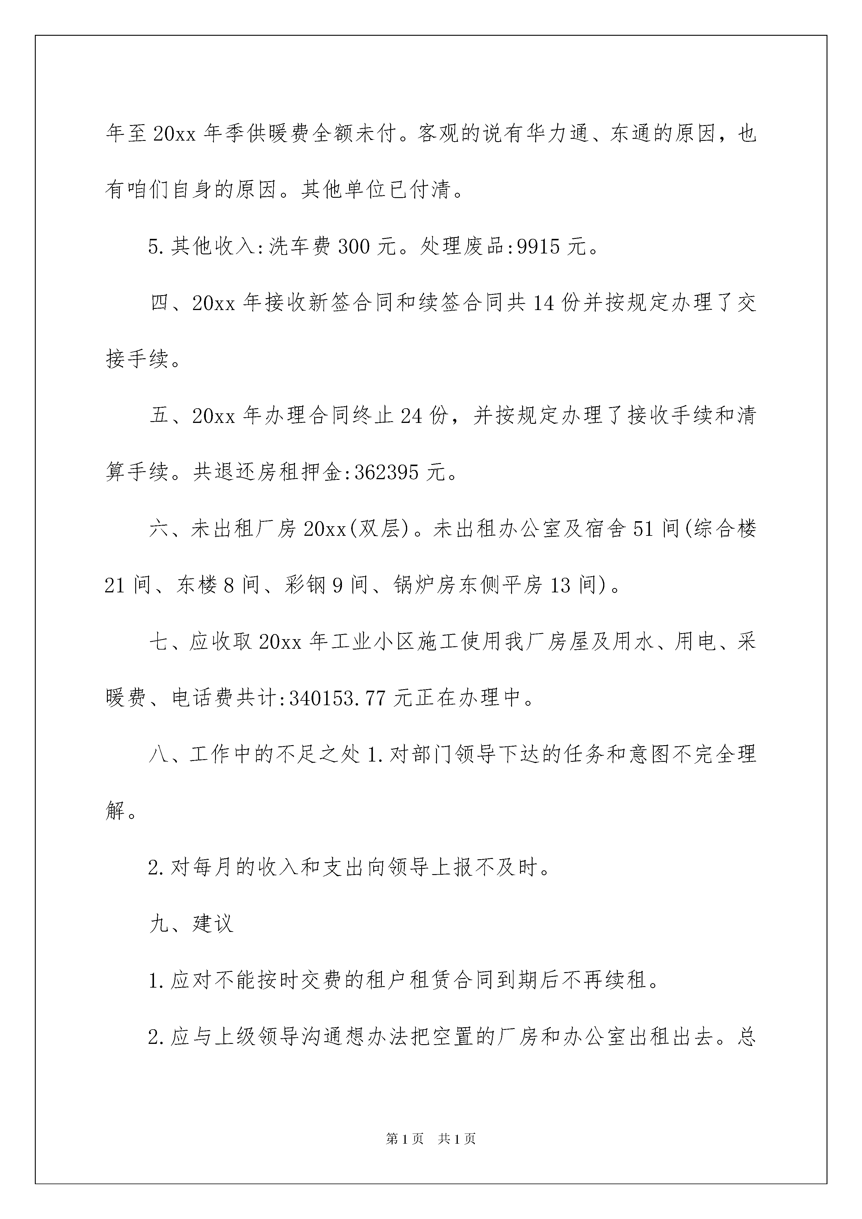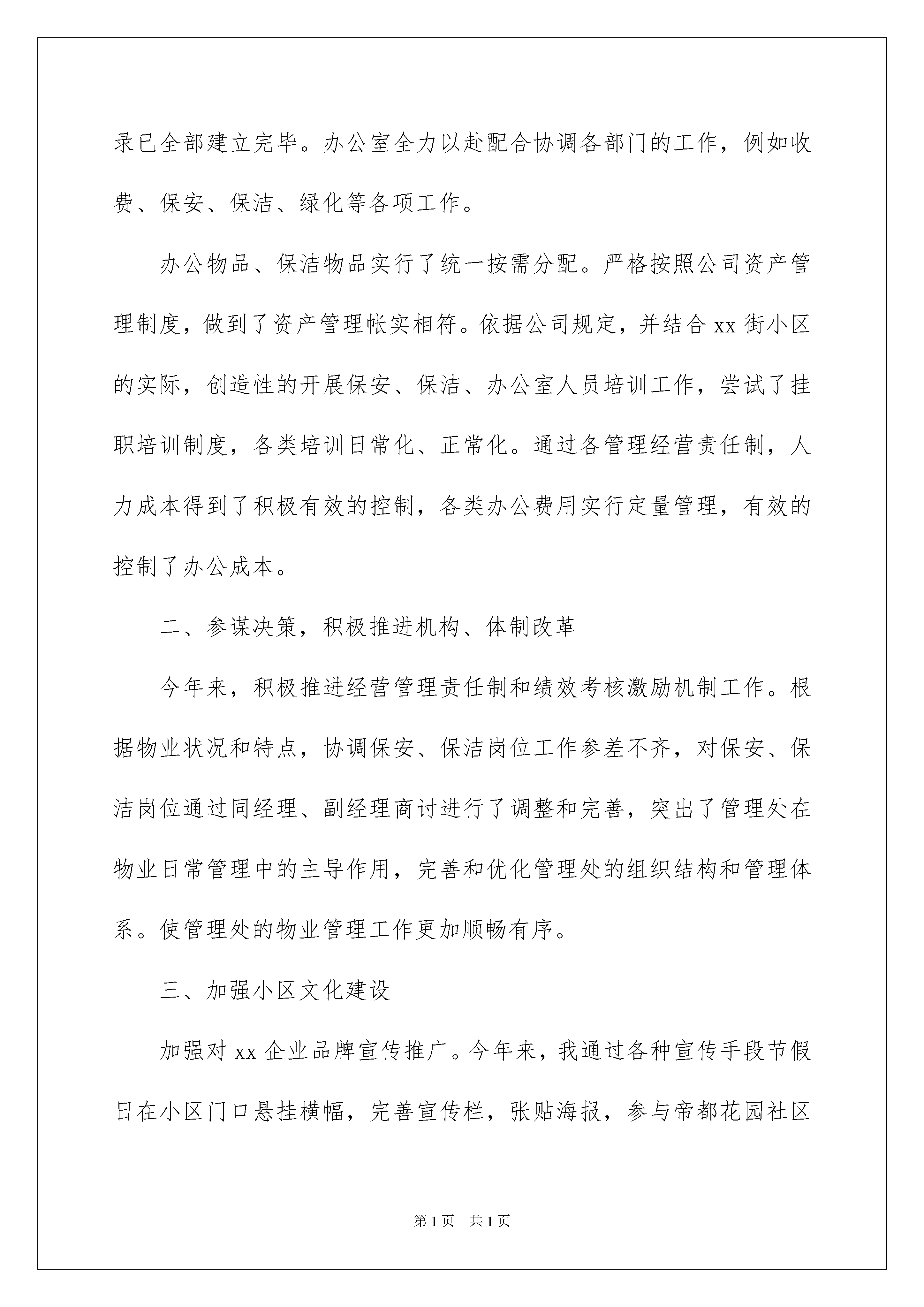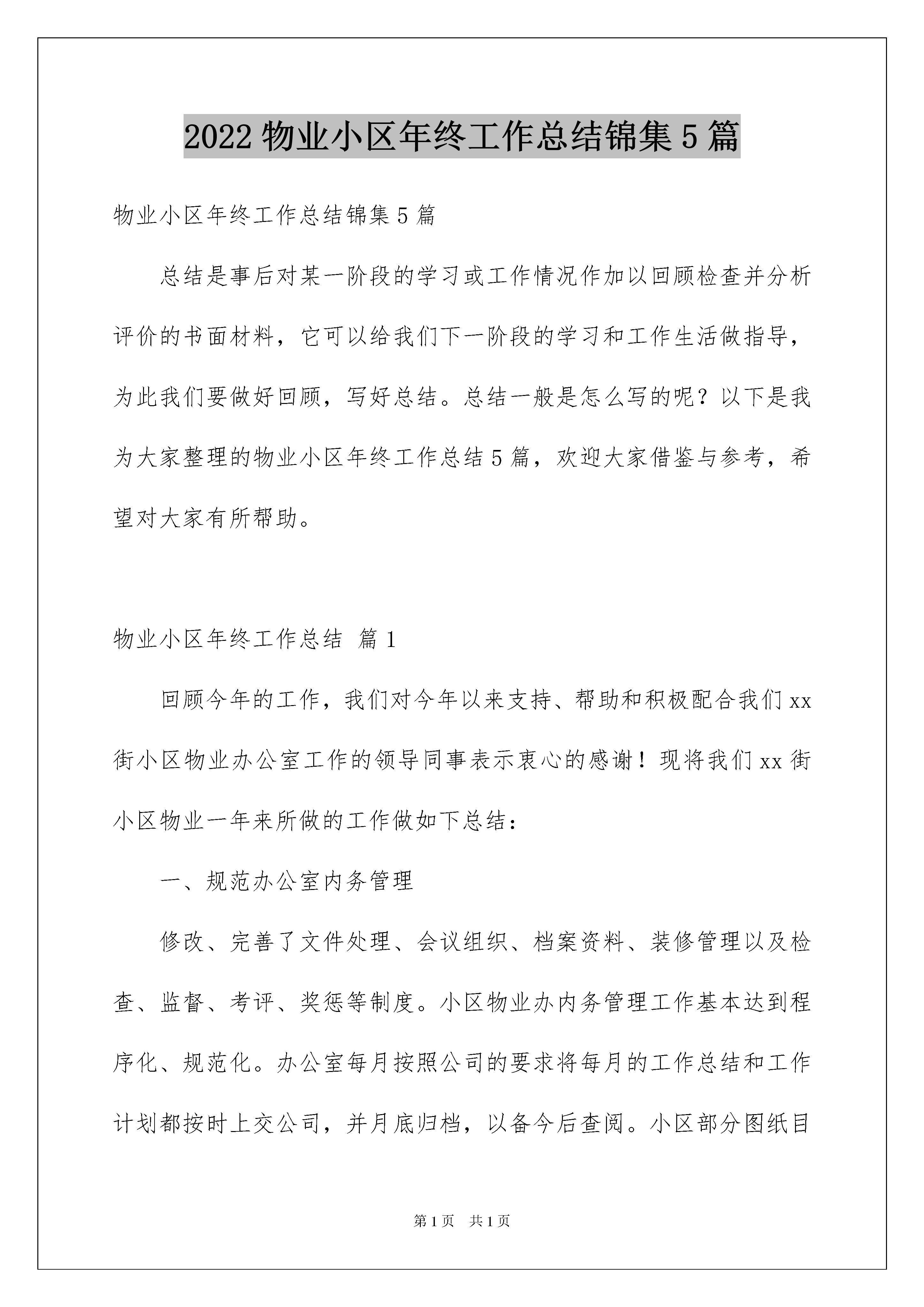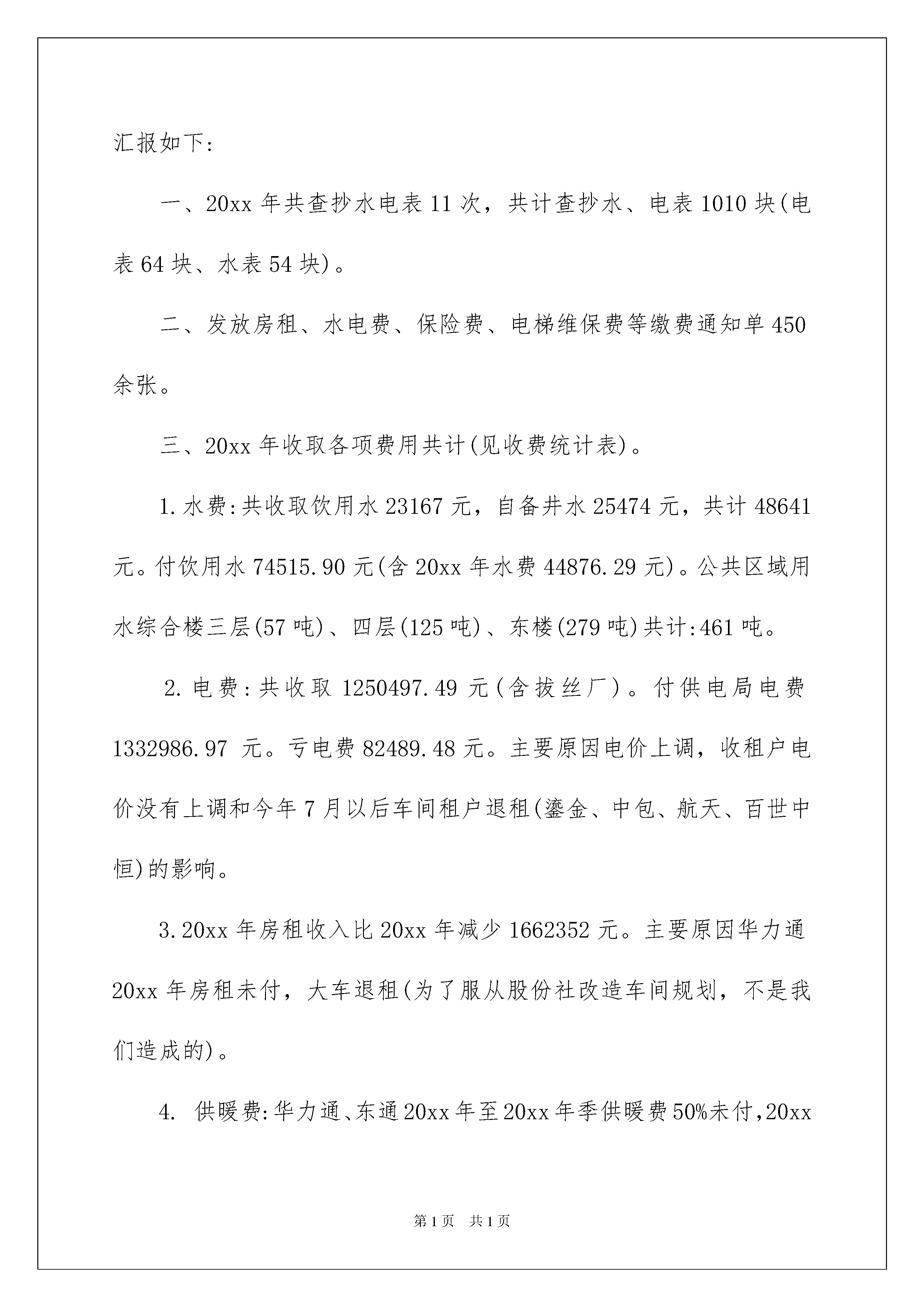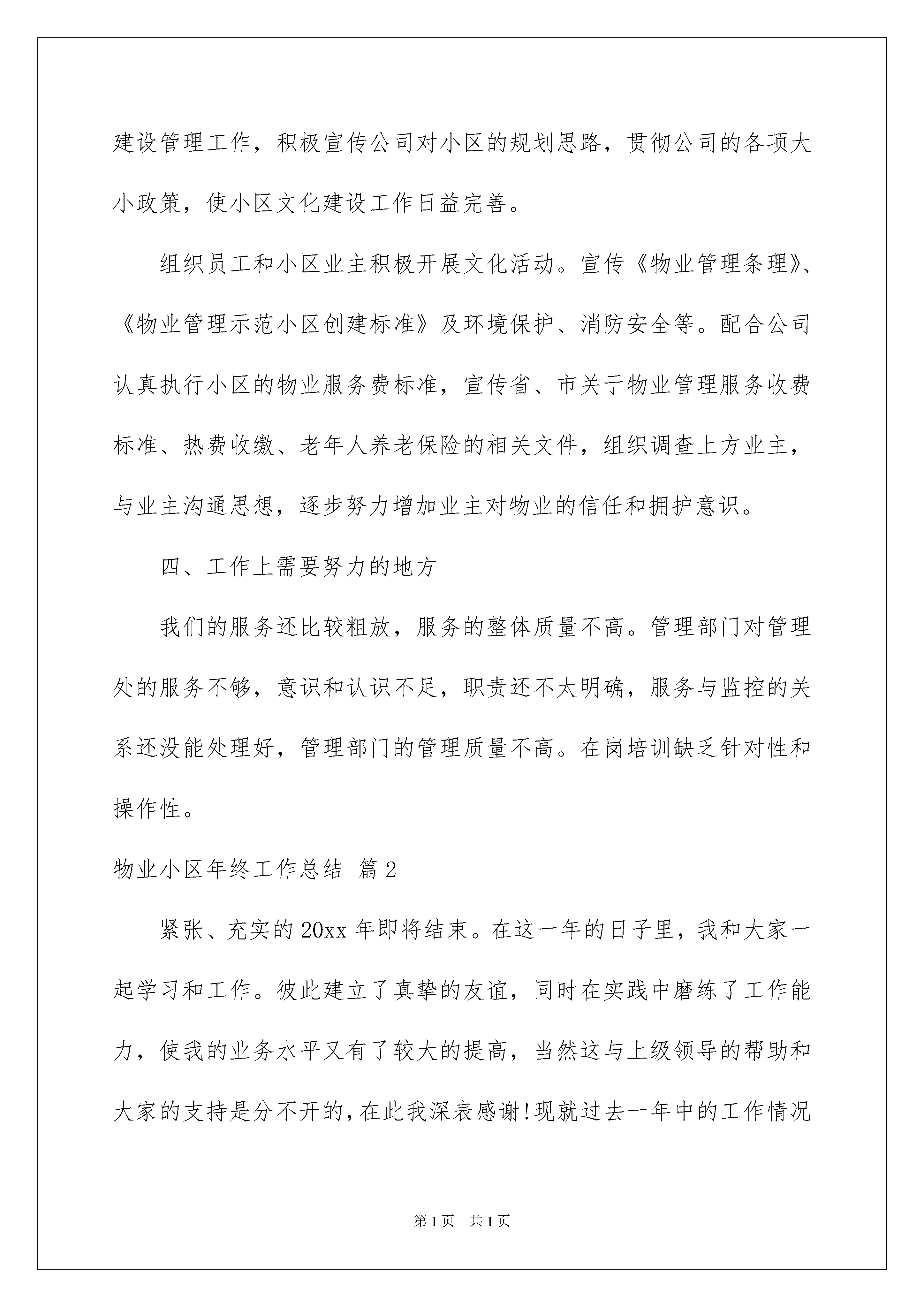 2022物业小区年终工作总结锦集5篇物业小区年终工作总结锦集5篇总结是事后对某一阶段的学习或工作情况作加以回顾检查并分析评价的书面材料,它可以给我们下一阶段的学习和工作生活做指导,为此我们要做好回顾,写好总结。总结一般是怎么写的呢?以下是我为大家整理的物业小区年终工作总结5篇,欢迎大家借鉴与参考,希望对大家有所帮助。物业小区年终工作总结篇1回顾今年的工作,我们对今年以来支持、帮助和积极配合我们xx街小区物业办公室工作的领导同事表示衷心的感谢!现将我们xx街小区物业一年来所做的工作做如下总结:一、规范办公室内务管理修改、完善了文件处理、会议组织、档案资料、装修管理以及检查、监督、考评、奖惩等制度。小区物业办内务管理工作基本达到程序化、规范化。办公室每月按照公司的要求将每月的工作总结和工作计划都按时上交公司,并月底归档,以备今后查阅。小区部分图纸目录已全部建立完毕。办公室全力以赴配合协调各部门的工作,例如收费、保安、保洁、绿化等各项工作。办公物品、保洁物品实行了统一按需分配。严格按照公司资产管理制度,做到了资产管理帐实相符。依据公司规定,并结合xx街小区的实际,创造性的开展保安、保洁、办公室人员培训工作,尝试了挂职培训制度,各类培训日常化、正常化。通过各管理经营责任制,人力成本得到了积极有效的控制,各类办公费用实行定量管理,有效的控制了办公成本。二、参谋决策,积极推进机构、体制改革今年来,积极推进经营管理责任制和绩效考核激励机制工作。根据物业状况和特点,协调保安、保洁岗位工作参差不齐,对保安、保洁岗位通过同经理、副经理商讨进行了调整和完善,突出了管理处在物业日常管理中的主导作用,完善和优化管理处的组织结构和管理体系。使管理处的物业管理工作更加顺畅有序。三、加强小区文化建设加强对xx企业品牌宣传推广。今年来,我通过各种宣传手段节假日在小区门口悬挂横幅,完善宣传栏,张贴海报,参与帝都花园社区建设管理工作,积极宣传公司对小区的规划思路,贯彻公司的各项大小政策,使小区文化建设工作日益完善。组织员工和小区业主积极开展文化活动。宣传《物业管理条理》、《物业管理示范小区创建标准》及环境保护、消防安全等。配合公司认真执行小区的物业服务费标准,宣传省、市关于物业管理服务收费标准、热费收缴、老年人养老保险的相关文件,组织调查上方业主,与业主沟通思想,逐步努力增加业主对物业的信任和拥护意识。四、工作上需要努力的地方我们的服务还比较粗放,服务的整体质量不高。管理部门对管理处的服务不够,意识和认识不足,职责还不太明确,服务与监控的关系还没能处理好,管理部门的管理质量不高。在岗培训缺乏针对性和操作性。物业小区年终工作总结篇2紧张、充实的20xx年即将结束。在这一年的日子里,我和大家一起学习和工作。彼此建立了真挚的友谊,同时在实践中磨练了工作能力,使我的业务水平又有了较大的提高,当然这与上级领导的帮助和大家的支持是分不开的,在此我深表感谢!现就过去一年中的工作情况汇报如下:一、20xx年共查抄水电表11次,共计查抄水、电表1010块(电表64块、水表54块)。二、发放房租、水电费、保险费、电梯维保费等缴费通知单450余张。三、20xx年收取各项费用共计(见收费统计表)。1.水费:共收取饮用水23167元,自备井水25474元,共计48641元。付饮用水74515.90元(含20xx年水费44876.29元)。公共区域用水综合楼三层(57吨)、四层(125吨)、东楼(279吨)共计:461吨。2.电费:共收取1250497.49元(含拔丝厂)。付供电局电费1332986.97元。亏电费82489.48元。主要原因电价上调,收租户电价没有上调和今年7月以后车间租户退租(鎏金、中包、航天、百世中恒)的影响。3.20xx年房租收入比20xx年减少1662352元。主要原因华力通20xx年房租未付,大车退租(为了服从股份社改造车间规划,不是我们造成的)。4.供暖费:华力通、东通20xx年至20xx年季供暖费50%未付,20xx年至20xx年季供暖费全额未付。客观的说有华力通、东通的原因,也有咱们自身的原因。其他单位已付清。5.其他收入:洗车费300元。处理废品:9915元。四、20xx年接收新签合同和续签合同共14份并按规定办理了交接手续。五、20xx年办理合同终止24份,并按规定办理了接收手续和清算手续。共退还房租押金:362395元。六、未出租厂房20xx(双层)。未出租办公室及宿舍51间(综合楼21间、东楼8间、彩钢9间、锅炉房东侧平房13间)。七、应收取20xx年工业小区施工使用我厂房屋及用水、用电、采暖费