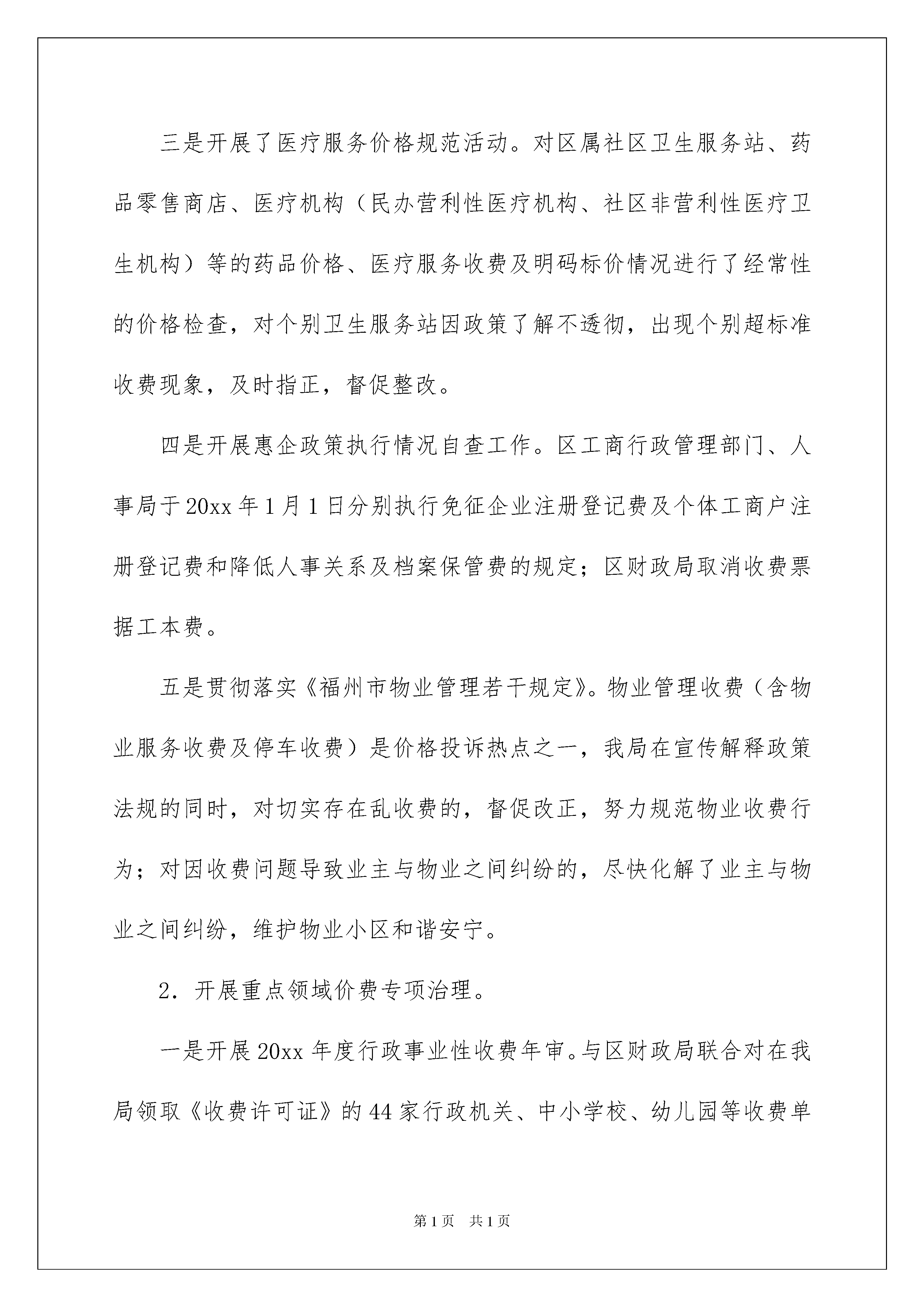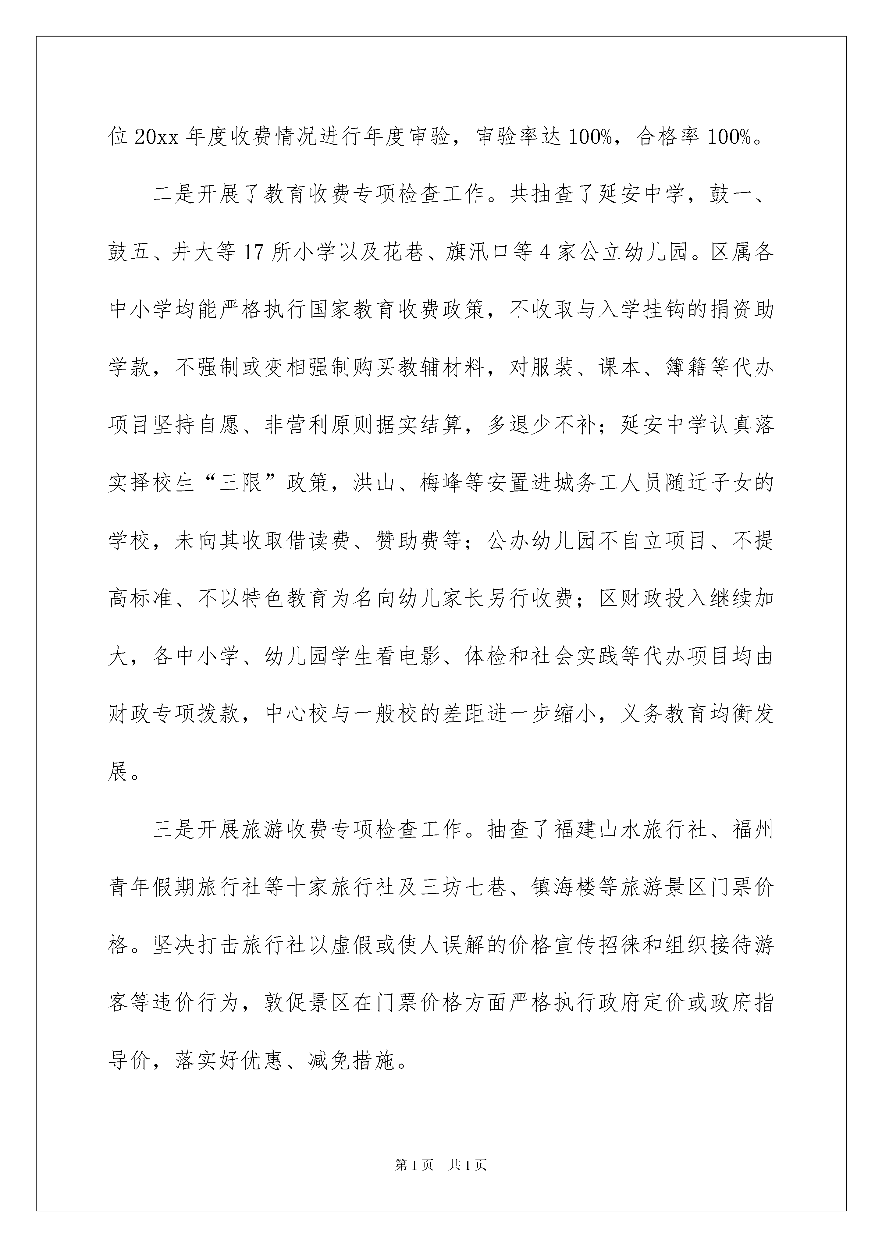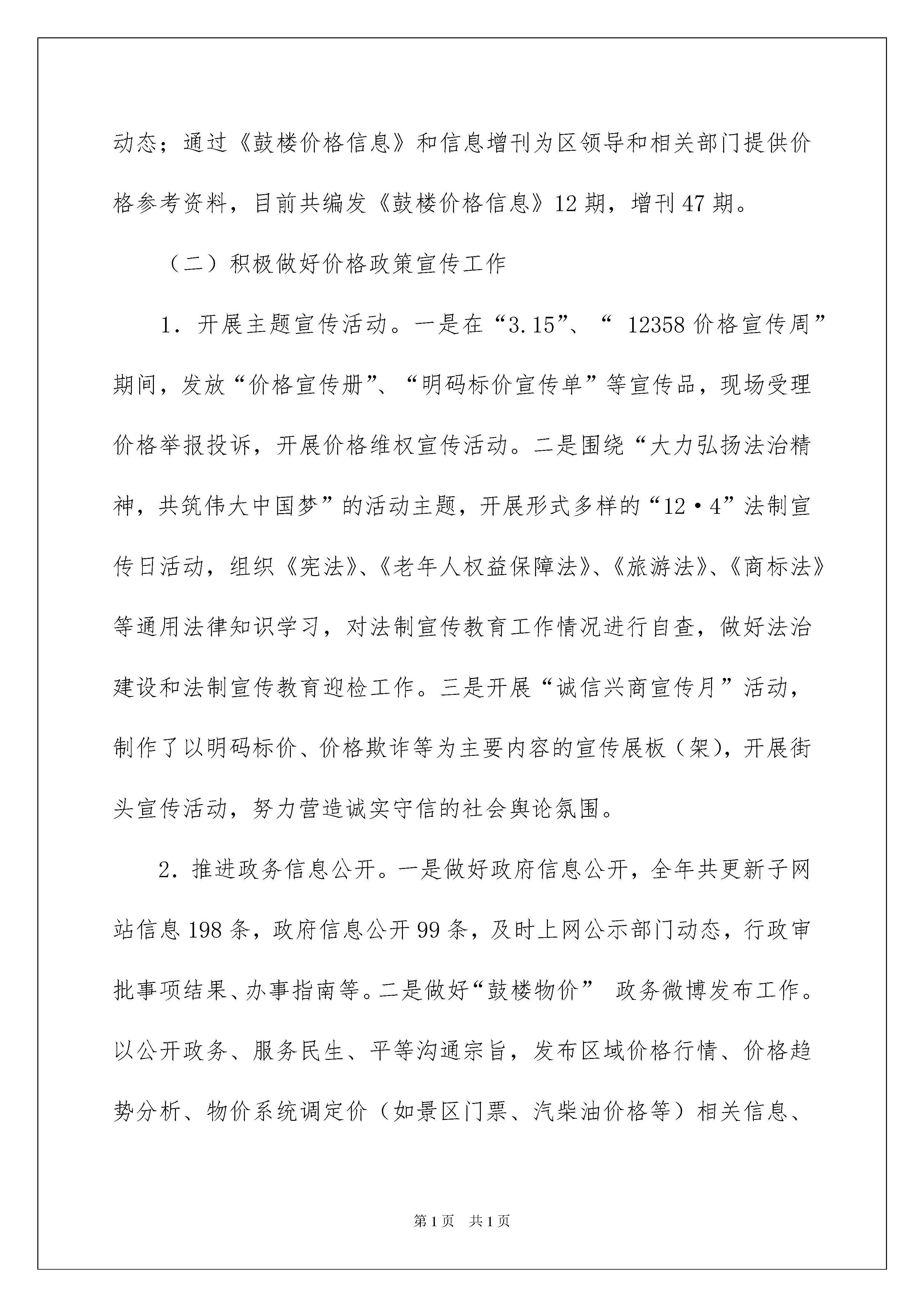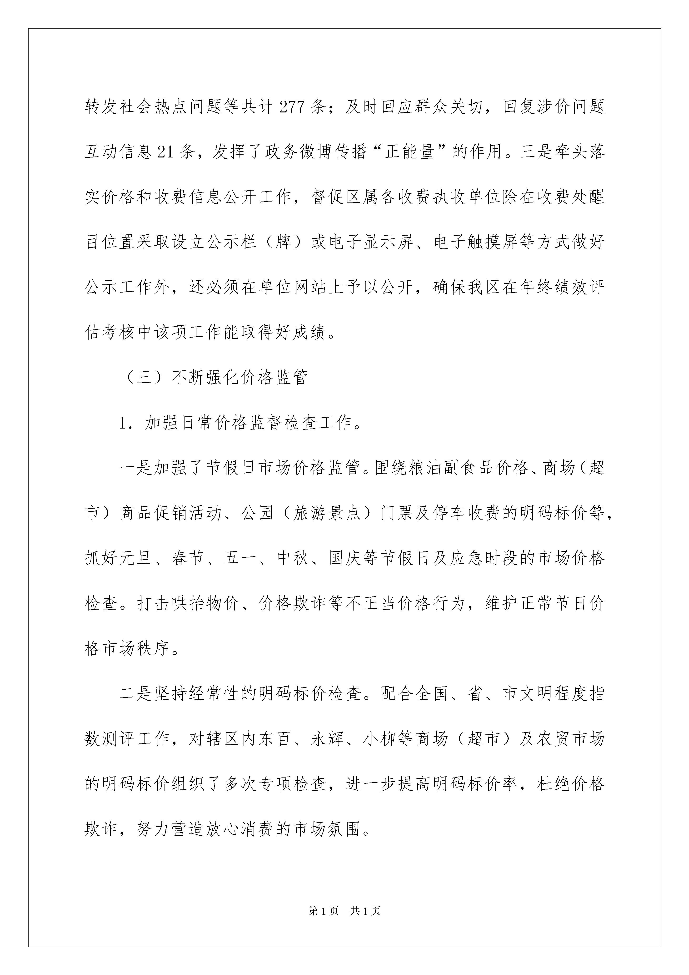 2022物价局年终工作总结集合九篇物价局年终工作总结集合九篇总结就是把一个时段的学习、工作或其完成情况进行一次全面系统的总结,他能够提升我们的书面表达能力,我想我们需要写一份总结了吧。你所见过的总结应该是什么样的?下面是我为大家收集的物价局年终工作总结9篇,欢迎阅读与收藏。物价局年终工作总结篇120xx年我局认真贯彻区委、区政府各项决策部署,着力强化价格监管,努力为建设美丽鼓楼、实力鼓楼、幸福鼓楼营造有利的价格环境和提供坚实的价格服务保障。现将20xx年价格工作情况及20xx年工作思路报告如下:一、20xx年工作情况总结(一)持续做好市场价格监测预警工作贯彻落实好省、市控价工作部署,坚持生活必需品价格监测常态化,每周对6个固定监测点的8大类61种商品价格进行采集、分析,重点关注容易诱发价格总水平较快上涨和社会不稳定因素的商品价格动态;通过《鼓楼价格信息》和信息增刊为区领导和相关部门提供价格参考资料,目前共编发《鼓楼价格信息》12期,增刊47期。(二)积极做好价格政策宣传工作1.开展主题宣传活动。一是在“3.15”、“12358价格宣传周”期间,发放“价格宣传册”、“明码标价宣传单”等宣传品,现场受理价格举报投诉,开展价格维权宣传活动。二是围绕“大力弘扬法治精神,共筑伟大中国梦”的活动主题,开展形式多样的“12·4”法制宣传日活动,组织《宪法》、《老年人权益保障法》、《旅游法》、《商标法》等通用法律知识学习,对法制宣传教育工作情况进行自查,做好法治建设和法制宣传教育迎检工作。三是开展“诚信兴商宣传月”活动,制作了以明码标价、价格欺诈等为主要内容的宣传展板(架),开展街头宣传活动,努力营造诚实守信的社会舆论氛围。2.推进政务信息公开。一是做好政府信息公开,全年共更新子网站信息198条,政府信息公开99条,及时上网公示部门动态,行政审批事项结果、办事指南等。二是做好“鼓楼物价”政务微博发布工作。以公开政务、服务民生、平等沟通宗旨,发布区域价格行情、价格趋势分析、物价系统调定价(如景区门票、汽柴油价格等)相关信息、转发社会热点问题等共计277条;及时回应群众关切,回复涉价问题互动信息21条,发挥了政务微博传播“正能量”的作用。三是牵头落实价格和收费信息公开工作,督促区属各收费执收单位除在收费处醒目位置采取设立公示栏(牌)或电子显示屏、电子触摸屏等方式做好公示工作外,还必须在单位网站上予以公开,确保我区在年终绩效评估考核中该项工作能取得好成绩。(三)不断强化价格监管1.加强日常价格监督检查工作。一是加强了节假日市场价格监管。围绕粮油副食品价格、商场(超市)商品促销活动、公园(旅游景点)门票及停车收费的明码标价等,抓好元旦、春节、五一、中秋、国庆等节假日及应急时段的市场价格检查。打击哄抬物价、价格欺诈等不正当价格行为,维护正常节日价格市场秩序。二是坚持经常性的明码标价检查。配合全国、省、市文明程度指数测评工作,对辖区内东百、永辉、小柳等商场(超市)及农贸市场的明码标价组织了多次专项检查,进一步提高明码标价率,杜绝价格欺诈,努力营造放心消费的市场氛围。三是开展了医疗服务价格规范活动。对区属社区卫生服务站、药品零售商店、医疗机构(民办营利性医疗机构、社区非营利性医疗卫生机构)等的药品价格、医疗服务收费及明码标价情况进行了经常性的价格检查,对个别卫生服务站因政策了解不透彻,出现个别超标准收费现象,及时指正,督促整改。四是开展惠企政策执行情况自查工作。区工商行政管理部门、人事局于20xx年1月1日分别执行免征企业注册登记费及个体工商户注册登记费和降低人事关系及档案保管费的规定;区财政局取消收费票据工本费。五是贯彻落实《福州市物业管理若干规定》。物业管理收费(含物业服务收费及停车收费)是价格投诉热点之一,我局在宣传解释政策法规的同时,对切实存在乱收费的,督促改正,努力规范物业收费行为;对因收费问题导致业主与物业之间纠纷的,尽快化解了业主与物业之间纠纷,维护物业小区和谐安宁。2.开展重点领域价费专项治理。一是开展20xx年度行政事业性收费年审。与区财政局联合对在我局领取《收费许可证》的44家行政机关、中小学校、幼儿园等收费单位20xx年度收费情况进行年度审验,审验率达100%,合格率100%。二是开展了教育收费专项检查工作。共抽查了延安中学,鼓一、鼓五、井大等17所小学以及花巷、旗汛口等4家公立幼儿园。区属各中小学均能严格执行国家教育收费政策,不收取与入学挂钩的捐资助学款,不强制或变相强制购买教辅材料,对服装、课本、簿籍等代办项目坚持自愿、非营利原则据实结算,多退少不补;延安中学认真落实择校生“