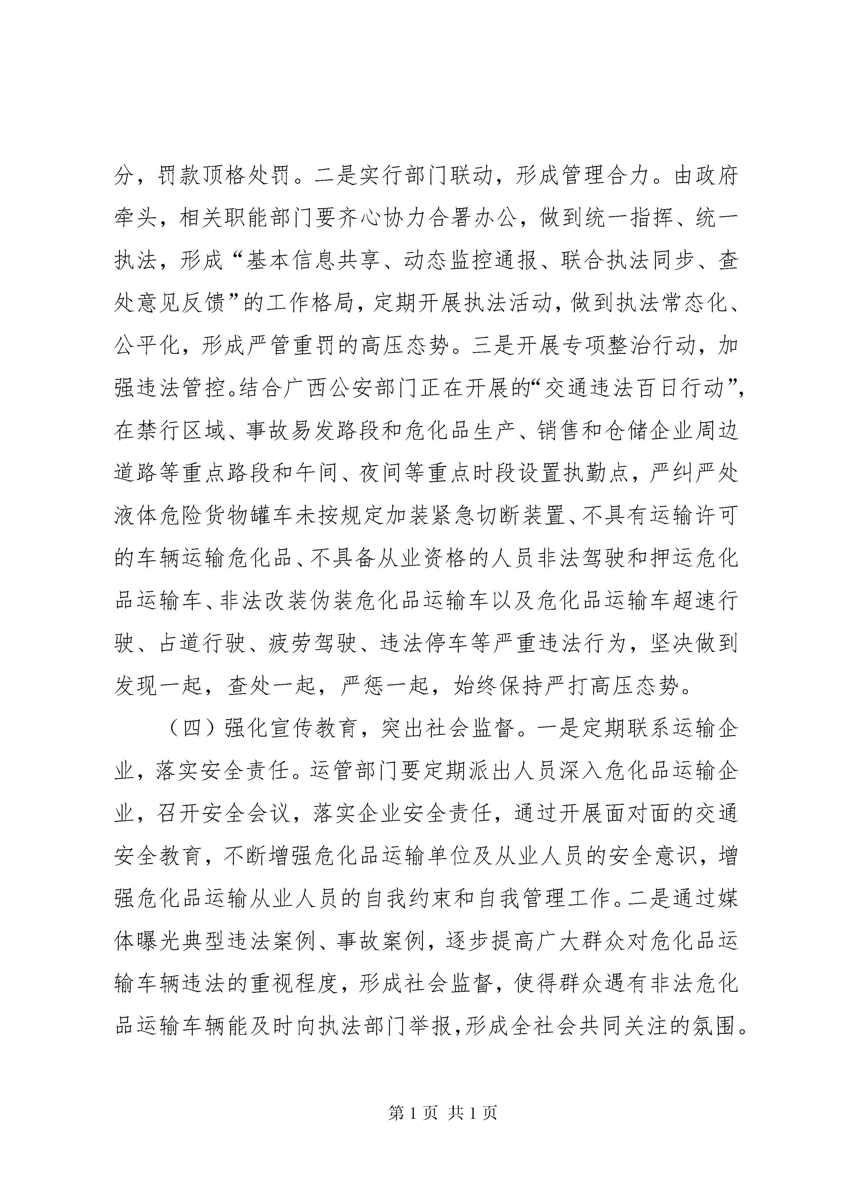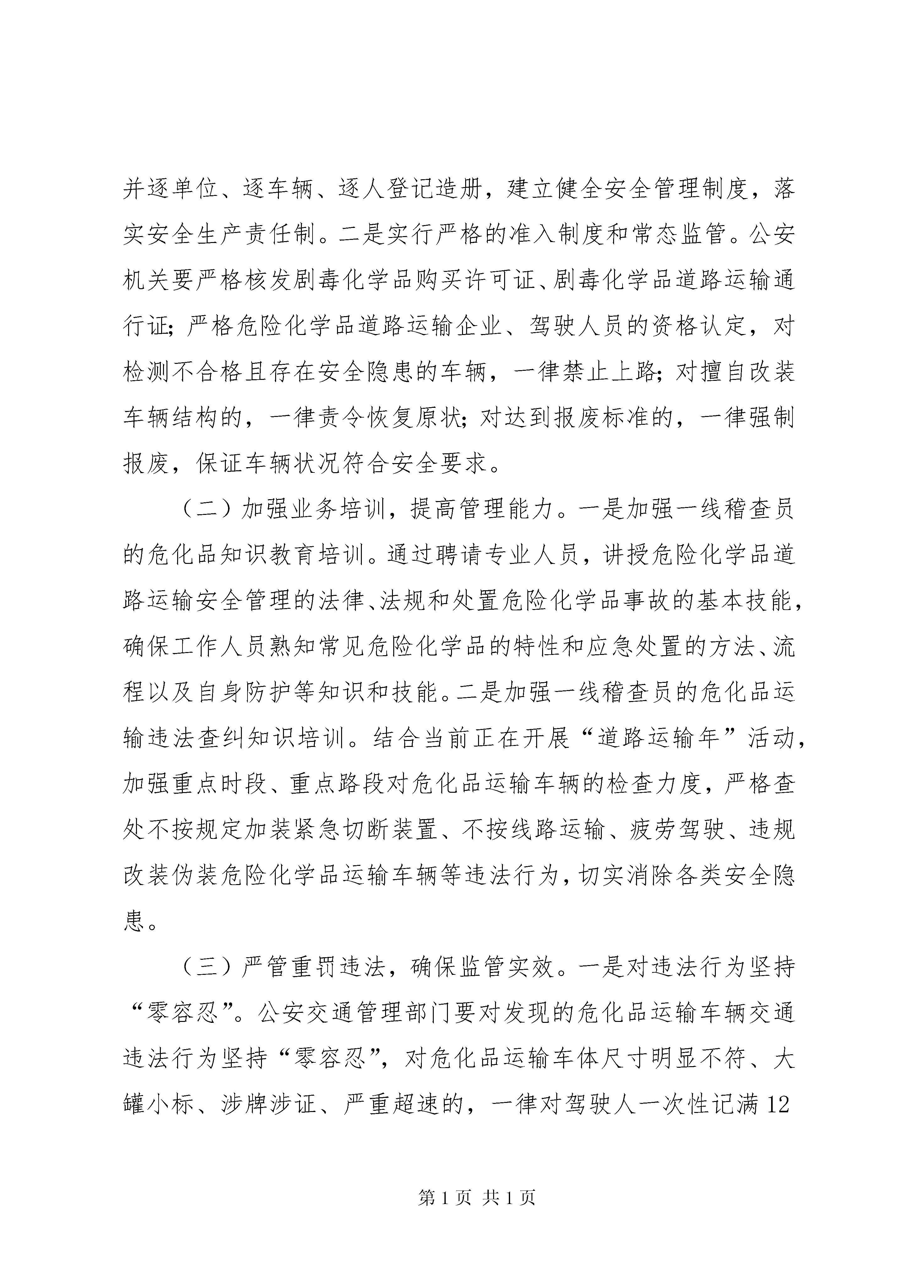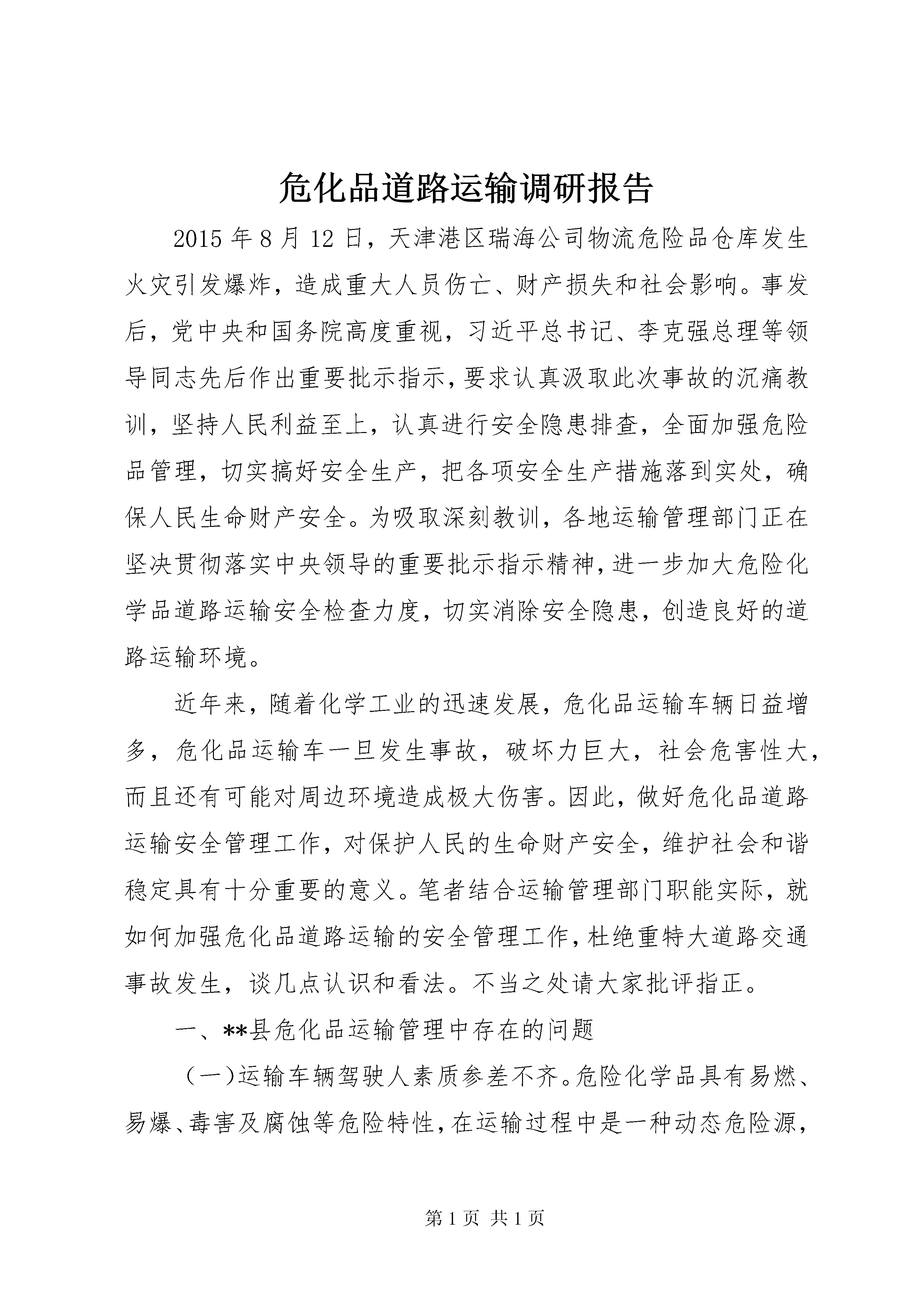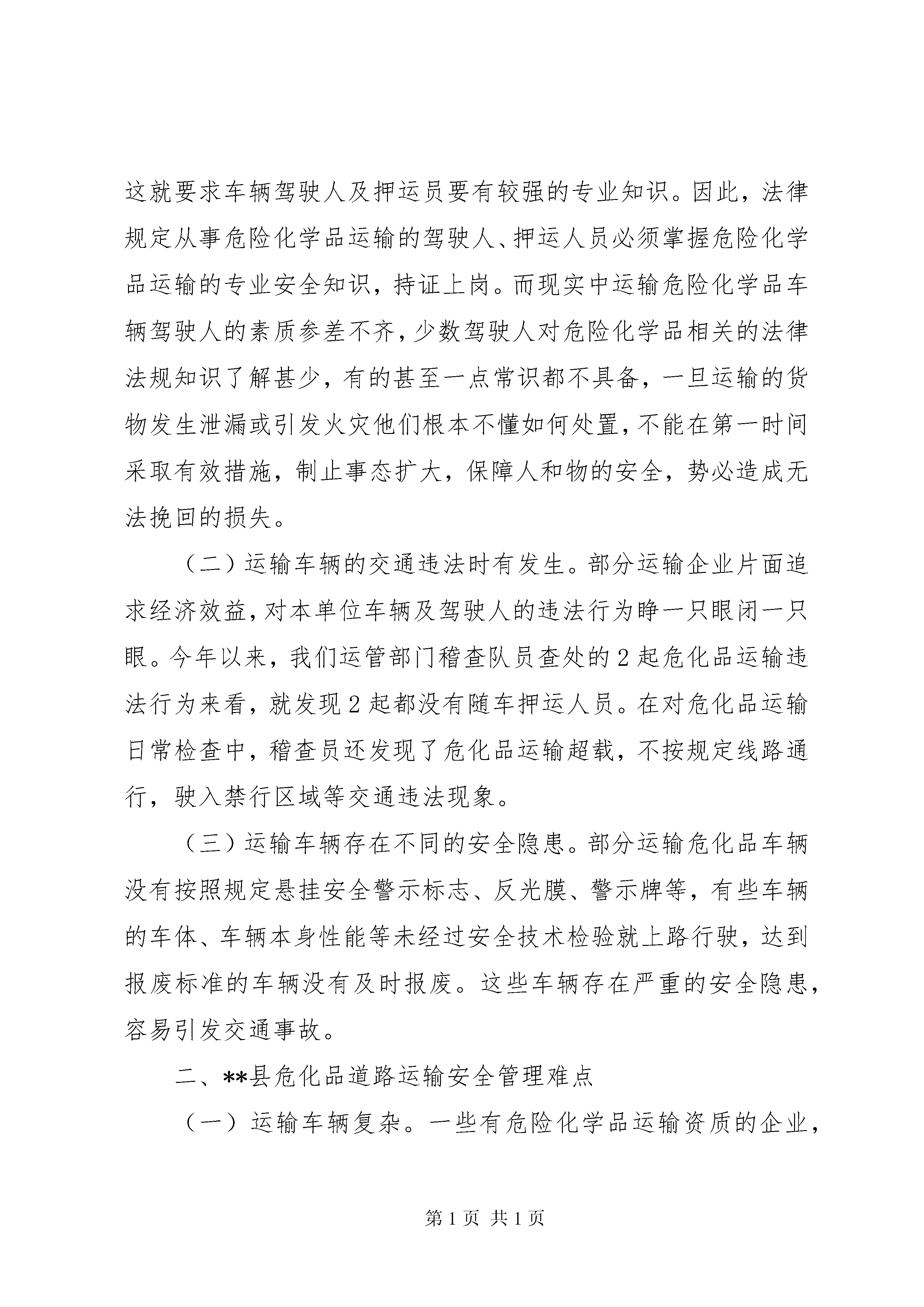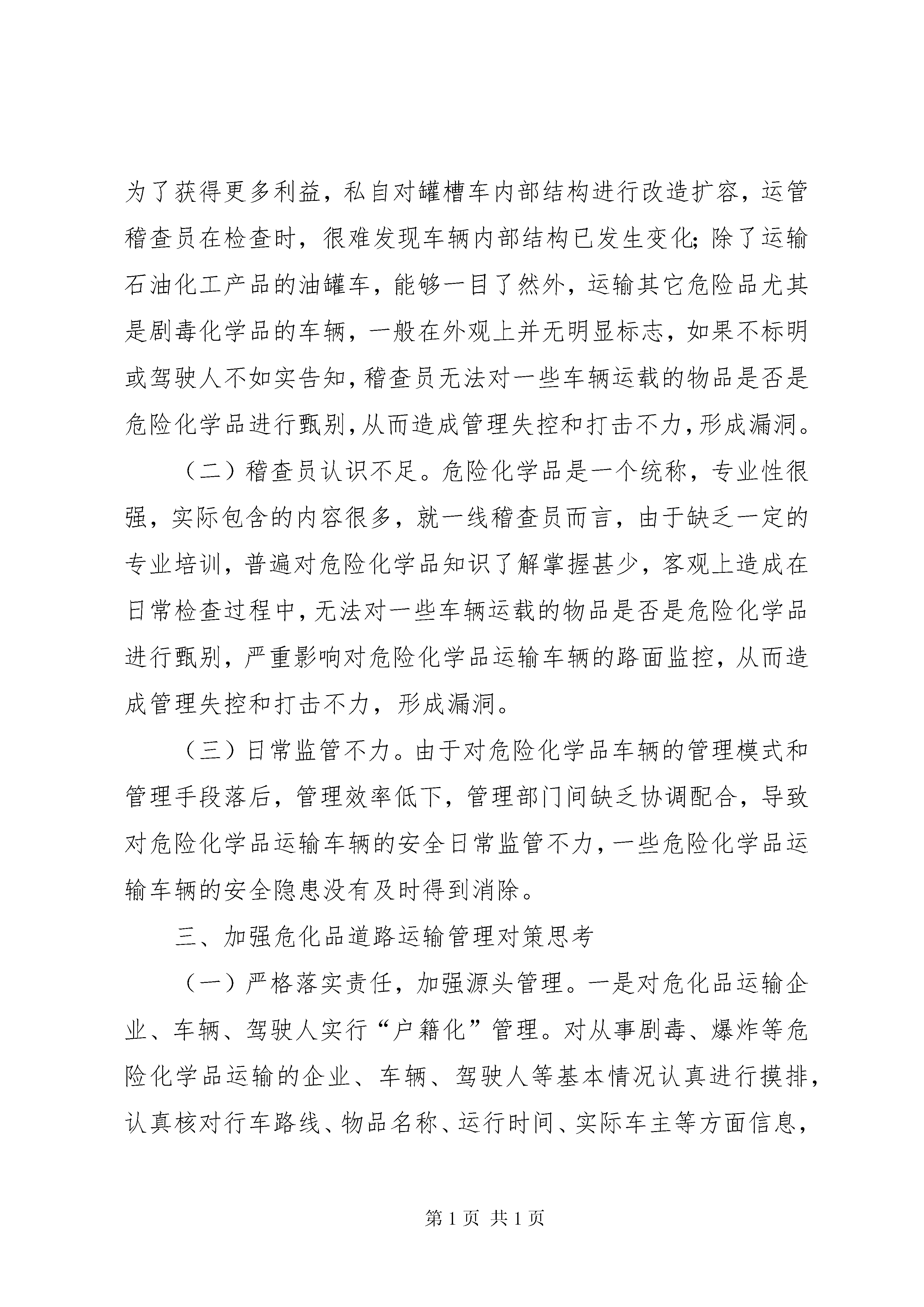危化品道路运输调研报告2015年8月12日,天津港区瑞海公司物流危险品仓库发生火灾引发爆炸,造成重大人员伤亡、财产损失和社会影响。事发后,党中央和国务院高度重视,习近平总书记、李克强总理等领导同志先后作出重要批示指示,要求认真汲取此次事故的沉痛教训,坚持人民利益至上,认真进行安全隐患排查,全面加强危险品管理,切实搞好安全生产,把各项安全生产措施落到实处,确保人民生命财产安全。为吸取深刻教训,各地运输管理部门正在坚决贯彻落实中央领导的重要批示指示精神,进一步加大危险化学品道路运输安全检查力度,切实消除安全隐患,创造良好的道路运输环境。近年来,随着化学工业的迅速发展,危化品运输车辆日益增多,危化品运输车一旦发生事故,破坏力巨大,社会危害性大,而且还有可能对周边环境造成极大伤害。因此,做好危化品道路运输安全管理工作,对保护人民的生命财产安全,维护社会和谐稳定具有十分重要的意义。笔者结合运输管理部门职能实际,就如何加强危化品道路运输的安全管理工作,杜绝重特大道路交通事故发生,谈几点认识和看法。不当之处请大家批评指正。一、**县危化品运输管理中存在的问题(一)运输车辆驾驶人素质参差不齐。危险化学品具有易燃、易爆、毒害及腐蚀等危险特性,在运输过程中是一种动态危险源,这就要求车辆驾驶人及押运员要有较强的专业知识。因此,法律规定从事危险化学品运输的驾驶人、押运人员必须掌握危险化学品运输的专业安全知识,持证上岗。而现实中运输危险化学品车辆驾驶人的素质参差不齐,少数驾驶人对危险化学品相关的法律法规知识了解甚少,有的甚至一点常识都不具备,一旦运输的货物发生泄漏或引发火灾他们根本不懂如何处置,不能在第一时间采取有效措施,制止事态扩大,保障人和物的安全,势必造成无法挽回的损失。(二)运输车辆的交通违法时有发生。部分运输企业片面追求经济效益,对本单位车辆及驾驶人的违法行为睁一只眼闭一只眼。今年以来,我们运管部门稽查队员查处的2起危化品运输违法行为来看,就发现2起都没有随车押运人员。在对危化品运输日常检查中,稽查员还发现了危化品运输超载,不按规定线路通行,驶入禁行区域等交通违法现象。(三)运输车辆存在不同的安全隐患。部分运输危化品车辆没有按照规定悬挂安全警示标志、反光膜、警示牌等,有些车辆的车体、车辆本身性能等未经过安全技术检验就上路行驶,达到报废标准的车辆没有及时报废。这些车辆存在严重的安全隐患,容易引发交通事故。二、**县危化品道路运输安全管理难点(一)运输车辆复杂。一些有危险化学品运输资质的企业,为了获得更多利益,私自对罐槽车内部结构进行改造扩容,运管稽查员在检查时,很难发现车辆内部结构已发生变化;除了运输石油化工产品的油罐车,能够一目了然外,运输其它危险品尤其是剧毒化学品的车辆,一般在外观上并无明显标志,如果不标明或驾驶人不如实告知,稽查员无法对一些车辆运载的物品是否是危险化学品进行甄别,从而造成管理失控和打击不力,形成漏洞。(二)稽查员认识不足。危险化学品是一个统称,专业性很强,实际包含的内容很多,就一线稽查员而言,由于缺乏一定的专业培训,普遍对危险化学品知识了解掌握甚少,客观上造成在日常检查过程中,无法对一些车辆运载的物品是否是危险化学品进行甄别,严重影响对危险化学品运输车辆的路面监控,从而造成管理失控和打击不力,形成漏洞。(三)日常监管不力。由于对危险化学品车辆的管理模式和管理手段落后,管理效率低下,管理部门间缺乏协调配合,导致对危险化学品运输车辆的安全日常监管不力,一些危险化学品运输车辆的安全隐患没有及时得到消除。三、加强危化品道路运输管理对策思考(一)严格落实责任,加强源头管理。一是对危化品运输企业、车辆、驾驶人实行“户籍化”管理。对从事剧毒、爆炸等危险化学品运输的企业、车辆、驾驶人等基本情况认真进行摸排,认真核对行车路线、物品名称、运行时间、实际车主等方面信息,并逐单位、逐车辆、逐人登记造册,建立健全安全管理制度,落实安全生产责任制。二是实行严格的准入制度和常态监管。公安机关要严格核发剧毒化学品购买许可证、剧毒化学品道路运输通行证;严格危险化学品道路运输企业、驾驶人员的资格认定,对检测不合格且存在安全隐患的车辆,一律禁止上路;对擅自改装车辆结构的,一律责令恢复原状;对达到报废标准的,一律强制报废,保证车辆状况符合安全要求。(二)加强业务培训,提高管理能力。一是加强一线稽查员的危化品知识教育培训。通过聘请专业人员,讲授危险化学品道路运输安全管理的法律、法规和处置危险化学品事故的基本技能,确保工作人员熟知常见危险化学品的特性和应急处置的方法、流程以及自身防护等知识和技能。二是加强一线稽查员的危化品运输违法查纠知识培训。结合当前正在开展“道路运输年”活动,加强重点时段、重点路段对危化品运输车辆的检查力度,严格查处不按
