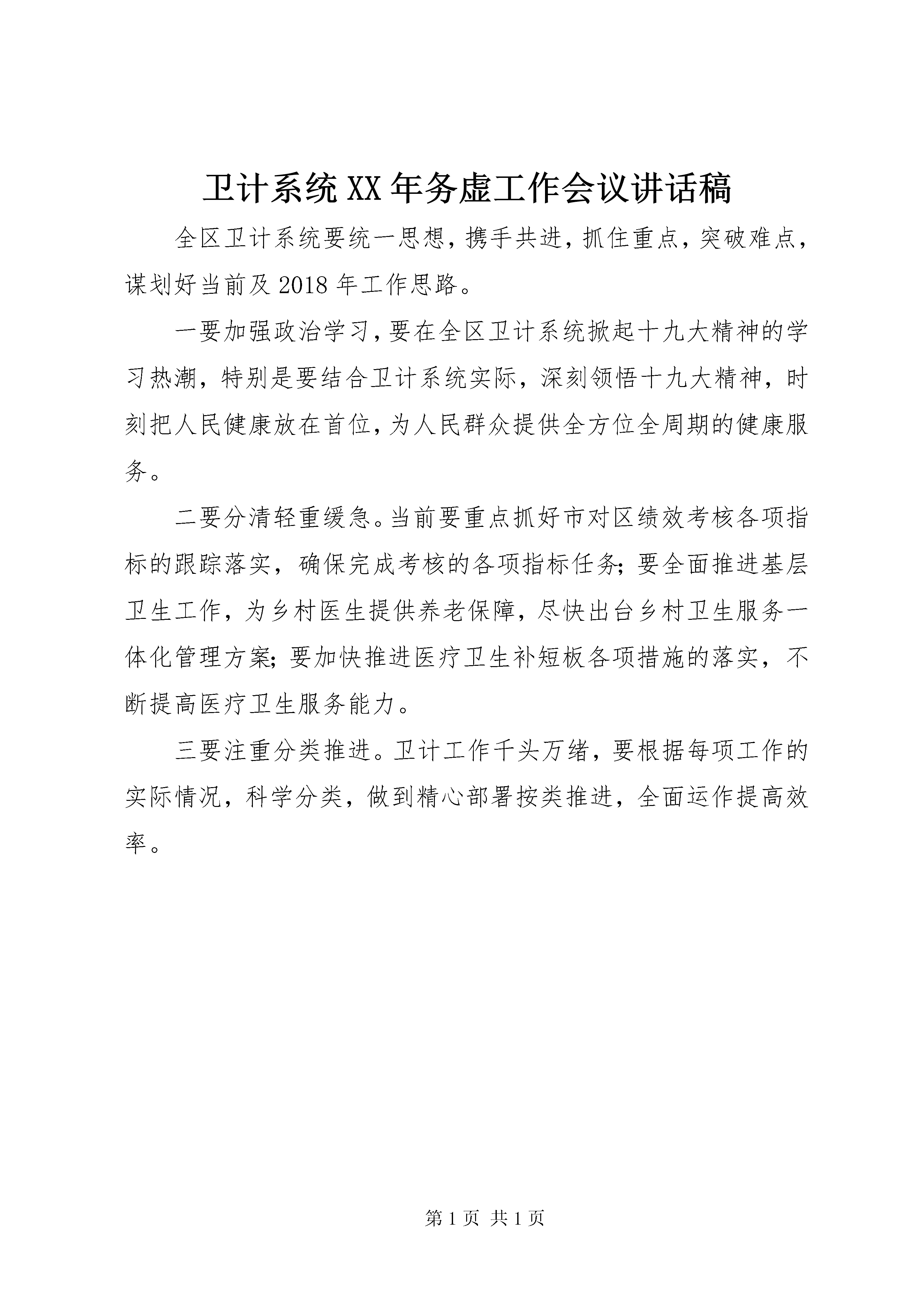 卫计系统XX年务虚工作会议讲话稿全区卫计系统要统一思想,携手共进,抓住重点,突破难点,谋划好当前及2018年工作思路。一要加强政治学习,要在全区卫计系统掀起十九大精神的学习热潮,特别是要结合卫计系统实际,深刻领悟十九大精神,时刻把人民健康放在首位,为人民群众提供全方位全周期的健康服务。二要分清轻重缓急。当前要重点抓好市对区绩效考核各项指标的跟踪落实,确保完成考核的各项指标任务;要全面推进基层卫生工作,为乡村医生提供养老保障,尽快出台乡村卫生服务一体化管理方案;要加快推进医疗卫生补短板各项措施的落实,不断提高医疗卫生服务能力。三要注重分类推进。卫计工作千头万绪,要根据每项工作的实际情况,科学分类,做到精心部署按类推进,全面运作提高效率。