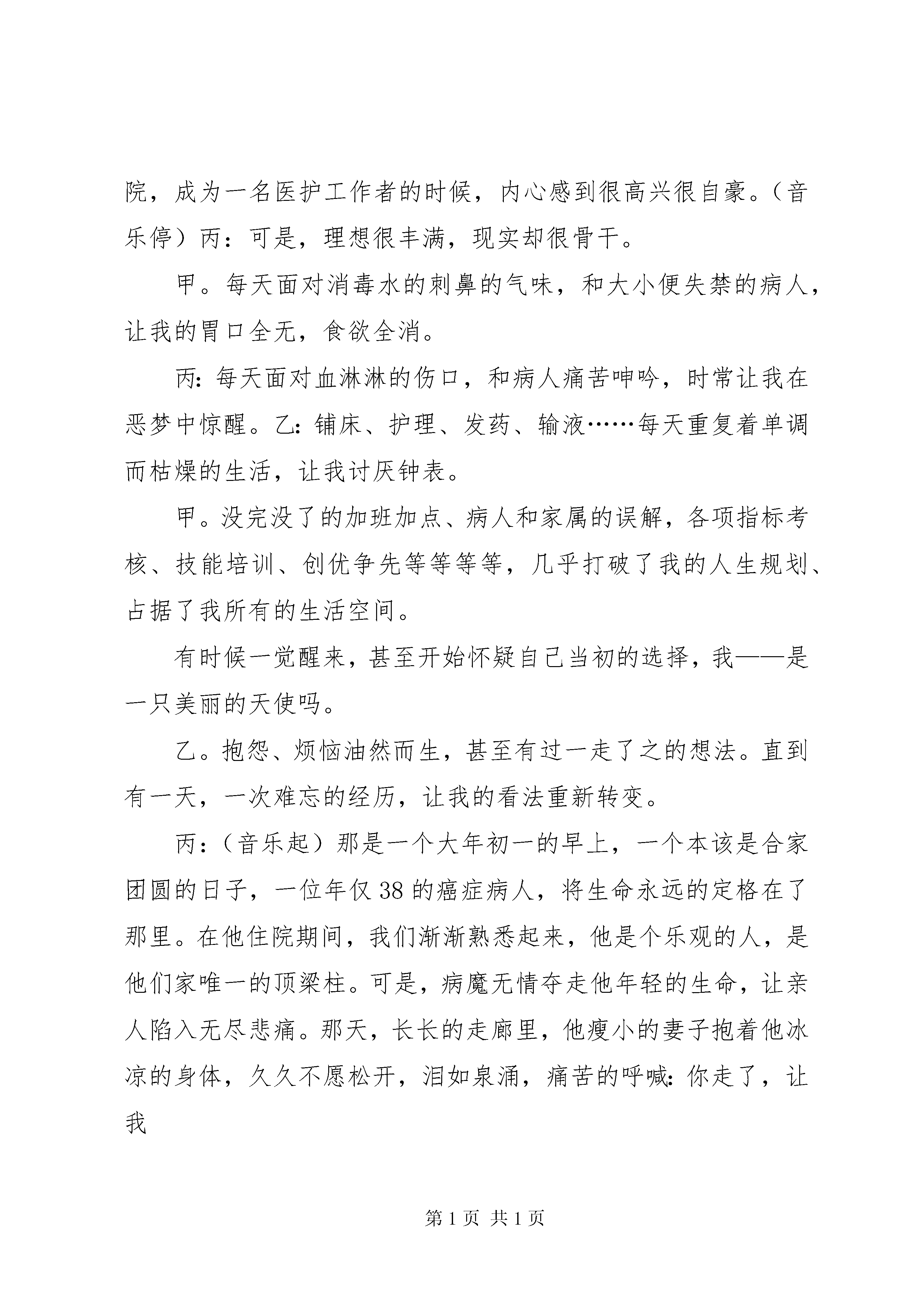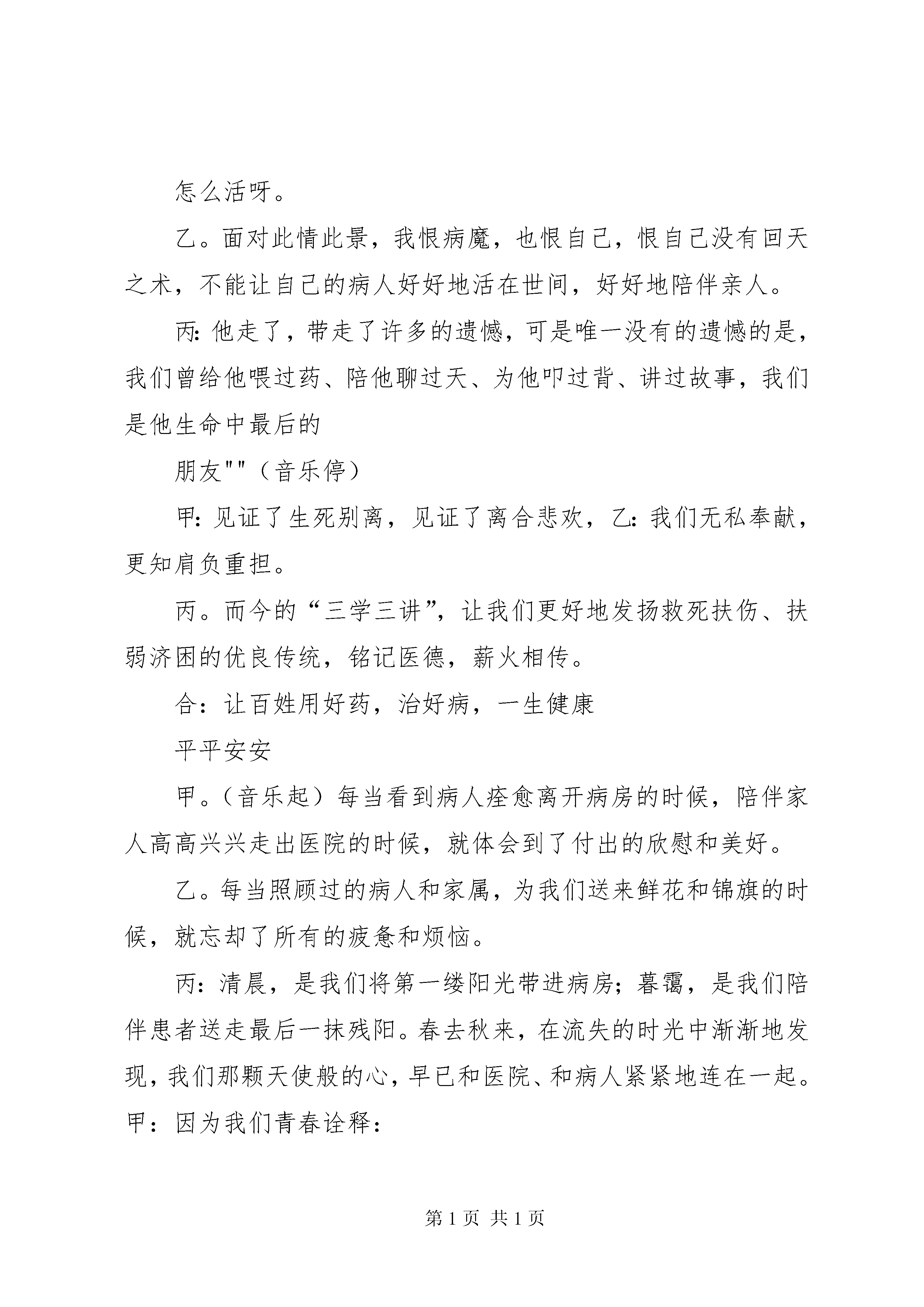卫计系统两学一做演讲稿三人组合演讲奉献与幸福撰稿:陈红耀丙:各位评委乙:各位同事合:大家上午好。甲:生命一去不覆来乙:健康相随永不衰丙:长阪雄风今何在。合:妙手回春最精彩。甲:我叫郑佳佳乙:我叫詹梦琦丙:我叫刘苗苗丙:我们来自长阪坡医院,今天演讲的题目是合:奉献与幸福。(音乐起)丙:有人问,幸福是什么。也许会有千万个不同的答案。乙:有人说,幸福是花前月下,恋人相拥的温柔。丙:有人说,幸福是久别重逢,细语倾诉的温馨。甲:有人说,幸福是财富充裕,一掷千金的豪情。乙:作为医护工作者的我们,却对幸福有着全新的、不同的认识。丙:记得在我7七岁的时候,爷爷生病了,有一位叫陈自芳的乡村医生,经常到家里为爷爷治病,她洁白的白大褂,忙碌的身影,深深地印在我的脑海里。在她精心治疗下,爷爷终于能够下地干活了,爷爷说陈医生是从上天下凡的天使,能让人起死回生,长命百岁,我信了爷爷的话,心里暗下决心,长大了我也当一名白衣天使。甲:这个梦想终于如愿以偿,当我从医科大学毕业,走进医院,成为一名医护工作者的时候,内心感到很高兴很自豪。(音乐停)丙:可是,理想很丰满,现实却很骨干。甲。每天面对消毒水的刺鼻的气味,和大小便失禁的病人,让我的胃口全无,食欲全消。丙:每天面对血淋淋的伤口,和病人痛苦呻吟,时常让我在恶梦中惊醒。乙:铺床、护理、发药、输液……每天重复着单调而枯燥的生活,让我讨厌钟表。甲。没完没了的加班加点、病人和家属的误解,各项指标考核、技能培训、创优争先等等等等,几乎打破了我的人生规划、占据了我所有的生活空间。有时候一觉醒来,甚至开始怀疑自己当初的选择,我——是一只美丽的天使吗。乙。抱怨、烦恼油然而生,甚至有过一走了之的想法。直到有一天,一次难忘的经历,让我的看法重新转变。丙:(音乐起)那是一个大年初一的早上,一个本该是合家团圆的日子,一位年仅38的癌症病人,将生命永远的定格在了那里。在他住院期间,我们渐渐熟悉起来,他是个乐观的人,是他们家唯一的顶梁柱。可是,病魔无情夺走他年轻的生命,让亲人陷入无尽悲痛。那天,长长的走廊里,他瘦小的妻子抱着他冰凉的身体,久久不愿松开,泪如泉涌,痛苦的呼喊:你走了,让我怎么活呀。乙。面对此情此景,我恨病魔,也恨自己,恨自己没有回天之术,不能让自己的病人好好地活在世间,好好地陪伴亲人。丙:他走了,带走了许多的遗憾,可是唯一没有的遗憾的是,我们曾给他喂过药、陪他聊过天、为他叩过背、讲过故事,我们是他生命中最后的朋友""(音乐停)甲:见证了生死别离,见证了离合悲欢,乙:我们无私奉献,更知肩负重担。丙。而今的“三学三讲”,让我们更好地发扬救死扶伤、扶弱济困的优良传统,铭记医德,薪火相传。合:让百姓用好药,治好病,一生健康平平安安甲。(音乐起)每当看到病人痊愈离开病房的时候,陪伴家人高高兴兴走出医院的时候,就体会到了付出的欣慰和美好。乙。每当照顾过的病人和家属,为我们送来鲜花和锦旗的时候,就忘却了所有的疲惫和烦恼。丙:清晨,是我们将第一缕阳光带进病房;暮霭,是我们陪伴患者送走最后一抹残阳。春去秋来,在流失的时光中渐渐地发现,我们那颗天使般的心,早已和医院、和病人紧紧地连在一起。甲:因为我们青春诠释:合:你幸福我奉献,你健康我快乐。合:谢谢大家。