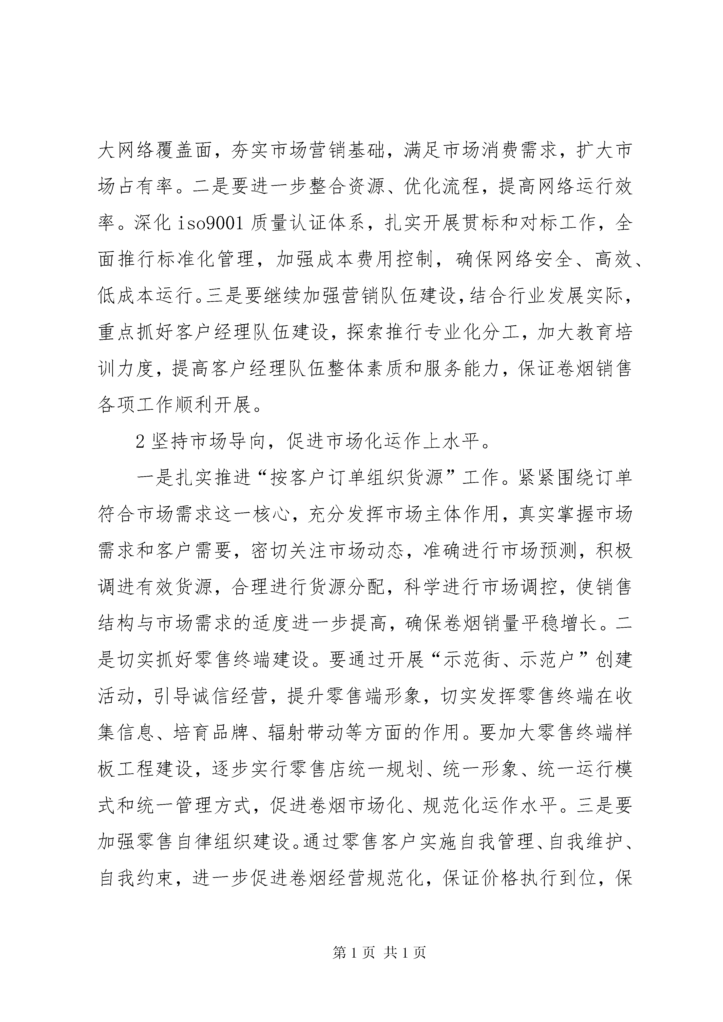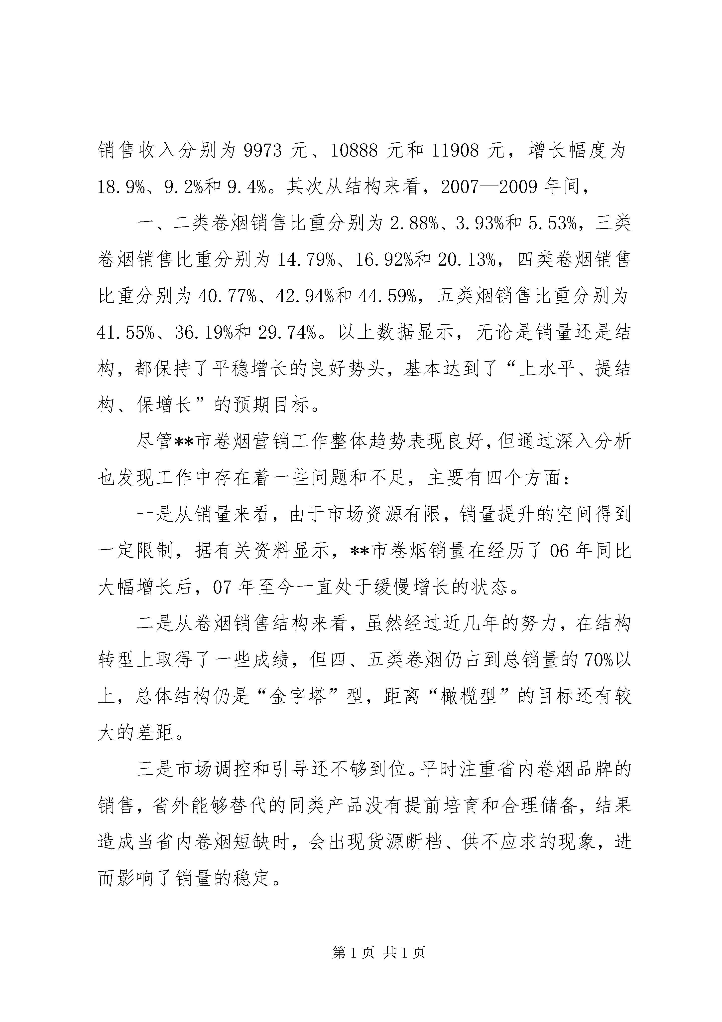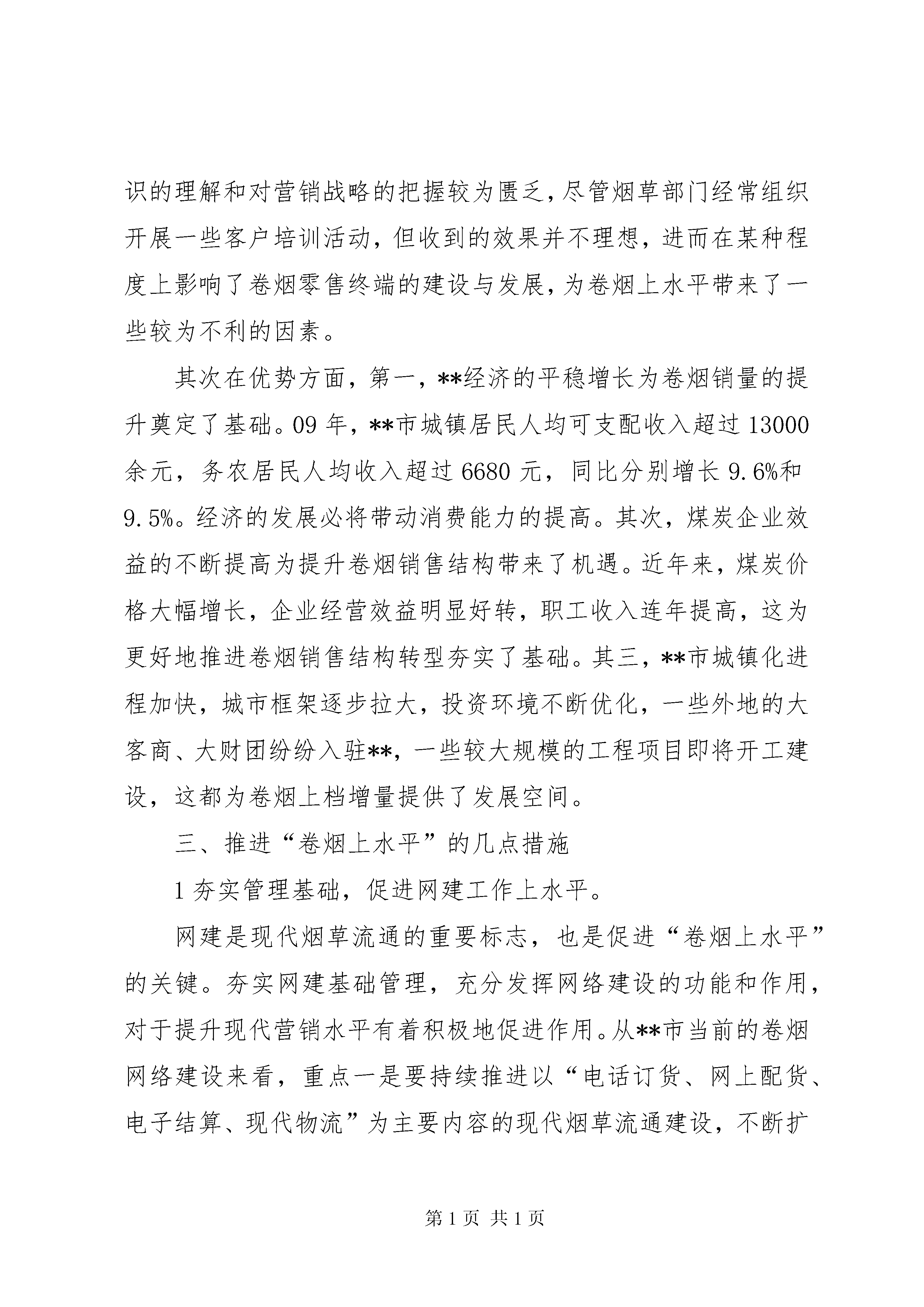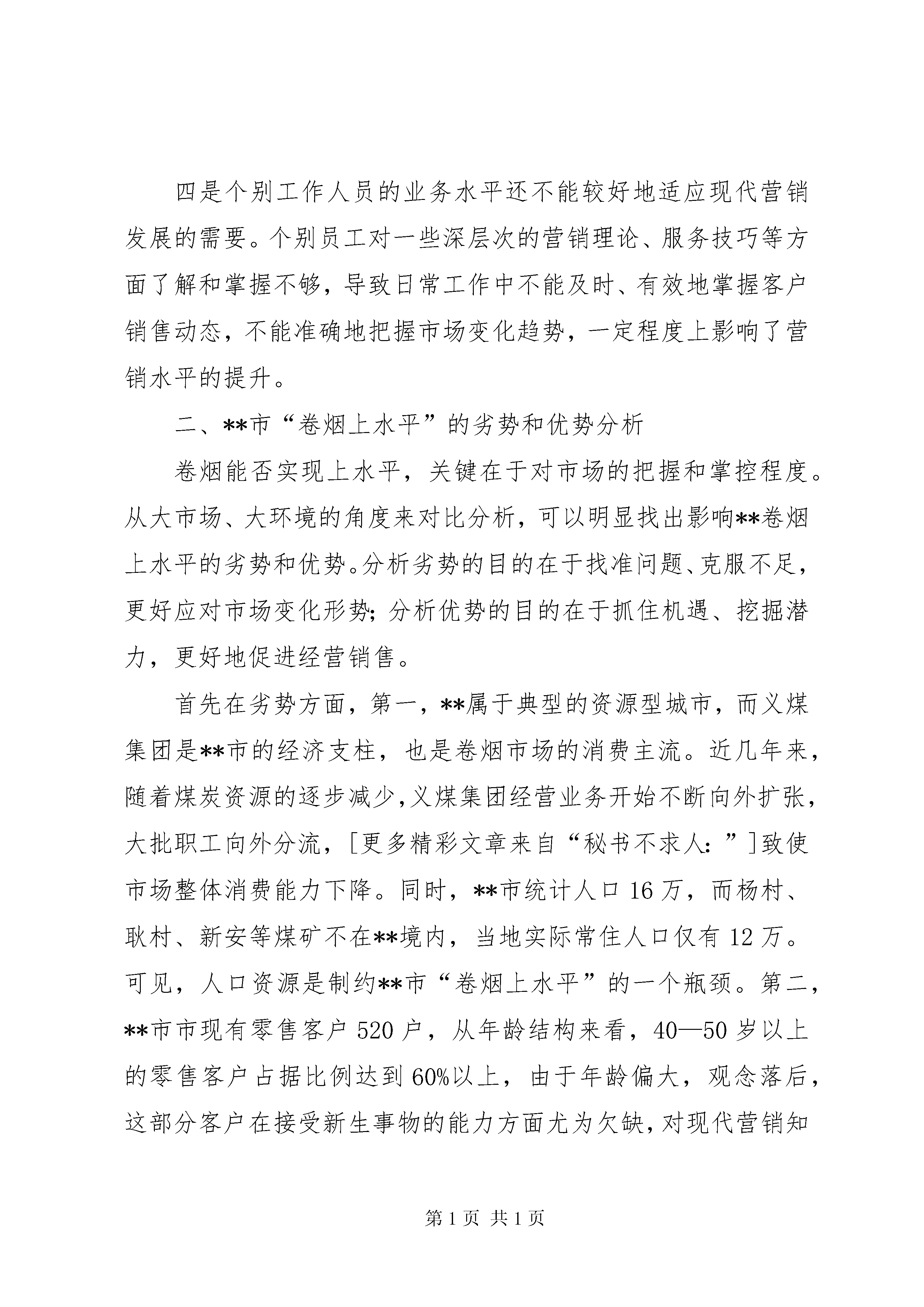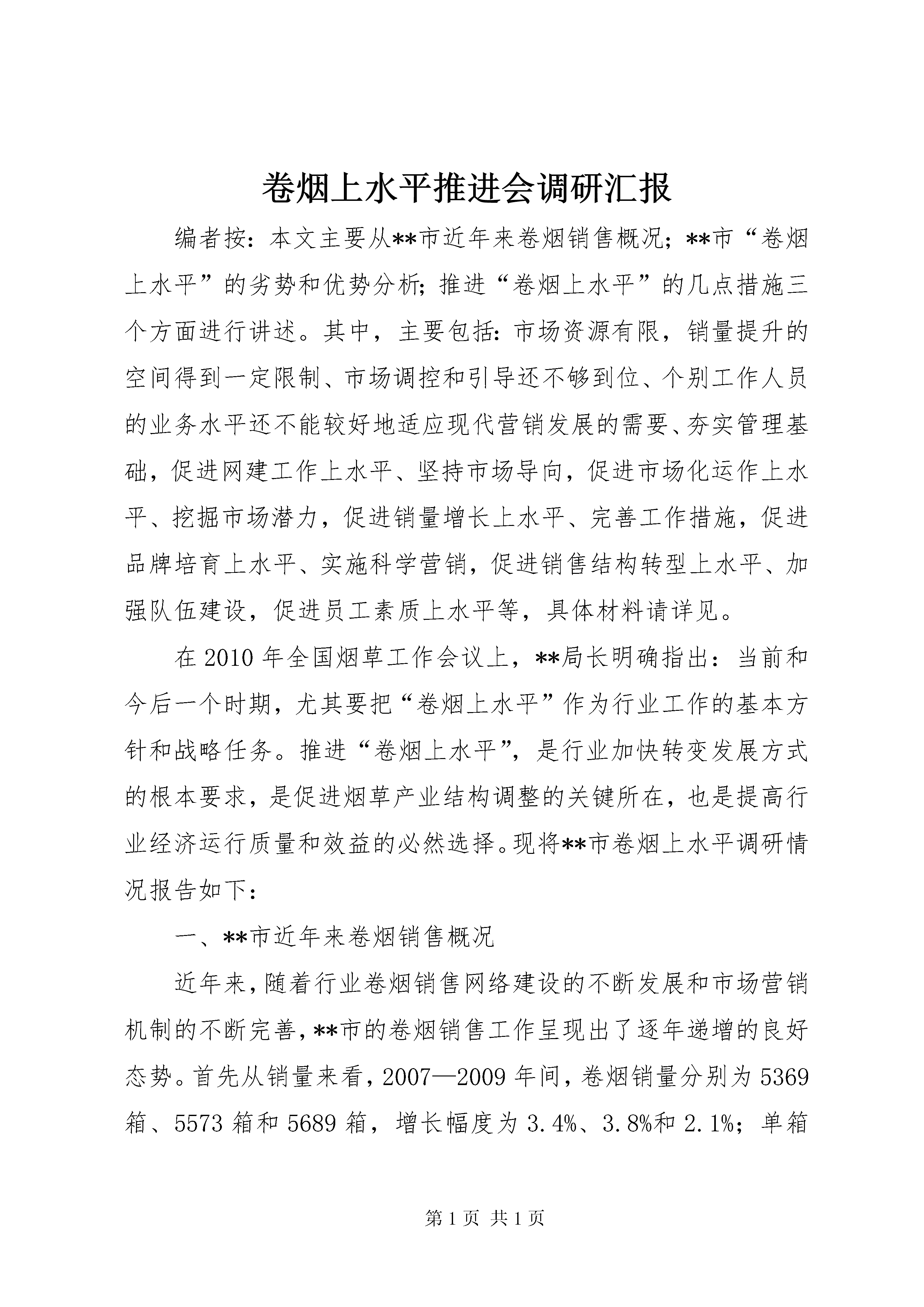 卷烟上水平推进会调研汇报编者按:本文主要从**市近年来卷烟销售概况;**市“卷烟上水平”的劣势和优势分析;推进“卷烟上水平”的几点措施三个方面进行讲述。其中,主要包括:市场资源有限,销量提升的空间得到一定限制、市场调控和引导还不够到位、个别工作人员的业务水平还不能较好地适应现代营销发展的需要、夯实管理基础,促进网建工作上水平、坚持市场导向,促进市场化运作上水平、挖掘市场潜力,促进销量增长上水平、完善工作措施,促进品牌培育上水平、实施科学营销,促进销售结构转型上水平、加强队伍建设,促进员工素质上水平等,具体材料请详见。在2010年全国烟草工作会议上,**局长明确指出:当前和今后一个时期,尤其要把“卷烟上水平”作为行业工作的基本方针和战略任务。推进“卷烟上水平”,是行业加快转变发展方式的根本要求,是促进烟草产业结构调整的关键所在,也是提高行业经济运行质量和效益的必然选择。现将**市卷烟上水平调研情况报告如下:一、**市近年来卷烟销售概况近年来,随着行业卷烟销售网络建设的不断发展和市场营销机制的不断完善,**市的卷烟销售工作呈现出了逐年递增的良好态势。首先从销量来看,2007—2009年间,卷烟销量分别为5369箱、5573箱和5689箱,增长幅度为3.4%、3.8%和2.1%;单箱销售收入分别为9973元、10888元和11908元,增长幅度为18.9%、9.2%和9.4%。其次从结构来看,2007—2009年间,一、二类卷烟销售比重分别为2.88%、3.93%和5.53%,三类卷烟销售比重分别为14.79%、16.92%和20.13%,四类卷烟销售比重分别为40.77%、42.94%和44.59%,五类烟销售比重分别为41.55%、36.19%和29.74%。以上数据显示,无论是销量还是结构,都保持了平稳增长的良好势头,基本达到了“上水平、提结构、保增长”的预期目标。尽管**市卷烟营销工作整体趋势表现良好,但通过深入分析也发现工作中存在着一些问题和不足,主要有四个方面:一是从销量来看,由于市场资源有限,销量提升的空间得到一定限制,据有关资料显示,**市卷烟销量在经历了06年同比大幅增长后,07年至今一直处于缓慢增长的状态。二是从卷烟销售结构来看,虽然经过近几年的努力,在结构转型上取得了一些成绩,但四、五类卷烟仍占到总销量的70%以上,总体结构仍是“金字塔”型,距离“橄榄型”的目标还有较大的差距。三是市场调控和引导还不够到位。平时注重省内卷烟品牌的销售,省外能够替代的同类产品没有提前培育和合理储备,结果造成当省内卷烟短缺时,会出现货源断档、供不应求的现象,进而影响了销量的稳定。四是个别工作人员的业务水平还不能较好地适应现代营销发展的需要。个别员工对一些深层次的营销理论、服务技巧等方面了解和掌握不够,导致日常工作中不能及时、有效地掌握客户销售动态,不能准确地把握市场变化趋势,一定程度上影响了营销水平的提升。二、**市“卷烟上水平”的劣势和优势分析卷烟能否实现上水平,关键在于对市场的把握和掌控程度。从大市场、大环境的角度来对比分析,可以明显找出影响**卷烟上水平的劣势和优势。分析劣势的目的在于找准问题、克服不足,更好应对市场变化形势;分析优势的目的在于抓住机遇、挖掘潜力,更好地促进经营销售。首先在劣势方面,第一,**属于典型的资源型城市,而义煤集团是**市的经济支柱,也是卷烟市场的消费主流。近几年来,随着煤炭资源的逐步减少,义煤集团经营业务开始不断向外扩张,大批职工向外分流,[更多精彩文章来自“秘书不求人:”]致使市场整体消费能力下降。同时,**市统计人口16万,而杨村、耿村、新安等煤矿不在**境内,当地实际常住人口仅有12万。可见,人口资源是制约**市“卷烟上水平”的一个瓶颈。第二,**市市现有零售客户520户,从年龄结构来看,40—50岁以上的零售客户占据比例达到60%以上,由于年龄偏大,观念落后,这部分客户在接受新生事物的能力方面尤为欠缺,对现代营销知识的理解和对营销战略的把握较为匮乏,尽管烟草部门经常组织开展一些客户培训活动,但收到的效果并不理想,进而在某种程度上影响了卷烟零售终端的建设与发展,为卷烟上水平带来了一些较为不利的因素。其次在优势方面,第一,**经济的平稳增长为卷烟销量的提升奠定了基础。09年,**市城镇居民人均可支配收入超过13000余元,务农居民人均收入超过6680元,同比分别增长9.6%和9.5%。经济的发展必将带动消费能力的提高。其次,煤炭企业效益的不断提高为提升卷烟销售结构带来了机遇。近年来,煤炭价格大幅增长,企业经营效益明显好转,职工收入连年提高,这为更好地推进卷烟销售结构转型夯实了基础。其三,**市城镇化进程加快,城市框架逐步拉大,投资环境不断优化,一些外地的大客商、大财团纷