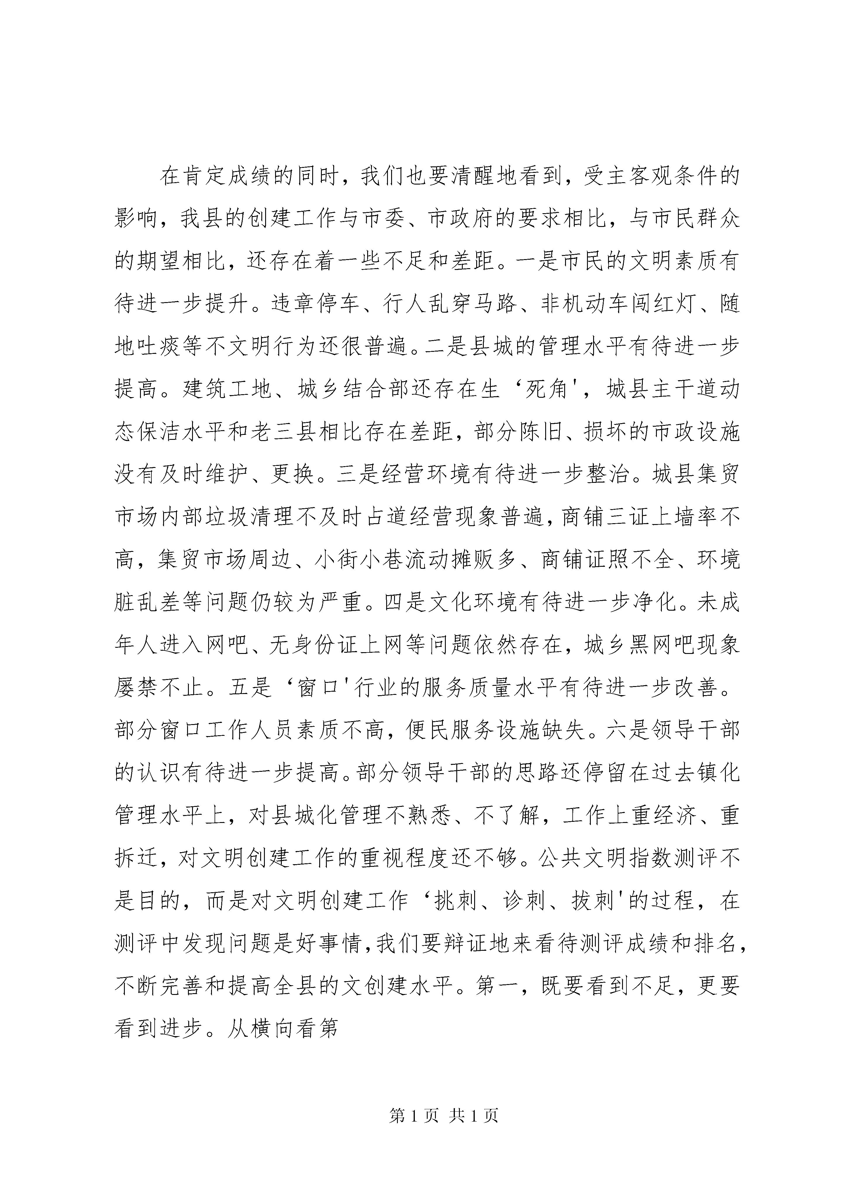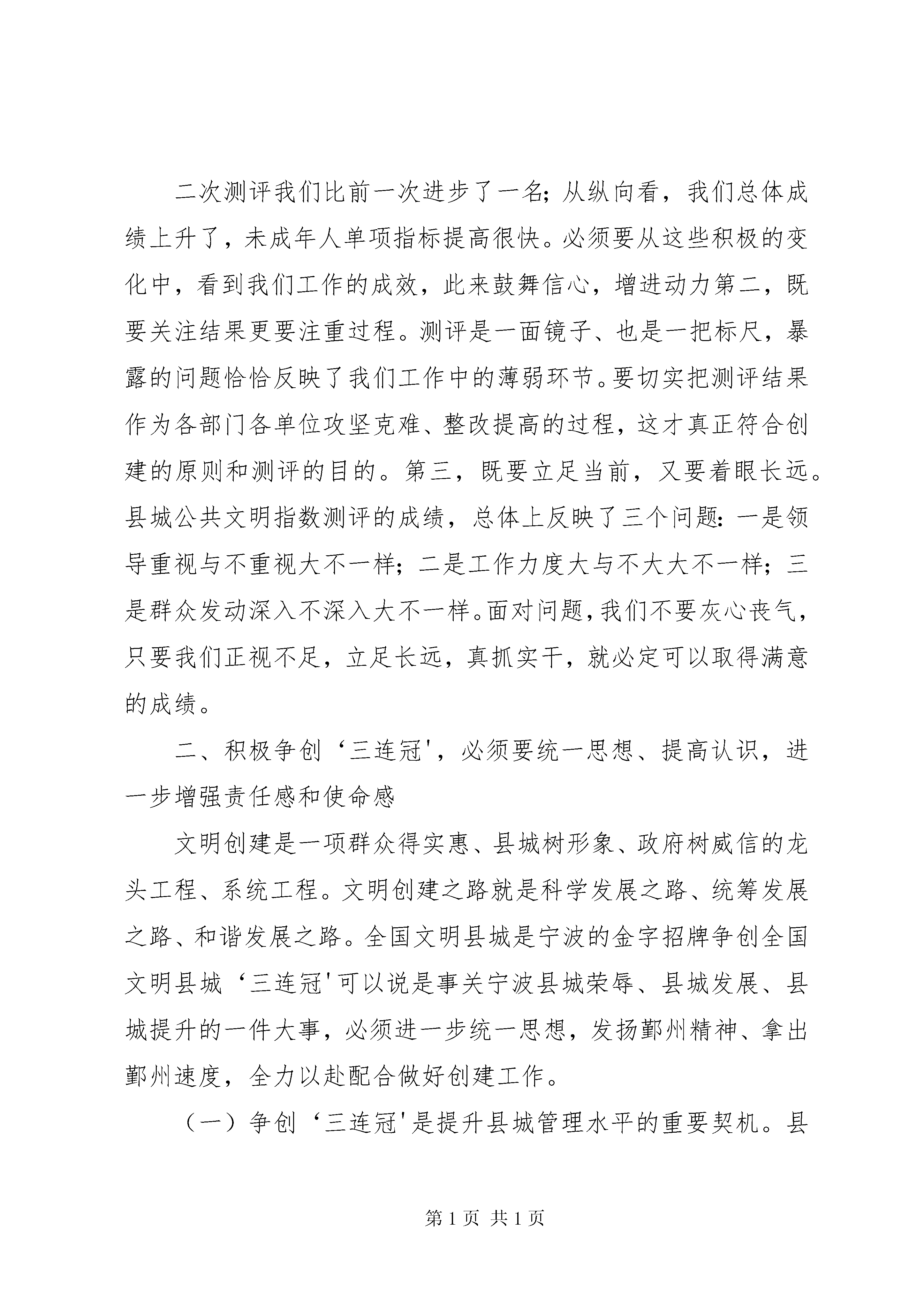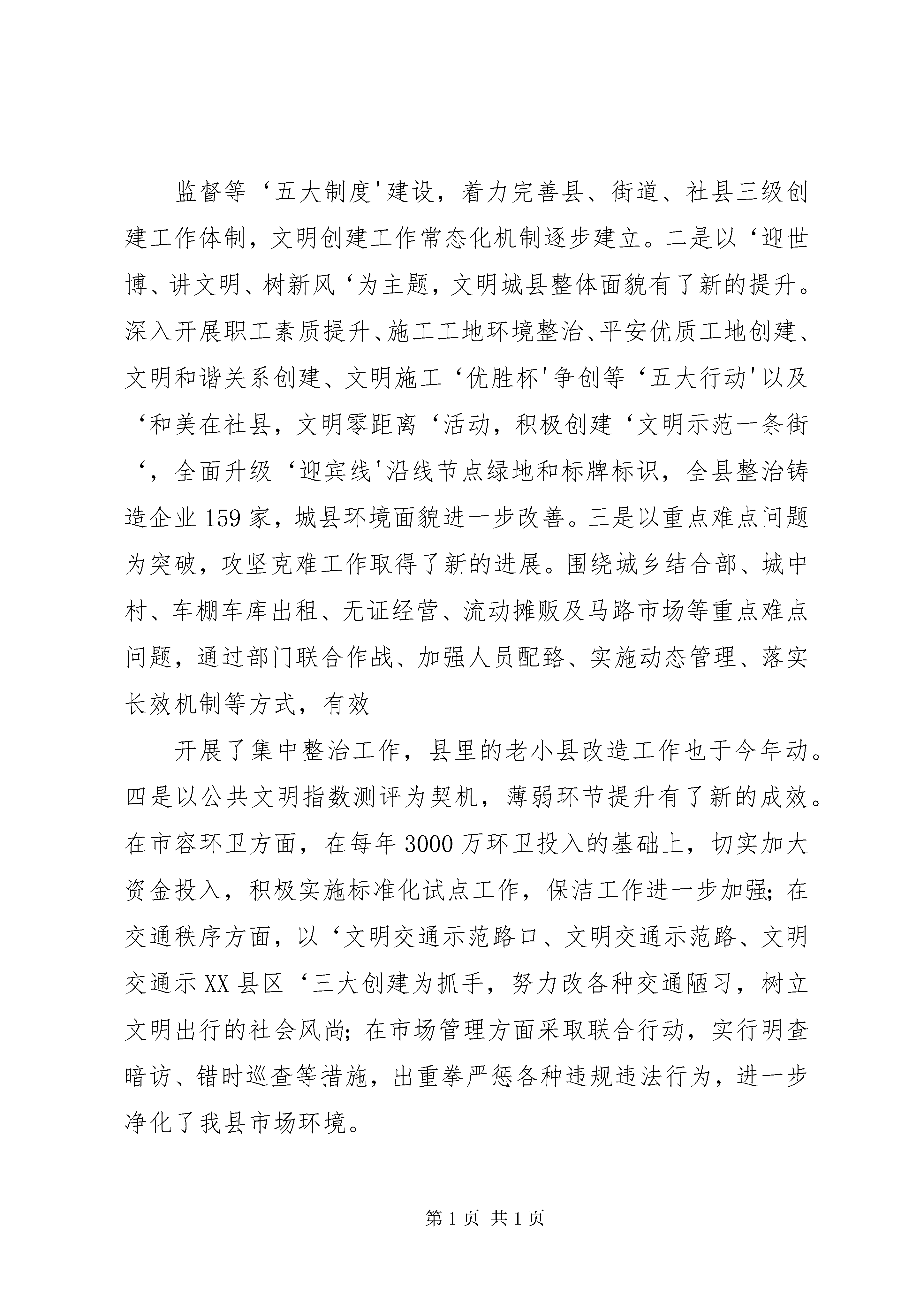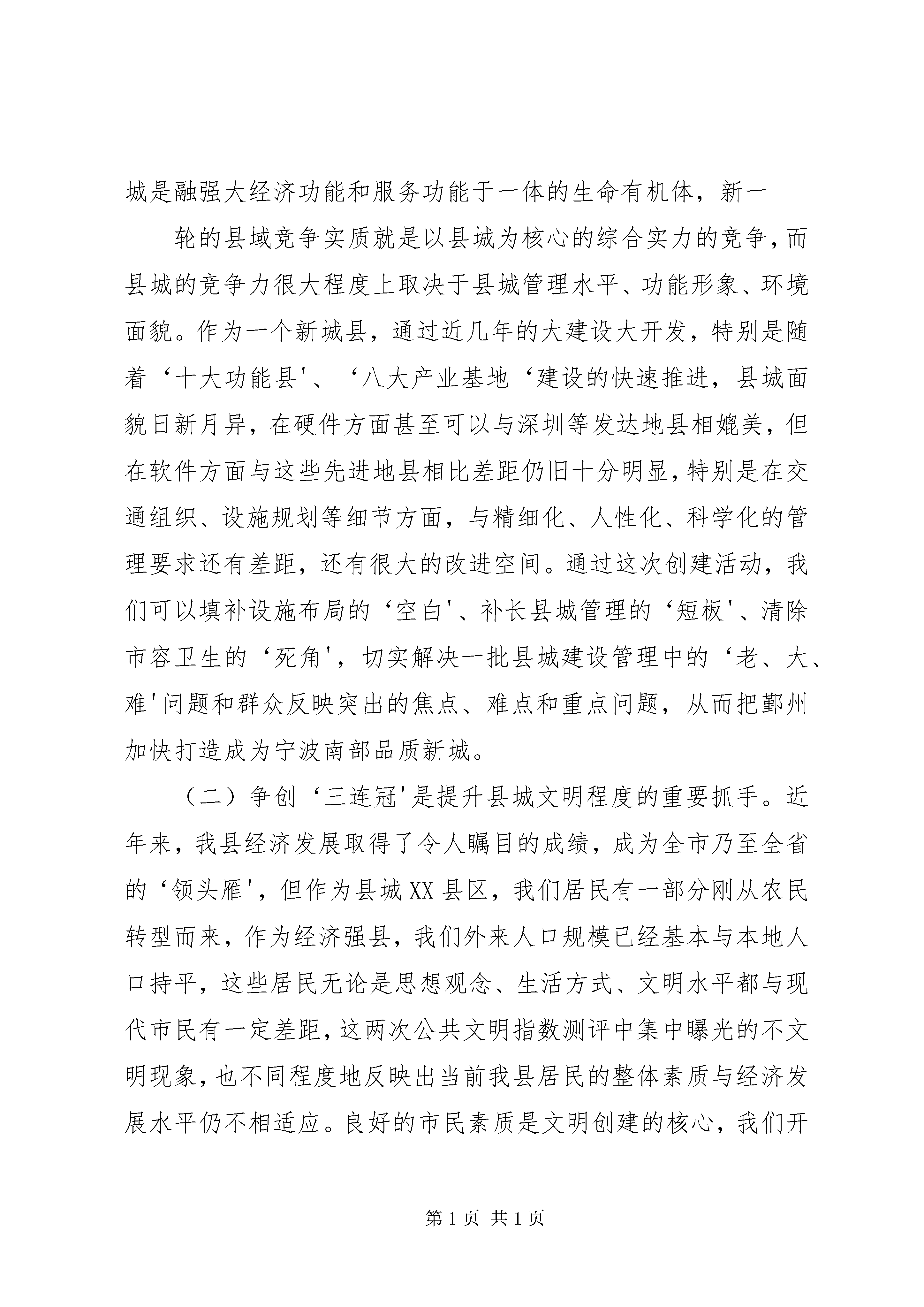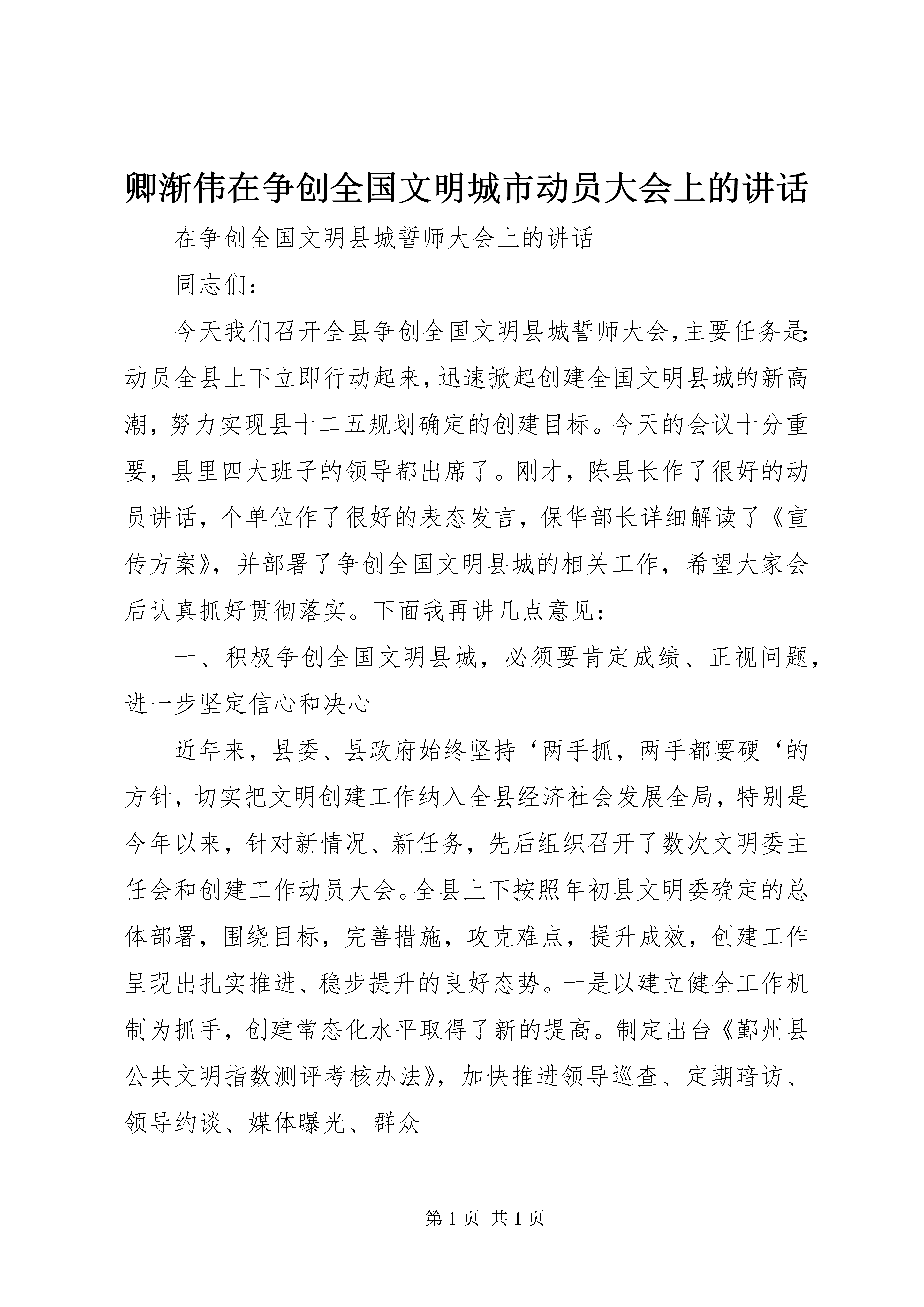 卿渐伟在争创全国文明城市动员大会上的讲话在争创全国文明县城誓师大会上的讲话同志们:今天我们召开全县争创全国文明县城誓师大会,主要任务是:动员全县上下立即行动起来,迅速掀起创建全国文明县城的新高潮,努力实现县十二五规划确定的创建目标。今天的会议十分重要,县里四大班子的领导都出席了。刚才,陈县长作了很好的动员讲话,个单位作了很好的表态发言,保华部长详细解读了《宣传方案》,并部署了争创全国文明县城的相关工作,希望大家会后认真抓好贯彻落实。下面我再讲几点意见:一、积极争创全国文明县城,必须要肯定成绩、正视问题,进一步坚定信心和决心近年来,县委、县政府始终坚持‘两手抓,两手都要硬‘的方针,切实把文明创建工作纳入全县经济社会发展全局,特别是今年以来,针对新情况、新任务,先后组织召开了数次文明委主任会和创建工作动员大会。全县上下按照年初县文明委确定的总体部署,围绕目标,完善措施,攻克难点,提升成效,创建工作呈现出扎实推进、稳步提升的良好态势。一是以建立健全工作机制为抓手,创建常态化水平取得了新的提高。制定出台《鄞州县公共文明指数测评考核办法》,加快推进领导巡查、定期暗访、领导约谈、媒体曝光、群众监督等‘五大制度'建设,着力完善县、街道、社县三级创建工作体制,文明创建工作常态化机制逐步建立。二是以‘迎世博、讲文明、树新风‘为主题,文明城县整体面貌有了新的提升。深入开展职工素质提升、施工工地环境整治、平安优质工地创建、文明和谐关系创建、文明施工‘优胜杯'争创等‘五大行动'以及‘和美在社县,文明零距离‘活动,积极创建‘文明示范一条街‘,全面升级‘迎宾线'沿线节点绿地和标牌标识,全县整治铸造企业159家,城县环境面貌进一步改善。三是以重点难点问题为突破,攻坚克难工作取得了新的进展。围绕城乡结合部、城中村、车棚车库出租、无证经营、流动摊贩及马路市场等重点难点问题,通过部门联合作战、加强人员配臵、实施动态管理、落实长效机制等方式,有效开展了集中整治工作,县里的老小县改造工作也于今年动。四是以公共文明指数测评为契机,薄弱环节提升有了新的成效。在市容环卫方面,在每年3000万环卫投入的基础上,切实加大资金投入,积极实施标准化试点工作,保洁工作进一步加强;在交通秩序方面,以‘文明交通示范路口、文明交通示范路、文明交通示XX县区‘三大创建为抓手,努力改各种交通陋习,树立文明出行的社会风尚;在市场管理方面采取联合行动,实行明查暗访、错时巡查等措施,出重拳严惩各种违规违法行为,进一步净化了我县市场环境。在肯定成绩的同时,我们也要清醒地看到,受主客观条件的影响,我县的创建工作与市委、市政府的要求相比,与市民群众的期望相比,还存在着一些不足和差距。一是市民的文明素质有待进一步提升。违章停车、行人乱穿马路、非机动车闯红灯、随地吐痰等不文明行为还很普遍。二是县城的管理水平有待进一步提高。建筑工地、城乡结合部还存在生‘死角',城县主干道动态保洁水平和老三县相比存在差距,部分陈旧、损坏的市政设施没有及时维护、更换。三是经营环境有待进一步整治。城县集贸市场内部垃圾清理不及时占道经营现象普遍,商铺三证上墙率不高,集贸市场周边、小街小巷流动摊贩多、商铺证照不全、环境脏乱差等问题仍较为严重。四是文化环境有待进一步净化。未成年人进入网吧、无身份证上网等问题依然存在,城乡黑网吧现象屡禁不止。五是‘窗口'行业的服务质量水平有待进一步改善。部分窗口工作人员素质不高,便民服务设施缺失。六是领导干部的认识有待进一步提高。部分领导干部的思路还停留在过去镇化管理水平上,对县城化管理不熟悉、不了解,工作上重经济、重拆迁,对文明创建工作的重视程度还不够。公共文明指数测评不是目的,而是对文明创建工作‘挑刺、诊刺、拔刺'的过程,在测评中发现问题是好事情,我们要辩证地来看待测评成绩和排名,不断完善和提高全县的文创建水平。第一,既要看到不足,更要看到进步。从横向看第二次测评我们比前一次进步了一名;从纵向看,我们总体成绩上升了,未成年人单项指标提高很快。必须要从这些积极的变化中,看到我们工作的成效,此来鼓舞信心,增进动力第二,既要关注结果更要注重过程。测评是一面镜子、也是一把标尺,暴露的问题恰恰反映了我们工作中的薄弱环节。要切实把测评结果作为各部门各单位攻坚克难、整改提高的过程,这才真正符合创建的原则和测评的目的。第三,既要立足当前,又要着眼长远。县城公共文明指数测评的成绩,总体上反映了三个问题:一是领导重视与不重视大不一样;二是工作力度大与不大大不一样;三是群众发动深入不深入大不一样。面对问题,我们不要灰心丧气,只要我们正视不足,立足长远,真抓实干,就必定可以取得满意的成绩。二、积极争创‘三连冠',必须要统一思想、提高认识,进一步增强责任感和使命感文明创建是一项群众得实惠、县城树形象、