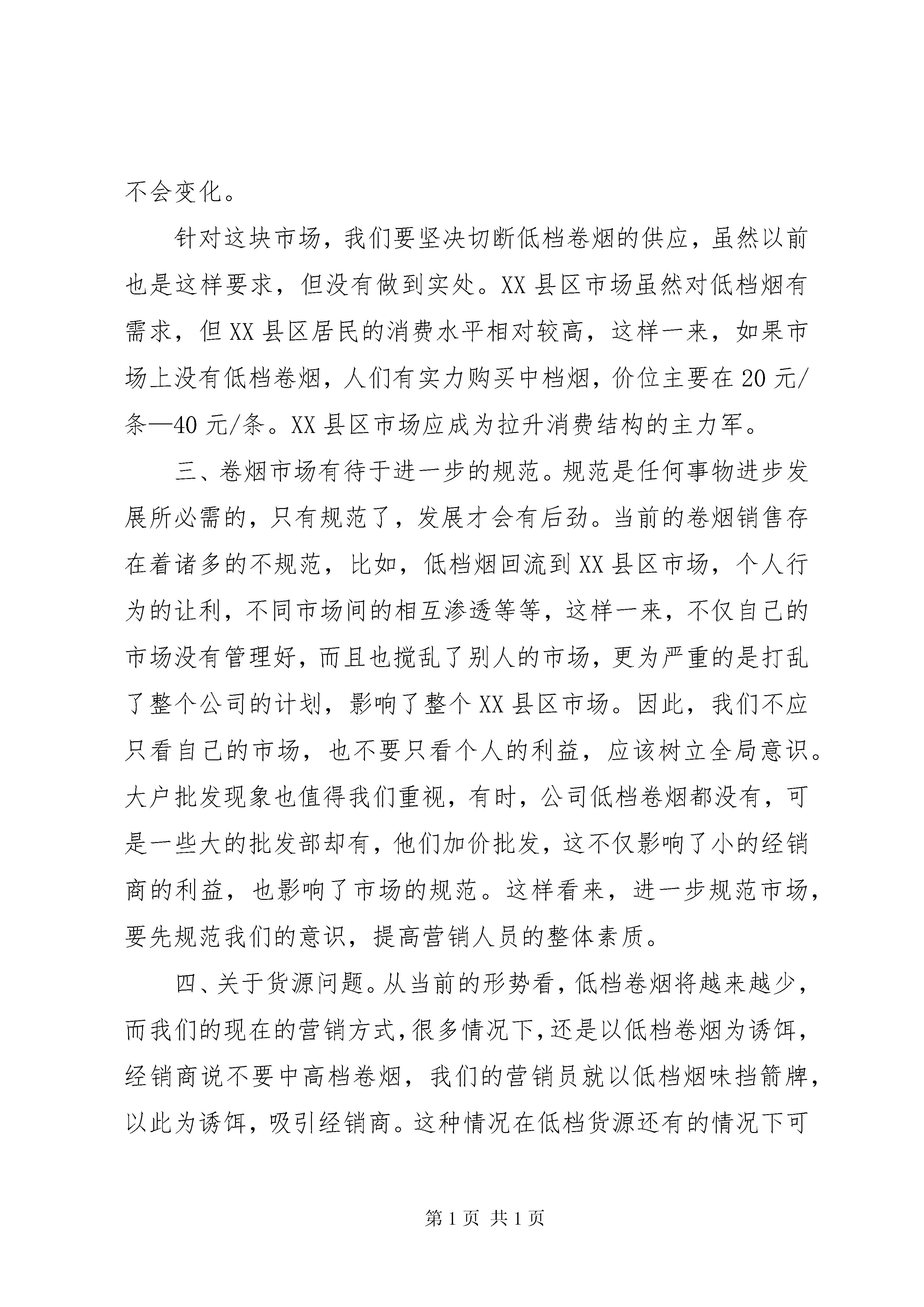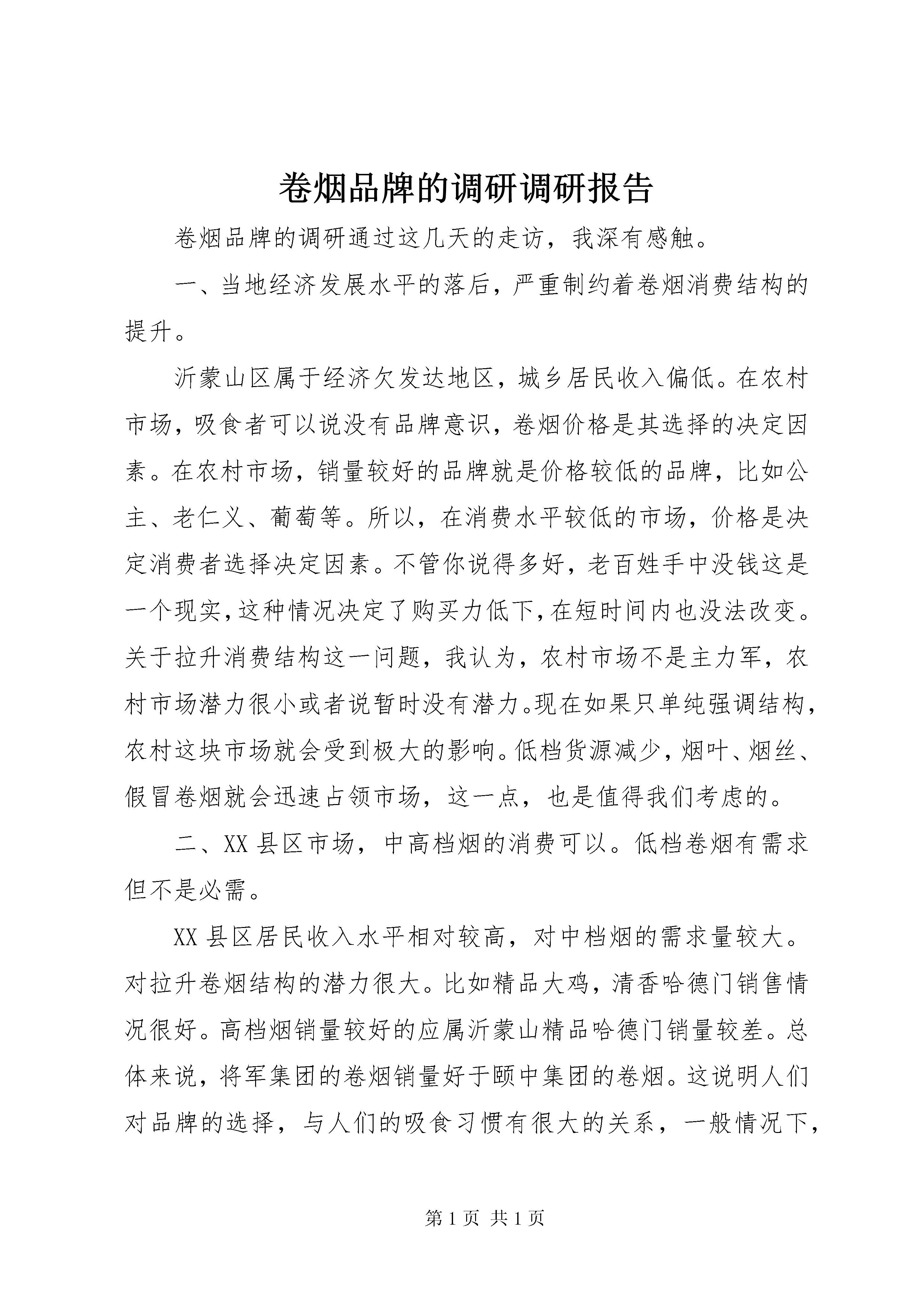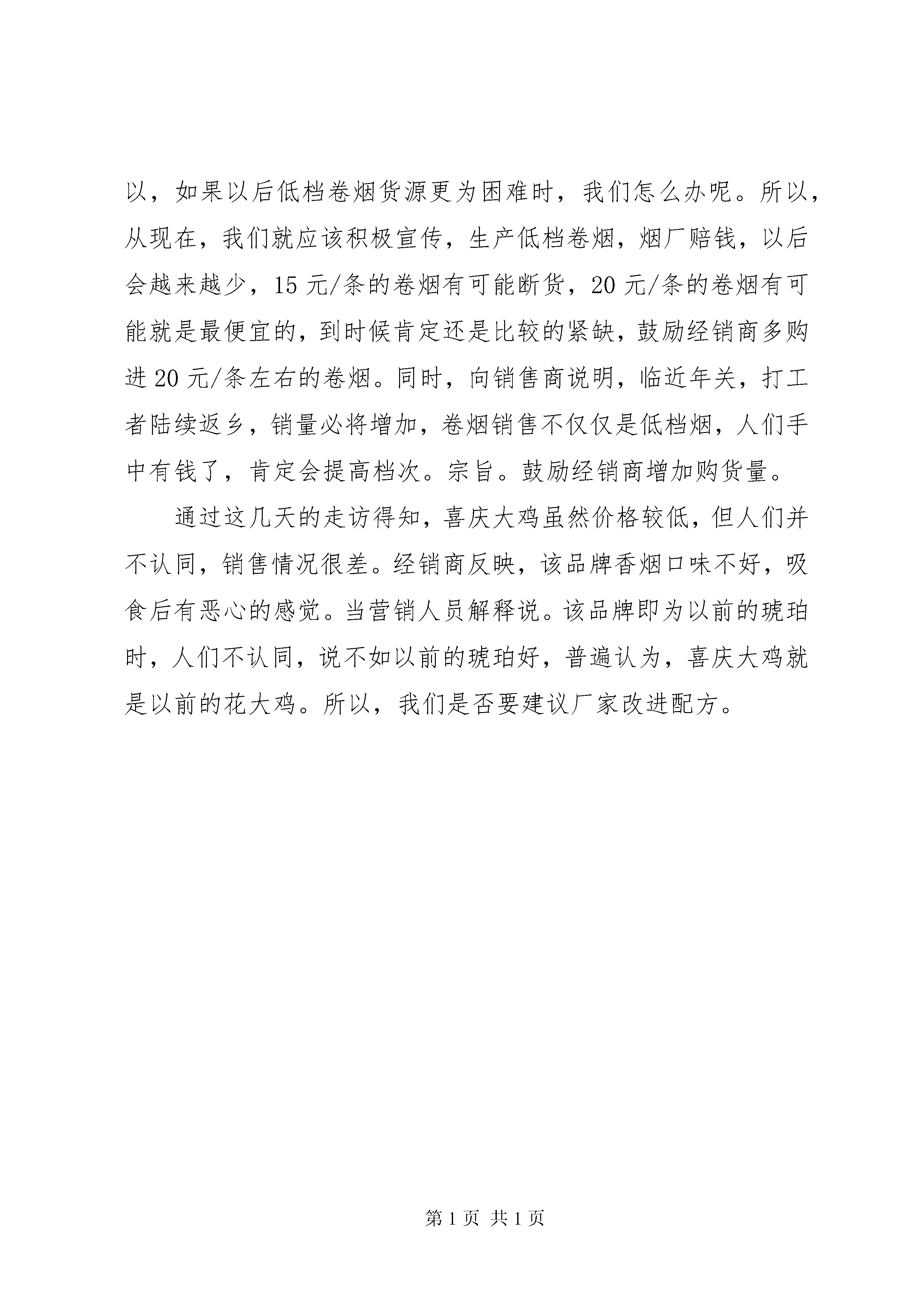 卷烟品牌的调研调研报告卷烟品牌的调研通过这几天的走访,我深有感触。一、当地经济发展水平的落后,严重制约着卷烟消费结构的提升。沂蒙山区属于经济欠发达地区,城乡居民收入偏低。在农村市场,吸食者可以说没有品牌意识,卷烟价格是其选择的决定因素。在农村市场,销量较好的品牌就是价格较低的品牌,比如公主、老仁义、葡萄等。所以,在消费水平较低的市场,价格是决定消费者选择决定因素。不管你说得多好,老百姓手中没钱这是一个现实,这种情况决定了购买力低下,在短时间内也没法改变。关于拉升消费结构这一问题,我认为,农村市场不是主力军,农村市场潜力很小或者说暂时没有潜力。现在如果只单纯强调结构,农村这块市场就会受到极大的影响。低档货源减少,烟叶、烟丝、假冒卷烟就会迅速占领市场,这一点,也是值得我们考虑的。二、XX县区市场,中高档烟的消费可以。低档卷烟有需求但不是必需。XX县区居民收入水平相对较高,对中档烟的需求量较大。对拉升卷烟结构的潜力很大。比如精品大鸡,清香哈德门销售情况很好。高档烟销量较好的应属沂蒙山精品哈德门销量较差。总体来说,将军集团的卷烟销量好于颐中集团的卷烟。这说明人们对品牌的选择,与人们的吸食习惯有很大的关系,一般情况下,不会变化。针对这块市场,我们要坚决切断低档卷烟的供应,虽然以前也是这样要求,但没有做到实处。XX县区市场虽然对低档烟有需求,但XX县区居民的消费水平相对较高,这样一来,如果市场上没有低档卷烟,人们有实力购买中档烟,价位主要在20元/条—40元/条。XX县区市场应成为拉升消费结构的主力军。三、卷烟市场有待于进一步的规范。规范是任何事物进步发展所必需的,只有规范了,发展才会有后劲。当前的卷烟销售存在着诸多的不规范,比如,低档烟回流到XX县区市场,个人行为的让利,不同市场间的相互渗透等等,这样一来,不仅自己的市场没有管理好,而且也搅乱了别人的市场,更为严重的是打乱了整个公司的计划,影响了整个XX县区市场。因此,我们不应只看自己的市场,也不要只看个人的利益,应该树立全局意识。大户批发现象也值得我们重视,有时,公司低档卷烟都没有,可是一些大的批发部却有,他们加价批发,这不仅影响了小的经销商的利益,也影响了市场的规范。这样看来,进一步规范市场,要先规范我们的意识,提高营销人员的整体素质。四、关于货源问题。从当前的形势看,低档卷烟将越来越少,而我们的现在的营销方式,很多情况下,还是以低档卷烟为诱饵,经销商说不要中高档卷烟,我们的营销员就以低档烟味挡箭牌,以此为诱饵,吸引经销商。这种情况在低档货源还有的情况下可以,如果以后低档卷烟货源更为困难时,我们怎么办呢。所以,从现在,我们就应该积极宣传,生产低档卷烟,烟厂赔钱,以后会越来越少,15元/条的卷烟有可能断货,20元/条的卷烟有可能就是最便宜的,到时候肯定还是比较的紧缺,鼓励经销商多购进20元/条左右的卷烟。同时,向销售商说明,临近年关,打工者陆续返乡,销量必将增加,卷烟销售不仅仅是低档烟,人们手中有钱了,肯定会提高档次。宗旨。鼓励经销商增加购货量。通过这几天的走访得知,喜庆大鸡虽然价格较低,但人们并不认同,销售情况很差。经销商反映,该品牌香烟口味不好,吸食后有恶心的感觉。当营销人员解释说。该品牌即为以前的琥珀时,人们不认同,说不如以前的琥珀好,普遍认为,喜庆大鸡就是以前的花大鸡。所以,我们是否要建议厂家改进配方。