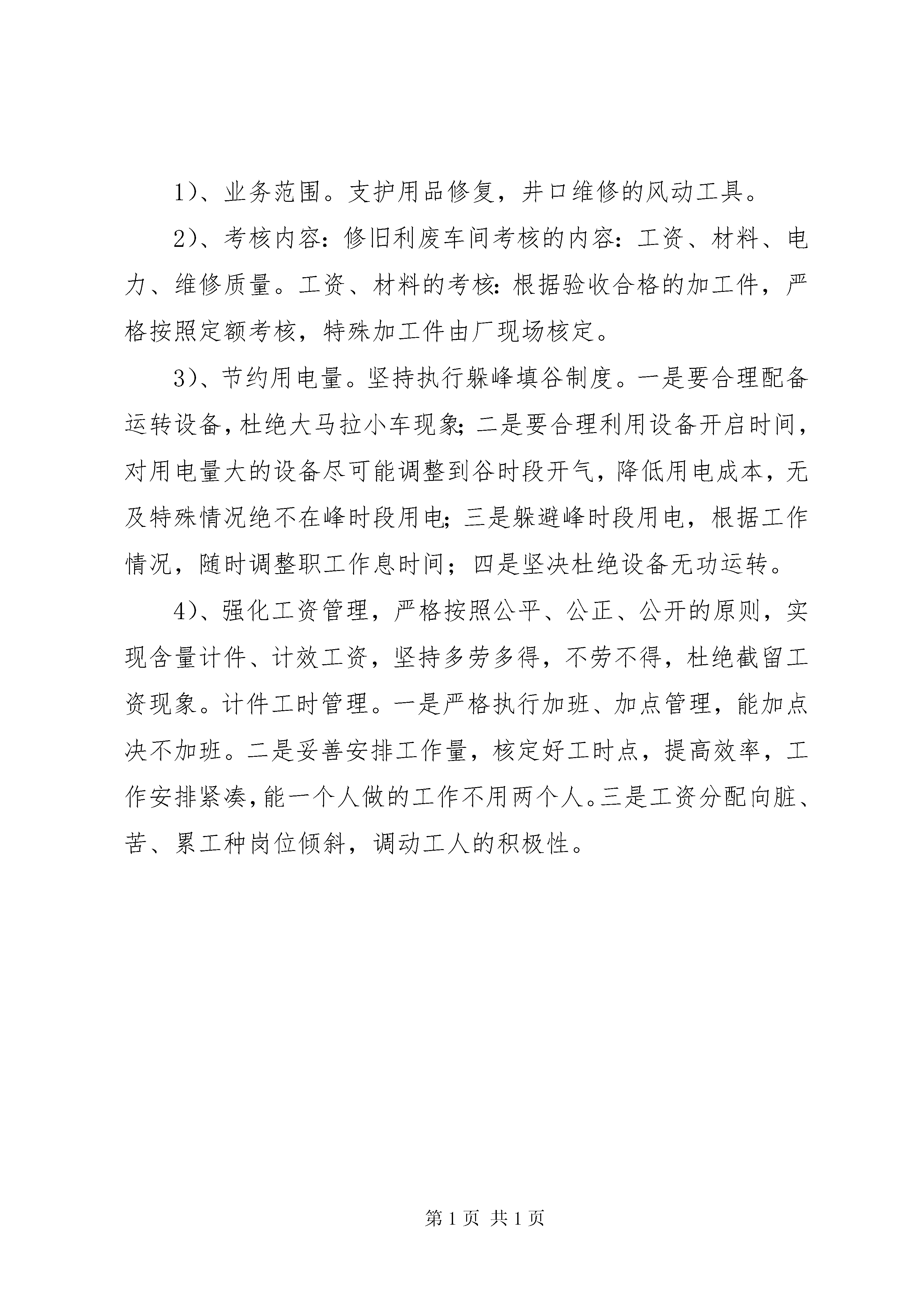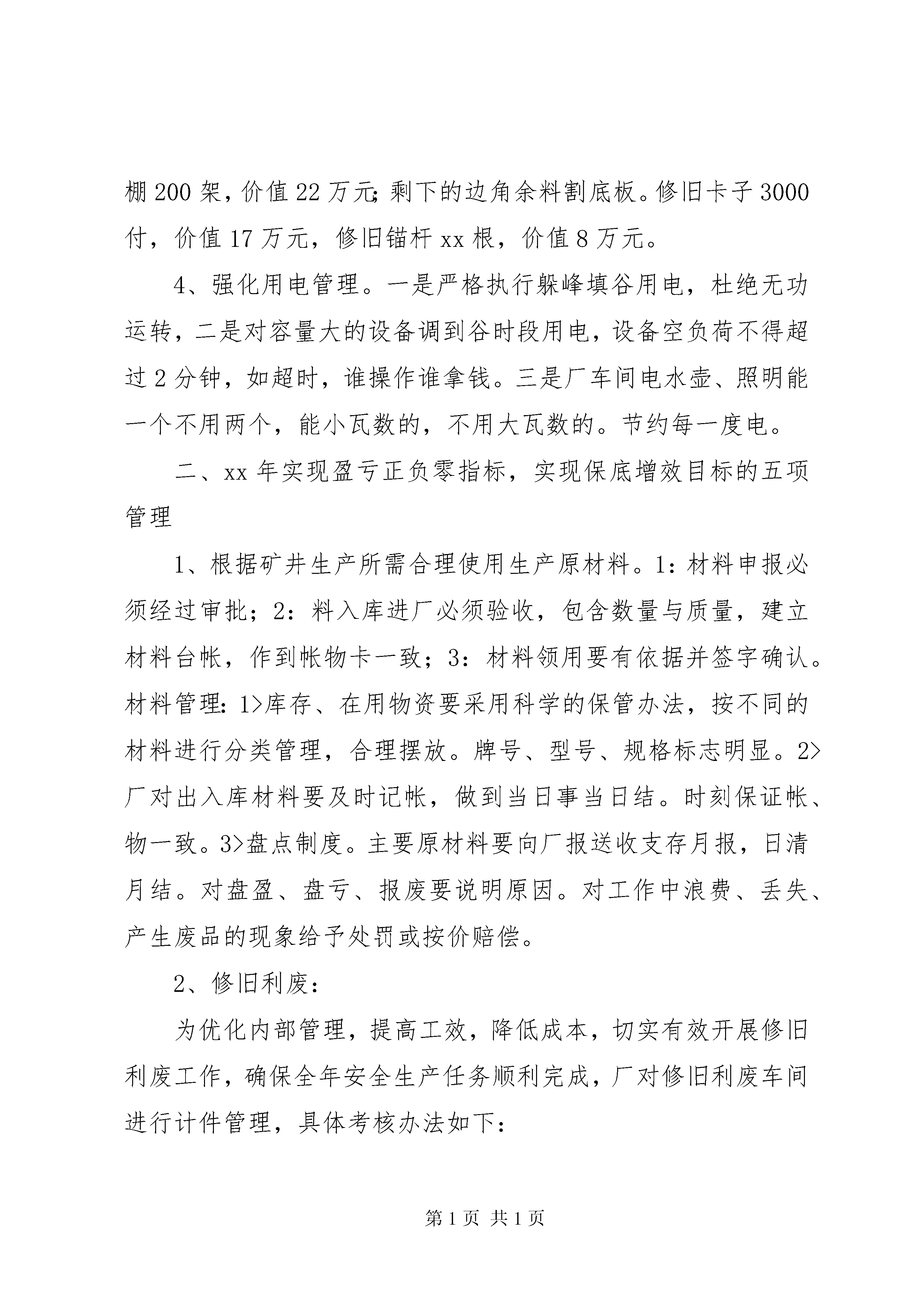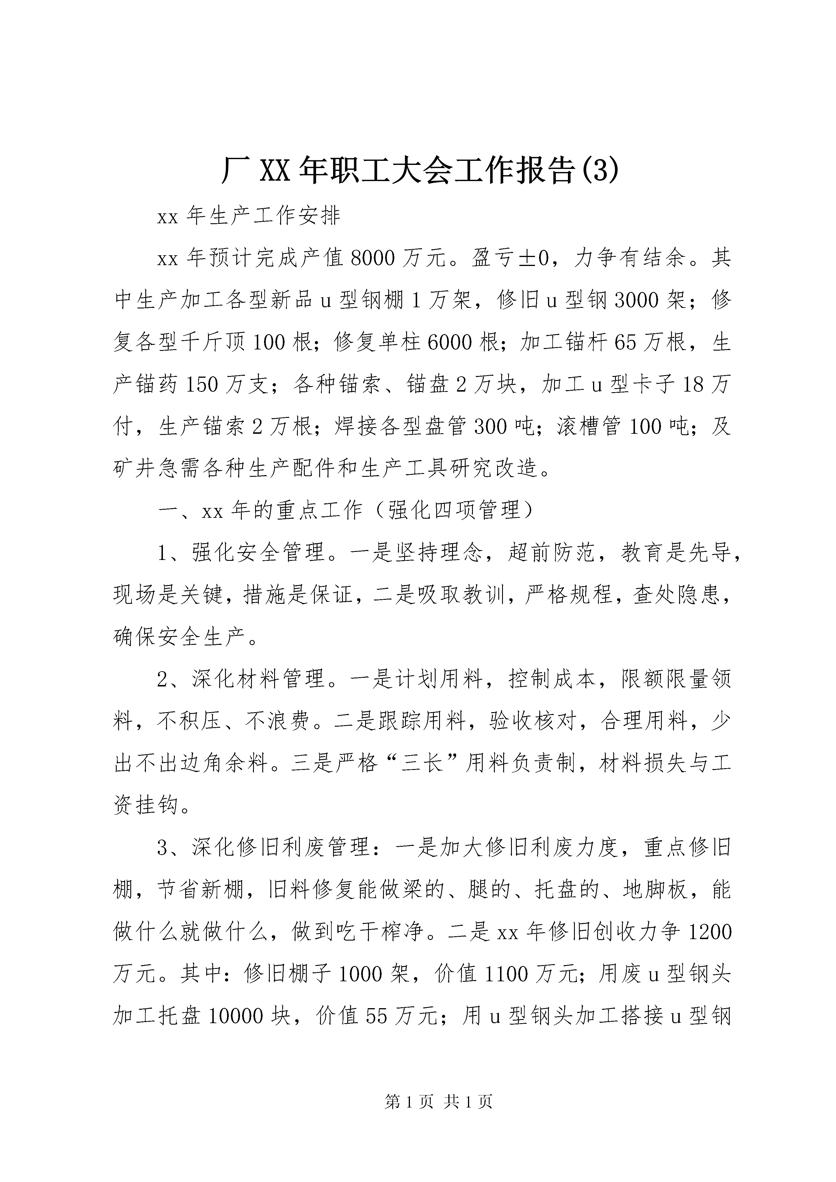 厂XX年职工大会工作报告(3)xx年生产工作安排xx年预计完成产值8000万元。盈亏±0,力争有结余。其中生产加工各型新品u型钢棚1万架,修旧u型钢3000架;修复各型千斤顶100根;修复单柱6000根;加工锚杆65万根,生产锚药150万支;各种锚索、锚盘2万块,加工u型卡子18万付,生产锚索2万根;焊接各型盘管300吨;滚槽管100吨;及矿井急需各种生产配件和生产工具研究改造。一、xx年的重点工作(强化四项管理)1、强化安全管理。一是坚持理念,超前防范,教育是先导,现场是关键,措施是保证,二是吸取教训,严格规程,查处隐患,确保安全生产。2、深化材料管理。一是计划用料,控制成本,限额限量领料,不积压、不浪费。二是跟踪用料,验收核对,合理用料,少出不出边角余料。三是严格“三长”用料负责制,材料损失与工资挂钩。3、深化修旧利废管理:一是加大修旧利废力度,重点修旧棚,节省新棚,旧料修复能做梁的、腿的、托盘的、地脚板,能做什么就做什么,做到吃干榨净。二是xx年修旧创收力争1200万元。其中:修旧棚子1000架,价值1100万元;用废u型钢头加工托盘10000块,价值55万元;用u型钢头加工搭接u型钢棚200架,价值22万元;剩下的边角余料割底板。修旧卡子3000付,价值17万元,修旧锚杆xx根,价值8万元。4、强化用电管理。一是严格执行躲峰填谷用电,杜绝无功运转,二是对容量大的设备调到谷时段用电,设备空负荷不得超过2分钟,如超时,谁操作谁拿钱。三是厂车间电水壶、照明能一个不用两个,能小瓦数的,不用大瓦数的。节约每一度电。二、xx年实现盈亏正负零指标,实现保底增效目标的五项管理1、根据矿井生产所需合理使用生产原材料。1:材料申报必须经过审批;2:料入库进厂必须验收,包含数量与质量,建立材料台帐,作到帐物卡一致;3:材料领用要有依据并签字确认。材料管理:1>库存、在用物资要采用科学的保管办法,按不同的材料进行分类管理,合理摆放。牌号、型号、规格标志明显。2>厂对出入库材料要及时记帐,做到当日事当日结。时刻保证帐、物一致。3>盘点制度。主要原材料要向厂报送收支存月报,日清月结。对盘盈、盘亏、报废要说明原因。对工作中浪费、丢失、产生废品的现象给予处罚或按价赔偿。2、修旧利废:为优化内部管理,提高工效,降低成本,切实有效开展修旧利废工作,确保全年安全生产任务顺利完成,厂对修旧利废车间进行计件管理,具体考核办法如下:1)、业务范围。支护用品修复,井口维修的风动工具。2)、考核内容:修旧利废车间考核的内容:工资、材料、电力、维修质量。工资、材料的考核:根据验收合格的加工件,严格按照定额考核,特殊加工件由厂现场核定。3)、节约用电量。坚持执行躲峰填谷制度。一是要合理配备运转设备,杜绝大马拉小车现象;二是要合理利用设备开启时间,对用电量大的设备尽可能调整到谷时段开气,降低用电成本,无及特殊情况绝不在峰时段用电;三是躲避峰时段用电,根据工作情况,随时调整职工作息时间;四是坚决杜绝设备无功运转。4)、强化工资管理,严格按照公平、公正、公开的原则,实现含量计件、计效工资,坚持多劳多得,不劳不得,杜绝截留工资现象。计件工时管理。一是严格执行加班、加点管理,能加点决不加班。二是妥善安排工作量,核定好工时点,提高效率,工作安排紧凑,能一个人做的工作不用两个人。三是工资分配向脏、苦、累工种岗位倾斜,调动工人的积极性。