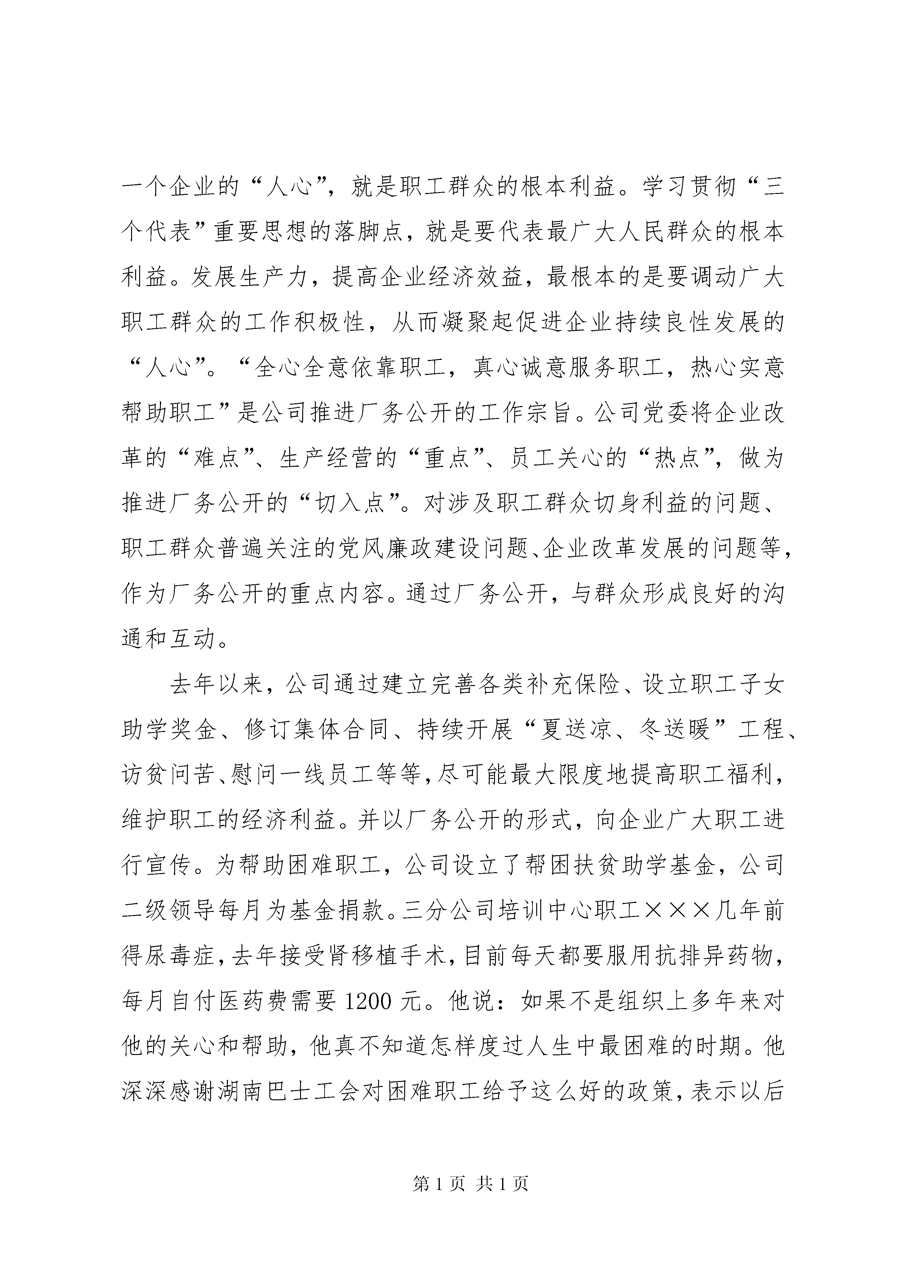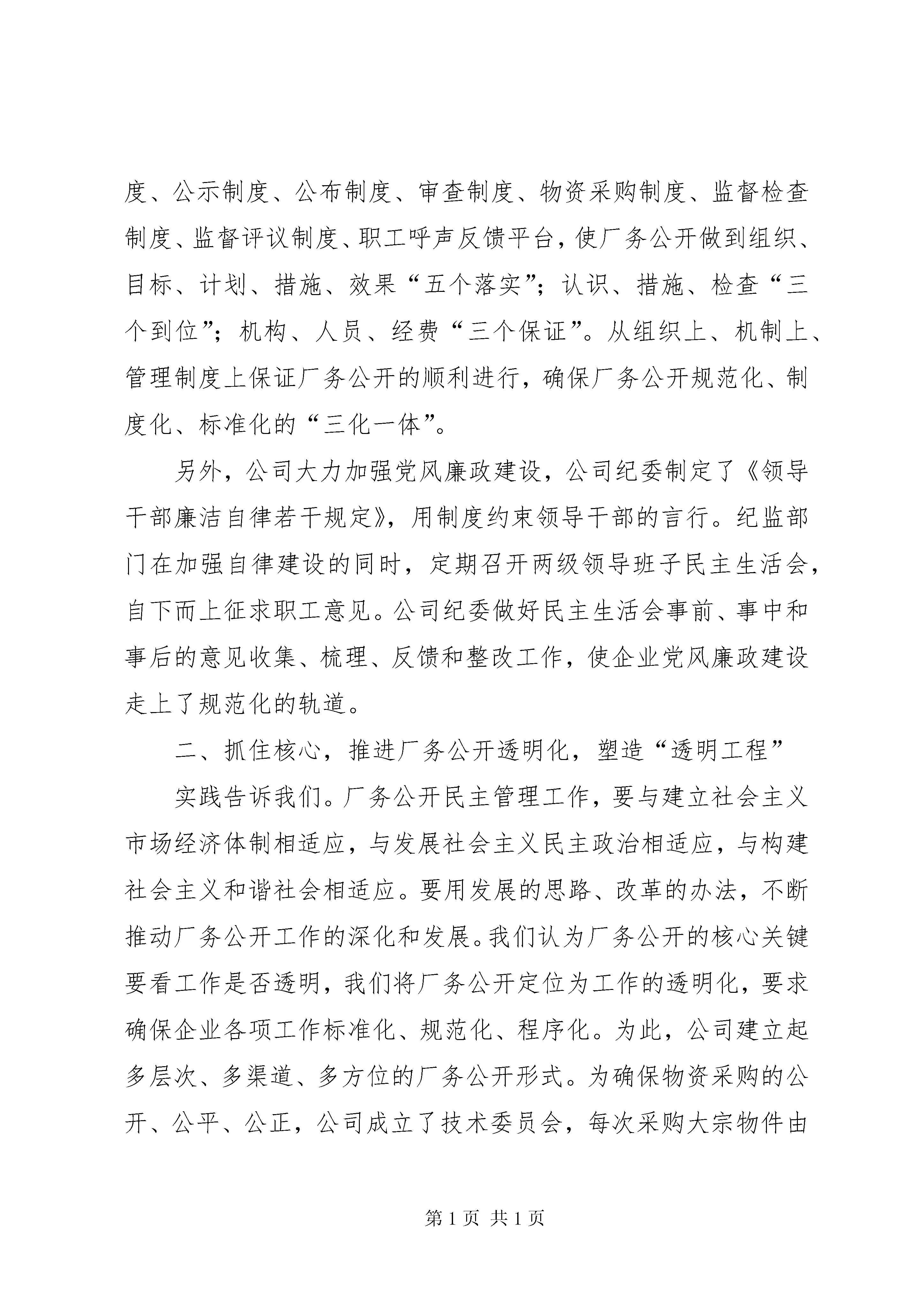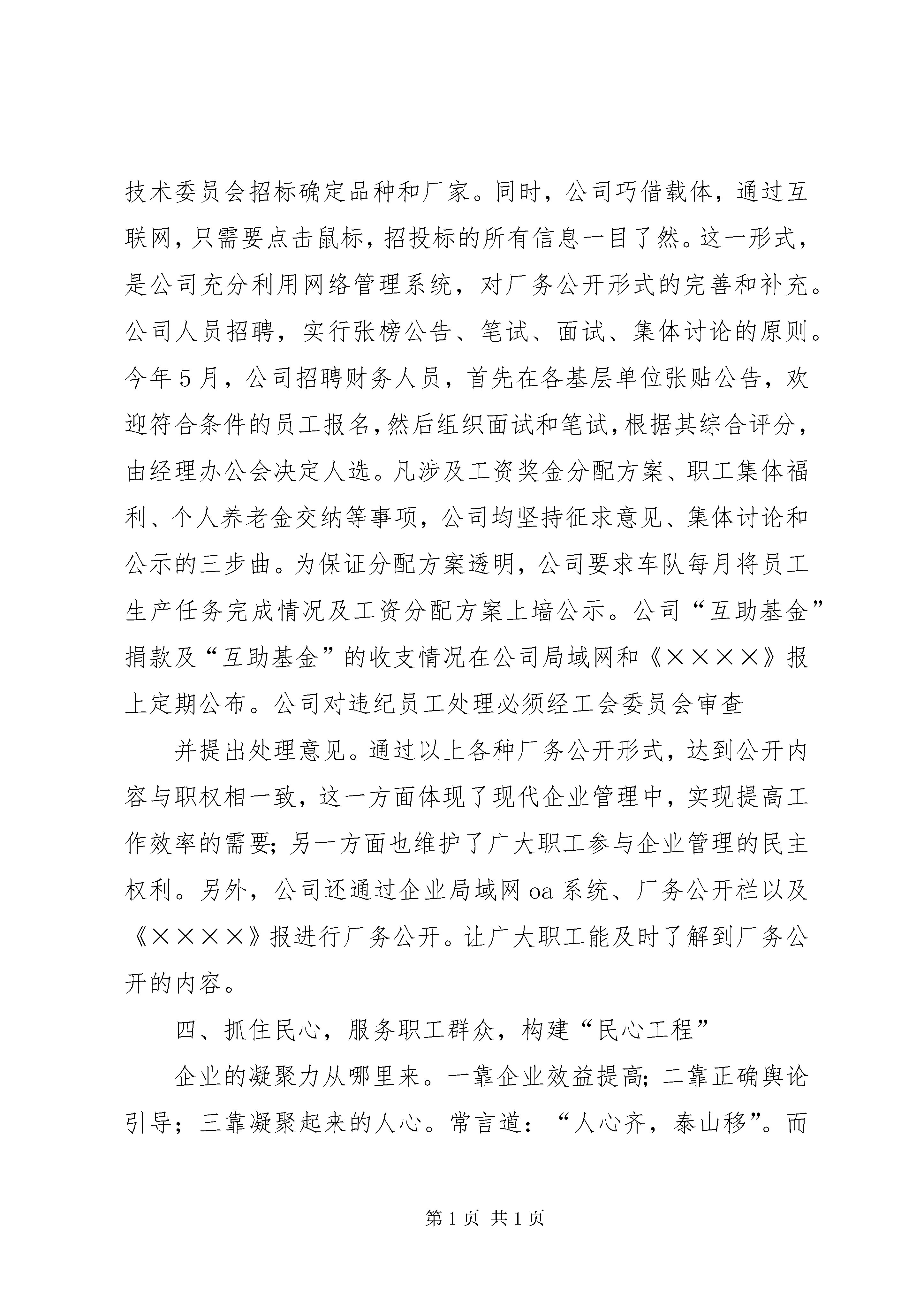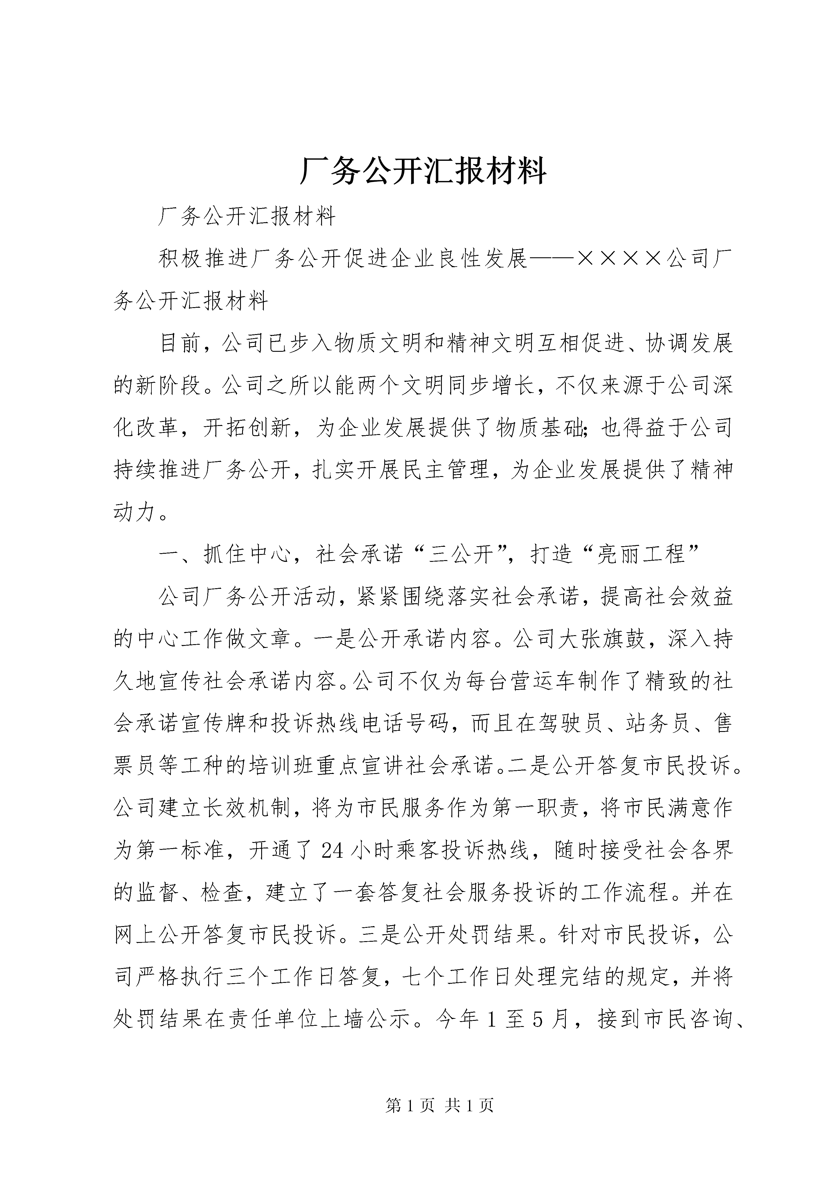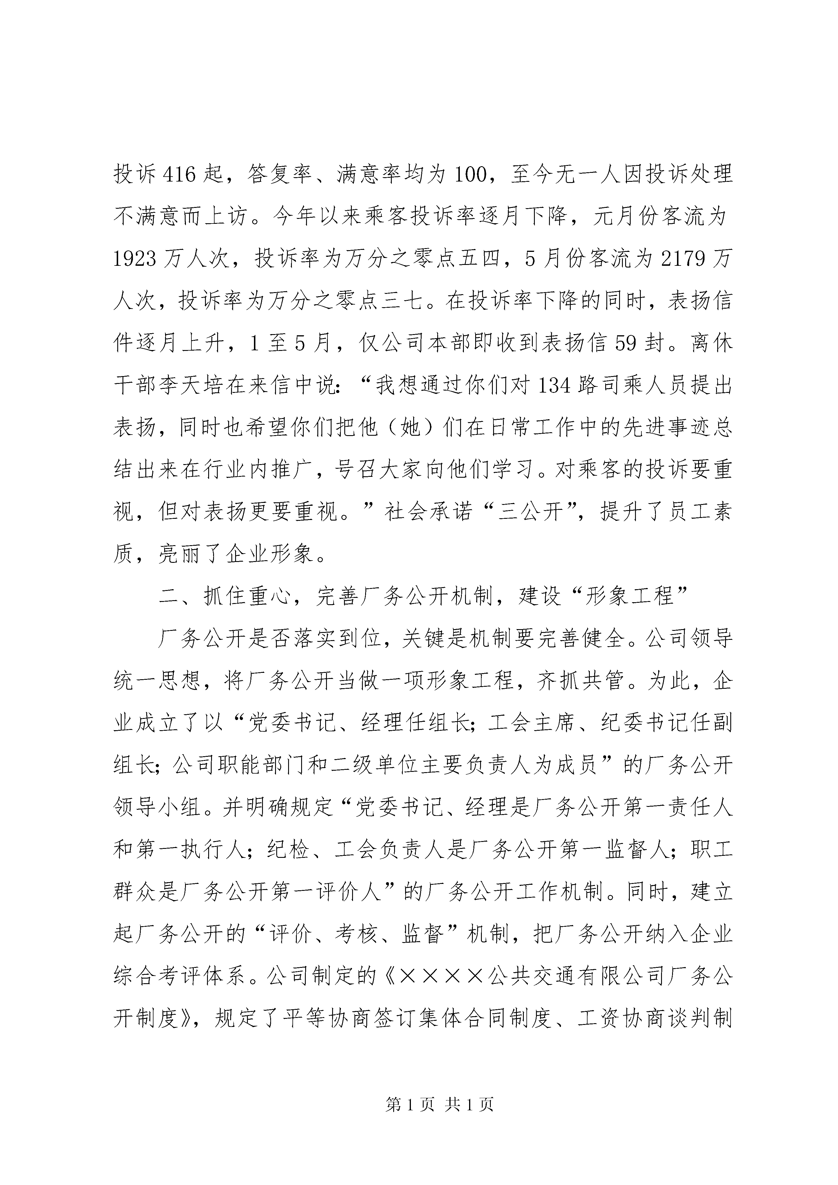 厂务公开汇报材料厂务公开汇报材料积极推进厂务公开促进企业良性发展——××××公司厂务公开汇报材料目前,公司已步入物质文明和精神文明互相促进、协调发展的新阶段。公司之所以能两个文明同步增长,不仅来源于公司深化改革,开拓创新,为企业发展提供了物质基础;也得益于公司持续推进厂务公开,扎实开展民主管理,为企业发展提供了精神动力。一、抓住中心,社会承诺“三公开”,打造“亮丽工程”公司厂务公开活动,紧紧围绕落实社会承诺,提高社会效益的中心工作做文章。一是公开承诺内容。公司大张旗鼓,深入持久地宣传社会承诺内容。公司不仅为每台营运车制作了精致的社会承诺宣传牌和投诉热线电话号码,而且在驾驶员、站务员、售票员等工种的培训班重点宣讲社会承诺。二是公开答复市民投诉。公司建立长效机制,将为市民服务作为第一职责,将市民满意作为第一标准,开通了24小时乘客投诉热线,随时接受社会各界的监督、检查,建立了一套答复社会服务投诉的工作流程。并在网上公开答复市民投诉。三是公开处罚结果。针对市民投诉,公司严格执行三个工作日答复,七个工作日处理完结的规定,并将处罚结果在责任单位上墙公示。今年1至5月,接到市民咨询、投诉416起,答复率、满意率均为100,至今无一人因投诉处理不满意而上访。今年以来乘客投诉率逐月下降,元月份客流为1923万人次,投诉率为万分之零点五四,5月份客流为2179万人次,投诉率为万分之零点三七。在投诉率下降的同时,表扬信件逐月上升,1至5月,仅公司本部即收到表扬信59封。离休干部李天培在来信中说:“我想通过你们对134路司乘人员提出表扬,同时也希望你们把他(她)们在日常工作中的先进事迹总结出来在行业内推广,号召大家向他们学习。对乘客的投诉要重视,但对表扬更要重视。”社会承诺“三公开”,提升了员工素质,亮丽了企业形象。二、抓住重心,完善厂务公开机制,建设“形象工程”厂务公开是否落实到位,关键是机制要完善健全。公司领导统一思想,将厂务公开当做一项形象工程,齐抓共管。为此,企业成立了以“党委书记、经理任组长;工会主席、纪委书记任副组长;公司职能部门和二级单位主要负责人为成员”的厂务公开领导小组。并明确规定“党委书记、经理是厂务公开第一责任人和第一执行人;纪检、工会负责人是厂务公开第一监督人;职工群众是厂务公开第一评价人”的厂务公开工作机制。同时,建立起厂务公开的“评价、考核、监督”机制,把厂务公开纳入企业综合考评体系。公司制定的《××××公共交通有限公司厂务公开制度》,规定了平等协商签订集体合同制度、工资协商谈判制度、公示制度、公布制度、审查制度、物资采购制度、监督检查制度、监督评议制度、职工呼声反馈平台,使厂务公开做到组织、目标、计划、措施、效果“五个落实”;认识、措施、检查“三个到位”;机构、人员、经费“三个保证”。从组织上、机制上、管理制度上保证厂务公开的顺利进行,确保厂务公开规范化、制度化、标准化的“三化一体”。另外,公司大力加强党风廉政建设,公司纪委制定了《领导干部廉洁自律若干规定》,用制度约束领导干部的言行。纪监部门在加强自律建设的同时,定期召开两级领导班子民主生活会,自下而上征求职工意见。公司纪委做好民主生活会事前、事中和事后的意见收集、梳理、反馈和整改工作,使企业党风廉政建设走上了规范化的轨道。二、抓住核心,推进厂务公开透明化,塑造“透明工程”实践告诉我们。厂务公开民主管理工作,要与建立社会主义市场经济体制相适应,与发展社会主义民主政治相适应,与构建社会主义和谐社会相适应。要用发展的思路、改革的办法,不断推动厂务公开工作的深化和发展。我们认为厂务公开的核心关键要看工作是否透明,我们将厂务公开定位为工作的透明化,要求确保企业各项工作标准化、规范化、程序化。为此,公司建立起多层次、多渠道、多方位的厂务公开形式。为确保物资采购的公开、公平、公正,公司成立了技术委员会,每次采购大宗物件由技术委员会招标确定品种和厂家。同时,公司巧借载体,通过互联网,只需要点击鼠标,招投标的所有信息一目了然。这一形式,是公司充分利用网络管理系统,对厂务公开形式的完善和补充。公司人员招聘,实行张榜公告、笔试、面试、集体讨论的原则。今年5月,公司招聘财务人员,首先在各基层单位张贴公告,欢迎符合条件的员工报名,然后组织面试和笔试,根据其综合评分,由经理办公会决定人选。凡涉及工资奖金分配方案、职工集体福利、个人养老金交纳等事项,公司均坚持征求意见、集体讨论和公示的三步曲。为保证分配方案透明,公司要求车队每月将员工生产任务完成情况及工资分配方案上墙公示。公司“互助基金”捐款及“互助基金”的收支情况在公司局域网和《××××》报上定期公布。公司对违纪员工处理必须经工会委员会审查并提出处理意见。通过以上各种厂务公开形式,达到公开内容与职权相一致,这一方面体