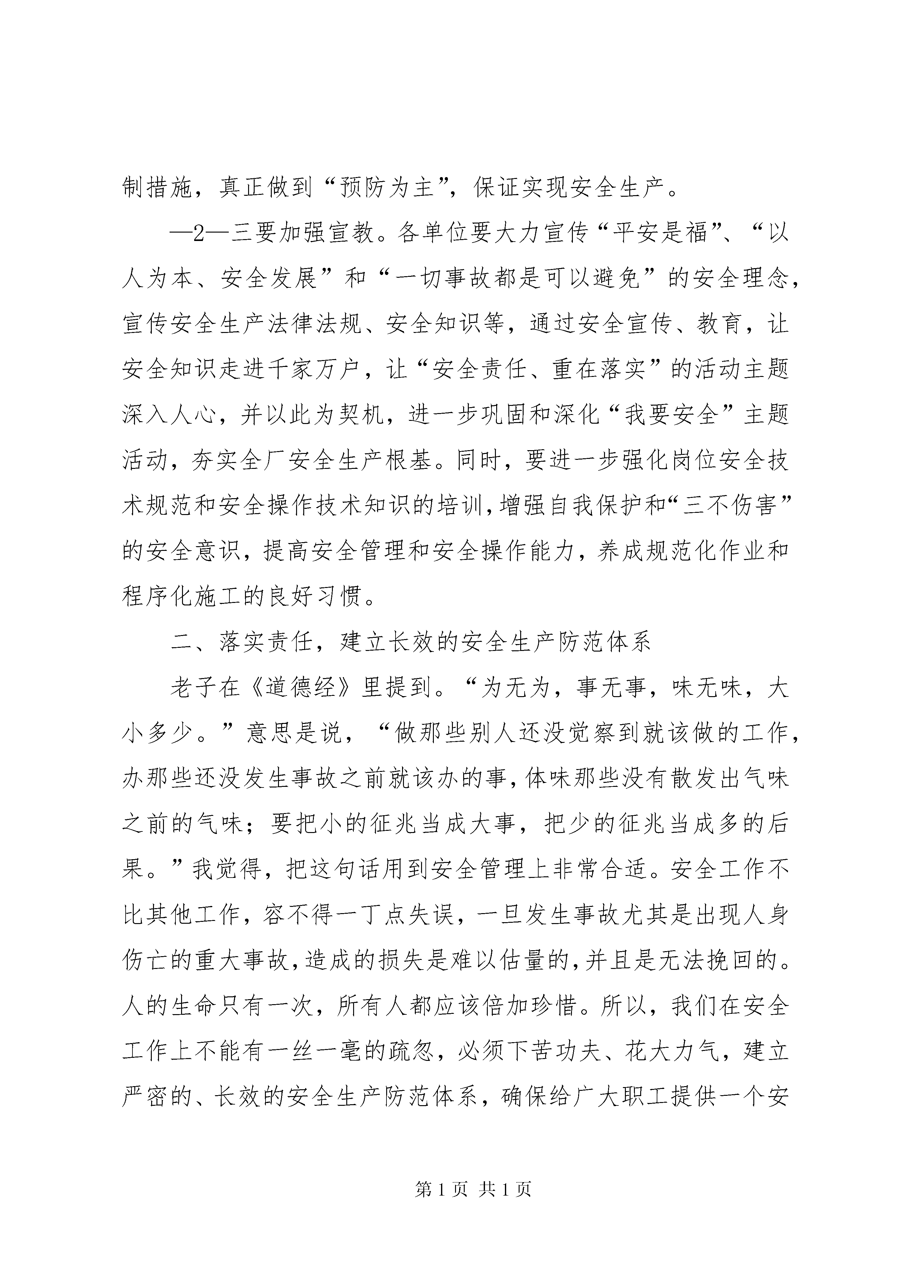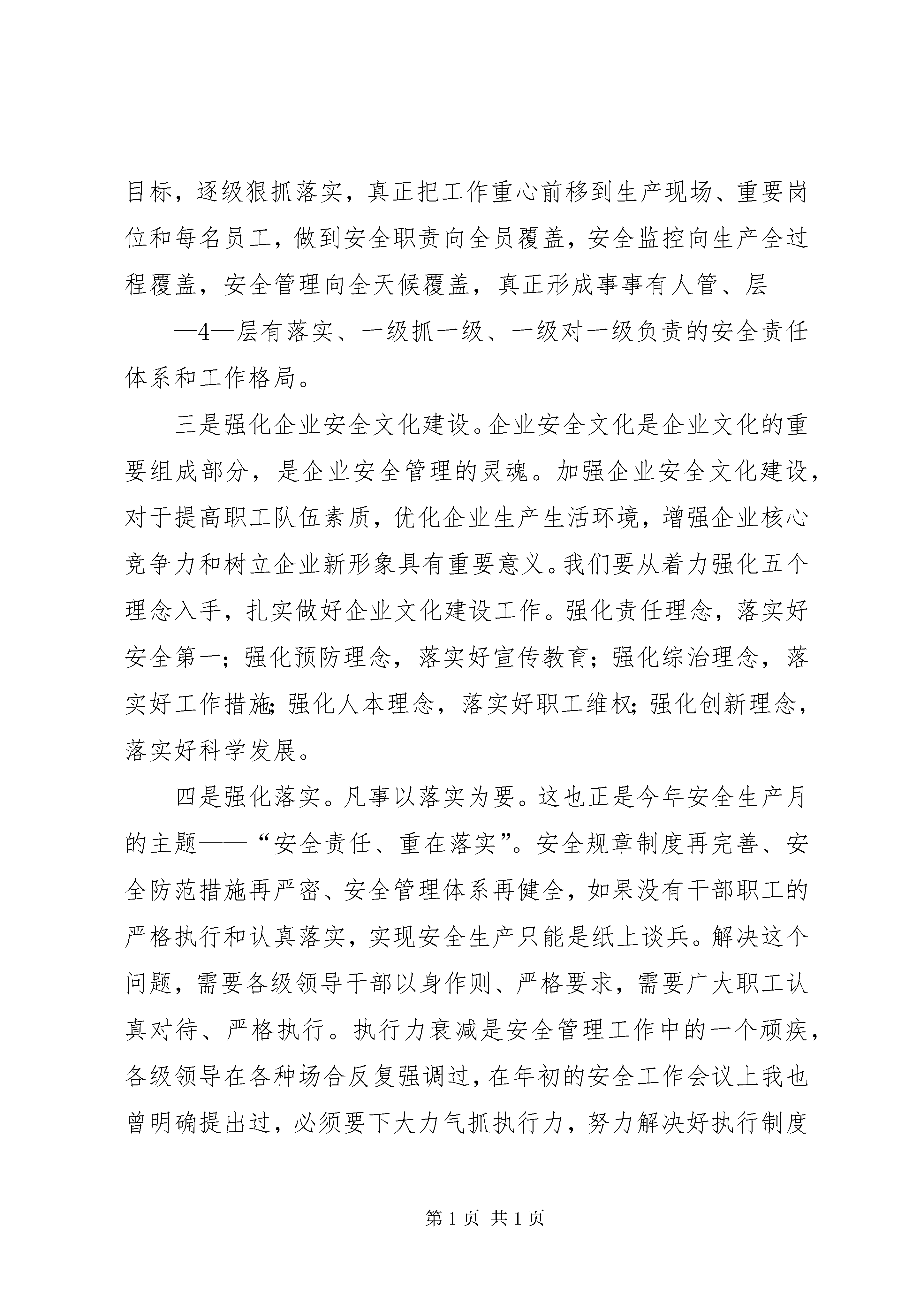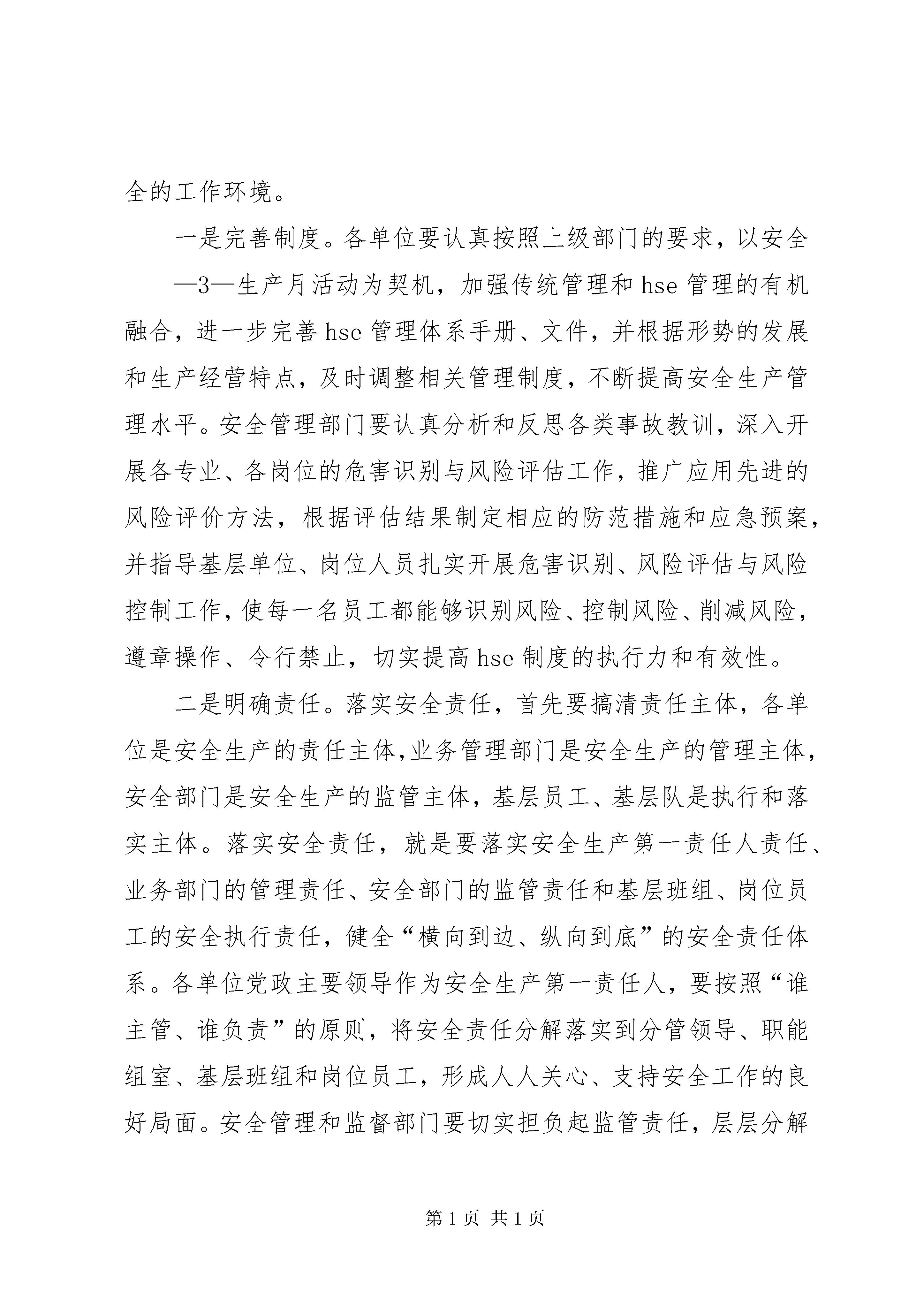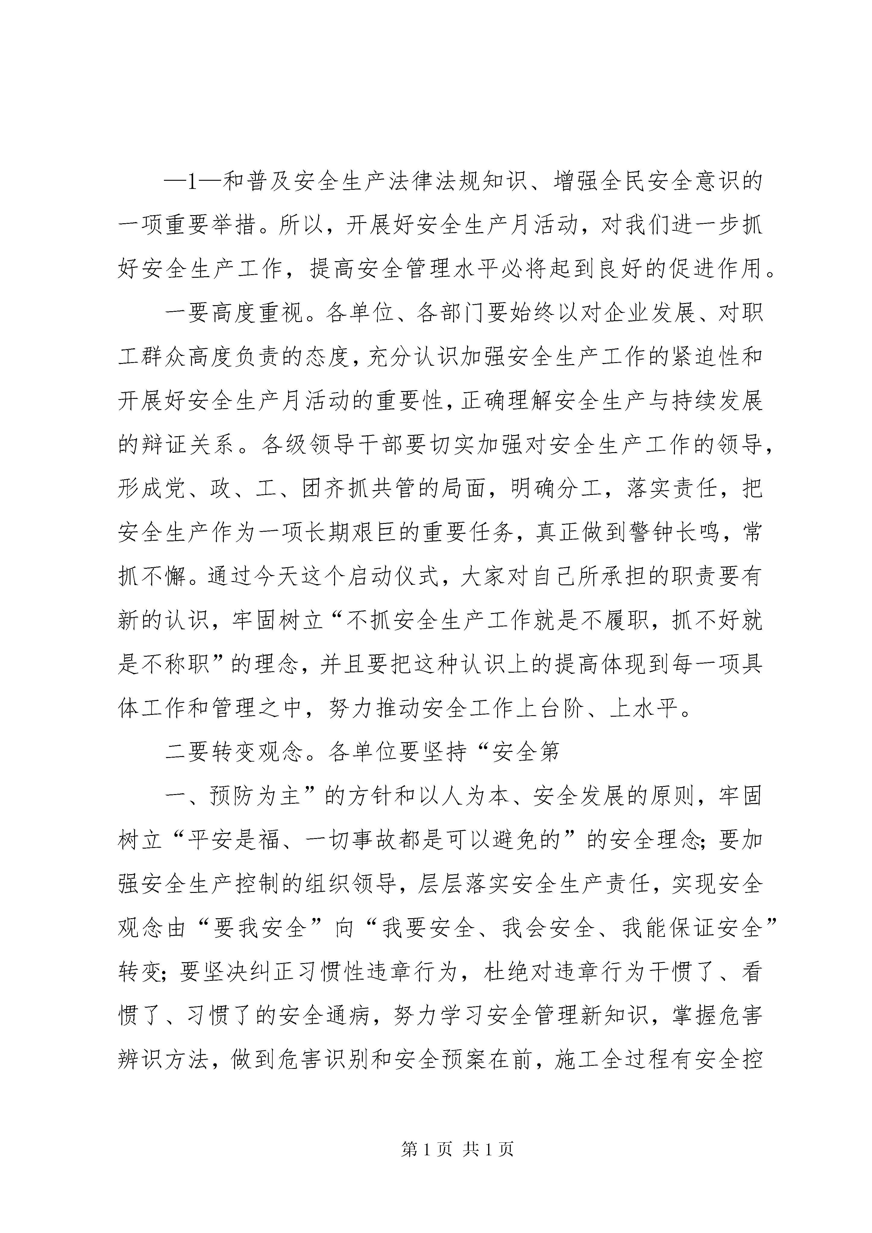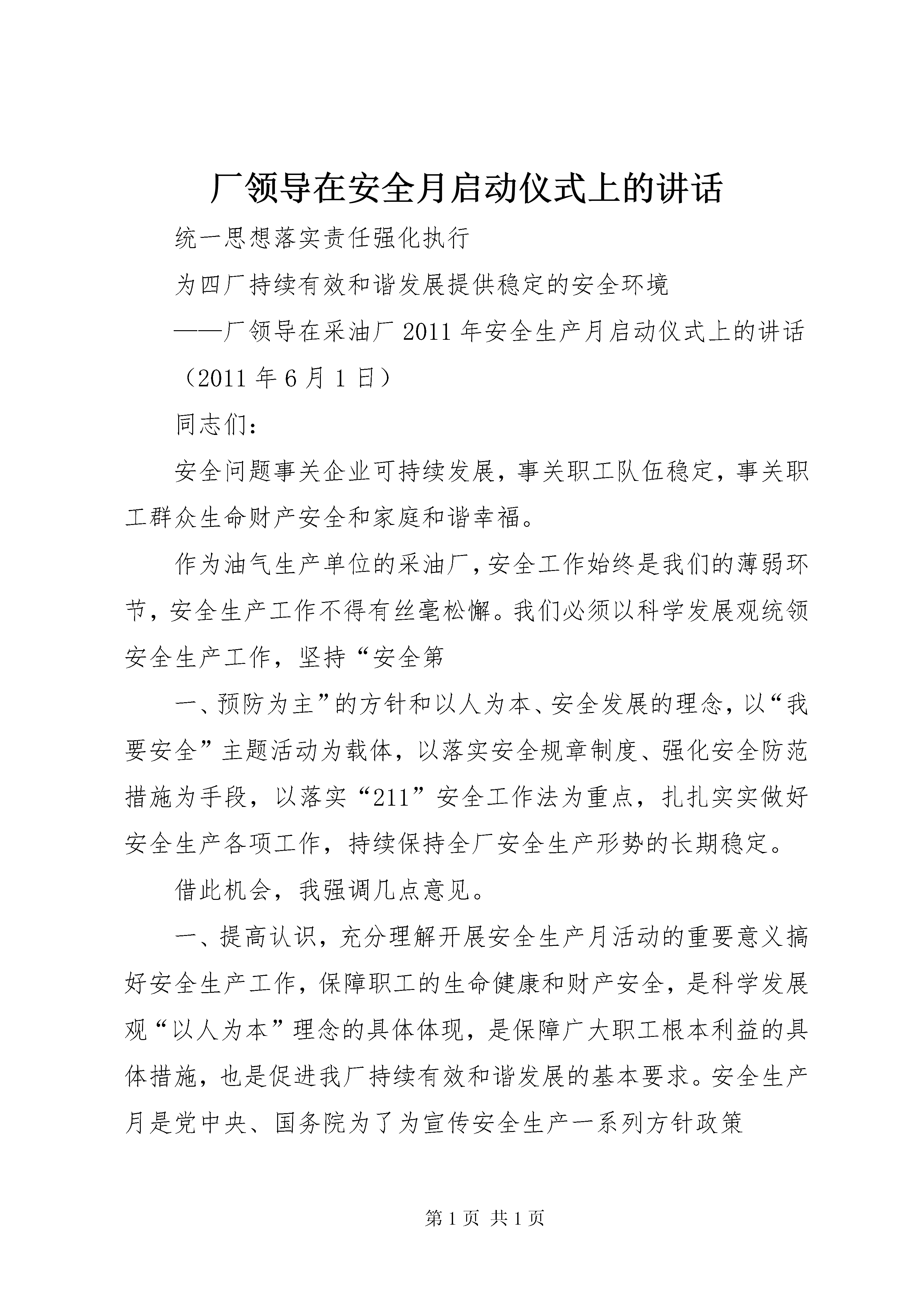 厂领导在安全月启动仪式上的讲话统一思想落实责任强化执行为四厂持续有效和谐发展提供稳定的安全环境——厂领导在采油厂2011年安全生产月启动仪式上的讲话(2011年6月1日)同志们:安全问题事关企业可持续发展,事关职工队伍稳定,事关职工群众生命财产安全和家庭和谐幸福。作为油气生产单位的采油厂,安全工作始终是我们的薄弱环节,安全生产工作不得有丝毫松懈。我们必须以科学发展观统领安全生产工作,坚持“安全第一、预防为主”的方针和以人为本、安全发展的理念,以“我要安全”主题活动为载体,以落实安全规章制度、强化安全防范措施为手段,以落实“211”安全工作法为重点,扎扎实实做好安全生产各项工作,持续保持全厂安全生产形势的长期稳定。借此机会,我强调几点意见。一、提高认识,充分理解开展安全生产月活动的重要意义搞好安全生产工作,保障职工的生命健康和财产安全,是科学发展观“以人为本”理念的具体体现,是保障广大职工根本利益的具体措施,也是促进我厂持续有效和谐发展的基本要求。安全生产月是党中央、国务院为了为宣传安全生产一系列方针政策—1—和普及安全生产法律法规知识、增强全民安全意识的一项重要举措。所以,开展好安全生产月活动,对我们进一步抓好安全生产工作,提高安全管理水平必将起到良好的促进作用。一要高度重视。各单位、各部门要始终以对企业发展、对职工群众高度负责的态度,充分认识加强安全生产工作的紧迫性和开展好安全生产月活动的重要性,正确理解安全生产与持续发展的辩证关系。各级领导干部要切实加强对安全生产工作的领导,形成党、政、工、团齐抓共管的局面,明确分工,落实责任,把安全生产作为一项长期艰巨的重要任务,真正做到警钟长鸣,常抓不懈。通过今天这个启动仪式,大家对自己所承担的职责要有新的认识,牢固树立“不抓安全生产工作就是不履职,抓不好就是不称职”的理念,并且要把这种认识上的提高体现到每一项具体工作和管理之中,努力推动安全工作上台阶、上水平。二要转变观念。各单位要坚持“安全第一、预防为主”的方针和以人为本、安全发展的原则,牢固树立“平安是福、一切事故都是可以避免的”的安全理念;要加强安全生产控制的组织领导,层层落实安全生产责任,实现安全观念由“要我安全”向“我要安全、我会安全、我能保证安全”转变;要坚决纠正习惯性违章行为,杜绝对违章行为干惯了、看惯了、习惯了的安全通病,努力学习安全管理新知识,掌握危害辨识方法,做到危害识别和安全预案在前,施工全过程有安全控制措施,真正做到“预防为主”,保证实现安全生产。—2—三要加强宣教。各单位要大力宣传“平安是福”、“以人为本、安全发展”和“一切事故都是可以避免”的安全理念,宣传安全生产法律法规、安全知识等,通过安全宣传、教育,让安全知识走进千家万户,让“安全责任、重在落实”的活动主题深入人心,并以此为契机,进一步巩固和深化“我要安全”主题活动,夯实全厂安全生产根基。同时,要进一步强化岗位安全技术规范和安全操作技术知识的培训,增强自我保护和“三不伤害”的安全意识,提高安全管理和安全操作能力,养成规范化作业和程序化施工的良好习惯。二、落实责任,建立长效的安全生产防范体系老子在《道德经》里提到。“为无为,事无事,味无味,大小多少。”意思是说,“做那些别人还没觉察到就该做的工作,办那些还没发生事故之前就该办的事,体味那些没有散发出气味之前的气味;要把小的征兆当成大事,把少的征兆当成多的后果。”我觉得,把这句话用到安全管理上非常合适。安全工作不比其他工作,容不得一丁点失误,一旦发生事故尤其是出现人身伤亡的重大事故,造成的损失是难以估量的,并且是无法挽回的。人的生命只有一次,所有人都应该倍加珍惜。所以,我们在安全工作上不能有一丝一毫的疏忽,必须下苦功夫、花大力气,建立严密的、长效的安全生产防范体系,确保给广大职工提供一个安全的工作环境。一是完善制度。各单位要认真按照上级部门的要求,以安全—3—生产月活动为契机,加强传统管理和hse管理的有机融合,进一步完善hse管理体系手册、文件,并根据形势的发展和生产经营特点,及时调整相关管理制度,不断提高安全生产管理水平。安全管理部门要认真分析和反思各类事故教训,深入开展各专业、各岗位的危害识别与风险评估工作,推广应用先进的风险评价方法,根据评估结果制定相应的防范措施和应急预案,并指导基层单位、岗位人员扎实开展危害识别、风险评估与风险控制工作,使每一名员工都能够识别风险、控制风险、削减风险,遵章操作、令行禁止,切实提高hse制度的执行力和有效性。二是明确责任。落实安全责任,首先要搞清责任主体,各单位是安全生产的责任主体,业务管理部门是安全生产的管理主体,安全部门是安全生产的监管主体,基层员工、基层队是执行和落实主体。落实安全责任,就是要落实安全生产第一责任人责任、业务部门的管理