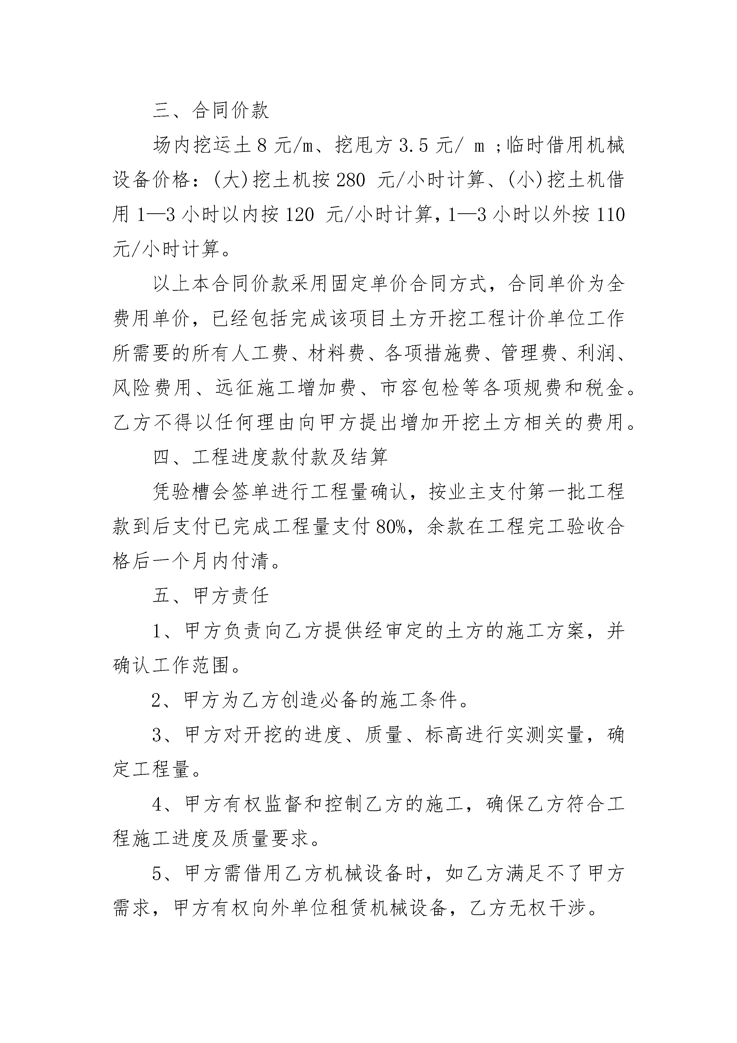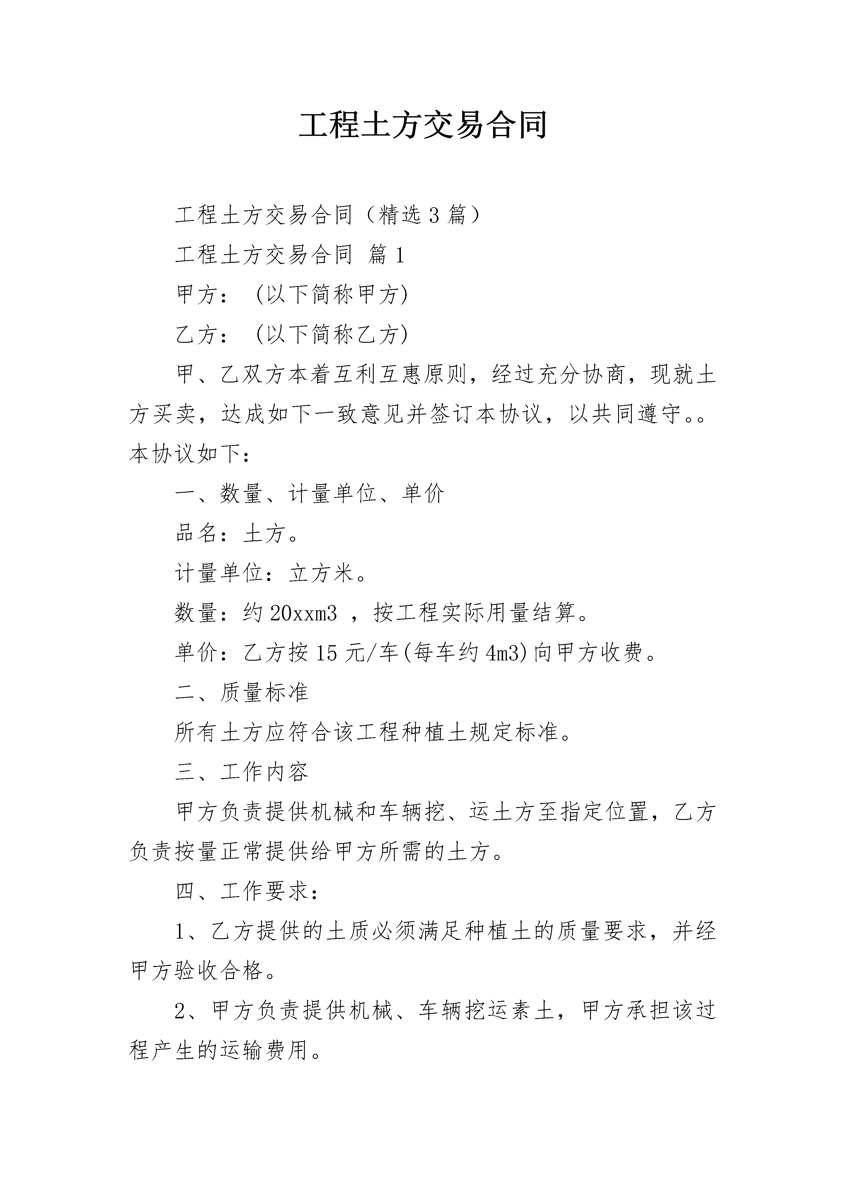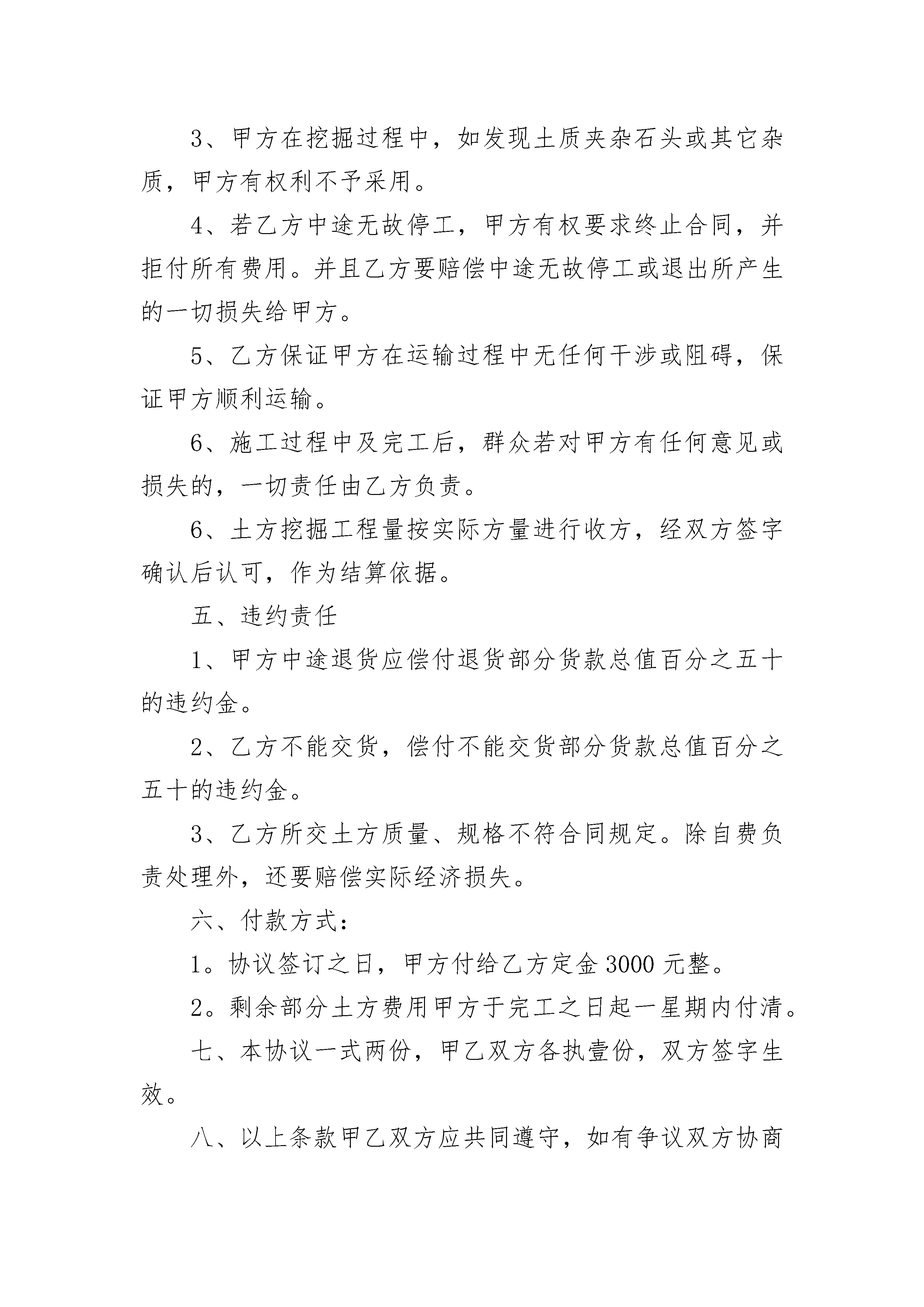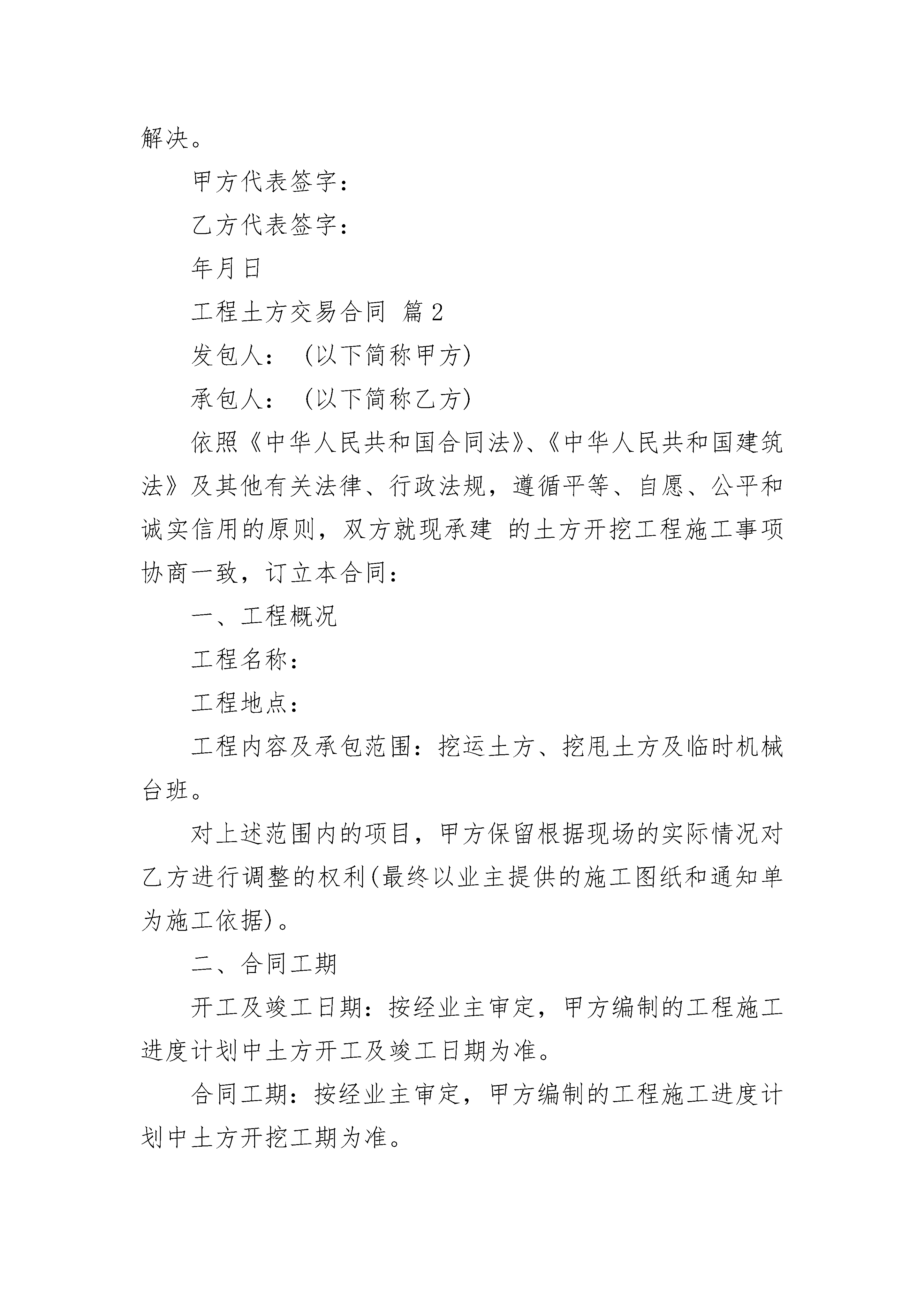 工程土方交易合同工程土方交易合同(精选3篇)工程土方交易合同篇1甲方:(以下简称甲方)乙方:(以下简称乙方)甲、乙双方本着互利互惠原则,经过充分协商,现就土方买卖,达成如下一致意见并签订本协议,以共同遵守。。本协议如下:一、数量、计量单位、单价品名:土方。计量单位:立方米。数量:约20xxm3,按工程实际用量结算。单价:乙方按15元/车(每车约4m3)向甲方收费。二、质量标准所有土方应符合该工程种植土规定标准。三、工作内容甲方负责提供机械和车辆挖、运土方至指定位置,乙方负责按量正常提供给甲方所需的土方。四、工作要求:1、乙方提供的土质必须满足种植土的质量要求,并经甲方验收合格。2、甲方负责提供机械、车辆挖运素土,甲方承担该过程产生的运输费用。3、甲方在挖掘过程中,如发现土质夹杂石头或其它杂质,甲方有权利不予采用。4、若乙方中途无故停工,甲方有权要求终止合同,并拒付所有费用。并且乙方要赔偿中途无故停工或退出所产生的一切损失给甲方。5、乙方保证甲方在运输过程中无任何干涉或阻碍,保证甲方顺利运输。6、施工过程中及完工后,群众若对甲方有任何意见或损失的,一切责任由乙方负责。6、土方挖掘工程量按实际方量进行收方,经双方签字确认后认可,作为结算依据。五、违约责任1、甲方中途退货应偿付退货部分货款总值百分之五十的违约金。2、乙方不能交货,偿付不能交货部分货款总值百分之五十的违约金。3、乙方所交土方质量、规格不符合同规定。除自费负责处理外,还要赔偿实际经济损失。六、付款方式:1。协议签订之日,甲方付给乙方定金3000元整。2。剩余部分土方费用甲方于完工之日起一星期内付清。七、本协议一式两份,甲乙双方各执壹份,双方签字生效。八、以上条款甲乙双方应共同遵守,如有争议双方协商解决。甲方代表签字:乙方代表签字:年月日工程土方交易合同篇2发包人:(以下简称甲方)承包人:(以下简称乙方)依照《中华人民共和国合同法》、《中华人民共和国建筑法》及其他有关法律、行政法规,遵循平等、自愿、公平和诚实信用的原则,双方就现承建的土方开挖工程施工事项协商一致,订立本合同:一、工程概况工程名称:工程地点:工程内容及承包范围:挖运土方、挖甩土方及临时机械台班。对上述范围内的项目,甲方保留根据现场的实际情况对乙方进行调整的权利(最终以业主提供的施工图纸和通知单为施工依据)。二、合同工期开工及竣工日期:按经业主审定,甲方编制的工程施工进度计划中土方开工及竣工日期为准。合同工期:按经业主审定,甲方编制的工程施工进度计划中土方开挖工期为准。三、合同价款场内挖运土8元/m、挖甩方3.5元/m;临时借用机械设备价格:(大)挖土机按280元/小时计算、(小)挖土机借用1—3小时以内按120元/小时计算,1—3小时以外按110元/小时计算。以上本合同价款采用固定单价合同方式,合同单价为全费用单价,已经包括完成该项目土方开挖工程计价单位工作所需要的所有人工费、材料费、各项措施费、管理费、利润、风险费用、远征施工增加费、市容包检等各项规费和税金。乙方不得以任何理由向甲方提出增加开挖土方相关的费用。四、工程进度款付款及结算凭验槽会签单进行工程量确认,按业主支付第一批工程款到后支付已完成工程量支付80%,余款在工程完工验收合格后一个月内付清。五、甲方责任1、甲方负责向乙方提供经审定的土方的施工方案,并确认工作范围。2、甲方为乙方创造必备的施工条件。3、甲方对开挖的进度、质量、标高进行实测实量,确定工程量。4、甲方有权监督和控制乙方的施工,确保乙方符合工程施工进度及质量要求。5、甲方需借用乙方机械设备时,如乙方满足不了甲方需求,甲方有权向外单位租赁机械设备,乙方无权干涉。六、乙方责任1、乙方需按甲方的要求组织设备进场,并确保施工机械正常运行。2、乙方施工过程中应按甲方及业主的质量、进度要求,在施工机械有效作业范围和现场满足运输的条件下,有序的进行开挖或甩方、土方驳运堆放,开挖过程中应满足甲方对基杭排水、围护、放坡、开挖深度等的控制要求。如乙方超挖(超深、超宽、超长),则超挖而增加的回填土工程费用、增加基础垫层工程费用也乙方承担。3、自觉接受甲方、监理单位、业主的质量监督、进度控制要求,服从和遵守甲方及业主单位和各项规章制度。如有违反,按有关的规定处罚。4、乙方对施工过程的机械设备的安全操作、文明施工承担全部责任。5、乙方无任何理由要求延长工期(不可抗拒力等原因除外),如甲方认为,工程或其任何部分施工进度太慢,而不能按合同预定的工程完工期限完工时,则甲方应将此情况书面通知乙方,加快施工进度,确保工程能在预定的工期内完工,乙方无权要求支付任何附加费用以及价格变更。6、乙方在办理工程结算时应提供建安发票(税务统一发票)。七、文明施工及安全生产1、乙方应保证施工场地及工地周边道路路面整洁并符合有关