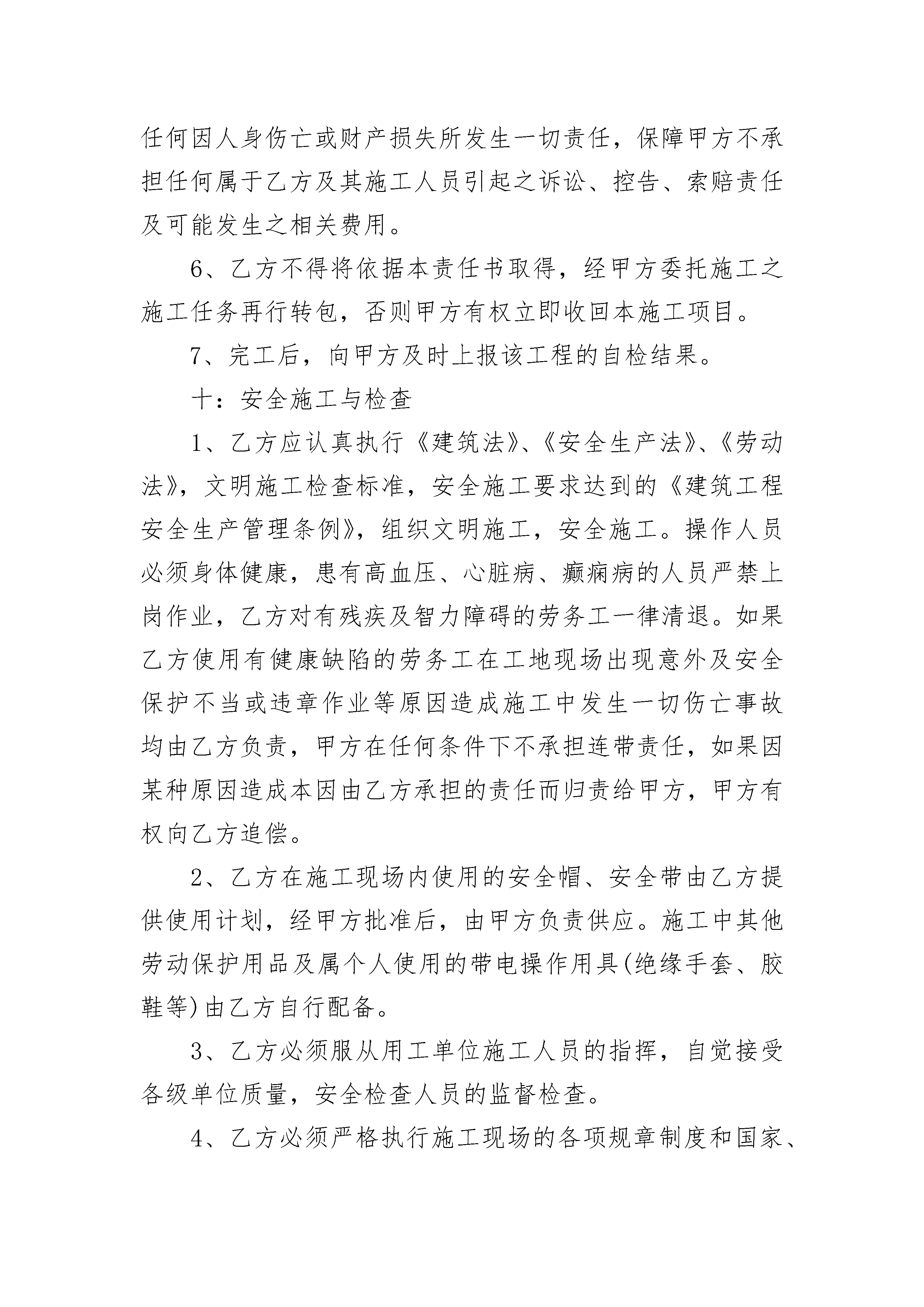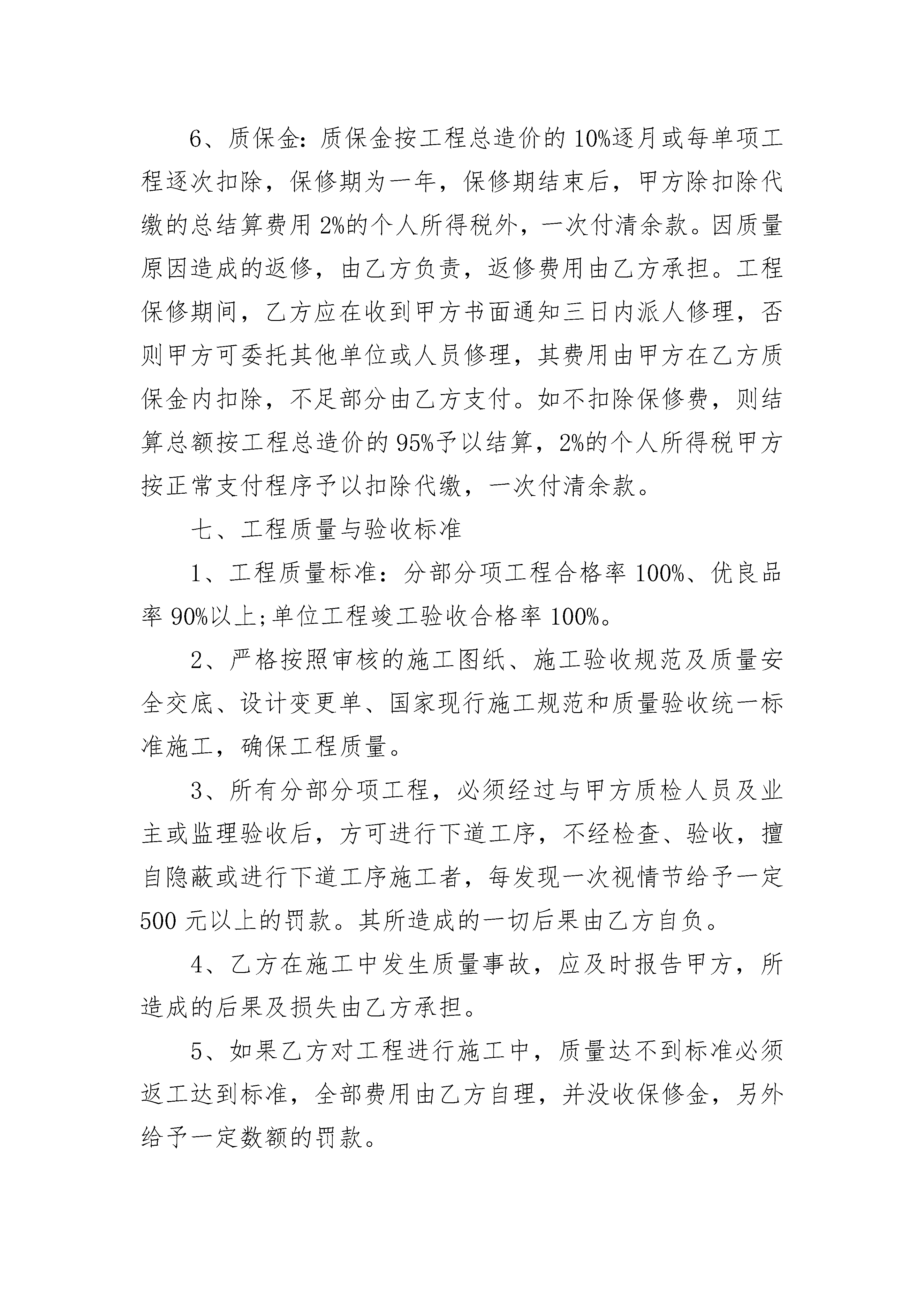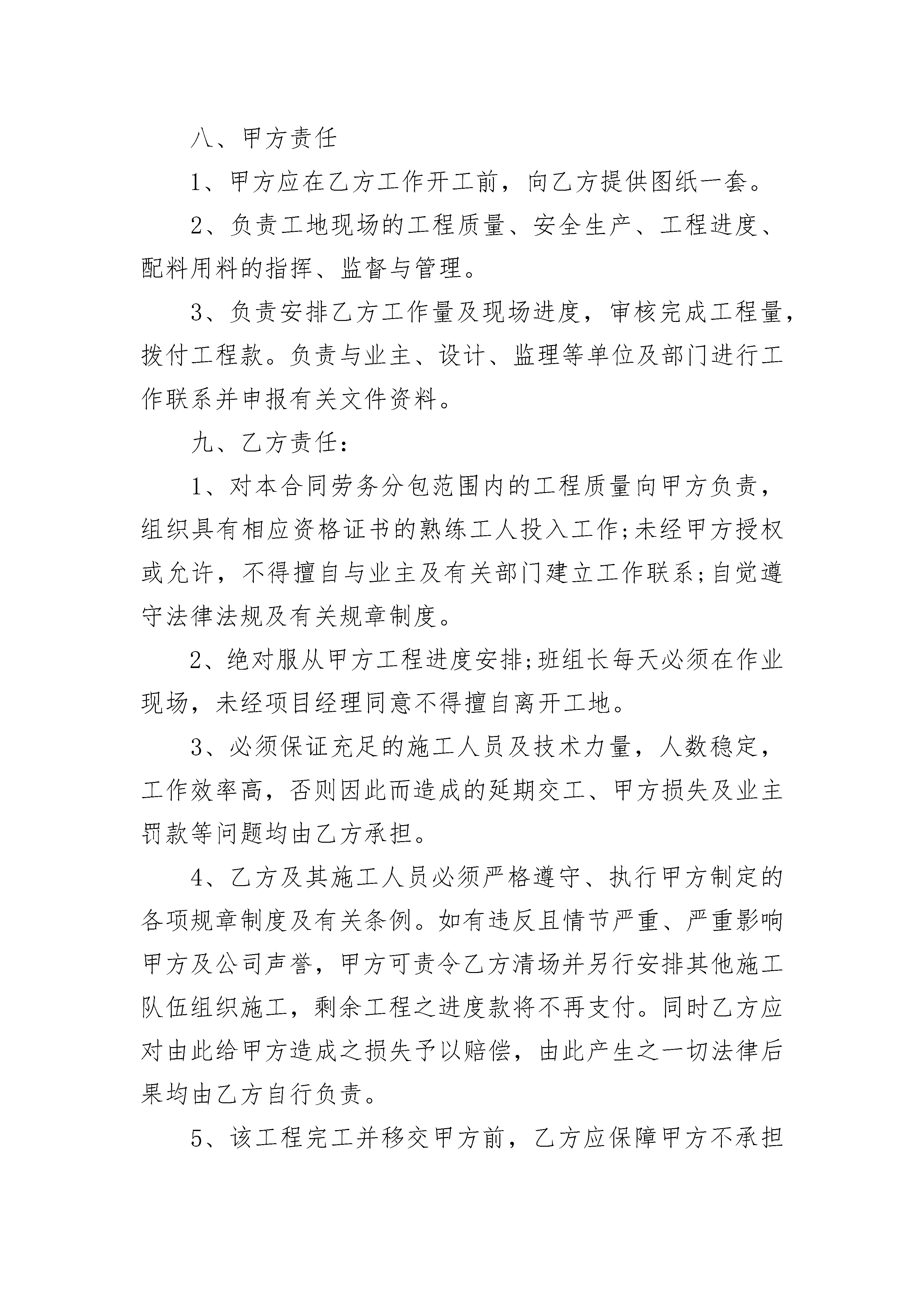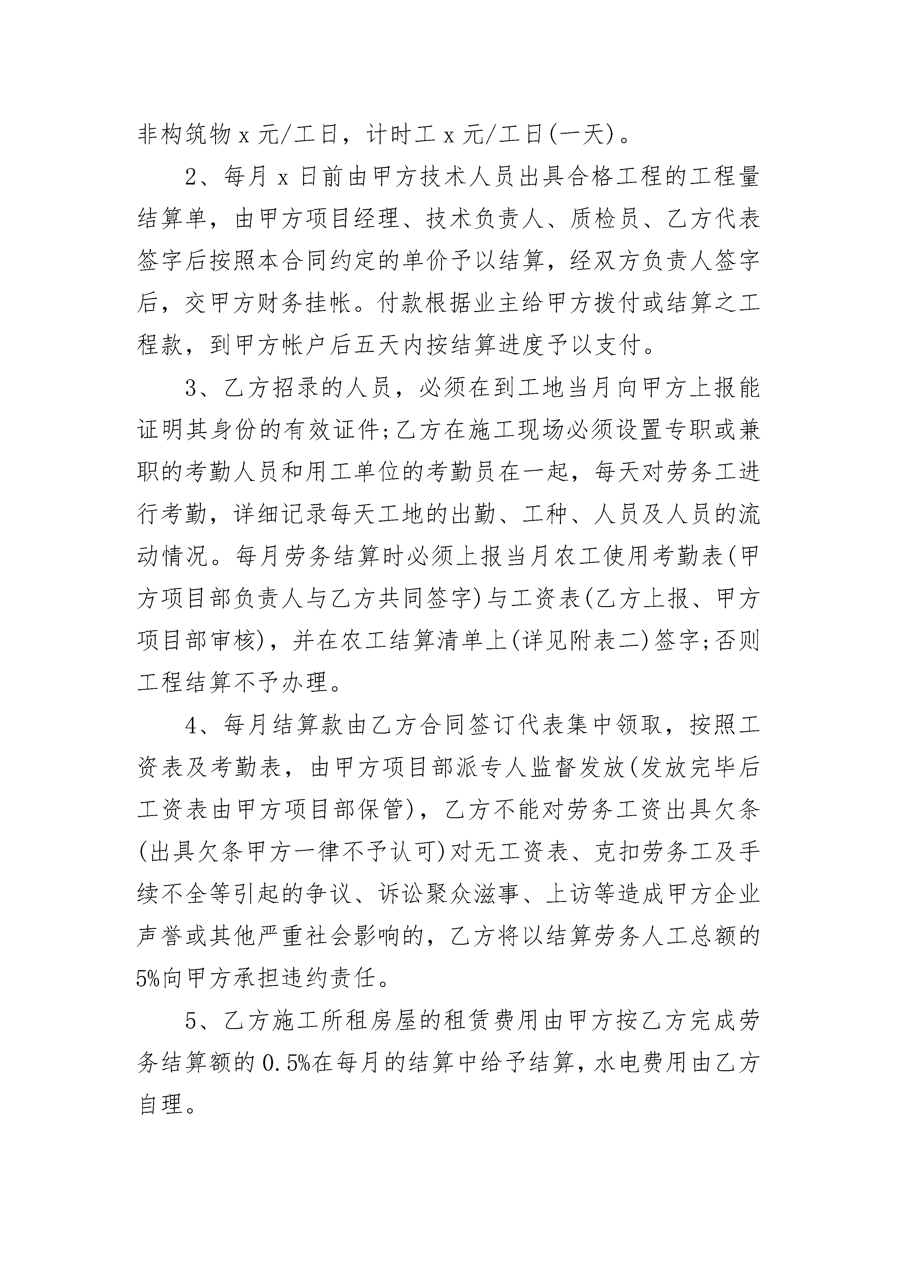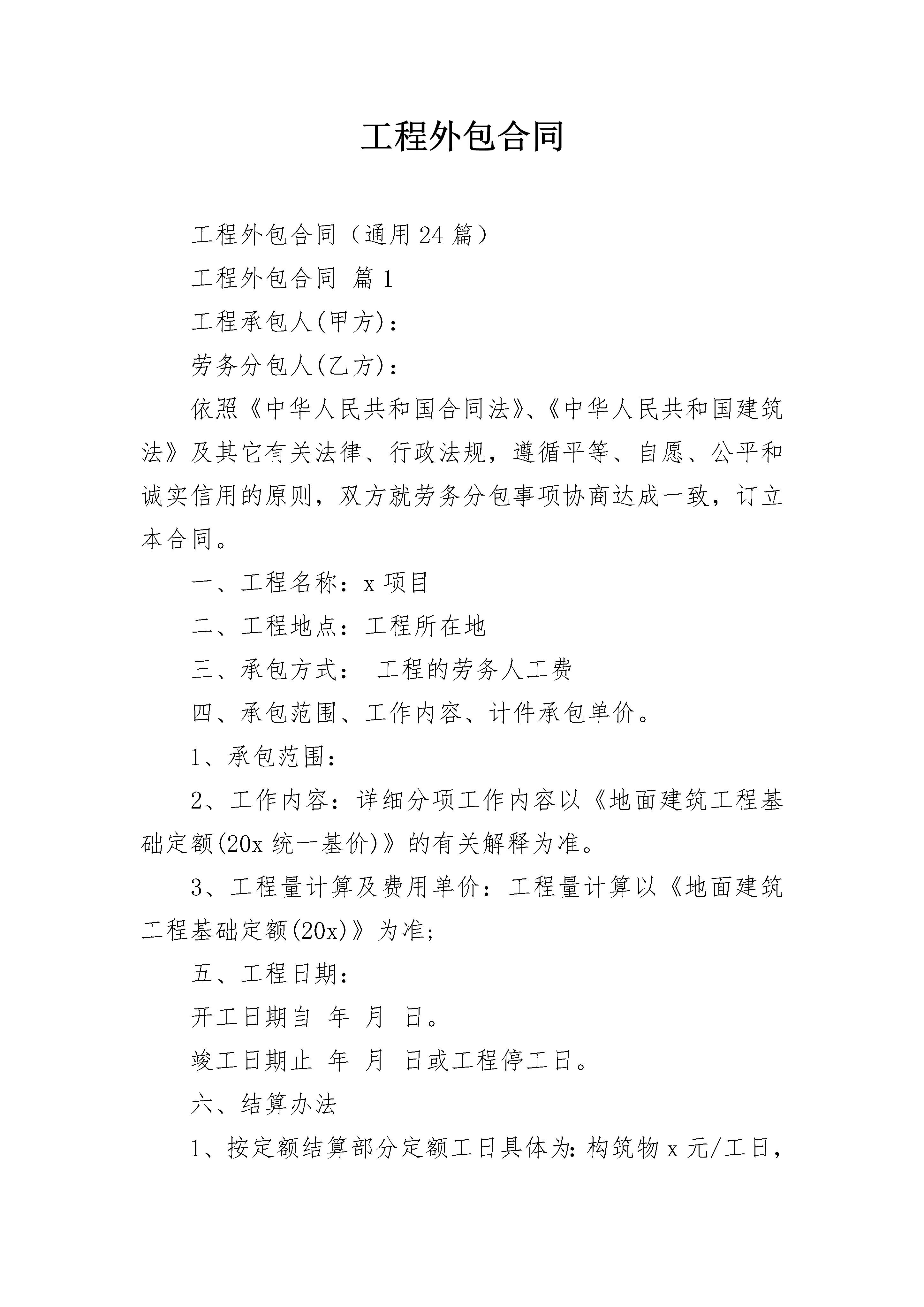 工程外包合同工程外包合同(通用24篇)工程外包合同篇1工程承包人(甲方):劳务分包人(乙方):依照《中华人民共和国合同法》、《中华人民共和国建筑法》及其它有关法律、行政法规,遵循平等、自愿、公平和诚实信用的原则,双方就劳务分包事项协商达成一致,订立本合同。一、工程名称:x项目二、工程地点:工程所在地三、承包方式:工程的劳务人工费四、承包范围、工作内容、计件承包单价。1、承包范围:2、工作内容:详细分项工作内容以《地面建筑工程基础定额(20x统一基价)》的有关解释为准。3、工程量计算及费用单价:工程量计算以《地面建筑工程基础定额(20x)》为准;五、工程日期:开工日期自年月日。竣工日期止年月日或工程停工日。六、结算办法1、按定额结算部分定额工日具体为:构筑物x元/工日,非构筑物x元/工日,计时工x元/工日(一天)。2、每月x日前由甲方技术人员出具合格工程的工程量结算单,由甲方项目经理、技术负责人、质检员、乙方代表签字后按照本合同约定的单价予以结算,经双方负责人签字后,交甲方财务挂帐。付款根据业主给甲方拨付或结算之工程款,到甲方帐户后五天内按结算进度予以支付。3、乙方招录的人员,必须在到工地当月向甲方上报能证明其身份的有效证件;乙方在施工现场必须设置专职或兼职的考勤人员和用工单位的考勤员在一起,每天对劳务工进行考勤,详细记录每天工地的出勤、工种、人员及人员的流动情况。每月劳务结算时必须上报当月农工使用考勤表(甲方项目部负责人与乙方共同签字)与工资表(乙方上报、甲方项目部审核),并在农工结算清单上(详见附表二)签字;否则工程结算不予办理。4、每月结算款由乙方合同签订代表集中领取,按照工资表及考勤表,由甲方项目部派专人监督发放(发放完毕后工资表由甲方项目部保管),乙方不能对劳务工资出具欠条(出具欠条甲方一律不予认可)对无工资表、克扣劳务工及手续不全等引起的争议、诉讼聚众滋事、上访等造成甲方企业声誉或其他严重社会影响的,乙方将以结算劳务人工总额的5%向甲方承担违约责任。5、乙方施工所租房屋的租赁费用由甲方按乙方完成劳务结算额的0.5%在每月的结算中给予结算,水电费用由乙方自理。6、质保金:质保金按工程总造价的10%逐月或每单项工程逐次扣除,保修期为一年,保修期结束后,甲方除扣除代缴的总结算费用2%的个人所得税外,一次付清余款。因质量原因造成的返修,由乙方负责,返修费用由乙方承担。工程保修期间,乙方应在收到甲方书面通知三日内派人修理,否则甲方可委托其他单位或人员修理,其费用由甲方在乙方质保金内扣除,不足部分由乙方支付。如不扣除保修费,则结算总额按工程总造价的95%予以结算,2%的个人所得税甲方按正常支付程序予以扣除代缴,一次付清余款。七、工程质量与验收标准1、工程质量标准:分部分项工程合格率100%、优良品率90%以上;单位工程竣工验收合格率100%。2、严格按照审核的施工图纸、施工验收规范及质量安全交底、设计变更单、国家现行施工规范和质量验收统一标准施工,确保工程质量。3、所有分部分项工程,必须经过与甲方质检人员及业主或监理验收后,方可进行下道工序,不经检查、验收,擅自隐蔽或进行下道工序施工者,每发现一次视情节给予一定500元以上的罚款。其所造成的一切后果由乙方自负。4、乙方在施工中发生质量事故,应及时报告甲方,所造成的后果及损失由乙方承担。5、如果乙方对工程进行施工中,质量达不到标准必须返工达到标准,全部费用由乙方自理,并没收保修金,另外给予一定数额的罚款。八、甲方责任1、甲方应在乙方工作开工前,向乙方提供图纸一套。2、负责工地现场的工程质量、安全生产、工程进度、配料用料的指挥、监督与管理。3、负责安排乙方工作量及现场进度,审核完成工程量,拨付工程款。负责与业主、设计、监理等单位及部门进行工作联系并申报有关文件资料。九、乙方责任:1、对本合同劳务分包范围内的工程质量向甲方负责,组织具有相应资格证书的熟练工人投入工作;未经甲方授权或允许,不得擅自与业主及有关部门建立工作联系;自觉遵守法律法规及有关规章制度。2、绝对服从甲方工程进度安排;班组长每天必须在作业现场,未经项目经理同意不得擅自离开工地。3、必须保证充足的施工人员及技术力量,人数稳定,工作效率高,否则因此而造成的延期交工、甲方损失及业主罚款等问题均由乙方承担。4、乙方及其施工人员必须严格遵守、执行甲方制定的各项规章制度及有关条例。如有违反且情节严重、严重影响甲方及公司声誉,甲方可责令乙方清场并另行安排其他施工队伍组织施工,剩余工程之进度款将不再支付。同时乙方应对由此给甲方造成之损失予以赔偿,由此产生之一切法律后果均由乙方自行负责。5、该工程完工并移交甲方前,乙方应保障甲方不承担任何因人身伤亡或财产损失所发生一切责任,保障甲方不承担任何属于乙方及其施工人员引起之诉讼、控告、索赔