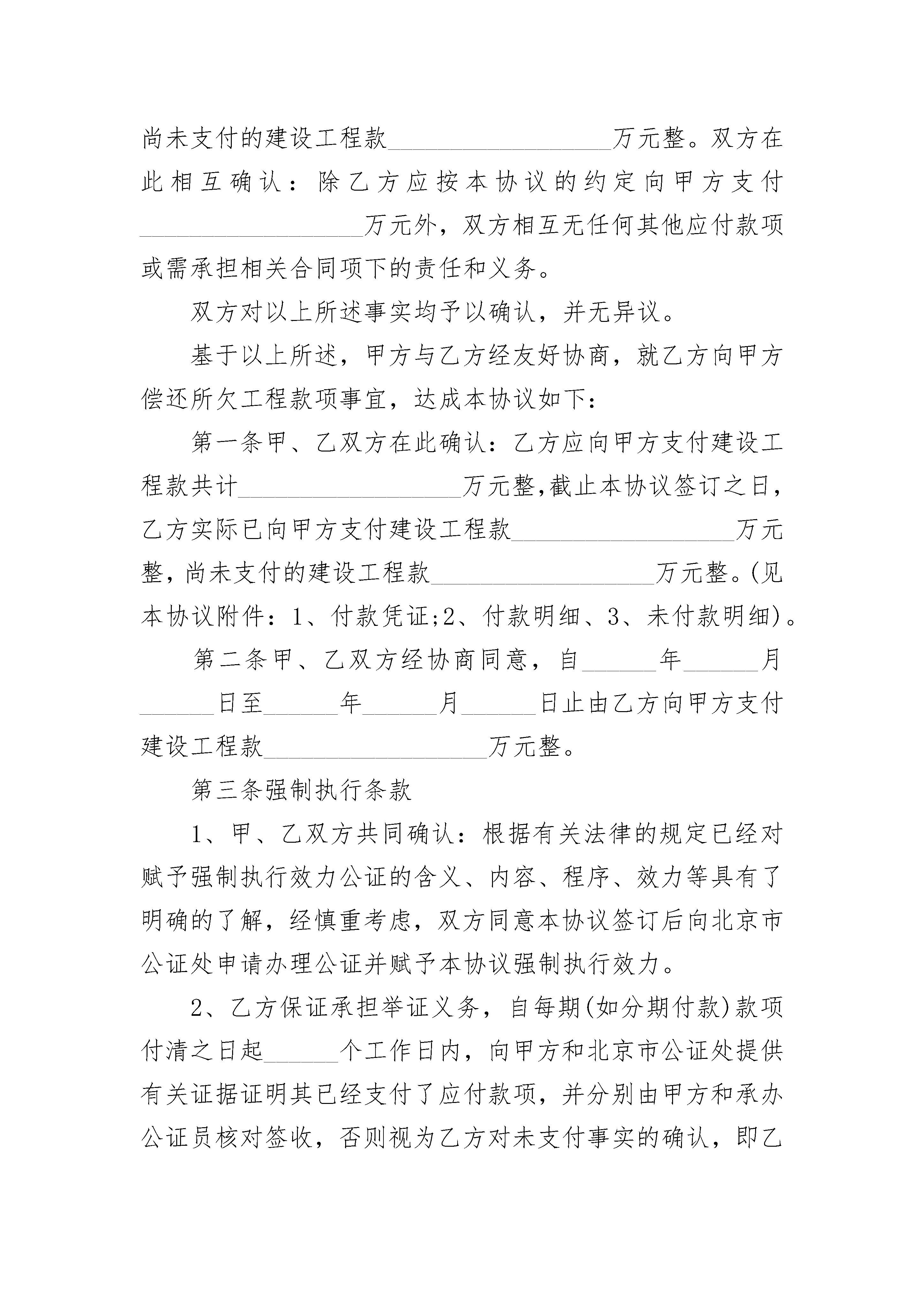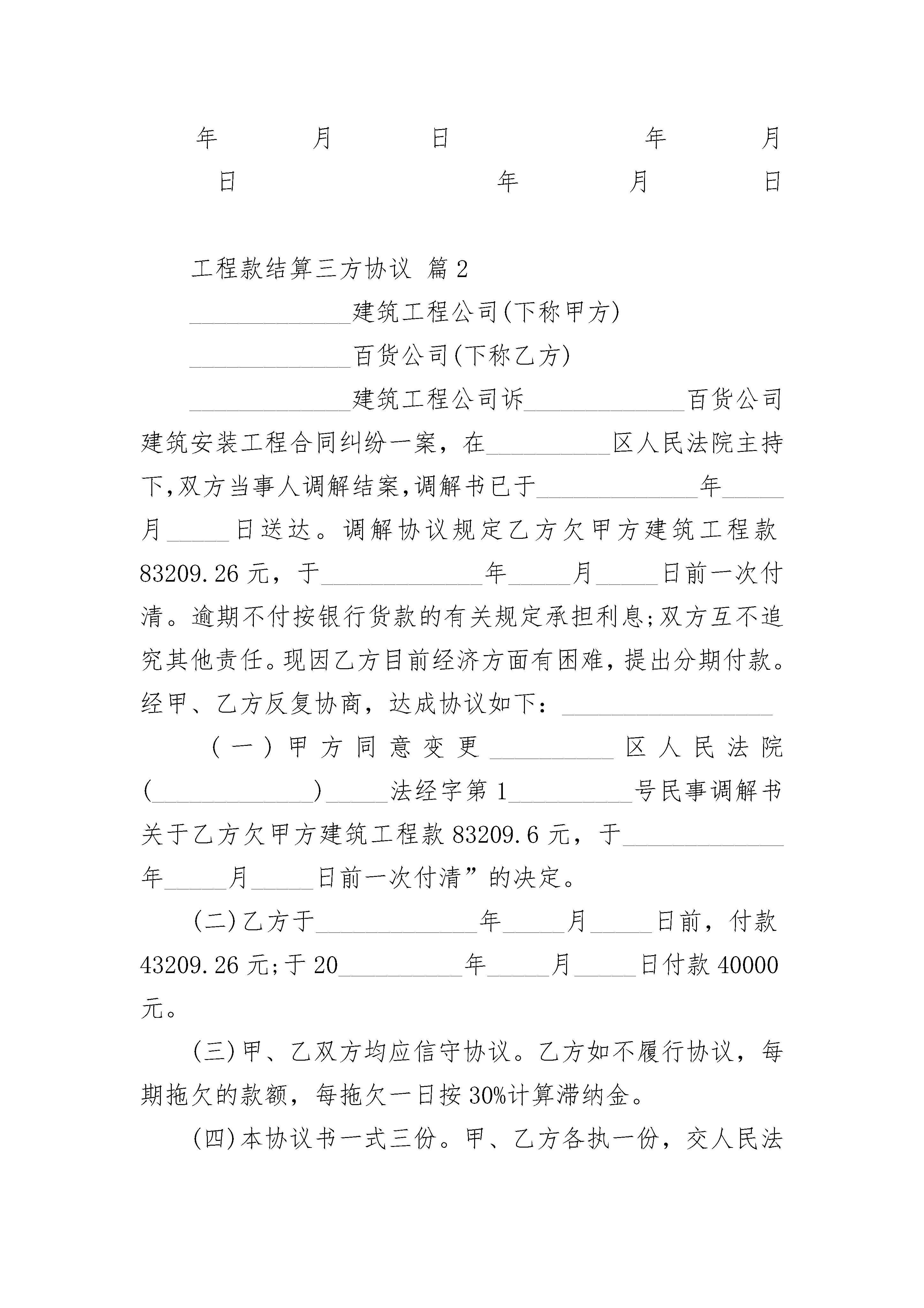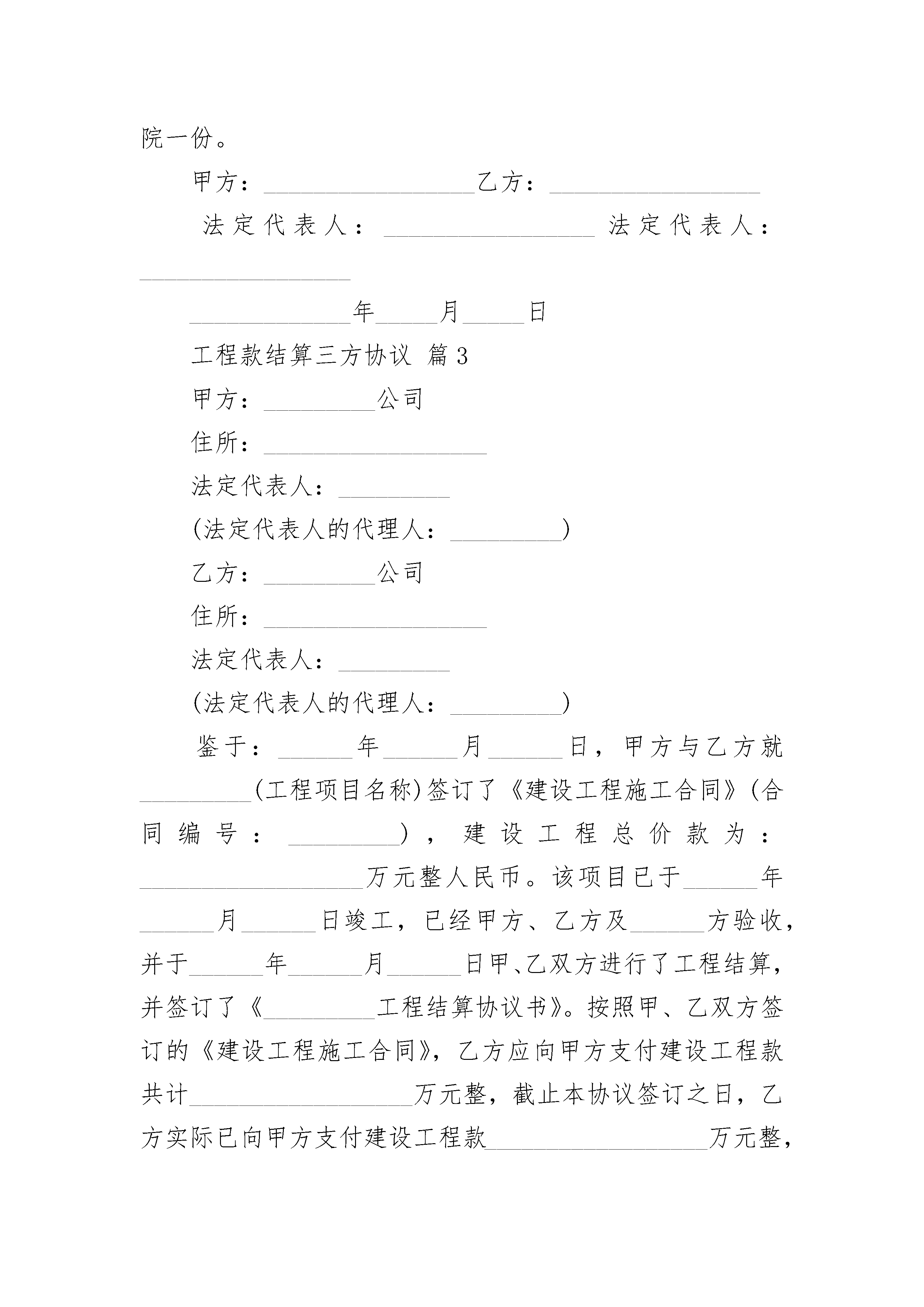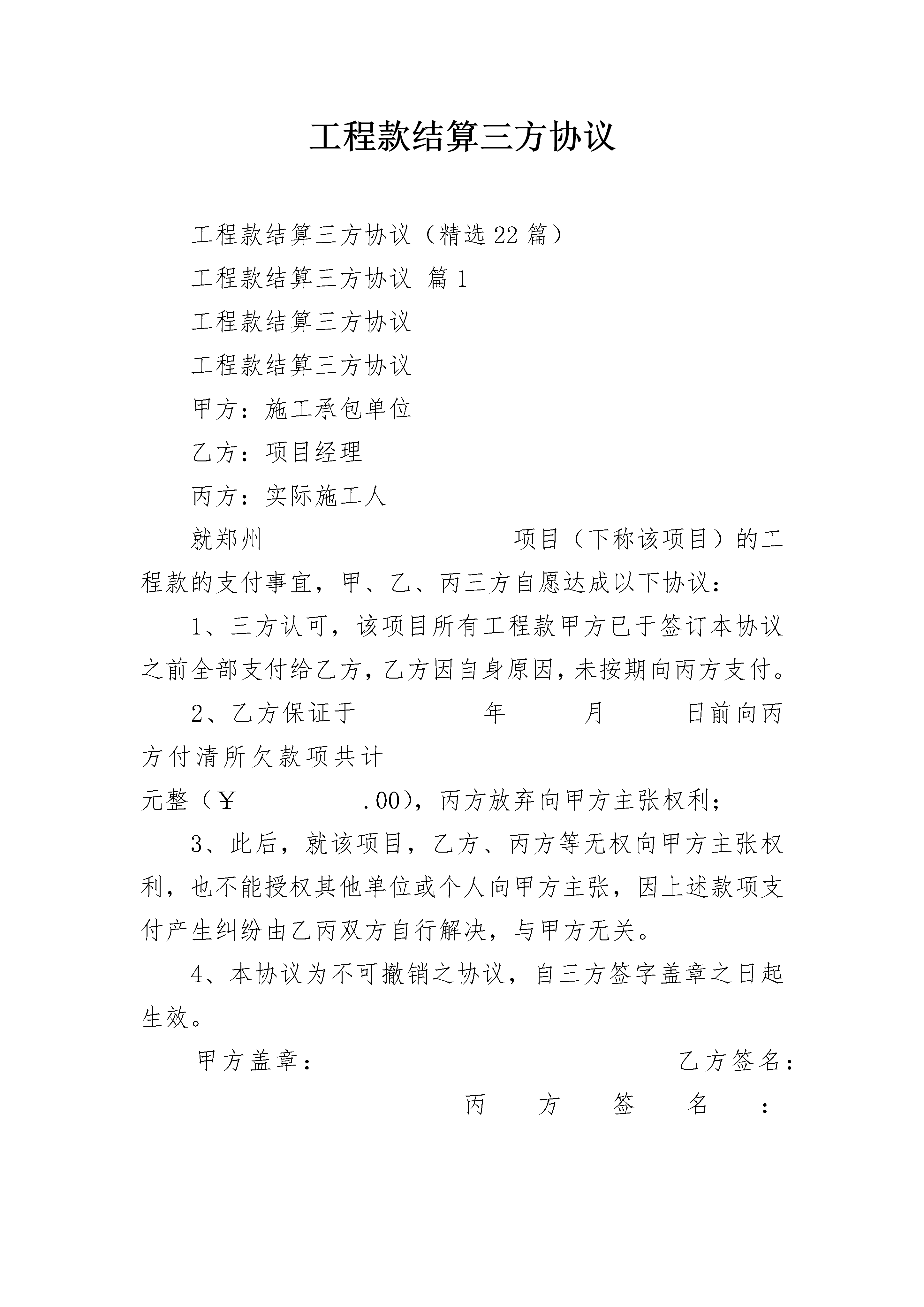 工程款结算三方协议工程款结算三方协议(精选22篇)工程款结算三方协议篇1工程款结算三方协议工程款结算三方协议甲方:施工承包单位乙方:项目经理丙方:实际施工人就郑州项目(下称该项目)的工程款的支付事宜,甲、乙、丙三方自愿达成以下协议:1、三方认可,该项目所有工程款甲方已于签订本协议之前全部支付给乙方,乙方因自身原因,未按期向丙方支付。2、乙方保证于年月日前向丙方付清所欠款项共计元整(¥.00),丙方放弃向甲方主张权利;3、此后,就该项目,乙方、丙方等无权向甲方主张权利,也不能授权其他单位或个人向甲方主张,因上述款项支付产生纠纷由乙丙双方自行解决,与甲方无关。4、本协议为不可撤销之协议,自三方签字盖章之日起生效。甲方盖章:乙方签名:丙方签名:年月日年月日年月日工程款结算三方协议篇2_____________建筑工程公司(下称甲方)_____________百货公司(下称乙方)_____________建筑工程公司诉_____________百货公司建筑安装工程合同纠纷一案,在__________区人民法院主持下,双方当事人调解结案,调解书已于_____________年_____月_____日送达。调解协议规定乙方欠甲方建筑工程款83209.26元,于_____________年_____月_____日前一次付清。逾期不付按银行货款的有关规定承担利息;双方互不追究其他责任。现因乙方目前经济方面有困难,提出分期付款。经甲、乙方反复协商,达成协议如下:_________________(一)甲方同意变更__________区人民法院(_____________)_____法经字第1__________号民事调解书关于乙方欠甲方建筑工程款83209.6元,于_____________年_____月_____日前一次付清”的决定。(二)乙方于_____________年_____月_____日前,付款43209.26元;于20__________年_____月_____日付款40000元。(三)甲、乙双方均应信守协议。乙方如不履行协议,每期拖欠的款额,每拖欠一日按30%计算滞纳金。(四)本协议书一式三份。甲、乙方各执一份,交人民法院一份。甲方:_________________乙方:_________________法定代表人:_________________法定代表人:______________________________年_____月_____日工程款结算三方协议篇3甲方:_________公司住所:__________________法定代表人:_________(法定代表人的代理人:_________)乙方:_________公司住所:__________________法定代表人:_________(法定代表人的代理人:_________)鉴于:______年______月______日,甲方与乙方就_________(工程项目名称)签订了《建设工程施工合同》(合同编号:_________),建设工程总价款为:__________________万元整人民币。该项目已于______年______月______日竣工,已经甲方、乙方及______方验收,并于______年______月______日甲、乙双方进行了工程结算,并签订了《_________工程结算协议书》。按照甲、乙双方签订的《建设工程施工合同》,乙方应向甲方支付建设工程款共计__________________万元整,截止本协议签订之日,乙方实际已向甲方支付建设工程款__________________万元整,尚未支付的建设工程款__________________万元整。双方在此相互确认:除乙方应按本协议的约定向甲方支付__________________万元外,双方相互无任何其他应付款项或需承担相关合同项下的责任和义务。双方对以上所述事实均予以确认,并无异议。基于以上所述,甲方与乙方经友好协商,就乙方向甲方偿还所欠工程款项事宜,达成本协议如下:第一条甲、乙双方在此确认:乙方应向甲方支付建设工程款共计__________________万元整,截止本协议签订之日,乙方实际已向甲方支付建设工程款__________________万元整,尚未支付的建设工程款__________________万元整。(见本协议附件:1、付款凭证;2、付款明细、3、未付款明细)。第二条甲、乙双方经协商同意,自______年____