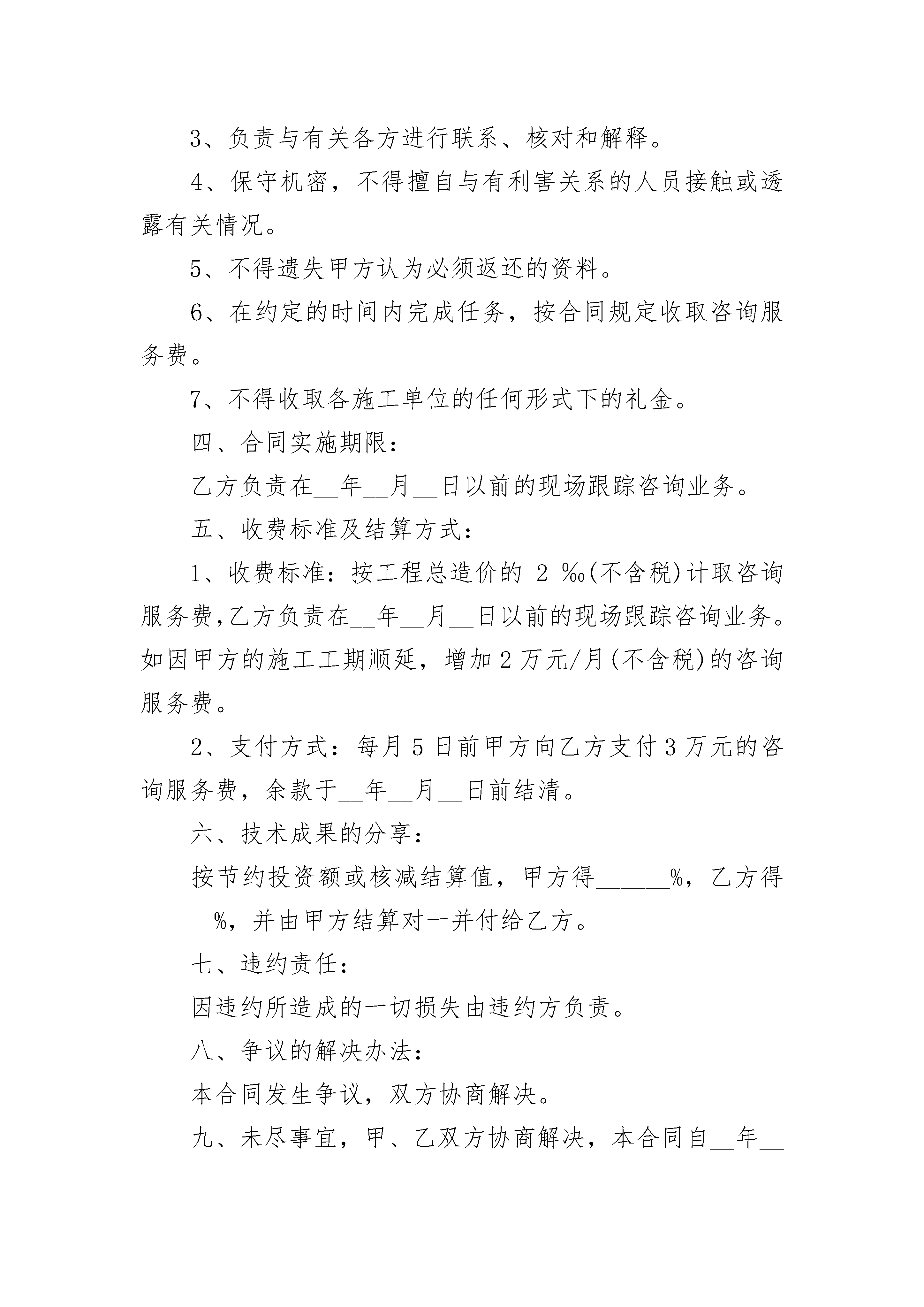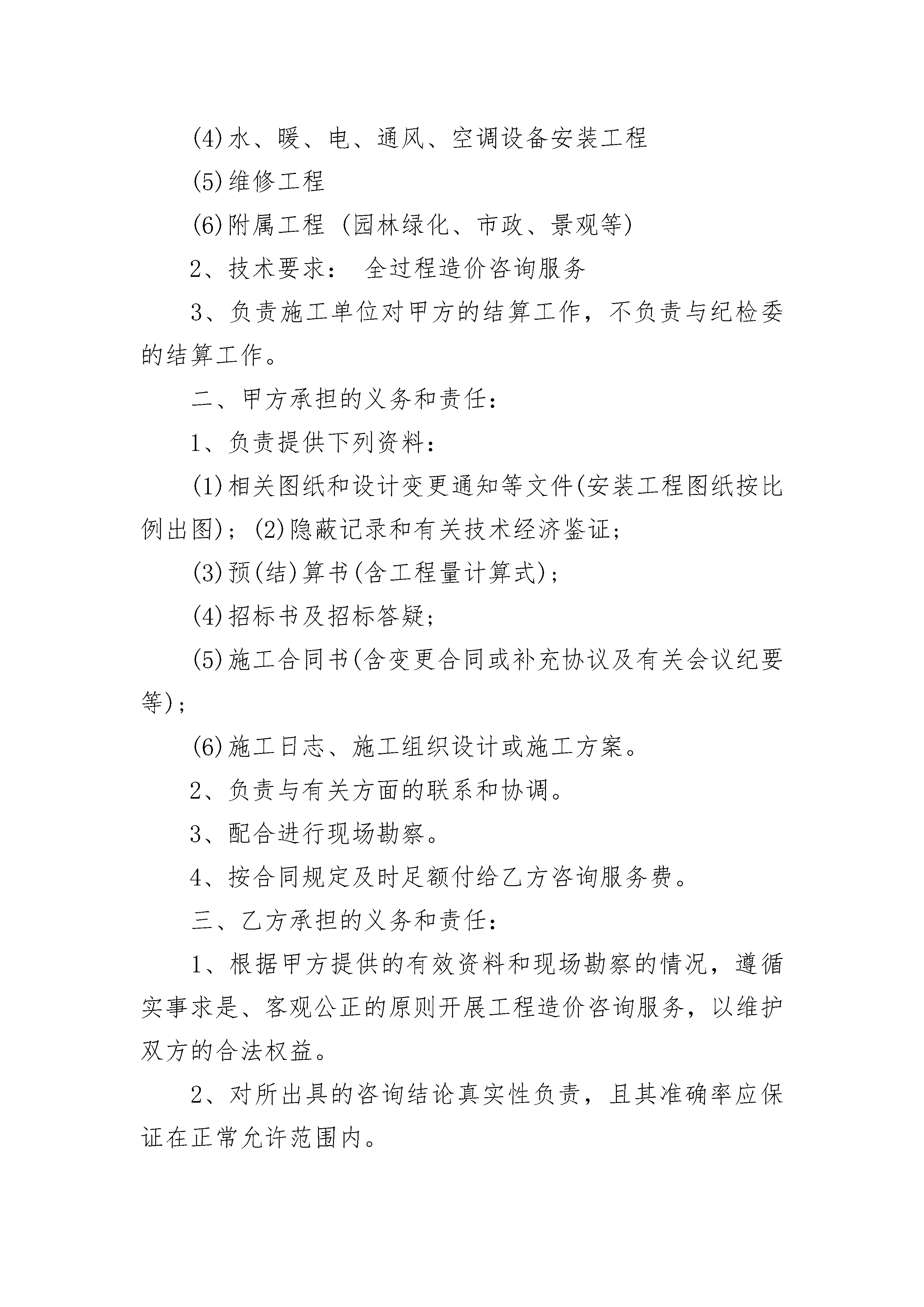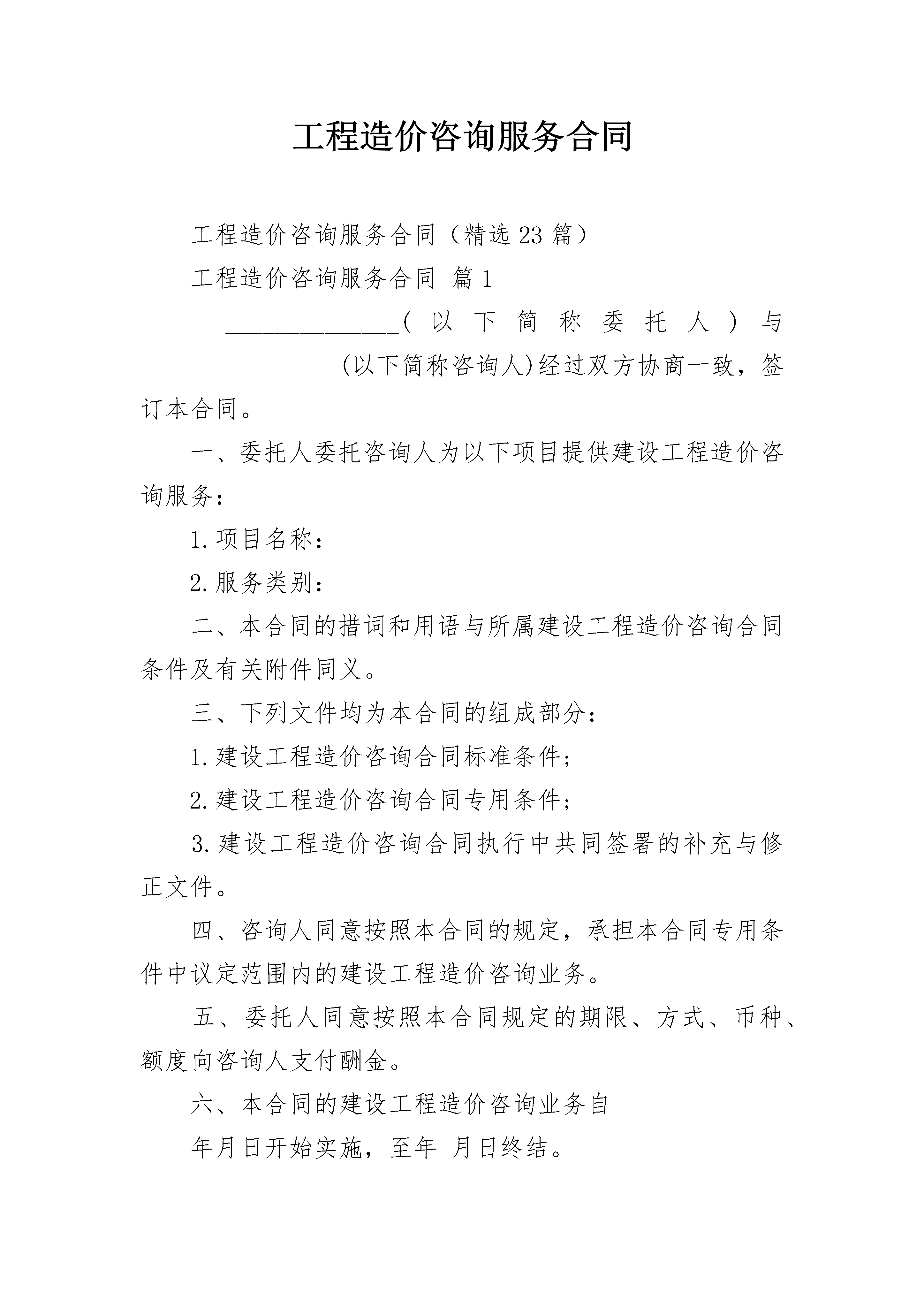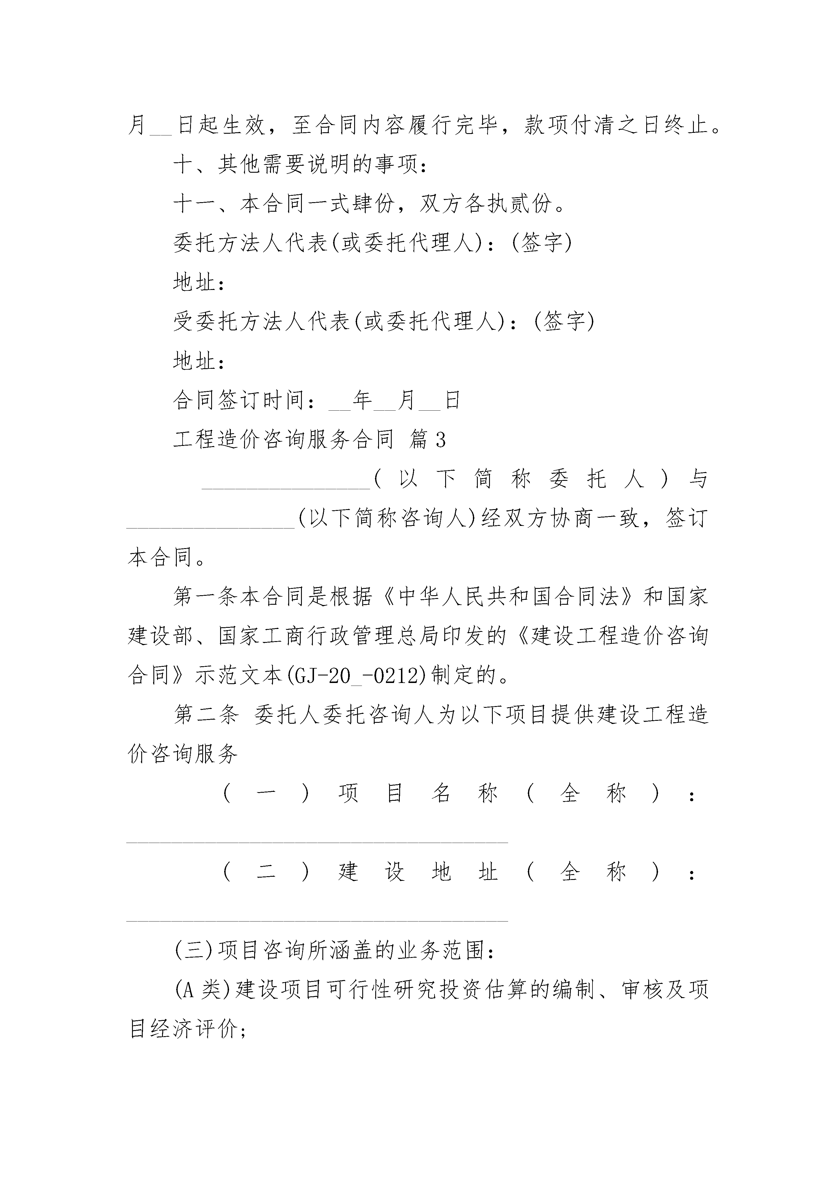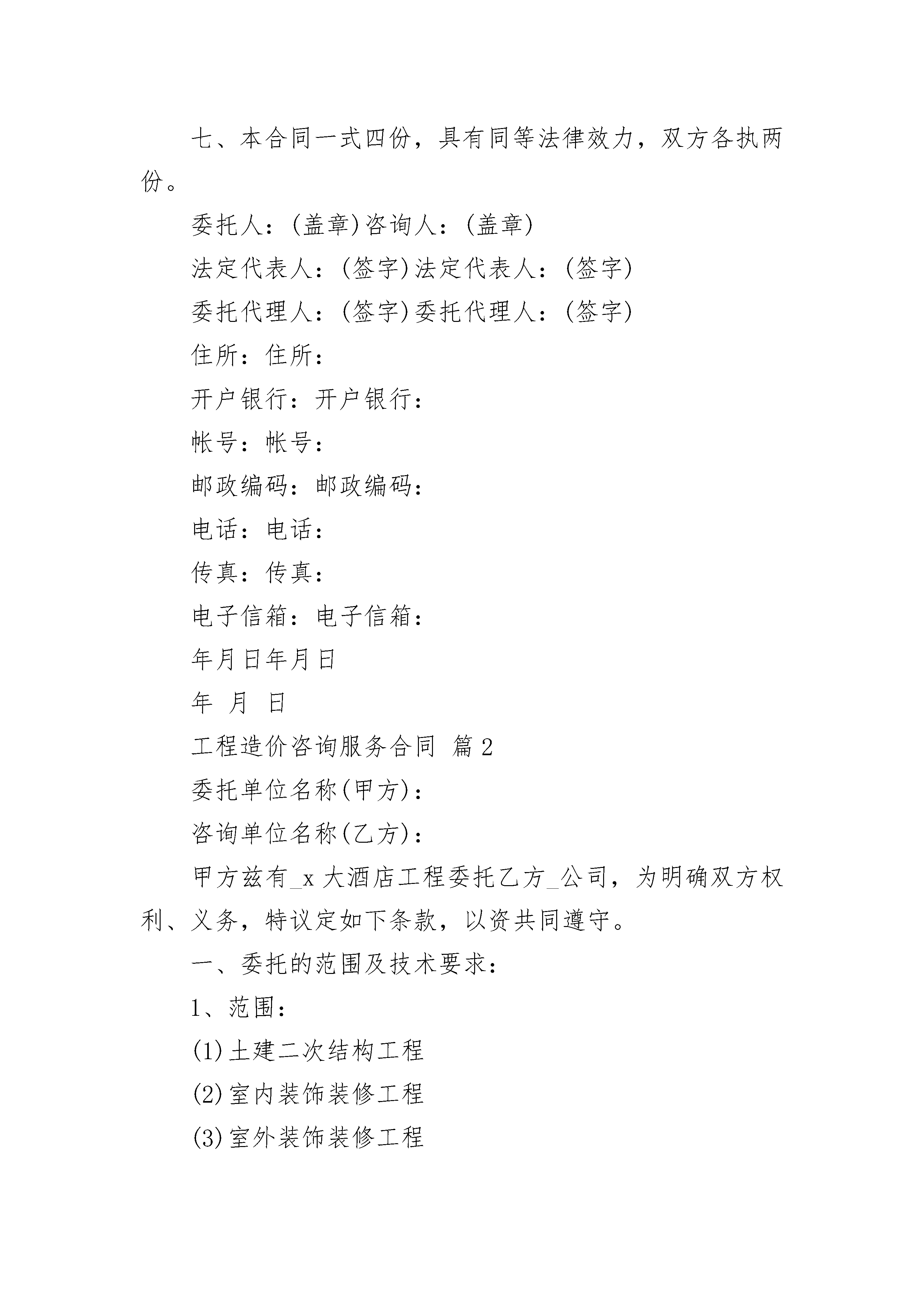 工程造价咨询服务合同工程造价咨询服务合同(精选23篇)工程造价咨询服务合同篇1______________(以下简称委托人)与________________(以下简称咨询人)经过双方协商一致,签订本合同。一、委托人委托咨询人为以下项目提供建设工程造价咨询服务:1.项目名称:2.服务类别:二、本合同的措词和用语与所属建设工程造价咨询合同条件及有关附件同义。三、下列文件均为本合同的组成部分:1.建设工程造价咨询合同标准条件;2.建设工程造价咨询合同专用条件;3.建设工程造价咨询合同执行中共同签署的补充与修正文件。四、咨询人同意按照本合同的规定,承担本合同专用条件中议定范围内的建设工程造价咨询业务。五、委托人同意按照本合同规定的期限、方式、币种、额度向咨询人支付酬金。六、本合同的建设工程造价咨询业务自年月日开始实施,至年月日终结。七、本合同一式四份,具有同等法律效力,双方各执两份。委托人:(盖章)咨询人:(盖章)法定代表人:(签字)法定代表人:(签字)委托代理人:(签字)委托代理人:(签字)住所:住所:开户银行:开户银行:帐号:帐号:邮政编码:邮政编码:电话:电话:传真:传真:电子信箱:电子信箱:年月日年月日年月日工程造价咨询服务合同篇2委托单位名称(甲方):咨询单位名称(乙方):甲方兹有_x大酒店工程委托乙方_公司,为明确双方权利、义务,特议定如下条款,以资共同遵守。一、委托的范围及技术要求:1、范围:(1)土建二次结构工程(2)室内装饰装修工程(3)室外装饰装修工程(4)水、暖、电、通风、空调设备安装工程(5)维修工程(6)附属工程(园林绿化、市政、景观等)2、技术要求:全过程造价咨询服务3、负责施工单位对甲方的结算工作,不负责与纪检委的结算工作。二、甲方承担的义务和责任:1、负责提供下列资料:(1)相关图纸和设计变更通知等文件(安装工程图纸按比例出图);(2)隐蔽记录和有关技术经济鉴证;(3)预(结)算书(含工程量计算式);(4)招标书及招标答疑;(5)施工合同书(含变更合同或补充协议及有关会议纪要等);(6)施工日志、施工组织设计或施工方案。2、负责与有关方面的联系和协调。3、配合进行现场勘察。4、按合同规定及时足额付给乙方咨询服务费。三、乙方承担的义务和责任:1、根据甲方提供的有效资料和现场勘察的情况,遵循实事求是、客观公正的原则开展工程造价咨询服务,以维护双方的合法权益。2、对所出具的咨询结论真实性负责,且其准确率应保证在正常允许范围内。3、负责与有关各方进行联系、核对和解释。4、保守机密,不得擅自与有利害关系的人员接触或透露有关情况。5、不得遗失甲方认为必须返还的资料。6、在约定的时间内完成任务,按合同规定收取咨询服务费。7、不得收取各施工单位的任何形式下的礼金。四、合同实施期限:乙方负责在__年__月__日以前的现场跟踪咨询业务。五、收费标准及结算方式:1、收费标准:按工程总造价的2‰(不含税)计取咨询服务费,乙方负责在__年__月__日以前的现场跟踪咨询业务。如因甲方的施工工期顺延,增加2万元/月(不含税)的咨询服务费。2、支付方式:每月5日前甲方向乙方支付3万元的咨询服务费,余款于__年__月__日前结清。六、技术成果的分享:按节约投资额或核减结算值,甲方得______%,乙方得______%,并由甲方结算对一并付给乙方。七、违约责任:因违约所造成的一切损失由违约方负责。八、争议的解决办法:本合同发生争议,双方协商解决。九、未尽事宜,甲、乙双方协商解决,本合同自__年__月__日起生效,至合同内容履行完毕,款项付清之日终止。十、其他需要说明的事项:十一、本合同一式肆份,双方各执贰份。委托方法人代表(或委托代理人):(签字)地址:受委托方法人代表(或委托代理人):(签字)地址:合同签订时间:__年__月__日工程造价咨询服务合同篇3_______________(以下简称委托人)与_______________(以下简称咨询人)经双方协商一致,签订本合同。第一条本合同是根据《中华人民共和国合同法》和国家建设部、国家工商行政管理总局印发的《建设工程造价咨询合同》示范文本(GJ-20_-0212)制定的。第二条委托人委托咨询人为以下项目提供建设工程造价咨询服务(一)项目名称(全称):__________________________________(二)建设地址(全称):__________________________________(三)项目咨询所涵盖的业务范围:(A类)建设项目可行性研究投资估算的编制、审核及项目经济评价;(B类)建设工程概算、预算、结算、竣工结(决)算的编制、审核;(C类)建设工程进度申报的编制、审核;(D类)工程洽商、变更及合同争议的鉴定与索赔;(E类)编制工程造价计价依据及对工程造